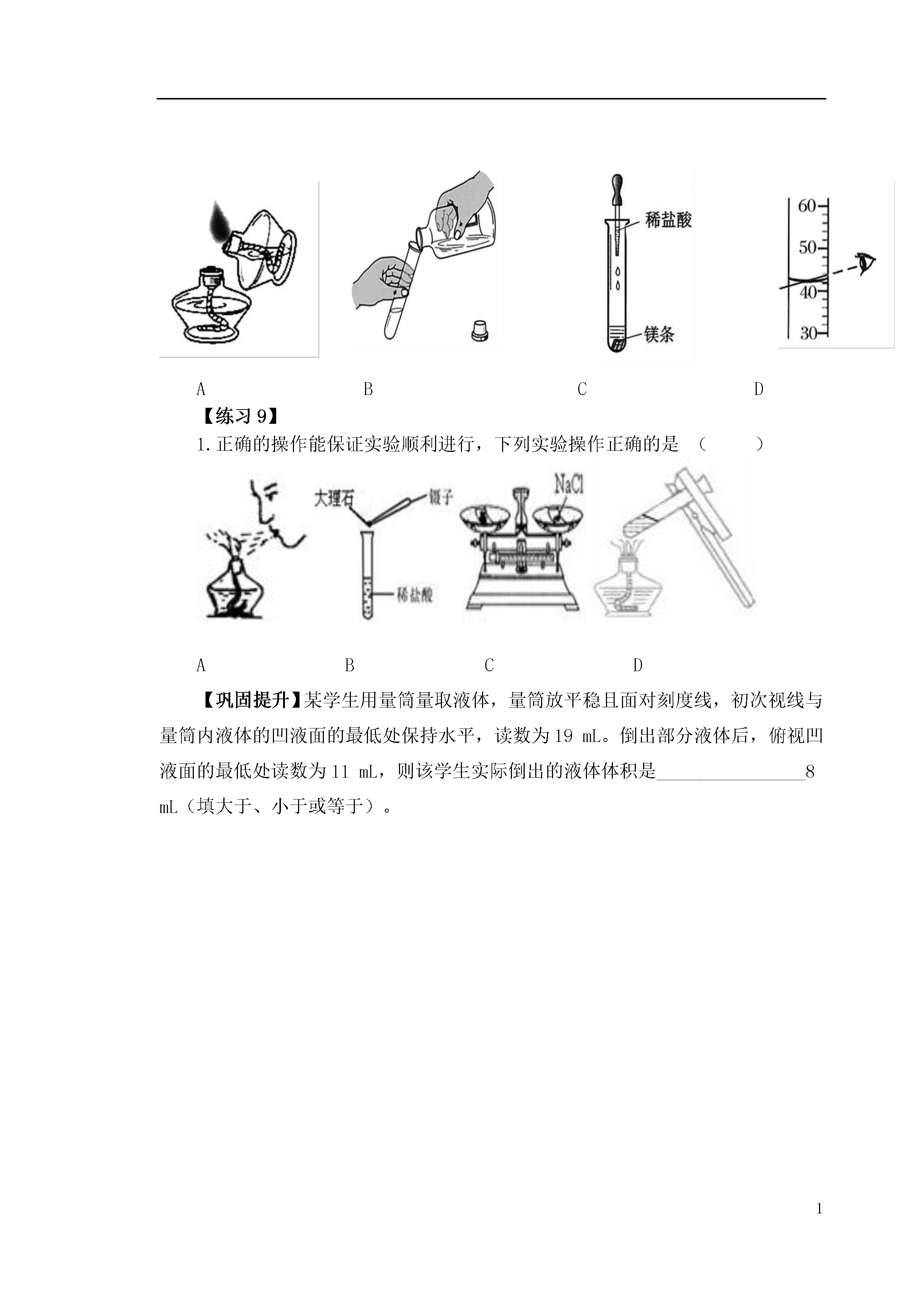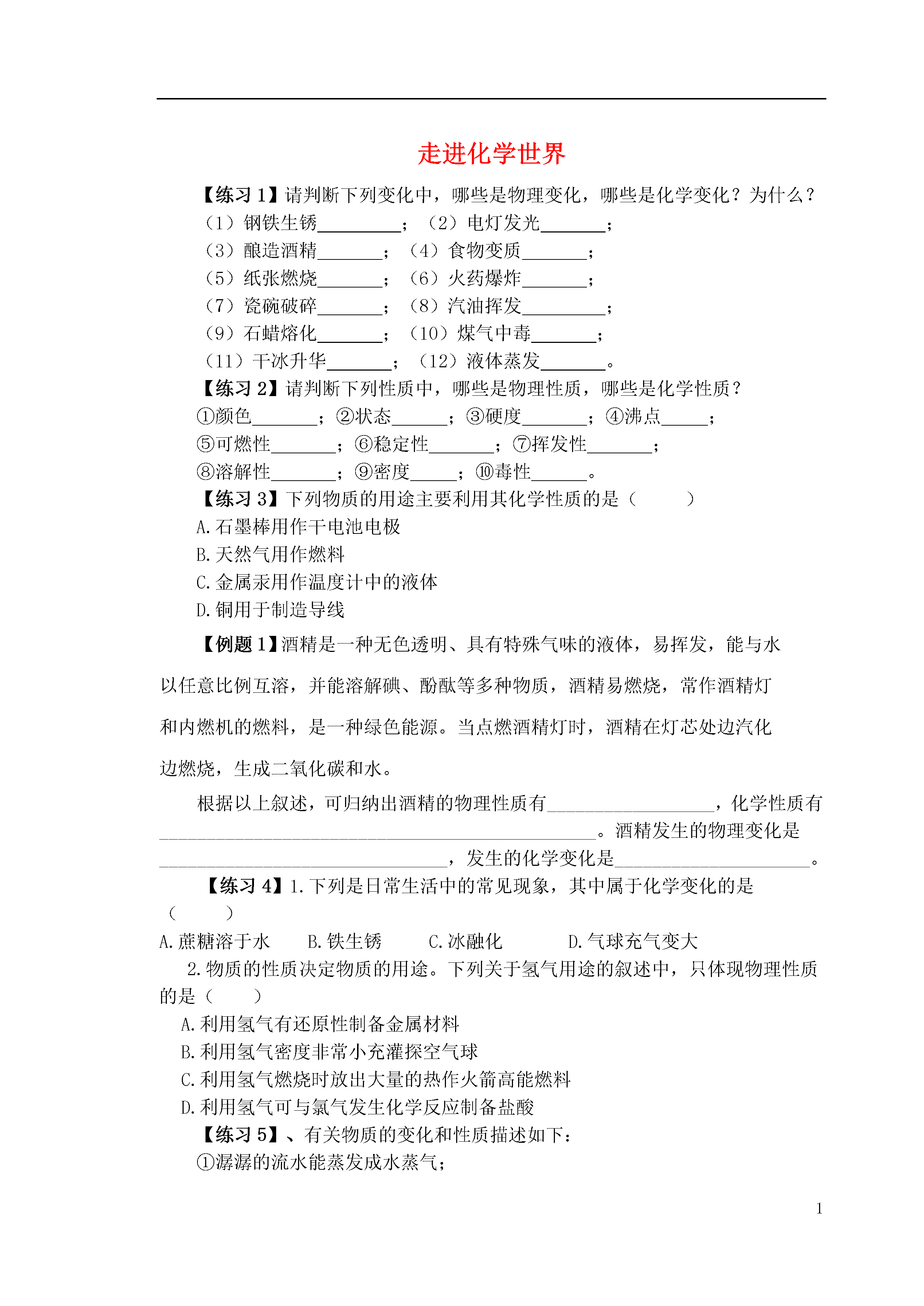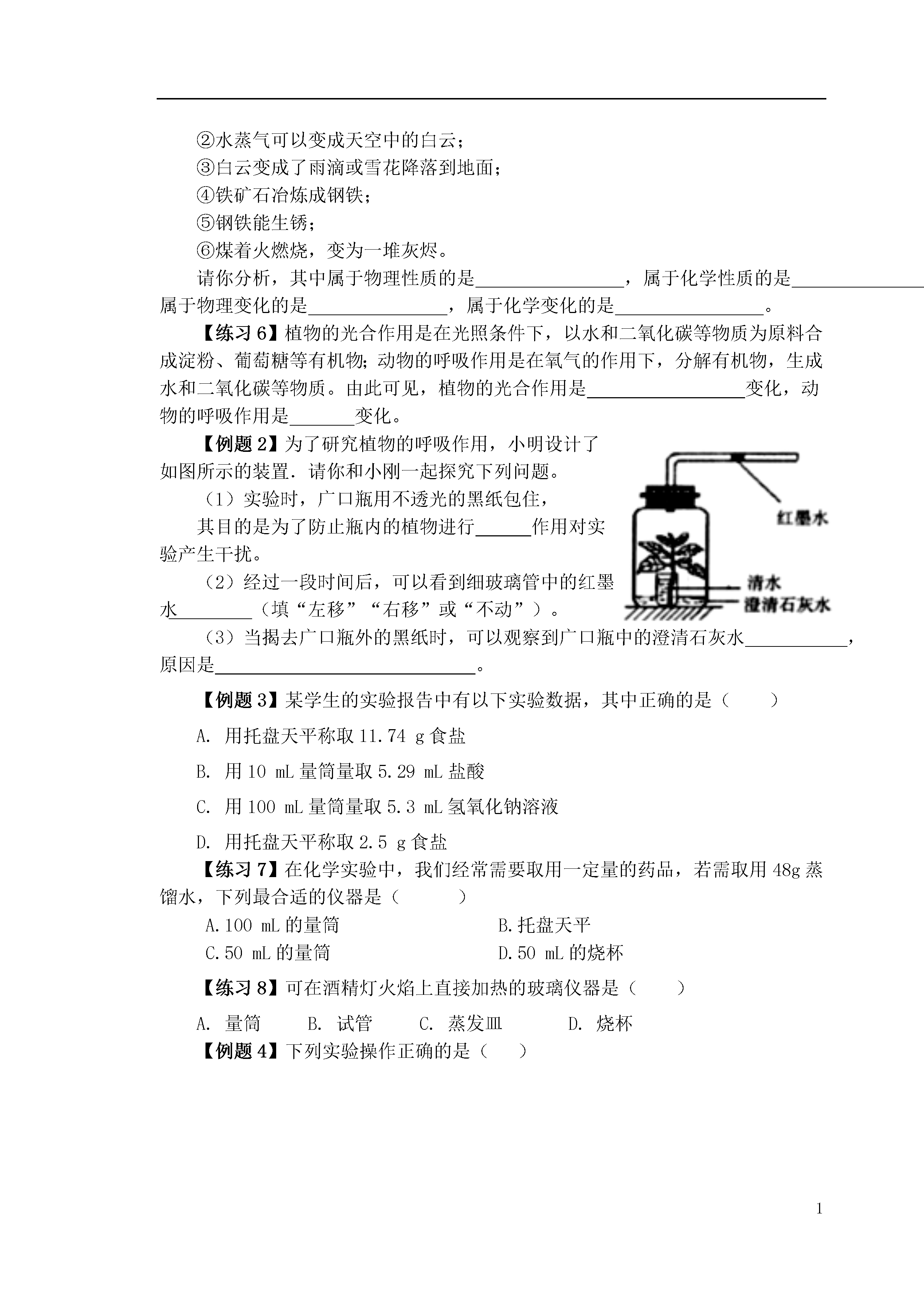 1走进化学世界【练习1】请判断下列变化中,哪些是物理变化,哪些是化学变化?为什么?(1)钢铁生锈;(2)电灯发光;(3)酿造酒精;(4)食物变质;(5)纸张燃烧;(6)火药爆炸;(7)瓷碗破碎;(8)汽油挥发;(9)石蜡熔化;(10)煤气中毒;(11)干冰升华;(12)液体蒸发。【练习2】请判断下列性质中,哪些是物理性质,哪些是化学性质?①颜色;②状态;③硬度;④沸点;⑤可燃性;⑥稳定性;⑦挥发性;⑧溶解性;⑨密度;⑩毒性。【练习3】下列物质的用途主要利用其化学性质的是()A.石墨棒用作干电池电极B.天然气用作燃料C.金属汞用作温度计中的液体D.铜用于制造导线【例题1】酒精是一种无色透明、具有特殊气味的液体,易挥发,能与水以任意比例互溶,并能溶解碘、酚酞等多种物质,酒精易燃烧,常作酒精灯和内燃机的燃料,是一种绿色能源。当点燃酒精灯时,酒精在灯芯处边汽化边燃烧,生成二氧化碳和水。根据以上叙述,可归纳出酒精的物理性质有__________________,化学性质有_______________________________________________。酒精发生的物理变化是_______________________________,发生的化学变化是_____________________。【练习4】1.下列是日常生活中的常见现象,其中属于化学变化的是()A.蔗糖溶于水B.铁生锈C.冰融化D.气球充气变大2.物质的性质决定物质的用途。下列关于氢气用途的叙述中,只体现物理性质的是()A.利用氢气有还原性制备金属材料B.利用氢气密度非常小充灌探空气球C.利用氢气燃烧时放出大量的热作火箭高能燃料D.利用氢气可与氯气发生化学反应制备盐酸【练习5】、有关物质的变化和性质描述如下:①潺潺的流水能蒸发成水蒸气;②水蒸气可以变成天空中的白云;③白云变成了雨滴或雪花降落到地面;④铁矿石冶炼成钢铁;⑤钢铁能生锈;⑥煤着火燃烧,变为一堆灰烬。请你分析,其中属于物理性质的是,属于化学性质的是,属于物理变化的是,属于化学变化的是。【练习6】植物的光合作用是在光照条件下,以水和二氧化碳等物质为原料合成淀粉、葡萄糖等有机物;动物的呼吸作用是在氧气的作用下,分解有机物,生成水和二氧化碳等物质。由此可见,植物的光合作用是_______变化,动物的呼吸作用是变化。【例题2】为了研究植物的呼吸作用,小明设计了如图所示的装置.请你和小刚一起探究下列问题。(1)实验时,广口瓶用不透光的黑纸包住,其目的是为了防止瓶内的植物进行作用对实验产生干扰。(2)经过一段时间后,可以看到细玻璃管中的红墨水(填“左移”“右移”或“不动”)。(3)当揭去广口瓶外的黑纸时,可以观察到广口瓶中的澄清石灰水,原因是。【例题3】某学生的实验报告中有以下实验数据,其中正确的是()A.用托盘天平称取11.74g食盐B.用10mL量筒量取5.29mL盐酸C.用100mL量筒量取5.3mL氢氧化钠溶液D.用托盘天平称取2.5g食盐【练习7】在化学实验中,我们经常需要取用一定量的药品,若需取用48g蒸馏水,下列最合适的仪器是()A.100mL的量筒B.托盘天平C.50mL的量筒D.50mL的烧杯【练习8】可在酒精灯火焰上直接加热的玻璃仪器是()A.量筒B.试管C.蒸发皿D.烧杯【例题4】下列实验操作正确的是()ABCD【练习9】1.正确的操作能保证实验顺利进行,下列实验操作正确的是()ABCD【巩固提升】某学生用量筒量取液体,量筒放平稳且面对刻度线,初次视线与量筒内液体的凹液面的最低处保持水平,读数为19mL。倒出部分液体后,俯视凹液面的最低处读数为11mL,则该学生实际倒出的液体体积是________________8mL(填大于、小于或等于)。