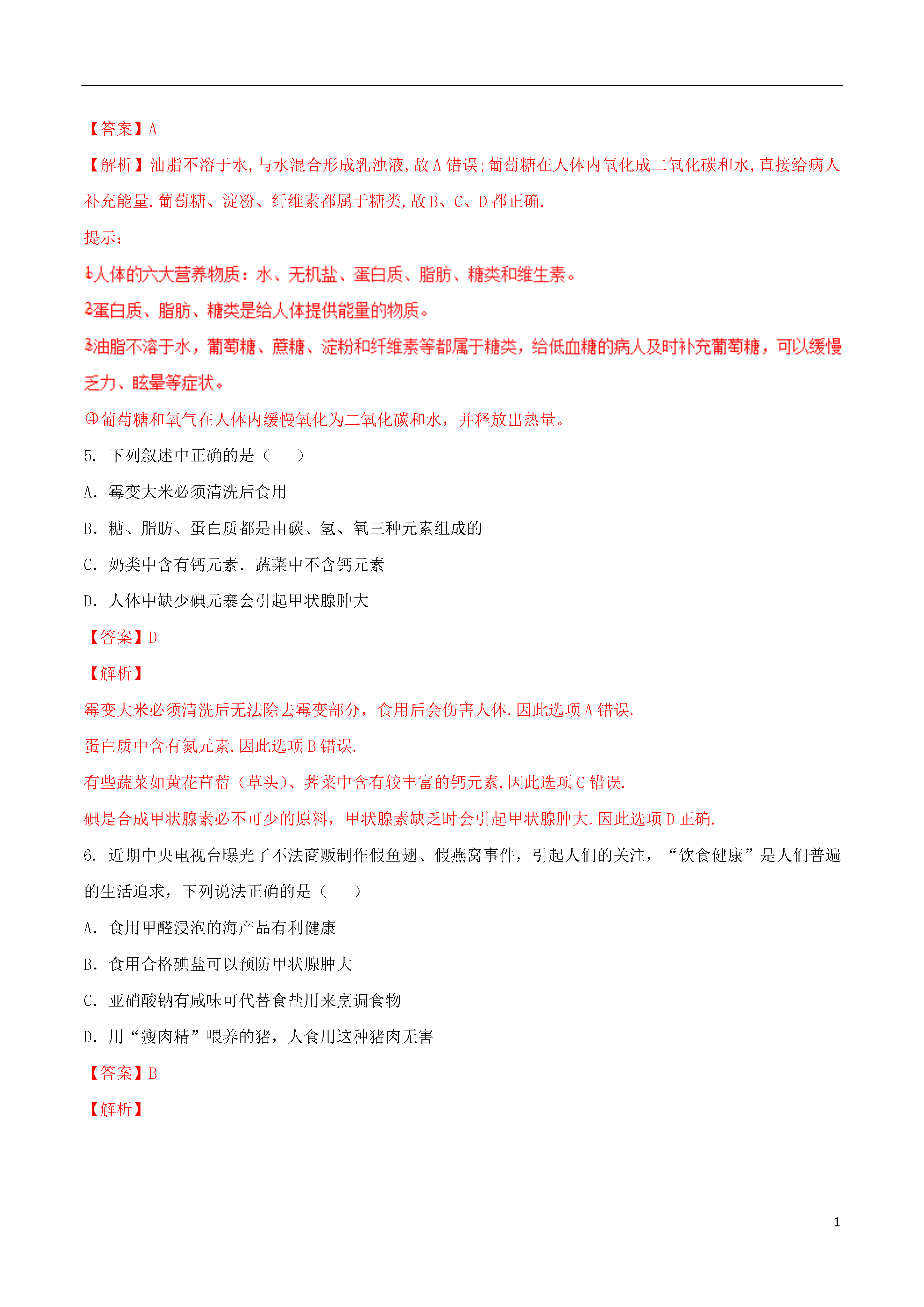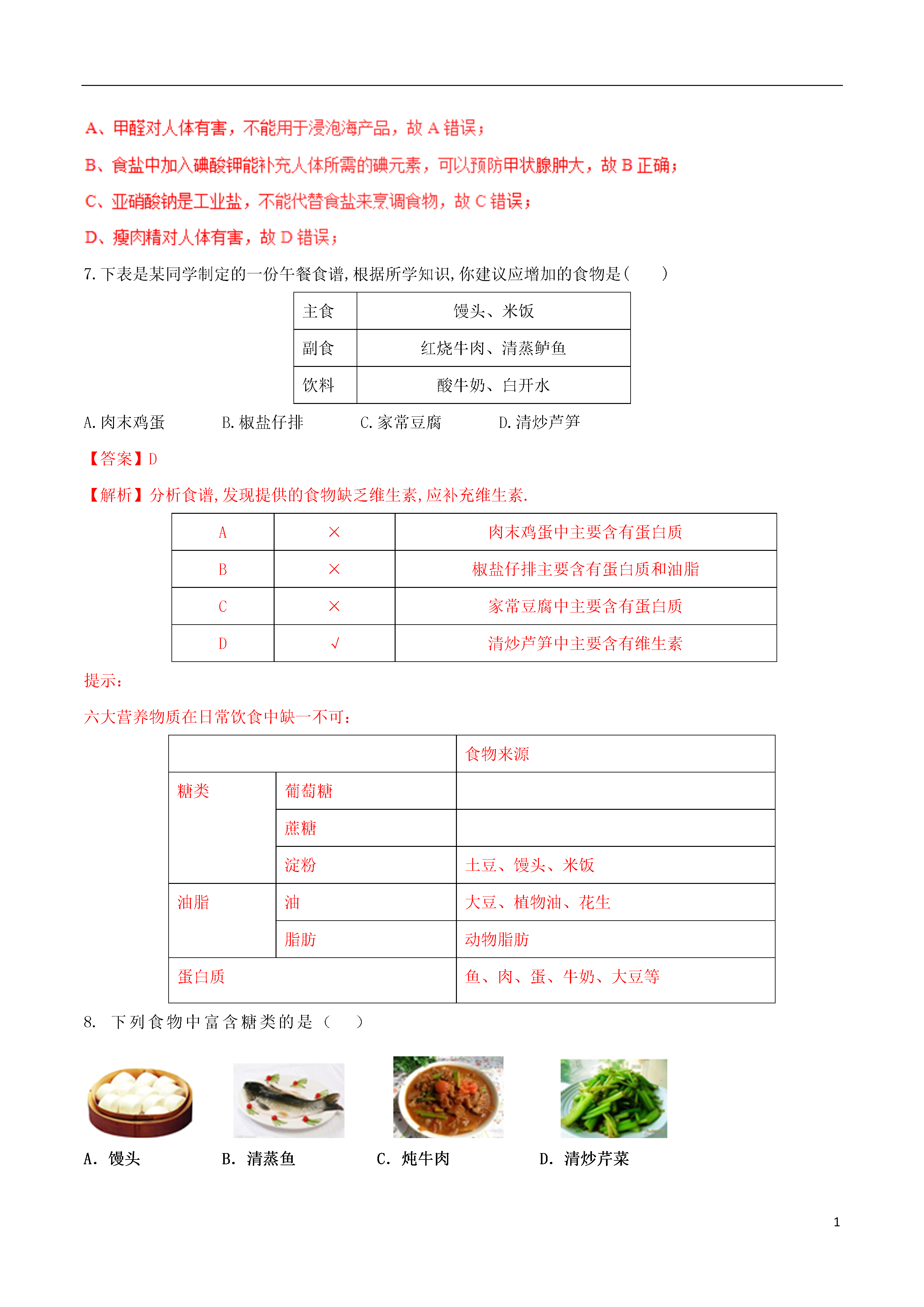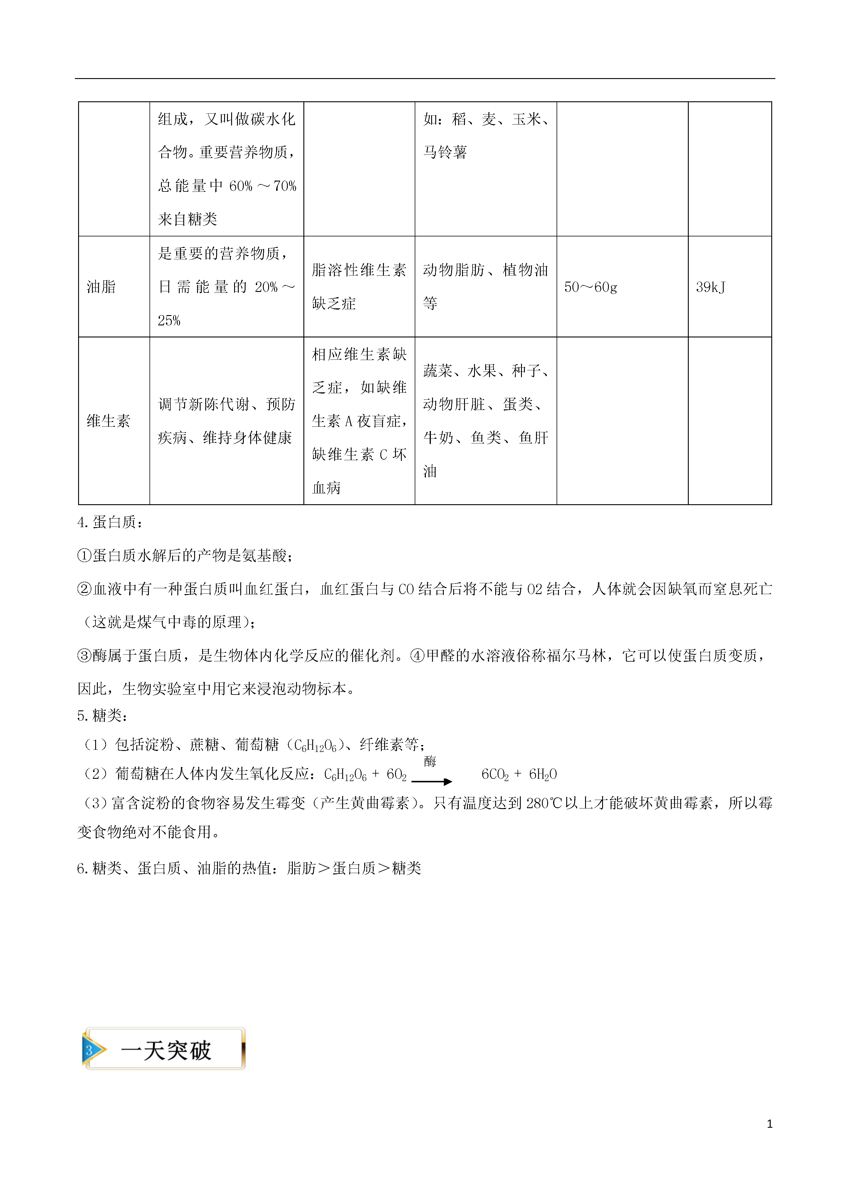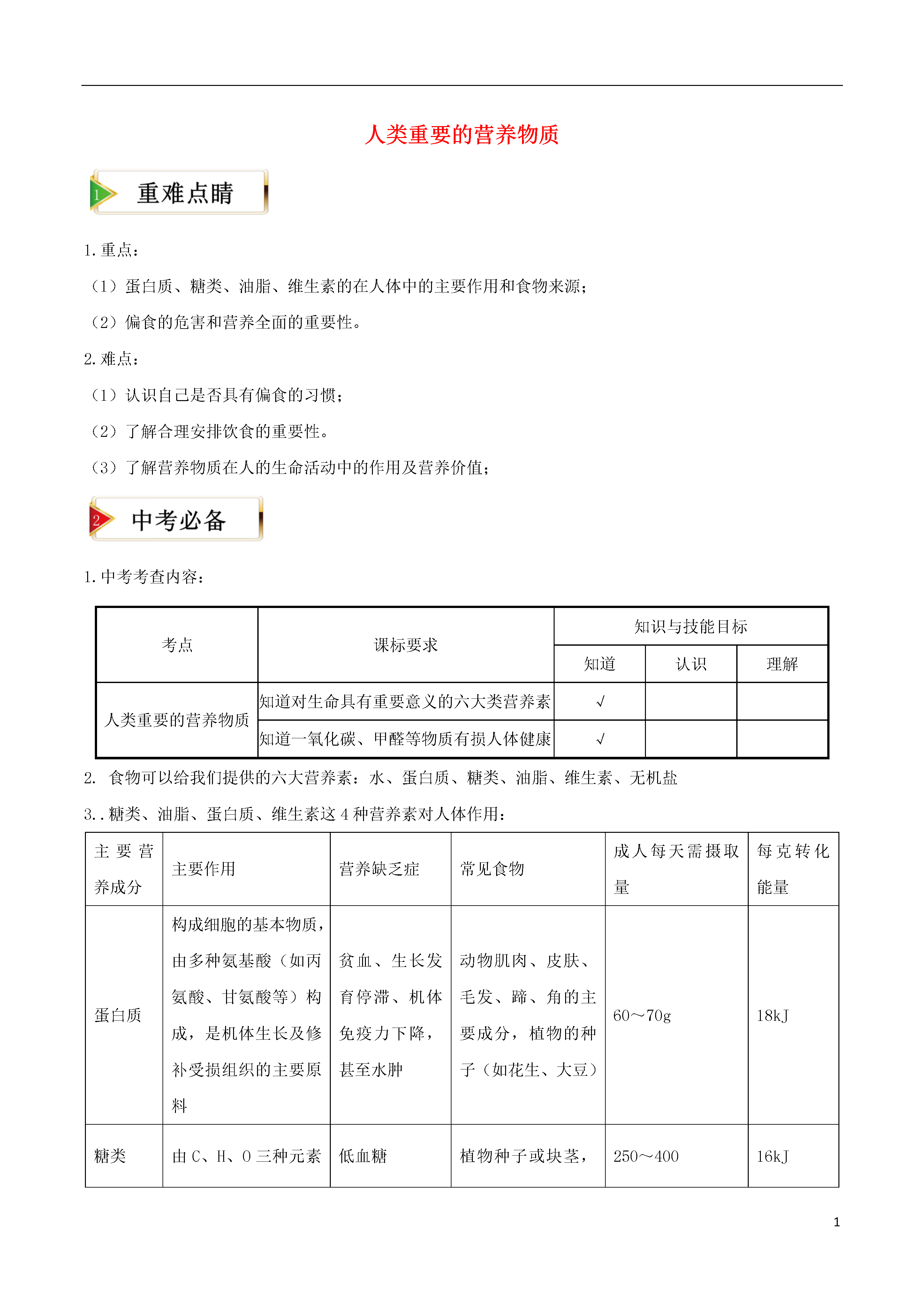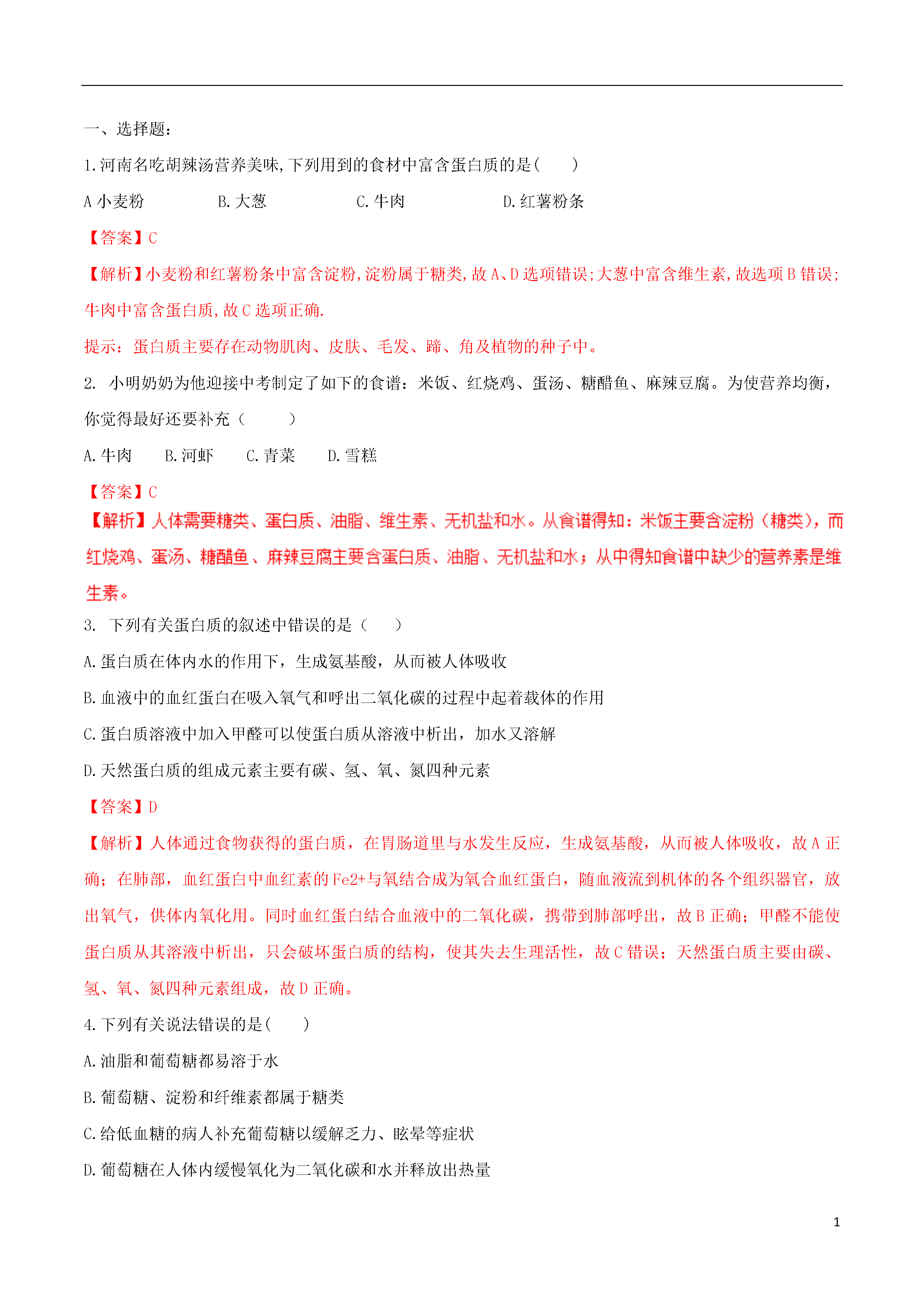 1人类重要的营养物质1.重点:(1)蛋白质、糖类、油脂、维生素的在人体中的主要作用和食物来源;(2)偏食的危害和营养全面的重要性。2.难点:(1)认识自己是否具有偏食的习惯;(2)了解合理安排饮食的重要性。(3)了解营养物质在人的生命活动中的作用及营养价值;1.中考考查内容:考点课标要求知识与技能目标知道认识理解人类重要的营养物质知道对生命具有重要意义的六大类营养素√知道一氧化碳、甲醛等物质有损人体健康√2.食物可以给我们提供的六大营养素:水、蛋白质、糖类、油脂、维生素、无机盐3..糖类、油脂、蛋白质、维生素这4种营养素对人体作用:主要营养成分主要作用营养缺乏症常见食物成人每天需摄取量每克转化能量蛋白质构成细胞的基本物质,由多种氨基酸(如丙氨酸、甘氨酸等)构成,是机体生长及修补受损组织的主要原料贫血、生长发育停滞、机体免疫力下降,甚至水肿动物肌肉、皮肤、毛发、蹄、角的主要成分,植物的种子(如花生、大豆)60~70g18kJ糖类由C、H、O三种元素组成,又叫做碳水化合物。重要营养物质,总能量中60%~70%来自糖类低血糖植物种子或块茎,如:稻、麦、玉米、马铃薯250~40016kJ油脂是重要的营养物质,日需能量的20%~25%脂溶性维生素缺乏症动物脂肪、植物油等50~60g39kJ维生素调节新陈代谢、预防疾病、维持身体健康相应维生素缺乏症,如缺维生素A夜盲症,缺维生素C坏血病蔬菜、水果、种子、动物肝脏、蛋类、牛奶、鱼类、鱼肝油4.蛋白质:①蛋白质水解后的产物是氨基酸;②血液中有一种蛋白质叫血红蛋白,血红蛋白与CO结合后将不能与O2结合,人体就会因缺氧而窒息死亡(这就是煤气中毒的原理);③酶属于蛋白质,是生物体内化学反应的催化剂。④甲醛的水溶液俗称福尔马林,它可以使蛋白质变质,因此,生物实验室中用它来浸泡动物标本。5.糖类:酶(1)包括淀粉、蔗糖、葡萄糖(C6H12O6)、纤维素等;(2)葡萄糖在人体内发生氧化反应:C6H12O6+6O26CO2+6H2O(3)富含淀粉的食物容易发生霉变(产生黄曲霉素)。只有温度达到280℃以上才能破坏黄曲霉素,所以霉变食物绝对不能食用。6.糖类、蛋白质、油脂的热值:脂肪>蛋白质>糖类一、选择题:1.河南名吃胡辣汤营养美味,下列用到的食材中富含蛋白质的是()A小麦粉B.大葱C.牛肉D.红薯粉条【答案】C【解析】小麦粉和红薯粉条中富含淀粉,淀粉属于糖类,故A、D选项错误;大葱中富含维生素,故选项B错误;牛肉中富含蛋白质,故C选项正确.提示:蛋白质主要存在动物肌肉、皮肤、毛发、蹄、角及植物的种子中。2.小明奶奶为他迎接中考制定了如下的食谱:米饭、红烧鸡、蛋汤、糖醋鱼、麻辣豆腐。为使营养均衡,你觉得最好还要补充()A.牛肉B.河虾C.青菜D.雪糕【答案】C3.下列有关蛋白质的叙述中错误的是()A.蛋白质在体内水的作用下,生成氨基酸,从而被人体吸收B.血液中的血红蛋白在吸入氧气和呼出二氧化碳的过程中起着载体的作用C.蛋白质溶液中加入甲醛可以使蛋白质从溶液中析出,加水又溶解D.天然蛋白质的组成元素主要有碳、氢、氧、氮四种元素【答案】D【解析】人体通过食物获得的蛋白质,在胃肠道里与水发生反应,生成氨基酸,从而被人体吸收,故A正确;在肺部,血红蛋白中血红素的Fe2+与氧结合成为氧合血红蛋白,随血液流到机体的各个组织器官,放出氧气,供体内氧化用。同时血红蛋白结合血液中的二氧化碳,携带到肺部呼出,故B正确;甲醛不能使蛋白质从其溶液中析出,只会破坏蛋白质的结构,使其失去生理活性,故C错误;天然蛋白质主要由碳、氢、氧、氮四种元素组成,故D正确。4.下列有关说法错误的是()A.油脂和葡萄糖都易溶于水B.葡萄糖、淀粉和纤维素都属于糖类C.给低血糖的病人补充葡萄糖以缓解乏力、眩晕等症状D.葡萄糖在人体内缓慢氧化为二氧化碳和水并释放出热量【答案】A【解析】油脂不溶于水,与水混合形成乳浊液,故A错误;葡萄糖在人体内氧化成二氧化碳和水,直接给病人补充能量.葡萄糖、淀粉、纤维素都属于糖类,故B、C、D都正确.提示:eq\o\ac(○,4)葡萄糖和氧气在人体内缓慢氧化为二氧化碳和水,并释放出热量。5.下列叙述中正确的是()A.霉变大米必须清洗后食用B.糖、脂肪、蛋白质都是由碳、氢、氧三种元素组成的C.奶类中含有钙元素.蔬菜中不含钙元素D.人体中缺少碘元褰会引起甲状腺肿大【答案】D【解析】霉变大米必须清洗后无法除去霉变部分,食用后会伤害人体.因此选项A错误.蛋白质中含有氮元素.因此选项B错误.有些蔬菜如黄花苜蓿(草头)、荠菜中含有较丰富的钙元素.因此选项C错误.碘是合成甲状腺素必不可少的