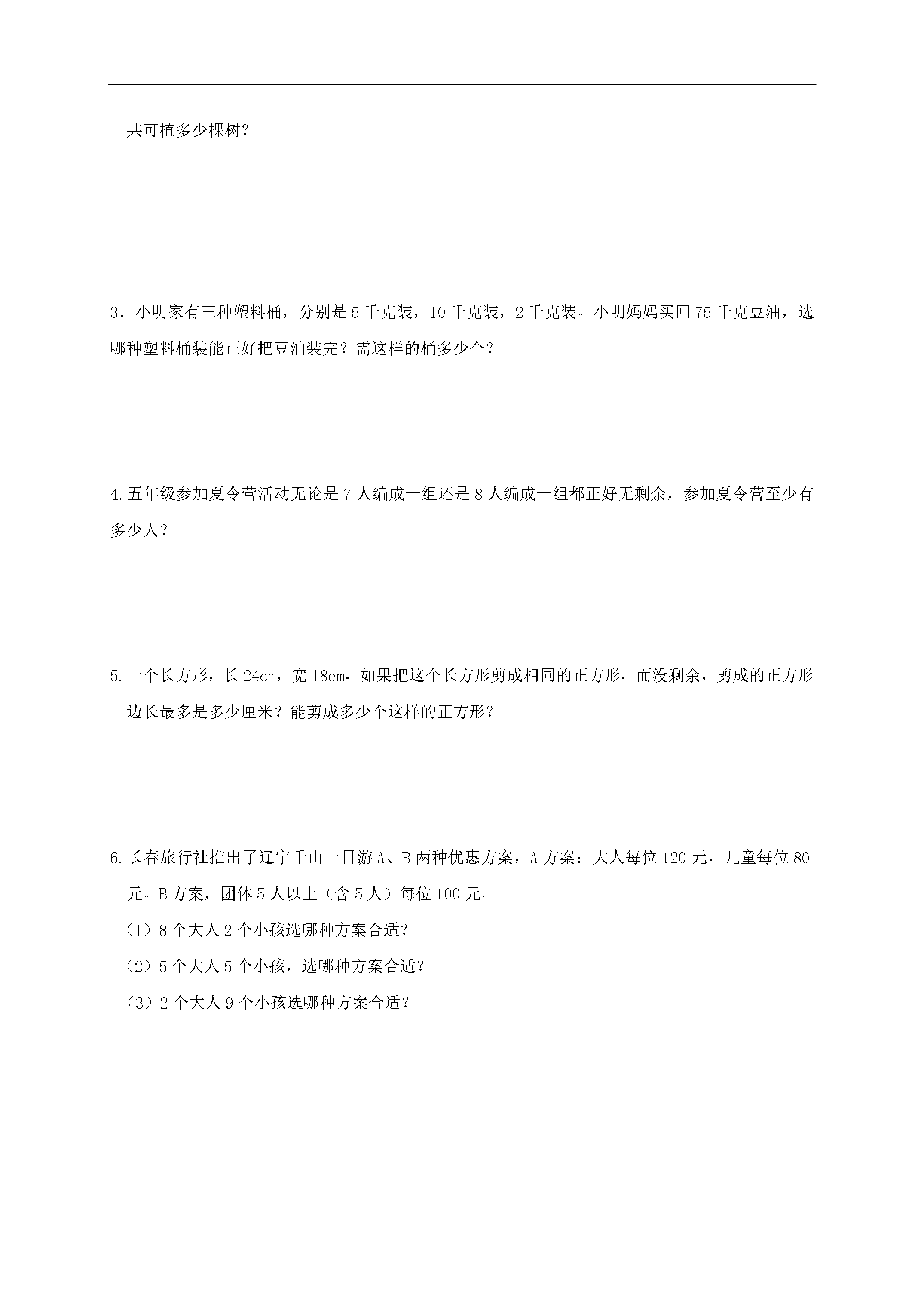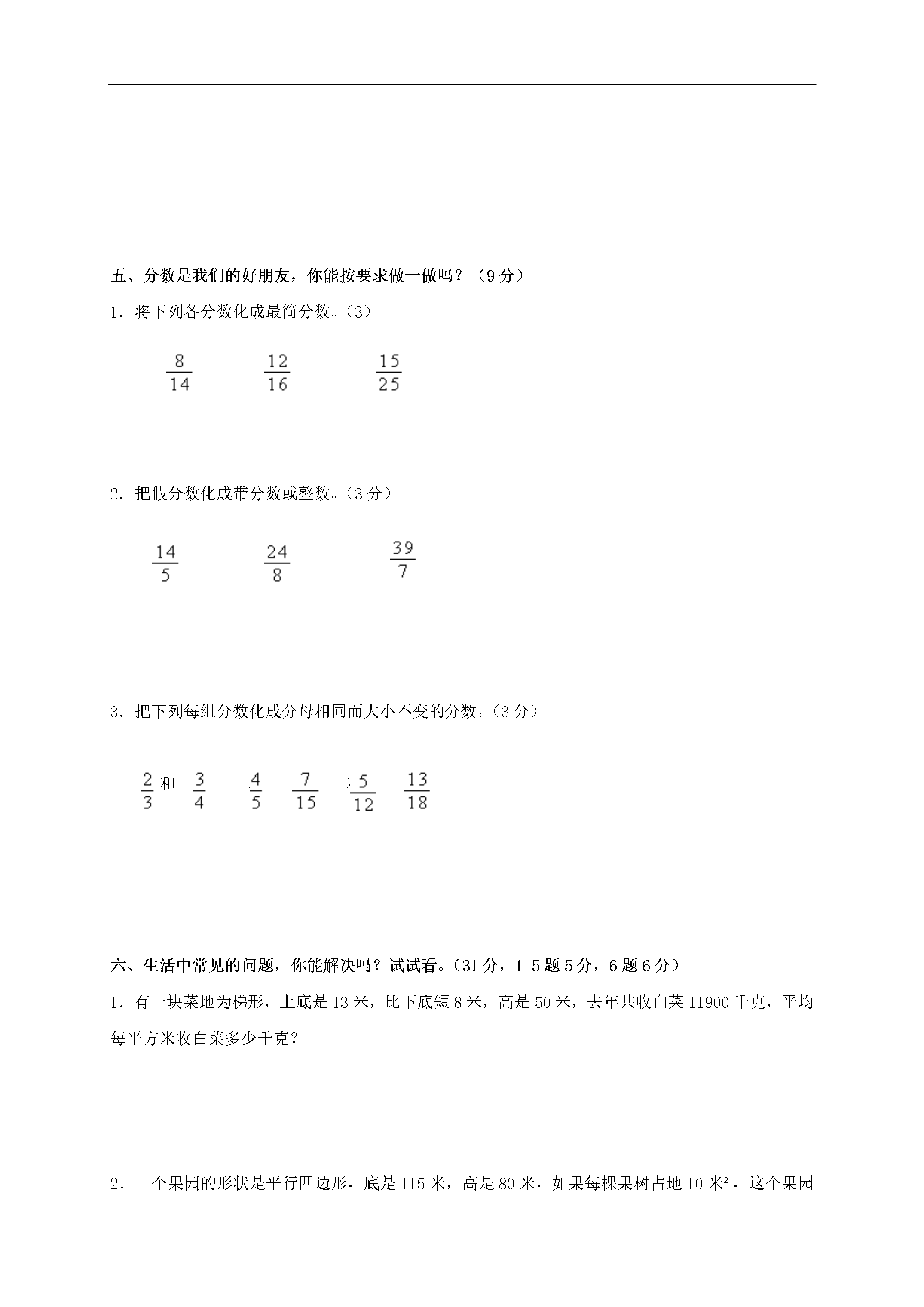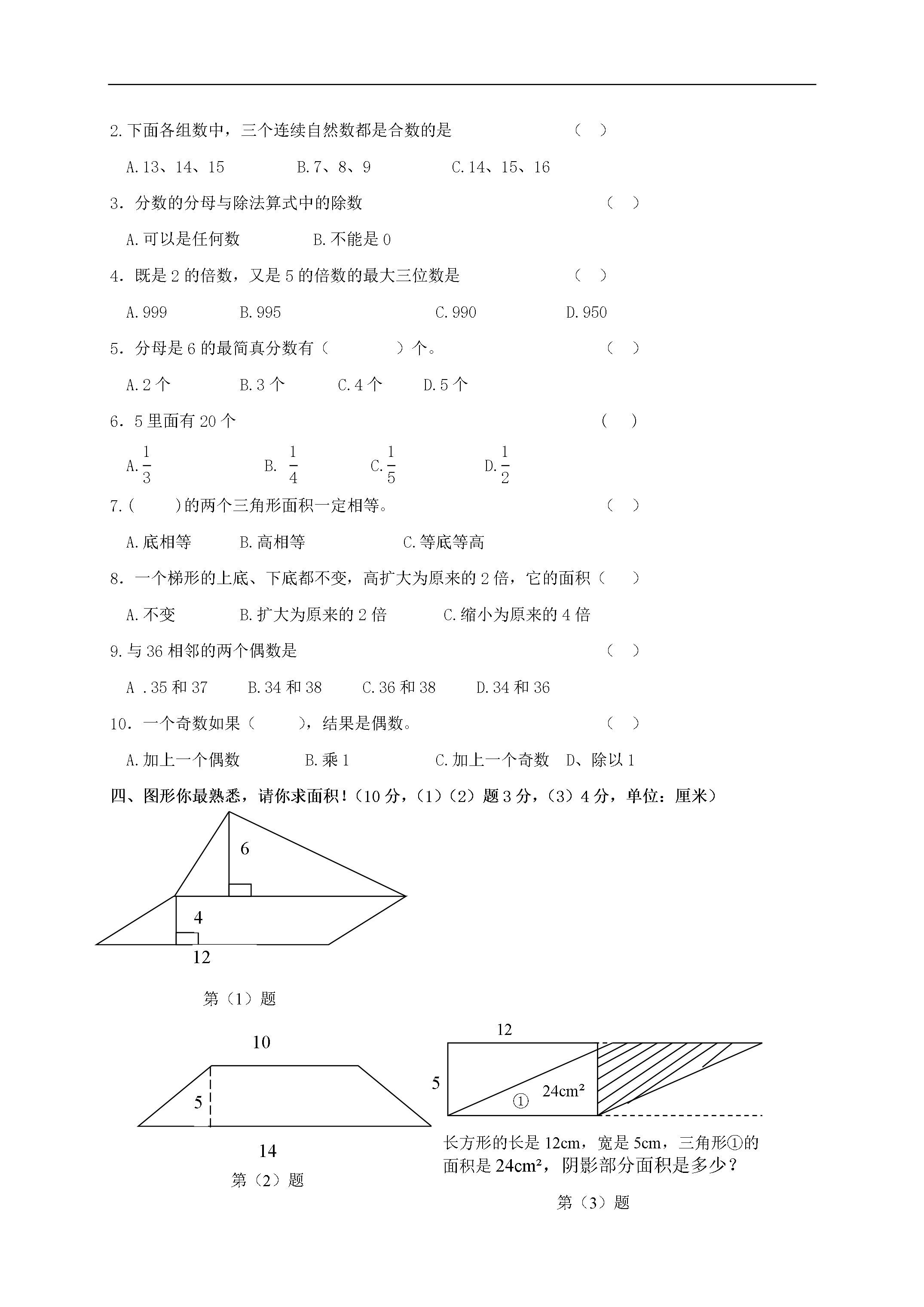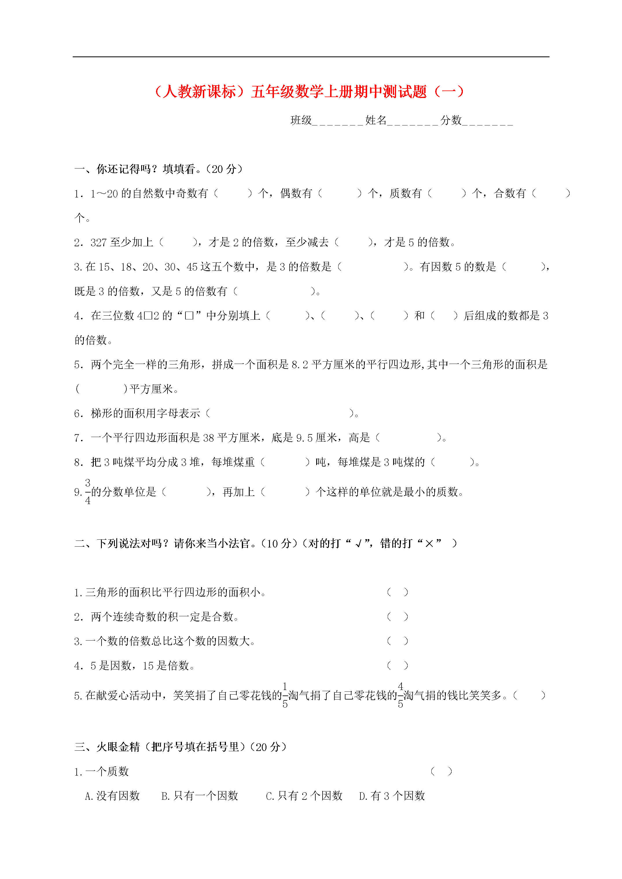 (人教新课标)五年级数学上册期中测试题(一)班级_______姓名_______分数_______一、你还记得吗?填填看。(20分)1.1~20的自然数中奇数有()个,偶数有()个,质数有()个,合数有()个。2.327至少加上(),才是2的倍数,至少减去(),才是5的倍数。3.在15、18、20、30、45这五个数中,是3的倍数是()。有因数5的数是(),既是3的倍数,又是5的倍数有()。4.在三位数4□2的“□”中分别填上()、()、()和()后组成的数都是3的倍数。5.两个完全一样的三角形,拼成一个面积是8.2平方厘米的平行四边形,其中一个三角形的面积是()平方厘米。6.梯形的面积用字母表示()。7.一个平行四边形面积是38平方厘米,底是9.5厘米,高是()。8.把3吨煤平均分成3堆,每堆煤重()吨,每堆煤是3吨煤的()。9.eq\f(3,4)的分数单位是(),再加上()个这样的单位就是最小的质数。二、下列说法对吗?请你来当小法官。(10分)(对的打“√”,错的打“×”)1.三角形的面积比平行四边形的面积小。()2.两个连续奇数的积一定是合数。()3.一个数的倍数总比这个数的因数大。()4.5是因数,15是倍数。()5.在献爱心活动中,笑笑捐了自己零花钱的eq\f(1,5)淘气捐了自己零花钱的eq\f(4,5)淘气捐的钱比笑笑多。()三、火眼金精(把序号填在括号里)(20分)1.一个质数()A.没有因数B.只有一个因数C.只有2个因数D.有3个因数2.下面各组数中,三个连续自然数都是合数的是()A.13、14、15B.7、8、9C.14、15、163.分数的分母与除法算式中的除数()A.可以是任何数B.不能是04.既是2的倍数,又是5的倍数的最大三位数是()A.999B.995C.990D.9505.分母是6的最简真分数有()个。()A.2个B.3个C.4个D.5个6.5里面有20个()A.eq\f(1,3)B.eq\f(1,4)C.eq\f(1,5)D.eq\f(1,2)7.()的两个三角形面积一定相等。()A.底相等B.高相等C.等底等高8.一个梯形的上底、下底都不变,高扩大为原来的2倍,它的面积()A.不变B.扩大为原来的2倍C.缩小为原来的4倍9.与36相邻的两个偶数是()A.35和37B.34和38C.36和38D.34和3610.一个奇数如果(),结果是偶数。()A.加上一个偶数B.乘1C.加上一个奇数D、除以16412第(1)题四、图形你最熟悉,请你求面积!(10分,(1)(2)题3分,(3)4分,单位:厘米)长方形的长是12cm,宽是5cm,三角形①的面积是24cm²,阴影部分面积是多少?5①24cm²12第(3)题1014第(2)题5五、分数是我们的好朋友,你能按要求做一做吗?(9分)1.将下列各分数化成最简分数。(3)2.把假分数化成带分数或整数。(3分)3.把下列每组分数化成分母相同而大小不变的分数。(3分)和和和六、生活中常见的问题,你能解决吗?试试看。(31分,1-5题5分,6题6分)1.有一块菜地为梯形,上底是13米,比下底短8米,高是50米,去年共收白菜11900千克,平均每平方米收白菜多少千克?2.一个果园的形状是平行四边形,底是115米,高是80米,如果每棵果树占地10米²,这个果园一共可植多少棵树?3.小明家有三种塑料桶,分别是5千克装,10千克装,2千克装。小明妈妈买回75千克豆油,选哪种塑料桶装能正好把豆油装完?需这样的桶多少个?4.五年级参加夏令营活动无论是7人编成一组还是8人编成一组都正好无剩余,参加夏令营至少有多少人?5.一个长方形,长24cm,宽18cm,如果把这个长方形剪成相同的正方形,而没剩余,剪成的正方形边长最多是多少厘米?能剪成多少个这样的正方形?6.长春旅行社推出了辽宁千山一日游A、B两种优惠方案,A方案:大人每位120元,儿童每位80元。B方案,团体5人以上(含5人)每位100元。(1)8个大人2个小孩选哪种方案合适?(2)5个大人5个小孩,选哪种方案合适?(3)2个大人9个小孩选哪种方案合适?