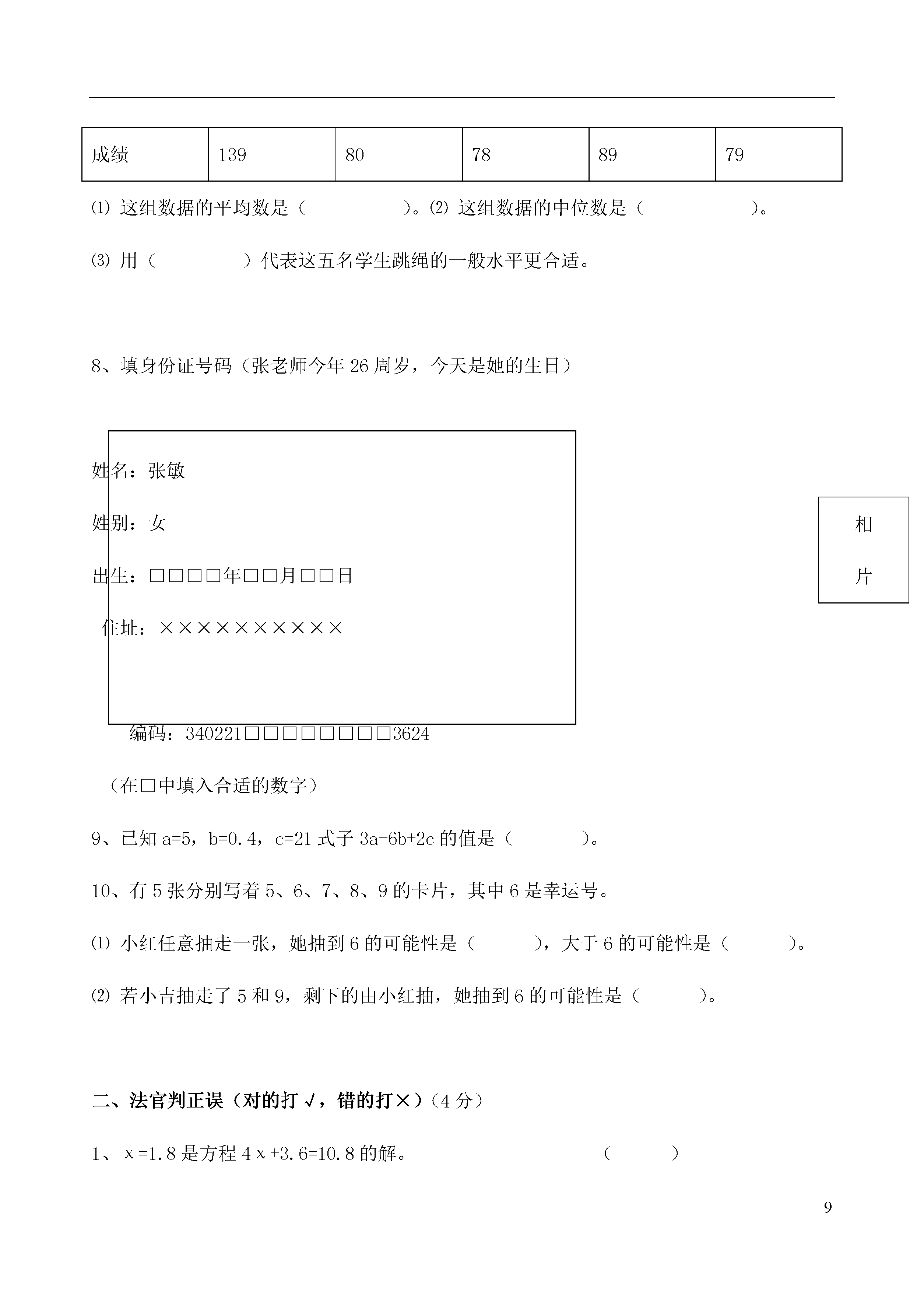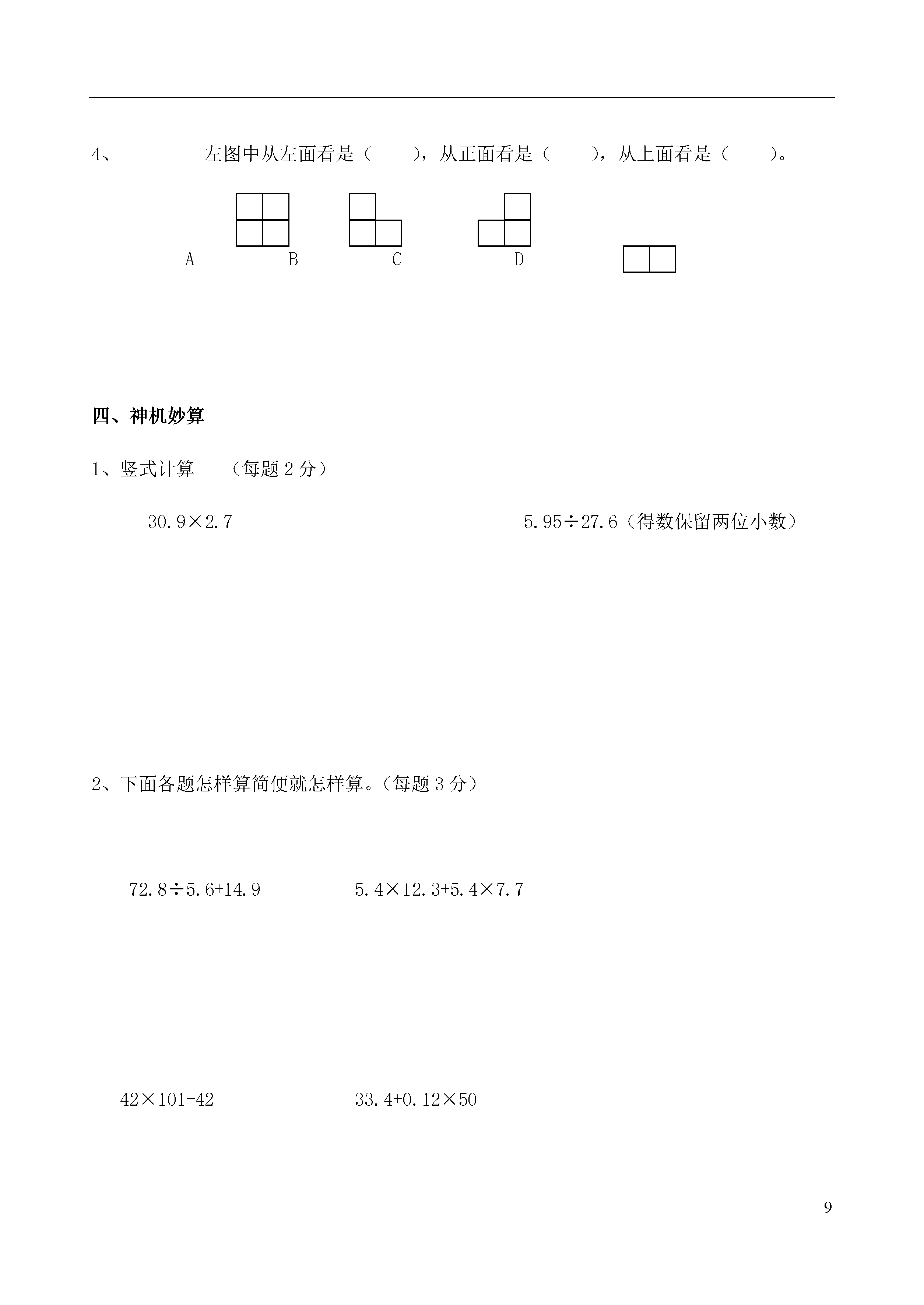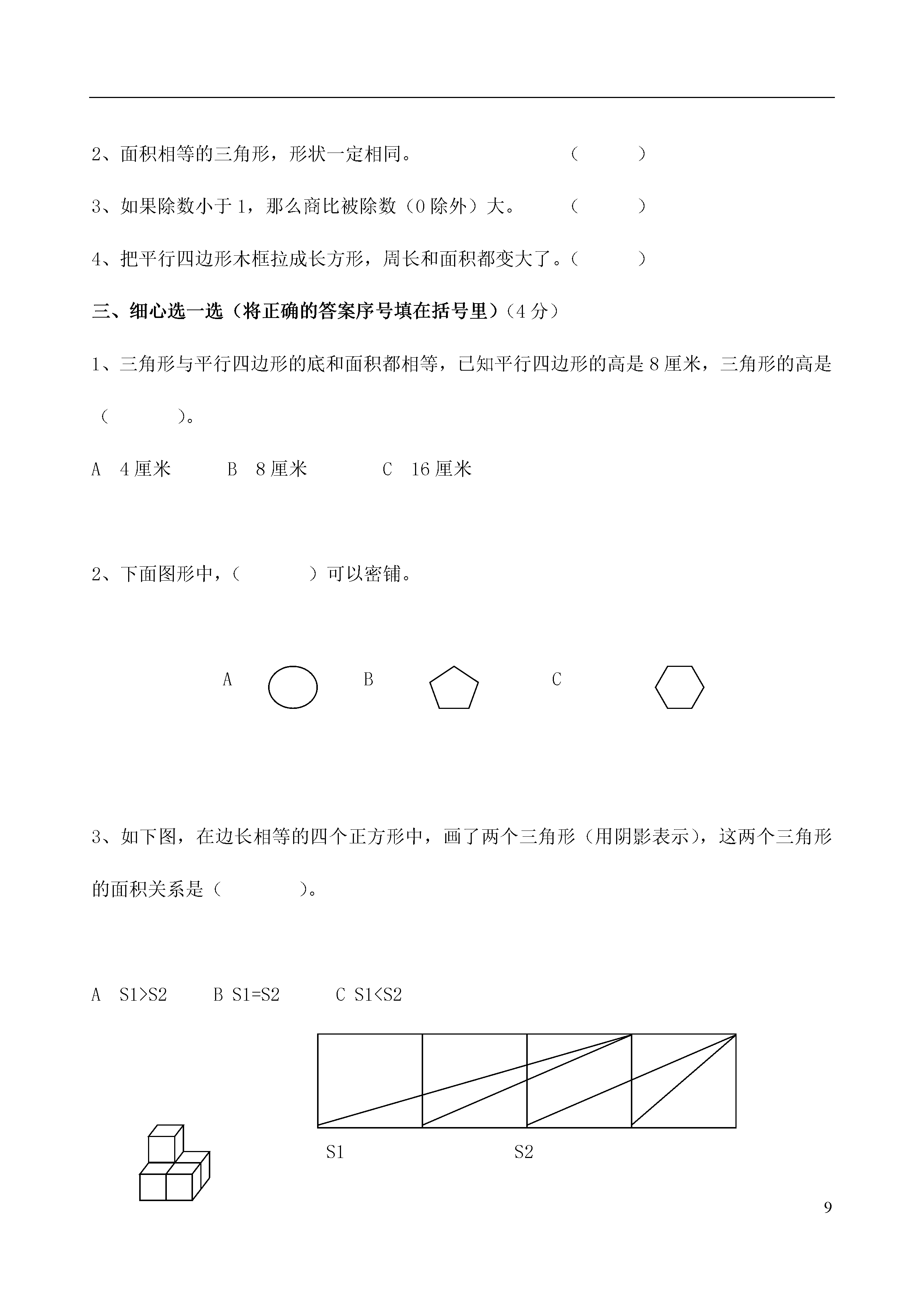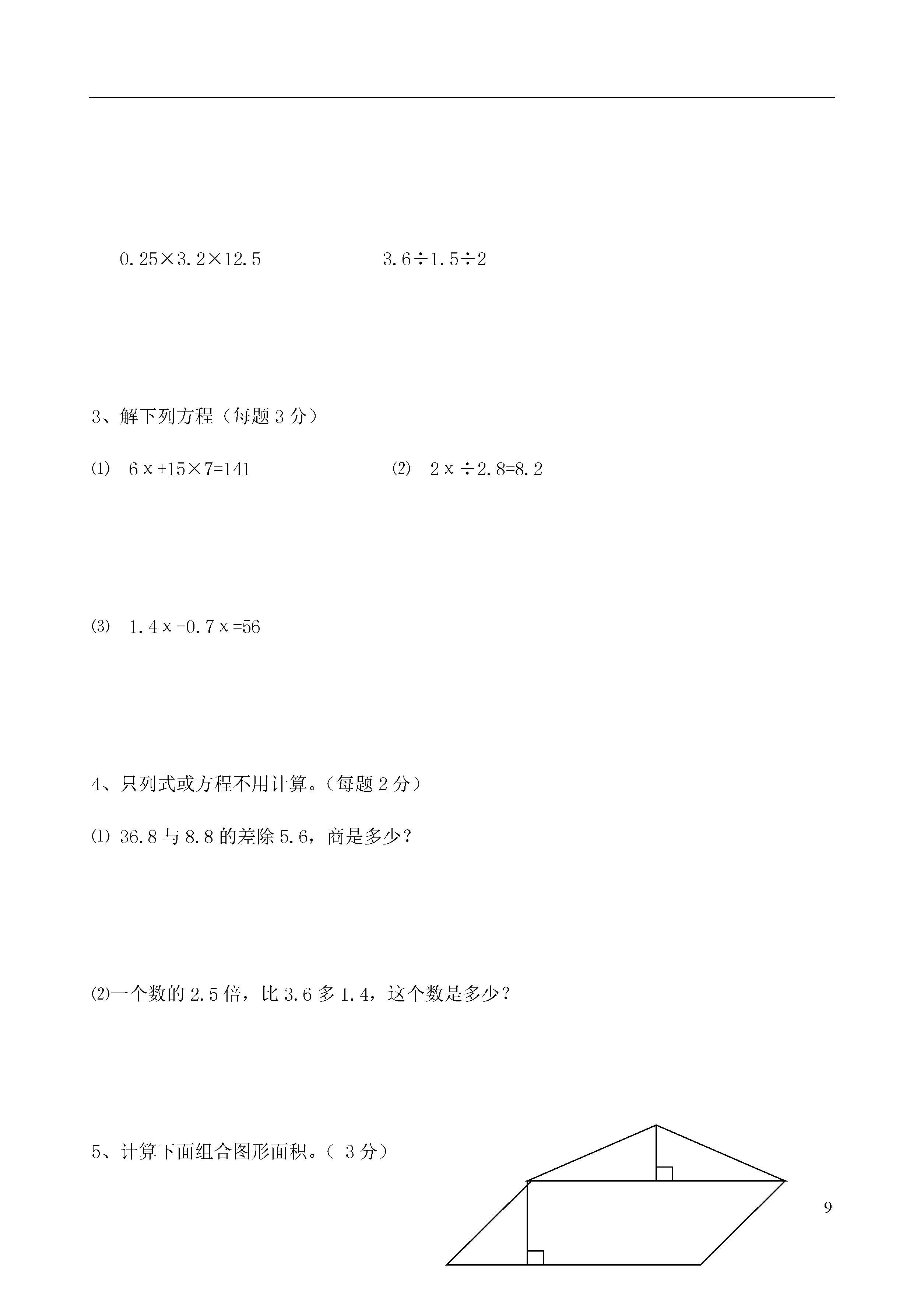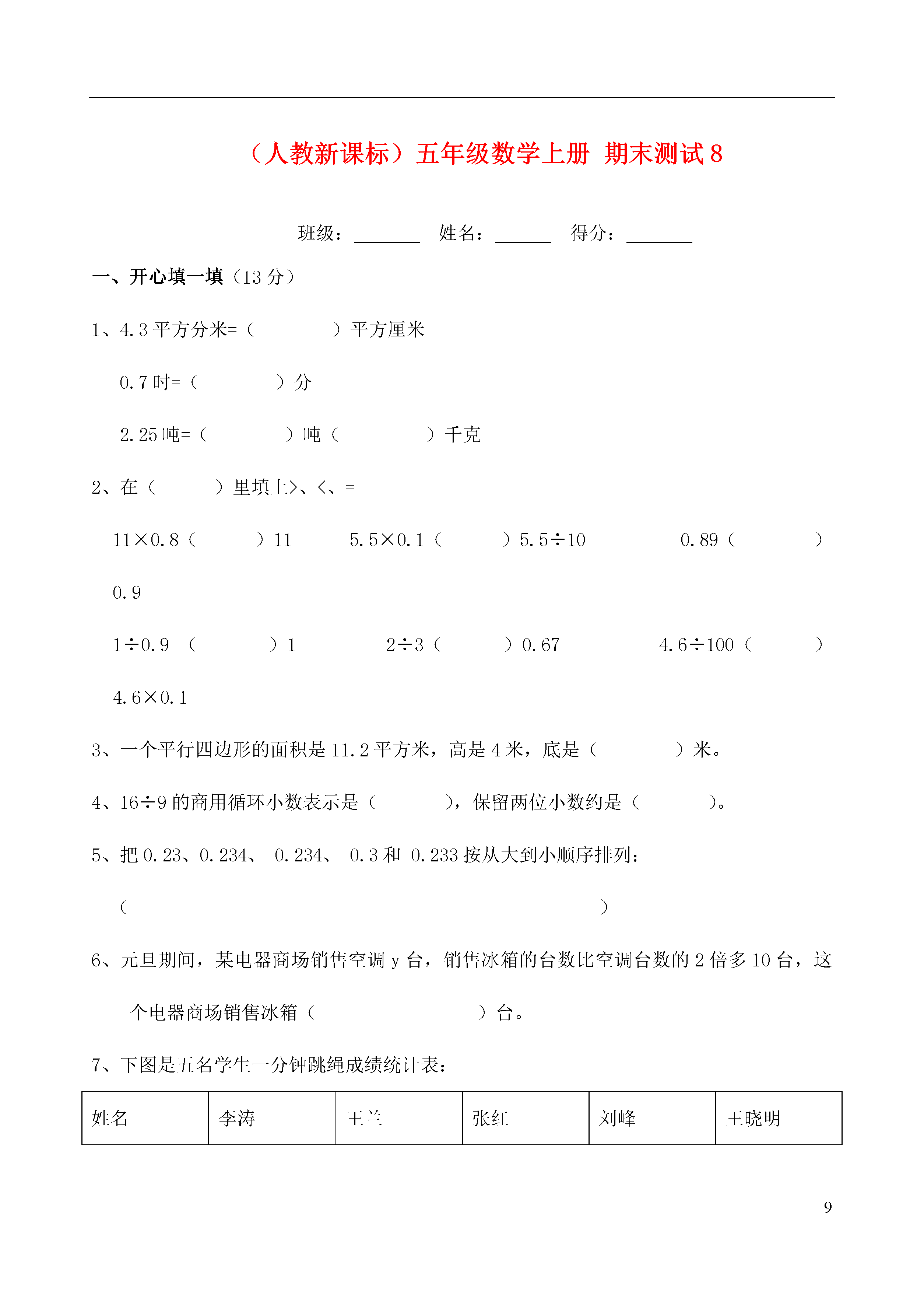 9(人教新课标)五年级数学上册期末测试8班级:姓名:得分:一、开心填一填(13分)1、4.3平方分米=()平方厘米0.7时=()分2.25吨=()吨()千克2、在()里填上>、<、=11×0.8()115.5×0.1()5.5÷100.89()0.91÷0.9()12÷3()0.674.6÷100()4.6×0.13、一个平行四边形的面积是11.2平方米,高是4米,底是()米。4、16÷9的商用循环小数表示是(),保留两位小数约是()。5、把0.23、0.234、0.234、0.3和0.233按从大到小顺序排列:()6、元旦期间,某电器商场销售空调y台,销售冰箱的台数比空调台数的2倍多10台,这个电器商场销售冰箱()台。7、下图是五名学生一分钟跳绳成绩统计表:姓名李涛王兰张红刘峰王晓明成绩13980788979⑴这组数据的平均数是()。⑵这组数据的中位数是()。⑶用()代表这五名学生跳绳的一般水平更合适。8、填身份证号码(张老师今年26周岁,今天是她的生日)2001年1月12星期日姓名:张敏相片姓别:女出生:□□□□年□□月□□日住址:××××××××××编码:340221□□□□□□□□3624(在□中填入合适的数字)9、已知a=5,b=0.4,c=21式子3a-6b+2c的值是()。10、有5张分别写着5、6、7、8、9的卡片,其中6是幸运号。⑴小红任意抽走一张,她抽到6的可能性是(),大于6的可能性是()。⑵若小吉抽走了5和9,剩下的由小红抽,她抽到6的可能性是()。二、法官判正误(对的打√,错的打×)(4分)1、χ=1.8是方程4χ+3.6=10.8的解。()2、面积相等的三角形,形状一定相同。()3、如果除数小于1,那么商比被除数(0除外)大。()4、把平行四边形木框拉成长方形,周长和面积都变大了。()三、细心选一选(将正确的答案序号填在括号里)(4分)1、三角形与平行四边形的底和面积都相等,已知平行四边形的高是8厘米,三角形的高是()。A4厘米B8厘米C16厘米2、下面图形中,()可以密铺。ABC3、如下图,在边长相等的四个正方形中,画了两个三角形(用阴影表示),这两个三角形的面积关系是()。AS1>S2BS1=S2CS1<S2S1S24、左图中从左面看是(),从正面看是(),从上面看是()。ABCD四、神机妙算1、竖式计算(每题2分)30.9×2.75.95÷27.6(得数保留两位小数)2、下面各题怎样算简便就怎样算。(每题3分)72.8÷5.6+14.95.4×12.3+5.4×7.742×101-4233.4+0.12×500.25×3.2×12.53.6÷1.5÷23、解下列方程(每题3分)⑴6χ+15×7=141⑵2χ÷2.8=8.2⑶1.4χ-0.7χ=564、只列式或方程不用计算。(每题2分)⑴36.8与8.8的差除5.6,商是多少?⑵一个数的2.5倍,比3.6多1.4,这个数是多少?5、计算下面组合图形面积。(3分)五、我来画一画。1、张斌和李娜用转盘做游戏,指针停在红色区域算小然赢,指针停在黄色区域算小东赢,请用你喜欢的颜色,按要求涂一涂转盘。(3分)使张斌赢的可能性大使李娜赢的可能性大这样涂最公平2、画一个三角形,并画出三角形的底边上的高,量出所需条件,计算出它的面积。(3分)3、在下面平行线上画两个面积相等的平行四边形。(2分)4、用你学过的平面图形,画一幅你喜欢的图画。(3分)六、走进生活1、按要求回答:⑴一条高速公路长336千米,一辆客车3.2小时行完全程,一辆货车用3.8小时行完全程,客车的速度比货车的速度快多少?(5分)关系式:()=要求客车的速度比货车的速度快多少,必须先算:列式不用计算:⑵学校美术小组有学生120人,比书法小组的人数的2倍多14人,书法小组有学生多少人?(4分)画出线段图:列式不用计算:2、只列式不计算(4分)(1)3辆汽车5天可以运送货物187.5吨,那么每辆汽车平均每天运多少吨?(2)每辆汽车每天可以运货12.5吨,3辆汽车5天可运多少吨货物?2、列式解答(1)一根6.4米长的彩带,每1.4米剪一段包扎一个礼盒,这根彩带可以包扎几个礼盒?(4分)(2)学校举行书画竞赛,四、五年级共有75人获奖,其中五年级获奖人山数是四年级的1.5倍,四、五年级各有多少同学获奖?(列方程解答)(4分)(3)一块梯形麦田,上底是76米,下底是120米,高50米,一共收小