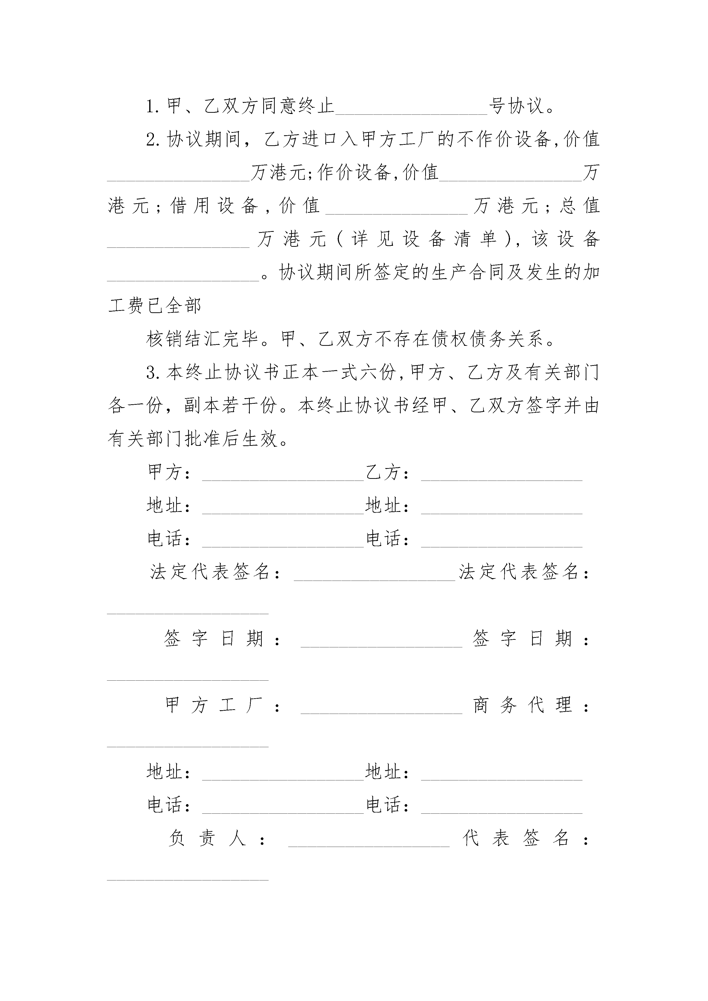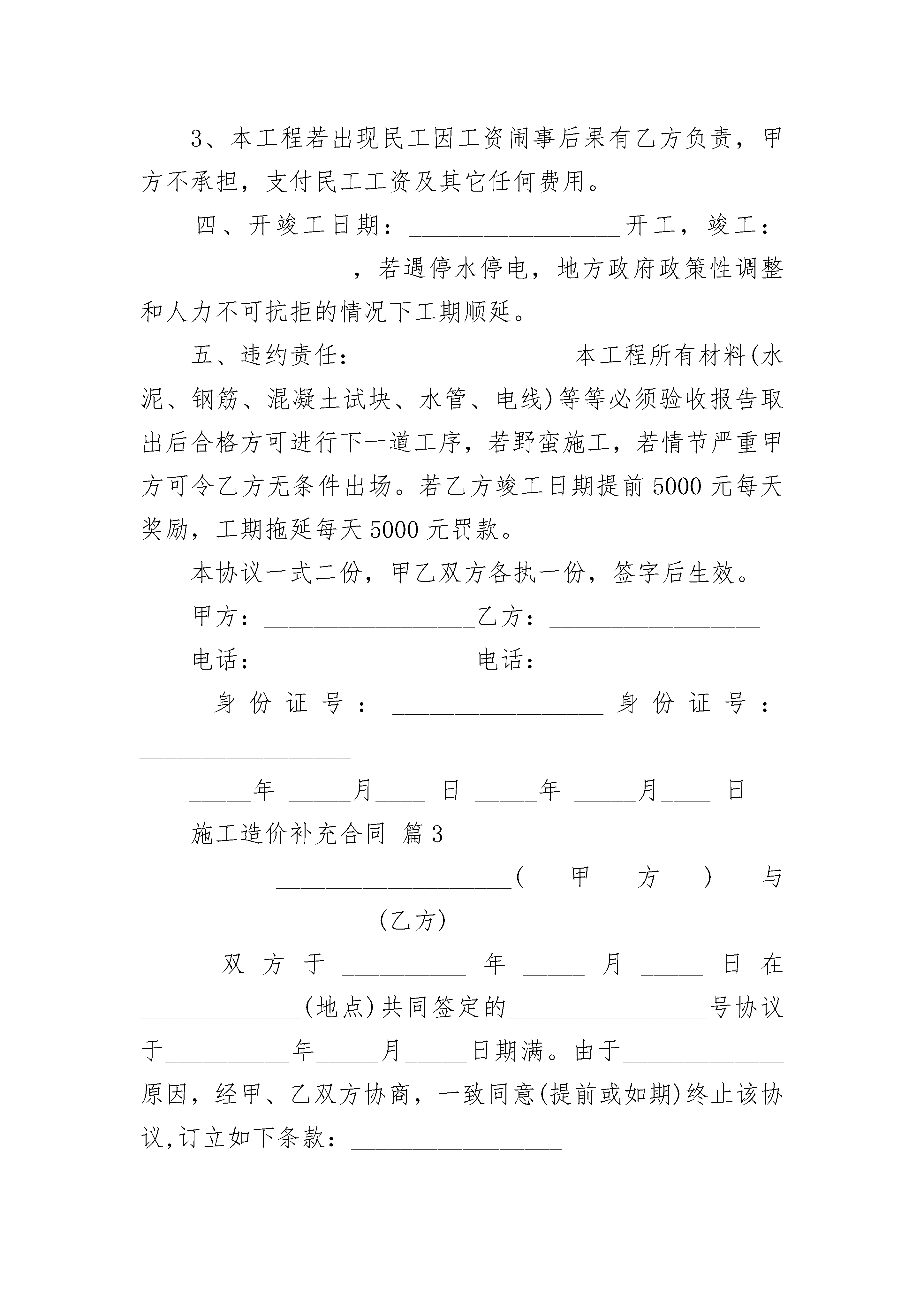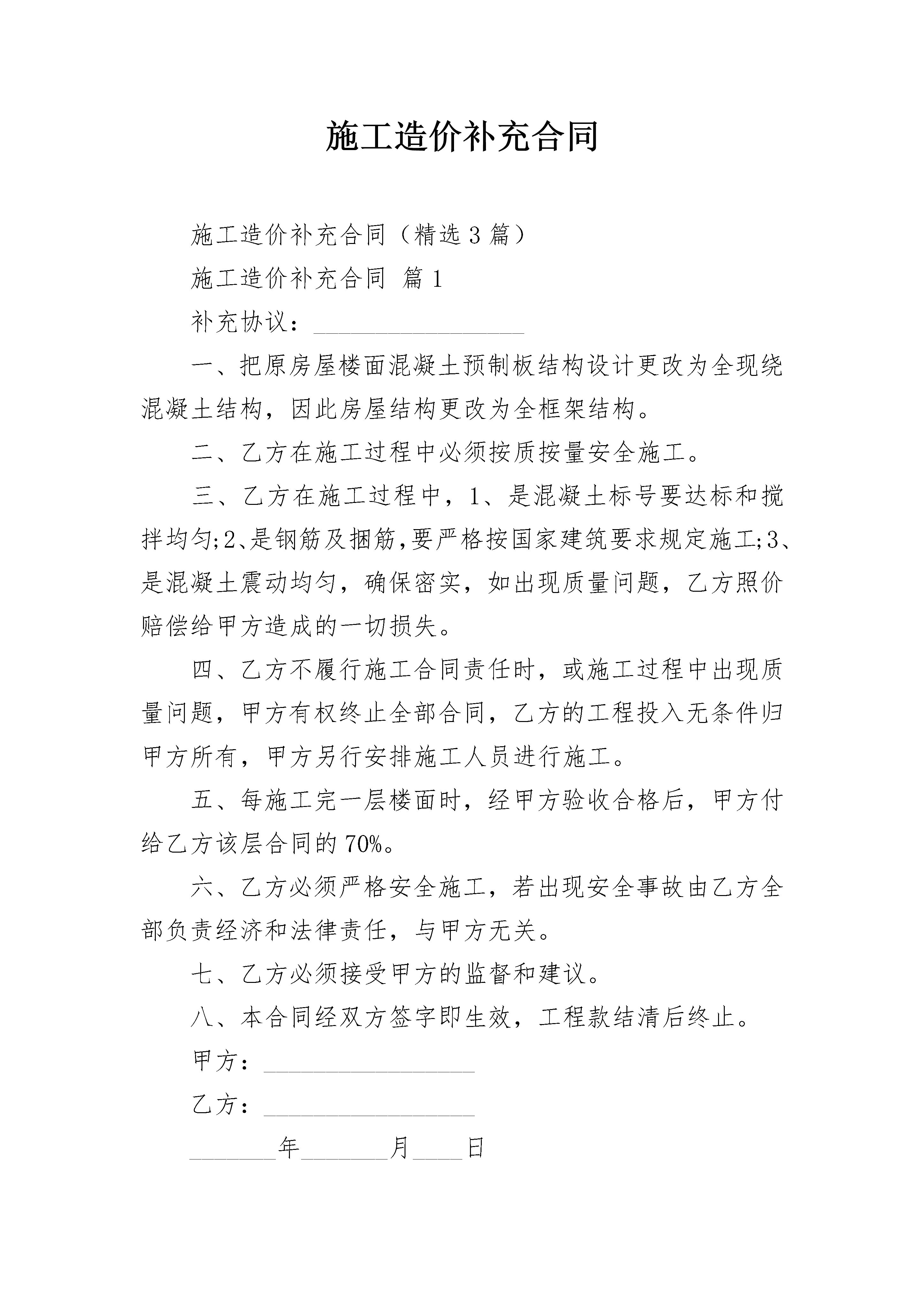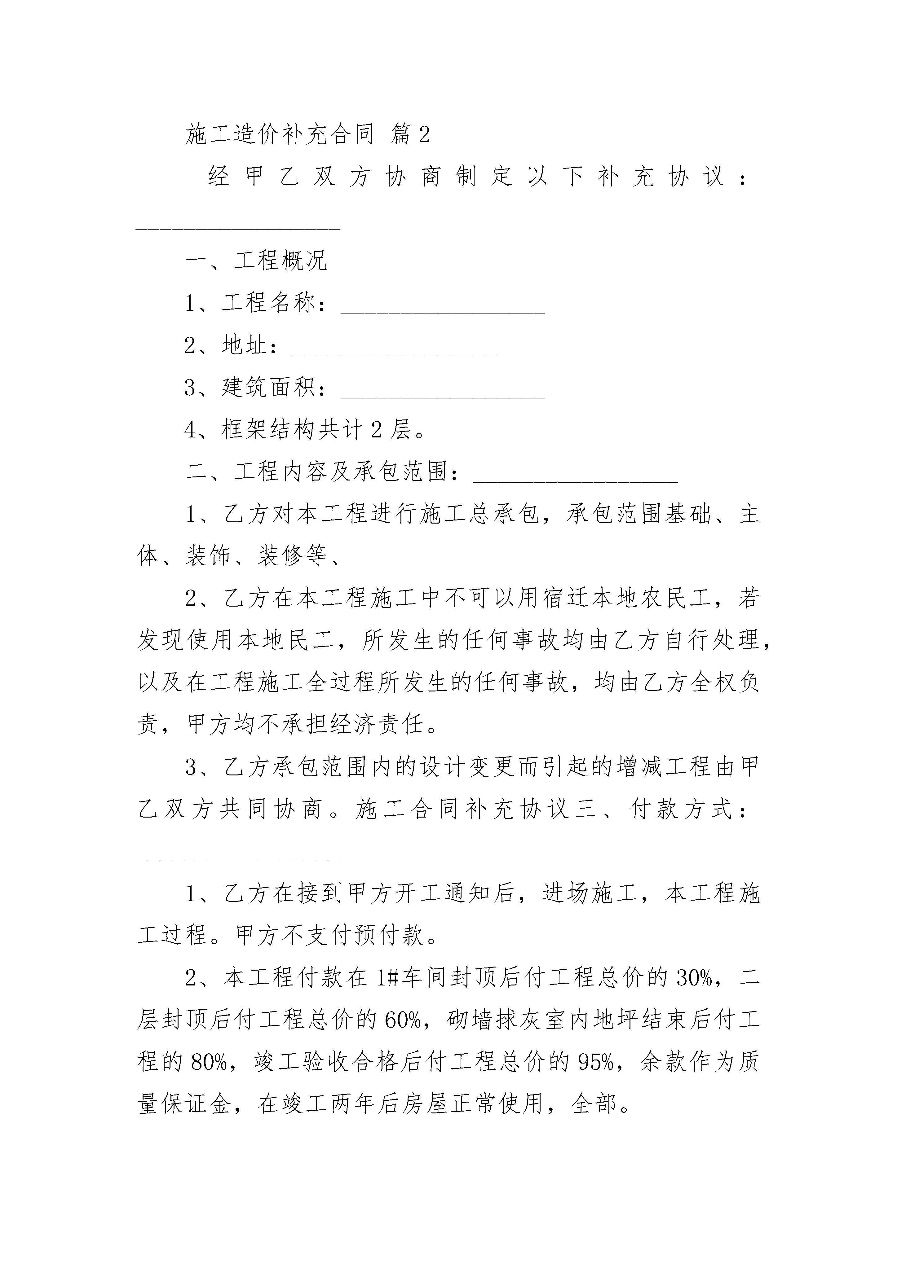 施工造价补充合同施工造价补充合同(精选3篇)施工造价补充合同篇1补充协议:_________________一、把原房屋楼面混凝土预制板结构设计更改为全现绕混凝土结构,因此房屋结构更改为全框架结构。二、乙方在施工过程中必须按质按量安全施工。三、乙方在施工过程中,1、是混凝土标号要达标和搅拌均匀;2、是钢筋及捆筋,要严格按国家建筑要求规定施工;3、是混凝土震动均匀,确保密实,如出现质量问题,乙方照价赔偿给甲方造成的一切损失。四、乙方不履行施工合同责任时,或施工过程中出现质量问题,甲方有权终止全部合同,乙方的工程投入无条件归甲方所有,甲方另行安排施工人员进行施工。五、每施工完一层楼面时,经甲方验收合格后,甲方付给乙方该层合同的70%。六、乙方必须严格安全施工,若出现安全事故由乙方全部负责经济和法律责任,与甲方无关。七、乙方必须接受甲方的监督和建议。八、本合同经双方签字即生效,工程款结清后终止。甲方:_________________乙方:________________________年_______月____日施工造价补充合同篇2经甲乙双方协商制定以下补充协议:_________________一、工程概况1、工程名称:_________________2、地址:_________________3、建筑面积:_________________4、框架结构共计2层。二、工程内容及承包范围:_________________1、乙方对本工程进行施工总承包,承包范围基础、主体、装饰、装修等、2、乙方在本工程施工中不可以用宿迁本地农民工,若发现使用本地民工,所发生的任何事故均由乙方自行处理,以及在工程施工全过程所发生的任何事故,均由乙方全权负责,甲方均不承担经济责任。3、乙方承包范围内的设计变更而引起的增减工程由甲乙双方共同协商。施工合同补充协议三、付款方式:_________________1、乙方在接到甲方开工通知后,进场施工,本工程施工过程。甲方不支付预付款。2、本工程付款在1#车间封顶后付工程总价的30%,二层封顶后付工程总价的60%,砌墙捄灰室内地坪结束后付工程的80%,竣工验收合格后付工程总价的95%,余款作为质量保证金,在竣工两年后房屋正常使用,全部。3、本工程若出现民工因工资闹事后果有乙方负责,甲方不承担,支付民工工资及其它任何费用。四、开竣工日期:_________________开工,竣工:_________________,若遇停水停电,地方政府政策性调整和人力不可抗拒的情况下工期顺延。五、违约责任:_________________本工程所有材料(水泥、钢筋、混凝土试块、水管、电线)等等必须验收报告取出后合格方可进行下一道工序,若野蛮施工,若情节严重甲方可令乙方无条件出场。若乙方竣工日期提前5000元每天奖励,工期拖延每天5000元罚款。本协议一式二份,甲乙双方各执一份,签字后生效。甲方:_________________乙方:_________________电话:_________________电话:_________________身份证号:_________________身份证号:______________________年_____月____日_____年_____月____日施工造价补充合同篇3___________________(甲方)与___________________(乙方)双方于__________年_____月_____日在_____________(地点)共同签定的________________号协议于__________年_____月_____日期满。由于_____________原因,经甲、乙双方协商,一致同意(提前或如期)终止该协议,订立如下条款:_________________1.甲、乙双方同意终止________________号协议。2.协议期间,乙方进口入甲方工厂的不作价设备,价值_______________万港元;作价设备,价值_______________万港元;借用设备,价值_______________万港元;总值_______________万港元(详见设备清单),该设备________________。协议期间所签定的生产合同及发生的加工费已全部核销结汇完毕。甲、乙双方不存在债权债务关系。3.本终止协议书正本一式六份,甲方、乙方及有关部门各一份,副本若干份。本终止协议书经甲、乙双方签字并由有关部门批准后生效。甲方:_________________乙方:_________________地址:_________________地址:_________________电话:_________________电话:_______________