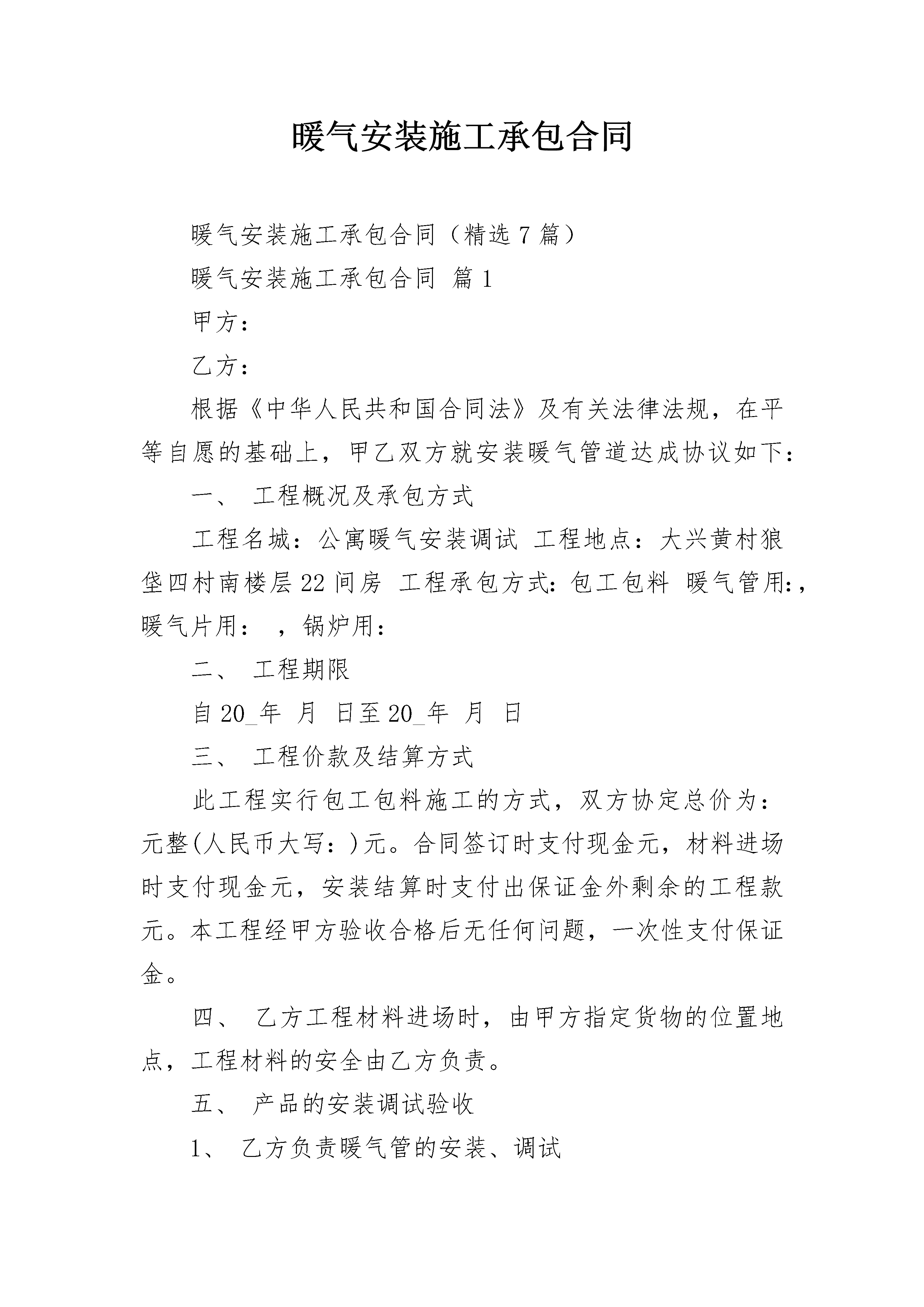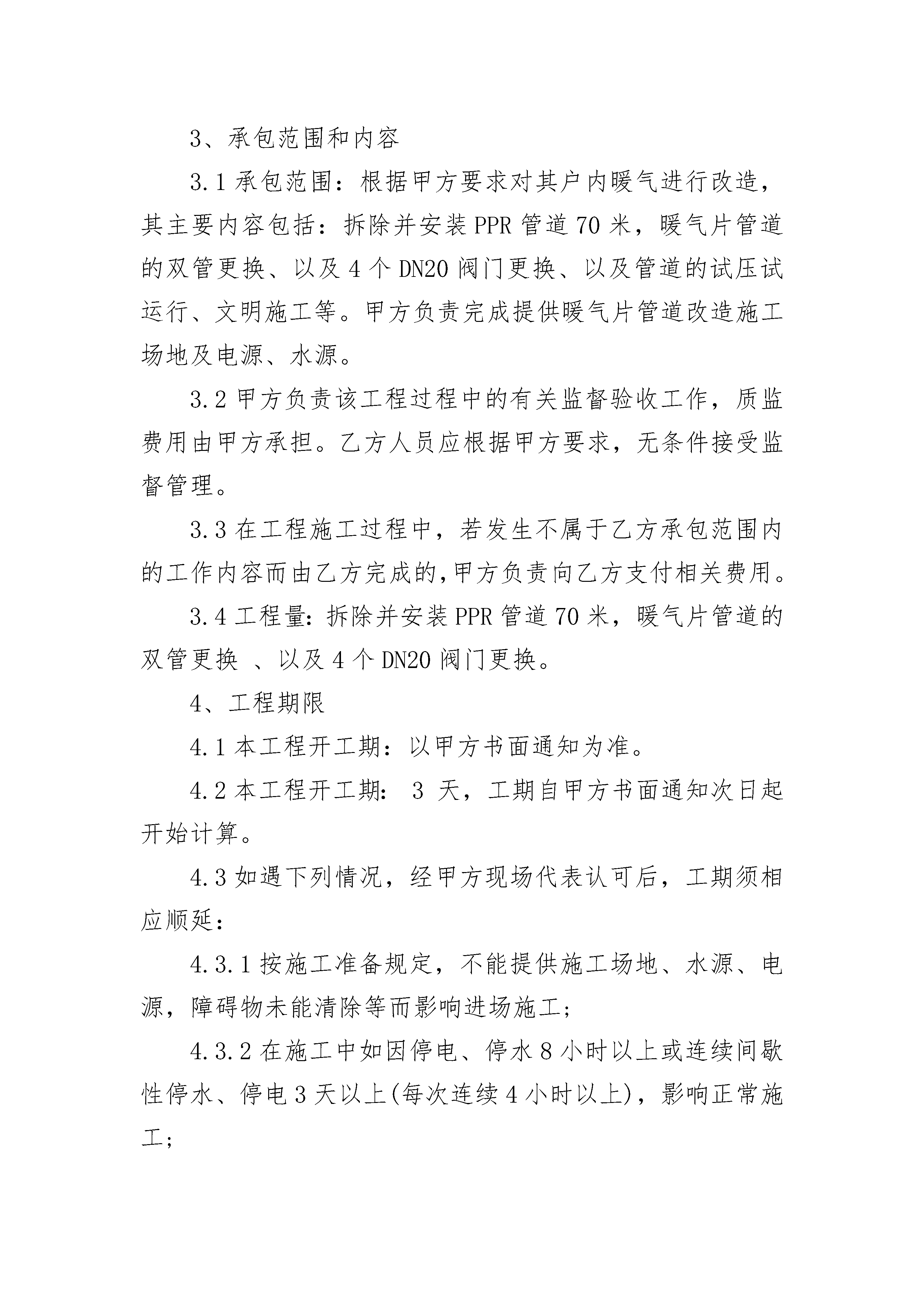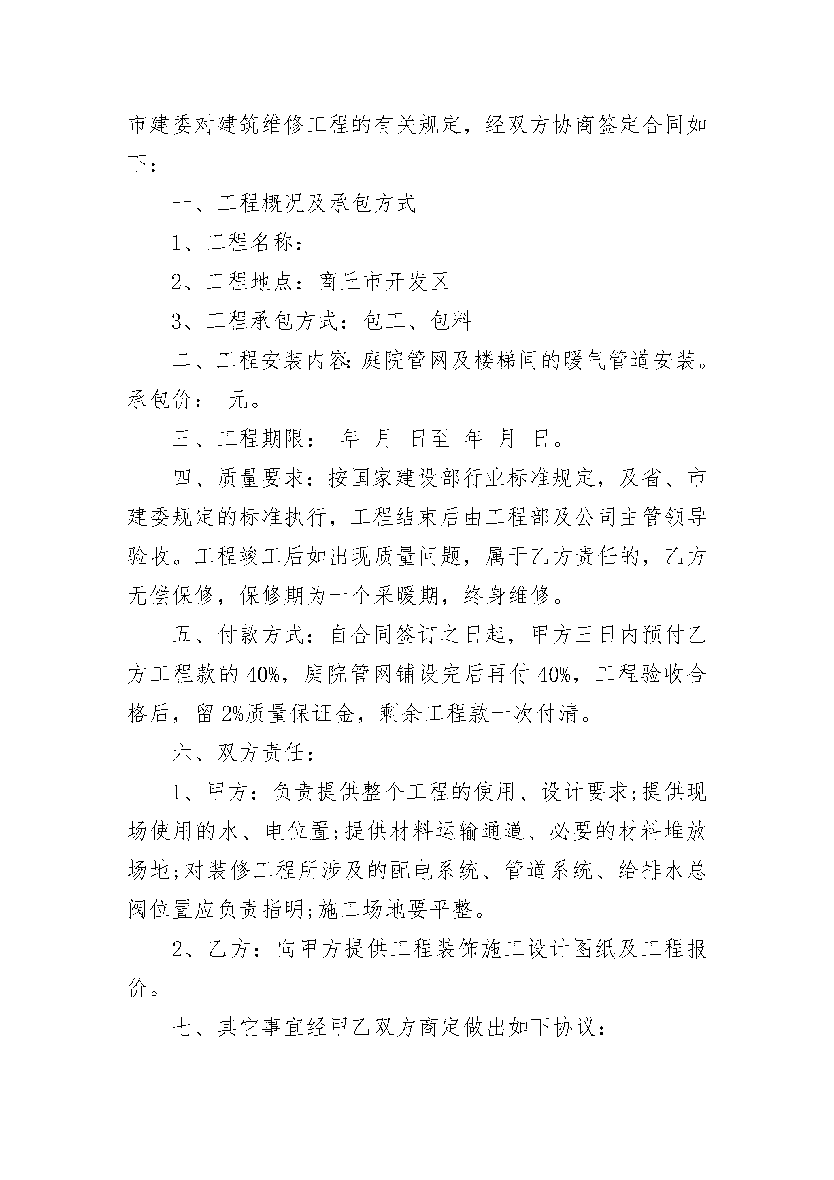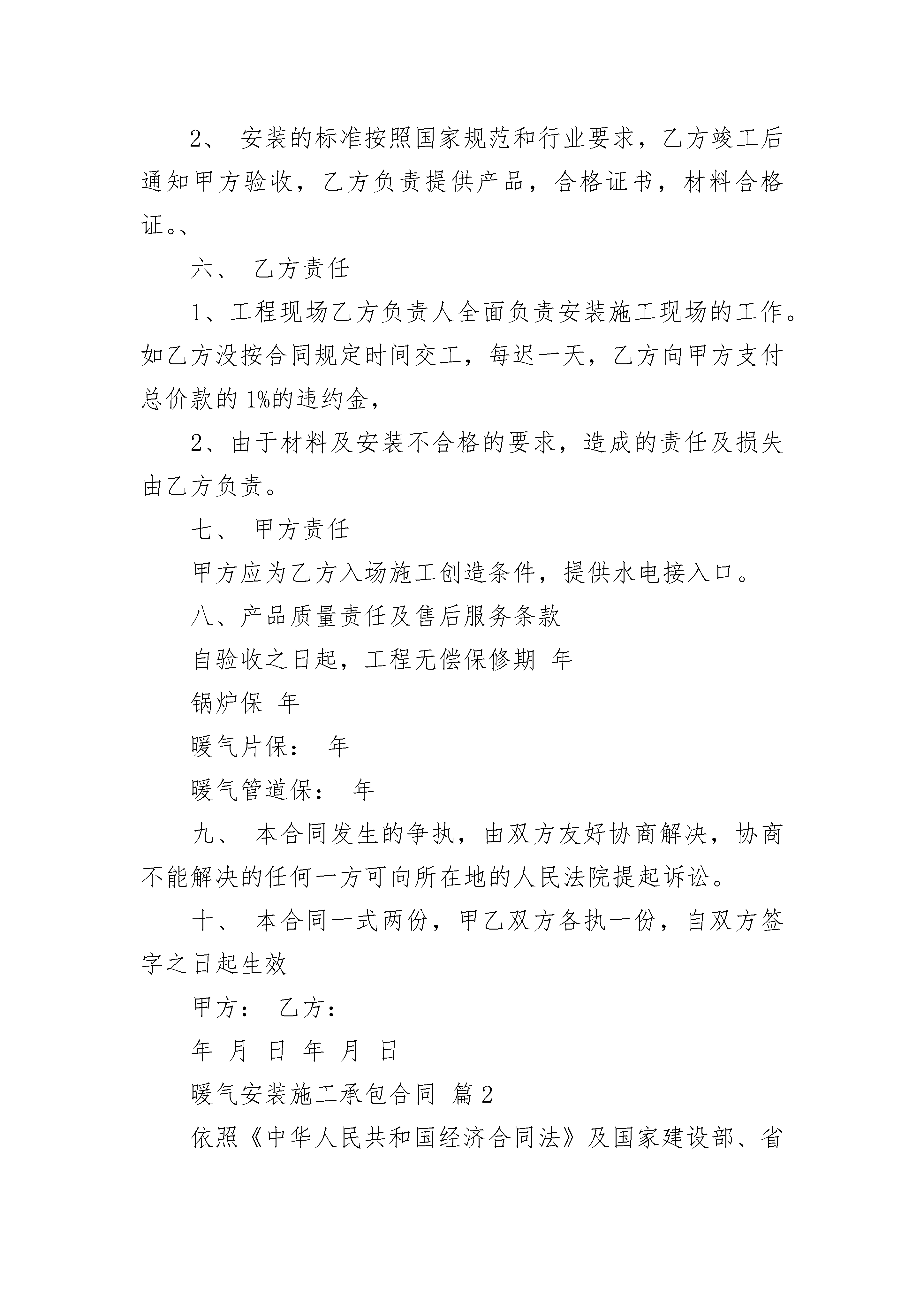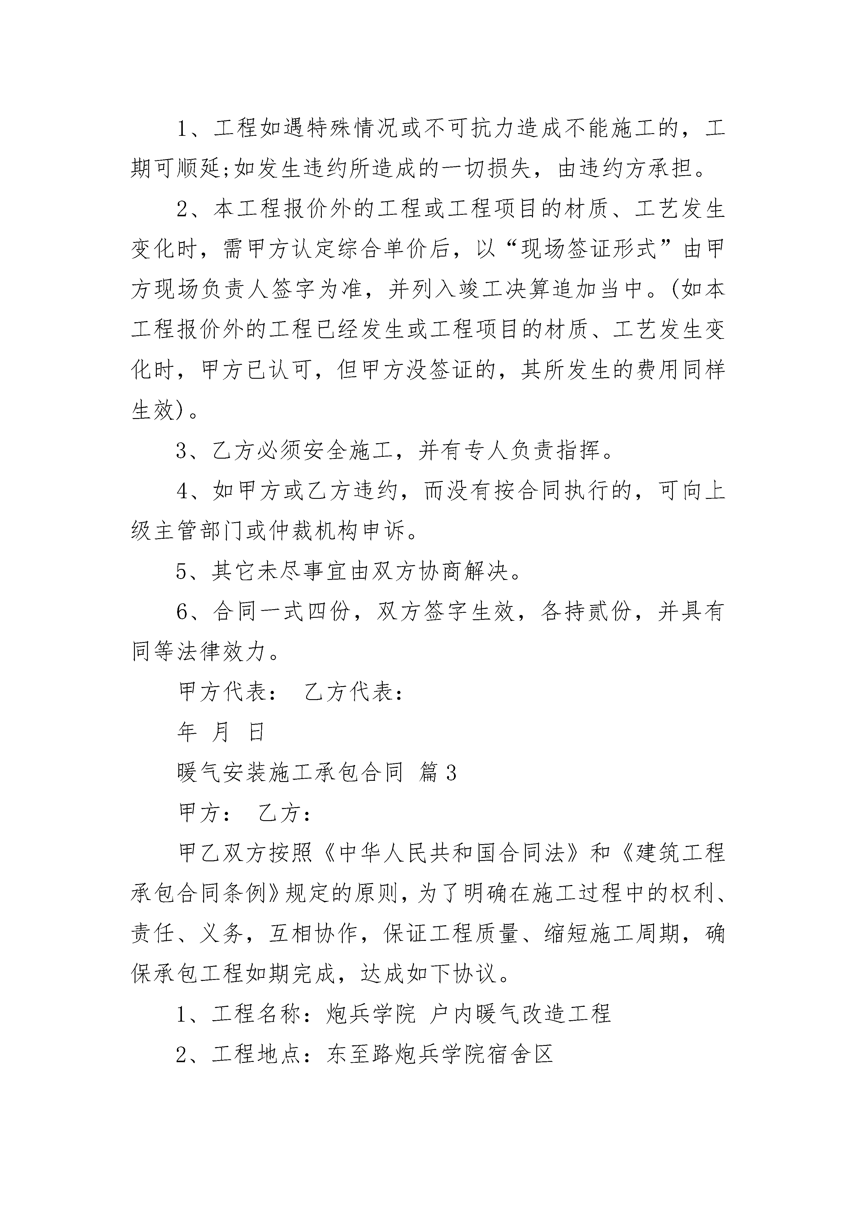 暖气安装施工承包合同暖气安装施工承包合同(精选7篇)暖气安装施工承包合同篇1甲方:乙方:根据《中华人民共和国合同法》及有关法律法规,在平等自愿的基础上,甲乙双方就安装暖气管道达成协议如下:一、工程概况及承包方式工程名城:公寓暖气安装调试工程地点:大兴黄村狼垡四村南楼层22间房工程承包方式:包工包料暖气管用:,暖气片用:,锅炉用:二、工程期限自20_年月日至20_年月日三、工程价款及结算方式此工程实行包工包料施工的方式,双方协定总价为:元整(人民币大写:)元。合同签订时支付现金元,材料进场时支付现金元,安装结算时支付出保证金外剩余的工程款元。本工程经甲方验收合格后无任何问题,一次性支付保证金。四、乙方工程材料进场时,由甲方指定货物的位置地点,工程材料的安全由乙方负责。五、产品的安装调试验收1、乙方负责暖气管的安装、调试2、安装的标准按照国家规范和行业要求,乙方竣工后通知甲方验收,乙方负责提供产品,合格证书,材料合格证。、六、乙方责任1、工程现场乙方负责人全面负责安装施工现场的工作。如乙方没按合同规定时间交工,每迟一天,乙方向甲方支付总价款的1%的违约金,2、由于材料及安装不合格的要求,造成的责任及损失由乙方负责。七、甲方责任甲方应为乙方入场施工创造条件,提供水电接入口。八、产品质量责任及售后服务条款自验收之日起,工程无偿保修期年锅炉保年暖气片保:年暖气管道保:年九、本合同发生的争执,由双方友好协商解决,协商不能解决的任何一方可向所在地的人民法院提起诉讼。十、本合同一式两份,甲乙双方各执一份,自双方签字之日起生效甲方:乙方:年月日年月日暖气安装施工承包合同篇2依照《中华人民共和国经济合同法》及国家建设部、省市建委对建筑维修工程的有关规定,经双方协商签定合同如下:一、工程概况及承包方式1、工程名称:2、工程地点:商丘市开发区3、工程承包方式:包工、包料二、工程安装内容:庭院管网及楼梯间的暖气管道安装。承包价:元。三、工程期限:年月日至年月日。四、质量要求:按国家建设部行业标准规定,及省、市建委规定的标准执行,工程结束后由工程部及公司主管领导验收。工程竣工后如出现质量问题,属于乙方责任的,乙方无偿保修,保修期为一个采暖期,终身维修。五、付款方式:自合同签订之日起,甲方三日内预付乙方工程款的40%,庭院管网铺设完后再付40%,工程验收合格后,留2%质量保证金,剩余工程款一次付清。六、双方责任:1、甲方:负责提供整个工程的使用、设计要求;提供现场使用的水、电位置;提供材料运输通道、必要的材料堆放场地;对装修工程所涉及的配电系统、管道系统、给排水总阀位置应负责指明;施工场地要平整。2、乙方:向甲方提供工程装饰施工设计图纸及工程报价。七、其它事宜经甲乙双方商定做出如下协议:1、工程如遇特殊情况或不可抗力造成不能施工的,工期可顺延;如发生违约所造成的一切损失,由违约方承担。2、本工程报价外的工程或工程项目的材质、工艺发生变化时,需甲方认定综合单价后,以“现场签证形式”由甲方现场负责人签字为准,并列入竣工决算追加当中。(如本工程报价外的工程已经发生或工程项目的材质、工艺发生变化时,甲方已认可,但甲方没签证的,其所发生的费用同样生效)。3、乙方必须安全施工,并有专人负责指挥。4、如甲方或乙方违约,而没有按合同执行的,可向上级主管部门或仲裁机构申诉。5、其它未尽事宜由双方协商解决。6、合同一式四份,双方签字生效,各持贰份,并具有同等法律效力。甲方代表:乙方代表:年月日暖气安装施工承包合同篇3甲方:乙方:甲乙双方按照《中华人民共和国合同法》和《建筑工程承包合同条例》规定的原则,为了明确在施工过程中的权利、责任、义务,互相协作,保证工程质量、缩短施工周期,确保承包工程如期完成,达成如下协议。1、工程名称:炮兵学院户内暖气改造工程2、工程地点:东至路炮兵学院宿舍区3、承包范围和内容3.1承包范围:根据甲方要求对其户内暖气进行改造,其主要内容包括:拆除并安装PPR管道70米,暖气片管道的双管更换、以及4个DN20阀门更换、以及管道的试压试运行、文明施工等。甲方负责完成提供暖气片管道改造施工场地及电源、水源。3.2甲方负责该工程过程中的有关监督验收工作,质监费用由甲方承担。乙方人员应根据甲方要求,无条件接受监督管理。3.3在工程施工过程中,若发生不属于乙方承包范围内的工作内容而由乙方完成的,甲方负责向乙方支付相关费用。3.4工程量:拆除并安装PPR管道70米,暖气片管道的双管更换、以及4个DN20阀门更换。4、工程期限4.1本工程开工期:以甲方书面通知为准。4.2本工程开工期:3天,工期自甲方书面通知次日起开始计算。4.3如遇下列情况,经甲方现场代表认可后,工期须相应顺延:4.3.1按施工准备规定,不能提供施工场地、水源、电源,障碍物未能清除等而影响进场施