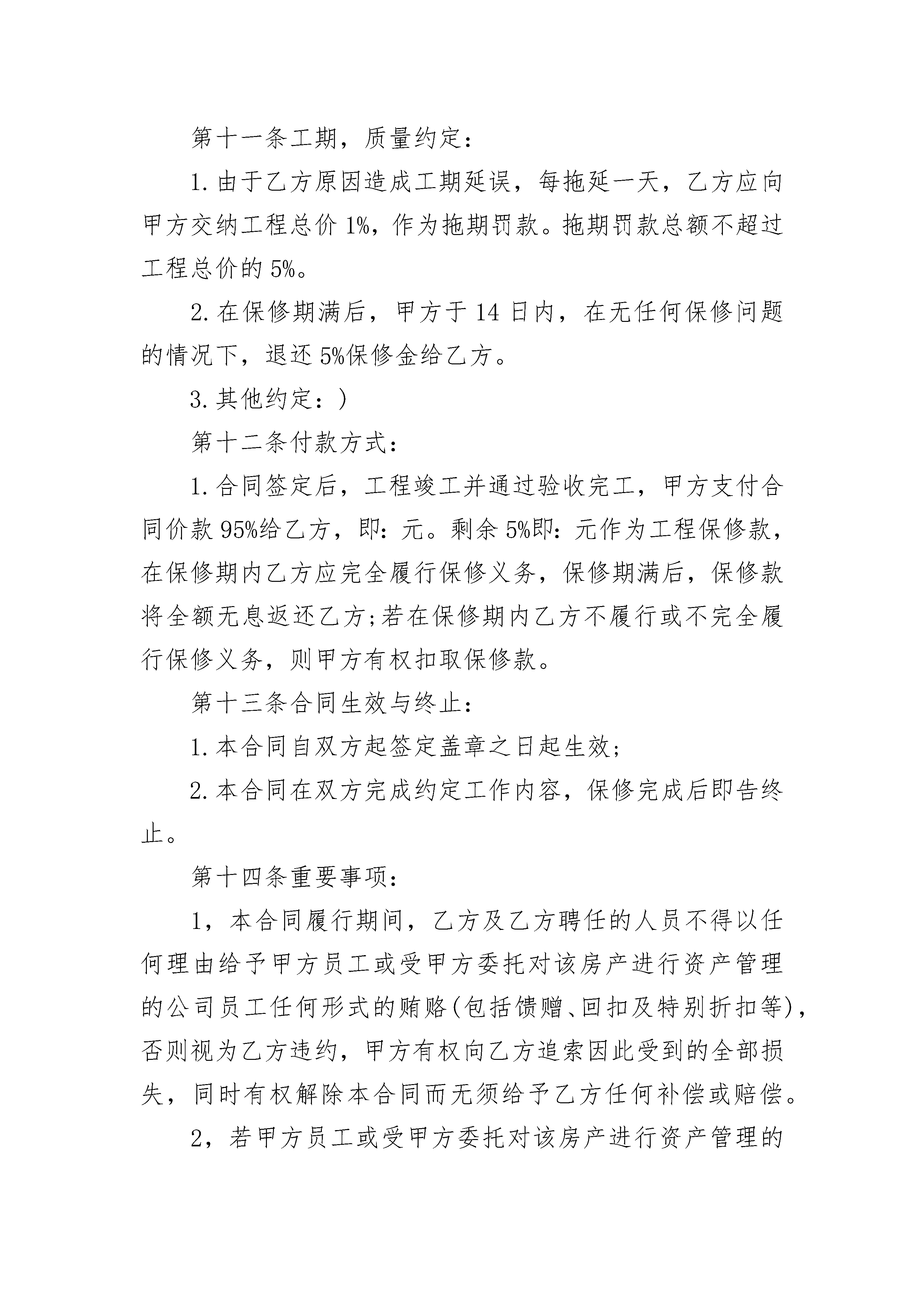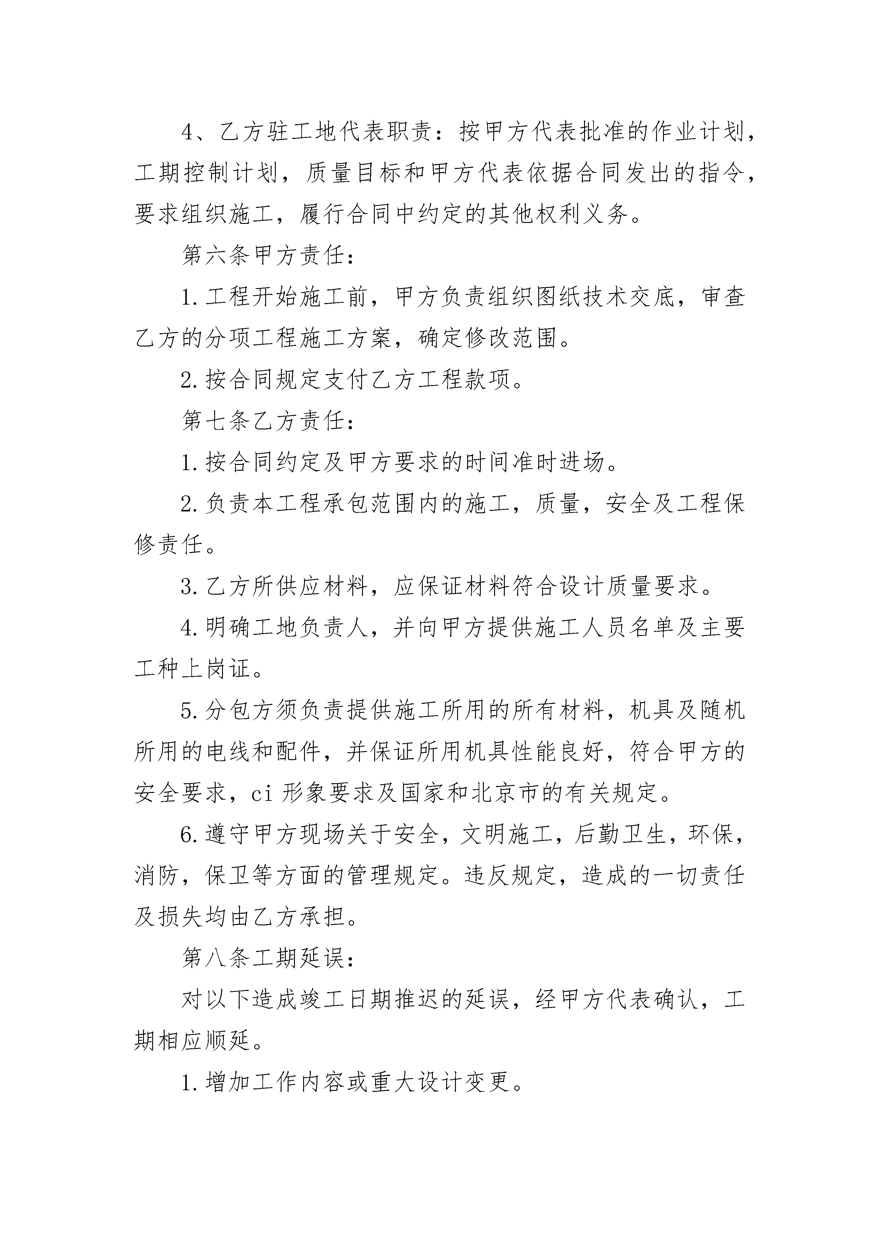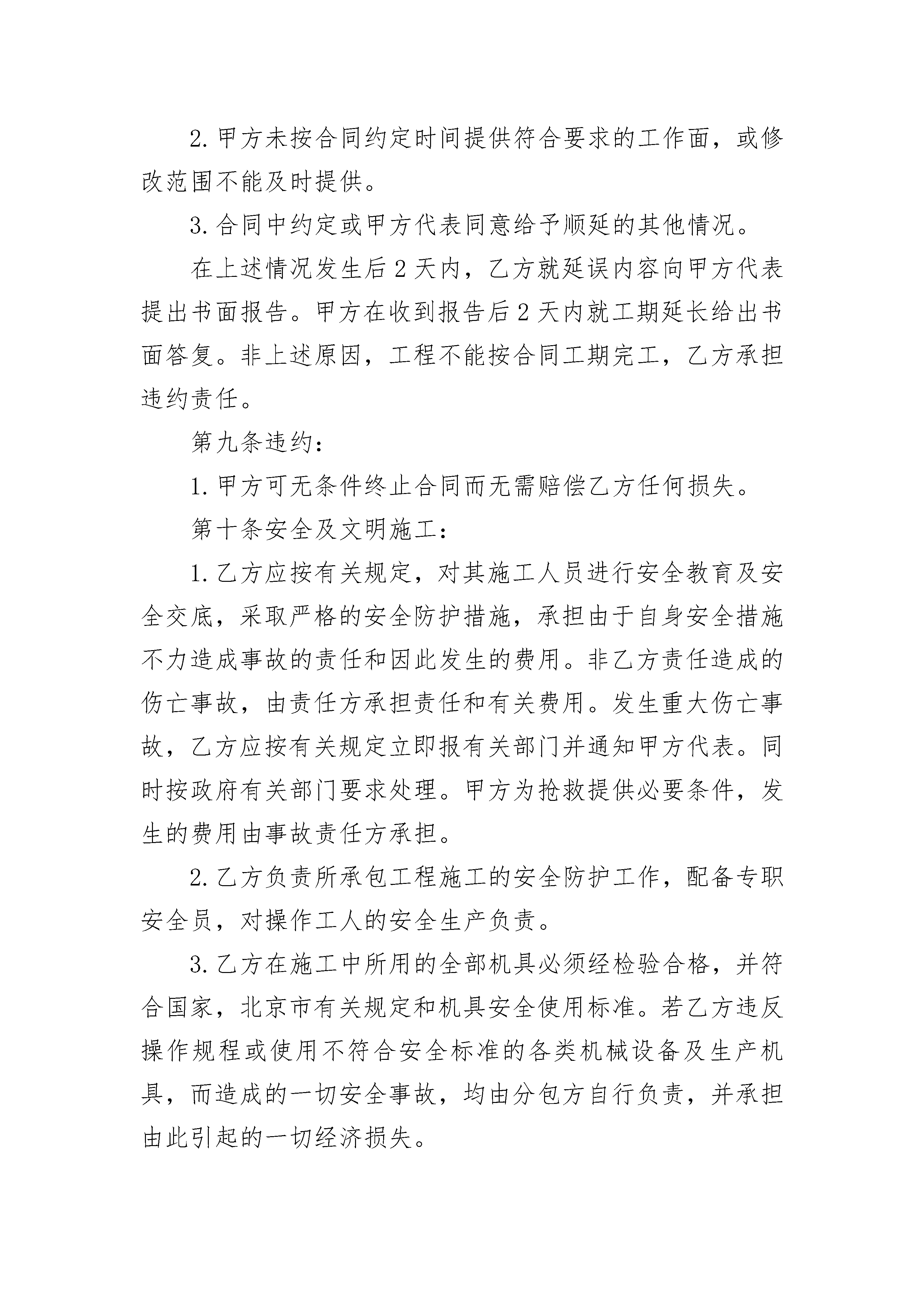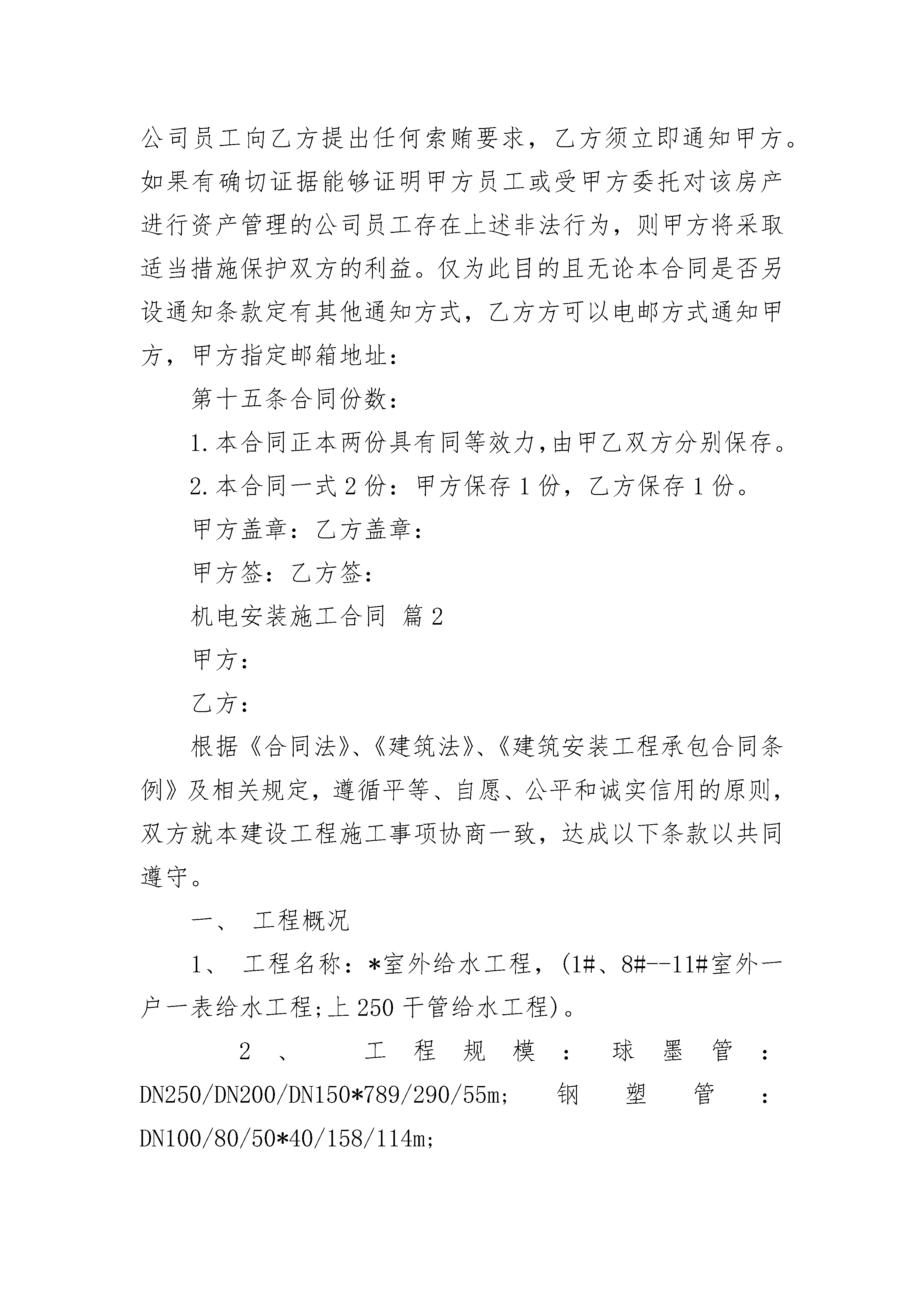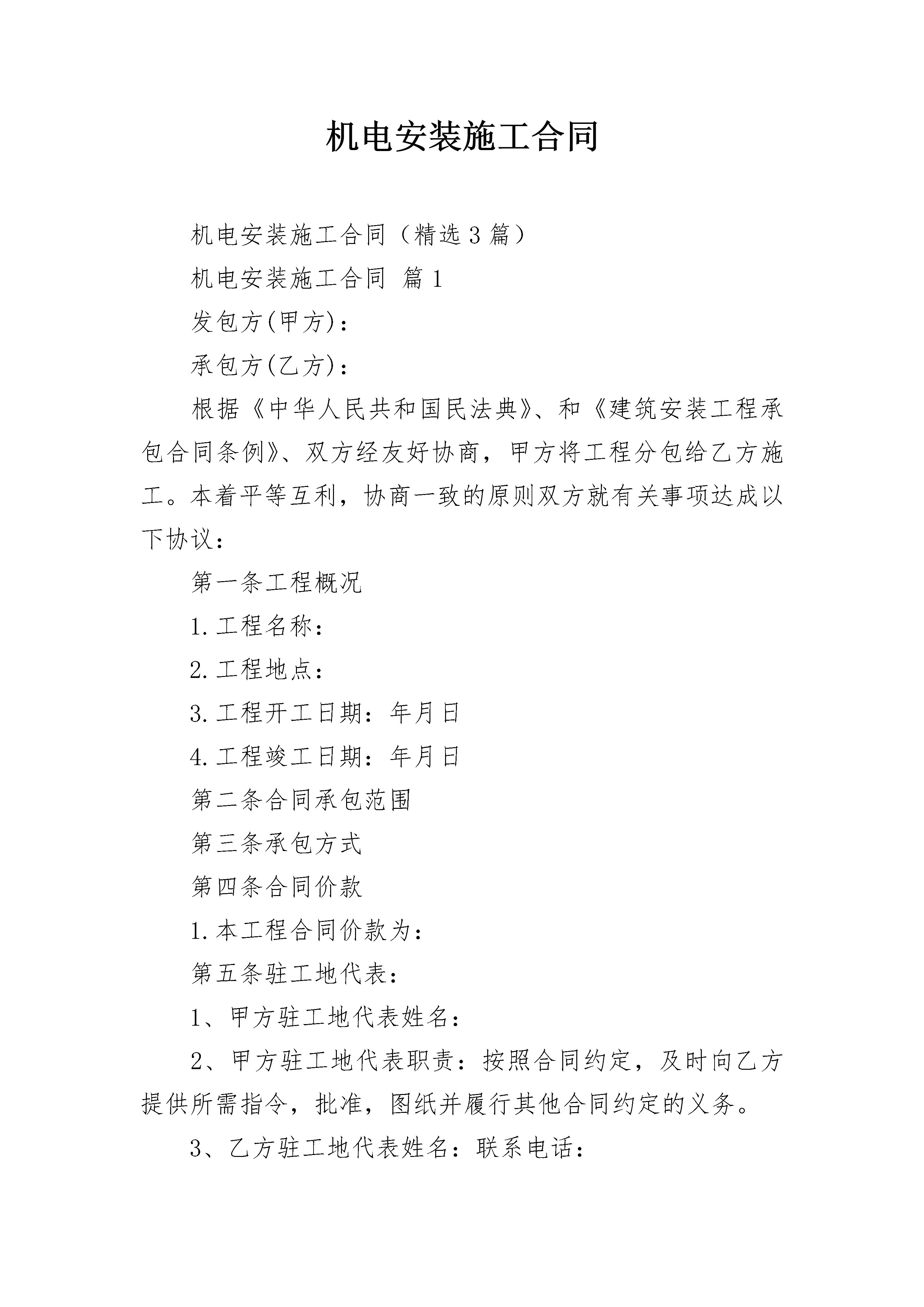 机电安装施工合同机电安装施工合同(精选3篇)机电安装施工合同篇1发包方(甲方):承包方(乙方):根据《中华人民共和国民法典》、和《建筑安装工程承包合同条例》、双方经友好协商,甲方将工程分包给乙方施工。本着平等互利,协商一致的原则双方就有关事项达成以下协议:第一条工程概况1.工程名称:2.工程地点:3.工程开工日期:年月日4.工程竣工日期:年月日第二条合同承包范围第三条承包方式第四条合同价款1.本工程合同价款为:第五条驻工地代表:1、甲方驻工地代表姓名:2、甲方驻工地代表职责:按照合同约定,及时向乙方提供所需指令,批准,图纸并履行其他合同约定的义务。3、乙方驻工地代表姓名:联系电话:4、乙方驻工地代表职责:按甲方代表批准的作业计划,工期控制计划,质量目标和甲方代表依据合同发出的指令,要求组织施工,履行合同中约定的其他权利义务。第六条甲方责任:1.工程开始施工前,甲方负责组织图纸技术交底,审查乙方的分项工程施工方案,确定修改范围。2.按合同规定支付乙方工程款项。第七条乙方责任:1.按合同约定及甲方要求的时间准时进场。2.负责本工程承包范围内的施工,质量,安全及工程保修责任。3.乙方所供应材料,应保证材料符合设计质量要求。4.明确工地负责人,并向甲方提供施工人员名单及主要工种上岗证。5.分包方须负责提供施工所用的所有材料,机具及随机所用的电线和配件,并保证所用机具性能良好,符合甲方的安全要求,ci形象要求及国家和北京市的有关规定。6.遵守甲方现场关于安全,文明施工,后勤卫生,环保,消防,保卫等方面的管理规定。违反规定,造成的一切责任及损失均由乙方承担。第八条工期延误:对以下造成竣工日期推迟的延误,经甲方代表确认,工期相应顺延。1.增加工作内容或重大设计变更。2.甲方未按合同约定时间提供符合要求的工作面,或修改范围不能及时提供。3.合同中约定或甲方代表同意给予顺延的其他情况。在上述情况发生后2天内,乙方就延误内容向甲方代表提出书面报告。甲方在收到报告后2天内就工期延长给出书面答复。非上述原因,工程不能按合同工期完工,乙方承担违约责任。第九条违约:1.甲方可无条件终止合同而无需赔偿乙方任何损失。第十条安全及文明施工:1.乙方应按有关规定,对其施工人员进行安全教育及安全交底,采取严格的安全防护措施,承担由于自身安全措施不力造成事故的责任和因此发生的费用。非乙方责任造成的伤亡事故,由责任方承担责任和有关费用。发生重大伤亡事故,乙方应按有关规定立即报有关部门并通知甲方代表。同时按政府有关部门要求处理。甲方为抢救提供必要条件,发生的费用由事故责任方承担。2.乙方负责所承包工程施工的安全防护工作,配备专职安全员,对操作工人的安全生产负责。3.乙方在施工中所用的全部机具必须经检验合格,并符合国家,北京市有关规定和机具安全使用标准。若乙方违反操作规程或使用不符合安全标准的各类机械设备及生产机具,而造成的一切安全事故,均由分包方自行负责,并承担由此引起的一切经济损失。第十一条工期,质量约定:1.由于乙方原因造成工期延误,每拖延一天,乙方应向甲方交纳工程总价1%,作为拖期罚款。拖期罚款总额不超过工程总价的5%。2.在保修期满后,甲方于14日内,在无任何保修问题的情况下,退还5%保修金给乙方。3.其他约定:)第十二条付款方式:1.合同签定后,工程竣工并通过验收完工,甲方支付合同价款95%给乙方,即:元。剩余5%即:元作为工程保修款,在保修期内乙方应完全履行保修义务,保修期满后,保修款将全额无息返还乙方;若在保修期内乙方不履行或不完全履行保修义务,则甲方有权扣取保修款。第十三条合同生效与终止:1.本合同自双方起签定盖章之日起生效;2.本合同在双方完成约定工作内容,保修完成后即告终止。第十四条重要事项:1,本合同履行期间,乙方及乙方聘任的人员不得以任何理由给予甲方员工或受甲方委托对该房产进行资产管理的公司员工任何形式的贿赂(包括馈赠、回扣及特别折扣等),否则视为乙方违约,甲方有权向乙方追索因此受到的全部损失,同时有权解除本合同而无须给予乙方任何补偿或赔偿。2,若甲方员工或受甲方委托对该房产进行资产管理的公司员工向乙方提出任何索贿要求,乙方须立即通知甲方。如果有确切证据能够证明甲方员工或受甲方委托对该房产进行资产管理的公司员工存在上述非法行为,则甲方将采取适当措施保护双方的利益。仅为此目的且无论本合同是否另设通知条款定有其他通知方式,乙方方可以电邮方式通知甲方,甲方指定邮箱地址:第十五条合同份数:1.本合同正本两份具有同等效力,由甲乙双方分别保存。2.本合同一式2份:甲方保存1份,乙方保存1份。甲方盖章:乙方盖章:甲方签:乙方签:机电安装施工合同篇2甲方:乙方:根据《合同法》、《建筑法》、《建筑安装工程承包合同条例》及相关规定,遵循平等、自愿、公平和诚实信用