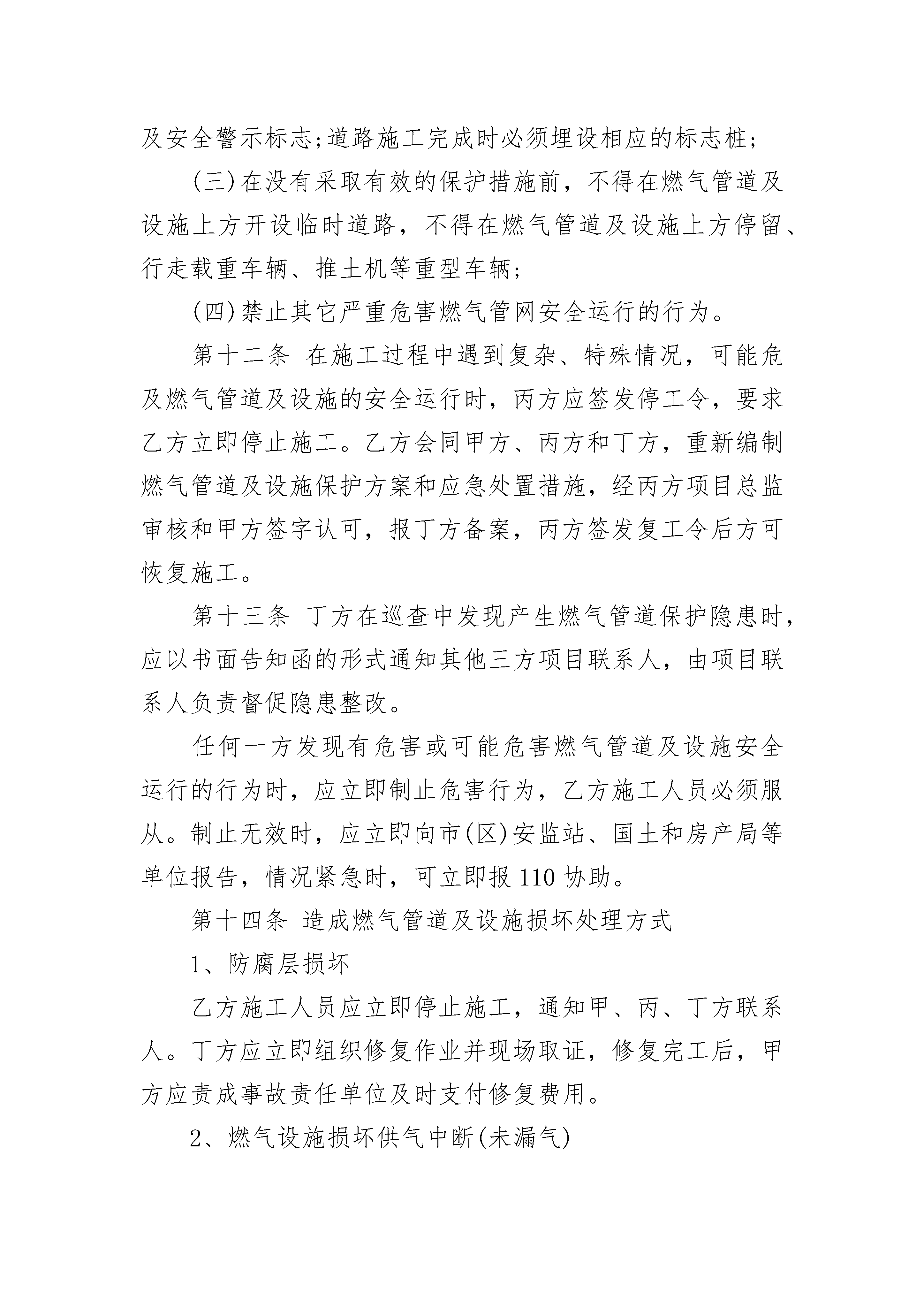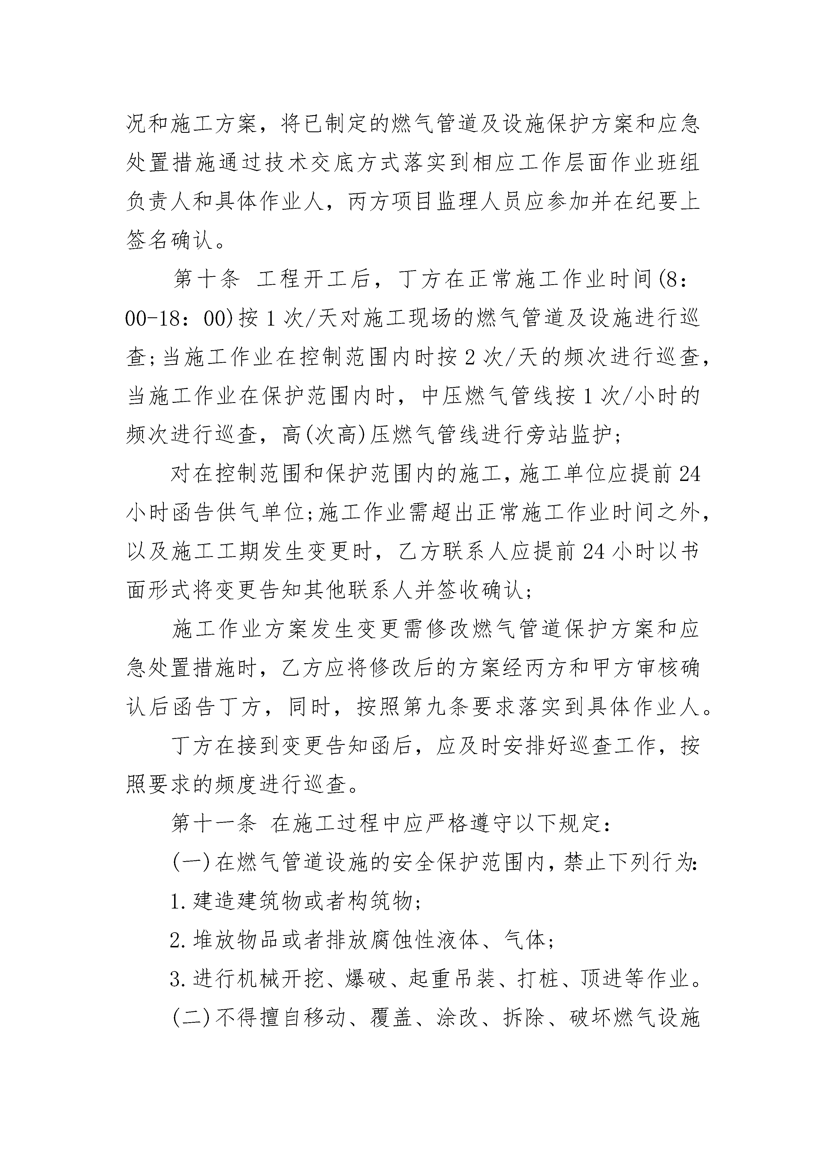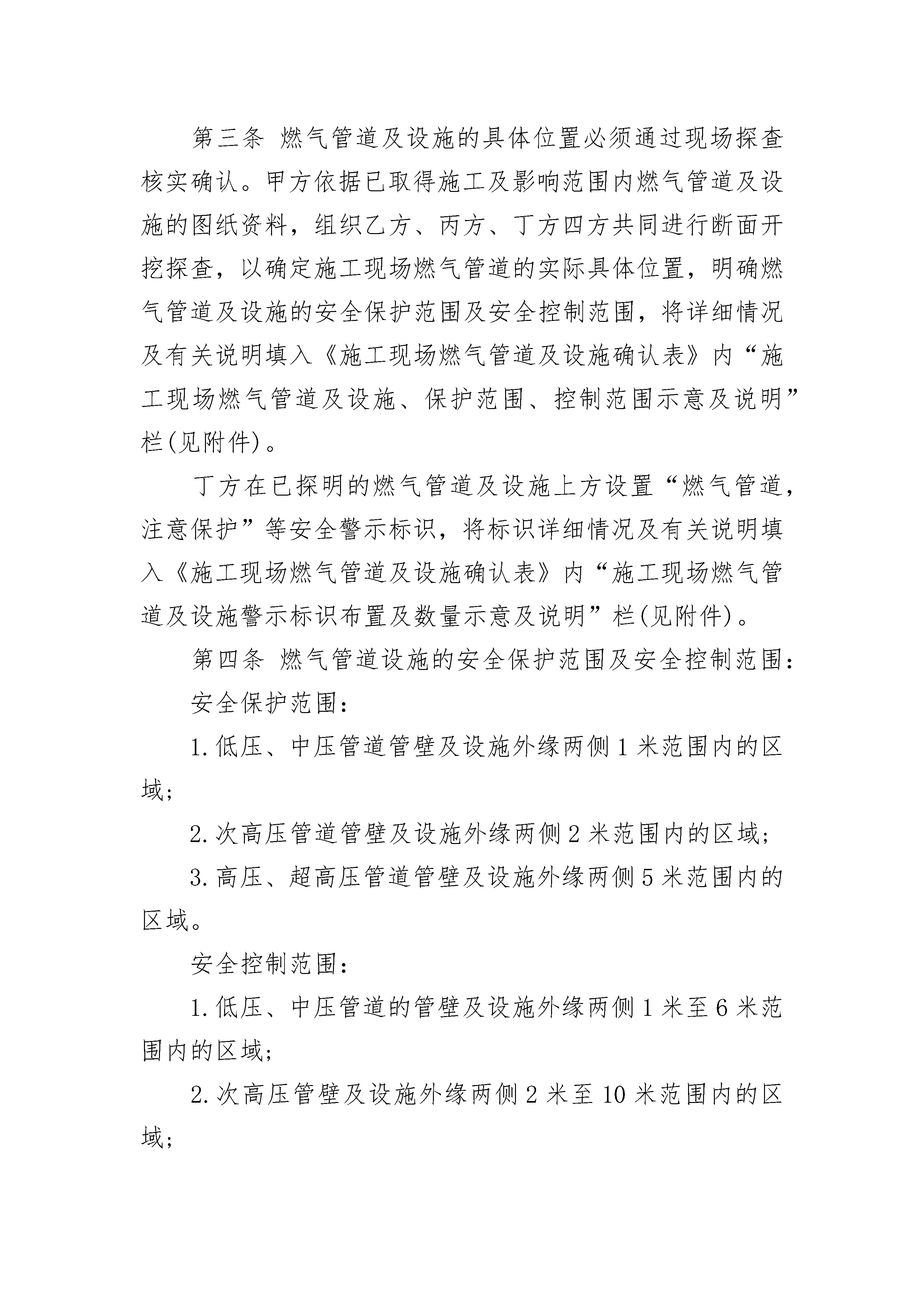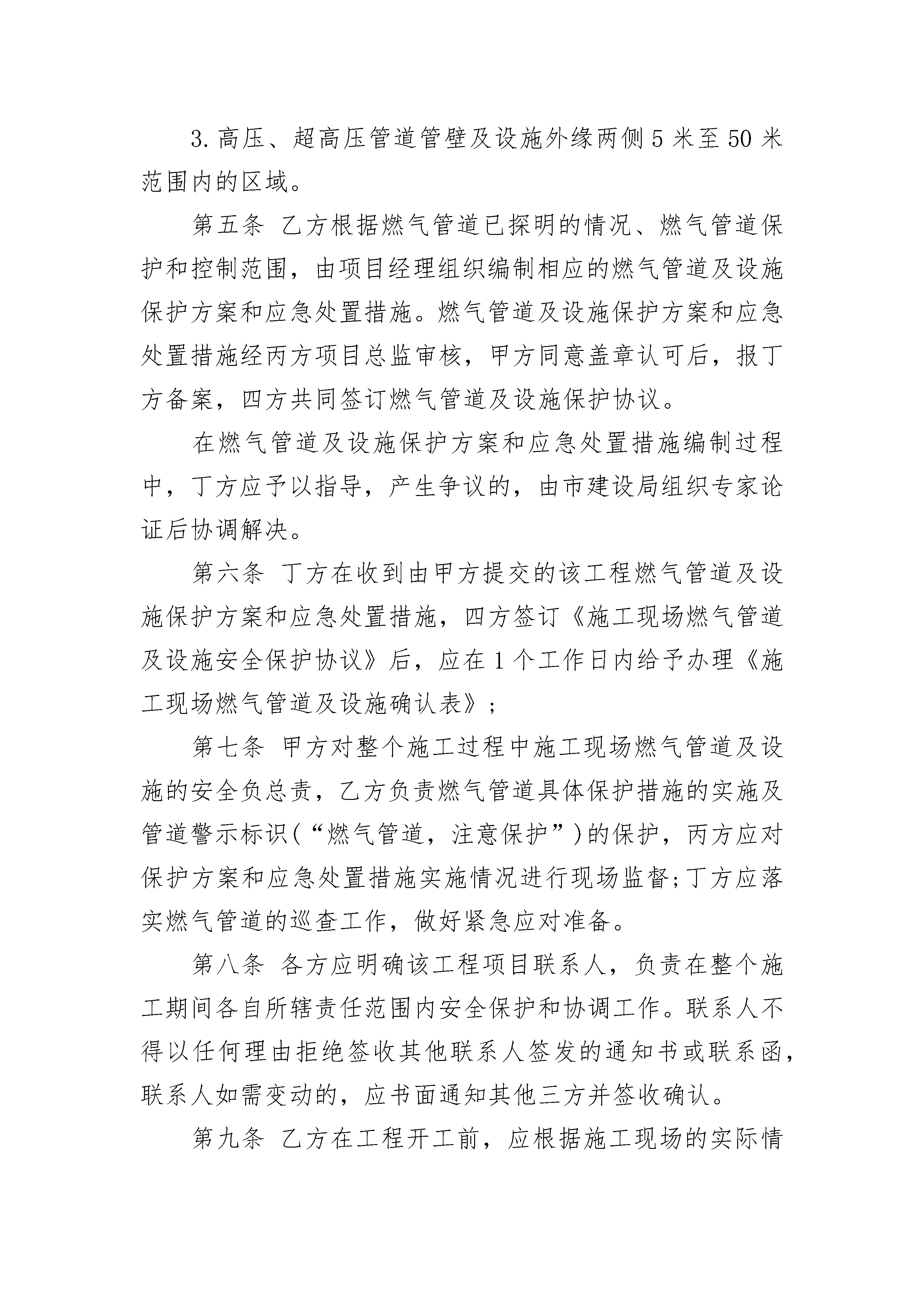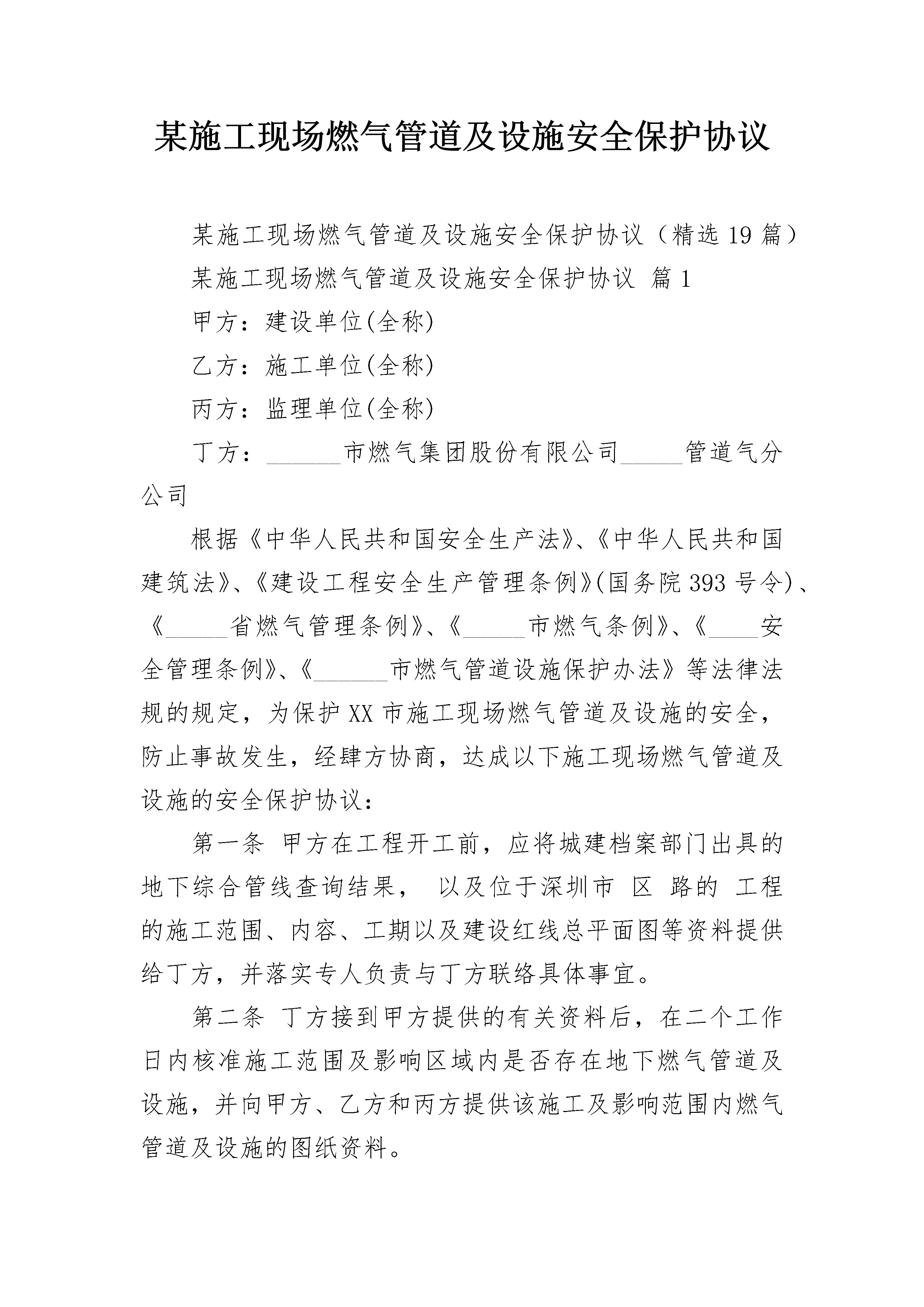 某施工现场燃气管道及设施安全保护协议某施工现场燃气管道及设施安全保护协议(精选19篇)某施工现场燃气管道及设施安全保护协议篇1甲方:建设单位(全称)乙方:施工单位(全称)丙方:监理单位(全称)丁方:______市燃气集团股份有限公司_____管道气分公司根据《中华人民共和国安全生产法》、《中华人民共和国建筑法》、《建设工程安全生产管理条例》(国务院393号令)、《_____省燃气管理条例》、《_____市燃气条例》、《____安全管理条例》、《______市燃气管道设施保护办法》等法律法规的规定,为保护XX市施工现场燃气管道及设施的安全,防止事故发生,经肆方协商,达成以下施工现场燃气管道及设施的安全保护协议:第一条甲方在工程开工前,应将城建档案部门出具的地下综合管线查询结果,以及位于深圳市区路的工程的施工范围、内容、工期以及建设红线总平面图等资料提供给丁方,并落实专人负责与丁方联络具体事宜。第二条丁方接到甲方提供的有关资料后,在二个工作日内核准施工范围及影响区域内是否存在地下燃气管道及设施,并向甲方、乙方和丙方提供该施工及影响范围内燃气管道及设施的图纸资料。第三条燃气管道及设施的具体位置必须通过现场探查核实确认。甲方依据已取得施工及影响范围内燃气管道及设施的图纸资料,组织乙方、丙方、丁方四方共同进行断面开挖探查,以确定施工现场燃气管道的实际具体位置,明确燃气管道及设施的安全保护范围及安全控制范围,将详细情况及有关说明填入《施工现场燃气管道及设施确认表》内“施工现场燃气管道及设施、保护范围、控制范围示意及说明”栏(见附件)。丁方在已探明的燃气管道及设施上方设置“燃气管道,注意保护”等安全警示标识,将标识详细情况及有关说明填入《施工现场燃气管道及设施确认表》内“施工现场燃气管道及设施警示标识布置及数量示意及说明”栏(见附件)。第四条燃气管道设施的安全保护范围及安全控制范围:安全保护范围:1.低压、中压管道管壁及设施外缘两侧1米范围内的区域;2.次高压管道管壁及设施外缘两侧2米范围内的区域;3.高压、超高压管道管壁及设施外缘两侧5米范围内的区域。安全控制范围:1.低压、中压管道的管壁及设施外缘两侧1米至6米范围内的区域;2.次高压管壁及设施外缘两侧2米至10米范围内的区域;3.高压、超高压管道管壁及设施外缘两侧5米至50米范围内的区域。第五条乙方根据燃气管道已探明的情况、燃气管道保护和控制范围,由项目经理组织编制相应的燃气管道及设施保护方案和应急处置措施。燃气管道及设施保护方案和应急处置措施经丙方项目总监审核,甲方同意盖章认可后,报丁方备案,四方共同签订燃气管道及设施保护协议。在燃气管道及设施保护方案和应急处置措施编制过程中,丁方应予以指导,产生争议的,由市建设局组织专家论证后协调解决。第六条丁方在收到由甲方提交的该工程燃气管道及设施保护方案和应急处置措施,四方签订《施工现场燃气管道及设施安全保护协议》后,应在1个工作日内给予办理《施工现场燃气管道及设施确认表》;第七条甲方对整个施工过程中施工现场燃气管道及设施的安全负总责,乙方负责燃气管道具体保护措施的实施及管道警示标识(“燃气管道,注意保护”)的保护,丙方应对保护方案和应急处置措施实施情况进行现场监督;丁方应落实燃气管道的巡查工作,做好紧急应对准备。第八条各方应明确该工程项目联系人,负责在整个施工期间各自所辖责任范围内安全保护和协调工作。联系人不得以任何理由拒绝签收其他联系人签发的通知书或联系函,联系人如需变动的,应书面通知其他三方并签收确认。第九条乙方在工程开工前,应根据施工现场的实际情况和施工方案,将已制定的燃气管道及设施保护方案和应急处置措施通过技术交底方式落实到相应工作层面作业班组负责人和具体作业人,丙方项目监理人员应参加并在纪要上签名确认。第十条工程开工后,丁方在正常施工作业时间(8:00-18:00)按1次/天对施工现场的燃气管道及设施进行巡查;当施工作业在控制范围内时按2次/天的频次进行巡查,当施工作业在保护范围内时,中压燃气管线按1次/小时的频次进行巡查,高(次高)压燃气管线进行旁站监护;对在控制范围和保护范围内的施工,施工单位应提前24小时函告供气单位;施工作业需超出正常施工作业时间之外,以及施工工期发生变更时,乙方联系人应提前24小时以书面形式将变更告知其他联系人并签收确认;施工作业方案发生变更需修改燃气管道保护方案和应急处置措施时,乙方应将修改后的方案经丙方和甲方审核确认后函告丁方,同时,按照第九条要求落实到具体作业人。丁方在接到变更告知函后,应及时安排好巡查工作,按照要求的频度进行巡查。第十一条在施工过程中应严格遵守以下规定:(一)在燃气管道设施的安全保护范围内,禁止下列行为:1.建造建筑物或者构筑物;2.堆放物品或者排放腐蚀性液体、气体;3.进行机械
