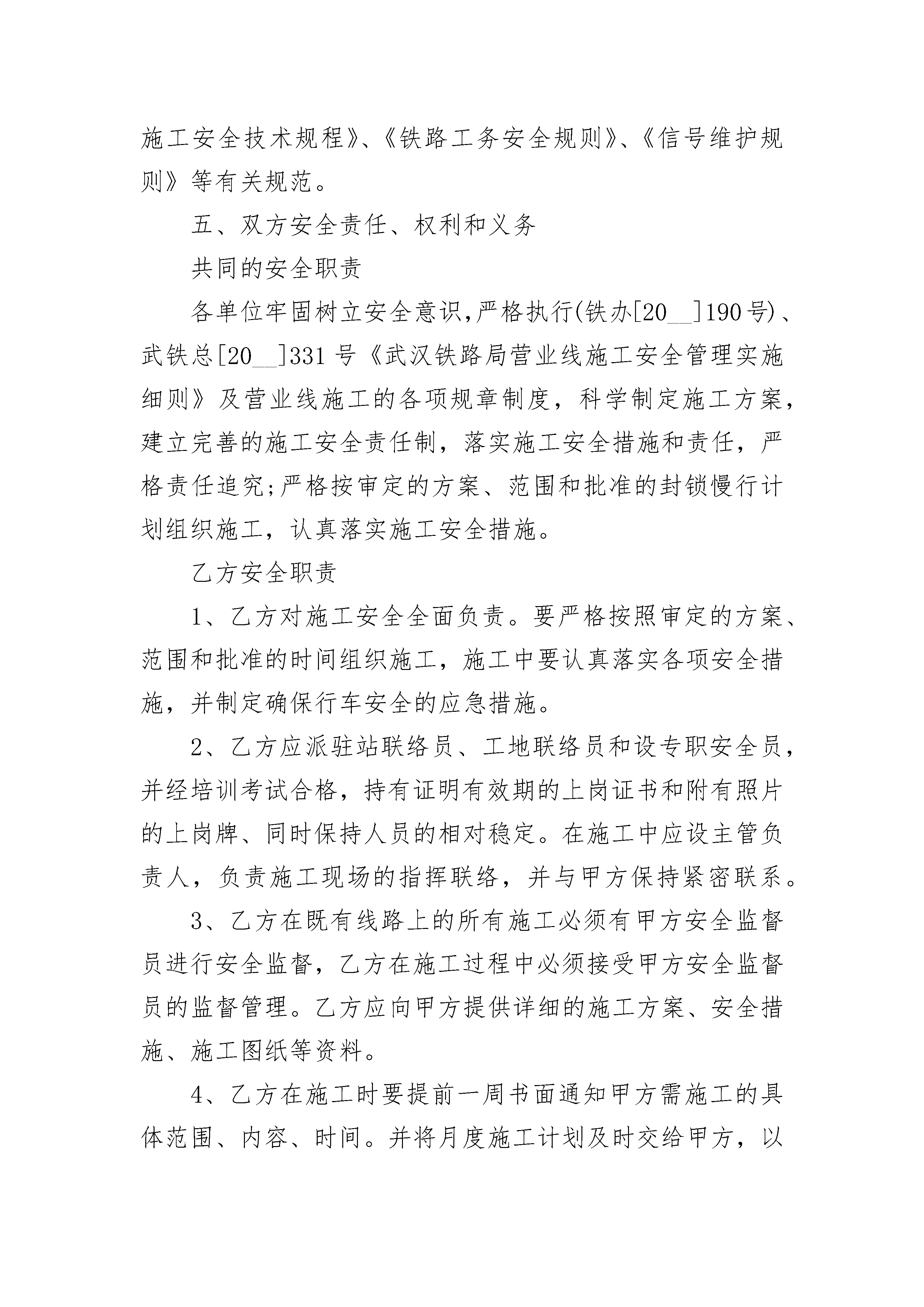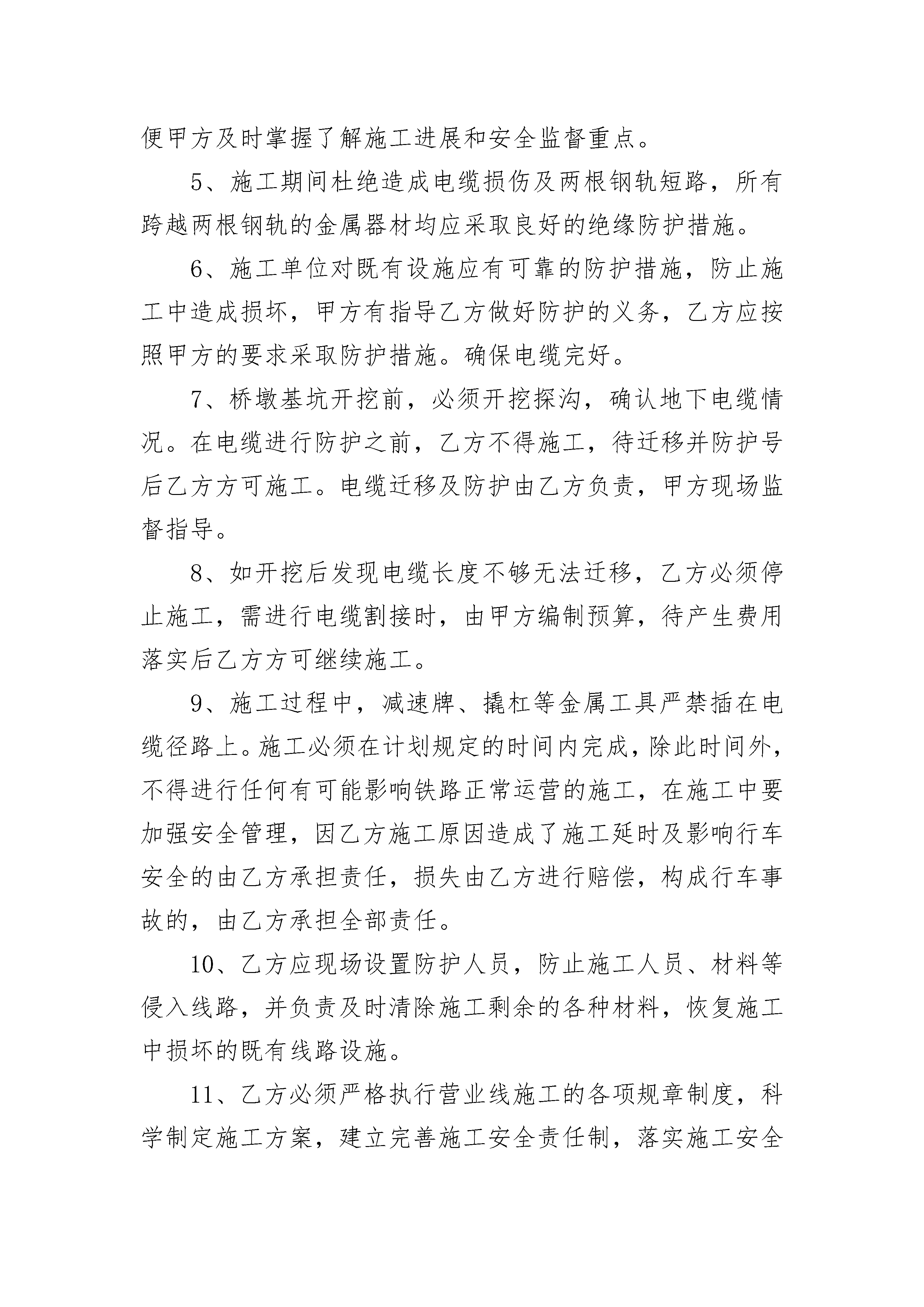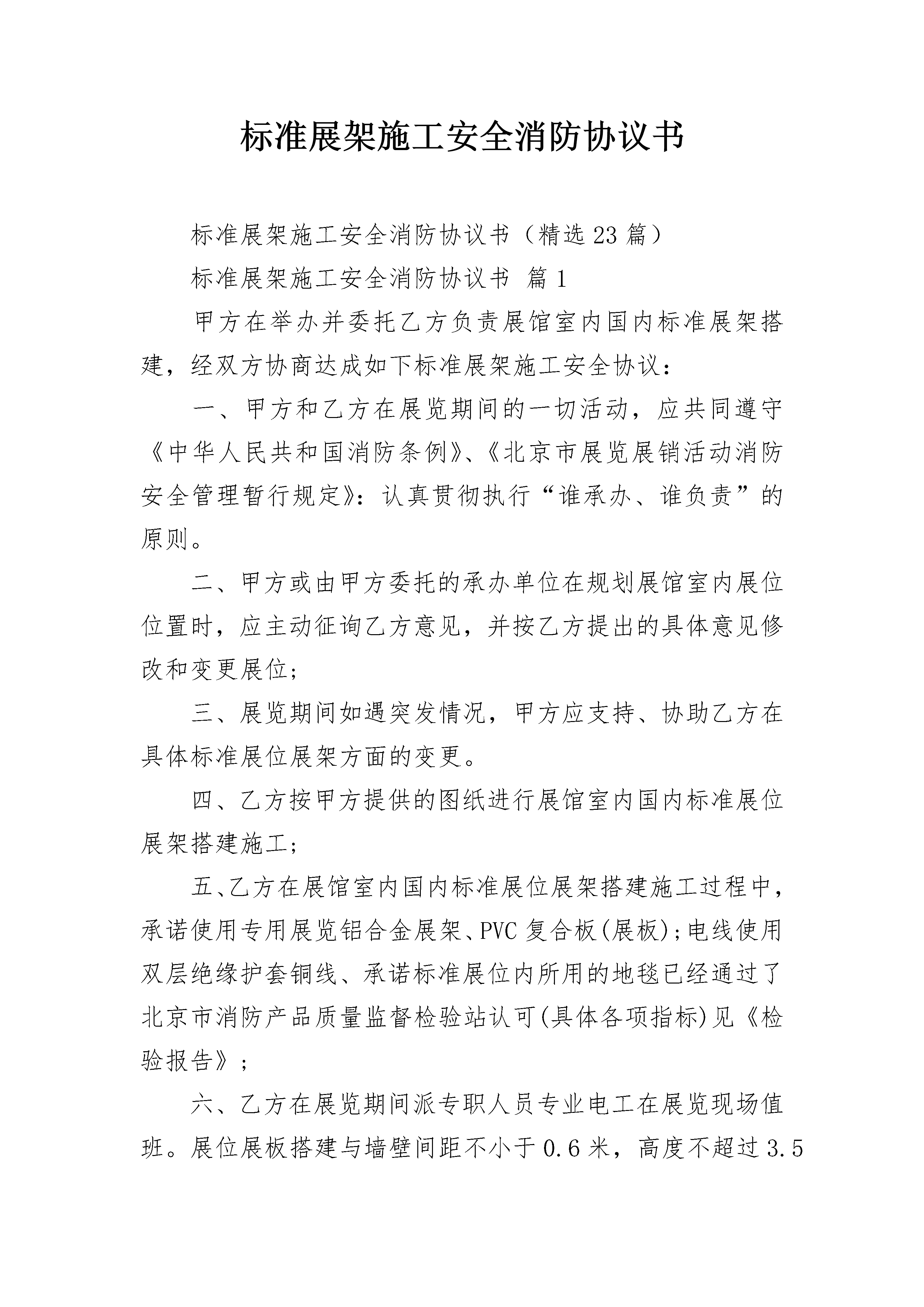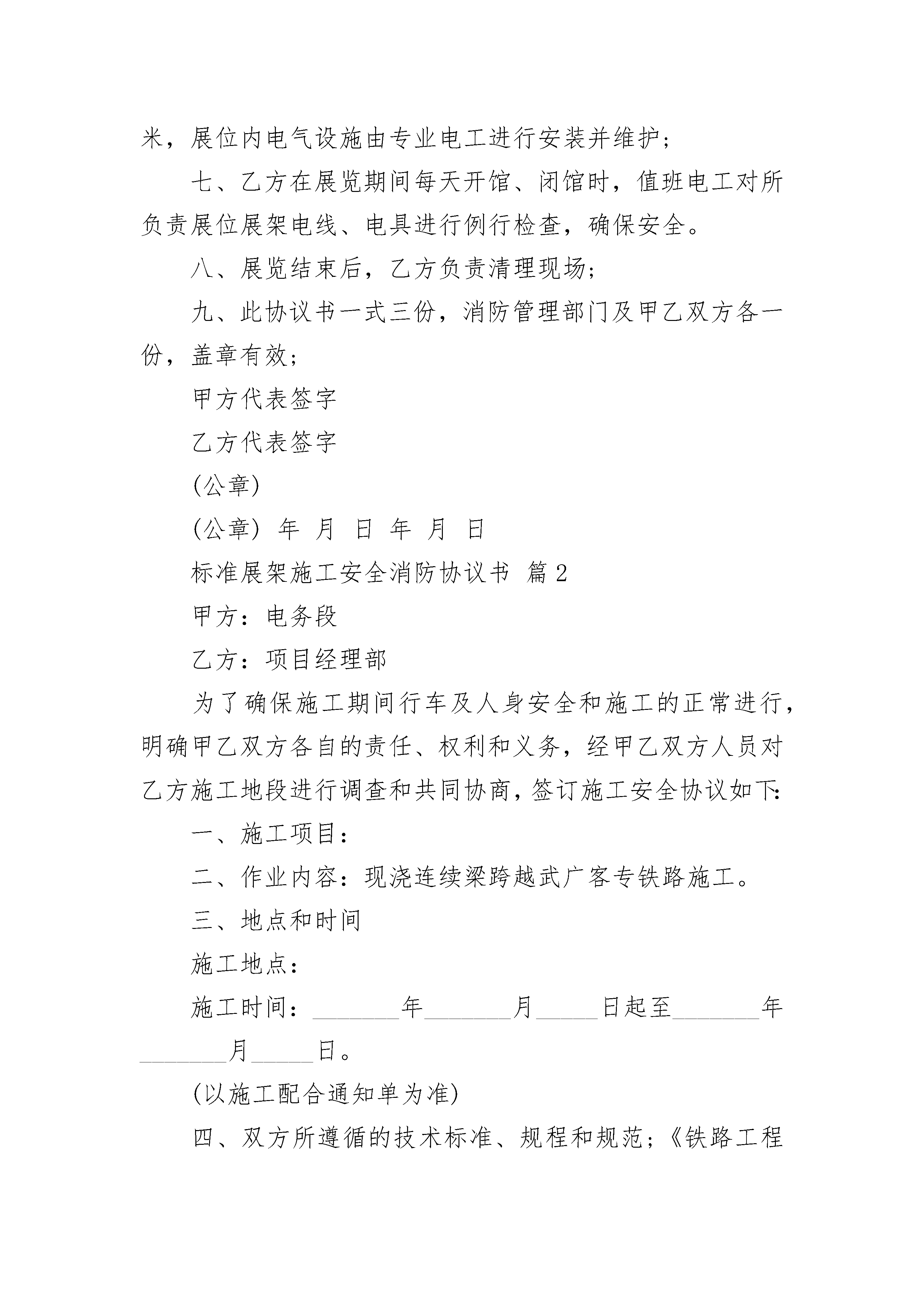 标准展架施工安全消防协议书标准展架施工安全消防协议书(精选23篇)标准展架施工安全消防协议书篇1甲方在举办并委托乙方负责展馆室内国内标准展架搭建,经双方协商达成如下标准展架施工安全协议:一、甲方和乙方在展览期间的一切活动,应共同遵守《中华人民共和国消防条例》、《北京市展览展销活动消防安全管理暂行规定》:认真贯彻执行“谁承办、谁负责”的原则。二、甲方或由甲方委托的承办单位在规划展馆室内展位位置时,应主动征询乙方意见,并按乙方提出的具体意见修改和变更展位;三、展览期间如遇突发情况,甲方应支持、协助乙方在具体标准展位展架方面的变更。四、乙方按甲方提供的图纸进行展馆室内国内标准展位展架搭建施工;五、乙方在展馆室内国内标准展位展架搭建施工过程中,承诺使用专用展览铝合金展架、PVC复合板(展板);电线使用双层绝缘护套铜线、承诺标准展位内所用的地毯已经通过了北京市消防产品质量监督检验站认可(具体各项指标)见《检验报告》;六、乙方在展览期间派专职人员专业电工在展览现场值班。展位展板搭建与墙壁间距不小于0.6米,高度不超过3.5米,展位内电气设施由专业电工进行安装并维护;七、乙方在展览期间每天开馆、闭馆时,值班电工对所负责展位展架电线、电具进行例行检查,确保安全。八、展览结束后,乙方负责清理现场;九、此协议书一式三份,消防管理部门及甲乙双方各一份,盖章有效;甲方代表签字乙方代表签字(公章)(公章)年月日年月日标准展架施工安全消防协议书篇2甲方:电务段乙方:项目经理部为了确保施工期间行车及人身安全和施工的正常进行,明确甲乙双方各自的责任、权利和义务,经甲乙双方人员对乙方施工地段进行调查和共同协商,签订施工安全协议如下:一、施工项目:二、作业内容:现浇连续梁跨越武广客专铁路施工。三、地点和时间施工地点:施工时间:_______年_______月_____日起至_______年_______月_____日。(以施工配合通知单为准)四、双方所遵循的技术标准、规程和规范;《铁路工程施工安全技术规程》、《铁路工务安全规则》、《信号维护规则》等有关规范。五、双方安全责任、权利和义务共同的安全职责各单位牢固树立安全意识,严格执行(铁办[20__]190号)、武铁总[20__]331号《武汉铁路局营业线施工安全管理实施细则》及营业线施工的各项规章制度,科学制定施工方案,建立完善的施工安全责任制,落实施工安全措施和责任,严格责任追究;严格按审定的方案、范围和批准的封锁慢行计划组织施工,认真落实施工安全措施。乙方安全职责1、乙方对施工安全全面负责。要严格按照审定的方案、范围和批准的时间组织施工,施工中要认真落实各项安全措施,并制定确保行车安全的应急措施。2、乙方应派驻站联络员、工地联络员和设专职安全员,并经培训考试合格,持有证明有效期的上岗证书和附有照片的上岗牌、同时保持人员的相对稳定。在施工中应设主管负责人,负责施工现场的指挥联络,并与甲方保持紧密联系。3、乙方在既有线路上的所有施工必须有甲方安全监督员进行安全监督,乙方在施工过程中必须接受甲方安全监督员的监督管理。乙方应向甲方提供详细的施工方案、安全措施、施工图纸等资料。4、乙方在施工时要提前一周书面通知甲方需施工的具体范围、内容、时间。并将月度施工计划及时交给甲方,以便甲方及时掌握了解施工进展和安全监督重点。5、施工期间杜绝造成电缆损伤及两根钢轨短路,所有跨越两根钢轨的金属器材均应采取良好的绝缘防护措施。6、施工单位对既有设施应有可靠的防护措施,防止施工中造成损坏,甲方有指导乙方做好防护的义务,乙方应按照甲方的要求采取防护措施。确保电缆完好。7、桥墩基坑开挖前,必须开挖探沟,确认地下电缆情况。在电缆进行防护之前,乙方不得施工,待迁移并防护号后乙方方可施工。电缆迁移及防护由乙方负责,甲方现场监督指导。8、如开挖后发现电缆长度不够无法迁移,乙方必须停止施工,需进行电缆割接时,由甲方编制预算,待产生费用落实后乙方方可继续施工。9、施工过程中,减速牌、撬杠等金属工具严禁插在电缆径路上。施工必须在计划规定的时间内完成,除此时间外,不得进行任何有可能影响铁路正常运营的施工,在施工中要加强安全管理,因乙方施工原因造成了施工延时及影响行车安全的由乙方承担责任,损失由乙方进行赔偿,构成行车事故的,由乙方承担全部责任。10、乙方应现场设置防护人员,防止施工人员、材料等侵入线路,并负责及时清除施工剩余的各种材料,恢复施工中损坏的既有线路设施。11、乙方必须严格执行营业线施工的各项规章制度,科学制定施工方案,建立完善施工安全责任制,落实施工安全措施和责任,严格责任追究;应严格按审定的方案、范围和批准封锁慢行计划组织施工,认真落实安全措施。12、因施工造成营业线设备损坏和影响行车安全构成铁路交通事故的,视具体情况,施工单位要承担全部