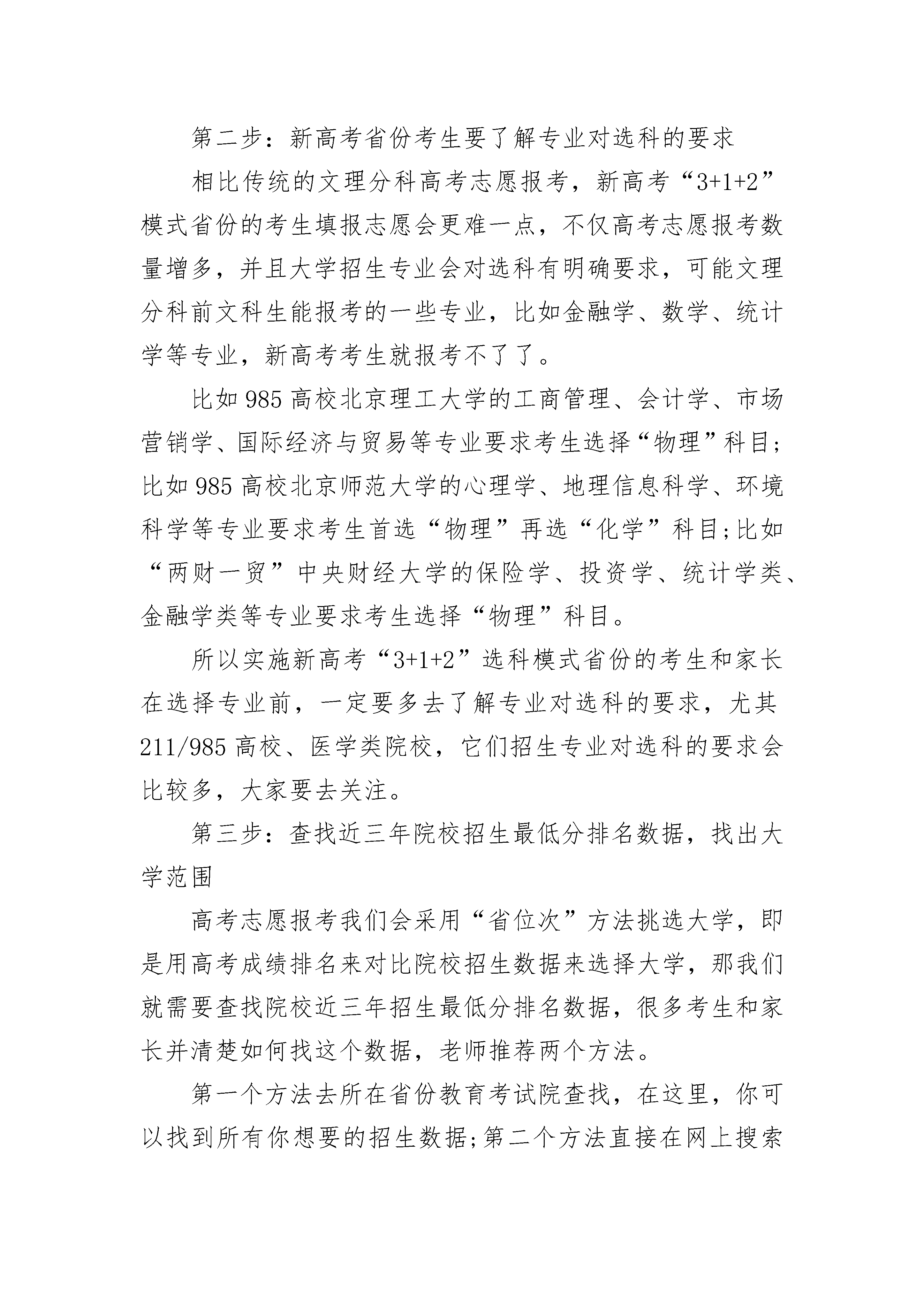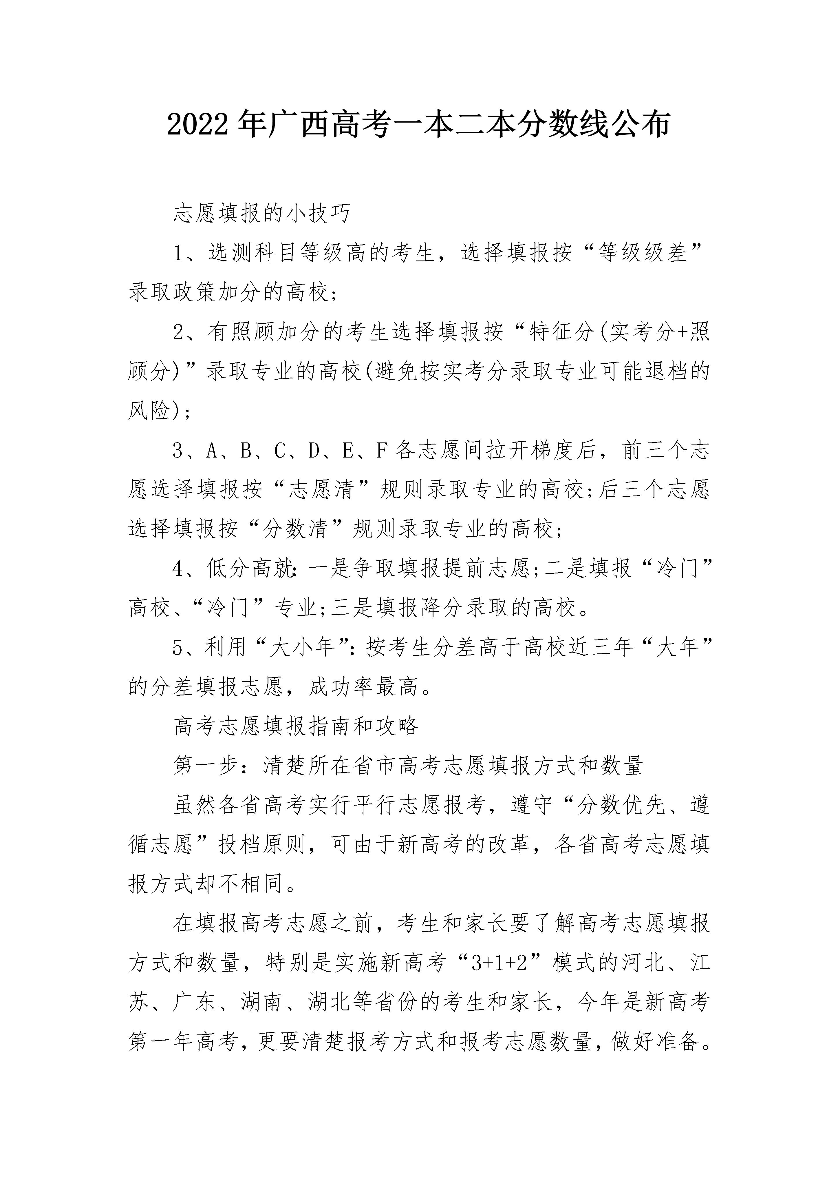 2022年广西高考一本二本分数线公布志愿填报的小技巧1、选测科目等级高的考生,选择填报按“等级级差”录取政策加分的高校;2、有照顾加分的考生选择填报按“特征分(实考分+照顾分)”录取专业的高校(避免按实考分录取专业可能退档的风险);3、A、B、C、D、E、F各志愿间拉开梯度后,前三个志愿选择填报按“志愿清”规则录取专业的高校;后三个志愿选择填报按“分数清”规则录取专业的高校;4、低分高就:一是争取填报提前志愿;二是填报“冷门”高校、“冷门”专业;三是填报降分录取的高校。5、利用“大小年”:按考生分差高于高校近三年“大年”的分差填报志愿,成功率最高。高考志愿填报指南和攻略第一步:清楚所在省市高考志愿填报方式和数量虽然各省高考实行平行志愿报考,遵守“分数优先、遵循志愿”投档原则,可由于新高考的改革,各省高考志愿填报方式却不相同。在填报高考志愿之前,考生和家长要了解高考志愿填报方式和数量,特别是实施新高考“3+1+2”模式的河北、江苏、广东、湖南、湖北等省份的考生和家长,今年是新高考第一年高考,更要清楚报考方式和报考志愿数量,做好准备。第二步:新高考省份考生要了解专业对选科的要求相比传统的文理分科高考志愿报考,新高考“3+1+2”模式省份的考生填报志愿会更难一点,不仅高考志愿报考数量增多,并且大学招生专业会对选科有明确要求,可能文理分科前文科生能报考的一些专业,比如金融学、数学、统计学等专业,新高考考生就报考不了了。比如985高校北京理工大学的工商管理、会计学、市场营销学、国际经济与贸易等专业要求考生选择“物理”科目;比如985高校北京师范大学的心理学、地理信息科学、环境科学等专业要求考生首选“物理”再选“化学”科目;比如“两财一贸”中央财经大学的保险学、投资学、统计学类、金融学类等专业要求考生选择“物理”科目。所以实施新高考“3+1+2”选科模式省份的考生和家长在选择专业前,一定要多去了解专业对选科的要求,尤其211/985高校、医学类院校,它们招生专业对选科的要求会比较多,大家要去关注。第三步:查找近三年院校招生最低分排名数据,找出大学范围高考志愿报考我们会采用“省位次”方法挑选大学,即是用高考成绩排名来对比院校招生数据来选择大学,那我们就需要查找院校近三年招生最低分排名数据,很多考生和家长并清楚如何找这个数据,老师推荐两个方法。第一个方法去所在省份教育考试院查找,在这里,你可以找到所有你想要的招生数据;第二个方法直接在网上搜索“某年某省份本科批院校投档线”,甚至你可以找出别人统计好的院校近三年招生数据;因此查找数据比较简单,大家千万不要傻傻地掏钱买数据。第四步:根据报考大学和专业,筛选大学并确定报考大学通过第三步,我们可以选择出40所大学或60所大学,选择如此多的大学并一定全部适合我们报考,因为有的大学可能院校位置不好、可能是较高收费、可能综合实力不强等等,所以我们需要根据报考大学和专业先去筛选大学。比如考生想报考省会城市的大学,那我们就先把院校位置在省会城市的大学筛选出来;比如考生又想学财经类专业或电子信息类专业,那我们就把有这些招生专业的大学也筛选出来。筛选出大学后,需要进一步确定报考大学。第一个方面看院校招生最低分排名数据,第二个方面去查找专业招生最低分排名数据。