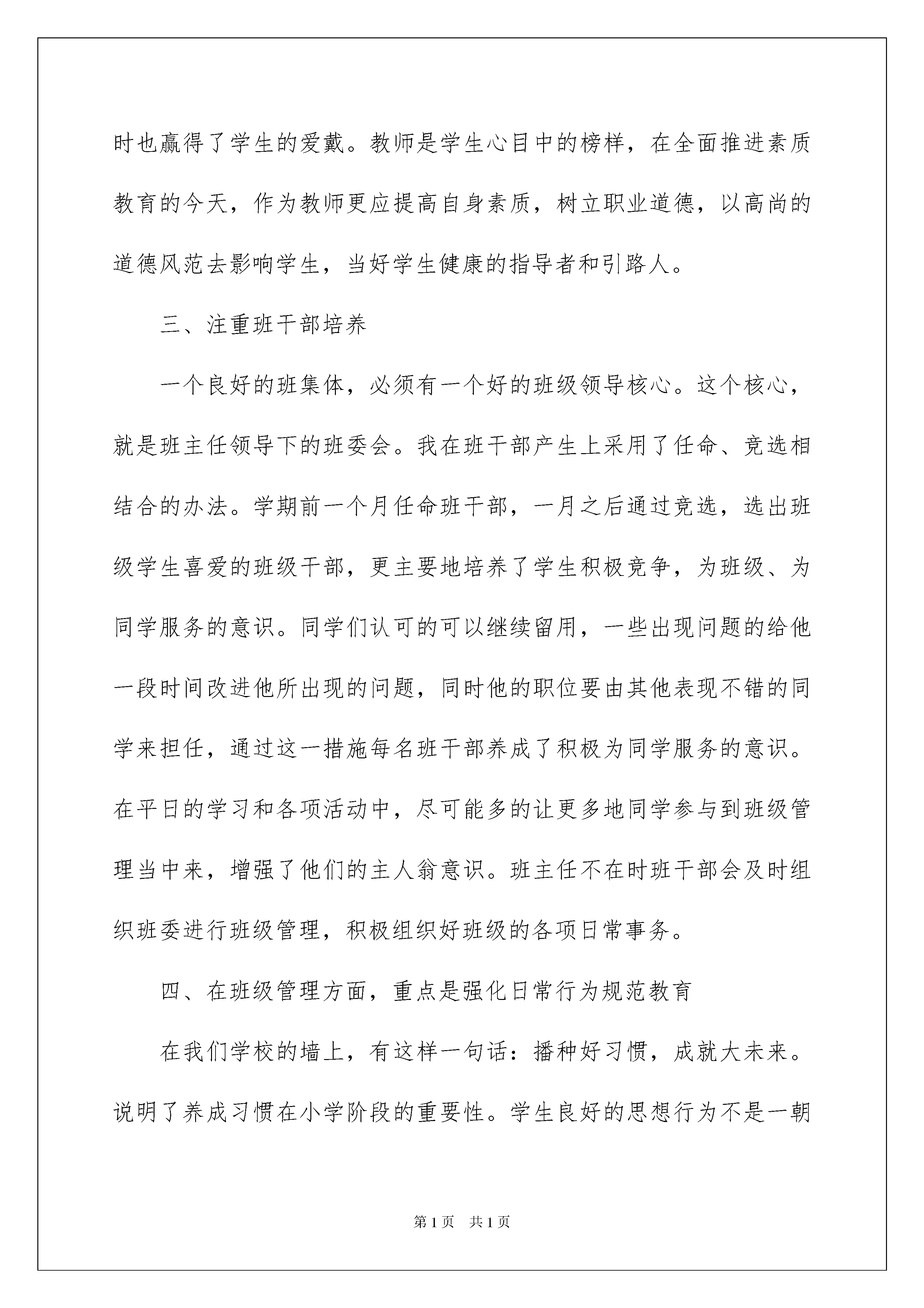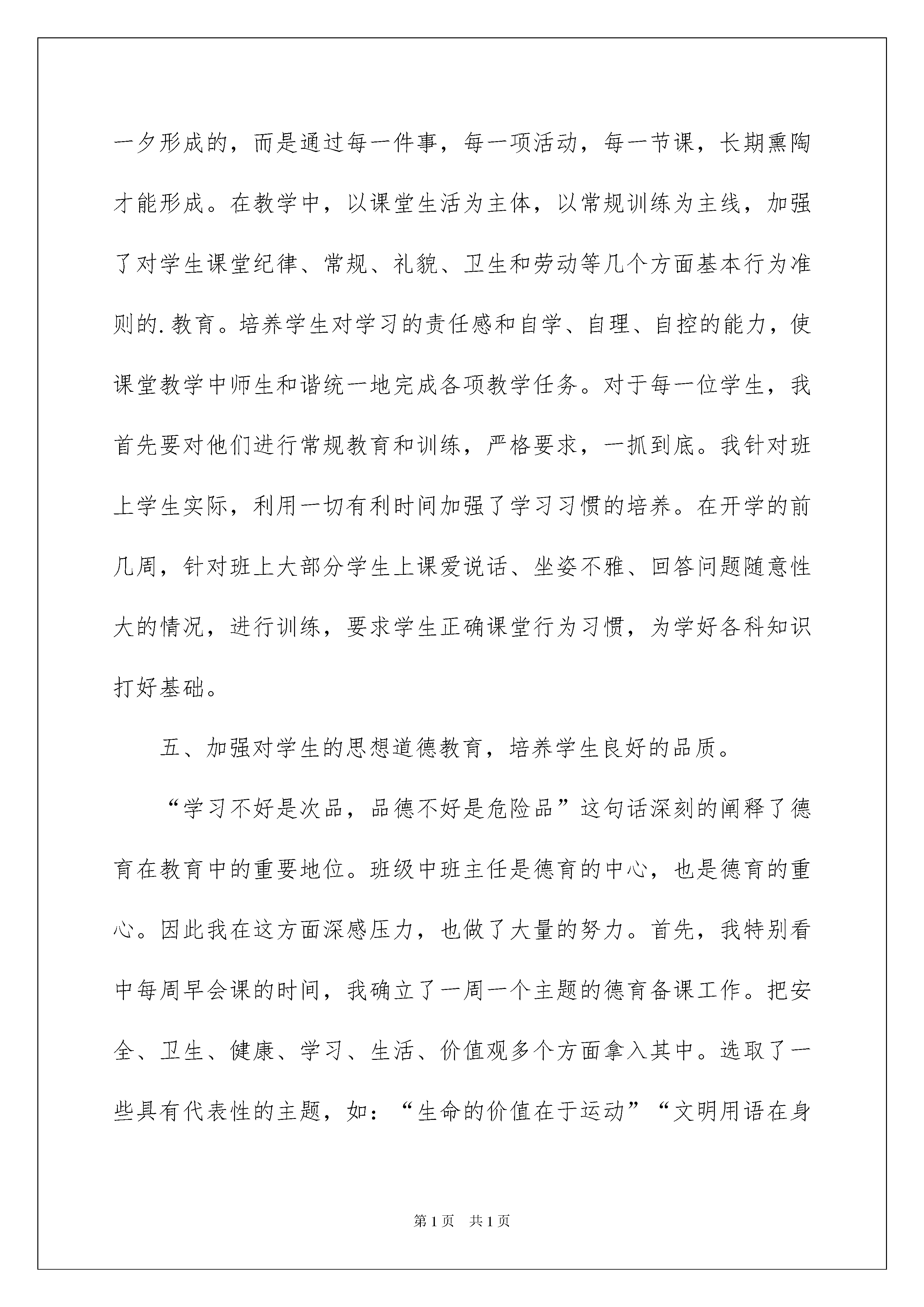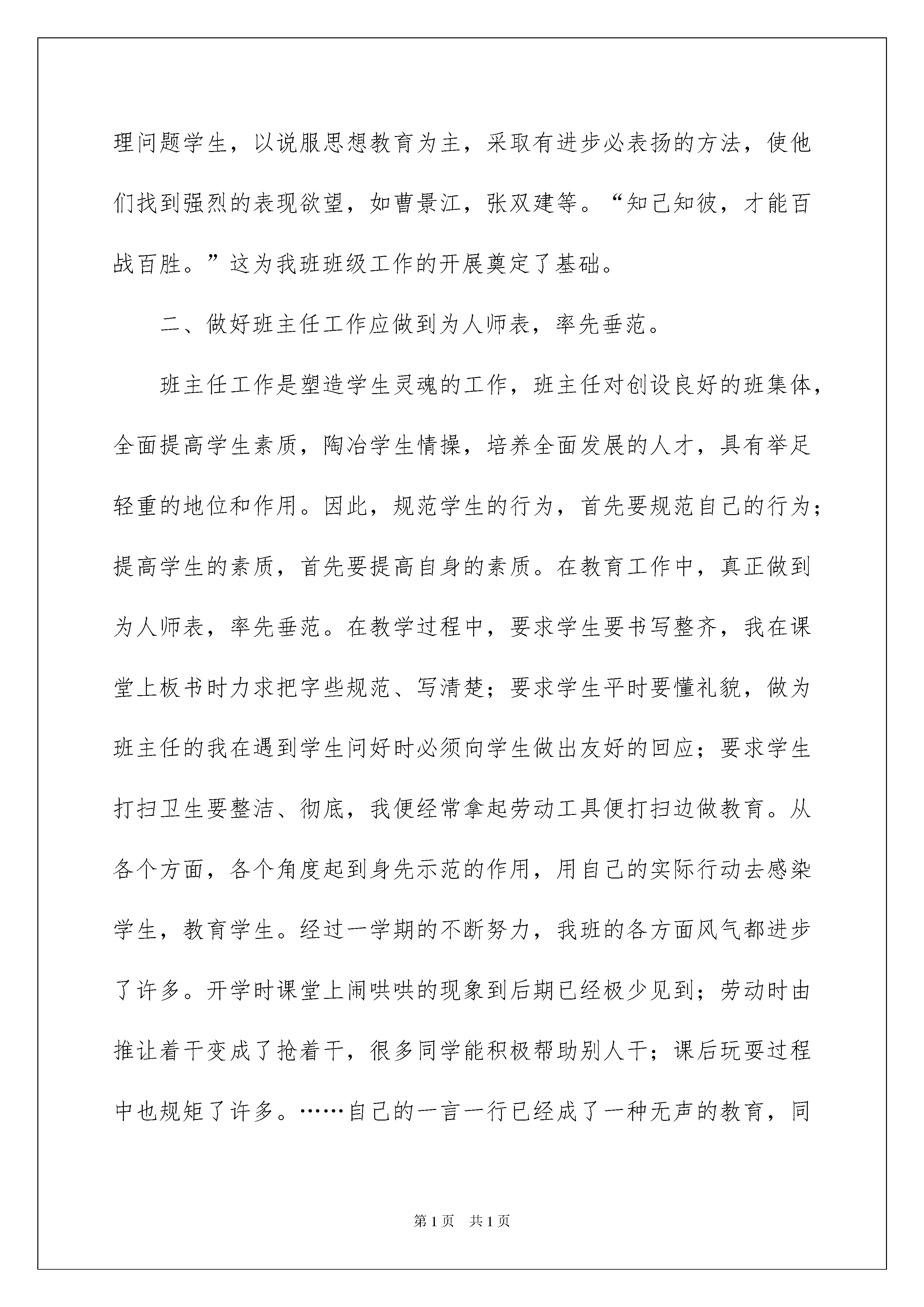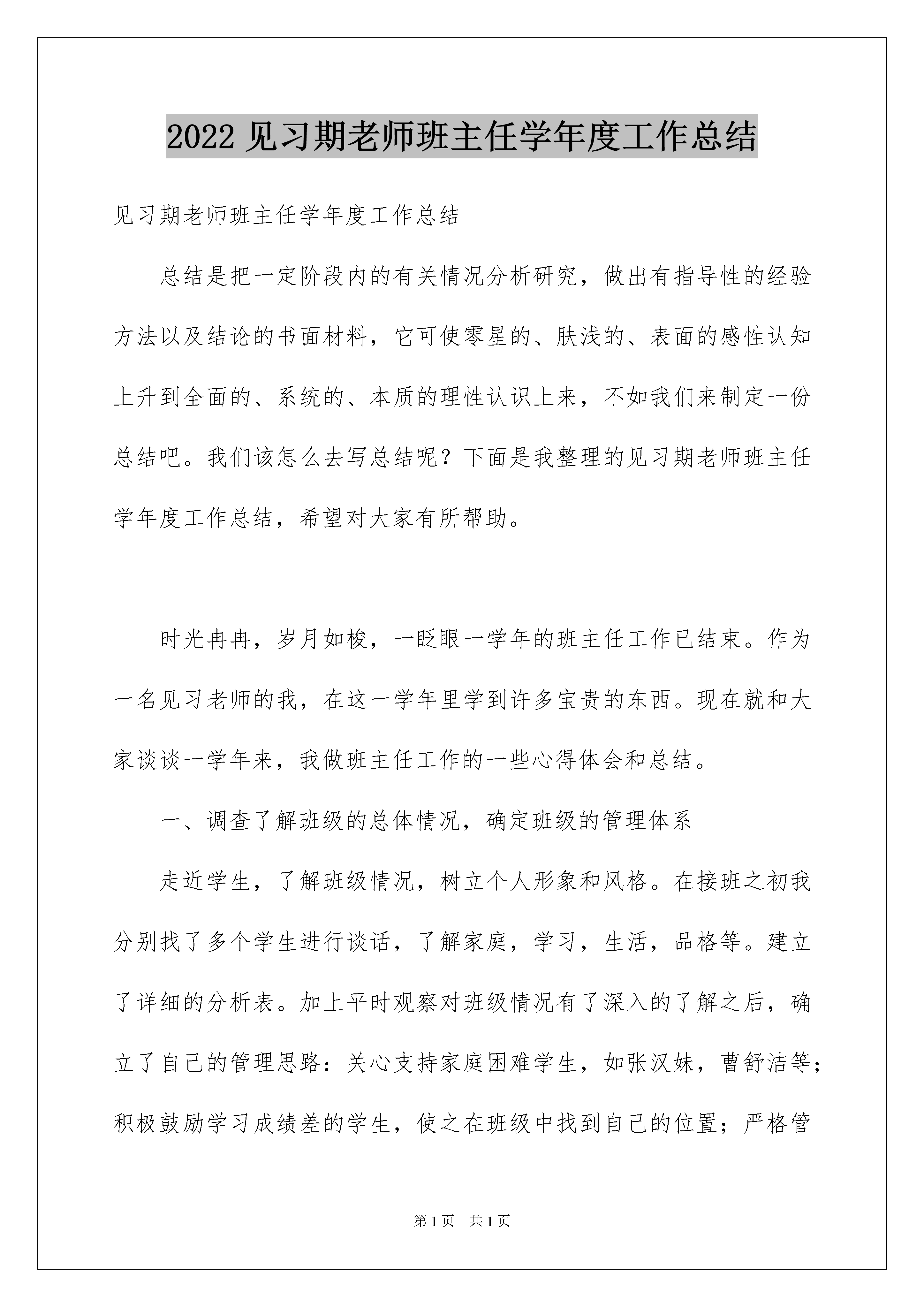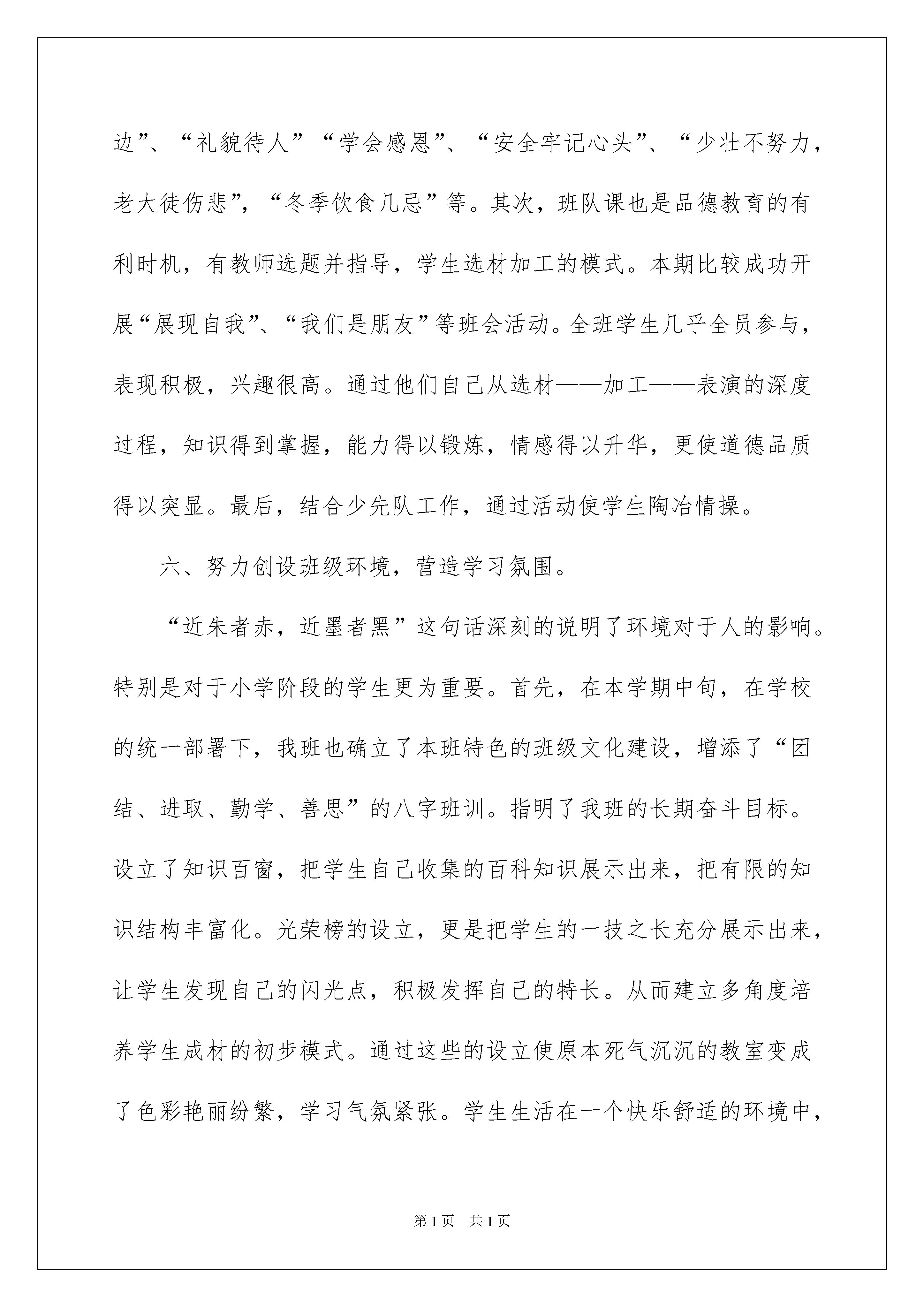 2022见习期老师班主任学年度工作总结见习期老师班主任学年度工作总结总结是把一定阶段内的有关情况分析研究,做出有指导性的经验方法以及结论的书面材料,它可使零星的、肤浅的、表面的感性认知上升到全面的、系统的、本质的理性认识上来,不如我们来制定一份总结吧。我们该怎么去写总结呢?下面是我整理的见习期老师班主任学年度工作总结,希望对大家有所帮助。时光冉冉,岁月如梭,一眨眼一学年的班主任工作已结束。作为一名见习老师的我,在这一学年里学到许多宝贵的东西。现在就和大家谈谈一学年来,我做班主任工作的一些心得体会和总结。一、调查了解班级的总体情况,确定班级的管理体系走近学生,了解班级情况,树立个人形象和风格。在接班之初我分别找了多个学生进行谈话,了解家庭,学习,生活,品格等。建立了详细的分析表。加上平时观察对班级情况有了深入的了解之后,确立了自己的管理思路:关心支持家庭困难学生,如张汉妹,曹舒洁等;积极鼓励学习成绩差的学生,使之在班级中找到自己的位置;严格管理问题学生,以说服思想教育为主,采取有进步必表扬的方法,使他们找到强烈的表现欲望,如曹景江,张双建等。“知己知彼,才能百战百胜。”这为我班班级工作的开展奠定了基础。二、做好班主任工作应做到为人师表,率先垂范。班主任工作是塑造学生灵魂的工作,班主任对创设良好的班集体,全面提高学生素质,陶冶学生情操,培养全面发展的人才,具有举足轻重的地位和作用。因此,规范学生的行为,首先要规范自己的行为;提高学生的素质,首先要提高自身的素质。在教育工作中,真正做到为人师表,率先垂范。在教学过程中,要求学生要书写整齐,我在课堂上板书时力求把字些规范、写清楚;要求学生平时要懂礼貌,做为班主任的我在遇到学生问好时必须向学生做出友好的回应;要求学生打扫卫生要整洁、彻底,我便经常拿起劳动工具便打扫边做教育。从各个方面,各个角度起到身先示范的作用,用自己的实际行动去感染学生,教育学生。经过一学期的不断努力,我班的各方面风气都进步了许多。开学时课堂上闹哄哄的现象到后期已经极少见到;劳动时由推让着干变成了抢着干,很多同学能积极帮助别人干;课后玩耍过程中也规矩了许多。……自己的一言一行已经成了一种无声的教育,同时也赢得了学生的爱戴。教师是学生心目中的榜样,在全面推进素质教育的今天,作为教师更应提高自身素质,树立职业道德,以高尚的道德风范去影响学生,当好学生健康的指导者和引路人。三、注重班干部培养一个良好的班集体,必须有一个好的班级领导核心。这个核心,就是班主任领导下的班委会。我在班干部产生上采用了任命、竞选相结合的办法。学期前一个月任命班干部,一月之后通过竞选,选出班级学生喜爱的班级干部,更主要地培养了学生积极竞争,为班级、为同学服务的意识。同学们认可的可以继续留用,一些出现问题的给他一段时间改进他所出现的问题,同时他的职位要由其他表现不错的同学来担任,通过这一措施每名班干部养成了积极为同学服务的意识。在平日的学习和各项活动中,尽可能多的让更多地同学参与到班级管理当中来,增强了他们的主人翁意识。班主任不在时班干部会及时组织班委进行班级管理,积极组织好班级的各项日常事务。四、在班级管理方面,重点是强化日常行为规范教育在我们学校的墙上,有这样一句话:播种好习惯,成就大未来。说明了养成习惯在小学阶段的重要性。学生良好的思想行为不是一朝一夕形成的,而是通过每一件事,每一项活动,每一节课,长期熏陶才能形成。在教学中,以课堂生活为主体,以常规训练为主线,加强了对学生课堂纪律、常规、礼貌、卫生和劳动等几个方面基本行为准则的.教育。培养学生对学习的责任感和自学、自理、自控的能力,使课堂教学中师生和谐统一地完成各项教学任务。对于每一位学生,我首先要对他们进行常规教育和训练,严格要求,一抓到底。我针对班上学生实际,利用一切有利时间加强了学习习惯的培养。在开学的前几周,针对班上大部分学生上课爱说话、坐姿不雅、回答问题随意性大的情况,进行训练,要求学生正确课堂行为习惯,为学好各科知识打好基础。五、加强对学生的思想道德教育,培养学生良好的品质。“学习不好是次品,品德不好是危险品”这句话深刻的阐释了德育在教育中的重要地位。班级中班主任是德育的中心,也是德育的重心。因此我在这方面深感压力,也做了大量的努力。首先,我特别看中每周早会课的时间,我确立了一周一个主题的德育备课工作。把安全、卫生、健康、学习、生活、价值观多个方面拿入其中。选取了一些具有代表性的主题,如:“生命的价值在于运动”“文明用语在身边”、“礼貌待人”“学会感恩”、“安全牢记心头”、“少壮不努力,老大徒伤悲”,“冬季饮食几忌”等。其次,班队