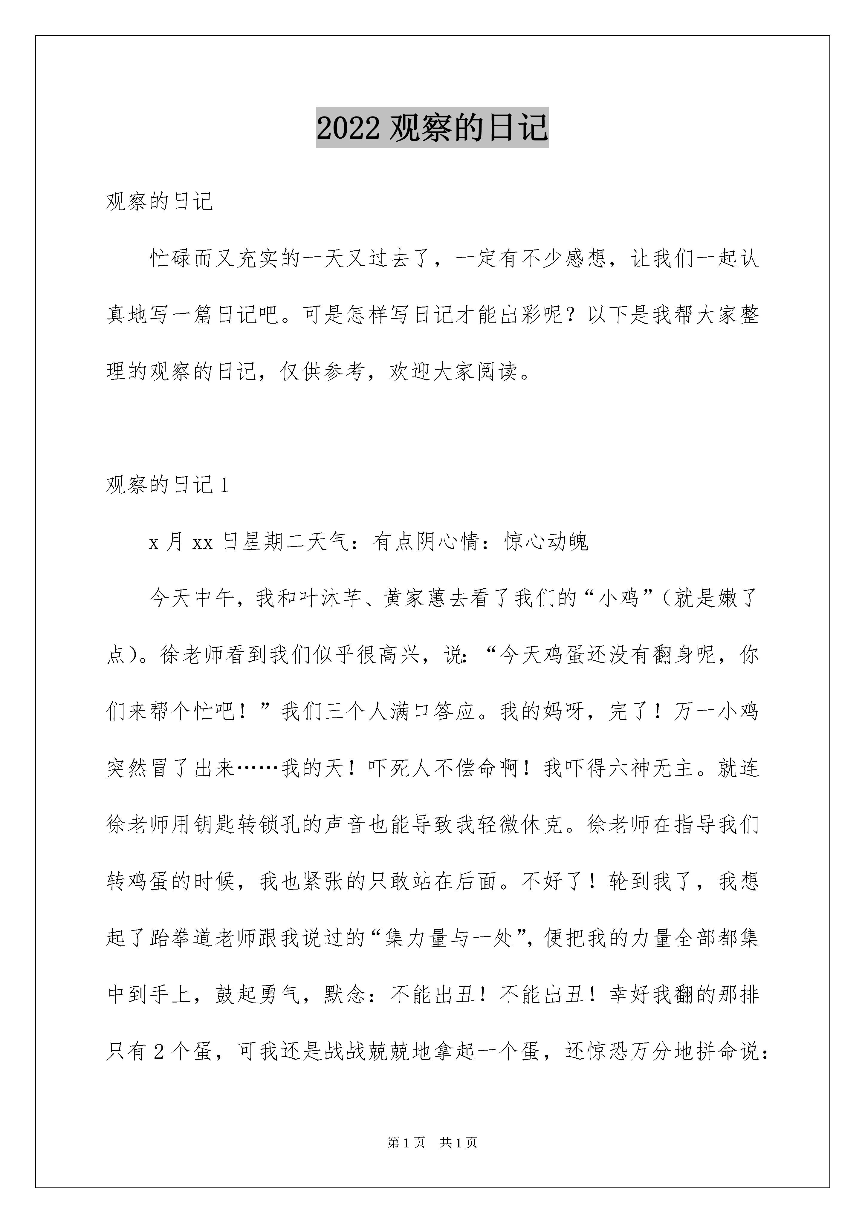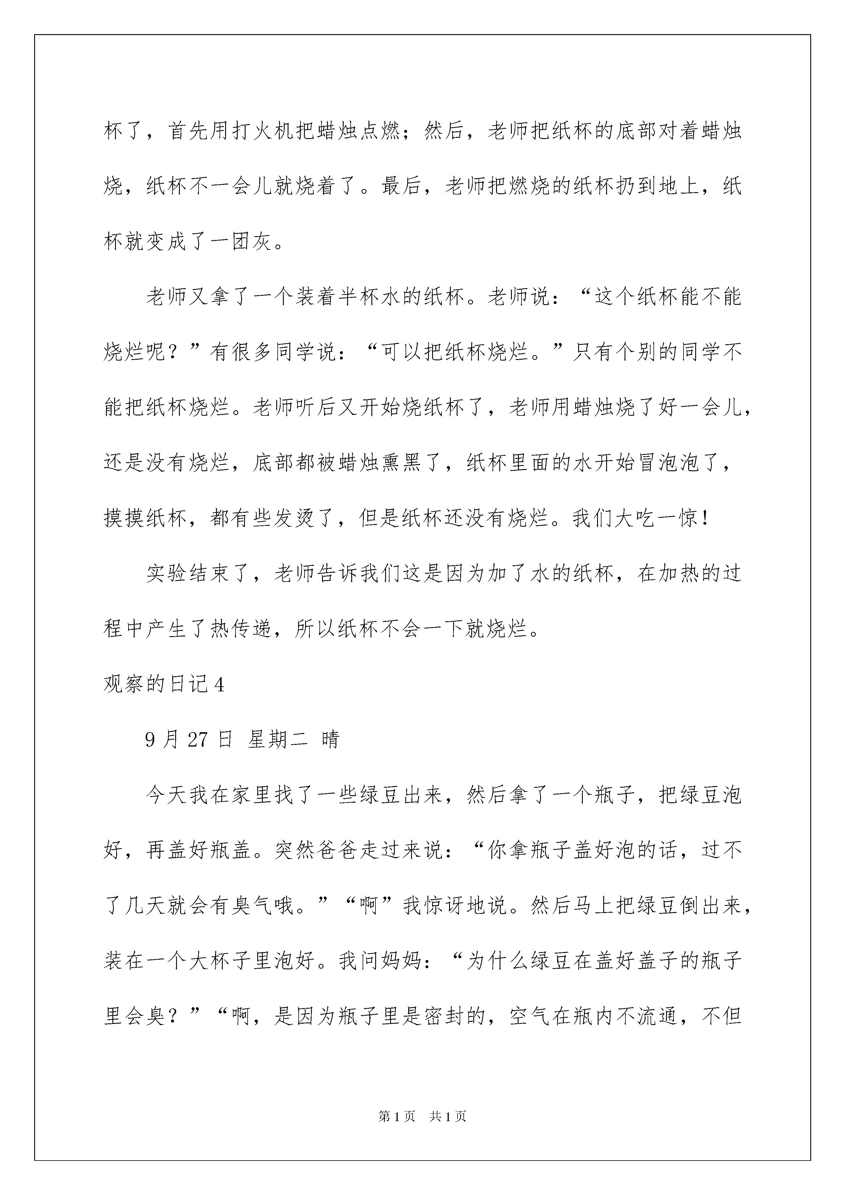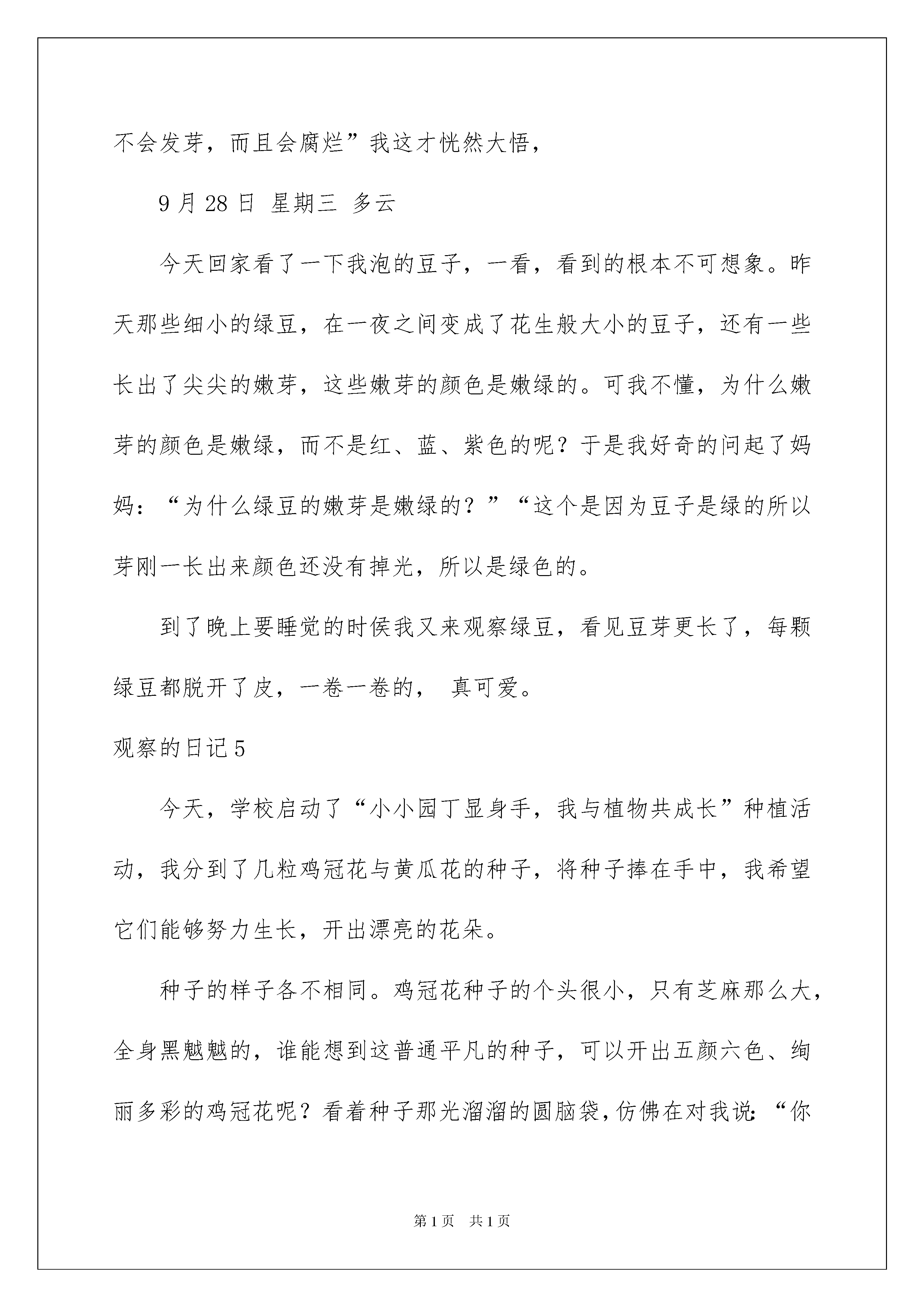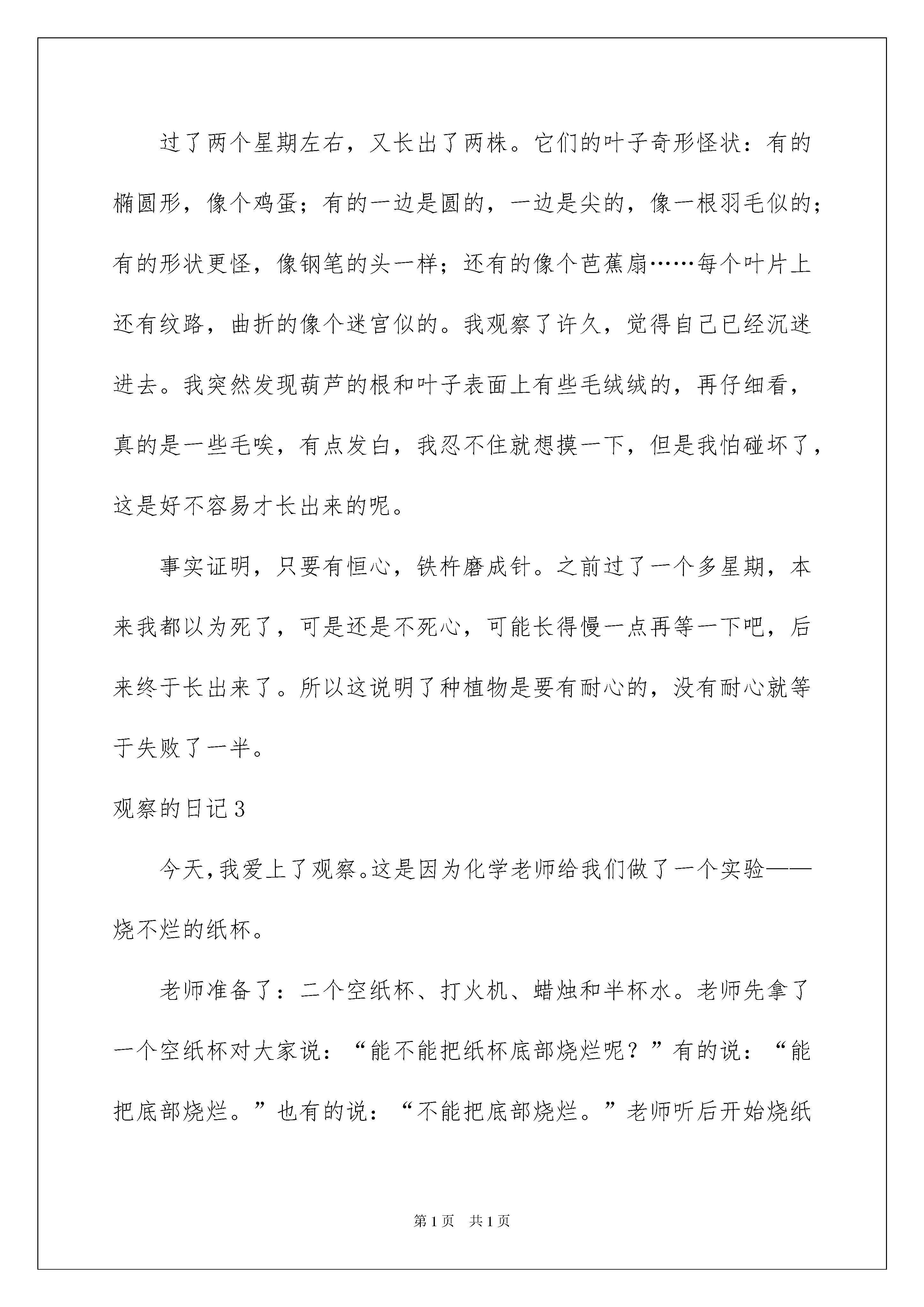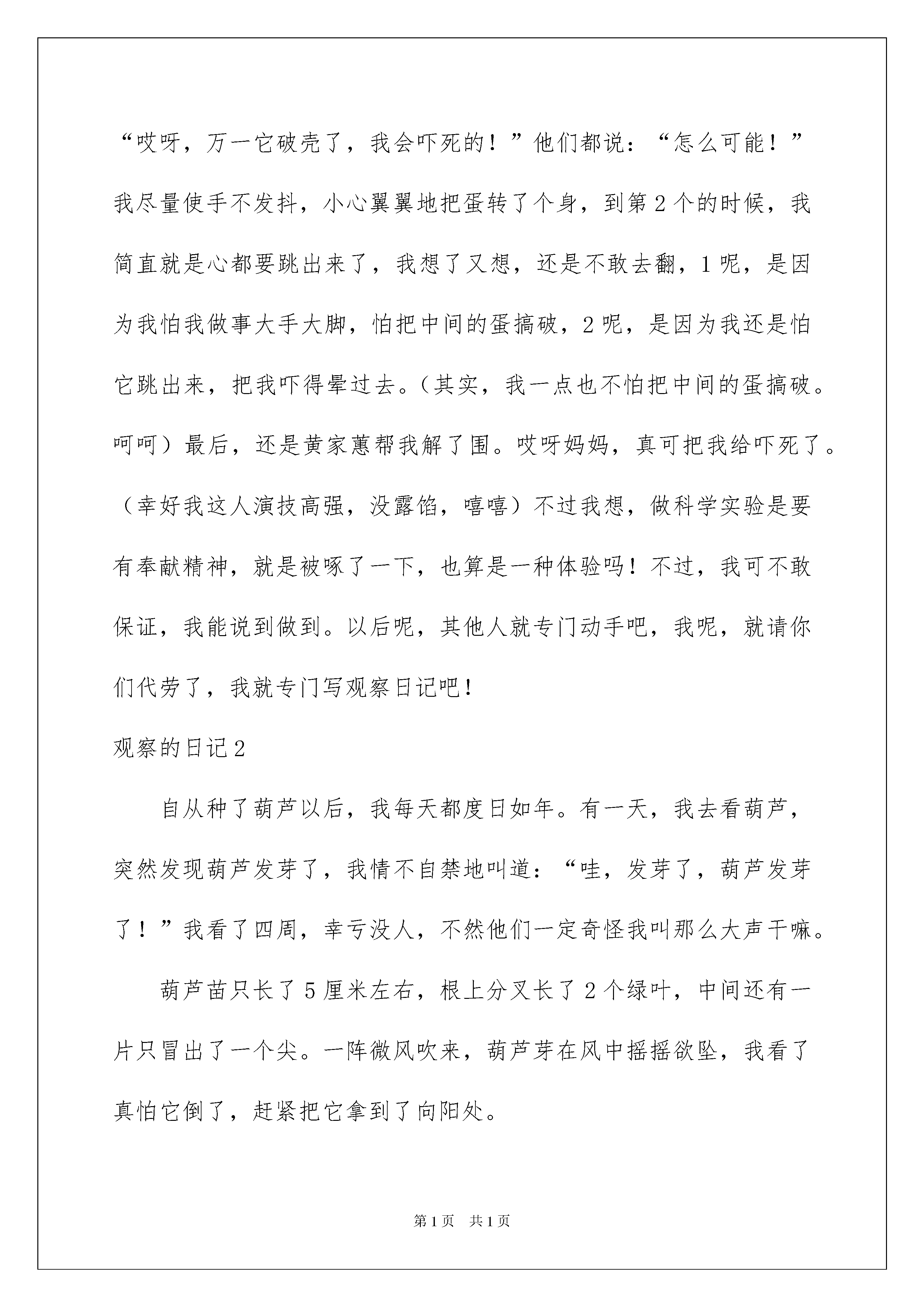 2022观察的日记观察的日记忙碌而又充实的一天又过去了,一定有不少感想,让我们一起认真地写一篇日记吧。可是怎样写日记才能出彩呢?以下是我帮大家整理的观察的日记,仅供参考,欢迎大家阅读。观察的日记1x月xx日星期二天气:有点阴心情:惊心动魄今天中午,我和叶沐芊、黄家蕙去看了我们的“小鸡”(就是嫩了点)。徐老师看到我们似乎很高兴,说:“今天鸡蛋还没有翻身呢,你们来帮个忙吧!”我们三个人满口答应。我的妈呀,完了!万一小鸡突然冒了出来……我的天!吓死人不偿命啊!我吓得六神无主。就连徐老师用钥匙转锁孔的声音也能导致我轻微休克。徐老师在指导我们转鸡蛋的时候,我也紧张的只敢站在后面。不好了!轮到我了,我想起了跆拳道老师跟我说过的“集力量与一处”,便把我的力量全部都集中到手上,鼓起勇气,默念:不能出丑!不能出丑!幸好我翻的那排只有2个蛋,可我还是战战兢兢地拿起一个蛋,还惊恐万分地拼命说:“哎呀,万一它破壳了,我会吓死的!”他们都说:“怎么可能!”我尽量使手不发抖,小心翼翼地把蛋转了个身,到第2个的时候,我简直就是心都要跳出来了,我想了又想,还是不敢去翻,1呢,是因为我怕我做事大手大脚,怕把中间的蛋搞破,2呢,是因为我还是怕它跳出来,把我吓得晕过去。(其实,我一点也不怕把中间的蛋搞破。呵呵)最后,还是黄家蕙帮我解了围。哎呀妈妈,真可把我给吓死了。(幸好我这人演技高强,没露馅,嘻嘻)不过我想,做科学实验是要有奉献精神,就是被啄了一下,也算是一种体验吗!不过,我可不敢保证,我能说到做到。以后呢,其他人就专门动手吧,我呢,就请你们代劳了,我就专门写观察日记吧!观察的日记2自从种了葫芦以后,我每天都度日如年。有一天,我去看葫芦,突然发现葫芦发芽了,我情不自禁地叫道:“哇,发芽了,葫芦发芽了!”我看了四周,幸亏没人,不然他们一定奇怪我叫那么大声干嘛。葫芦苗只长了5厘米左右,根上分叉长了2个绿叶,中间还有一片只冒出了一个尖。一阵微风吹来,葫芦芽在风中摇摇欲坠,我看了真怕它倒了,赶紧把它拿到了向阳处。过了两个星期左右,又长出了两株。它们的叶子奇形怪状:有的椭圆形,像个鸡蛋;有的一边是圆的,一边是尖的,像一根羽毛似的;有的形状更怪,像钢笔的头一样;还有的像个芭蕉扇……每个叶片上还有纹路,曲折的像个迷宫似的。我观察了许久,觉得自己已经沉迷进去。我突然发现葫芦的根和叶子表面上有些毛绒绒的,再仔细看,真的是一些毛唉,有点发白,我忍不住就想摸一下,但是我怕碰坏了,这是好不容易才长出来的呢。事实证明,只要有恒心,铁杵磨成针。之前过了一个多星期,本来我都以为死了,可是还是不死心,可能长得慢一点再等一下吧,后来终于长出来了。所以这说明了种植物是要有耐心的,没有耐心就等于失败了一半。观察的日记3今天,我爱上了观察。这是因为化学老师给我们做了一个实验——烧不烂的纸杯。老师准备了:二个空纸杯、打火机、蜡烛和半杯水。老师先拿了一个空纸杯对大家说:“能不能把纸杯底部烧烂呢?”有的说:“能把底部烧烂。”也有的说:“不能把底部烧烂。”老师听后开始烧纸杯了,首先用打火机把蜡烛点燃;然后,老师把纸杯的底部对着蜡烛烧,纸杯不一会儿就烧着了。最后,老师把燃烧的纸杯扔到地上,纸杯就变成了一团灰。老师又拿了一个装着半杯水的纸杯。老师说:“这个纸杯能不能烧烂呢?”有很多同学说:“可以把纸杯烧烂。”只有个别的同学不能把纸杯烧烂。老师听后又开始烧纸杯了,老师用蜡烛烧了好一会儿,还是没有烧烂,底部都被蜡烛熏黑了,纸杯里面的水开始冒泡泡了,摸摸纸杯,都有些发烫了,但是纸杯还没有烧烂。我们大吃一惊!实验结束了,老师告诉我们这是因为加了水的纸杯,在加热的过程中产生了热传递,所以纸杯不会一下就烧烂。观察的日记49月27日星期二晴今天我在家里找了一些绿豆出来,然后拿了一个瓶子,把绿豆泡好,再盖好瓶盖。突然爸爸走过来说:“你拿瓶子盖好泡的话,过不了几天就会有臭气哦。”“啊”我惊讶地说。然后马上把绿豆倒出来,装在一个大杯子里泡好。我问妈妈:“为什么绿豆在盖好盖子的瓶子里会臭?”“啊,是因为瓶子里是密封的,空气在瓶内不流通,不但不会发芽,而且会腐烂”我这才恍然大悟,9月28日星期三多云今天回家看了一下我泡的豆子,一看,看到的根本不可想象。昨天那些细小的绿豆,在一夜之间变成了花生般大小的豆子,还有一些长出了尖尖的嫩芽,这些嫩芽的颜色是嫩绿的。可我不懂,为什么嫩芽的颜色是嫩绿,而不是红、蓝、紫色的呢?于是我好奇的问起了妈妈:“为什么绿豆的嫩芽是嫩绿的?”“这个是因为豆子是绿的所以芽刚一长出来颜色还没有掉光,所以是绿色的。到了晚上要睡觉的时侯我又来观察绿豆,看见豆芽更长了,