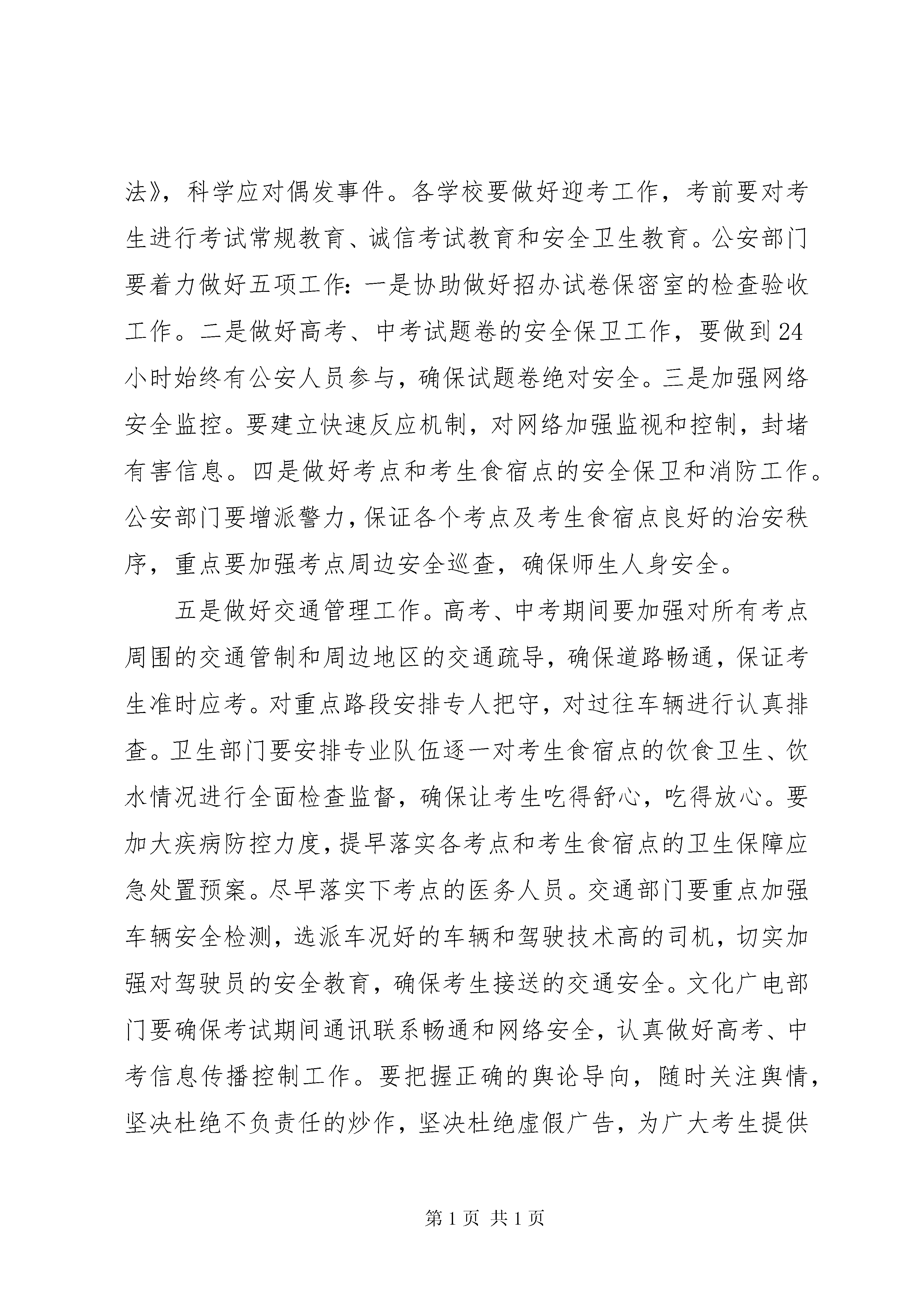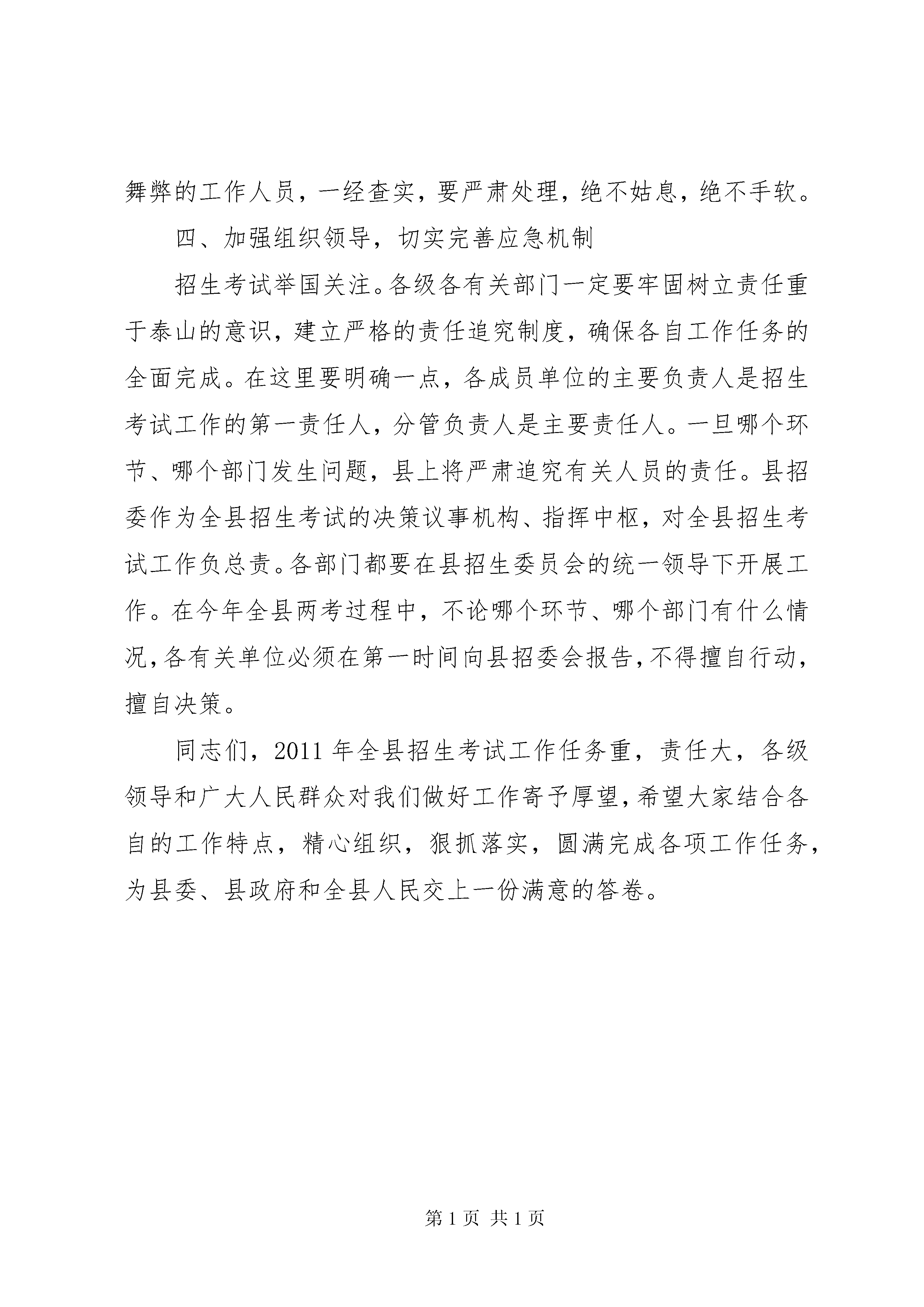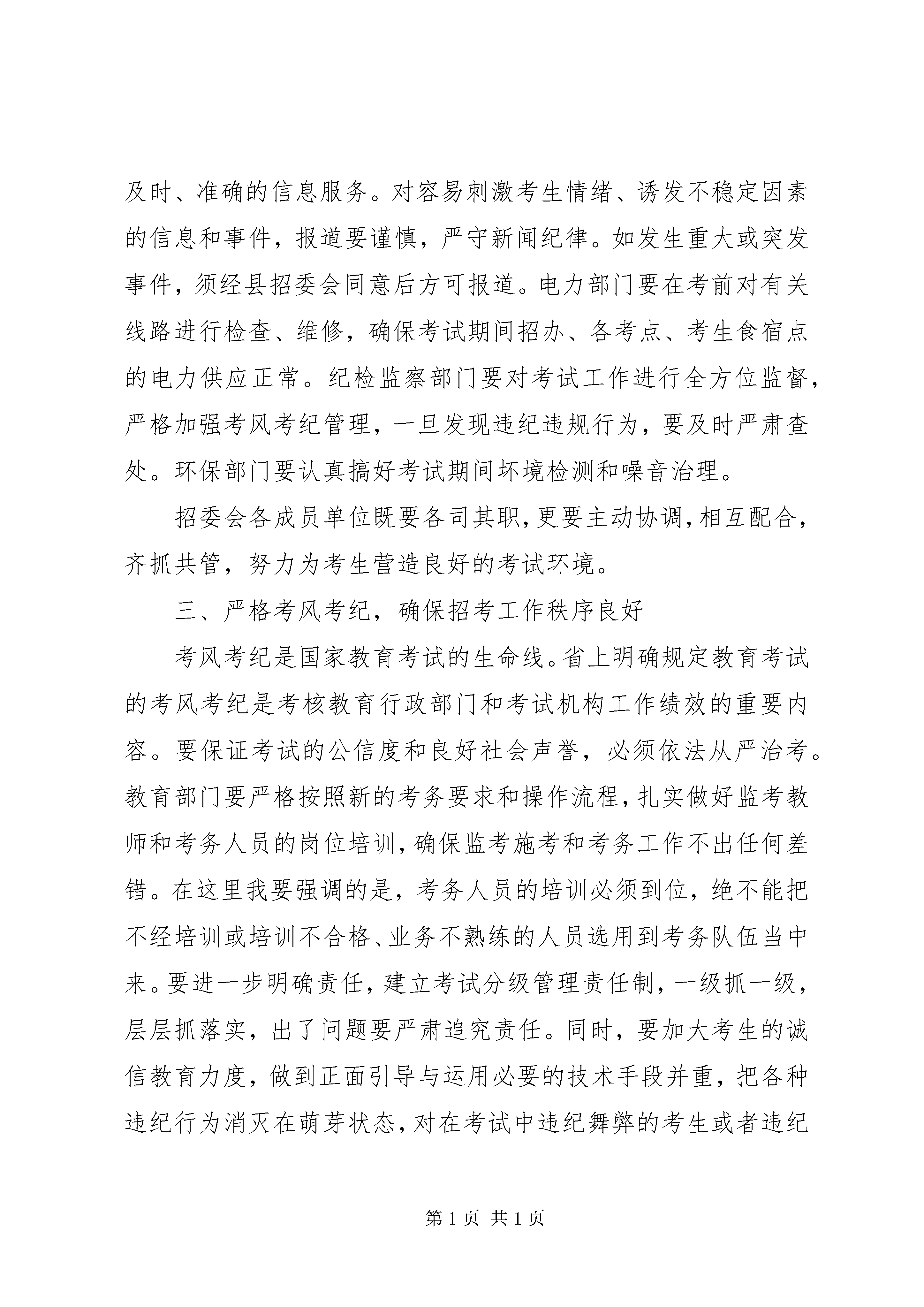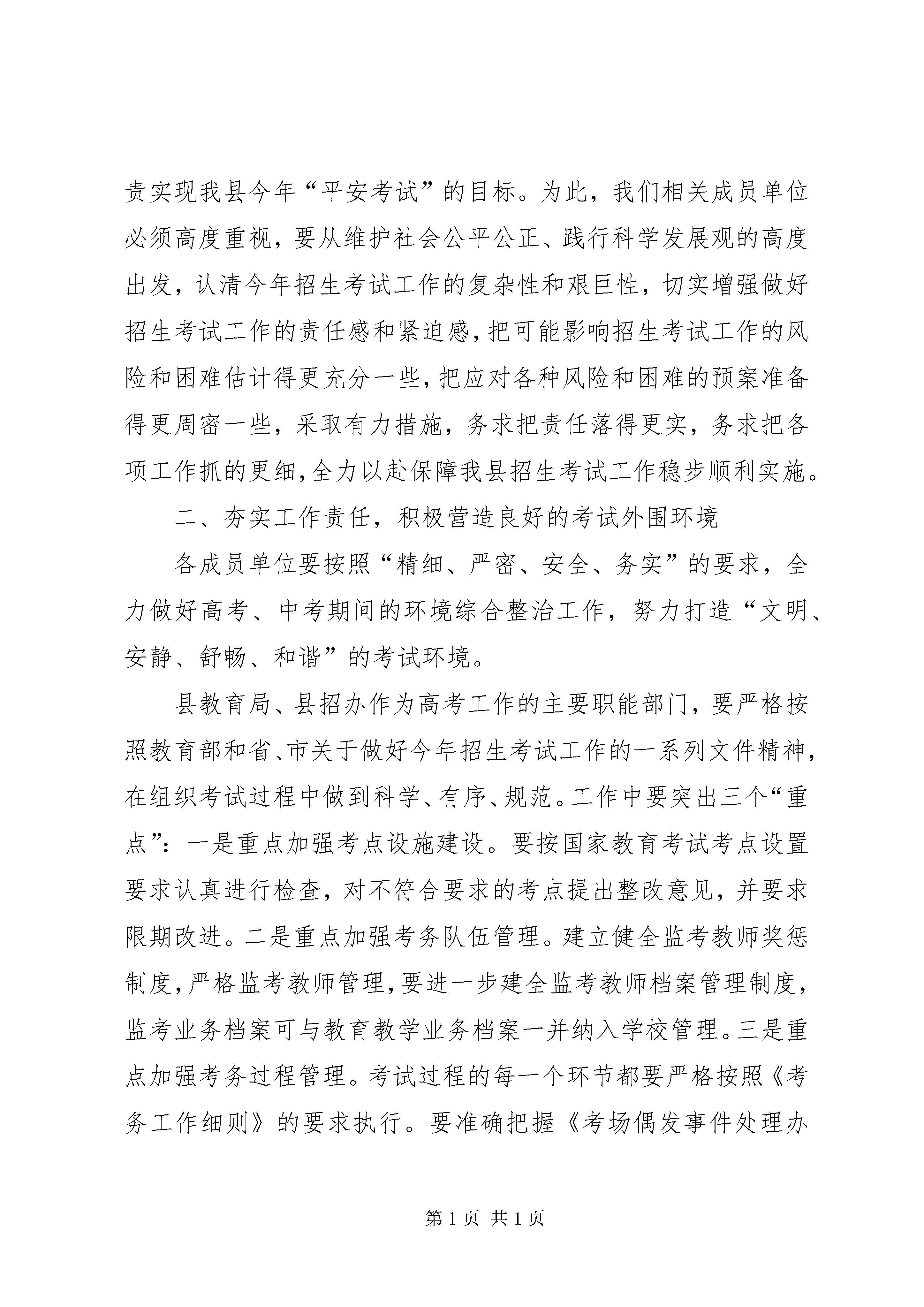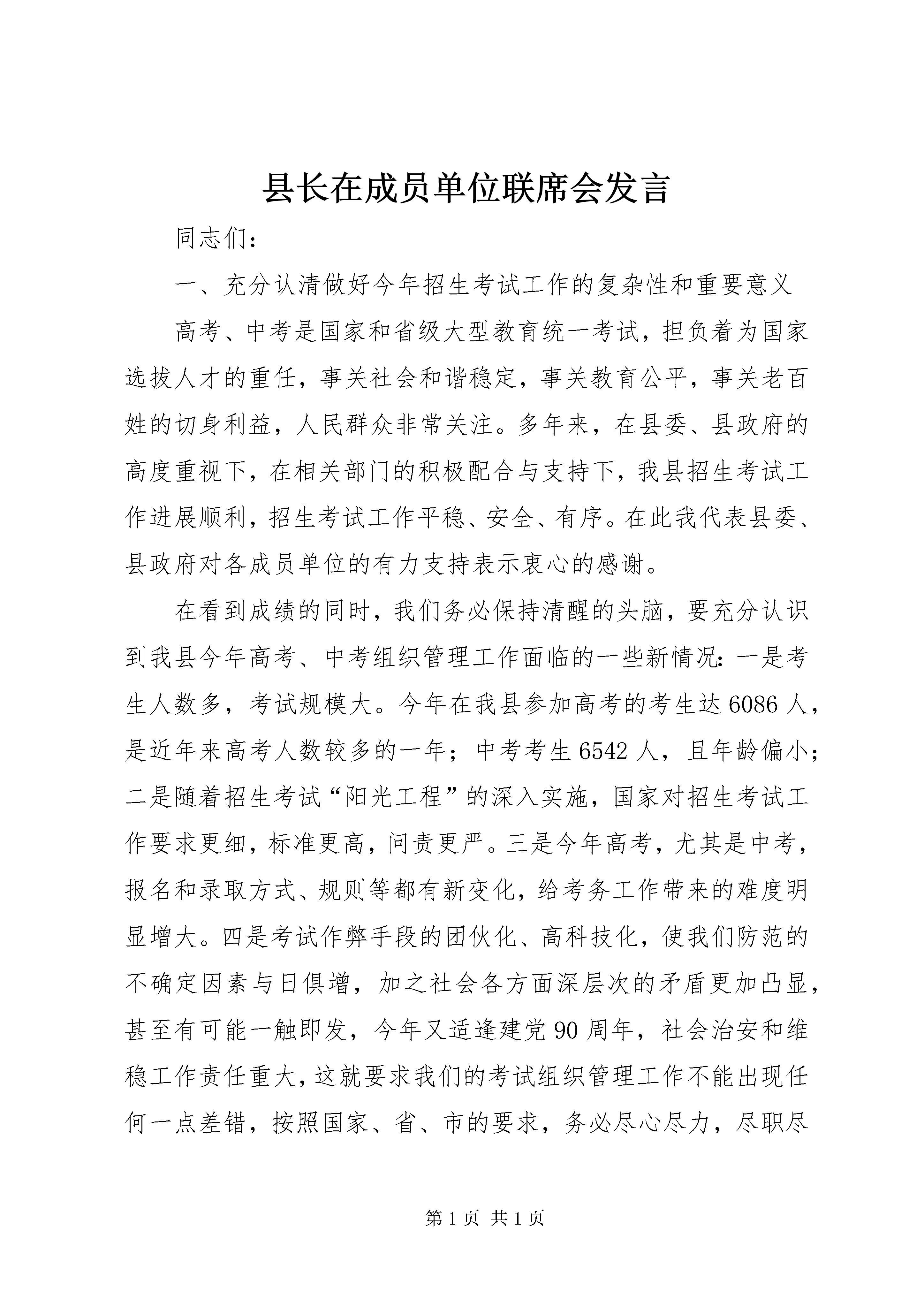 县长在成员单位联席会发言同志们:一、充分认清做好今年招生考试工作的复杂性和重要意义高考、中考是国家和省级大型教育统一考试,担负着为国家选拔人才的重任,事关社会和谐稳定,事关教育公平,事关老百姓的切身利益,人民群众非常关注。多年来,在县委、县政府的高度重视下,在相关部门的积极配合与支持下,我县招生考试工作进展顺利,招生考试工作平稳、安全、有序。在此我代表县委、县政府对各成员单位的有力支持表示衷心的感谢。在看到成绩的同时,我们务必保持清醒的头脑,要充分认识到我县今年高考、中考组织管理工作面临的一些新情况:一是考生人数多,考试规模大。今年在我县参加高考的考生达6086人,是近年来高考人数较多的一年;中考考生6542人,且年龄偏小;二是随着招生考试“阳光工程”的深入实施,国家对招生考试工作要求更细,标准更高,问责更严。三是今年高考,尤其是中考,报名和录取方式、规则等都有新变化,给考务工作带来的难度明显增大。四是考试作弊手段的团伙化、高科技化,使我们防范的不确定因素与日俱增,加之社会各方面深层次的矛盾更加凸显,甚至有可能一触即发,今年又适逢建党90周年,社会治安和维稳工作责任重大,这就要求我们的考试组织管理工作不能出现任何一点差错,按照国家、省、市的要求,务必尽心尽力,尽职尽责实现我县今年“平安考试”的目标。为此,我们相关成员单位必须高度重视,要从维护社会公平公正、践行科学发展观的高度出发,认清今年招生考试工作的复杂性和艰巨性,切实增强做好招生考试工作的责任感和紧迫感,把可能影响招生考试工作的风险和困难估计得更充分一些,把应对各种风险和困难的预案准备得更周密一些,采取有力措施,务求把责任落得更实,务求把各项工作抓的更细,全力以赴保障我县招生考试工作稳步顺利实施。二、夯实工作责任,积极营造良好的考试外围环境各成员单位要按照“精细、严密、安全、务实”的要求,全力做好高考、中考期间的环境综合整治工作,努力打造“文明、安静、舒畅、和谐”的考试环境。县教育局、县招办作为高考工作的主要职能部门,要严格按照教育部和省、市关于做好今年招生考试工作的一系列文件精神,在组织考试过程中做到科学、有序、规范。工作中要突出三个“重点”:一是重点加强考点设施建设。要按国家教育考试考点设置要求认真进行检查,对不符合要求的考点提出整改意见,并要求限期改进。二是重点加强考务队伍管理。建立健全监考教师奖惩制度,严格监考教师管理,要进一步建全监考教师档案管理制度,监考业务档案可与教育教学业务档案一并纳入学校管理。三是重点加强考务过程管理。考试过程的每一个环节都要严格按照《考务工作细则》的要求执行。要准确把握《考场偶发事件处理办法》,科学应对偶发事件。各学校要做好迎考工作,考前要对考生进行考试常规教育、诚信考试教育和安全卫生教育。公安部门要着力做好五项工作:一是协助做好招办试卷保密室的检查验收工作。二是做好高考、中考试题卷的安全保卫工作,要做到24小时始终有公安人员参与,确保试题卷绝对安全。三是加强网络安全监控。要建立快速反应机制,对网络加强监视和控制,封堵有害信息。四是做好考点和考生食宿点的安全保卫和消防工作。公安部门要增派警力,保证各个考点及考生食宿点良好的治安秩序,重点要加强考点周边安全巡查,确保师生人身安全。五是做好交通管理工作。高考、中考期间要加强对所有考点周围的交通管制和周边地区的交通疏导,确保道路畅通,保证考生准时应考。对重点路段安排专人把守,对过往车辆进行认真排查。卫生部门要安排专业队伍逐一对考生食宿点的饮食卫生、饮水情况进行全面检查监督,确保让考生吃得舒心,吃得放心。要加大疾病防控力度,提早落实各考点和考生食宿点的卫生保障应急处置预案。尽早落实下考点的医务人员。交通部门要重点加强车辆安全检测,选派车况好的车辆和驾驶技术高的司机,切实加强对驾驶员的安全教育,确保考生接送的交通安全。文化广电部门要确保考试期间通讯联系畅通和网络安全,认真做好高考、中考信息传播控制工作。要把握正确的舆论导向,随时关注舆情,坚决杜绝不负责任的炒作,坚决杜绝虚假广告,为广大考生提供及时、准确的信息服务。对容易刺激考生情绪、诱发不稳定因素的信息和事件,报道要谨慎,严守新闻纪律。如发生重大或突发事件,须经县招委会同意后方可报道。电力部门要在考前对有关线路进行检查、维修,确保考试期间招办、各考点、考生食宿点的电力供应正常。纪检监察部门要对考试工作进行全方位监督,严格加强考风考纪管理,一旦发现违纪违规行为,要及时严肃查处。环保部门要认真搞好考试期间坏境检测和噪音治理。招委会各成员单位既要各司其职,更要主动协调,相互配合,齐抓共管,努力为考生营造良好的考试环境。三、严格考风考纪,确保招考工作秩序良好考风考纪是国家教育考试的生命线。省上明确规定教育考试的考风考纪是考核教育
