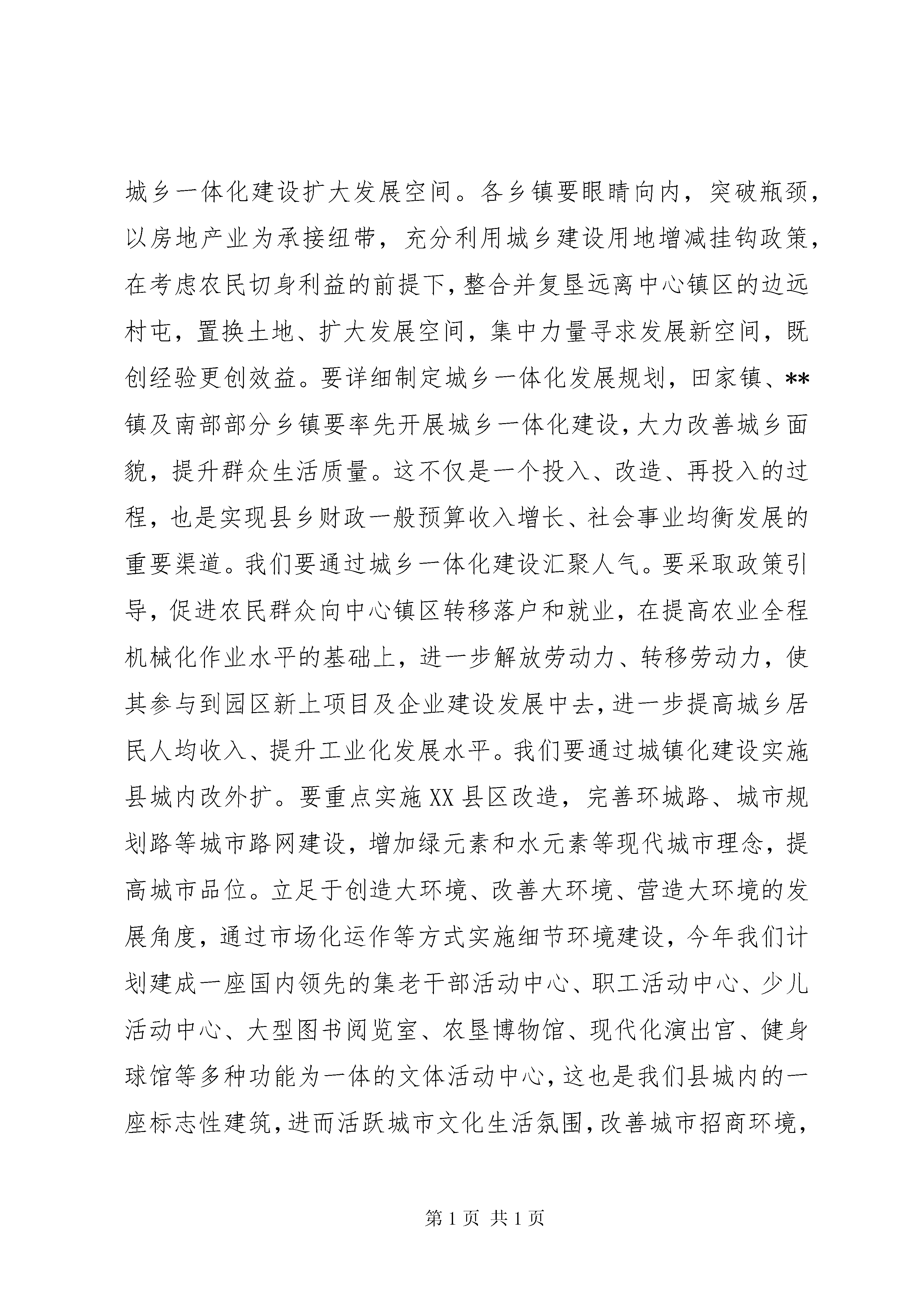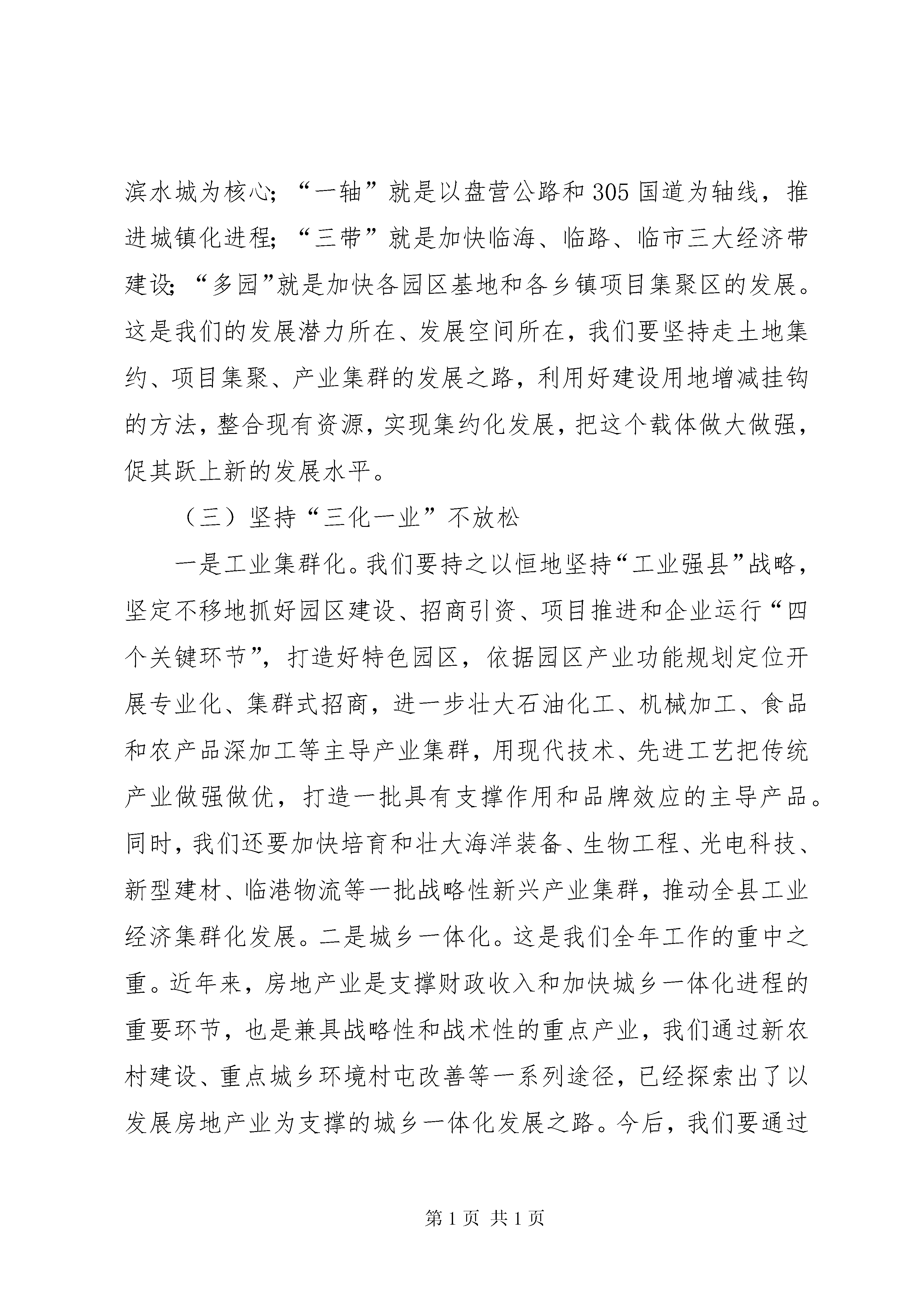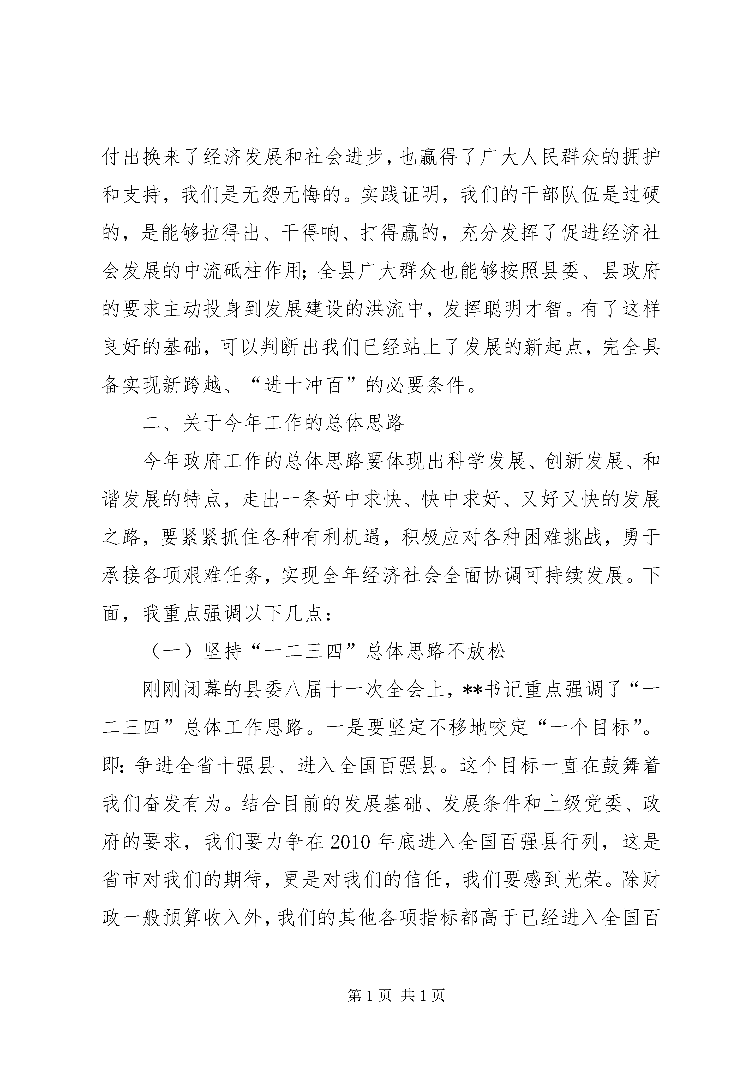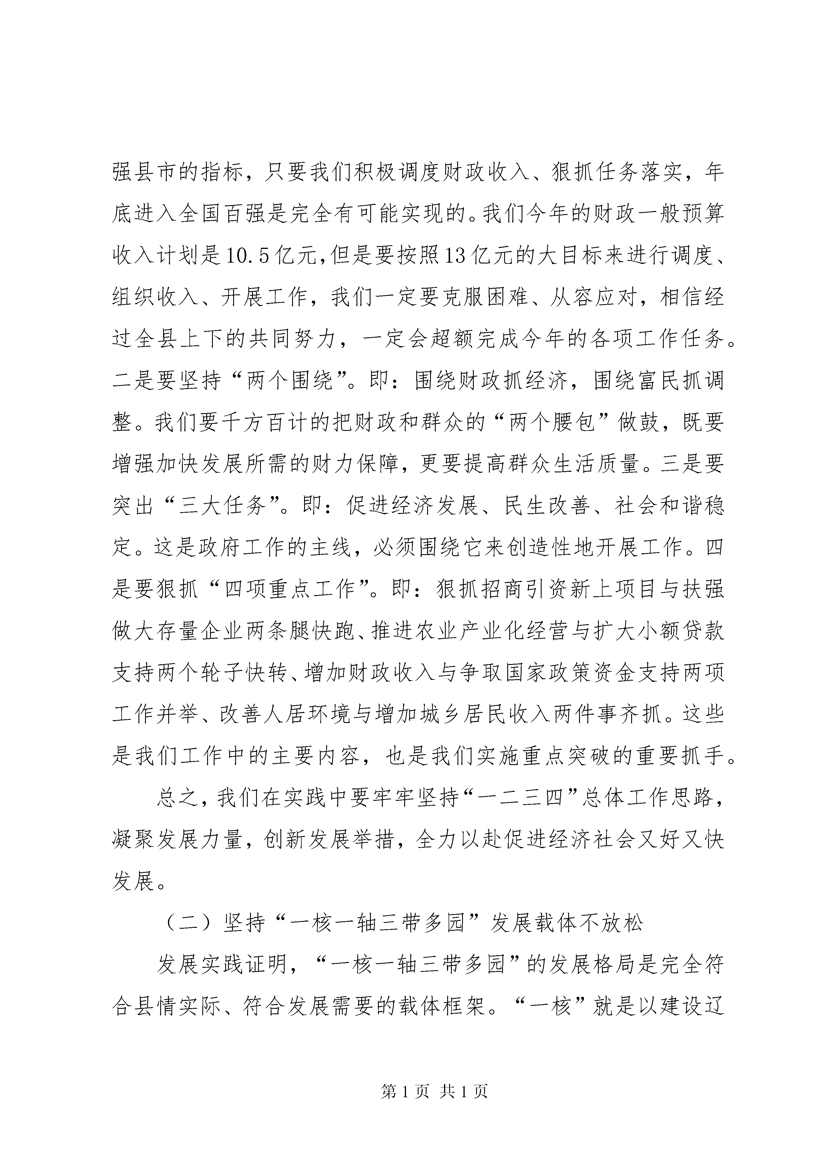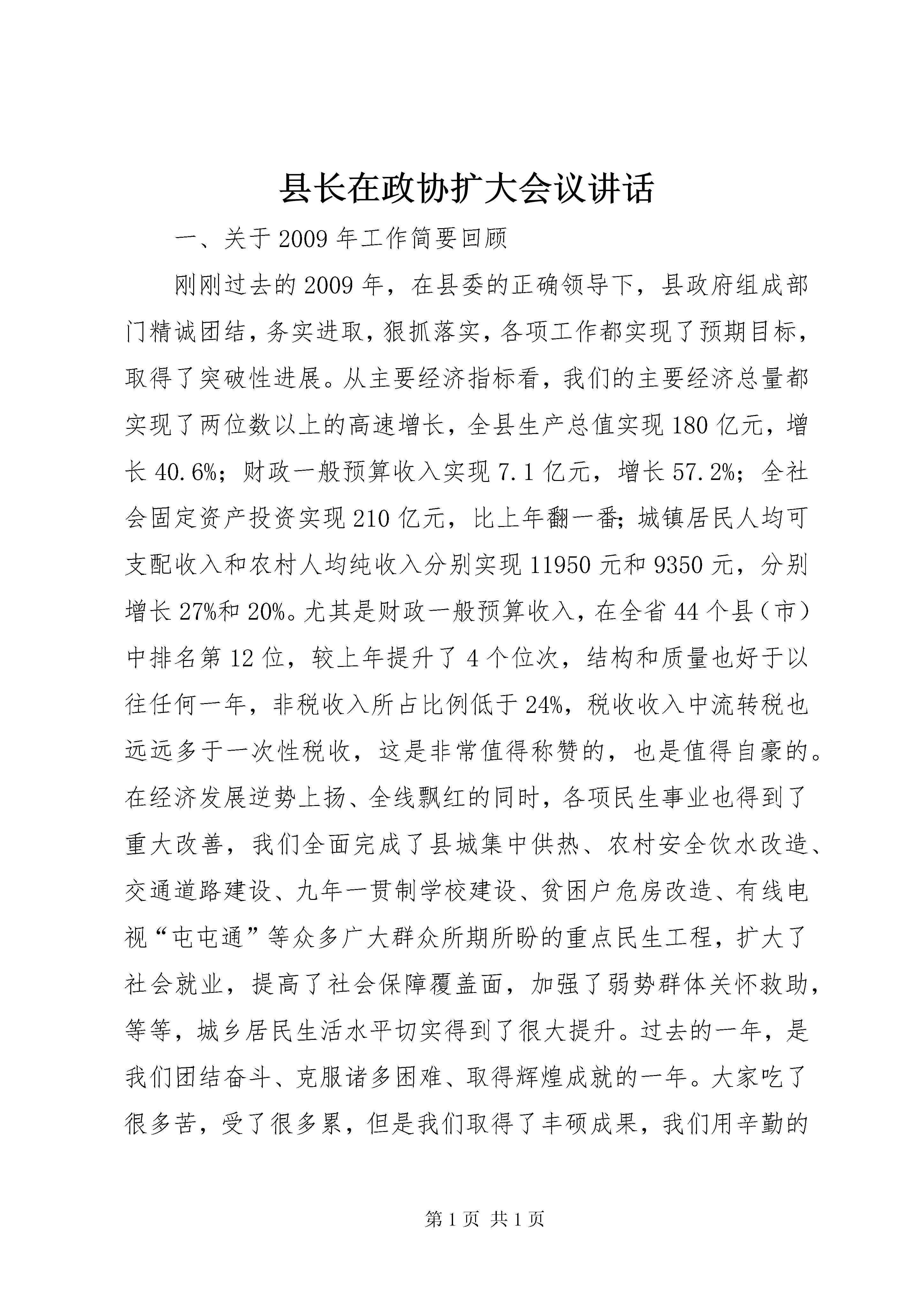 县长在政协扩大会议讲话一、关于2009年工作简要回顾刚刚过去的2009年,在县委的正确领导下,县政府组成部门精诚团结,务实进取,狠抓落实,各项工作都实现了预期目标,取得了突破性进展。从主要经济指标看,我们的主要经济总量都实现了两位数以上的高速增长,全县生产总值实现180亿元,增长40.6%;财政一般预算收入实现7.1亿元,增长57.2%;全社会固定资产投资实现210亿元,比上年翻一番;城镇居民人均可支配收入和农村人均纯收入分别实现11950元和9350元,分别增长27%和20%。尤其是财政一般预算收入,在全省44个县(市)中排名第12位,较上年提升了4个位次,结构和质量也好于以往任何一年,非税收入所占比例低于24%,税收收入中流转税也远远多于一次性税收,这是非常值得称赞的,也是值得自豪的。在经济发展逆势上扬、全线飘红的同时,各项民生事业也得到了重大改善,我们全面完成了县城集中供热、农村安全饮水改造、交通道路建设、九年一贯制学校建设、贫困户危房改造、有线电视“屯屯通”等众多广大群众所期所盼的重点民生工程,扩大了社会就业,提高了社会保障覆盖面,加强了弱势群体关怀救助,等等,城乡居民生活水平切实得到了很大提升。过去的一年,是我们团结奋斗、克服诸多困难、取得辉煌成就的一年。大家吃了很多苦,受了很多累,但是我们取得了丰硕成果,我们用辛勤的付出换来了经济发展和社会进步,也赢得了广大人民群众的拥护和支持,我们是无怨无悔的。实践证明,我们的干部队伍是过硬的,是能够拉得出、干得响、打得赢的,充分发挥了促进经济社会发展的中流砥柱作用;全县广大群众也能够按照县委、县政府的要求主动投身到发展建设的洪流中,发挥聪明才智。有了这样良好的基础,可以判断出我们已经站上了发展的新起点,完全具备实现新跨越、“进十冲百”的必要条件。二、关于今年工作的总体思路今年政府工作的总体思路要体现出科学发展、创新发展、和谐发展的特点,走出一条好中求快、快中求好、又好又快的发展之路,要紧紧抓住各种有利机遇,积极应对各种困难挑战,勇于承接各项艰难任务,实现全年经济社会全面协调可持续发展。下面,我重点强调以下几点:(一)坚持“一二三四”总体思路不放松刚刚闭幕的县委八届十一次全会上,**书记重点强调了“一二三四”总体工作思路。一是要坚定不移地咬定“一个目标”。即:争进全省十强县、进入全国百强县。这个目标一直在鼓舞着我们奋发有为。结合目前的发展基础、发展条件和上级党委、政府的要求,我们要力争在2010年底进入全国百强县行列,这是省市对我们的期待,更是对我们的信任,我们要感到光荣。除财政一般预算收入外,我们的其他各项指标都高于已经进入全国百强县市的指标,只要我们积极调度财政收入、狠抓任务落实,年底进入全国百强是完全有可能实现的。我们今年的财政一般预算收入计划是10.5亿元,但是要按照13亿元的大目标来进行调度、组织收入、开展工作,我们一定要克服困难、从容应对,相信经过全县上下的共同努力,一定会超额完成今年的各项工作任务。二是要坚持“两个围绕”。即:围绕财政抓经济,围绕富民抓调整。我们要千方百计的把财政和群众的“两个腰包”做鼓,既要增强加快发展所需的财力保障,更要提高群众生活质量。三是要突出“三大任务”。即:促进经济发展、民生改善、社会和谐稳定。这是政府工作的主线,必须围绕它来创造性地开展工作。四是要狠抓“四项重点工作”。即:狠抓招商引资新上项目与扶强做大存量企业两条腿快跑、推进农业产业化经营与扩大小额贷款支持两个轮子快转、增加财政收入与争取国家政策资金支持两项工作并举、改善人居环境与增加城乡居民收入两件事齐抓。这些是我们工作中的主要内容,也是我们实施重点突破的重要抓手。总之,我们在实践中要牢牢坚持“一二三四”总体工作思路,凝聚发展力量,创新发展举措,全力以赴促进经济社会又好又快发展。(二)坚持“一核一轴三带多园”发展载体不放松发展实践证明,“一核一轴三带多园”的发展格局是完全符合县情实际、符合发展需要的载体框架。“一核”就是以建设辽滨水城为核心;“一轴”就是以盘营公路和305国道为轴线,推进城镇化进程;“三带”就是加快临海、临路、临市三大经济带建设;“多园”就是加快各园区基地和各乡镇项目集聚区的发展。这是我们的发展潜力所在、发展空间所在,我们要坚持走土地集约、项目集聚、产业集群的发展之路,利用好建设用地增减挂钩的方法,整合现有资源,实现集约化发展,把这个载体做大做强,促其跃上新的发展水平。(三)坚持“三化一业”不放松一是工业集群化。我们要持之以恒地坚持“工业强县”战略,坚定不移地抓好园区建设、招商引资、项目推进和企业运行“四个关键环节”,打造好特色园区,依据园区产业功能规划定位开展专业化、集群式招商,进一步壮大石油化工、机械加工、食品和农产品深加工等主导产业集群