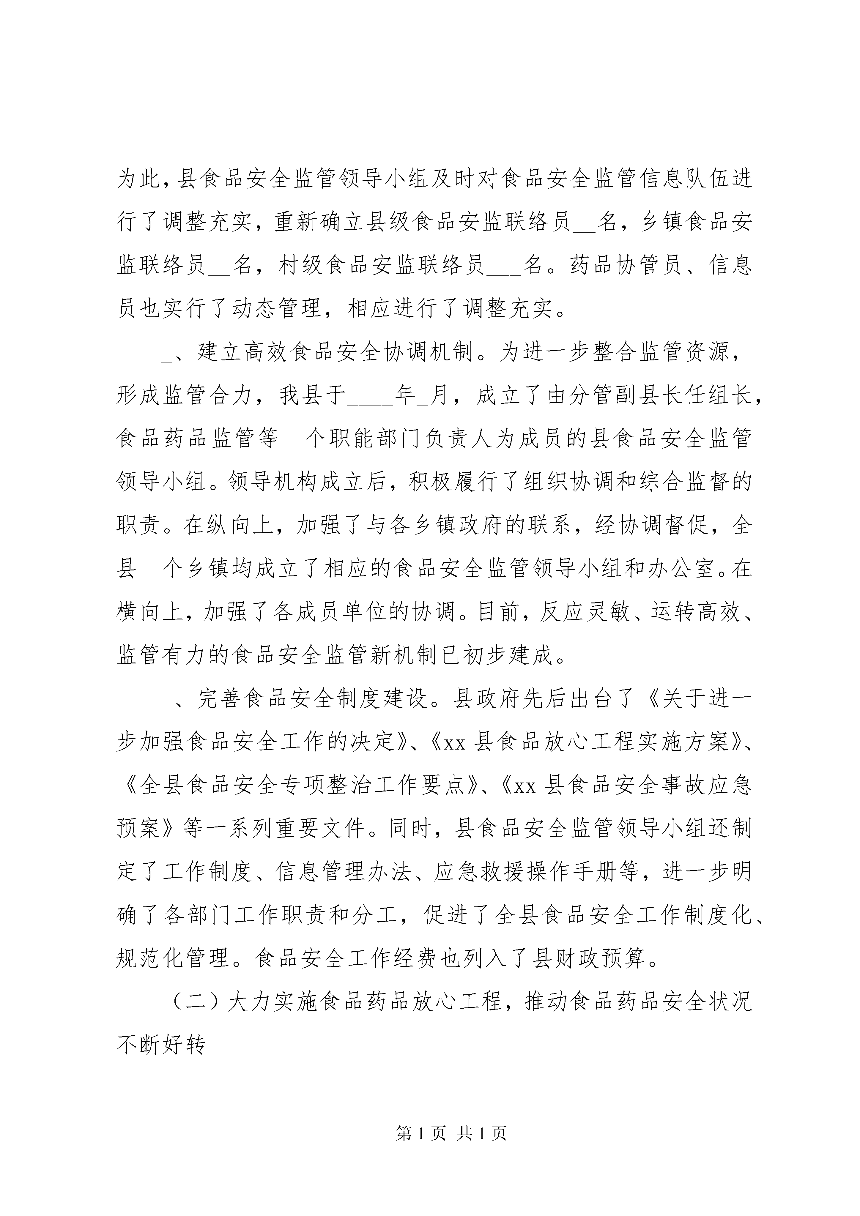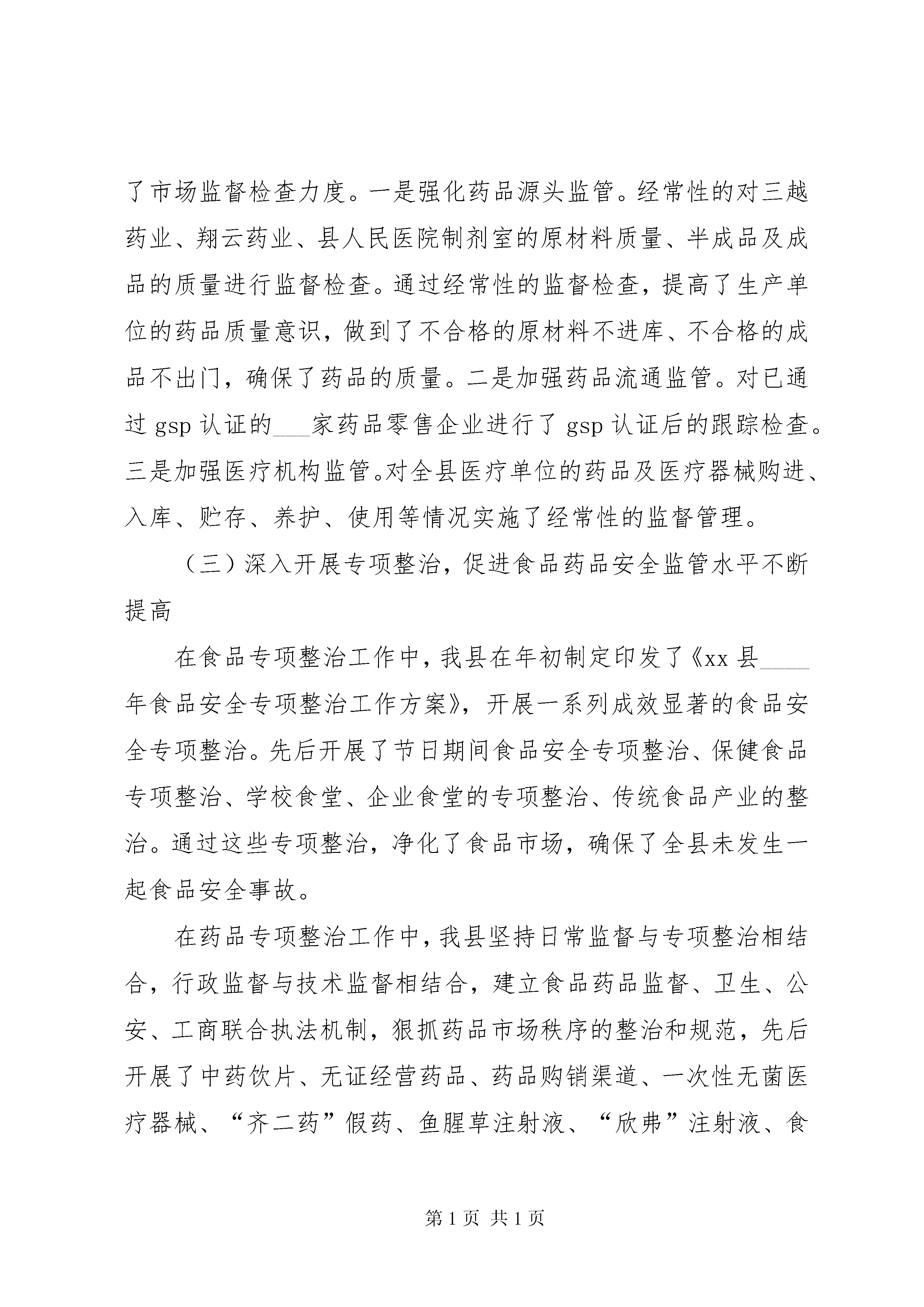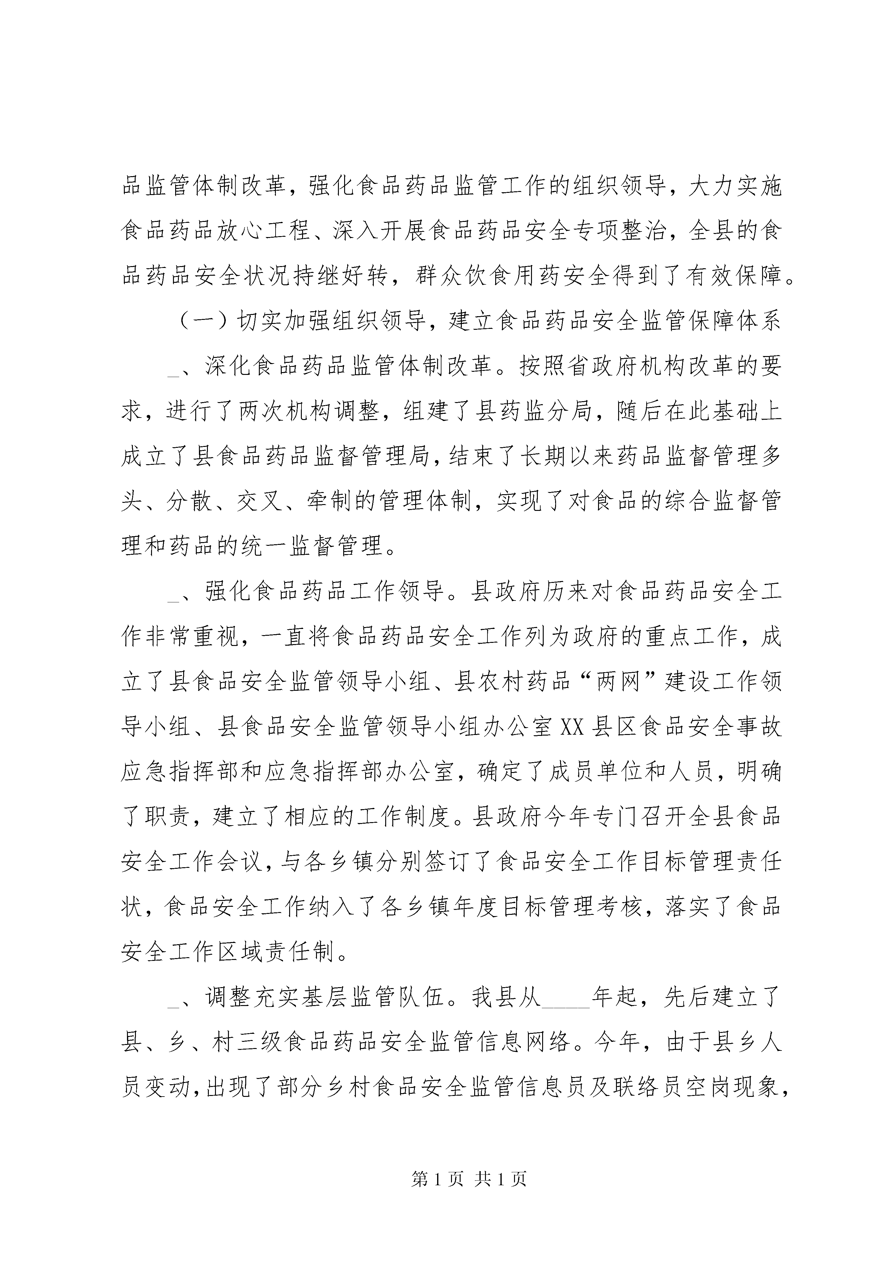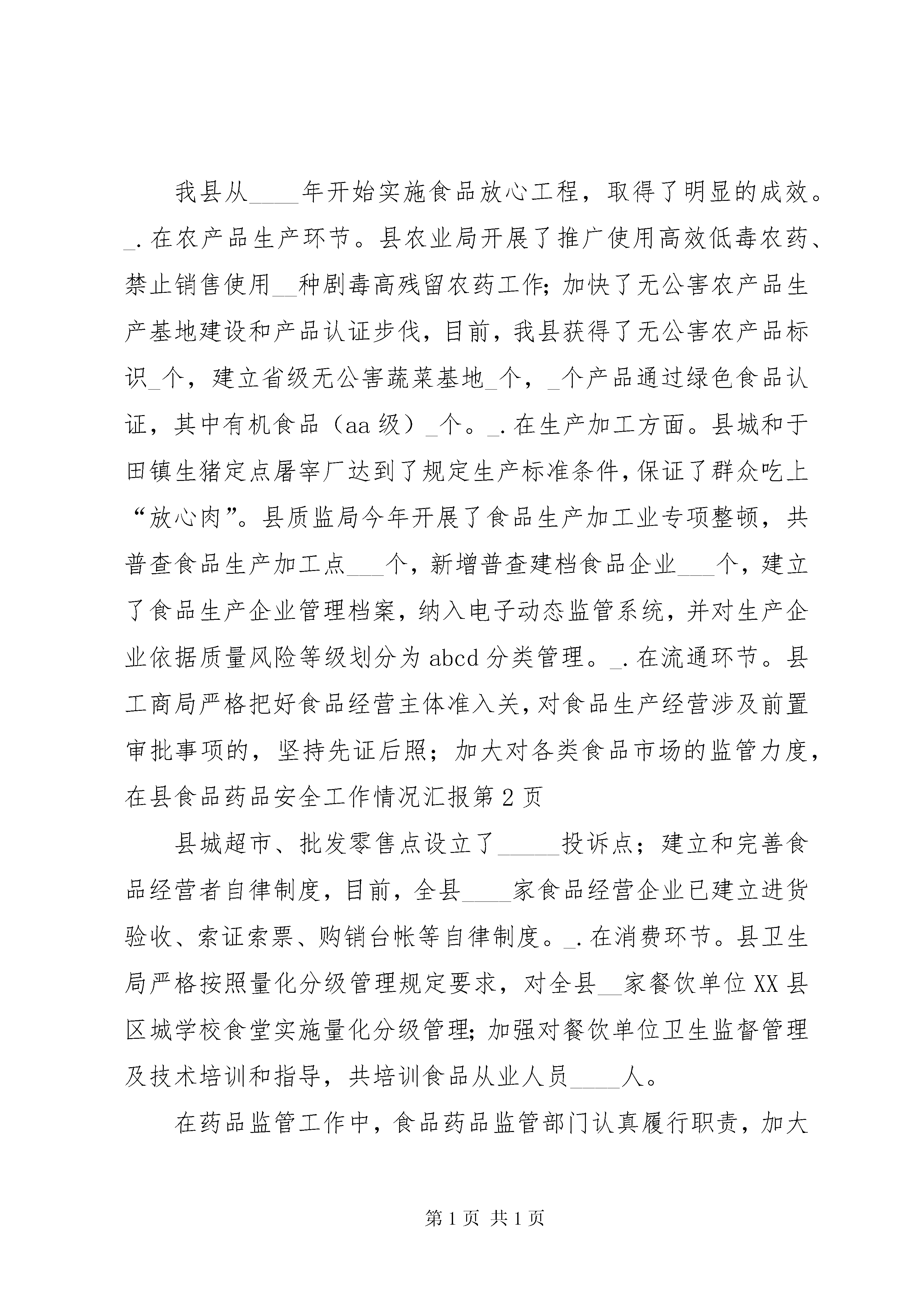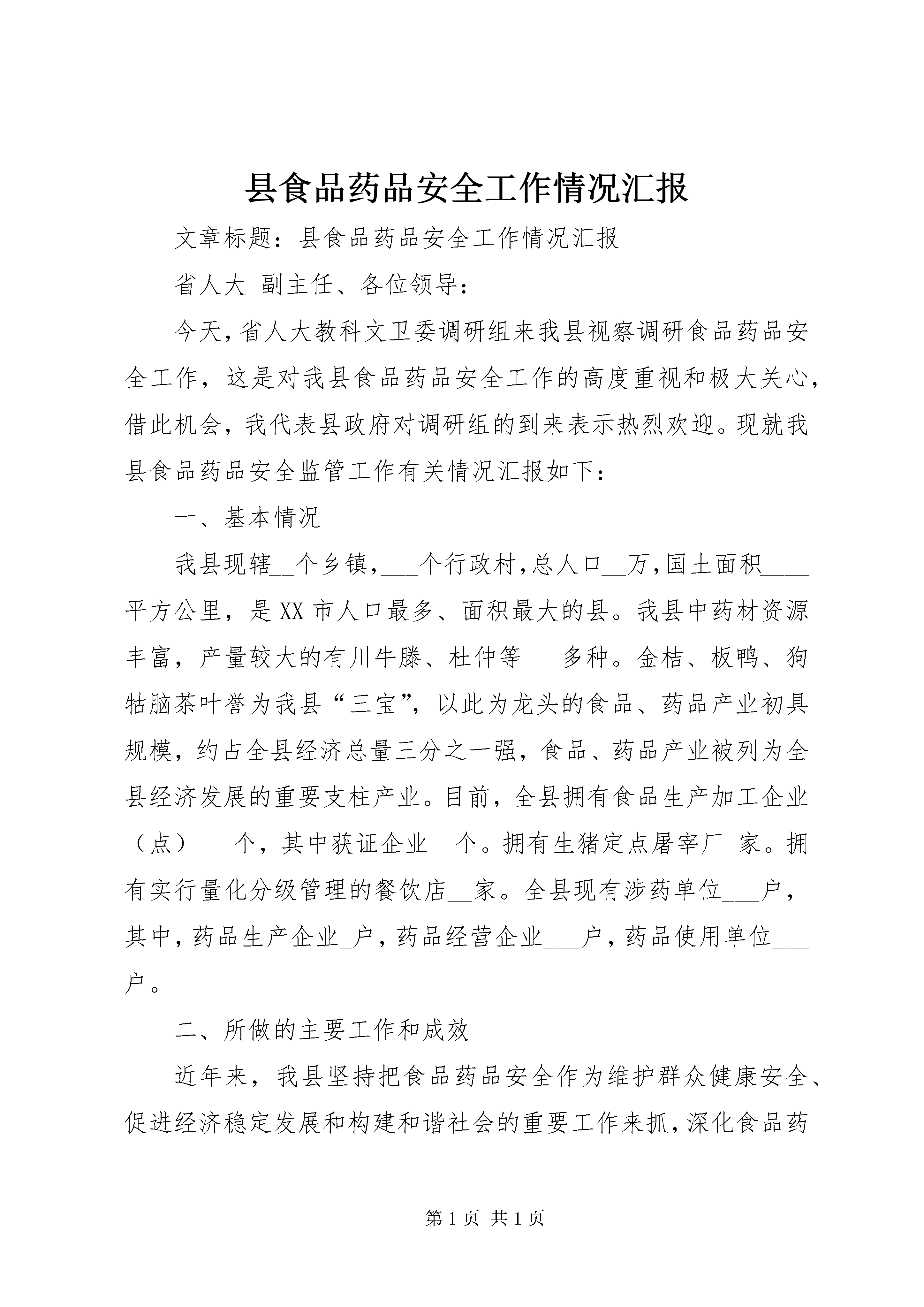 县食品药品安全工作情况汇报文章标题:县食品药品安全工作情况汇报省人大_副主任、各位领导:今天,省人大教科文卫委调研组来我县视察调研食品药品安全工作,这是对我县食品药品安全工作的高度重视和极大关心,借此机会,我代表县政府对调研组的到来表示热烈欢迎。现就我县食品药品安全监管工作有关情况汇报如下:一、基本情况我县现辖__个乡镇,___个行政村,总人口__万,国土面积____平方公里,是XX市人口最多、面积最大的县。我县中药材资源丰富,产量较大的有川牛滕、杜仲等___多种。金桔、板鸭、狗牯脑茶叶誉为我县“三宝”,以此为龙头的食品、药品产业初具规模,约占全县经济总量三分之一强,食品、药品产业被列为全县经济发展的重要支柱产业。目前,全县拥有食品生产加工企业(点)___个,其中获证企业__个。拥有生猪定点屠宰厂_家。拥有实行量化分级管理的餐饮店__家。全县现有涉药单位___户,其中,药品生产企业_户,药品经营企业___户,药品使用单位___户。二、所做的主要工作和成效近年来,我县坚持把食品药品安全作为维护群众健康安全、促进经济稳定发展和构建和谐社会的重要工作来抓,深化食品药品监管体制改革,强化食品药品监管工作的组织领导,大力实施食品药品放心工程、深入开展食品药品安全专项整治,全县的食品药品安全状况持继好转,群众饮食用药安全得到了有效保障。(一)切实加强组织领导,建立食品药品安全监管保障体系_、深化食品药品监管体制改革。按照省政府机构改革的要求,进行了两次机构调整,组建了县药监分局,随后在此基础上成立了县食品药品监督管理局,结束了长期以来药品监督管理多头、分散、交叉、牵制的管理体制,实现了对食品的综合监督管理和药品的统一监督管理。_、强化食品药品工作领导。县政府历来对食品药品安全工作非常重视,一直将食品药品安全工作列为政府的重点工作,成立了县食品安全监管领导小组、县农村药品“两网”建设工作领导小组、县食品安全监管领导小组办公室XX县区食品安全事故应急指挥部和应急指挥部办公室,确定了成员单位和人员,明确了职责,建立了相应的工作制度。县政府今年专门召开全县食品安全工作会议,与各乡镇分别签订了食品安全工作目标管理责任状,食品安全工作纳入了各乡镇年度目标管理考核,落实了食品安全工作区域责任制。_、调整充实基层监管队伍。我县从____年起,先后建立了县、乡、村三级食品药品安全监管信息网络。今年,由于县乡人员变动,出现了部分乡村食品安全监管信息员及联络员空岗现象,为此,县食品安全监管领导小组及时对食品安全监管信息队伍进行了调整充实,重新确立县级食品安监联络员__名,乡镇食品安监联络员__名,村级食品安监联络员___名。药品协管员、信息员也实行了动态管理,相应进行了调整充实。_、建立高效食品安全协调机制。为进一步整合监管资源,形成监管合力,我县于____年_月,成立了由分管副县长任组长,食品药品监管等__个职能部门负责人为成员的县食品安全监管领导小组。领导机构成立后,积极履行了组织协调和综合监督的职责。在纵向上,加强了与各乡镇政府的联系,经协调督促,全县__个乡镇均成立了相应的食品安全监管领导小组和办公室。在横向上,加强了各成员单位的协调。目前,反应灵敏、运转高效、监管有力的食品安全监管新机制已初步建成。_、完善食品安全制度建设。县政府先后出台了《关于进一步加强食品安全工作的决定》、《xx县食品放心工程实施方案》、《全县食品安全专项整治工作要点》、《xx县食品安全事故应急预案》等一系列重要文件。同时,县食品安全监管领导小组还制定了工作制度、信息管理办法、应急救援操作手册等,进一步明确了各部门工作职责和分工,促进了全县食品安全工作制度化、规范化管理。食品安全工作经费也列入了县财政预算。(二)大力实施食品药品放心工程,推动食品药品安全状况不断好转我县从____年开始实施食品放心工程,取得了明显的成效。_.在农产品生产环节。县农业局开展了推广使用高效低毒农药、禁止销售使用__种剧毒高残留农药工作;加快了无公害农产品生产基地建设和产品认证步伐,目前,我县获得了无公害农产品标识_个,建立省级无公害蔬菜基地_个,_个产品通过绿色食品认证,其中有机食品(aa级)_个。_.在生产加工方面。县城和于田镇生猪定点屠宰厂达到了规定生产标准条件,保证了群众吃上“放心肉”。县质监局今年开展了食品生产加工业专项整顿,共普查食品生产加工点___个,新增普查建档食品企业___个,建立了食品生产企业管理档案,纳入电子动态监管系统,并对生产企业依据质量风险等级划分为abcd分类管理。_.在流通环节。县工商局严格把好食品经营主体准入关,对食品生产经营涉及前置审批事项的,坚持先证后照;加大对各类食品市场的监管力度,在县食品药品安全工作情况汇报县城超市、批发零售点设