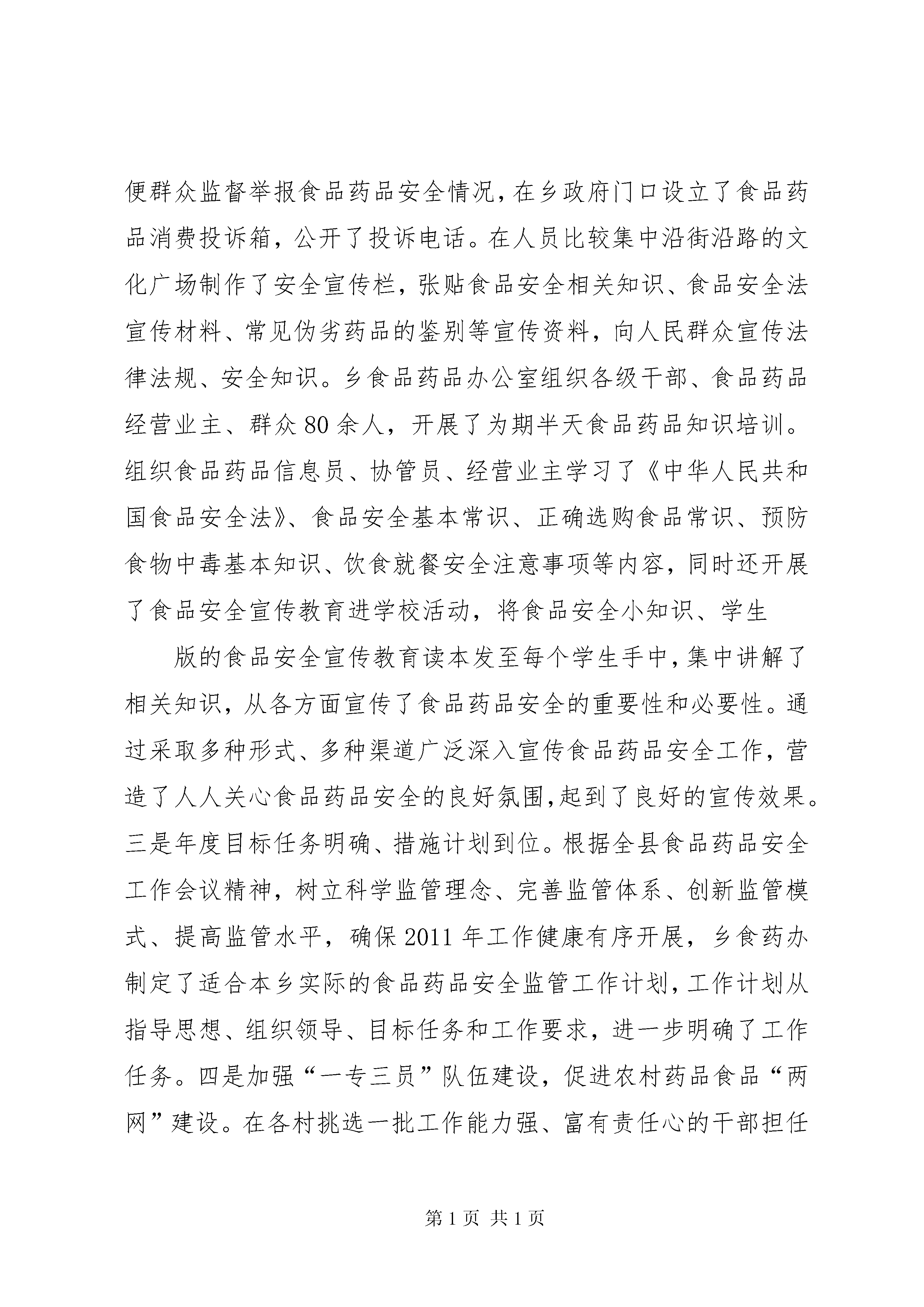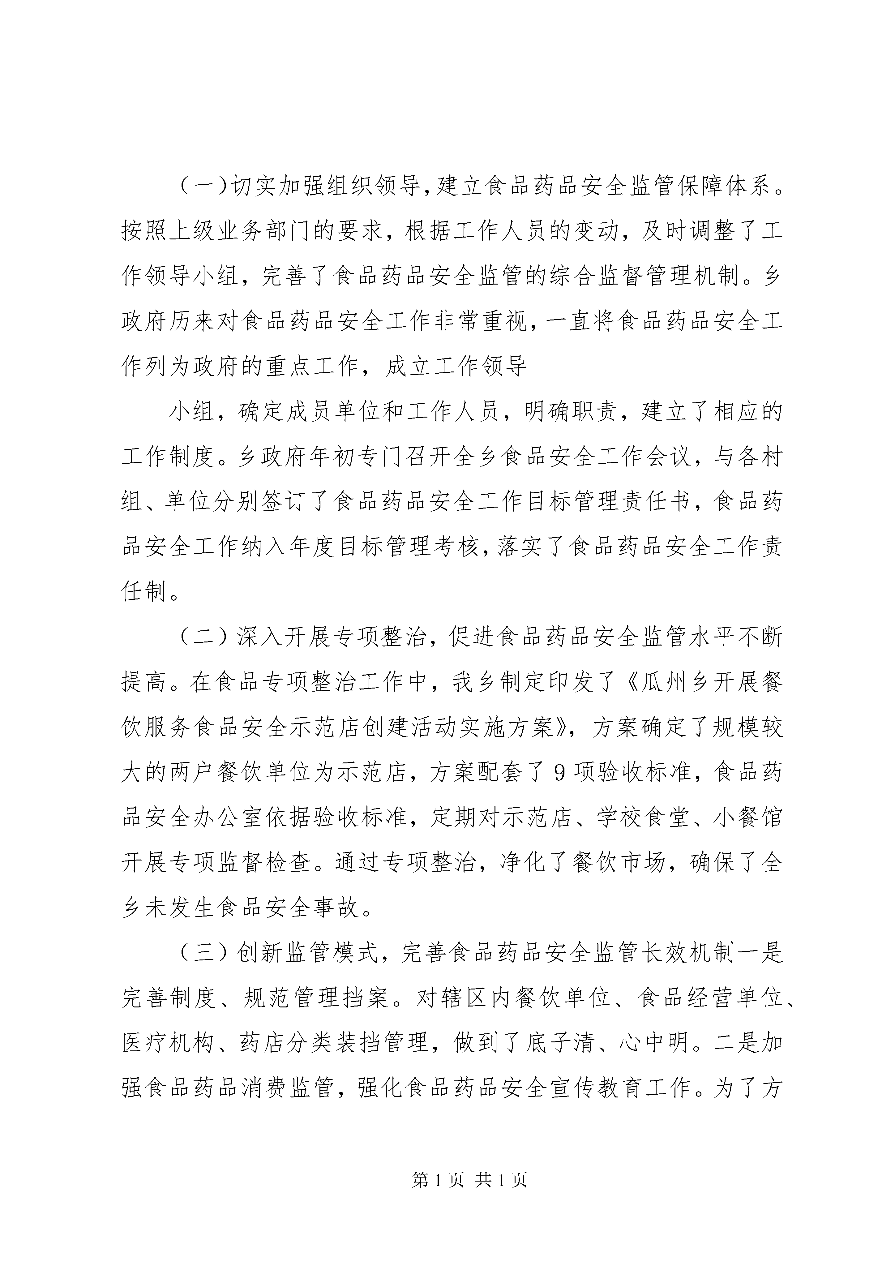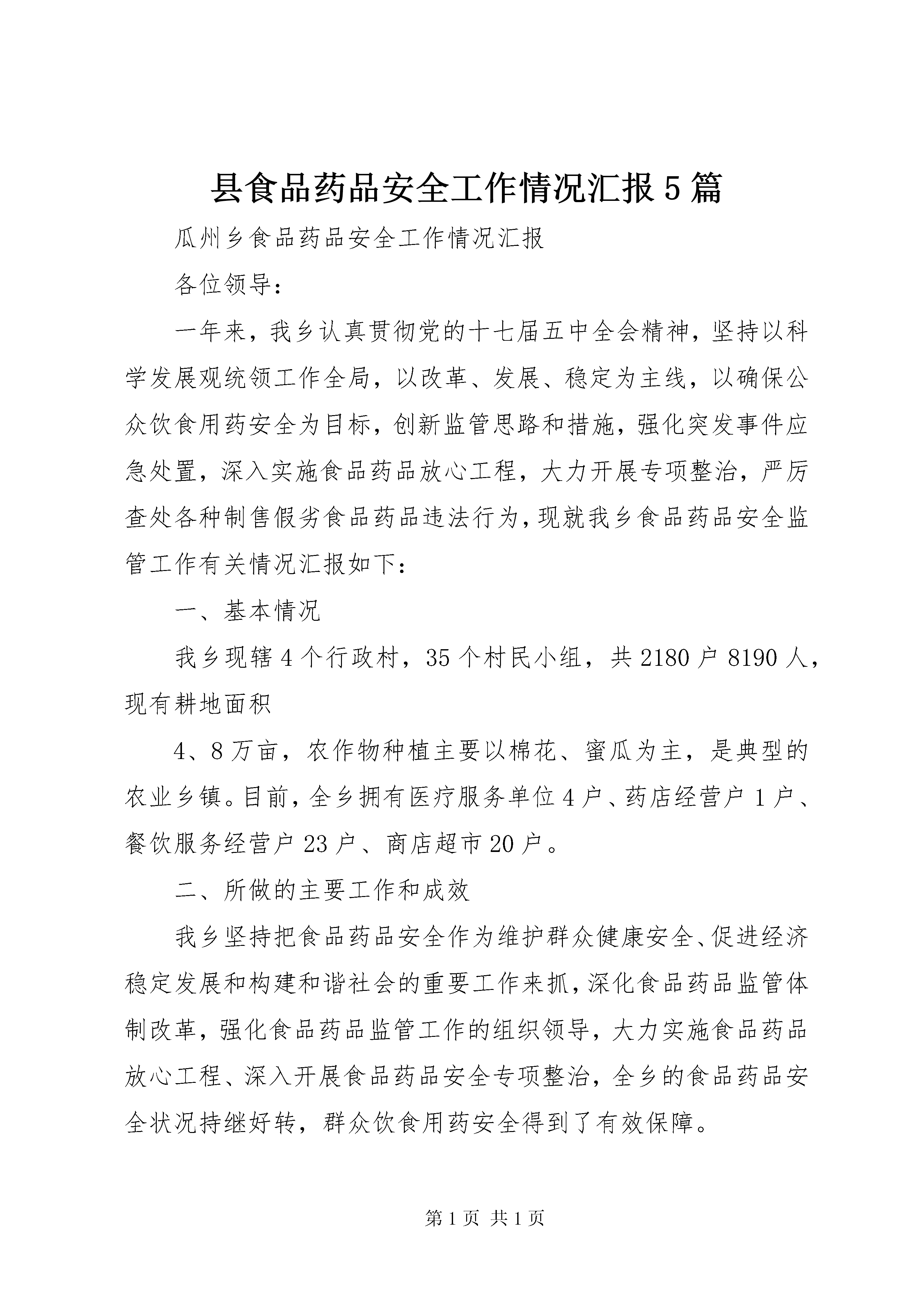 县食品药品安全工作情况汇报5篇瓜州乡食品药品安全工作情况汇报各位领导:一年来,我乡认真贯彻党的十七届五中全会精神,坚持以科学发展观统领工作全局,以改革、发展、稳定为主线,以确保公众饮食用药安全为目标,创新监管思路和措施,强化突发事件应急处置,深入实施食品药品放心工程,大力开展专项整治,严厉查处各种制售假劣食品药品违法行为,现就我乡食品药品安全监管工作有关情况汇报如下:一、基本情况我乡现辖4个行政村,35个村民小组,共2180户8190人,现有耕地面积4、8万亩,农作物种植主要以棉花、蜜瓜为主,是典型的农业乡镇。目前,全乡拥有医疗服务单位4户、药店经营户1户、餐饮服务经营户23户、商店超市20户。二、所做的主要工作和成效我乡坚持把食品药品安全作为维护群众健康安全、促进经济稳定发展和构建和谐社会的重要工作来抓,深化食品药品监管体制改革,强化食品药品监管工作的组织领导,大力实施食品药品放心工程、深入开展食品药品安全专项整治,全乡的食品药品安全状况持继好转,群众饮食用药安全得到了有效保障。(一)切实加强组织领导,建立食品药品安全监管保障体系。按照上级业务部门的要求,根据工作人员的变动,及时调整了工作领导小组,完善了食品药品安全监管的综合监督管理机制。乡政府历来对食品药品安全工作非常重视,一直将食品药品安全工作列为政府的重点工作,成立工作领导小组,确定成员单位和工作人员,明确职责,建立了相应的工作制度。乡政府年初专门召开全乡食品安全工作会议,与各村组、单位分别签订了食品药品安全工作目标管理责任书,食品药品安全工作纳入年度目标管理考核,落实了食品药品安全工作责任制。(二)深入开展专项整治,促进食品药品安全监管水平不断提高。在食品专项整治工作中,我乡制定印发了《瓜州乡开展餐饮服务食品安全示范店创建活动实施方案》,方案确定了规模较大的两户餐饮单位为示范店,方案配套了9项验收标准,食品药品安全办公室依据验收标准,定期对示范店、学校食堂、小餐馆开展专项监督检查。通过专项整治,净化了餐饮市场,确保了全乡未发生食品安全事故。(三)创新监管模式,完善食品药品安全监管长效机制一是完善制度、规范管理挡案。对辖区内餐饮单位、食品经营单位、医疗机构、药店分类装挡管理,做到了底子清、心中明。二是加强食品药品消费监管,强化食品药品安全宣传教育工作。为了方便群众监督举报食品药品安全情况,在乡政府门口设立了食品药品消费投诉箱,公开了投诉电话。在人员比较集中沿街沿路的文化广场制作了安全宣传栏,张贴食品安全相关知识、食品安全法宣传材料、常见伪劣药品的鉴别等宣传资料,向人民群众宣传法律法规、安全知识。乡食品药品办公室组织各级干部、食品药品经营业主、群众80余人,开展了为期半天食品药品知识培训。组织食品药品信息员、协管员、经营业主学习了《中华人民共和国食品安全法》、食品安全基本常识、正确选购食品常识、预防食物中毒基本知识、饮食就餐安全注意事项等内容,同时还开展了食品安全宣传教育进学校活动,将食品安全小知识、学生版的食品安全宣传教育读本发至每个学生手中,集中讲解了相关知识,从各方面宣传了食品药品安全的重要性和必要性。通过采取多种形式、多种渠道广泛深入宣传食品药品安全工作,营造了人人关心食品药品安全的良好氛围,起到了良好的宣传效果。三是年度目标任务明确、措施计划到位。根据全县食品药品安全工作会议精神,树立科学监管理念、完善监管体系、创新监管模式、提高监管水平,确保2011年工作健康有序开展,乡食药办制定了适合本乡实际的食品药品安全监管工作计划,工作计划从指导思想、组织领导、目标任务和工作要求,进一步明确了工作任务。四是加强“一专三员”队伍建设,促进农村药品食品“两网”建设。在各村挑选一批工作能力强、富有责任心的干部担任村食品药品安全信息员和协管员,形成了横向到边、纵向到底的食品安全监管网络,消除了农村食品安全监管盲区。以乡村组食品药品安全监管网络为主体,实行食品安全目标考核责任书制度,充分调动政府、监管部门和经营业主的积极性,进一步夯实了自律与他律结合、奖励和惩处并举、社会广泛参与的食品安全保障体系。五是监督检查、确保饮食安全。为切实加强辖区内食品药品安全监管力度,乡食品药品安全办公室积极协调乡卫生院、卫生办公室互相配合,定期不定期对商店、超市、粮油蔬菜店及餐饮单位进行食品安全检查,重点以证照是否齐全、从业人员是否进行健康体检、经营单位有无“三无商品”及过期和即将到期的食品以及室内卫生、周边环境情况。通过有效的监督检查,进一步规范了经营户的经营行为,打击了非法经营行为,净化了区域内食品卫生市场。六是积极开展监督整治活动。集中对餐饮服务单位进行定期监督检查,与经营户签定餐饮服务单位承诺书、食品安全承诺书、食品添加剂管理“十条规定”,配发各类管理制度和宣传画
