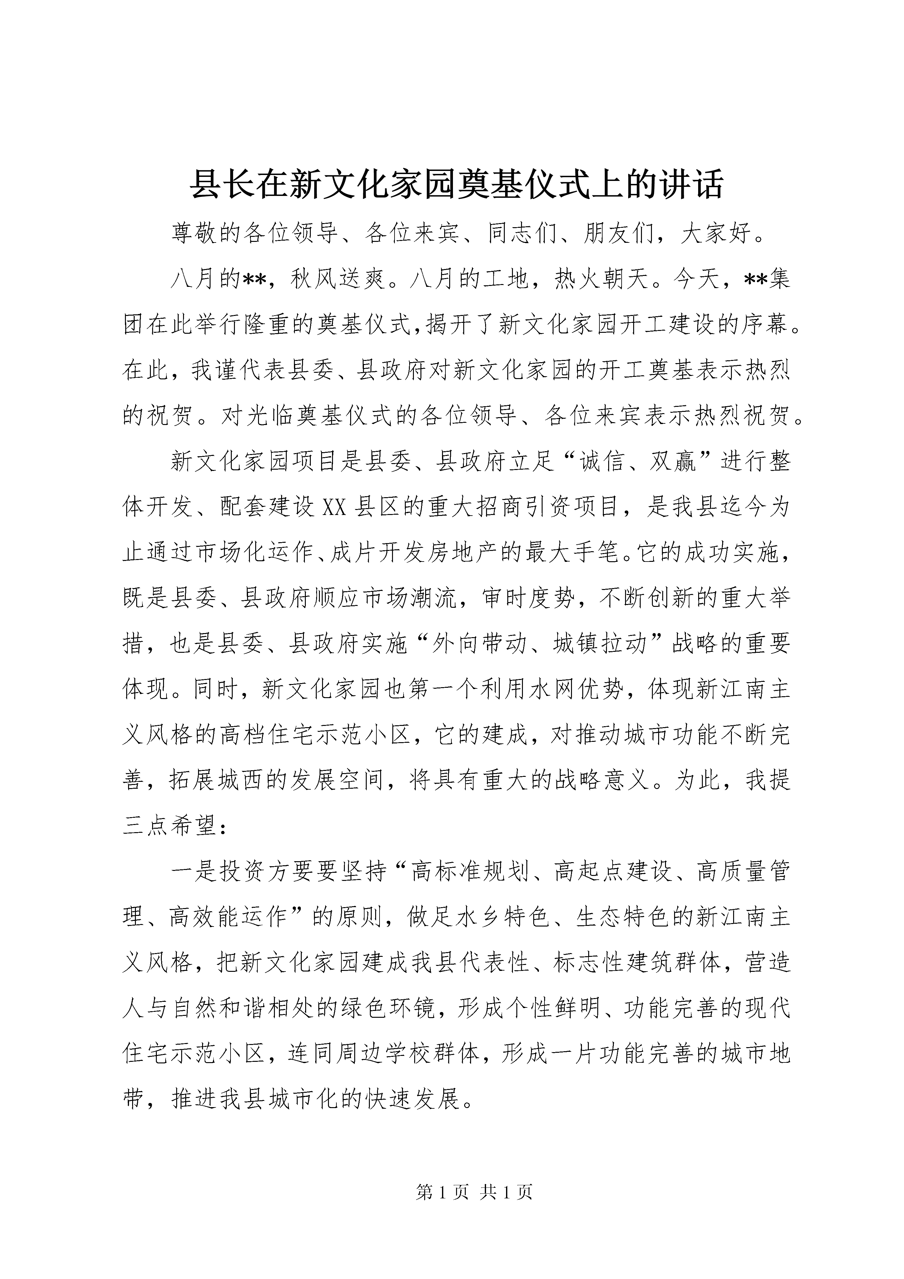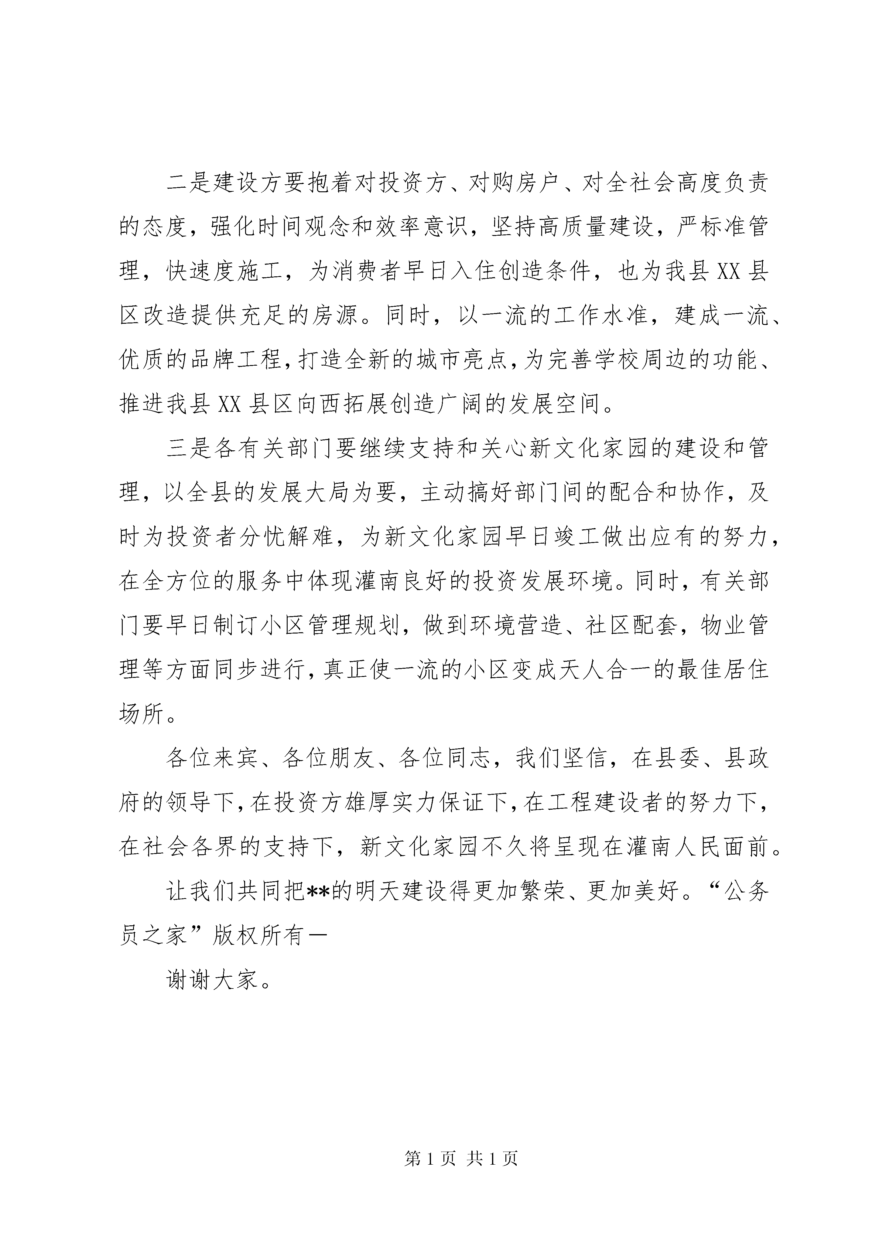 县长在新文化家园奠基仪式上的讲话尊敬的各位领导、各位来宾、同志们、朋友们,大家好。八月的**,秋风送爽。八月的工地,热火朝天。今天,**集团在此举行隆重的奠基仪式,揭开了新文化家园开工建设的序幕。在此,我谨代表县委、县政府对新文化家园的开工奠基表示热烈的祝贺。对光临奠基仪式的各位领导、各位来宾表示热烈祝贺。新文化家园项目是县委、县政府立足“诚信、双赢”进行整体开发、配套建设XX县区的重大招商引资项目,是我县迄今为止通过市场化运作、成片开发房地产的最大手笔。它的成功实施,既是县委、县政府顺应市场潮流,审时度势,不断创新的重大举措,也是县委、县政府实施“外向带动、城镇拉动”战略的重要体现。同时,新文化家园也第一个利用水网优势,体现新江南主义风格的高档住宅示范小区,它的建成,对推动城市功能不断完善,拓展城西的发展空间,将具有重大的战略意义。为此,我提三点希望:一是投资方要要坚持“高标准规划、高起点建设、高质量管理、高效能运作”的原则,做足水乡特色、生态特色的新江南主义风格,把新文化家园建成我县代表性、标志性建筑群体,营造人与自然和谐相处的绿色环镜,形成个性鲜明、功能完善的现代住宅示范小区,连同周边学校群体,形成一片功能完善的城市地带,推进我县城市化的快速发展。二是建设方要抱着对投资方、对购房户、对全社会高度负责的态度,强化时间观念和效率意识,坚持高质量建设,严标准管理,快速度施工,为消费者早日入住创造条件,也为我县XX县区改造提供充足的房源。同时,以一流的工作水准,建成一流、优质的品牌工程,打造全新的城市亮点,为完善学校周边的功能、推进我县XX县区向西拓展创造广阔的发展空间。三是各有关部门要继续支持和关心新文化家园的建设和管理,以全县的发展大局为要,主动搞好部门间的配合和协作,及时为投资者分忧解难,为新文化家园早日竣工做出应有的努力,在全方位的服务中体现灌南良好的投资发展环境。同时,有关部门要早日制订小区管理规划,做到环境营造、社区配套,物业管理等方面同步进行,真正使一流的小区变成天人合一的最佳居住场所。各位来宾、各位朋友、各位同志,我们坚信,在县委、县政府的领导下,在投资方雄厚实力保证下,在工程建设者的努力下,在社会各界的支持下,新文化家园不久将呈现在灌南人民面前。让我们共同把**的明天建设得更加繁荣、更加美好。“公务员之家”版权所有-谢谢大家。