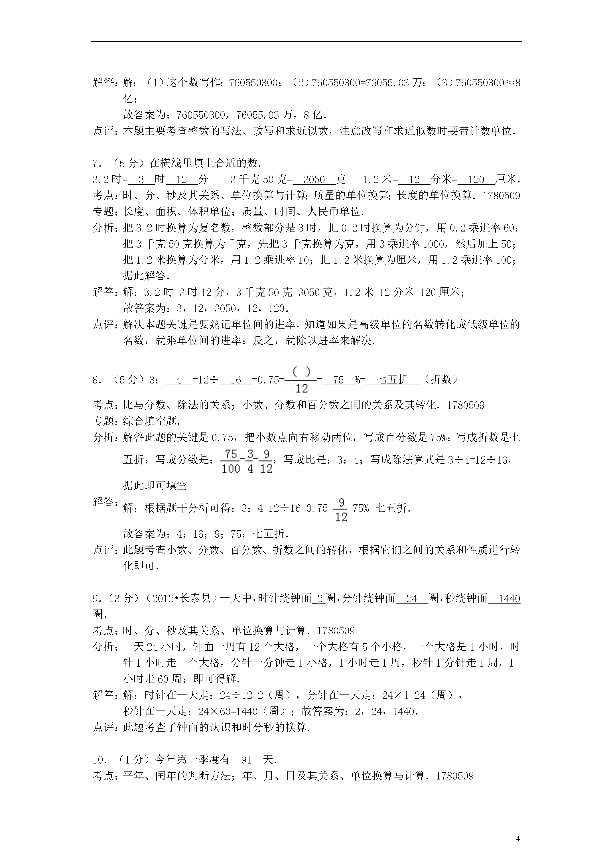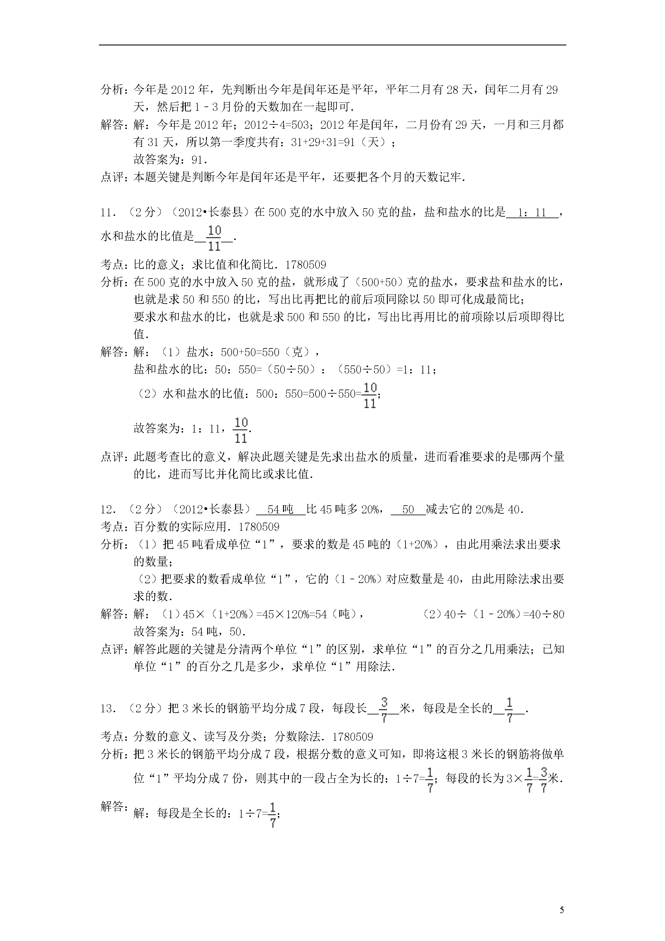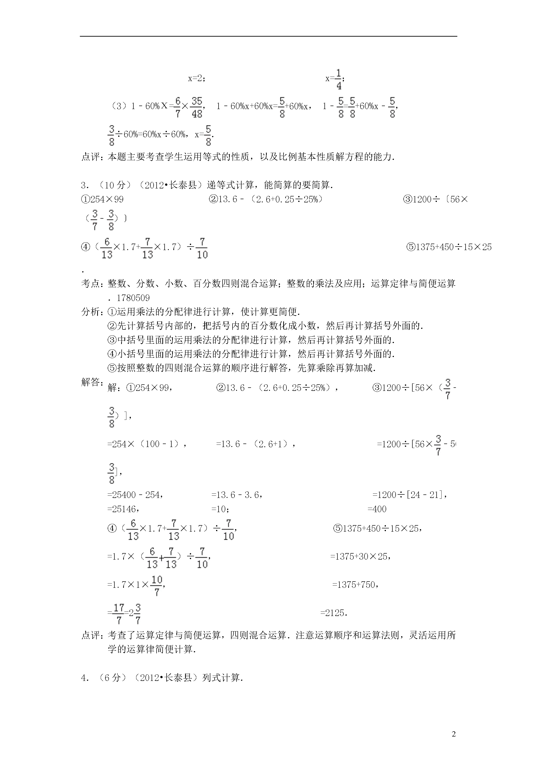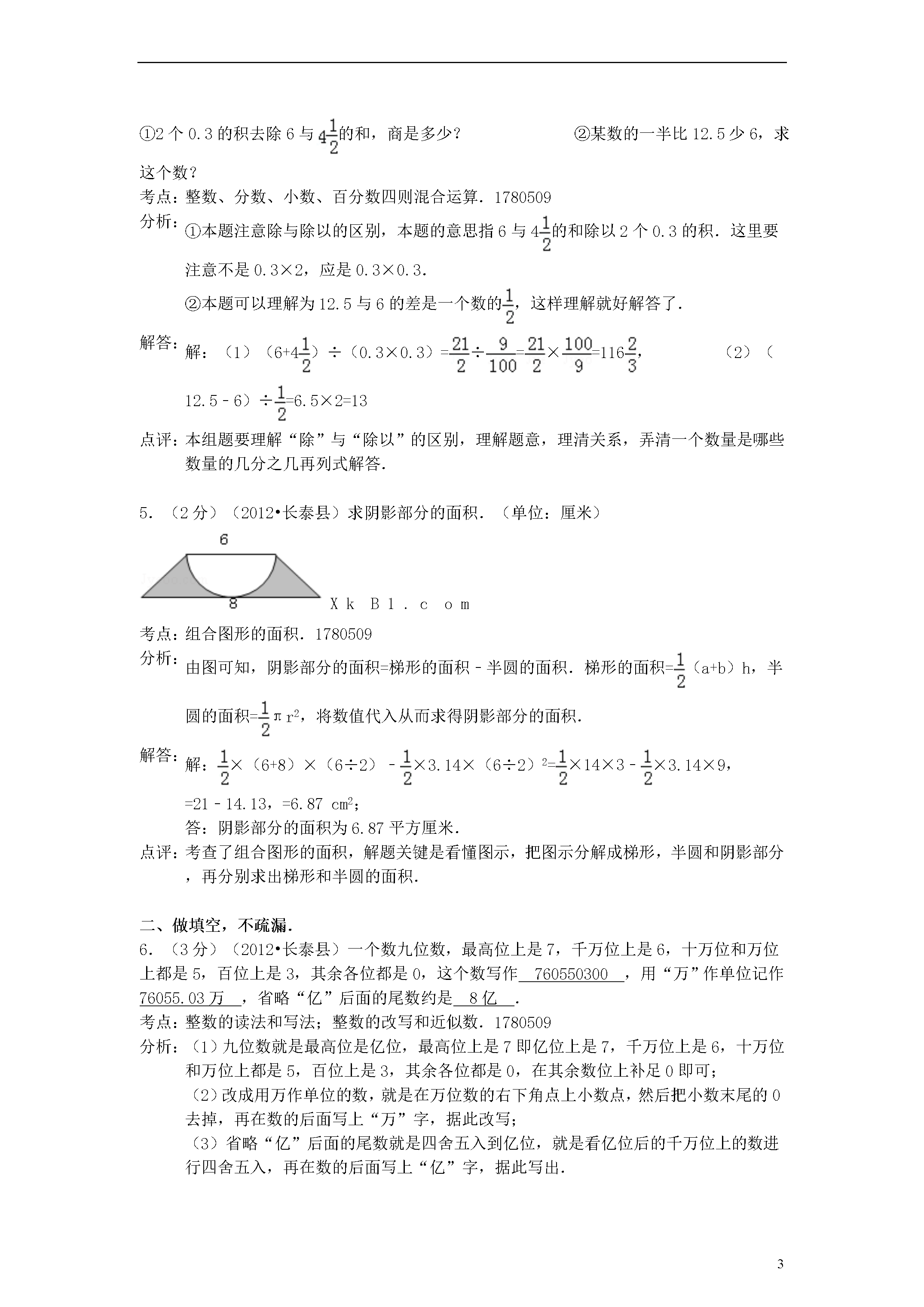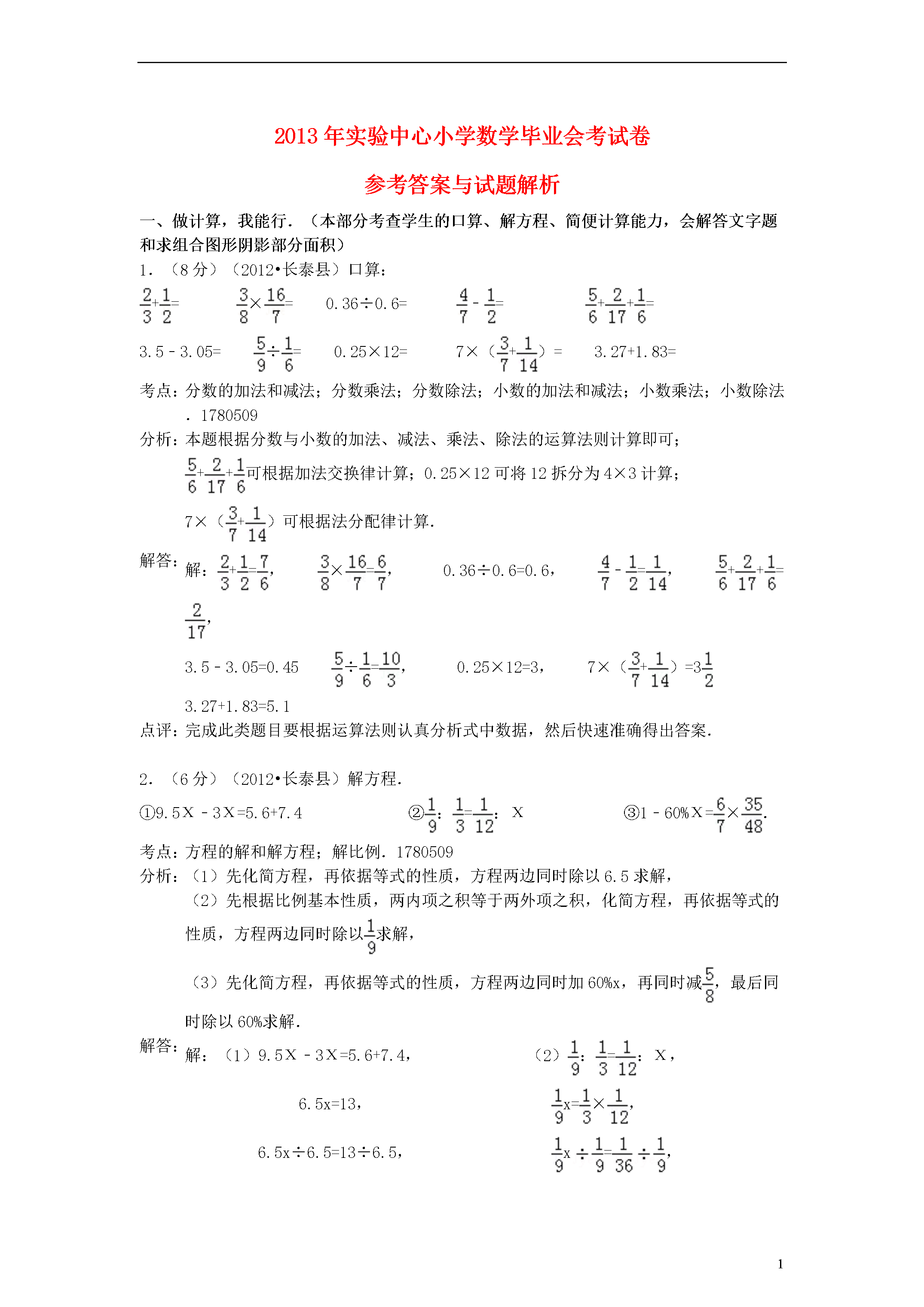 132013年实验中心小学数学毕业会考试卷参考答案与试题解析一、做计算,我能行.(本部分考查学生的口算、解方程、简便计算能力,会解答文字题和求组合图形阴影部分面积)1.(8分)(2012•长泰县)口算:+=×=0.36÷0.6=﹣=++=3.5﹣3.05=÷=0.25×12=7×(+)=3.27+1.83=考点:分数的加法和减法;分数乘法;分数除法;小数的加法和减法;小数乘法;小数除法.1780509分析:本题根据分数与小数的加法、减法、乘法、除法的运算法则计算即可;++可根据加法交换律计算;0.25×12可将12拆分为4×3计算;7×(+)可根据法分配律计算.解答:解:+=,×=,0.36÷0.6=0.6,﹣=,++=1,3.5﹣3.05=0.45÷=,0.25×12=3,7×(+)=33.27+1.83=5.1点评:完成此类题目要根据运算法则认真分析式中数据,然后快速准确得出答案.2.(6分)(2012•长泰县)解方程.①9.5Χ﹣3Χ=5.6+7.4②:=:Χ③1﹣60%Χ=×.考点:方程的解和解方程;解比例.1780509分析:(1)先化简方程,再依据等式的性质,方程两边同时除以6.5求解,(2)先根据比例基本性质,两内项之积等于两外项之积,化简方程,再依据等式的性质,方程两边同时除以求解,(3)先化简方程,再依据等式的性质,方程两边同时加60%x,再同时减,最后同时除以60%求解.解答:解:(1)9.5Χ﹣3Χ=5.6+7.4,(2):=:Χ,6.5x=13,x=×,6.5x÷6.5=13÷6.5,x=,x=2;x=;(3)1﹣60%Χ=×,1﹣60%x+60%x=+60%x,1﹣=+60%x﹣,÷60%=60%x÷60%,x=.点评:本题主要考查学生运用等式的性质,以及比例基本性质解方程的能力.3.(10分)(2012•长泰县)递等式计算,能简算的要简算.①254×99②13.6﹣(2.6+0.25÷25%)③1200÷〔56×(﹣)〕④(×1.7+×1.7)÷⑤1375+450÷15×25.考点:整数、分数、小数、百分数四则混合运算;整数的乘法及应用;运算定律与简便运算.1780509分析:①运用乘法的分配律进行计算,使计算更简便.②先计算括号内部的,把括号内的百分数化成小数,然后再计算括号外面的.③中括号里面的运用乘法的分配律进行计算,然后再计算括号外面的.④小括号里面的运用乘法的分配律进行计算,然后再计算括号外面的.⑤按照整数的四则混合运算的顺序进行解答,先算乘除再算加减.解答:解:①254×99,②13.6﹣(2.6+0.25÷25%),③1200÷[56×(﹣)],=254×(100﹣1),=13.6﹣(2.6+1),=1200÷[56×﹣56×],=25400﹣254,=13.6﹣3.6,=1200÷[24﹣21],=25146,=10;=400④(×1.7+×1.7)÷,⑤1375+450÷15×25,=1.7×()÷,=1375+30×25,=1.7×1×,=1375+750,==2=2125.点评:考查了运算定律与简便运算,四则混合运算.注意运算顺序和运算法则,灵活运用所学的运算律简便计算.4.(6分)(2012•长泰县)列式计算.①2个0.3的积去除6与的和,商是多少?②某数的一半比12.5少6,求这个数?考点:整数、分数、小数、百分数四则混合运算.1780509分析:①本题注意除与除以的区别,本题的意思指6与4的和除以2个0.3的积.这里要注意不是0.3×2,应是0.3×0.3.②本题可以理解为12.5与6的差是一个数的,这样理解就好解答了.解答:解:(1)(6+4)÷(0.3×0.3)=÷=×=116,(2)(12.5﹣6)÷=6.5×2=13点评:本组题要理解“除”与“除以”的区别,理解题意,理清关系,弄清一个数量是哪些数量的几分之几再列式解答.5.(2分)(2012•长泰县)求阴影部分的面积.(单位:厘米)XkB1.com考点:组合图形的面积.1780509分析:由图可知,阴影部分的面积=梯形的面积﹣半圆的面积.梯形的面积=(a+b)h,半圆的面积=πr2,将数值代入从而求得阴影部分的面积.解答:解:×(6+8)×(6÷2)﹣×3.14×(6÷2)2=×14×3﹣×3.14×9,=21﹣14.13,=6.87cm2;答:阴影部分的面积为6.87平方厘米.点评:考查了组合图形的面积,解题关键是看懂图示,把图示分解成梯形,半圆和阴影部分,再分别求出梯形和半圆的面积.二、做填空,不疏漏.6.(3分)(2012•长泰县)一个数九位数,最高位上是7,千万位上是6,十万位和万位上都是5,百位上是3,其余各位都是0,这个数写作760550300,用“万”作单位记作76055.03万,省略“亿”后面的尾