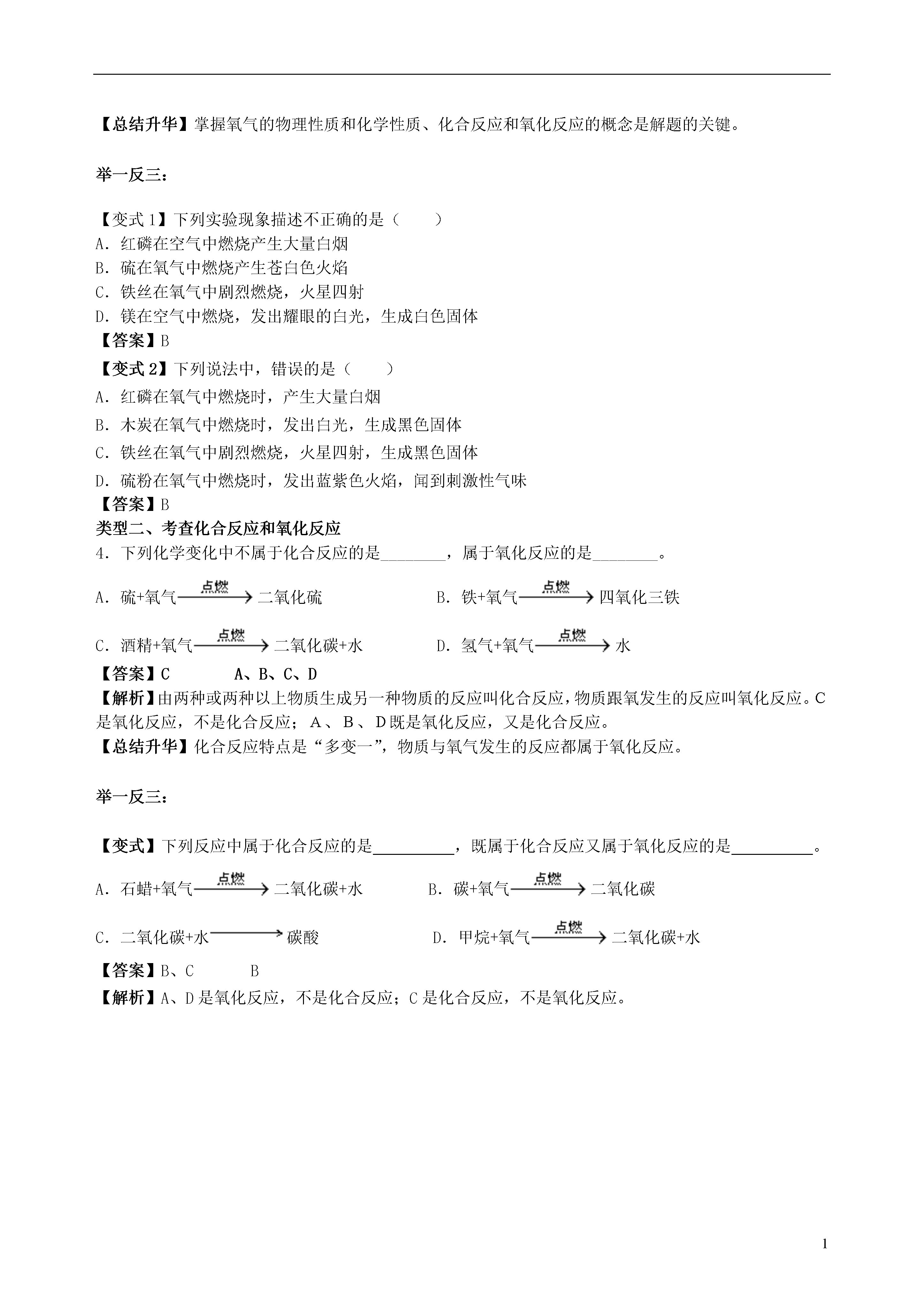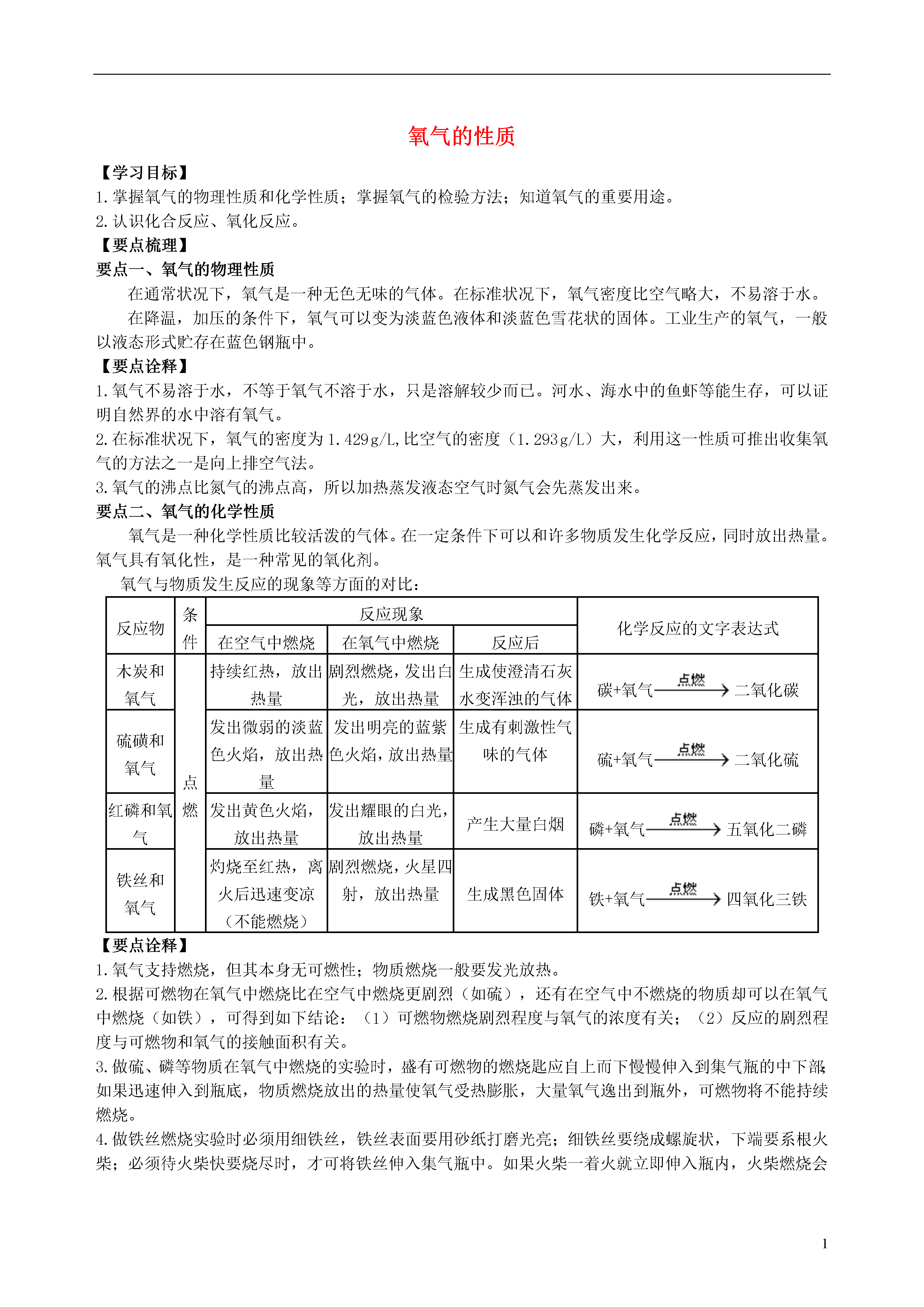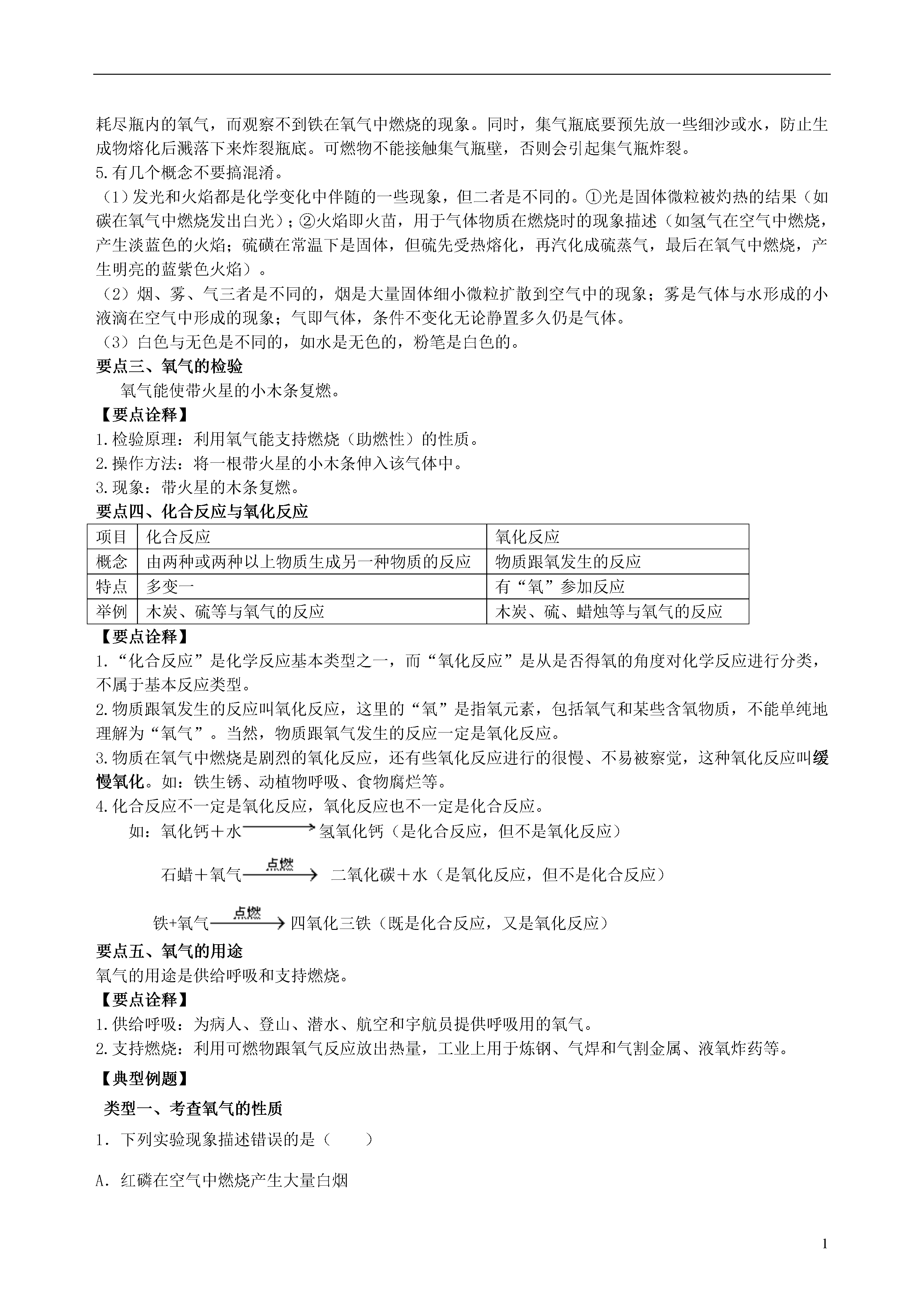 1氧气的性质【学习目标】1.掌握氧气的物理性质和化学性质;掌握氧气的检验方法;知道氧气的重要用途。2.认识化合反应、氧化反应。【要点梳理】要点一、氧气的物理性质在通常状况下,氧气是一种无色无味的气体。在标准状况下,氧气密度比空气略大,不易溶于水。在降温,加压的条件下,氧气可以变为淡蓝色液体和淡蓝色雪花状的固体。工业生产的氧气,一般以液态形式贮存在蓝色钢瓶中。【要点诠释】1.氧气不易溶于水,不等于氧气不溶于水,只是溶解较少而已。河水、海水中的鱼虾等能生存,可以证明自然界的水中溶有氧气。2.在标准状况下,氧气的密度为1.429g/L,比空气的密度(1.293g/L)大,利用这一性质可推出收集氧气的方法之一是向上排空气法。3.氧气的沸点比氮气的沸点高,所以加热蒸发液态空气时氮气会先蒸发出来。要点二、氧气的化学性质氧气是一种化学性质比较活泼的气体。在一定条件下可以和许多物质发生化学反应,同时放出热量。氧气具有氧化性,是一种常见的氧化剂。氧气与物质发生反应的现象等方面的对比:反应物条件反应现象化学反应的文字表达式在空气中燃烧在氧气中燃烧反应后木炭和氧气点燃持续红热,放出热量剧烈燃烧,发出白光,放出热量生成使澄清石灰水变浑浊的气体碳+氧气二氧化碳硫磺和氧气发出微弱的淡蓝色火焰,放出热量发出明亮的蓝紫色火焰,放出热量生成有刺激性气味的气体硫+氧气二氧化硫红磷和氧气发出黄色火焰,放出热量发出耀眼的白光,放出热量产生大量白烟磷+氧气五氧化二磷铁丝和氧气灼烧至红热,离火后迅速变凉(不能燃烧)剧烈燃烧,火星四射,放出热量生成黑色固体铁+氧气四氧化三铁【要点诠释】1.氧气支持燃烧,但其本身无可燃性;物质燃烧一般要发光放热。2.根据可燃物在氧气中燃烧比在空气中燃烧更剧烈(如硫),还有在空气中不燃烧的物质却可以在氧气中燃烧(如铁),可得到如下结论:(1)可燃物燃烧剧烈程度与氧气的浓度有关;(2)反应的剧烈程度与可燃物和氧气的接触面积有关。3.做硫、磷等物质在氧气中燃烧的实验时,盛有可燃物的燃烧匙应自上而下慢慢伸入到集气瓶的中下部;如果迅速伸入到瓶底,物质燃烧放出的热量使氧气受热膨胀,大量氧气逸出到瓶外,可燃物将不能持续燃烧。4.做铁丝燃烧实验时必须用细铁丝,铁丝表面要用砂纸打磨光亮;细铁丝要绕成螺旋状,下端要系根火柴;必须待火柴快要烧尽时,才可将铁丝伸入集气瓶中。如果火柴一着火就立即伸入瓶内,火柴燃烧会耗尽瓶内的氧气,而观察不到铁在氧气中燃烧的现象。同时,集气瓶底要预先放一些细沙或水,防止生成物熔化后溅落下来炸裂瓶底。可燃物不能接触集气瓶壁,否则会引起集气瓶炸裂。5.有几个概念不要搞混淆。(1)发光和火焰都是化学变化中伴随的一些现象,但二者是不同的。①光是固体微粒被灼热的结果(如碳在氧气中燃烧发出白光);②火焰即火苗,用于气体物质在燃烧时的现象描述(如氢气在空气中燃烧,产生淡蓝色的火焰;硫磺在常温下是固体,但硫先受热熔化,再汽化成硫蒸气,最后在氧气中燃烧,产生明亮的蓝紫色火焰)。(2)烟、雾、气三者是不同的,烟是大量固体细小微粒扩散到空气中的现象;雾是气体与水形成的小液滴在空气中形成的现象;气即气体,条件不变化无论静置多久仍是气体。(3)白色与无色是不同的,如水是无色的,粉笔是白色的。要点三、氧气的检验氧气能使带火星的小木条复燃。【要点诠释】1.检验原理:利用氧气能支持燃烧(助燃性)的性质。2.操作方法:将一根带火星的小木条伸入该气体中。3.现象:带火星的木条复燃。要点四、化合反应与氧化反应项目化合反应氧化反应概念由两种或两种以上物质生成另一种物质的反应物质跟氧发生的反应特点多变一有“氧”参加反应举例木炭、硫等与氧气的反应木炭、硫、蜡烛等与氧气的反应【要点诠释】1.“化合反应”是化学反应基本类型之一,而“氧化反应”是从是否得氧的角度对化学反应进行分类,不属于基本反应类型。2.物质跟氧发生的反应叫氧化反应,这里的“氧”是指氧元素,包括氧气和某些含氧物质,不能单纯地理解为“氧气”。当然,物质跟氧气发生的反应一定是氧化反应。3.物质在氧气中燃烧是剧烈的氧化反应,还有些氧化反应进行的很慢、不易被察觉,这种氧化反应叫缓慢氧化。如:铁生锈、动植物呼吸、食物腐烂等。4.化合反应不一定是氧化反应,氧化反应也不一定是化合反应。如:氧化钙+水氢氧化钙(是化合反应,但不是氧化反应)石蜡+氧气二氧化碳+水(是氧化反应,但不是化合反应)铁+氧气四氧化三铁(既是化合反应,又是氧化反应)要点五、氧气的用途氧气的用途是供给呼吸和支持燃烧。【要点诠释】1.供给呼吸:为病人、登山、潜水、航空和宇航员提供呼吸用的氧气。2.支持燃烧:利用可燃物跟氧气反应放出热量,工业上用于炼钢、气焊和气割金属、液氧炸药等。【典型