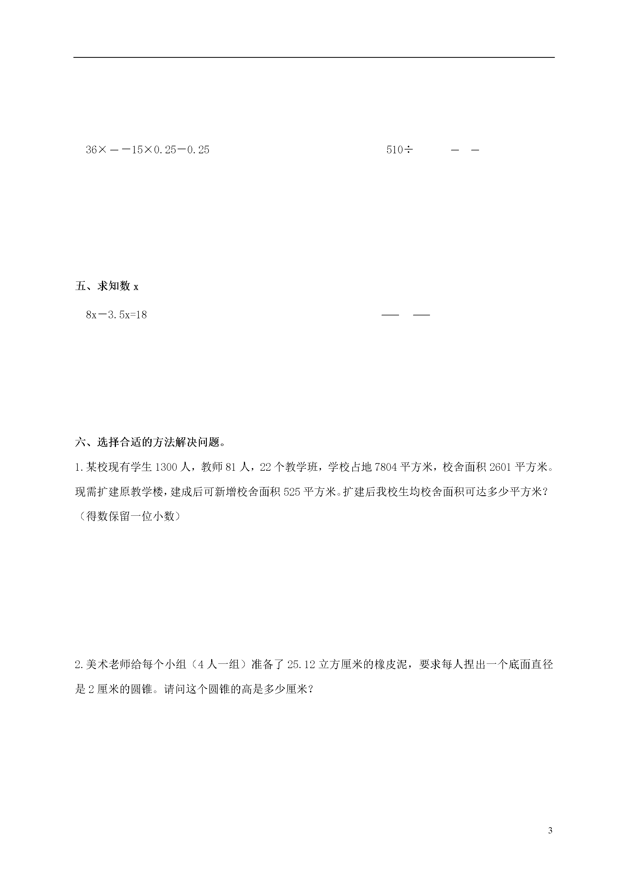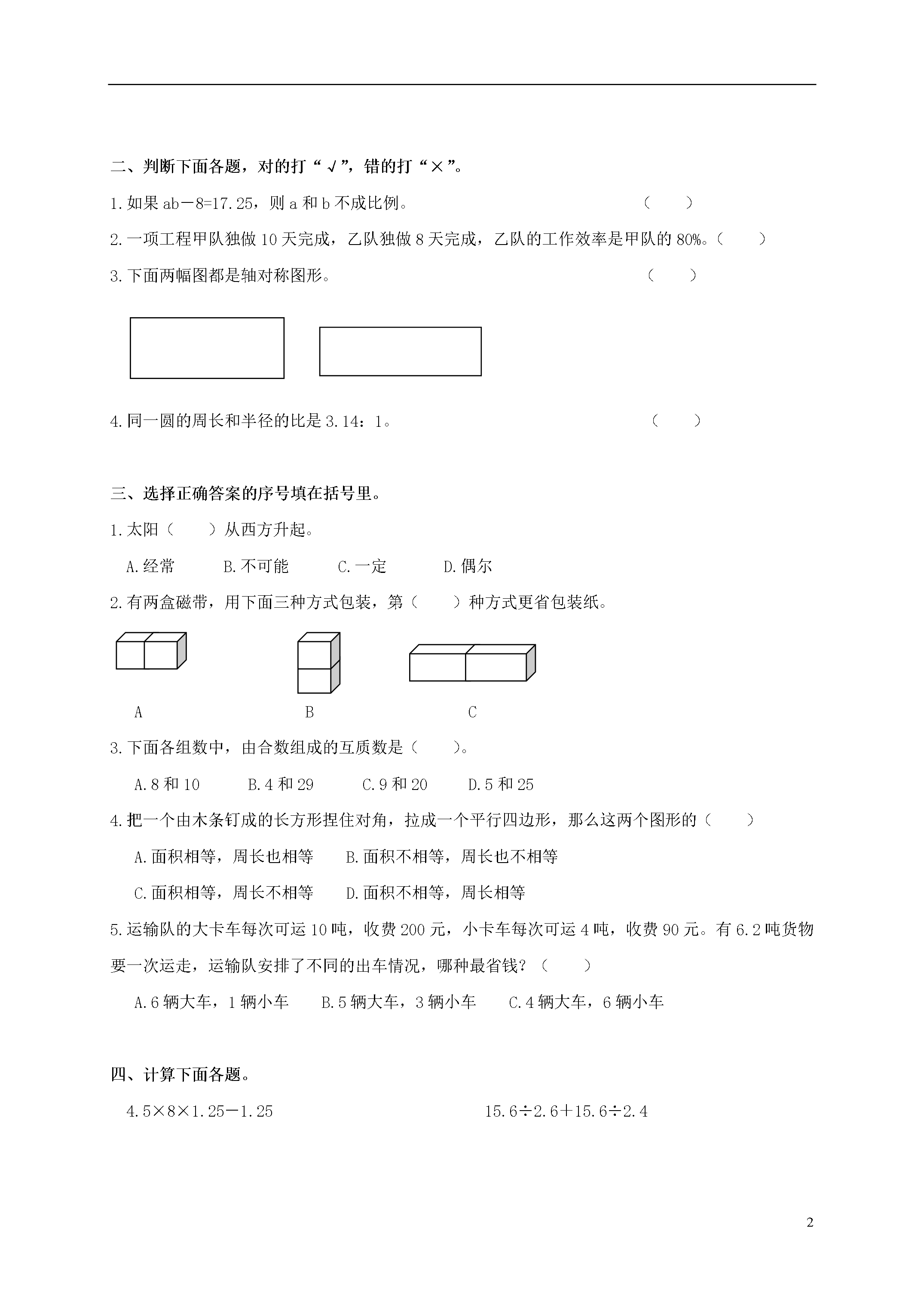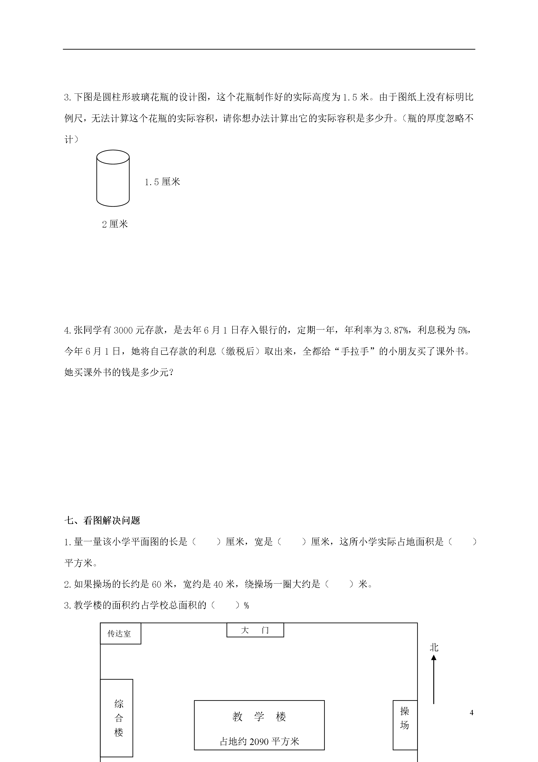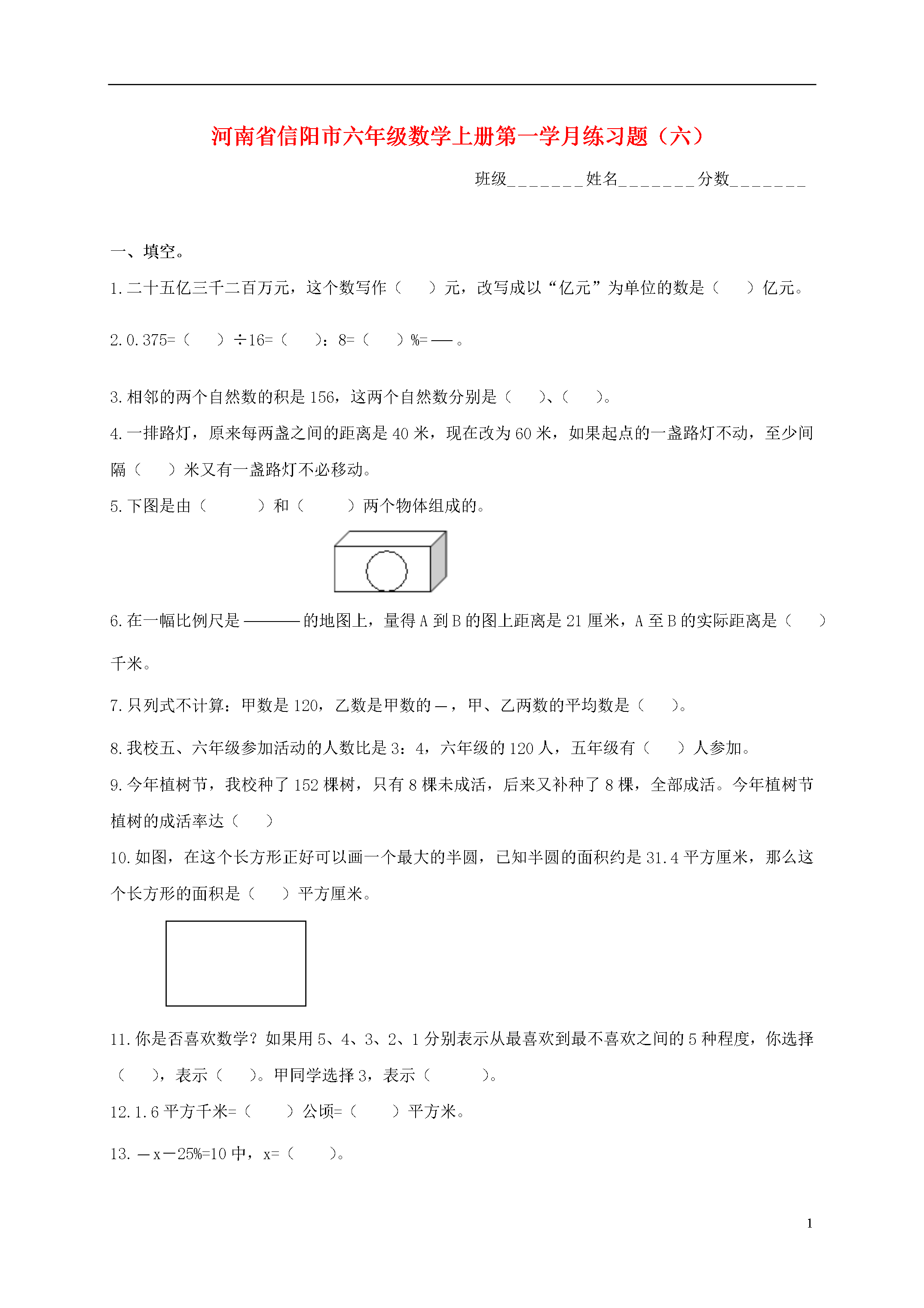 5河南省信阳市六年级数学上册第一学月练习题(六)班级_______姓名_______分数_______一、填空。1.二十五亿三千二百万元,这个数写作()元,改写成以“亿元”为单位的数是()亿元。2.0.375=()÷16=():8=()%=。3.相邻的两个自然数的积是156,这两个自然数分别是()、()。4.一排路灯,原来每两盏之间的距离是40米,现在改为60米,如果起点的一盏路灯不动,至少间隔()米又有一盏路灯不必移动。5.下图是由()和()两个物体组成的。6.在一幅比例尺是的地图上,量得A到B的图上距离是21厘米,A至B的实际距离是()千米。7.只列式不计算:甲数是120,乙数是甲数的,甲、乙两数的平均数是()。8.我校五、六年级参加活动的人数比是3:4,六年级的120人,五年级有()人参加。9.今年植树节,我校种了152棵树,只有8棵未成活,后来又补种了8棵,全部成活。今年植树节植树的成活率达()10.如图,在这个长方形正好可以画一个最大的半圆,已知半圆的面积约是31.4平方厘米,那么这个长方形的面积是()平方厘米。11.你是否喜欢数学?如果用5、4、3、2、1分别表示从最喜欢到最不喜欢之间的5种程度,你选择(),表示()。甲同学选择3,表示()。12.1.6平方千米=()公顷=()平方米。13.x-25%=10中,x=()。二、判断下面各题,对的打“√”,错的打“×”。1.如果ab-8=17.25,则a和b不成比例。()2.一项工程甲队独做10天完成,乙队独做8天完成,乙队的工作效率是甲队的80%。()3.下面两幅图都是轴对称图形。()4.同一圆的周长和半径的比是3.14:1。()三、选择正确答案的序号填在括号里。1.太阳()从西方升起。A.经常B.不可能C.一定D.偶尔2.有两盒磁带,用下面三种方式包装,第()种方式更省包装纸。ABC3.下面各组数中,由合数组成的互质数是()。A.8和10B.4和29C.9和20D.5和254.把一个由木条钉成的长方形捏住对角,拉成一个平行四边形,那么这两个图形的()A.面积相等,周长也相等B.面积不相等,周长也不相等C.面积相等,周长不相等D.面积不相等,周长相等5.运输队的大卡车每次可运10吨,收费200元,小卡车每次可运4吨,收费90元。有6.2吨货物要一次运走,运输队安排了不同的出车情况,哪种最省钱?()A.6辆大车,1辆小车B.5辆大车,3辆小车C.4辆大车,6辆小车四、计算下面各题。4.5×8×1.25-1.2515.6÷2.6+15.6÷2.436×-15×0.25-0.25510÷五、求知数x8x-3.5x=18六、选择合适的方法解决问题。1.某校现有学生1300人,教师81人,22个教学班,学校占地7804平方米,校舍面积2601平方米。现需扩建原教学楼,建成后可新增校舍面积525平方米。扩建后我校生均校舍面积可达多少平方米?(得数保留一位小数)2.美术老师给每个小组(4人一组)准备了25.12立方厘米的橡皮泥,要求每人捏出一个底面直径是2厘米的圆锥。请问这个圆锥的高是多少厘米?3.下图是圆柱形玻璃花瓶的设计图,这个花瓶制作好的实际高度为1.5米。由于图纸上没有标明比例尺,无法计算这个花瓶的实际容积,请你想办法计算出它的实际容积是多少升。(瓶的厚度忽略不计)1.5厘米2厘米4.张同学有3000元存款,是去年6月1日存入银行的,定期一年,年利率为3.87%,利息税为5%,今年6月1日,她将自己存款的利息(缴税后)取出来,全都给“手拉手”的小朋友买了课外书。她买课外书的钱是多少元?七、看图解决问题1.量一量该小学平面图的长是()厘米,宽是()厘米,这所小学实际占地面积是()平方米。2.如果操场的长约是60米,宽约是40米,绕操场一圈大约是()米。3.教学楼的面积约占学校总面积的()%传达室大门综合楼教学楼占地约2090平方米操场图书馆草地北