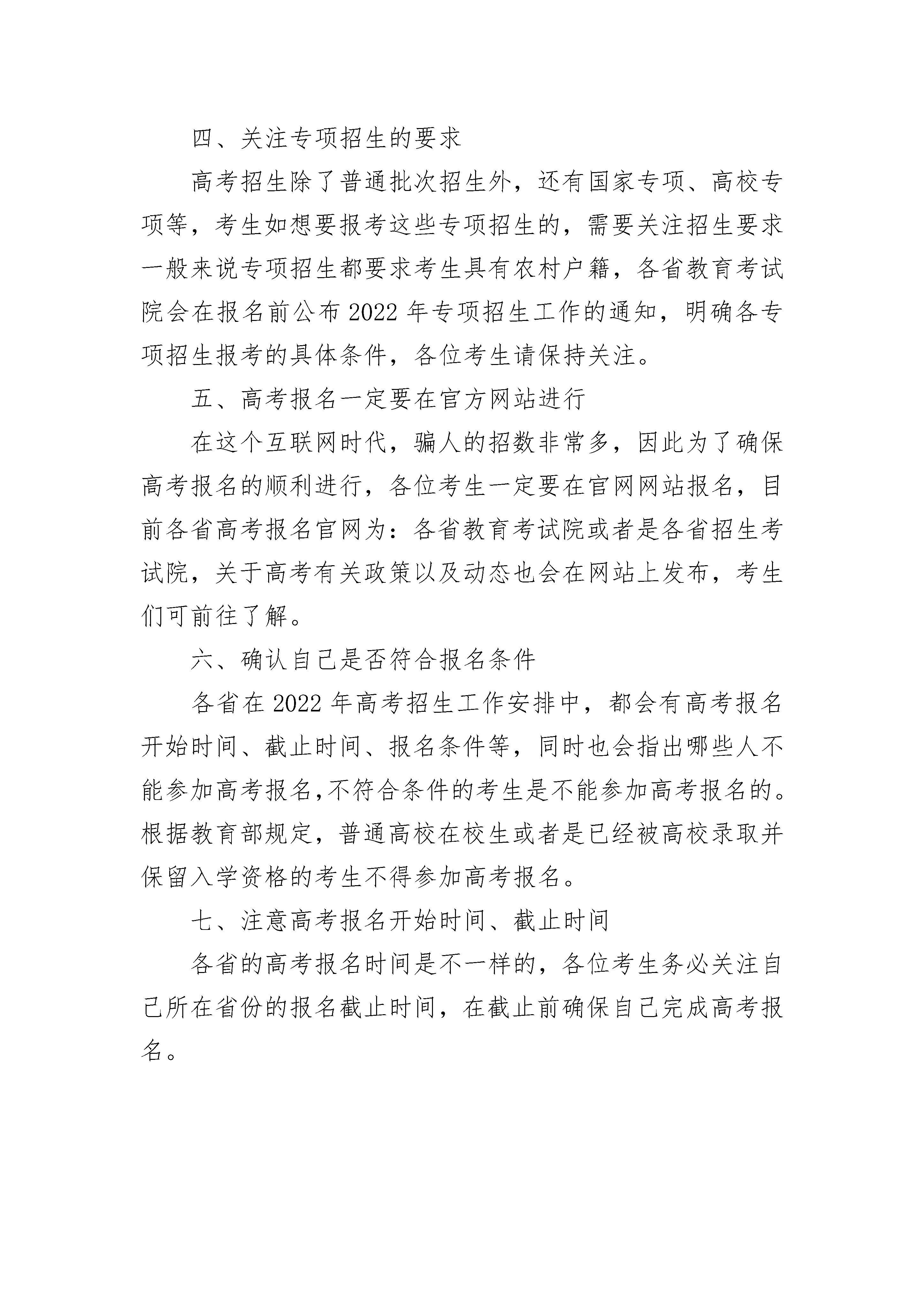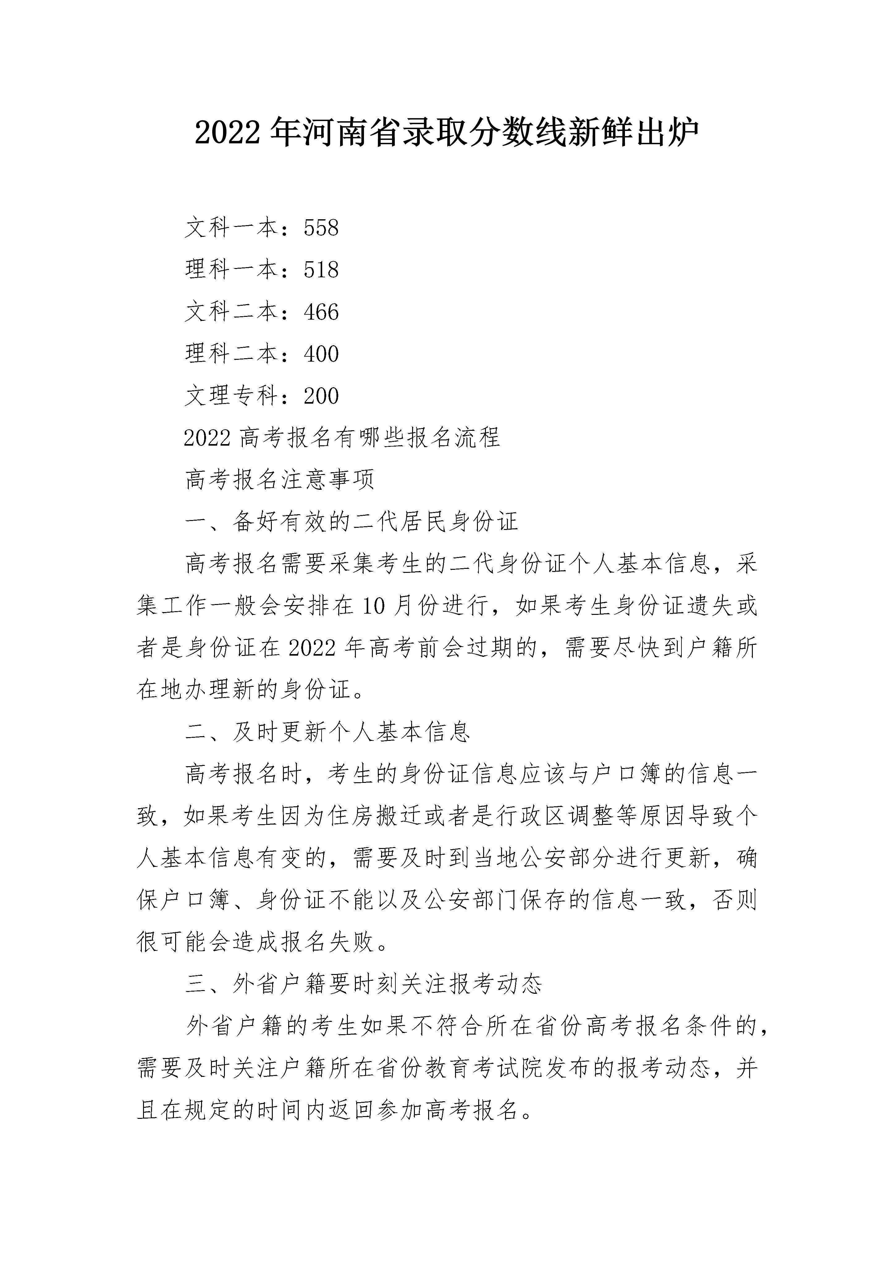 2022年河南省录取分数线新鲜出炉文科一本:558理科一本:518文科二本:466理科二本:400文理专科:2002022高考报名有哪些报名流程高考报名注意事项一、备好有效的二代居民身份证高考报名需要采集考生的二代身份证个人基本信息,采集工作一般会安排在10月份进行,如果考生身份证遗失或者是身份证在2022年高考前会过期的,需要尽快到户籍所在地办理新的身份证。二、及时更新个人基本信息高考报名时,考生的身份证信息应该与户口簿的信息一致,如果考生因为住房搬迁或者是行政区调整等原因导致个人基本信息有变的,需要及时到当地公安部分进行更新,确保户口簿、身份证不能以及公安部门保存的信息一致,否则很可能会造成报名失败。三、外省户籍要时刻关注报考动态外省户籍的考生如果不符合所在省份高考报名条件的,需要及时关注户籍所在省份教育考试院发布的报考动态,并且在规定的时间内返回参加高考报名。四、关注专项招生的要求高考招生除了普通批次招生外,还有国家专项、高校专项等,考生如想要报考这些专项招生的,需要关注招生要求一般来说专项招生都要求考生具有农村户籍,各省教育考试院会在报名前公布2022年专项招生工作的通知,明确各专项招生报考的具体条件,各位考生请保持关注。五、高考报名一定要在官方网站进行在这个互联网时代,骗人的招数非常多,因此为了确保高考报名的顺利进行,各位考生一定要在官网网站报名,目前各省高考报名官网为:各省教育考试院或者是各省招生考试院,关于高考有关政策以及动态也会在网站上发布,考生们可前往了解。六、确认自己是否符合报名条件各省在2022年高考招生工作安排中,都会有高考报名开始时间、截止时间、报名条件等,同时也会指出哪些人不能参加高考报名,不符合条件的考生是不能参加高考报名的。根据教育部规定,普通高校在校生或者是已经被高校录取并保留入学资格的考生不得参加高考报名。七、注意高考报名开始时间、截止时间各省的高考报名时间是不一样的,各位考生务必关注自己所在省份的报名截止时间,在截止前确保自己完成高考报名。