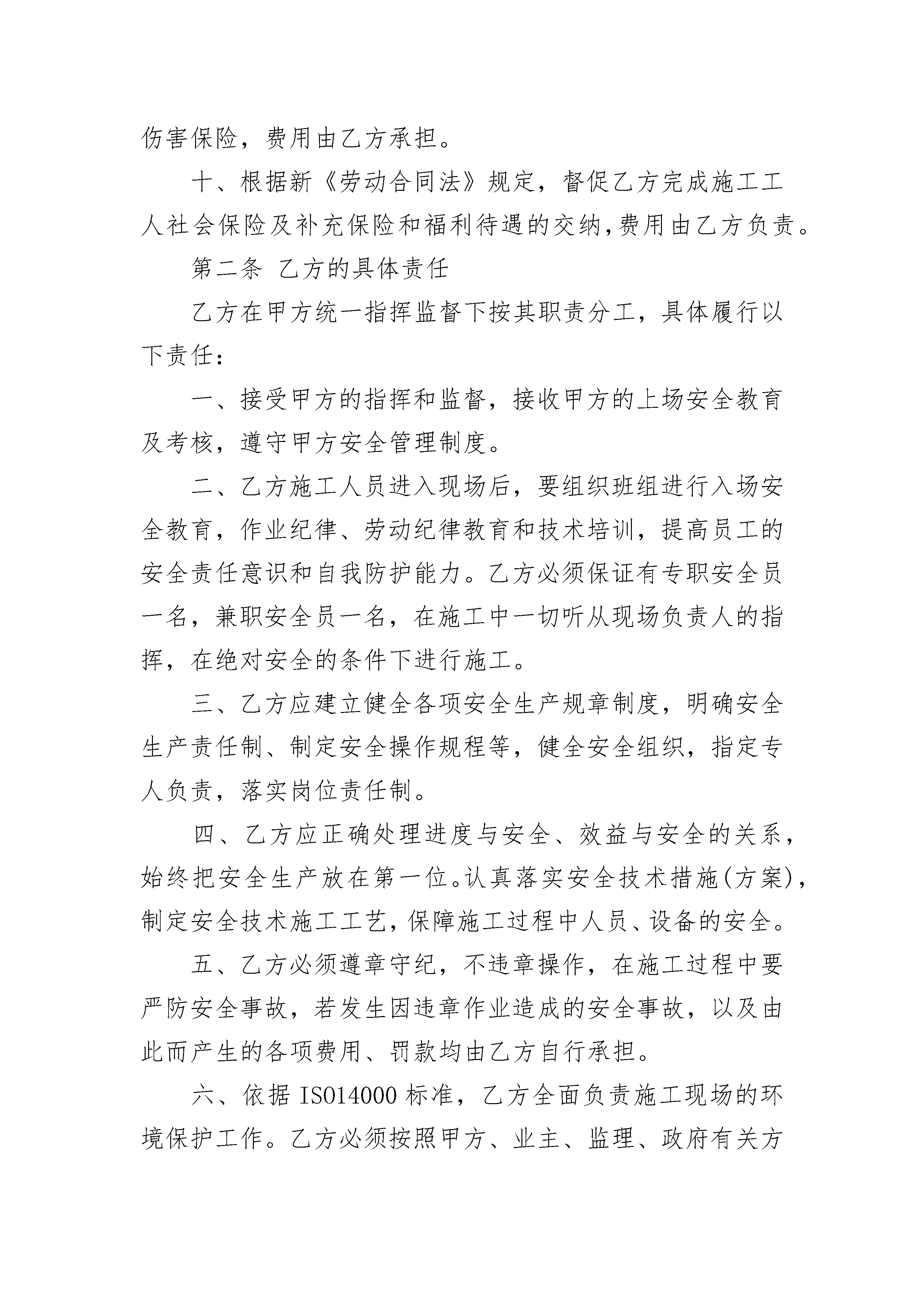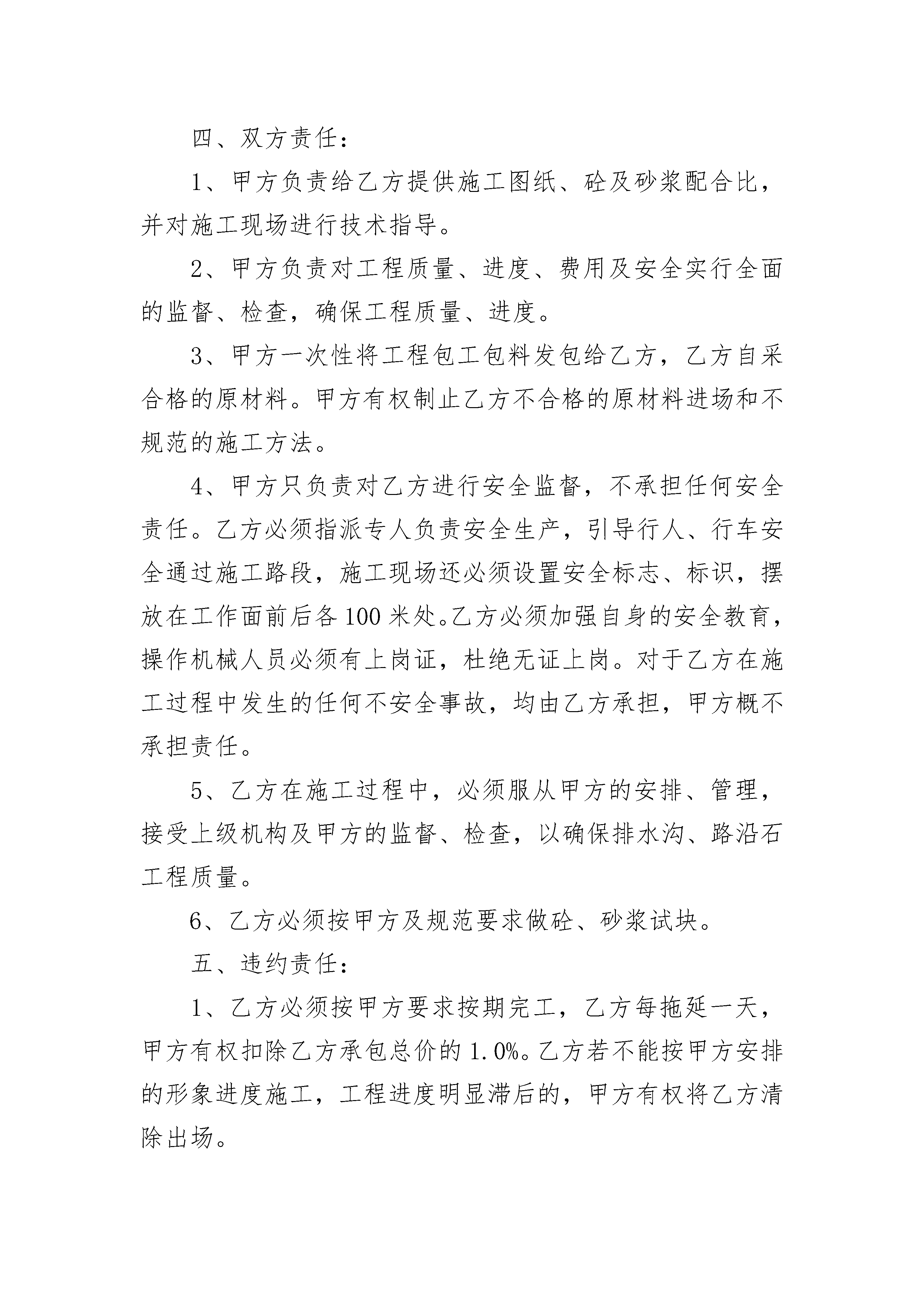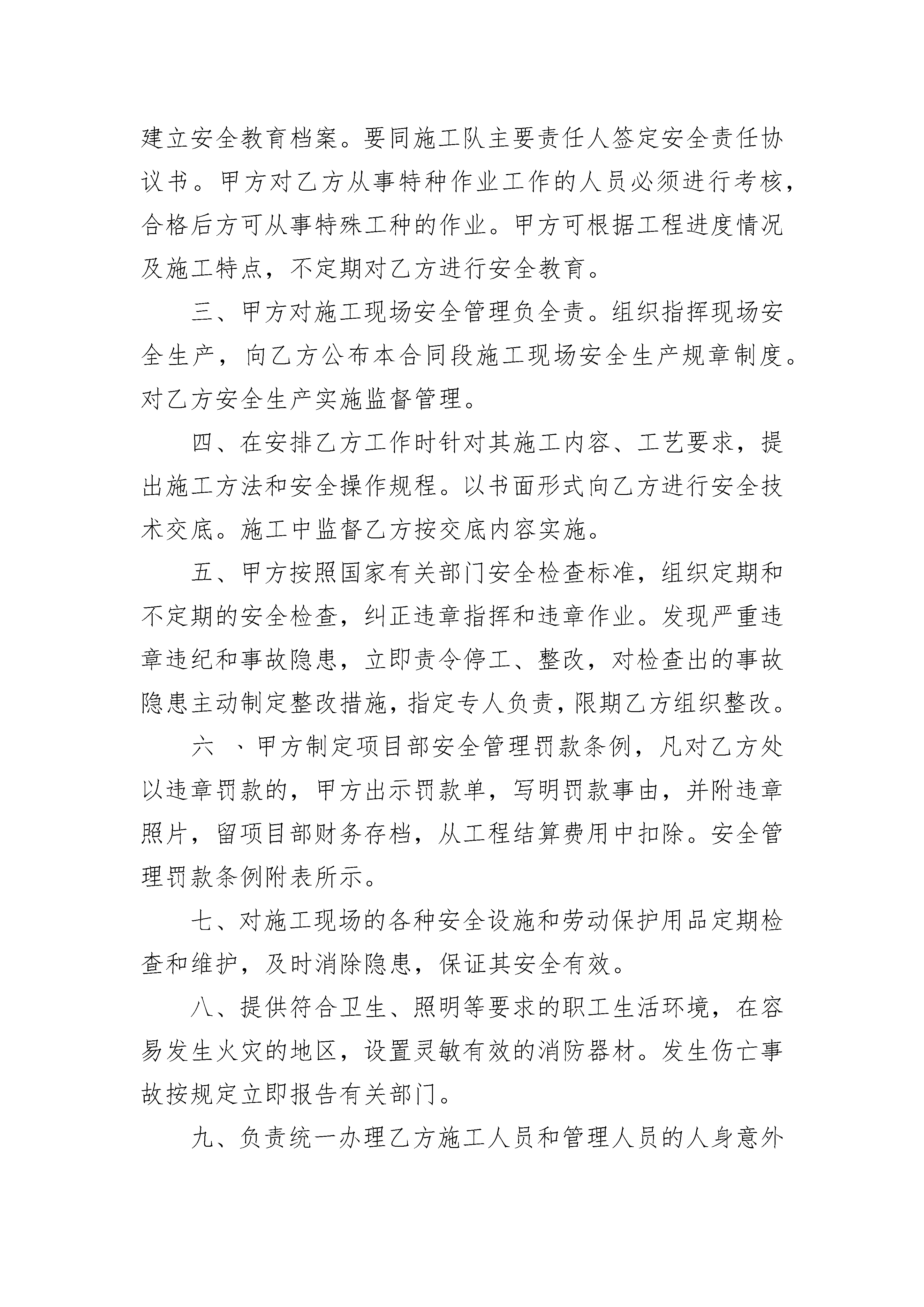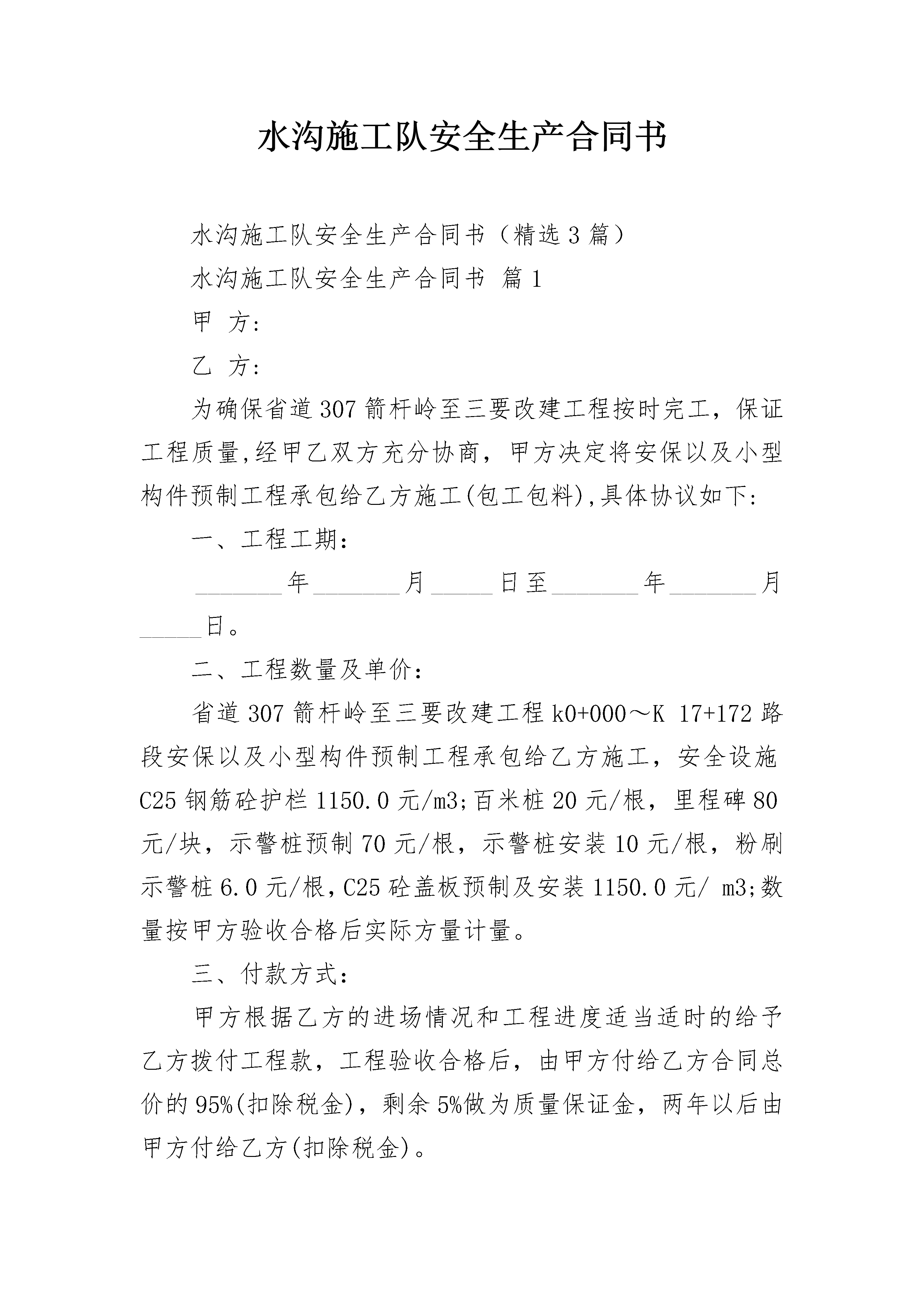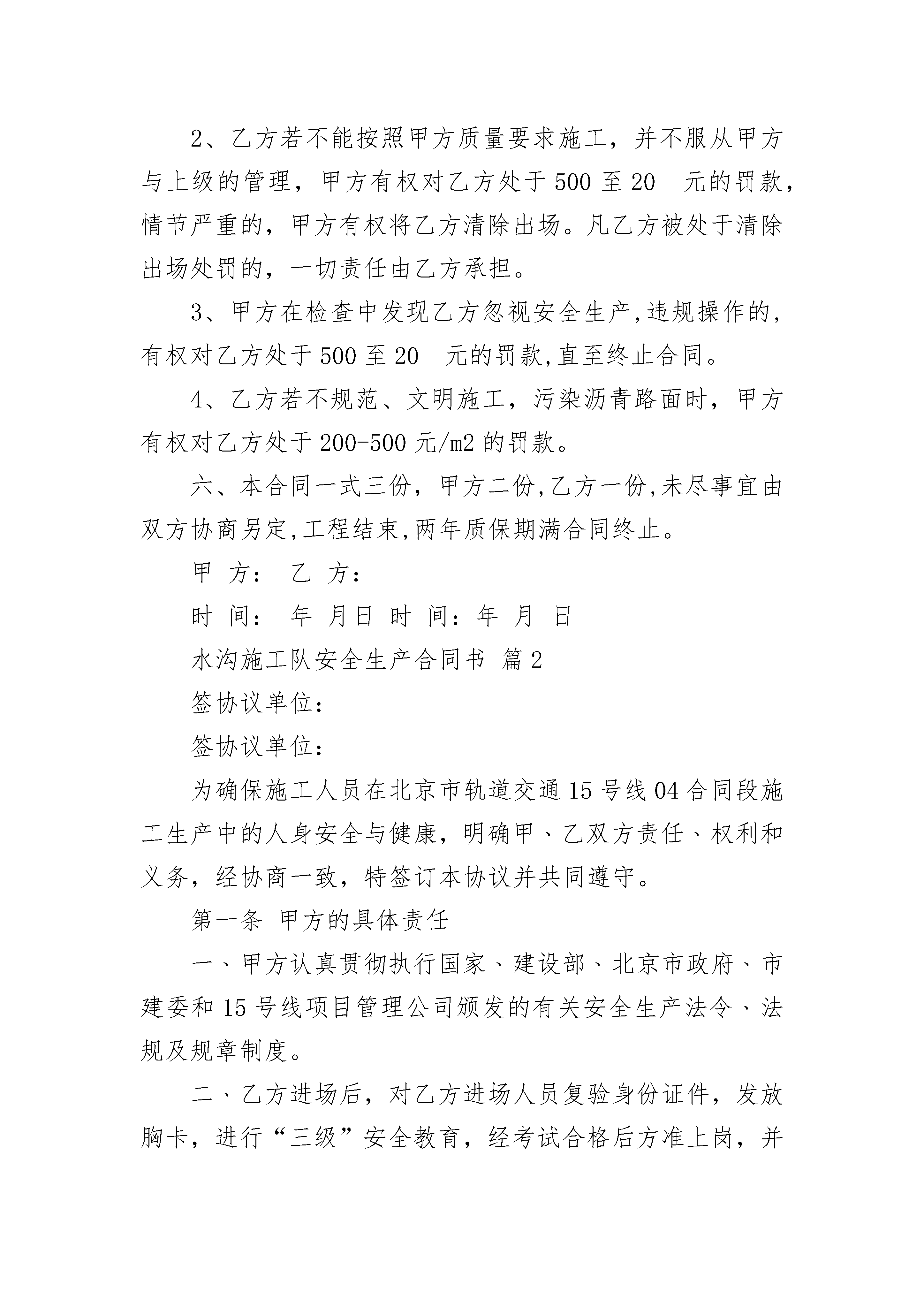 水沟施工队安全生产合同书水沟施工队安全生产合同书(精选3篇)水沟施工队安全生产合同书篇1甲方:乙方:为确保省道307箭杆岭至三要改建工程按时完工,保证工程质量,经甲乙双方充分协商,甲方决定将安保以及小型构件预制工程承包给乙方施工(包工包料),具体协议如下:一、工程工期:_______年_______月_____日至_______年_______月_____日。二、工程数量及单价:省道307箭杆岭至三要改建工程k0+000~K17+172路段安保以及小型构件预制工程承包给乙方施工,安全设施C25钢筋砼护栏1150.0元/m3;百米桩20元/根,里程碑80元/块,示警桩预制70元/根,示警桩安装10元/根,粉刷示警桩6.0元/根,C25砼盖板预制及安装1150.0元/m3;数量按甲方验收合格后实际方量计量。三、付款方式:甲方根据乙方的进场情况和工程进度适当适时的给予乙方拨付工程款,工程验收合格后,由甲方付给乙方合同总价的95%(扣除税金),剩余5%做为质量保证金,两年以后由甲方付给乙方(扣除税金)。四、双方责任:1、甲方负责给乙方提供施工图纸、砼及砂浆配合比,并对施工现场进行技术指导。2、甲方负责对工程质量、进度、费用及安全实行全面的监督、检查,确保工程质量、进度。3、甲方一次性将工程包工包料发包给乙方,乙方自采合格的原材料。甲方有权制止乙方不合格的原材料进场和不规范的施工方法。4、甲方只负责对乙方进行安全监督,不承担任何安全责任。乙方必须指派专人负责安全生产,引导行人、行车安全通过施工路段,施工现场还必须设置安全标志、标识,摆放在工作面前后各100米处。乙方必须加强自身的安全教育,操作机械人员必须有上岗证,杜绝无证上岗。对于乙方在施工过程中发生的任何不安全事故,均由乙方承担,甲方概不承担责任。5、乙方在施工过程中,必须服从甲方的安排、管理,接受上级机构及甲方的监督、检查,以确保排水沟、路沿石工程质量。6、乙方必须按甲方及规范要求做砼、砂浆试块。五、违约责任:1、乙方必须按甲方要求按期完工,乙方每拖延一天,甲方有权扣除乙方承包总价的1.0%。乙方若不能按甲方安排的形象进度施工,工程进度明显滞后的,甲方有权将乙方清除出场。2、乙方若不能按照甲方质量要求施工,并不服从甲方与上级的管理,甲方有权对乙方处于500至20__元的罚款,情节严重的,甲方有权将乙方清除出场。凡乙方被处于清除出场处罚的,一切责任由乙方承担。3、甲方在检查中发现乙方忽视安全生产,违规操作的,有权对乙方处于500至20__元的罚款,直至终止合同。4、乙方若不规范、文明施工,污染沥青路面时,甲方有权对乙方处于200-500元/m2的罚款。六、本合同一式三份,甲方二份,乙方一份,未尽事宜由双方协商另定,工程结束,两年质保期满合同终止。甲方:乙方:时间:年月日时间:年月日水沟施工队安全生产合同书篇2签协议单位:签协议单位:为确保施工人员在北京市轨道交通15号线04合同段施工生产中的人身安全与健康,明确甲﹑乙双方责任﹑权利和义务,经协商一致,特签订本协议并共同遵守。第一条甲方的具体责任一﹑甲方认真贯彻执行国家﹑建设部﹑北京市政府﹑市建委和15号线项目管理公司颁发的有关安全生产法令﹑法规及规章制度。二﹑乙方进场后,对乙方进场人员复验身份证件,发放胸卡,进行“三级”安全教育,经考试合格后方准上岗,并建立安全教育档案。要同施工队主要责任人签定安全责任协议书。甲方对乙方从事特种作业工作的人员必须进行考核,合格后方可从事特殊工种的作业。甲方可根据工程进度情况及施工特点,不定期对乙方进行安全教育。三、甲方对施工现场安全管理负全责。组织指挥现场安全生产,向乙方公布本合同段施工现场安全生产规章制度。对乙方安全生产实施监督管理。四、在安排乙方工作时针对其施工内容、工艺要求,提出施工方法和安全操作规程。以书面形式向乙方进行安全技术交底。施工中监督乙方按交底内容实施。五、甲方按照国家有关部门安全检查标准,组织定期和不定期的安全检查,纠正违章指挥和违章作业。发现严重违章违纪和事故隐患,立即责令停工、整改,对检查出的事故隐患主动制定整改措施,指定专人负责,限期乙方组织整改。六﹑甲方制定项目部安全管理罚款条例,凡对乙方处以违章罚款的,甲方出示罚款单,写明罚款事由,并附违章照片,留项目部财务存档,从工程结算费用中扣除。安全管理罚款条例附表所示。七、对施工现场的各种安全设施和劳动保护用品定期检查和维护,及时消除隐患,保证其安全有效。八、提供符合卫生、照明等要求的职工生活环境,在容易发生火灾的地区,设置灵敏有效的消防器材。发生伤亡事故按规定立即报告有关部门。九、负责统一办理乙方施工人员和管理人员的人身意外伤害保险,费用由乙方承担。十、根据新《劳动合同法》规定,督促乙方完成施工工人社会保险及补充保险和福利待