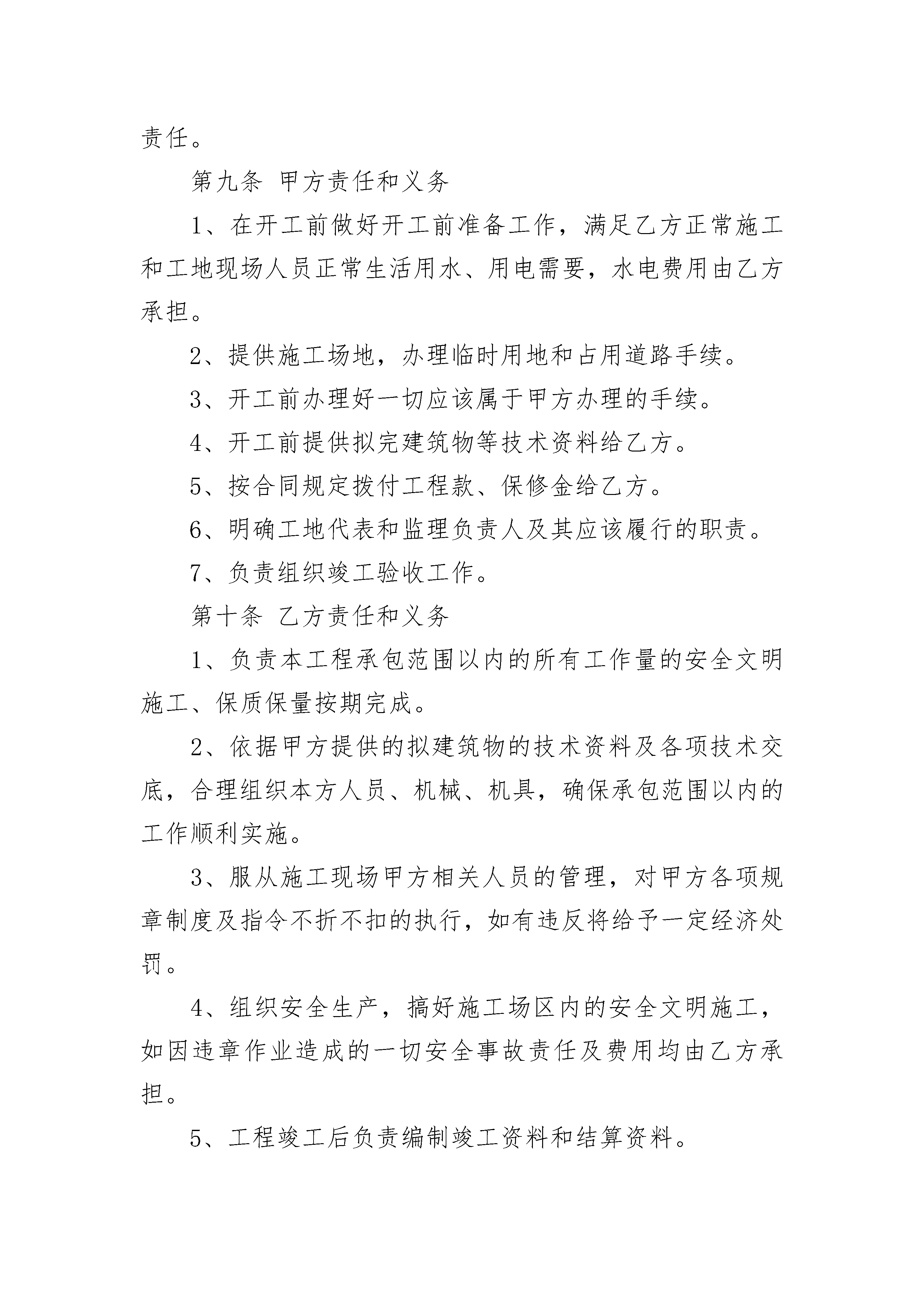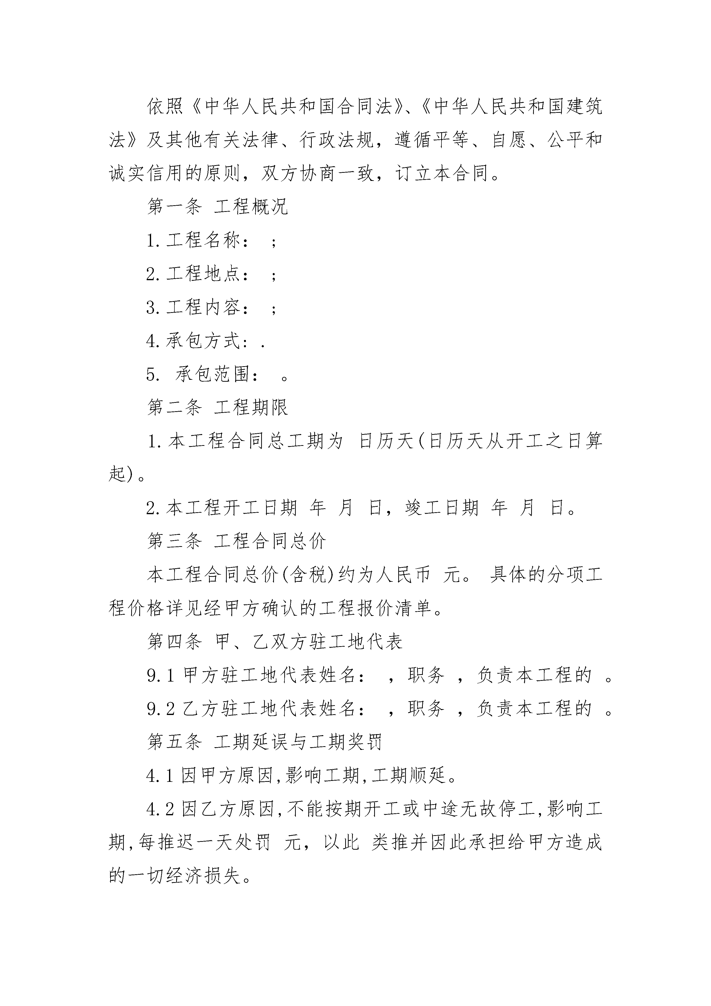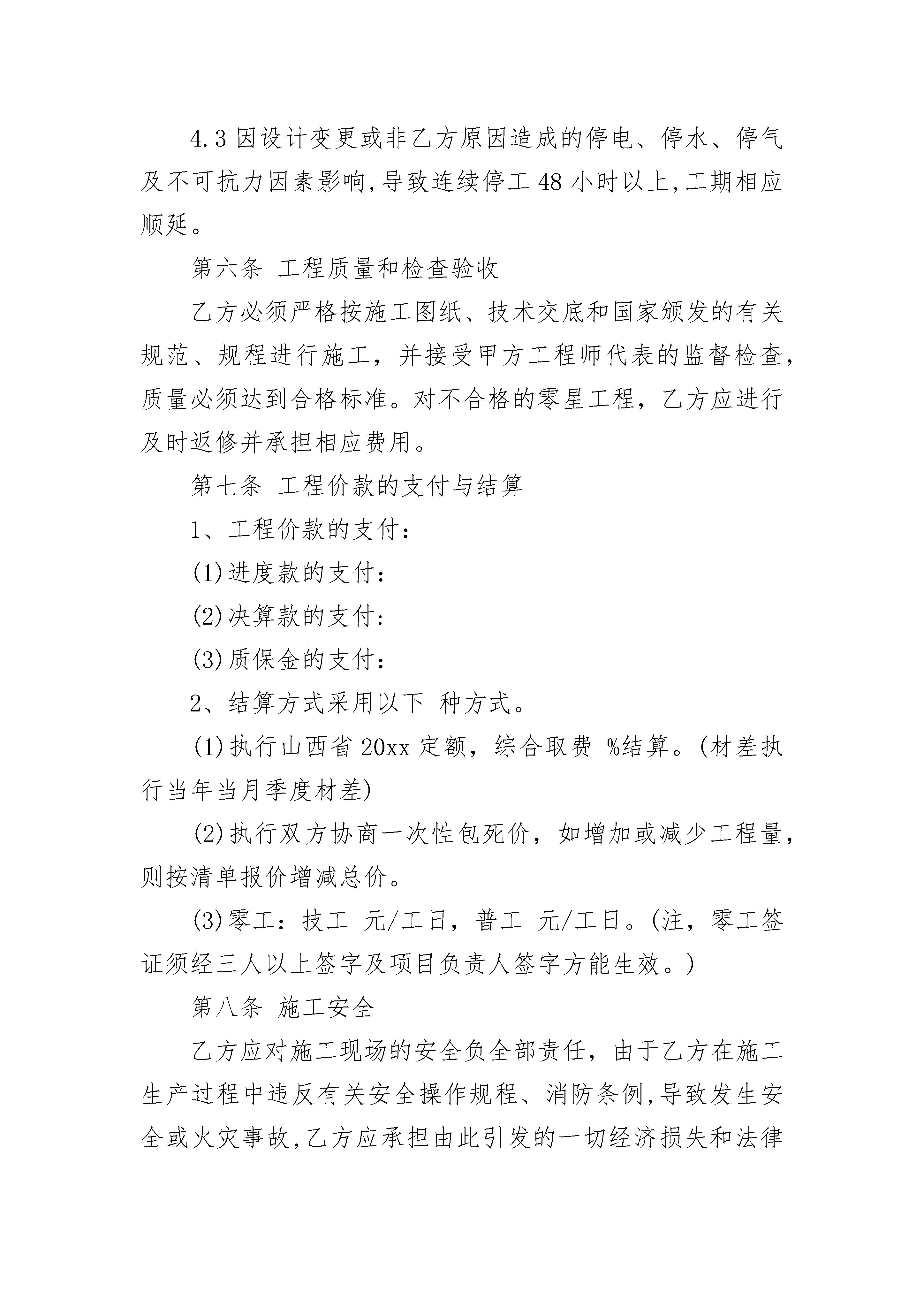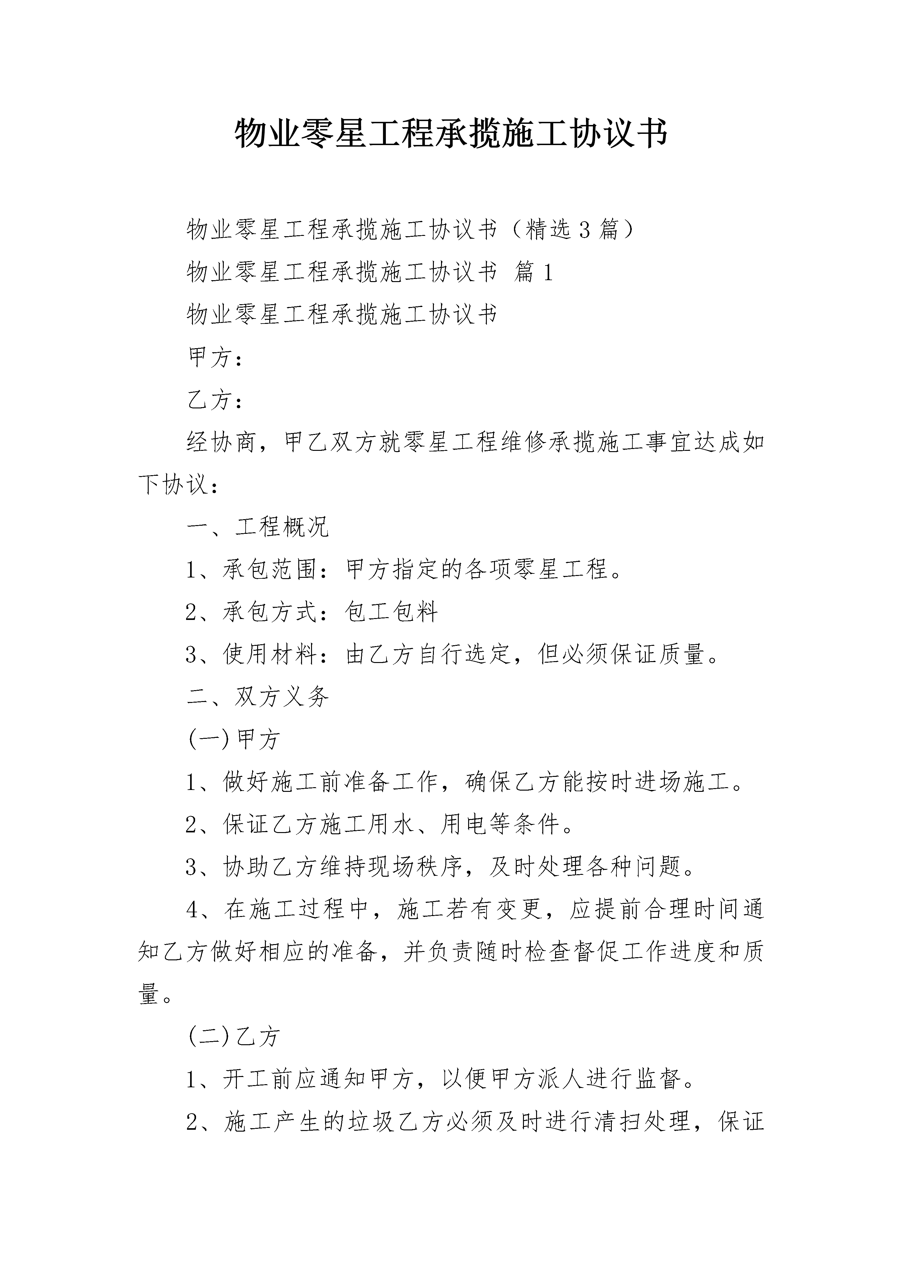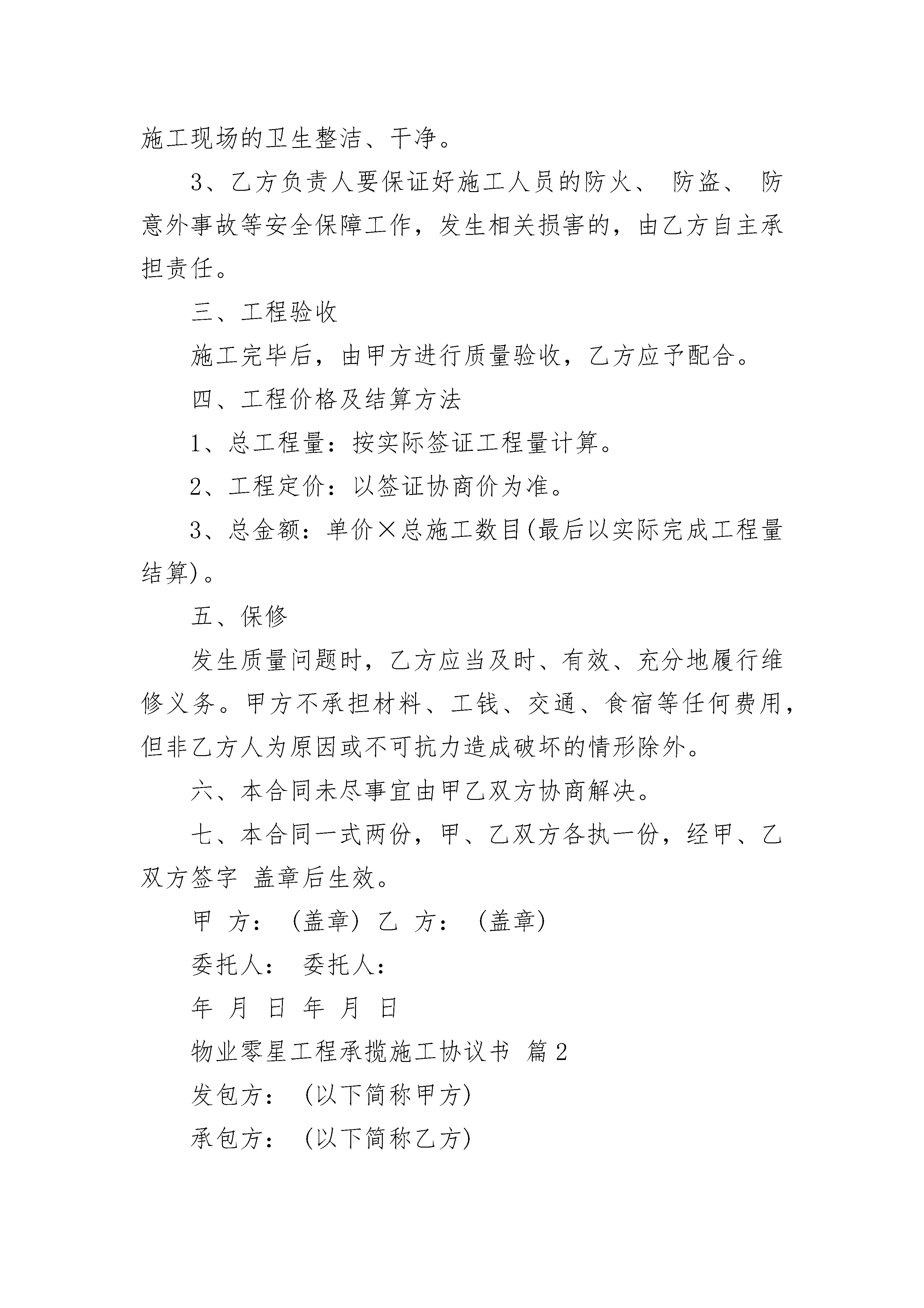 物业零星工程承揽施工协议书物业零星工程承揽施工协议书(精选3篇)物业零星工程承揽施工协议书篇1物业零星工程承揽施工协议书甲方:乙方:经协商,甲乙双方就零星工程维修承揽施工事宜达成如下协议:一、工程概况1、承包范围:甲方指定的各项零星工程。2、承包方式:包工包料3、使用材料:由乙方自行选定,但必须保证质量。二、双方义务(一)甲方1、做好施工前准备工作,确保乙方能按时进场施工。2、保证乙方施工用水、用电等条件。3、协助乙方维持现场秩序,及时处理各种问题。4、在施工过程中,施工若有变更,应提前合理时间通知乙方做好相应的准备,并负责随时检查督促工作进度和质量。(二)乙方1、开工前应通知甲方,以便甲方派人进行监督。2、施工产生的垃圾乙方必须及时进行清扫处理,保证施工现场的卫生整洁、干净。3、乙方负责人要保证好施工人员的防火、防盗、防意外事故等安全保障工作,发生相关损害的,由乙方自主承担责任。三、工程验收施工完毕后,由甲方进行质量验收,乙方应予配合。四、工程价格及结算方法1、总工程量:按实际签证工程量计算。2、工程定价:以签证协商价为准。3、总金额:单价×总施工数目(最后以实际完成工程量结算)。五、保修发生质量问题时,乙方应当及时、有效、充分地履行维修义务。甲方不承担材料、工钱、交通、食宿等任何费用,但非乙方人为原因或不可抗力造成破坏的情形除外。六、本合同未尽事宜由甲乙双方协商解决。七、本合同一式两份,甲、乙双方各执一份,经甲、乙双方签字盖章后生效。甲方:(盖章)乙方:(盖章)委托人:委托人:年月日年月日物业零星工程承揽施工协议书篇2发包方:(以下简称甲方)承包方:(以下简称乙方)依照《中华人民共和国合同法》、《中华人民共和国建筑法》及其他有关法律、行政法规,遵循平等、自愿、公平和诚实信用的原则,双方协商一致,订立本合同。第一条工程概况1.工程名称:;2.工程地点:;3.工程内容:;4.承包方式:.5.承包范围:。第二条工程期限1.本工程合同总工期为日历天(日历天从开工之日算起)。2.本工程开工日期年月日,竣工日期年月日。第三条工程合同总价本工程合同总价(含税)约为人民币元。具体的分项工程价格详见经甲方确认的工程报价清单。第四条甲、乙双方驻工地代表9.1甲方驻工地代表姓名:,职务,负责本工程的。9.2乙方驻工地代表姓名:,职务,负责本工程的。第五条工期延误与工期奖罚4.1因甲方原因,影响工期,工期顺延。4.2因乙方原因,不能按期开工或中途无故停工,影响工期,每推迟一天处罚元,以此类推并因此承担给甲方造成的一切经济损失。4.3因设计变更或非乙方原因造成的停电、停水、停气及不可抗力因素影响,导致连续停工48小时以上,工期相应顺延。第六条工程质量和检查验收乙方必须严格按施工图纸、技术交底和国家颁发的有关规范、规程进行施工,并接受甲方工程师代表的监督检查,质量必须达到合格标准。对不合格的零星工程,乙方应进行及时返修并承担相应费用。第七条工程价款的支付与结算1、工程价款的支付:(1)进度款的支付:(2)决算款的支付:(3)质保金的支付:2、结算方式采用以下种方式。(1)执行山西省20xx定额,综合取费%结算。(材差执行当年当月季度材差)(2)执行双方协商一次性包死价,如增加或减少工程量,则按清单报价增减总价。(3)零工:技工元/工日,普工元/工日。(注,零工签证须经三人以上签字及项目负责人签字方能生效。)第八条施工安全乙方应对施工现场的安全负全部责任,由于乙方在施工生产过程中违反有关安全操作规程、消防条例,导致发生安全或火灾事故,乙方应承担由此引发的一切经济损失和法律责任。第九条甲方责任和义务1、在开工前做好开工前准备工作,满足乙方正常施工和工地现场人员正常生活用水、用电需要,水电费用由乙方承担。2、提供施工场地,办理临时用地和占用道路手续。3、开工前办理好一切应该属于甲方办理的手续。4、开工前提供拟完建筑物等技术资料给乙方。5、按合同规定拨付工程款、保修金给乙方。6、明确工地代表和监理负责人及其应该履行的职责。7、负责组织竣工验收工作。第十条乙方责任和义务1、负责本工程承包范围以内的所有工作量的安全文明施工、保质保量按期完成。2、依据甲方提供的拟建筑物的技术资料及各项技术交底,合理组织本方人员、机械、机具,确保承包范围以内的工作顺利实施。3、服从施工现场甲方相关人员的管理,对甲方各项规章制度及指令不折不扣的执行,如有违反将给予一定经济处罚。4、组织安全生产,搞好施工场区内的安全文明施工,如因违章作业造成的一切安全事故责任及费用均由乙方承担。5、工程竣工后负责编制竣工资料和结算资料。6、工程交付甲方后,因乙方施工质量方面的原因引起的质量维修由乙方负责。第十一条工程保修本工程保修期限为年,在保修期限内若出现质量问题乙方在接到甲方通知后3天内进行工