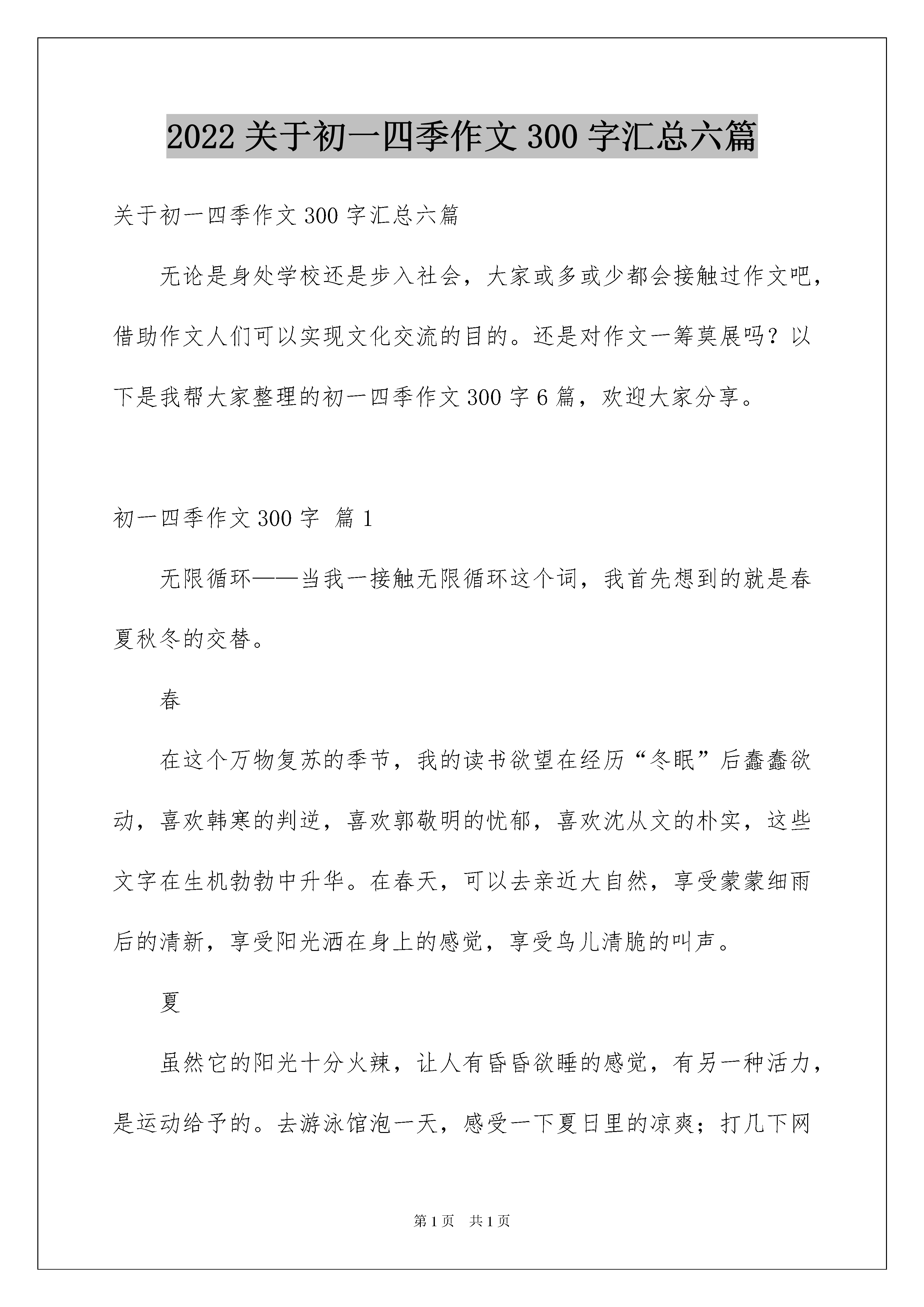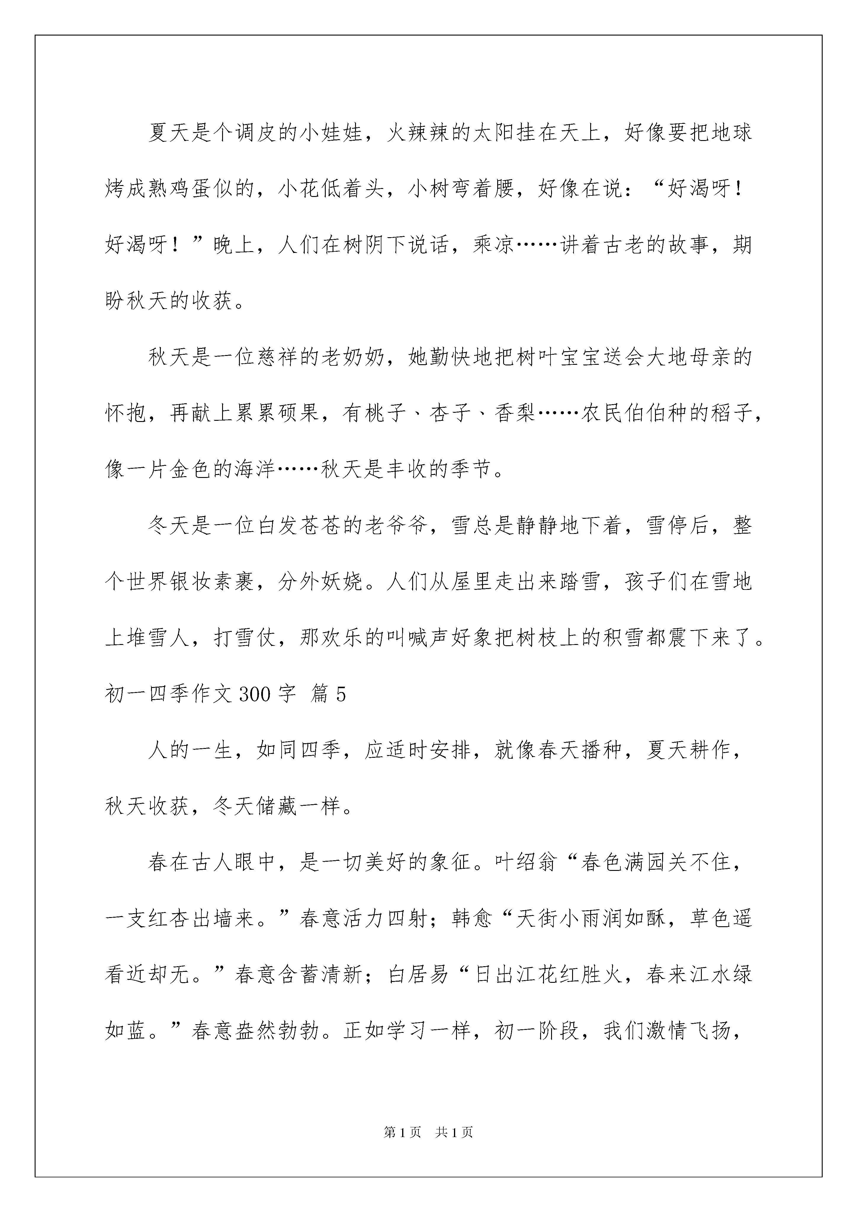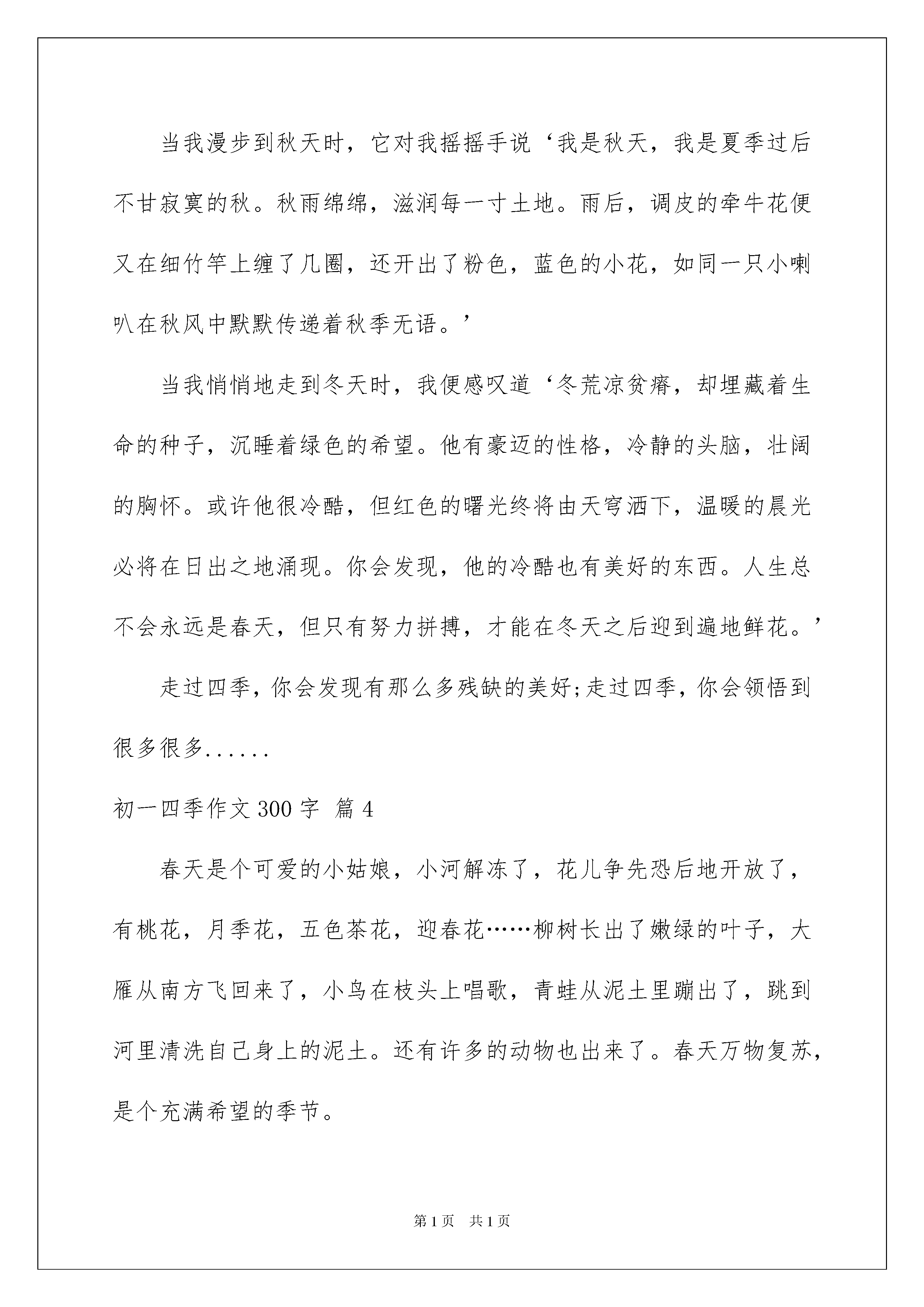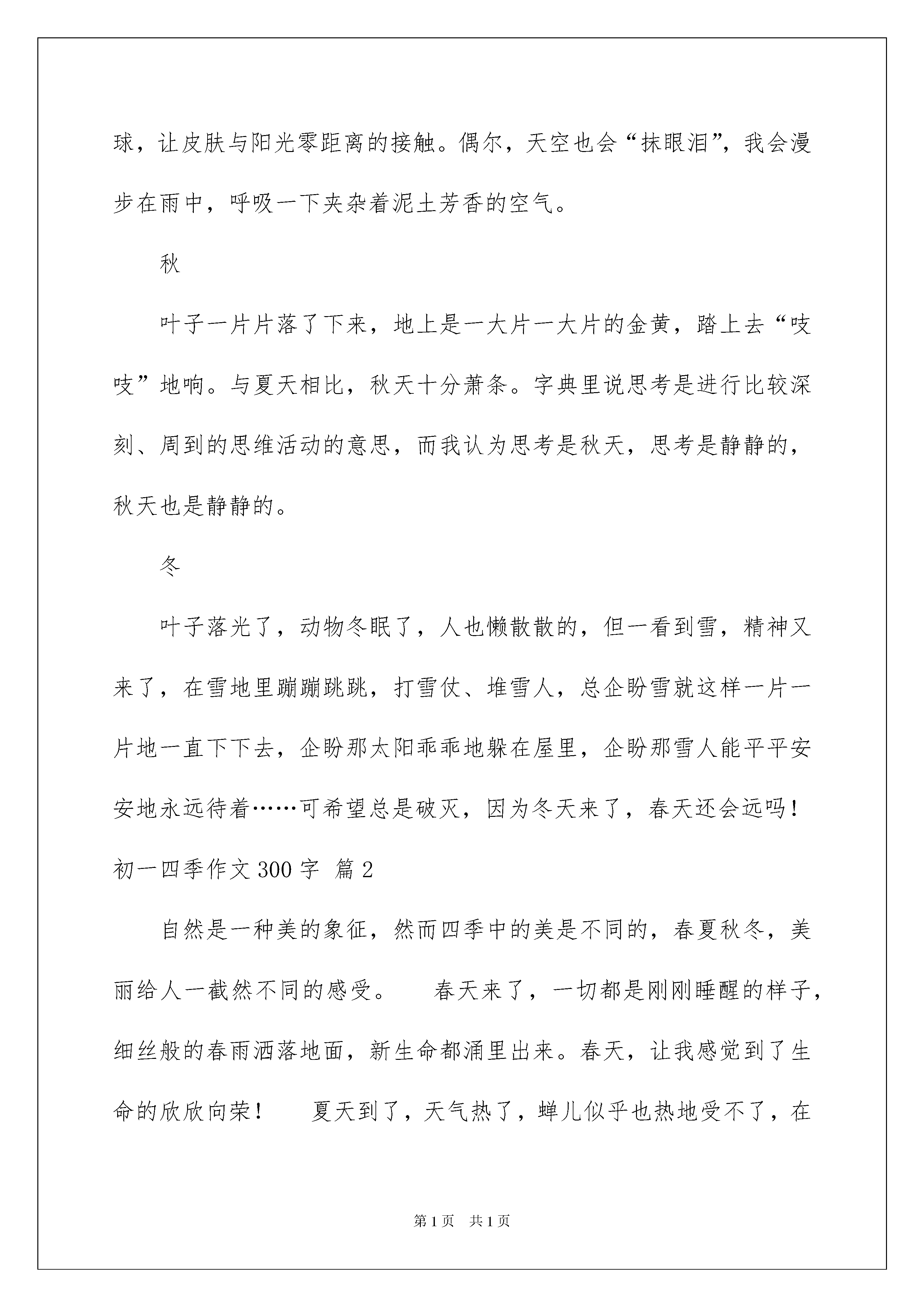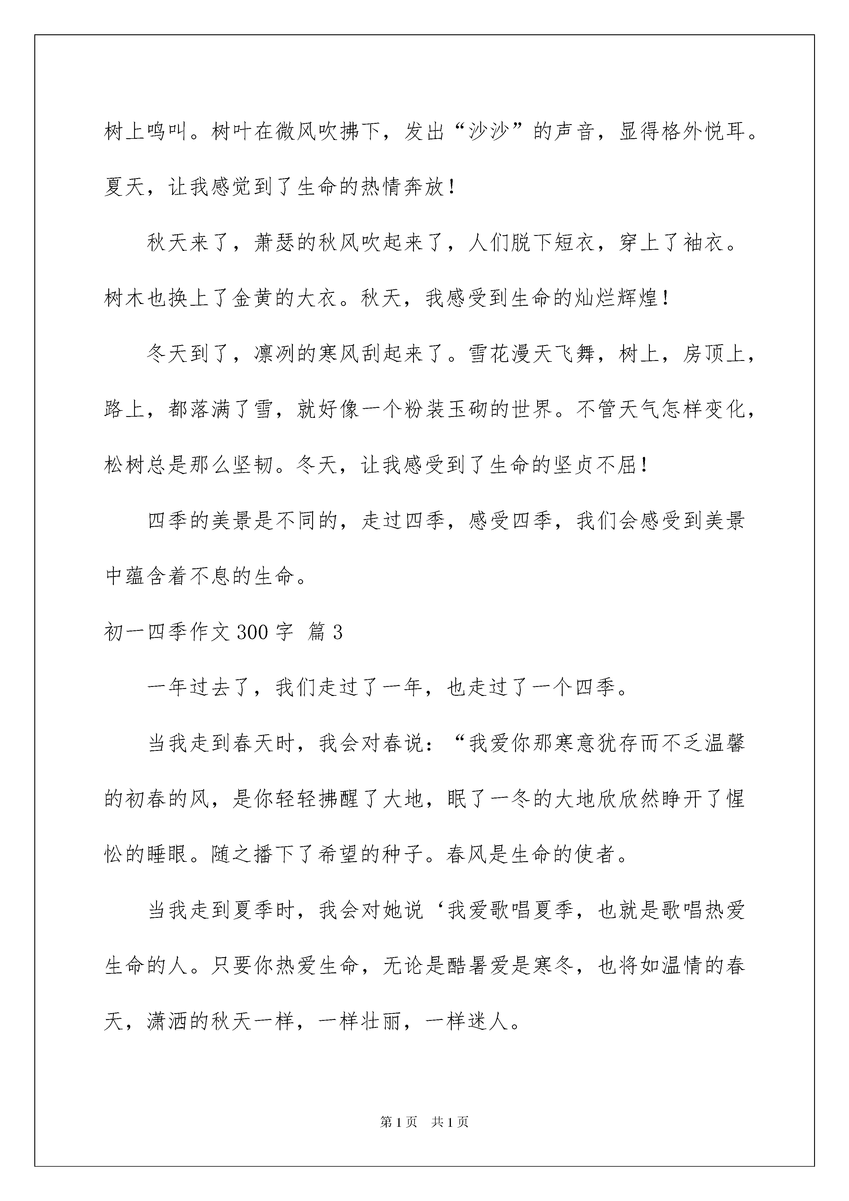 2022关于初一四季作文300字汇总六篇关于初一四季作文300字汇总六篇无论是身处学校还是步入社会,大家或多或少都会接触过作文吧,借助作文人们可以实现文化交流的目的。还是对作文一筹莫展吗?以下是我帮大家整理的初一四季作文300字6篇,欢迎大家分享。初一四季作文300字篇1无限循环——当我一接触无限循环这个词,我首先想到的就是春夏秋冬的交替。春在这个万物复苏的季节,我的读书欲望在经历“冬眠”后蠢蠢欲动,喜欢韩寒的判逆,喜欢郭敬明的忧郁,喜欢沈从文的朴实,这些文字在生机勃勃中升华。在春天,可以去亲近大自然,享受蒙蒙细雨后的清新,享受阳光洒在身上的感觉,享受鸟儿清脆的叫声。夏虽然它的阳光十分火辣,让人有昏昏欲睡的感觉,有另一种活力,是运动给予的。去游泳馆泡一天,感受一下夏日里的凉爽;打几下网球,让皮肤与阳光零距离的接触。偶尔,天空也会“抹眼泪”,我会漫步在雨中,呼吸一下夹杂着泥土芳香的空气。秋叶子一片片落了下来,地上是一大片一大片的金黄,踏上去“吱吱”地响。与夏天相比,秋天十分萧条。字典里说思考是进行比较深刻、周到的思维活动的意思,而我认为思考是秋天,思考是静静的,秋天也是静静的。冬叶子落光了,动物冬眠了,人也懒散散的,但一看到雪,精神又来了,在雪地里蹦蹦跳跳,打雪仗、堆雪人,总企盼雪就这样一片一片地一直下下去,企盼那太阳乖乖地躲在屋里,企盼那雪人能平平安安地永远待着……可希望总是破灭,因为冬天来了,春天还会远吗!初一四季作文300字篇2自然是一种美的象征,然而四季中的美是不同的,春夏秋冬,美丽给人一截然不同的感受。春天来了,一切都是刚刚睡醒的样子,细丝般的春雨洒落地面,新生命都涌里出来。春天,让我感觉到了生命的欣欣向荣!夏天到了,天气热了,蝉儿似乎也热地受不了,在树上鸣叫。树叶在微风吹拂下,发出“沙沙”的声音,显得格外悦耳。夏天,让我感觉到了生命的热情奔放!秋天来了,萧瑟的秋风吹起来了,人们脱下短衣,穿上了袖衣。树木也换上了金黄的大衣。秋天,我感受到生命的灿烂辉煌!冬天到了,凛冽的寒风刮起来了。雪花漫天飞舞,树上,房顶上,路上,都落满了雪,就好像一个粉装玉砌的世界。不管天气怎样变化,松树总是那么坚韧。冬天,让我感受到了生命的坚贞不屈!四季的美景是不同的,走过四季,感受四季,我们会感受到美景中蕴含着不息的生命。初一四季作文300字篇3一年过去了,我们走过了一年,也走过了一个四季。当我走到春天时,我会对春说:“我爱你那寒意犹存而不乏温馨的初春的风,是你轻轻拂醒了大地,眠了一冬的大地欣欣然睁开了惺忪的睡眼。随之播下了希望的种子。春风是生命的使者。当我走到夏季时,我会对她说‘我爱歌唱夏季,也就是歌唱热爱生命的人。只要你热爱生命,无论是酷暑爱是寒冬,也将如温情的春天,潇洒的秋天一样,一样壮丽,一样迷人。当我漫步到秋天时,它对我摇摇手说‘我是秋天,我是夏季过后不甘寂寞的秋。秋雨绵绵,滋润每一寸土地。雨后,调皮的牵牛花便又在细竹竿上缠了几圈,还开出了粉色,蓝色的小花,如同一只小喇叭在秋风中默默传递着秋季无语。’当我悄悄地走到冬天时,我便感叹道‘冬荒凉贫瘠,却埋藏着生命的种子,沉睡着绿色的希望。他有豪迈的性格,冷静的头脑,壮阔的胸怀。或许他很冷酷,但红色的曙光终将由天穹洒下,温暖的晨光必将在日出之地涌现。你会发现,他的冷酷也有美好的东西。人生总不会永远是春天,但只有努力拼搏,才能在冬天之后迎到遍地鲜花。’走过四季,你会发现有那么多残缺的美好;走过四季,你会领悟到很多很多......初一四季作文300字篇4春天是个可爱的小姑娘,小河解冻了,花儿争先恐后地开放了,有桃花,月季花,五色茶花,迎春花……柳树长出了嫩绿的叶子,大雁从南方飞回来了,小鸟在枝头上唱歌,青蛙从泥土里蹦出了,跳到河里清洗自己身上的泥土。还有许多的动物也出来了。春天万物复苏,是个充满希望的季节。夏天是个调皮的小娃娃,火辣辣的太阳挂在天上,好像要把地球烤成熟鸡蛋似的,小花低着头,小树弯着腰,好像在说:“好渴呀!好渴呀!”晚上,人们在树阴下说话,乘凉……讲着古老的故事,期盼秋天的收获。秋天是一位慈祥的老奶奶,她勤快地把树叶宝宝送会大地母亲的怀抱,再献上累累硕果,有桃子﹑杏子﹑香梨……农民伯伯种的稻子,像一片金色的海洋……秋天是丰收的季节。冬天是一位白发苍苍的老爷爷,雪总是静静地下着,雪停后,整个世界银妆素裹,分外妖娆。人们从屋里走出来踏雪,孩子们在雪地上堆雪人,打雪仗,那欢乐的叫喊声好象把树枝上的积雪都震下来了。初一四季作文300字篇5人的一生,如同四季,应适时安排,就像春天播种,夏天耕作,秋天收获,冬天储藏一样。春在古人眼中,是一