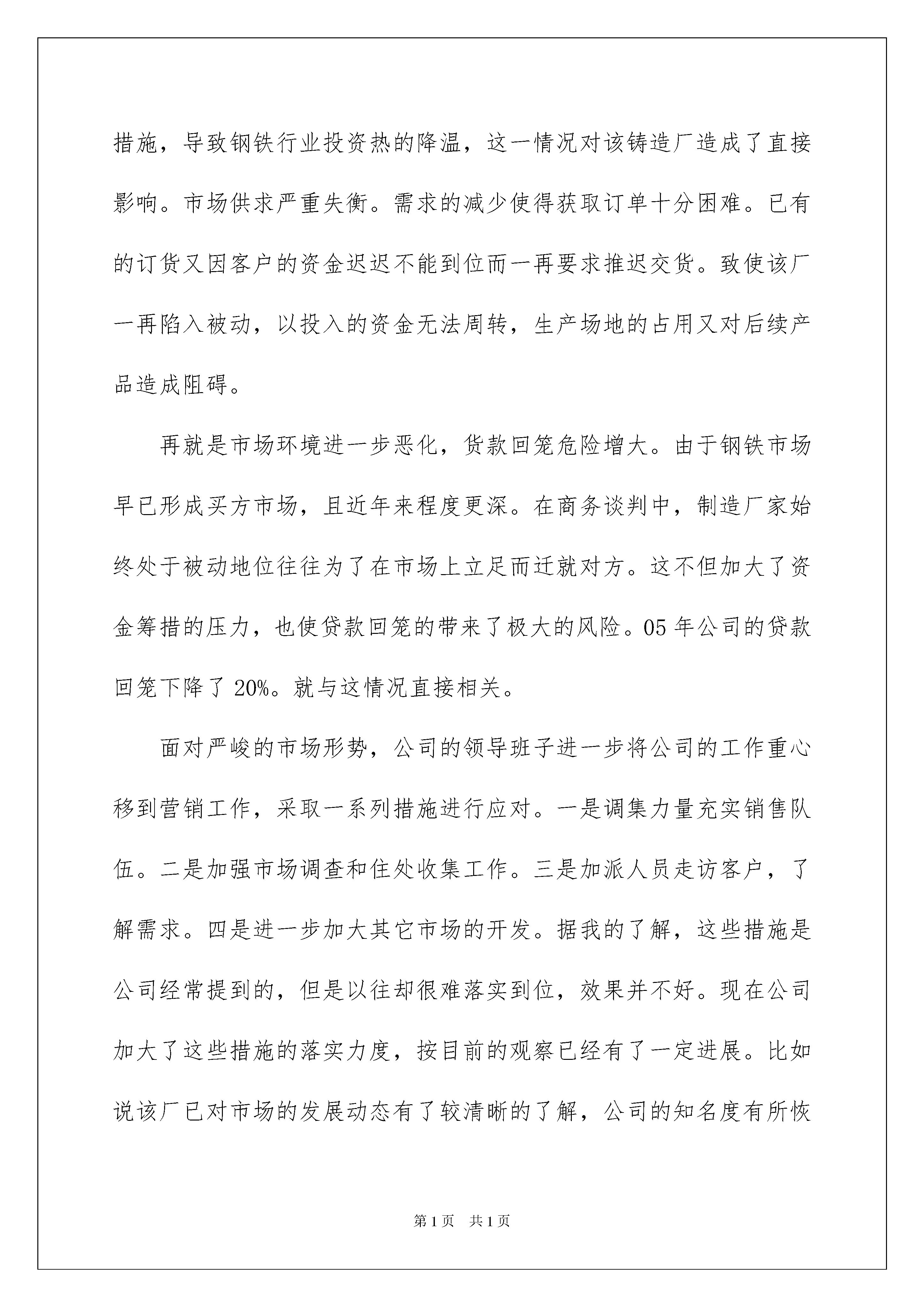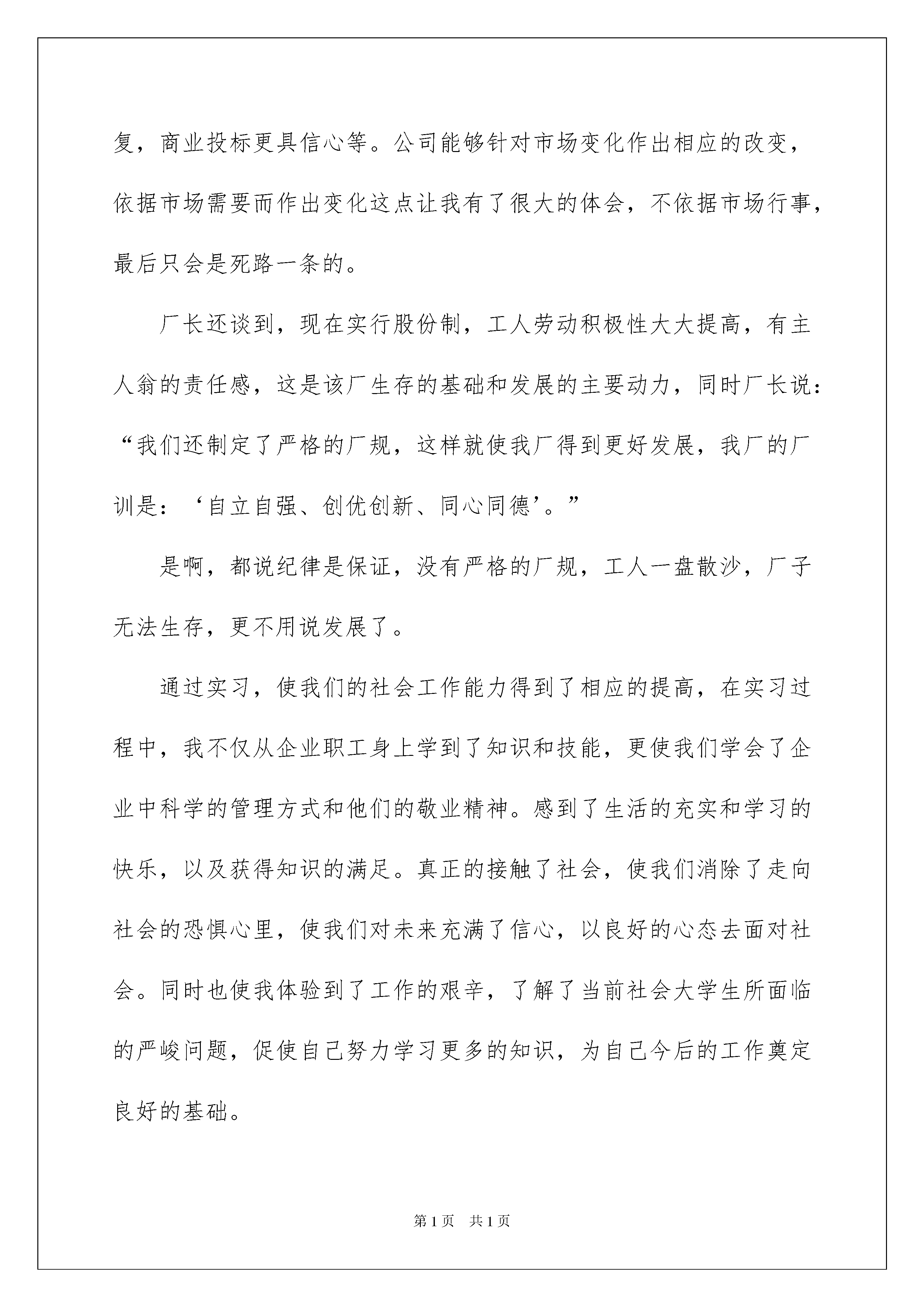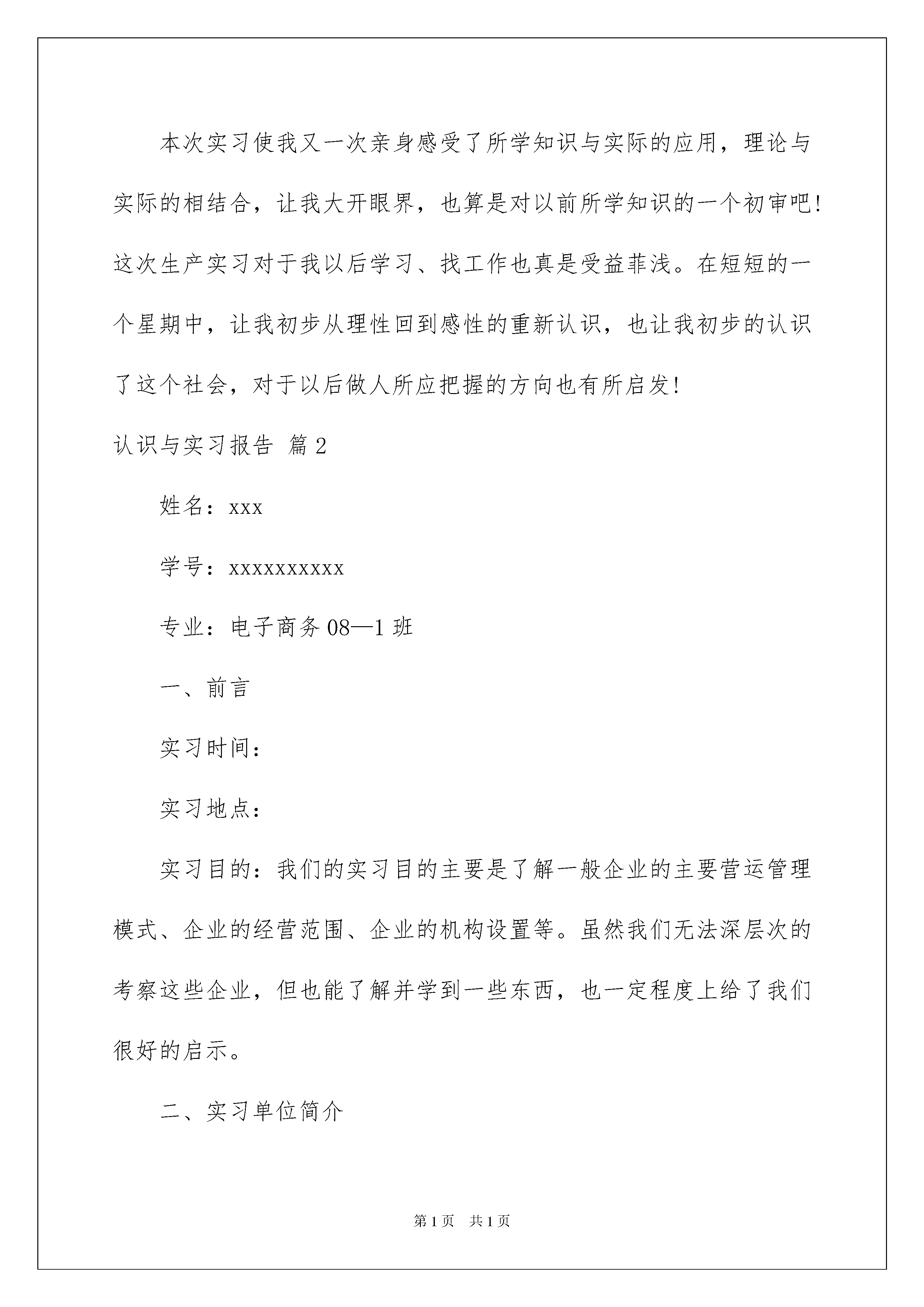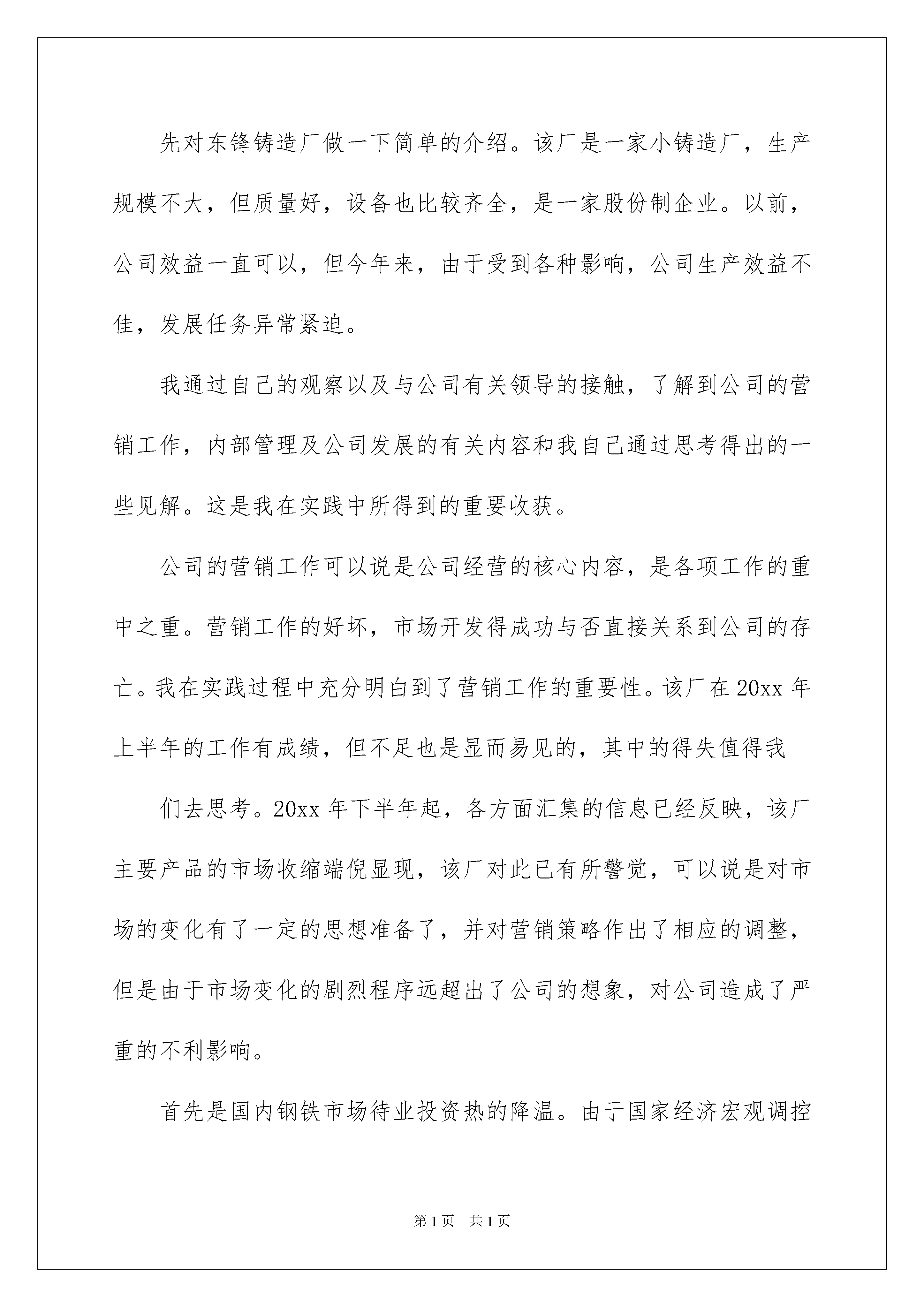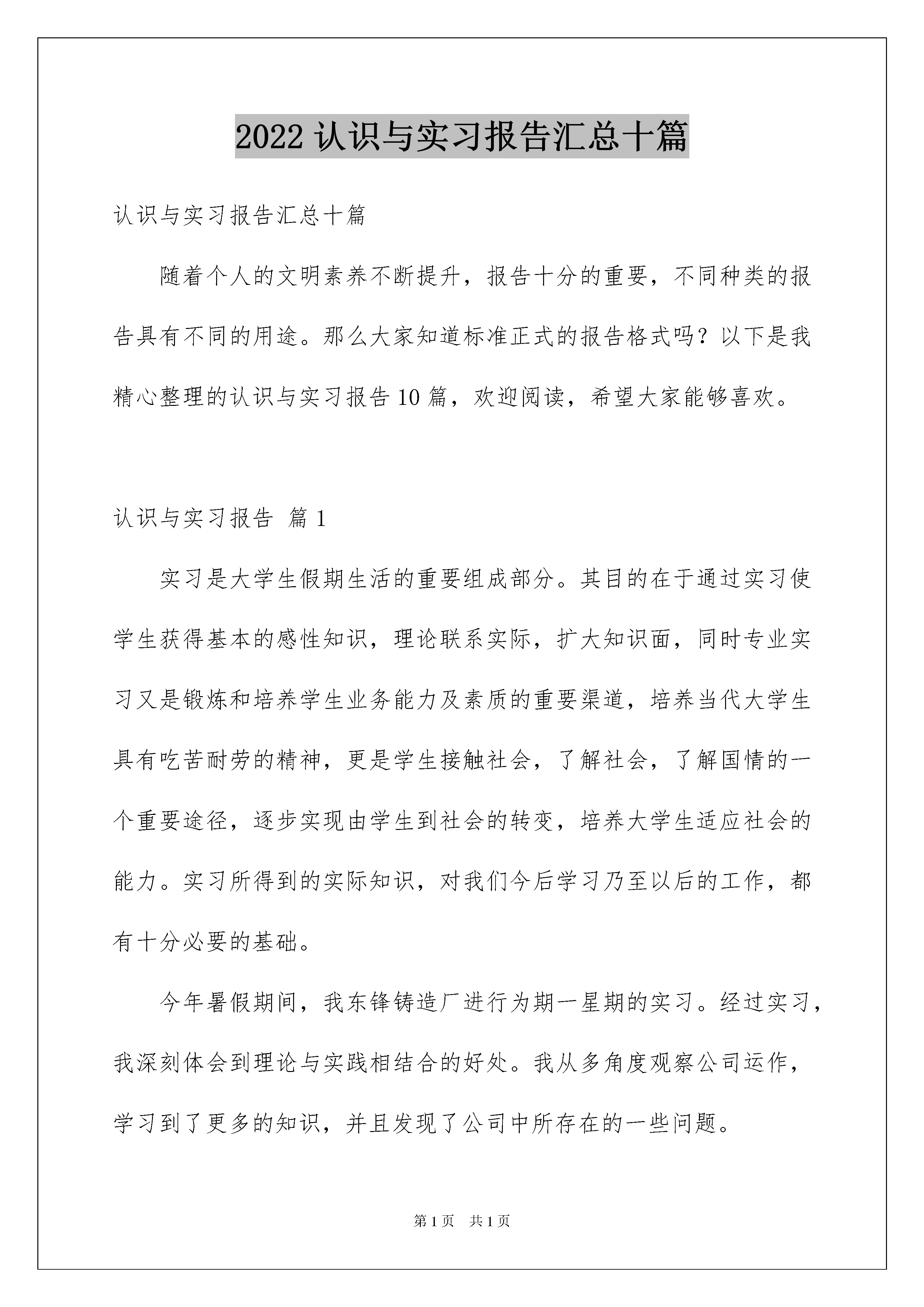 2022认识与实习报告汇总十篇认识与实习报告汇总十篇随着个人的文明素养不断提升,报告十分的重要,不同种类的报告具有不同的用途。那么大家知道标准正式的报告格式吗?以下是我精心整理的认识与实习报告10篇,欢迎阅读,希望大家能够喜欢。认识与实习报告篇1实习是大学生假期生活的重要组成部分。其目的在于通过实习使学生获得基本的感性知识,理论联系实际,扩大知识面,同时专业实习又是锻炼和培养学生业务能力及素质的重要渠道,培养当代大学生具有吃苦耐劳的精神,更是学生接触社会,了解社会,了解国情的一个重要途径,逐步实现由学生到社会的转变,培养大学生适应社会的能力。实习所得到的实际知识,对我们今后学习乃至以后的工作,都有十分必要的基础。今年暑假期间,我东锋铸造厂进行为期一星期的实习。经过实习,我深刻体会到理论与实践相结合的好处。我从多角度观察公司运作,学习到了更多的知识,并且发现了公司中所存在的一些问题。先对东锋铸造厂做一下简单的介绍。该厂是一家小铸造厂,生产规模不大,但质量好,设备也比较齐全,是一家股份制企业。以前,公司效益一直可以,但今年来,由于受到各种影响,公司生产效益不佳,发展任务异常紧迫。我通过自己的观察以及与公司有关领导的接触,了解到公司的营销工作,内部管理及公司发展的有关内容和我自己通过思考得出的一些见解。这是我在实践中所得到的重要收获。公司的营销工作可以说是公司经营的核心内容,是各项工作的重中之重。营销工作的好坏,市场开发得成功与否直接关系到公司的存亡。我在实践过程中充分明白到了营销工作的重要性。该厂在20xx年上半年的工作有成绩,但不足也是显而易见的,其中的得失值得我们去思考。20xx年下半年起,各方面汇集的信息已经反映,该厂主要产品的市场收缩端倪显现,该厂对此已有所警觉,可以说是对市场的变化有了一定的思想准备了,并对营销策略作出了相应的调整,但是由于市场变化的剧烈程序远超出了公司的想象,对公司造成了严重的不利影响。首先是国内钢铁市场待业投资热的降温。由于国家经济宏观调控措施,导致钢铁行业投资热的降温,这一情况对该铸造厂造成了直接影响。市场供求严重失衡。需求的减少使得获取订单十分困难。已有的订货又因客户的资金迟迟不能到位而一再要求推迟交货。致使该厂一再陷入被动,以投入的资金无法周转,生产场地的占用又对后续产品造成阻碍。再就是市场环境进一步恶化,货款回笼危险增大。由于钢铁市场早已形成买方市场,且近年来程度更深。在商务谈判中,制造厂家始终处于被动地位往往为了在市场上立足而迁就对方。这不但加大了资金筹措的压力,也使贷款回笼的带来了极大的风险。05年公司的贷款回笼下降了20%。就与这情况直接相关。面对严峻的市场形势,公司的领导班子进一步将公司的工作重心移到营销工作,采取一系列措施进行应对。一是调集力量充实销售队伍。二是加强市场调查和住处收集工作。三是加派人员走访客户,了解需求。四是进一步加大其它市场的开发。据我的了解,这些措施是公司经常提到的,但是以往却很难落实到位,效果并不好。现在公司加大了这些措施的落实力度,按目前的观察已经有了一定进展。比如说该厂已对市场的发展动态有了较清晰的了解,公司的知名度有所恢复,商业投标更具信心等。公司能够针对市场变化作出相应的改变,依据市场需要而作出变化这点让我有了很大的体会,不依据市场行事,最后只会是死路一条的。厂长还谈到,现在实行股份制,工人劳动积极性大大提高,有主人翁的责任感,这是该厂生存的基础和发展的主要动力,同时厂长说:“我们还制定了严格的厂规,这样就使我厂得到更好发展,我厂的厂训是:‘自立自强、创优创新、同心同德’。”是啊,都说纪律是保证,没有严格的厂规,工人一盘散沙,厂子无法生存,更不用说发展了。通过实习,使我们的社会工作能力得到了相应的提高,在实习过程中,我不仅从企业职工身上学到了知识和技能,更使我们学会了企业中科学的管理方式和他们的敬业精神。感到了生活的充实和学习的快乐,以及获得知识的满足。真正的接触了社会,使我们消除了走向社会的恐惧心里,使我们对未来充满了信心,以良好的心态去面对社会。同时也使我体验到了工作的艰辛,了解了当前社会大学生所面临的严峻问题,促使自己努力学习更多的知识,为自己今后的工作奠定良好的基础。本次实习使我又一次亲身感受了所学知识与实际的应用,理论与实际的相结合,让我大开眼界,也算是对以前所学知识的一个初审吧!这次生产实习对于我以后学习、找工作也真是受益菲浅。在短短的一个星期中,让我初步从理性回到感性的重新认识,也让我初步的认识了这个社会,对于以后做人所应把握的方向也有所启发!认识与实习报告篇2姓名:xxx学号:xxx