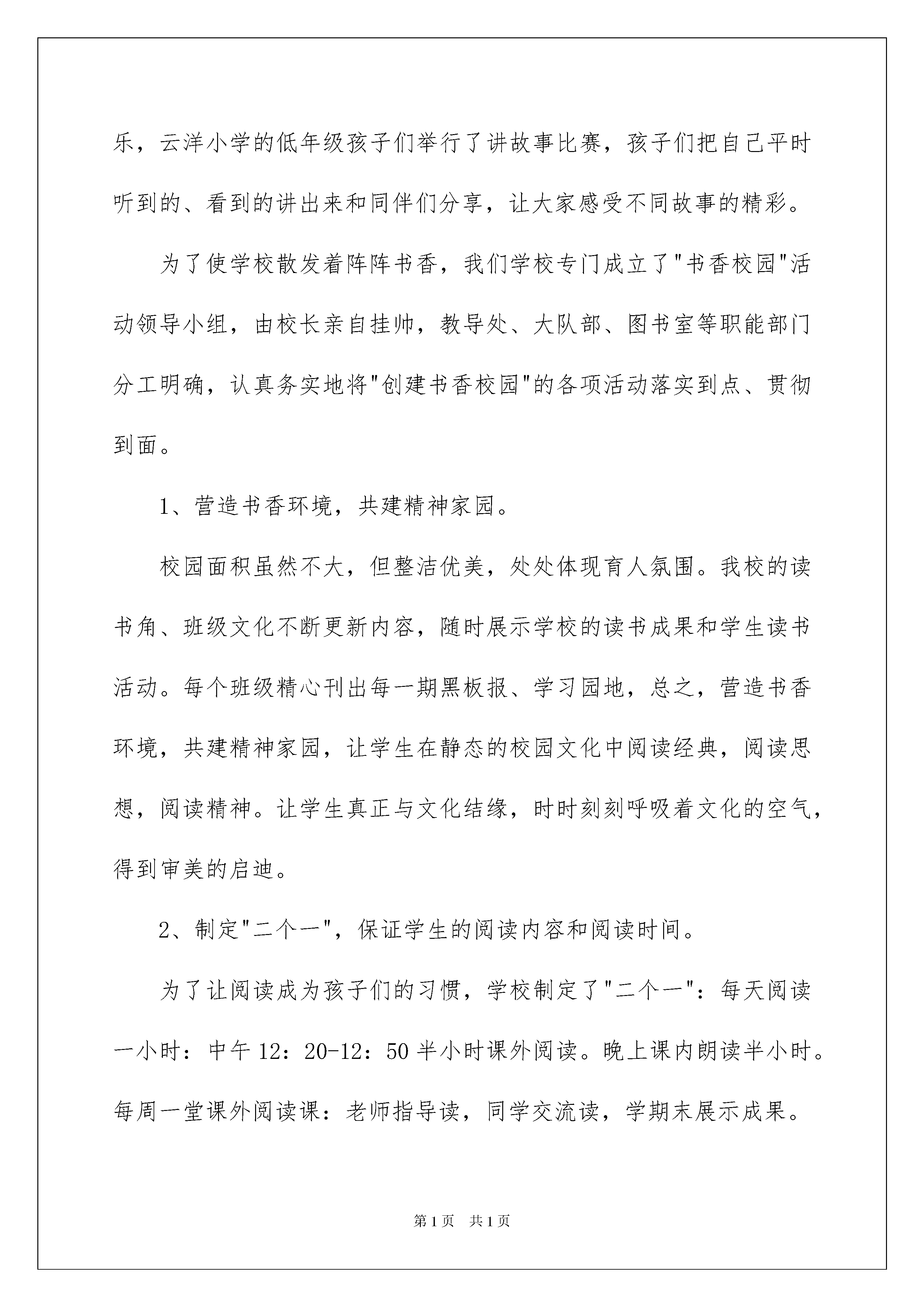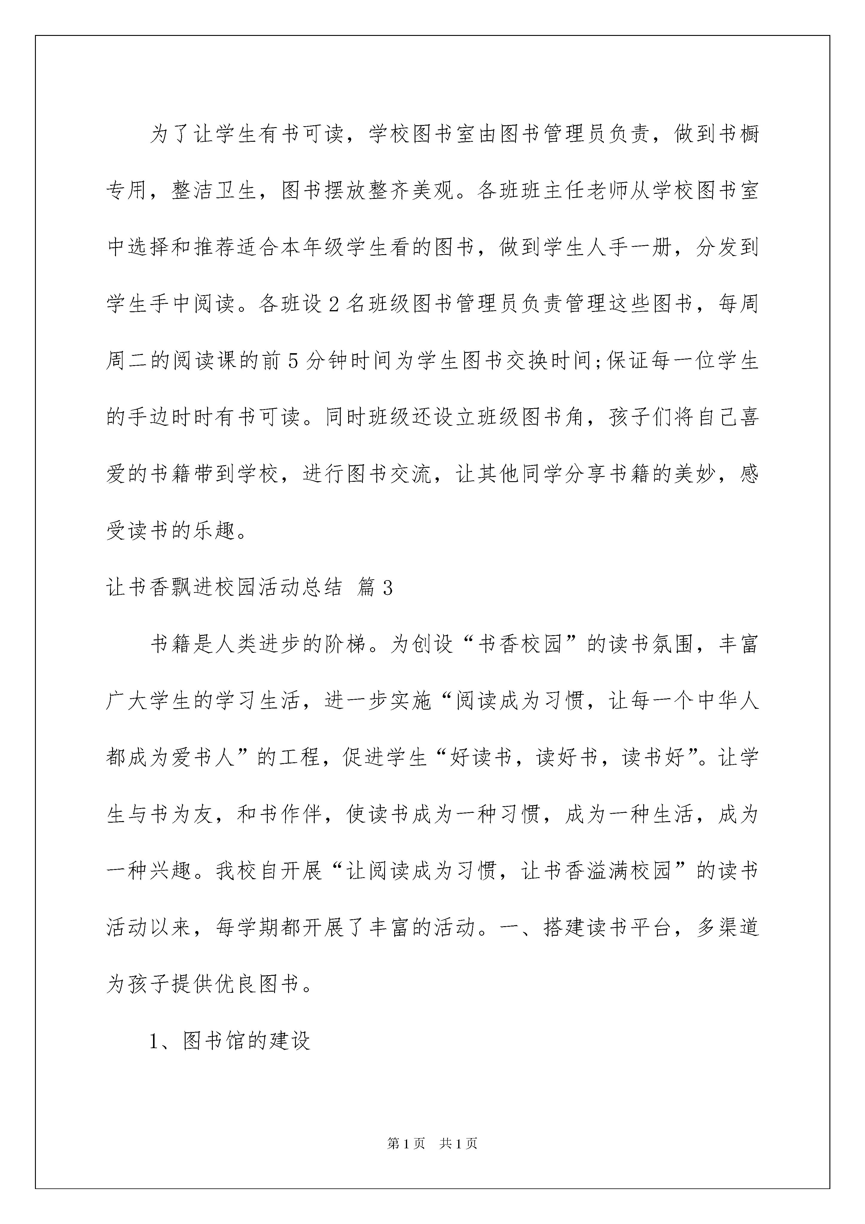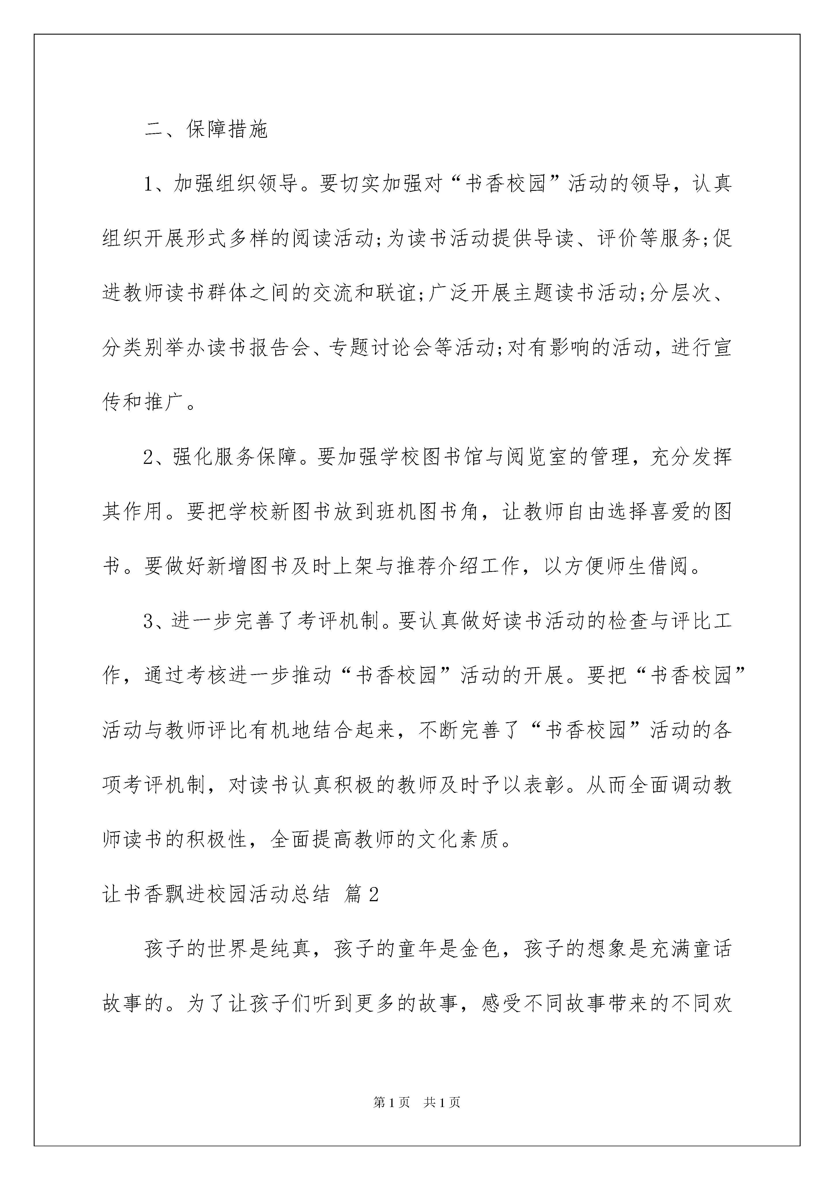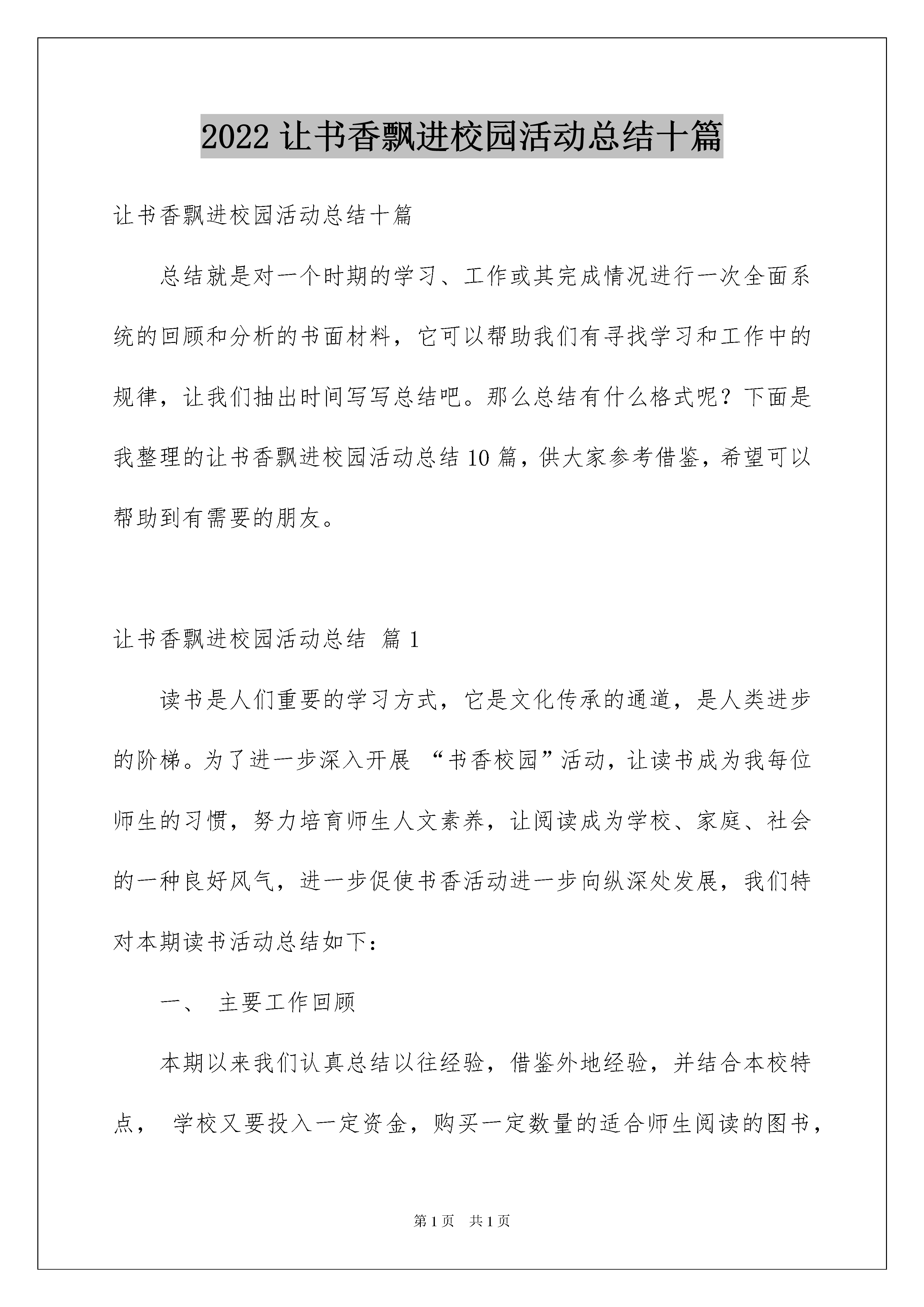 2022让书香飘进校园活动总结十篇让书香飘进校园活动总结十篇总结就是对一个时期的学习、工作或其完成情况进行一次全面系统的回顾和分析的书面材料,它可以帮助我们有寻找学习和工作中的规律,让我们抽出时间写写总结吧。那么总结有什么格式呢?下面是我整理的让书香飘进校园活动总结10篇,供大家参考借鉴,希望可以帮助到有需要的朋友。让书香飘进校园活动总结篇1读书是人们重要的学习方式,它是文化传承的通道,是人类进步的阶梯。为了进一步深入开展“书香校园”活动,让读书成为我每位师生的习惯,努力培育师生人文素养,让阅读成为学校、家庭、社会的一种良好风气,进一步促使书香活动进一步向纵深处发展,我们特对本期读书活动总结如下:一、主要工作回顾本期以来我们认真总结以往经验,借鉴外地经验,并结合本校特点,学校又要投入一定资金,购买一定数量的适合师生阅读的图书,切实加强学校图书室、阅览室、班级图书角、网络教室的管理,充分发挥其作用,积极为广大师生阅读提供良好的平台。(一)、教师读书活动1、每位老师结合个人实际,明确读书书目内容、目标、措施、效果预测等。如《教师走向成功的二十二条军规》、《李镇西教育思想》、《如何作好班主任》、《诗歌教学》、《三字经》等。2、倡导教师树立“时时学习、处处学习”意识,充分利用假期、周末以及课余时间,进行自我充电,走近经典,品味名著,提升个人综合素养。3、建立教师月读书制度,每位教师每月至少读一本好书。所读书籍可以是学校推荐的,也可以是个人自选。4、提倡“不动笔墨不读书”,促使教师养成良好的阅读习惯。每学期记录至少5000字学习笔记或读书随笔。鼓励青年教师自我加压,逐步增加随笔篇数、字数。学校要定时作好督促检查。5、加强教师读书成果展示交流,积极开展主题阅读沙龙、读书笔记展评、经典诗文诵读、读书活动交流等活动,评选学习标兵,营造良好的校园读书氛围。二、保障措施1、加强组织领导。要切实加强对“书香校园”活动的领导,认真组织开展形式多样的阅读活动;为读书活动提供导读、评价等服务;促进教师读书群体之间的交流和联谊;广泛开展主题读书活动;分层次、分类别举办读书报告会、专题讨论会等活动;对有影响的活动,进行宣传和推广。2、强化服务保障。要加强学校图书馆与阅览室的管理,充分发挥其作用。要把学校新图书放到班机图书角,让教师自由选择喜爱的图书。要做好新增图书及时上架与推荐介绍工作,以方便师生借阅。3、进一步完善了考评机制。要认真做好读书活动的检查与评比工作,通过考核进一步推动“书香校园”活动的开展。要把“书香校园”活动与教师评比有机地结合起来,不断完善了“书香校园”活动的各项考评机制,对读书认真积极的教师及时予以表彰。从而全面调动教师读书的积极性,全面提高教师的文化素质。让书香飘进校园活动总结篇2孩子的世界是纯真,孩子的童年是金色,孩子的想象是充满童话故事的。为了让孩子们听到更多的故事,感受不同故事带来的不同欢乐,云洋小学的低年级孩子们举行了讲故事比赛,孩子们把自己平时听到的、看到的讲出来和同伴们分享,让大家感受不同故事的精彩。为了使学校散发着阵阵书香,我们学校专门成立了"书香校园"活动领导小组,由校长亲自挂帅,教导处、大队部、图书室等职能部门分工明确,认真务实地将"创建书香校园"的各项活动落实到点、贯彻到面。1、营造书香环境,共建精神家园。校园面积虽然不大,但整洁优美,处处体现育人氛围。我校的读书角、班级文化不断更新内容,随时展示学校的读书成果和学生读书活动。每个班级精心刊出每一期黑板报、学习园地,总之,营造书香环境,共建精神家园,让学生在静态的校园文化中阅读经典,阅读思想,阅读精神。让学生真正与文化结缘,时时刻刻呼吸着文化的空气,得到审美的启迪。2、制定"二个一",保证学生的阅读内容和阅读时间。为了让阅读成为孩子们的习惯,学校制定了"二个一":每天阅读一小时:中午12:20-12:50半小时课外阅读。晚上课内朗读半小时。每周一堂课外阅读课:老师指导读,同学交流读,学期末展示成果。为了让学生有书可读,学校图书室由图书管理员负责,做到书橱专用,整洁卫生,图书摆放整齐美观。各班班主任老师从学校图书室中选择和推荐适合本年级学生看的图书,做到学生人手一册,分发到学生手中阅读。各班设2名班级图书管理员负责管理这些图书,每周周二的阅读课的前5分钟时间为学生图书交换时间;保证每一位学生的手边时时有书可读。同时班级还设立班级图书角,孩子们将自己喜爱的书籍带到学校,进行图书交流,让其他同学分享书籍的美妙,感受读书的乐趣。让书香飘进校园活动总结篇3书籍是人类进步的阶梯。为创设“书香校园”的读书氛围,丰富广大学生的学