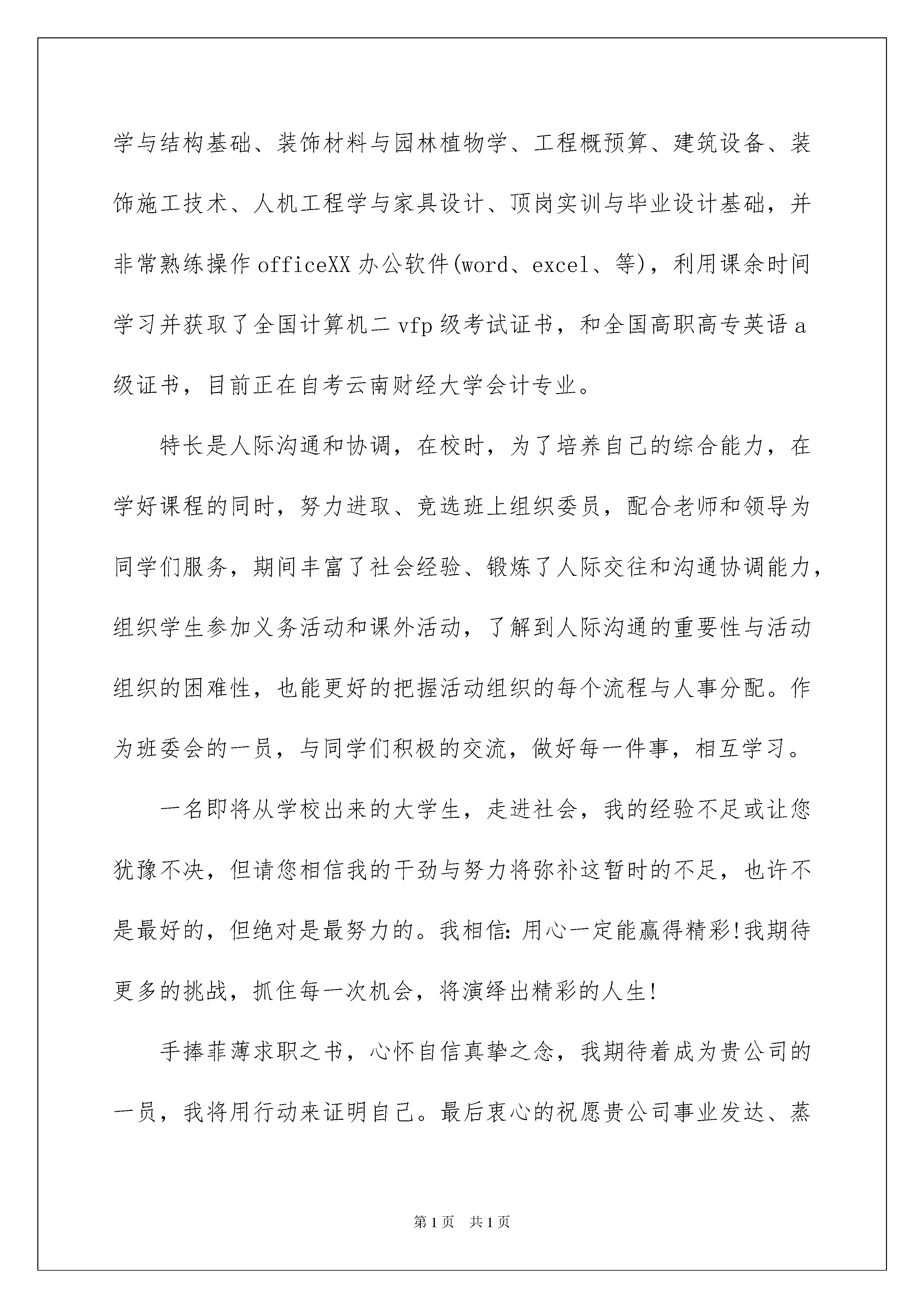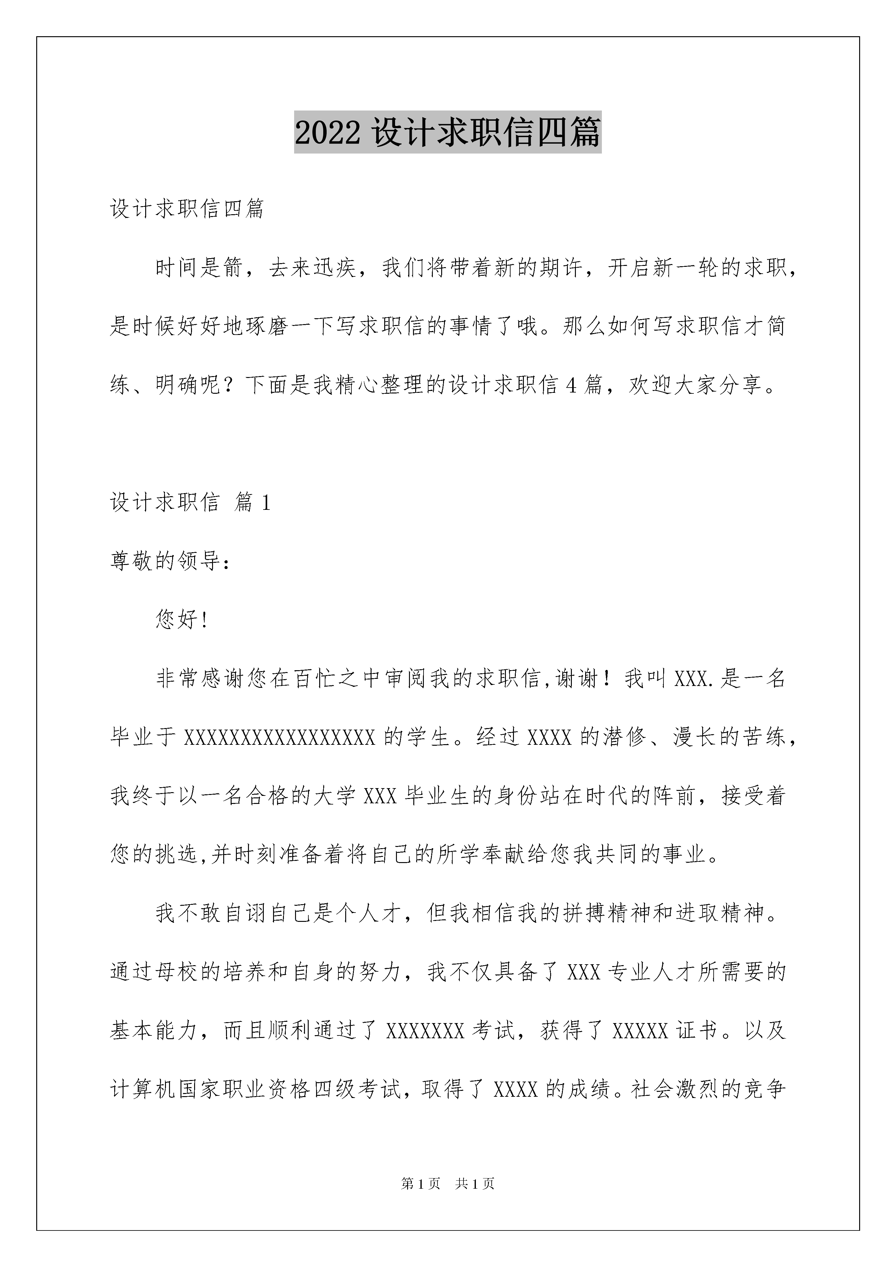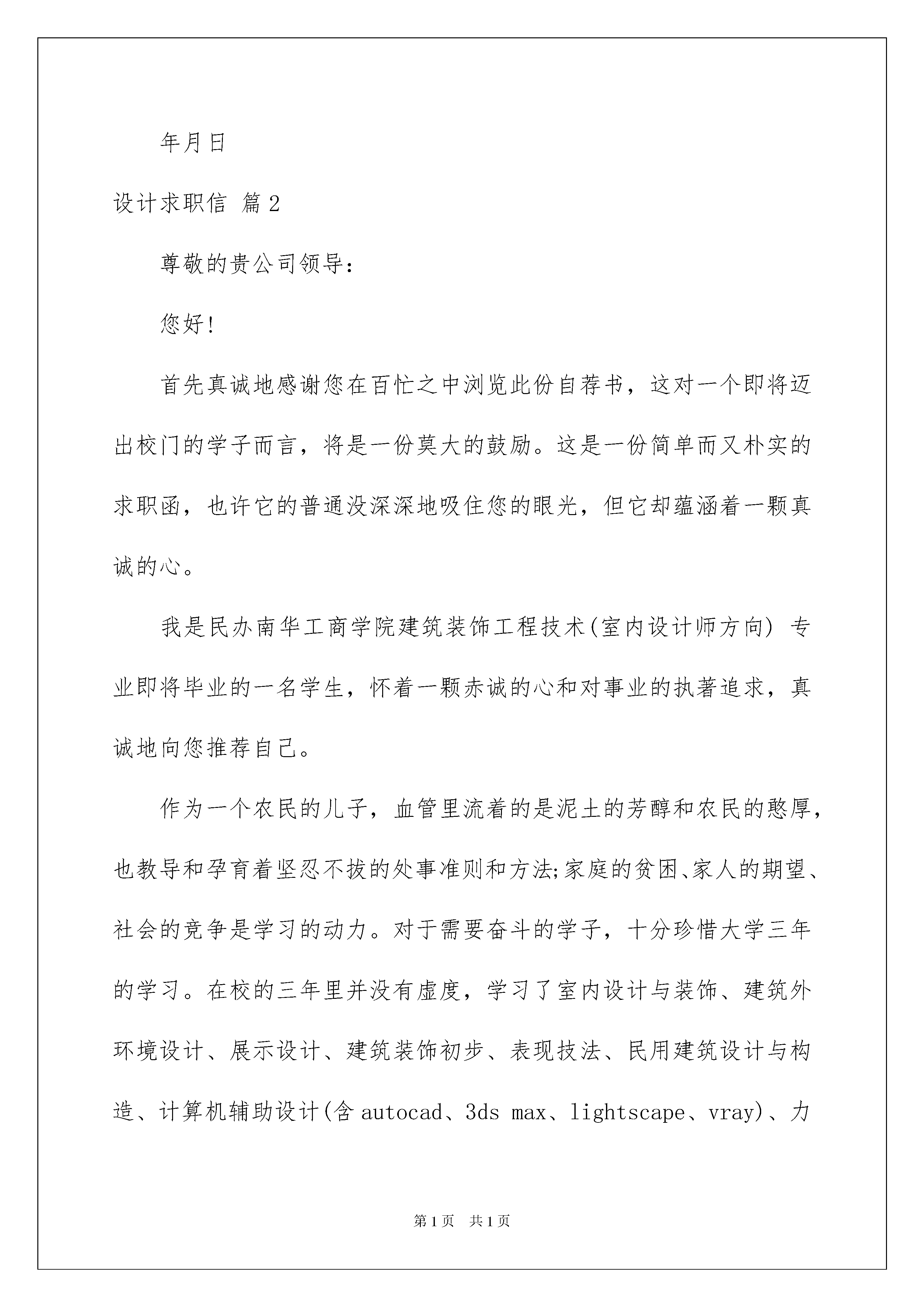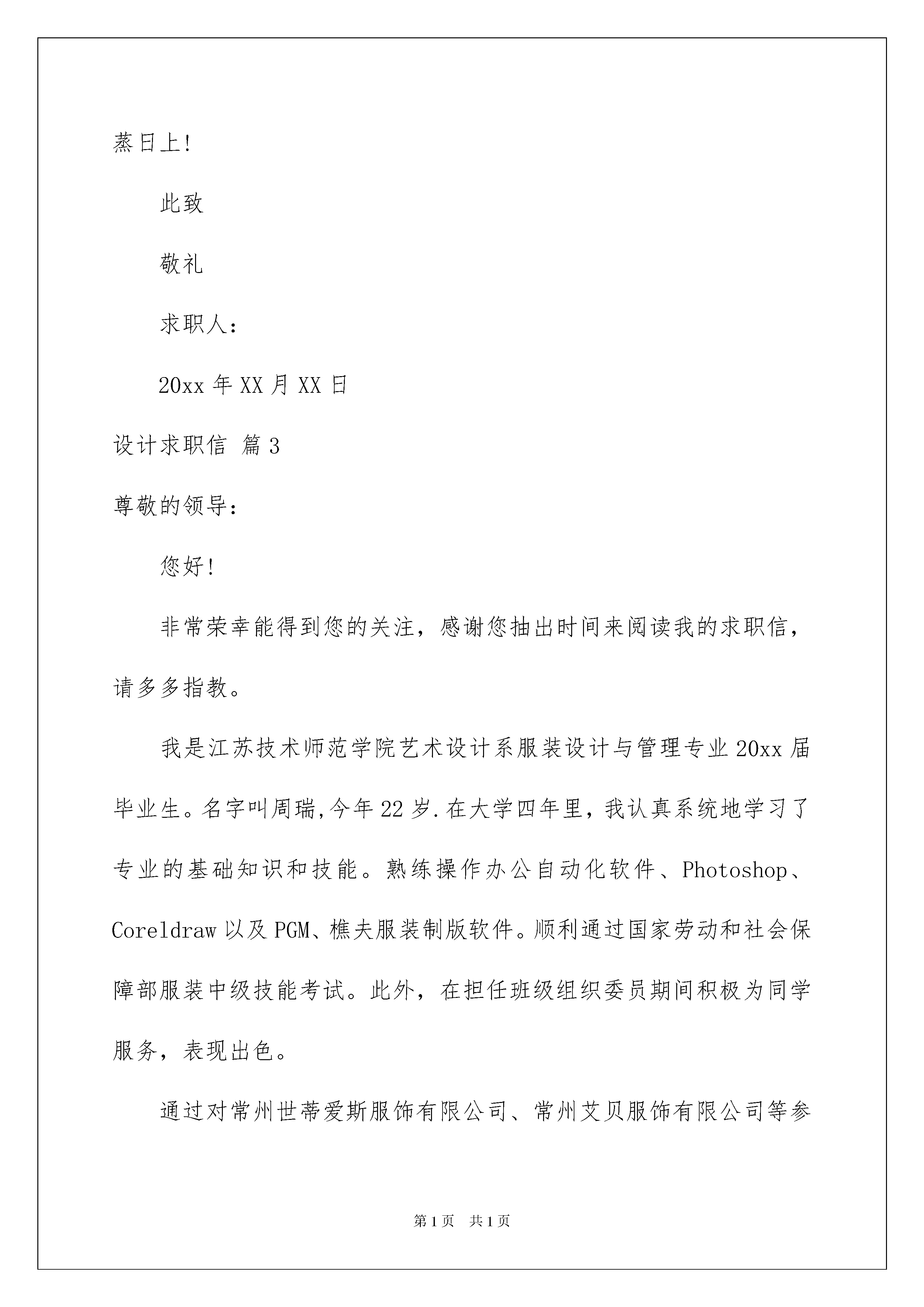 2022设计求职信四篇设计求职信四篇时间是箭,去来迅疾,我们将带着新的期许,开启新一轮的求职,是时候好好地琢磨一下写求职信的事情了哦。那么如何写求职信才简练、明确呢?下面是我精心整理的设计求职信4篇,欢迎大家分享。设计求职信篇1尊敬的领导:您好!非常感谢您在百忙之中审阅我的求职信,谢谢!我叫XXX.是一名毕业于XXXXXXXXXXXXXXXXX的学生。经过XXXX的潜修、漫长的苦练,我终于以一名合格的大学XXX毕业生的身份站在时代的阵前,接受着您的挑选,并时刻准备着将自己的所学奉献给您我共同的事业。我不敢自诩自己是个人才,但我相信我的拼搏精神和进取精神。通过母校的培养和自身的努力,我不仅具备了XXX专业人才所需要的基本能力,而且顺利通过了XXXXXXX考试,获得了XXXXX证书。以及计算机国家职业资格四级考试,取得了XXXX的成绩。社会激烈的竞争使我深知全面发展的重要性,本着向复合型人才发展的原则,“努力可能不会成功,不努力连成功的机会都没有”一直是我执着的观念;“细心”“用心”“诚心”是我不变的准则。我渴望能够加入你们的贵单位,我会踏踏实实的做好属于自己的一份工作,竭尽全力的在工作中取得好的成绩.我相信经过自己的勤奋和努力,一定会做出应有的贡献。我不是千里马,但我会像千里马一样不断向前奔跑。我并不是众多求职者中最突出的一个,也不是能力最强的一个。我所追求的是稳稳扎扎做事,利利索索做人。本着细心、用心、诚心的信念去做好每一件事。我期望的是一个千里马赛马场的平台,我坚信了贵公司,殷切期望贵公司坚信我可以。感谢您在百忙之中所给与我的关注,愿贵单位事业蒸蒸日上,屡创佳绩,祝您的事业白尺竿头,更进一步!希望各位领导能够对我予以考虑,我热切期盼你们的回音.谢谢!此致敬礼!求职人:年月日设计求职信篇2尊敬的贵公司领导:您好!首先真诚地感谢您在百忙之中浏览此份自荐书,这对一个即将迈出校门的学子而言,将是一份莫大的鼓励。这是一份简单而又朴实的求职函,也许它的普通没深深地吸住您的眼光,但它却蕴涵着一颗真诚的心。我是民办南华工商学院建筑装饰工程技术(室内设计师方向)专业即将毕业的一名学生,怀着一颗赤诚的心和对事业的执著追求,真诚地向您推荐自己。作为一个农民的儿子,血管里流着的是泥土的芳醇和农民的憨厚,也教导和孕育着坚忍不拔的处事准则和方法;家庭的贫困、家人的期望、社会的竞争是学习的动力。对于需要奋斗的学子,十分珍惜大学三年的学习。在校的三年里并没有虚度,学习了室内设计与装饰、建筑外环境设计、展示设计、建筑装饰初步、表现技法、民用建筑设计与构造、计算机辅助设计(含autocad、3dsmax、lightscape、vray)、力学与结构基础、装饰材料与园林植物学、工程概预算、建筑设备、装饰施工技术、人机工程学与家具设计、顶岗实训与毕业设计基础,并非常熟练操作officeXX办公软件(word、excel、等),利用课余时间学习并获取了全国计算机二vfp级考试证书,和全国高职高专英语a级证书,目前正在自考云南财经大学会计专业。特长是人际沟通和协调,在校时,为了培养自己的综合能力,在学好课程的同时,努力进取、竞选班上组织委员,配合老师和领导为同学们服务,期间丰富了社会经验、锻炼了人际交往和沟通协调能力,组织学生参加义务活动和课外活动,了解到人际沟通的重要性与活动组织的困难性,也能更好的把握活动组织的每个流程与人事分配。作为班委会的一员,与同学们积极的交流,做好每一件事,相互学习。一名即将从学校出来的大学生,走进社会,我的经验不足或让您犹豫不决,但请您相信我的干劲与努力将弥补这暂时的不足,也许不是最好的,但绝对是最努力的。我相信:用心一定能赢得精彩!我期待更多的挑战,抓住每一次机会,将演绎出精彩的人生!手捧菲薄求职之书,心怀自信真挚之念,我期待着成为贵公司的一员,我将用行动来证明自己。最后衷心的祝愿贵公司事业发达、蒸蒸日上!此致敬礼求职人:20xx年XX月XX日设计求职信篇3尊敬的领导:您好!非常荣幸能得到您的关注,感谢您抽出时间来阅读我的求职信,请多多指教。我是江苏技术师范学院艺术设计系服装设计与管理专业20xx届毕业生。名字叫周瑞,今年22岁.在大学四年里,我认真系统地学习了专业的基础知识和技能。熟练操作办公自动化软件、Photoshop、Coreldraw以及PGM、樵夫服装制版软件。顺利通过国家劳动和社会保障部服装中级技能考试。此外,在担任班级组织委员期间积极为同学服务,表现出色。通过对常州世蒂爱斯服饰有限公司、常州艾贝服饰有限公司等参观学习。以及在常州东华服饰有限公司的实习使我深入了解了服