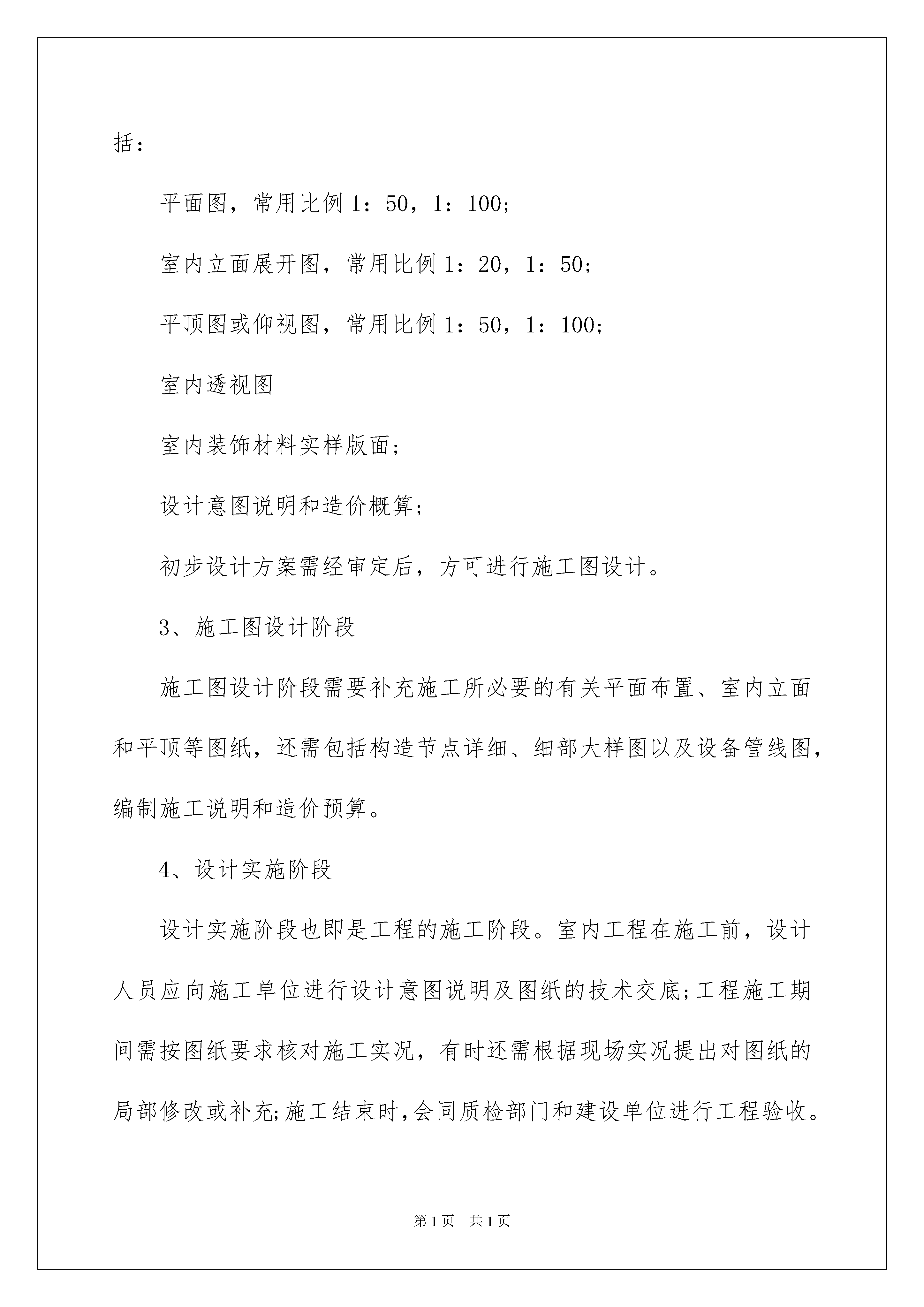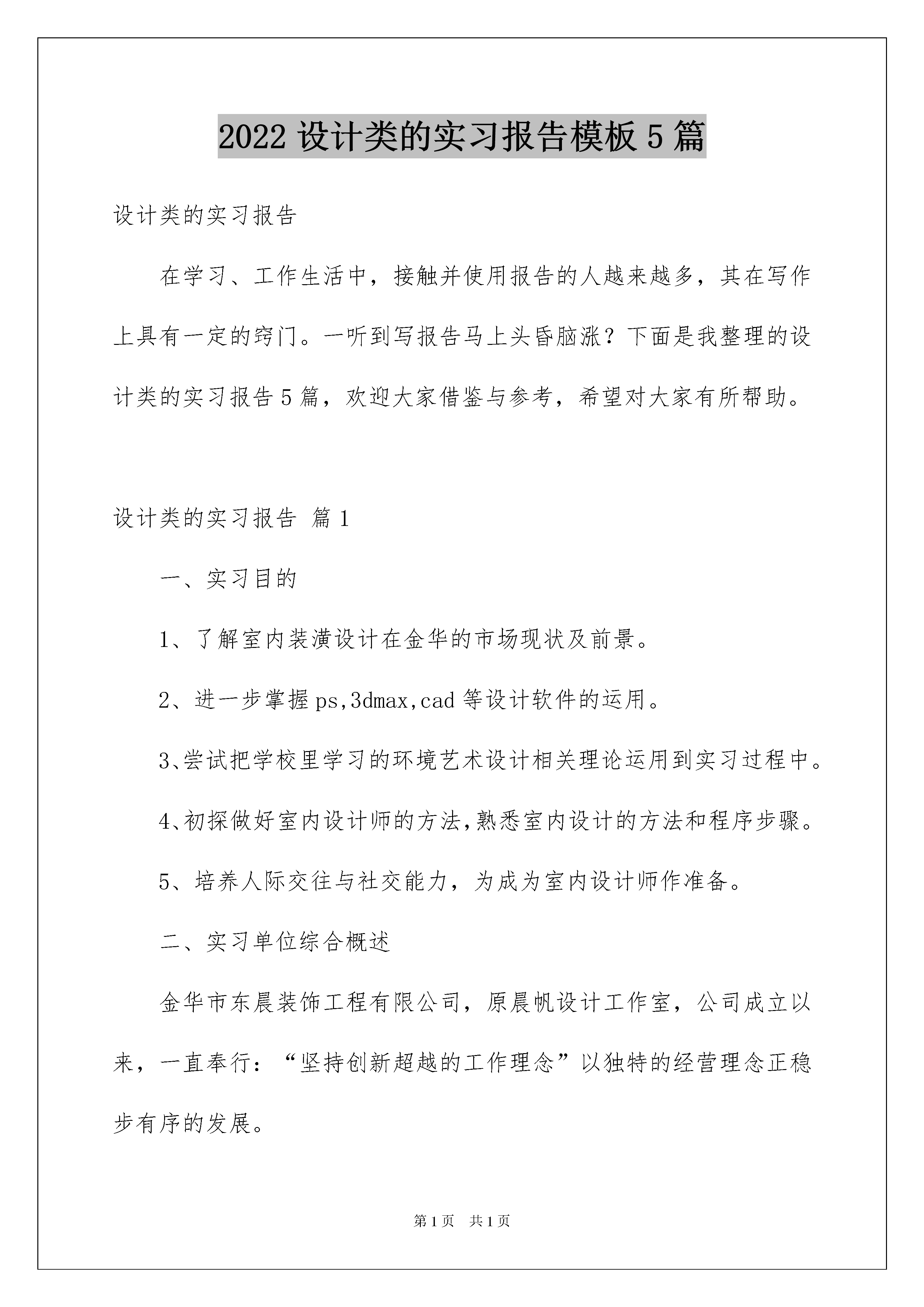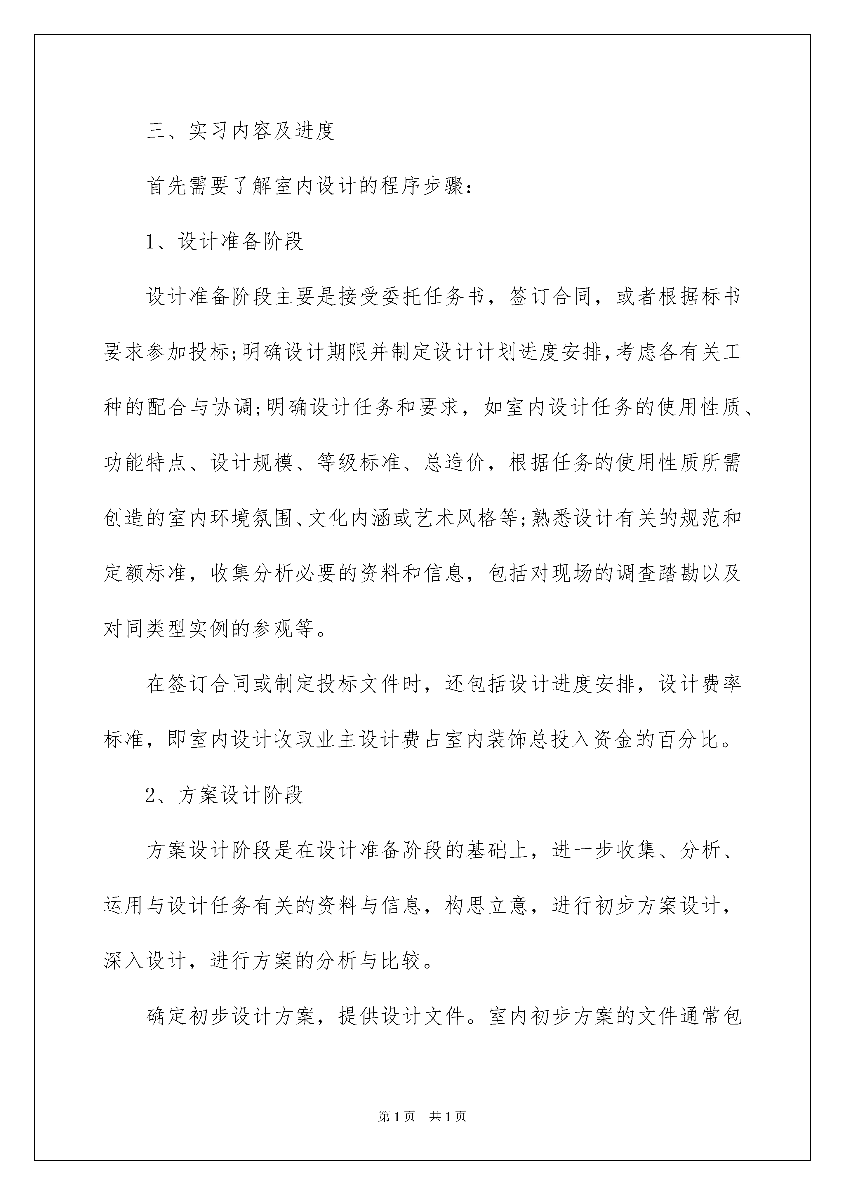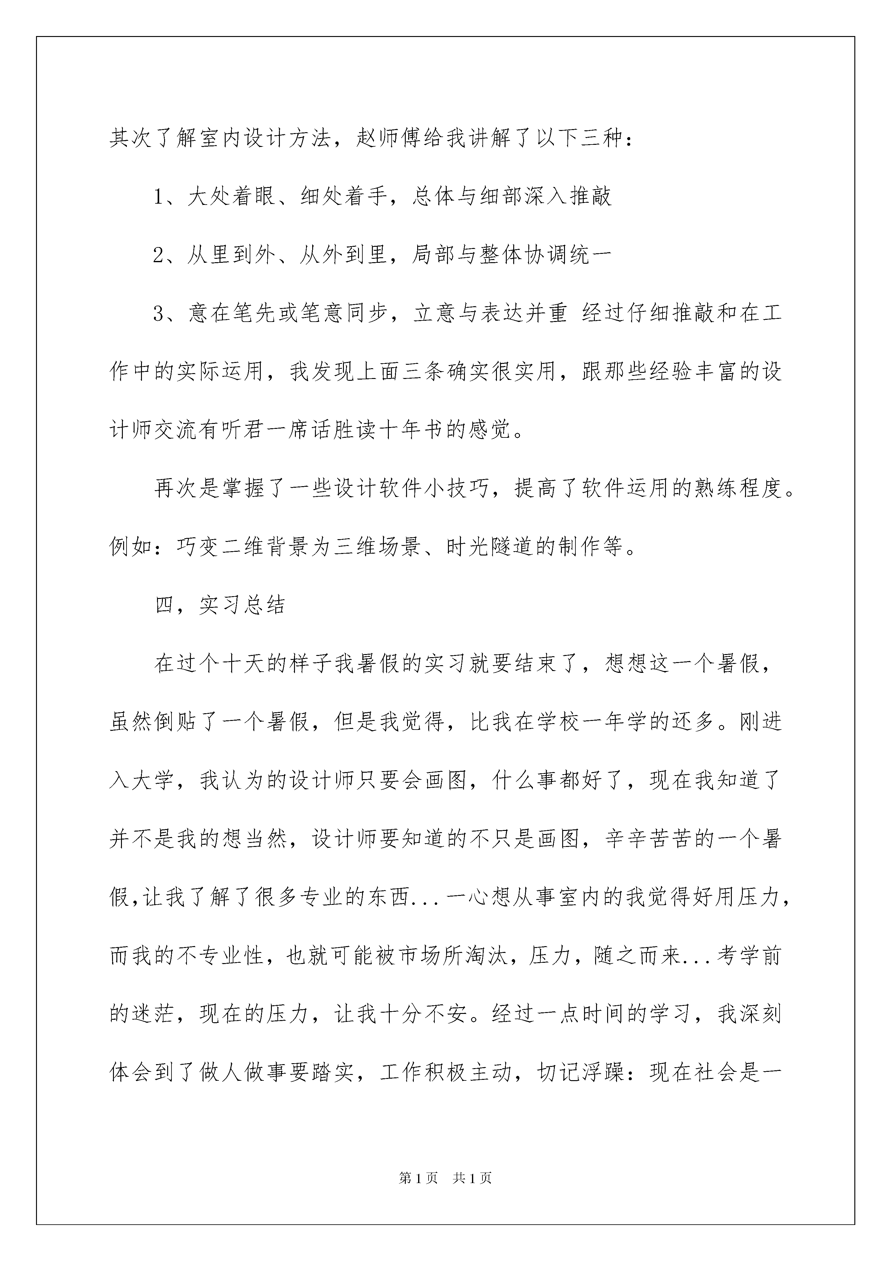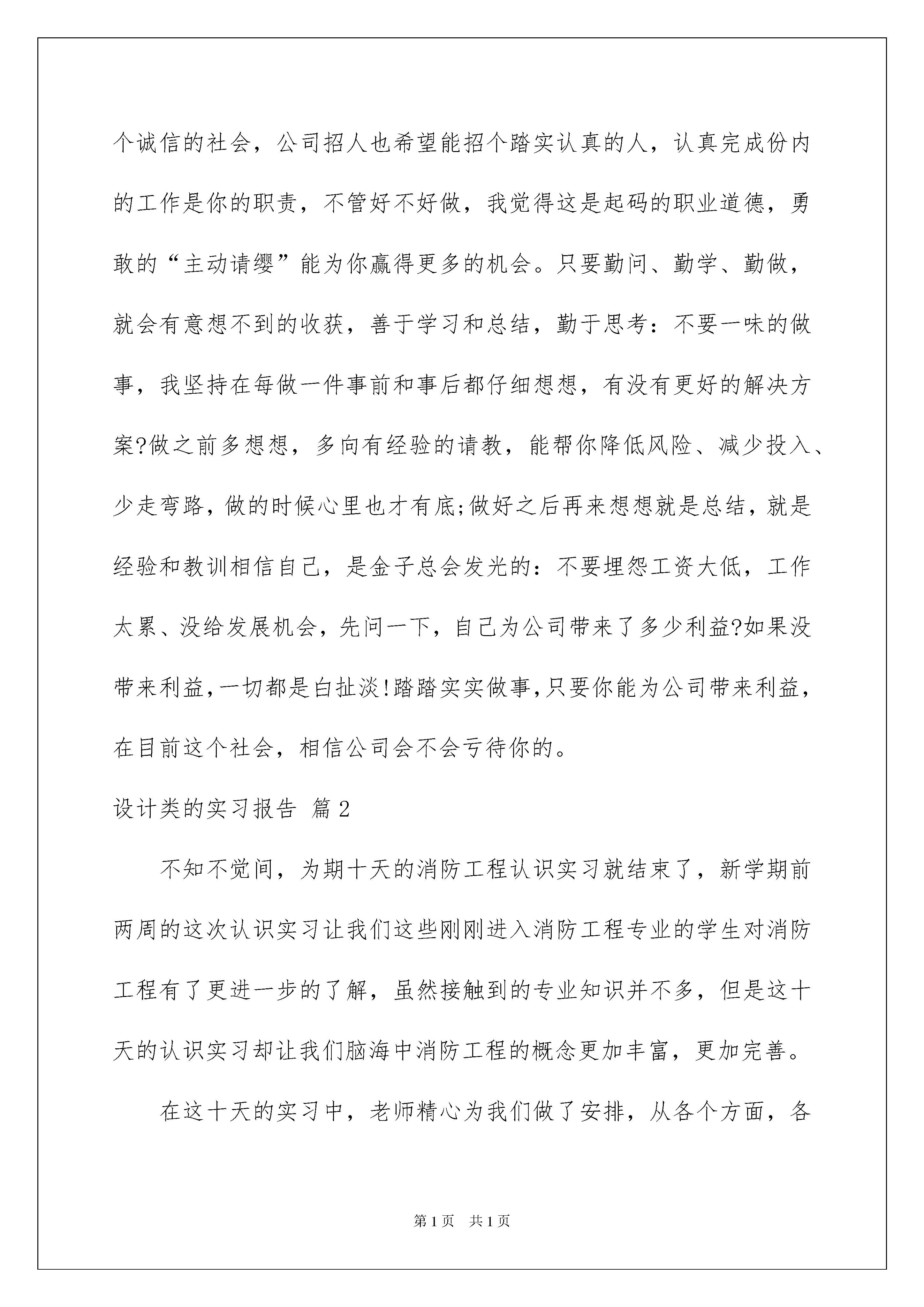 2022设计类的实习报告模板5篇设计类的实习报告在学习、工作生活中,接触并使用报告的人越来越多,其在写作上具有一定的窍门。一听到写报告马上头昏脑涨?下面是我整理的设计类的实习报告5篇,欢迎大家借鉴与参考,希望对大家有所帮助。设计类的实习报告篇1一、实习目的1、了解室内装潢设计在金华的市场现状及前景。2、进一步掌握ps,3dmax,cad等设计软件的运用。3、尝试把学校里学习的环境艺术设计相关理论运用到实习过程中。4、初探做好室内设计师的方法,熟悉室内设计的方法和程序步骤。5、培养人际交往与社交能力,为成为室内设计师作准备。二、实习单位综合概述金华市东晨装饰工程有限公司,原晨帆设计工作室,公司成立以来,一直奉行:“坚持创新超越的工作理念”以独特的经营理念正稳步有序的发展。三、实习内容及进度首先需要了解室内设计的程序步骤:1、设计准备阶段设计准备阶段主要是接受委托任务书,签订合同,或者根据标书要求参加投标;明确设计期限并制定设计计划进度安排,考虑各有关工种的配合与协调;明确设计任务和要求,如室内设计任务的使用性质、功能特点、设计规模、等级标准、总造价,根据任务的使用性质所需创造的室内环境氛围、文化内涵或艺术风格等;熟悉设计有关的规范和定额标准,收集分析必要的资料和信息,包括对现场的调查踏勘以及对同类型实例的参观等。在签订合同或制定投标文件时,还包括设计进度安排,设计费率标准,即室内设计收取业主设计费占室内装饰总投入资金的百分比。2、方案设计阶段方案设计阶段是在设计准备阶段的基础上,进一步收集、分析、运用与设计任务有关的资料与信息,构思立意,进行初步方案设计,深入设计,进行方案的分析与比较。确定初步设计方案,提供设计文件。室内初步方案的文件通常包括:平面图,常用比例1:50,1:100;室内立面展开图,常用比例1:20,1:50;平顶图或仰视图,常用比例1:50,1:100;室内透视图室内装饰材料实样版面;设计意图说明和造价概算;初步设计方案需经审定后,方可进行施工图设计。3、施工图设计阶段施工图设计阶段需要补充施工所必要的有关平面布置、室内立面和平顶等图纸,还需包括构造节点详细、细部大样图以及设备管线图,编制施工说明和造价预算。4、设计实施阶段设计实施阶段也即是工程的施工阶段。室内工程在施工前,设计人员应向施工单位进行设计意图说明及图纸的技术交底;工程施工期间需按图纸要求核对施工实况,有时还需根据现场实况提出对图纸的局部修改或补充;施工结束时,会同质检部门和建设单位进行工程验收。其次了解室内设计方法,赵师傅给我讲解了以下三种:1、大处着眼、细处着手,总体与细部深入推敲2、从里到外、从外到里,局部与整体协调统一3、意在笔先或笔意同步,立意与表达并重经过仔细推敲和在工作中的实际运用,我发现上面三条确实很实用,跟那些经验丰富的设计师交流有听君一席话胜读十年书的感觉。再次是掌握了一些设计软件小技巧,提高了软件运用的熟练程度。例如:巧变二维背景为三维场景、时光隧道的制作等。四,实习总结在过个十天的样子我暑假的实习就要结束了,想想这一个暑假,虽然倒贴了一个暑假,但是我觉得,比我在学校一年学的还多。刚进入大学,我认为的设计师只要会画图,什么事都好了,现在我知道了并不是我的想当然,设计师要知道的不只是画图,辛辛苦苦的一个暑假,让我了解了很多专业的东西...一心想从事室内的我觉得好用压力,而我的不专业性,也就可能被市场所淘汰,压力,随之而来...考学前的迷茫,现在的压力,让我十分不安。经过一点时间的学习,我深刻体会到了做人做事要踏实,工作积极主动,切记浮躁:现在社会是一个诚信的社会,公司招人也希望能招个踏实认真的人,认真完成份内的工作是你的职责,不管好不好做,我觉得这是起码的职业道德,勇敢的“主动请缨”能为你赢得更多的机会。只要勤问、勤学、勤做,就会有意想不到的收获,善于学习和总结,勤于思考:不要一味的做事,我坚持在每做一件事前和事后都仔细想想,有没有更好的解决方案?做之前多想想,多向有经验的请教,能帮你降低风险、减少投入、少走弯路,做的时候心里也才有底;做好之后再来想想就是总结,就是经验和教训相信自己,是金子总会发光的:不要埋怨工资大低,工作太累、没给发展机会,先问一下,自己为公司带来了多少利益?如果没带来利益,一切都是白扯淡!踏踏实实做事,只要你能为公司带来利益,在目前这个社会,相信公司会不会亏待你的。设计类的实习报告篇2不知不觉间,为期十天的消防工程认识实习就结束了,新学期前两周的这次认识实习让我们这些刚刚进入消防工程专业的学生对消防工程有了更进一步的了解,虽然接触到的专业知识并不多,但