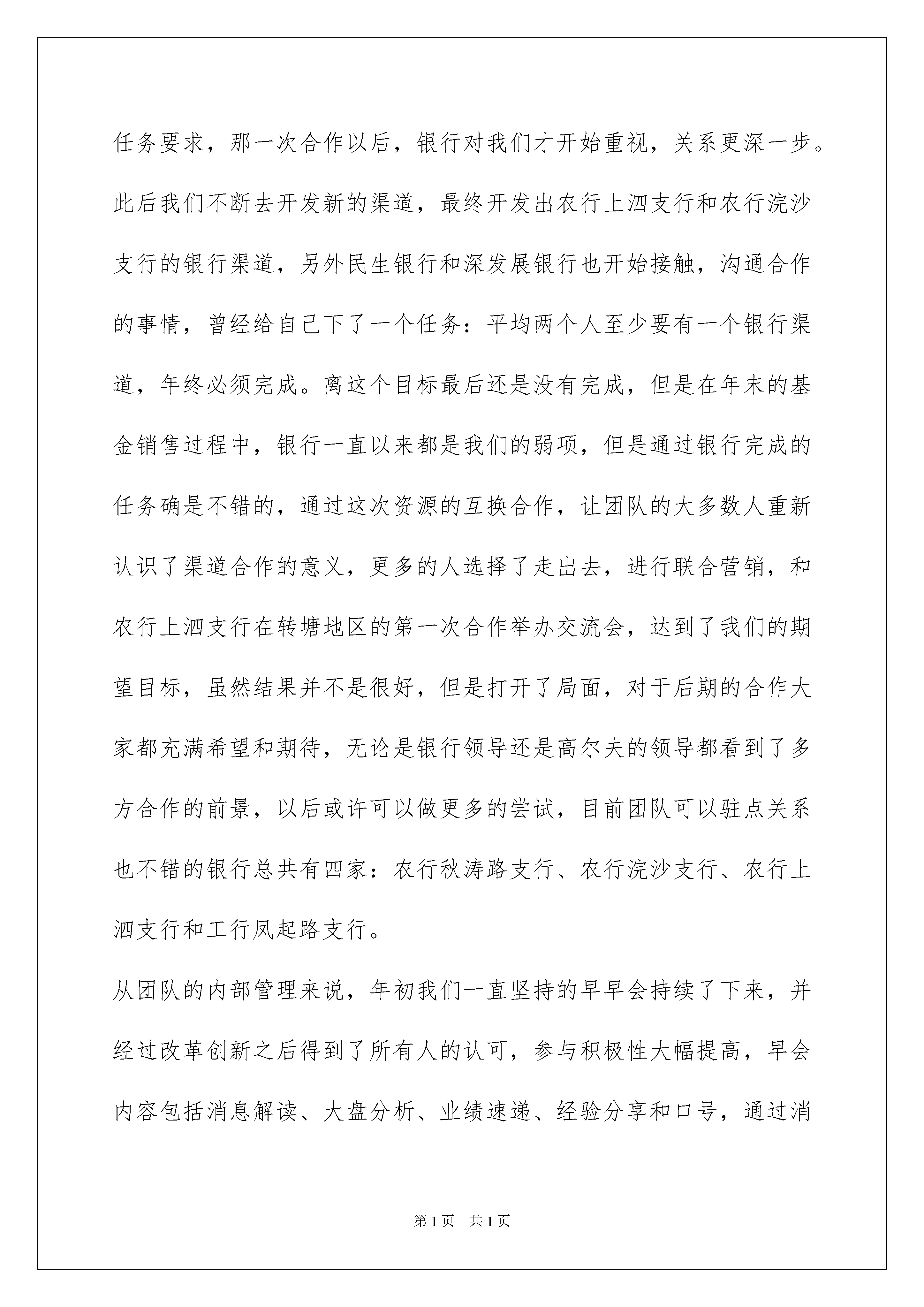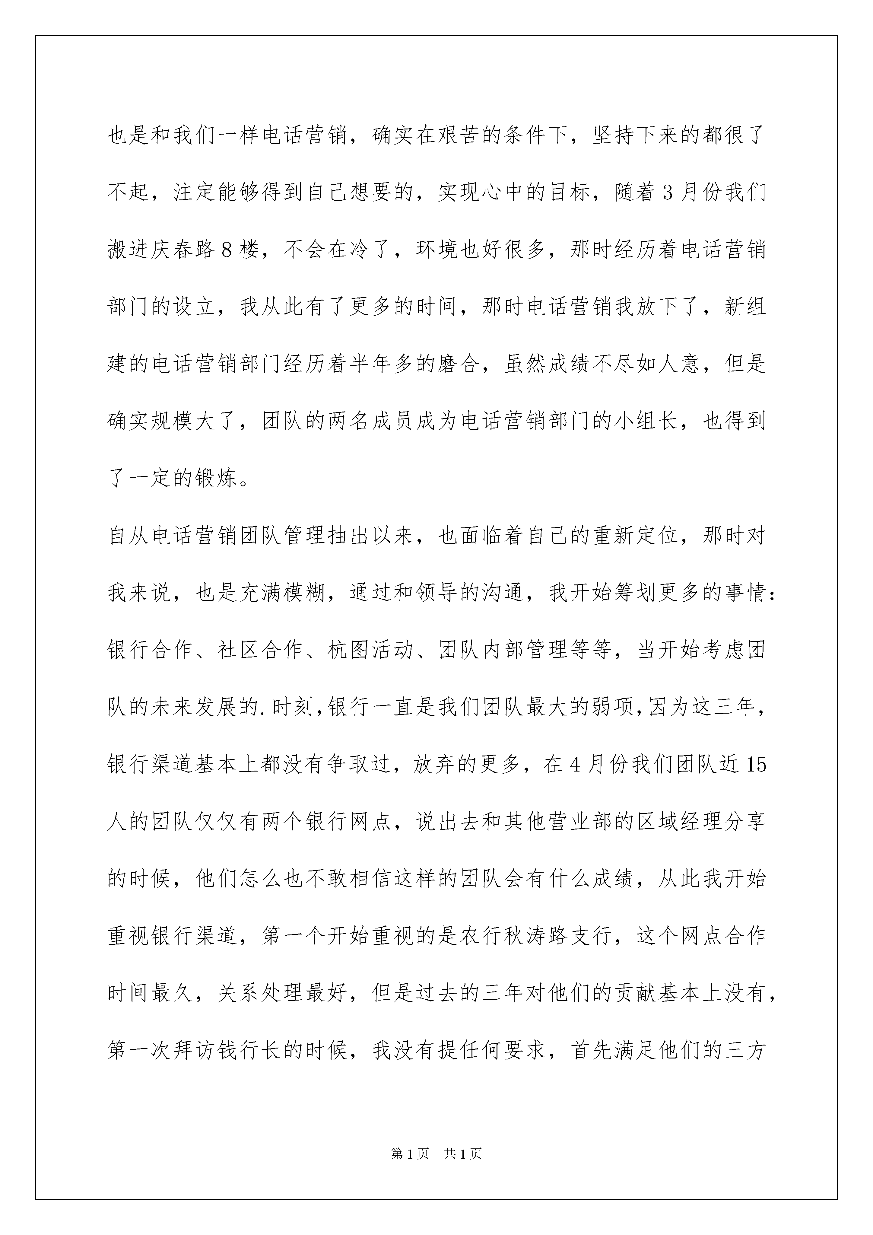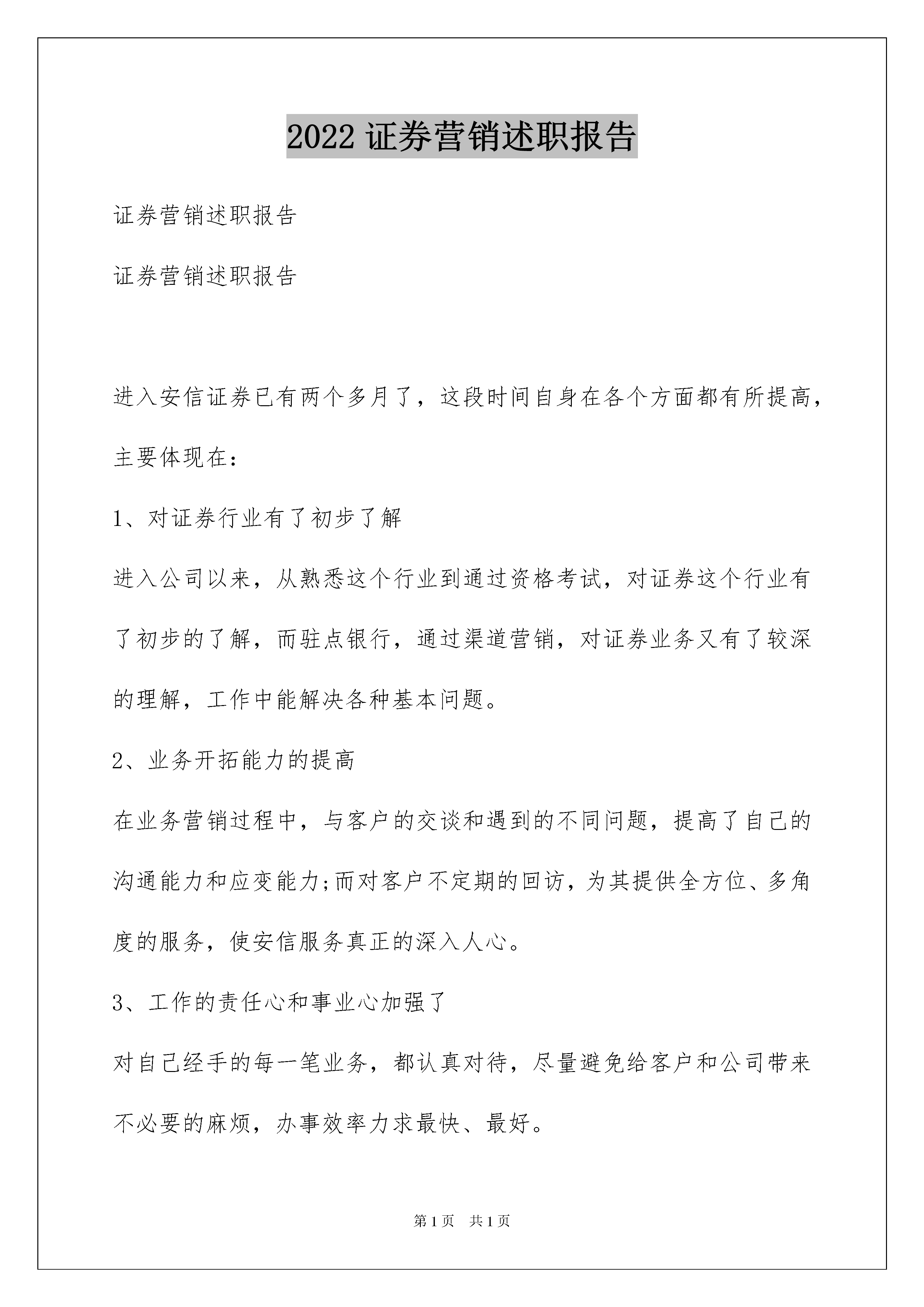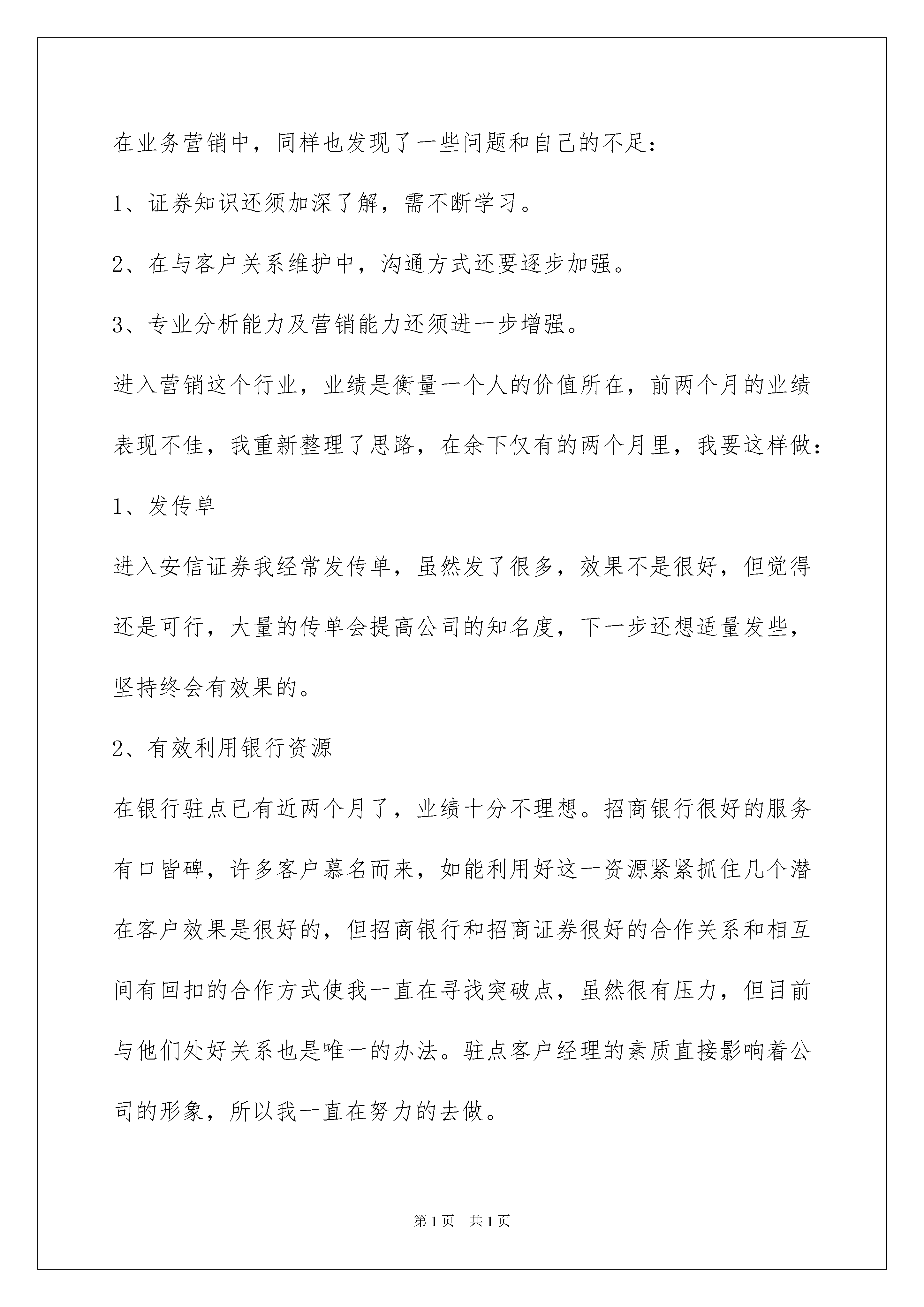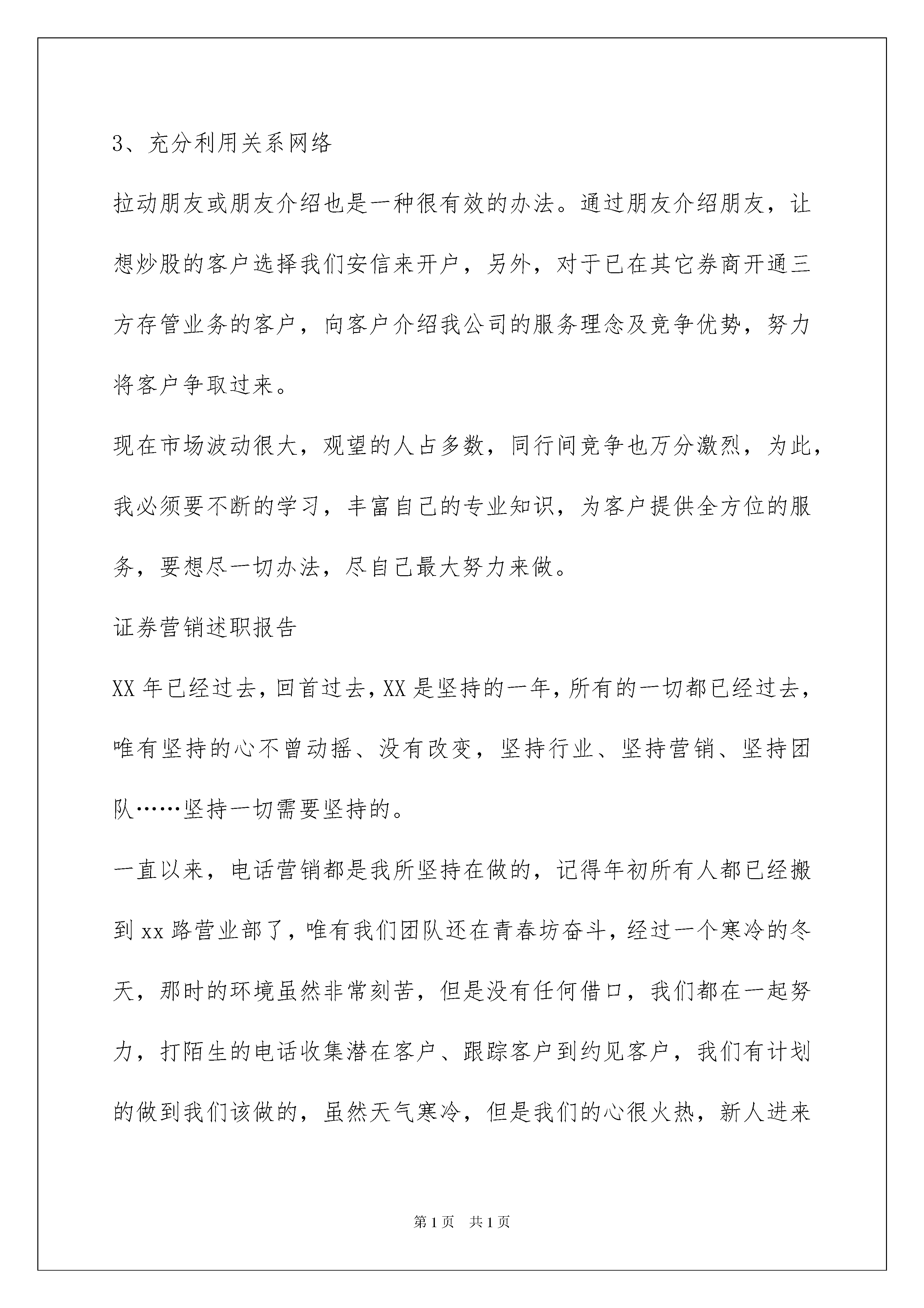 2022证券营销述职报告证券营销述职报告证券营销述职报告进入安信证券已有两个多月了,这段时间自身在各个方面都有所提高,主要体现在:1、对证券行业有了初步了解进入公司以来,从熟悉这个行业到通过资格考试,对证券这个行业有了初步的了解,而驻点银行,通过渠道营销,对证券业务又有了较深的理解,工作中能解决各种基本问题。2、业务开拓能力的提高在业务营销过程中,与客户的交谈和遇到的不同问题,提高了自己的沟通能力和应变能力;而对客户不定期的回访,为其提供全方位、多角度的服务,使安信服务真正的深入人心。3、工作的责任心和事业心加强了对自己经手的每一笔业务,都认真对待,尽量避免给客户和公司带来不必要的麻烦,办事效率力求最快、最好。在业务营销中,同样也发现了一些问题和自己的不足:1、证券知识还须加深了解,需不断学习。2、在与客户关系维护中,沟通方式还要逐步加强。3、专业分析能力及营销能力还须进一步增强。进入营销这个行业,业绩是衡量一个人的价值所在,前两个月的业绩表现不佳,我重新整理了思路,在余下仅有的两个月里,我要这样做:1、发传单进入安信证券我经常发传单,虽然发了很多,效果不是很好,但觉得还是可行,大量的传单会提高公司的知名度,下一步还想适量发些,坚持终会有效果的。2、有效利用银行资源在银行驻点已有近两个月了,业绩十分不理想。招商银行很好的服务有口皆碑,许多客户慕名而来,如能利用好这一资源紧紧抓住几个潜在客户效果是很好的,但招商银行和招商证券很好的合作关系和相互间有回扣的合作方式使我一直在寻找突破点,虽然很有压力,但目前与他们处好关系也是唯一的办法。驻点客户经理的素质直接影响着公司的形象,所以我一直在努力的去做。3、充分利用关系网络拉动朋友或朋友介绍也是一种很有效的办法。通过朋友介绍朋友,让想炒股的客户选择我们安信来开户,另外,对于已在其它券商开通三方存管业务的客户,向客户介绍我公司的服务理念及竞争优势,努力将客户争取过来。现在市场波动很大,观望的人占多数,同行间竞争也万分激烈,为此,我必须要不断的学习,丰富自己的专业知识,为客户提供全方位的服务,要想尽一切办法,尽自己最大努力来做。证券营销述职报告XX年已经过去,回首过去,XX是坚持的一年,所有的一切都已经过去,唯有坚持的心不曾动摇、没有改变,坚持行业、坚持营销、坚持团队……坚持一切需要坚持的。一直以来,电话营销都是我所坚持在做的,记得年初所有人都已经搬到xx路营业部了,唯有我们团队还在青春坊奋斗,经过一个寒冷的冬天,那时的环境虽然非常刻苦,但是没有任何借口,我们都在一起努力,打陌生的电话收集潜在客户、跟踪客户到约见客户,我们有计划的做到我们该做的,虽然天气寒冷,但是我们的心很火热,新人进来也是和我们一样电话营销,确实在艰苦的条件下,坚持下来的都很了不起,注定能够得到自己想要的,实现心中的目标,随着3月份我们搬进庆春路8楼,不会在冷了,环境也好很多,那时经历着电话营销部门的设立,我从此有了更多的时间,那时电话营销我放下了,新组建的电话营销部门经历着半年多的磨合,虽然成绩不尽如人意,但是确实规模大了,团队的两名成员成为电话营销部门的小组长,也得到了一定的锻炼。自从电话营销团队管理抽出以来,也面临着自己的重新定位,那时对我来说,也是充满模糊,通过和领导的沟通,我开始筹划更多的事情:银行合作、社区合作、杭图活动、团队内部管理等等,当开始考虑团队的未来发展的.时刻,银行一直是我们团队最大的弱项,因为这三年,银行渠道基本上都没有争取过,放弃的更多,在4月份我们团队近15人的团队仅仅有两个银行网点,说出去和其他营业部的区域经理分享的时候,他们怎么也不敢相信这样的团队会有什么成绩,从此我开始重视银行渠道,第一个开始重视的是农行秋涛路支行,这个网点合作时间最久,关系处理最好,但是过去的三年对他们的贡献基本上没有,第一次拜访钱行长的时候,我没有提任何要求,首先满足他们的三方任务要求,那一次合作以后,银行对我们才开始重视,关系更深一步。此后我们不断去开发新的渠道,最终开发出农行上泗支行和农行浣沙支行的银行渠道,另外民生银行和深发展银行也开始接触,沟通合作的事情,曾经给自己下了一个任务:平均两个人至少要有一个银行渠道,年终必须完成。离这个目标最后还是没有完成,但是在年末的基金销售过程中,银行一直以来都是我们的弱项,但是通过银行完成的任务确是不错的,通过这次资源的互换合作,让团队的大多数人重新认识了渠道合作的意义,更多的人选择了走出去,进行联合营销,和农行上泗支行在转塘地区的第一次合作举办交流会,达到了我们的期望目标,虽然结果并不是很好,但是打开了局面,对于后期的