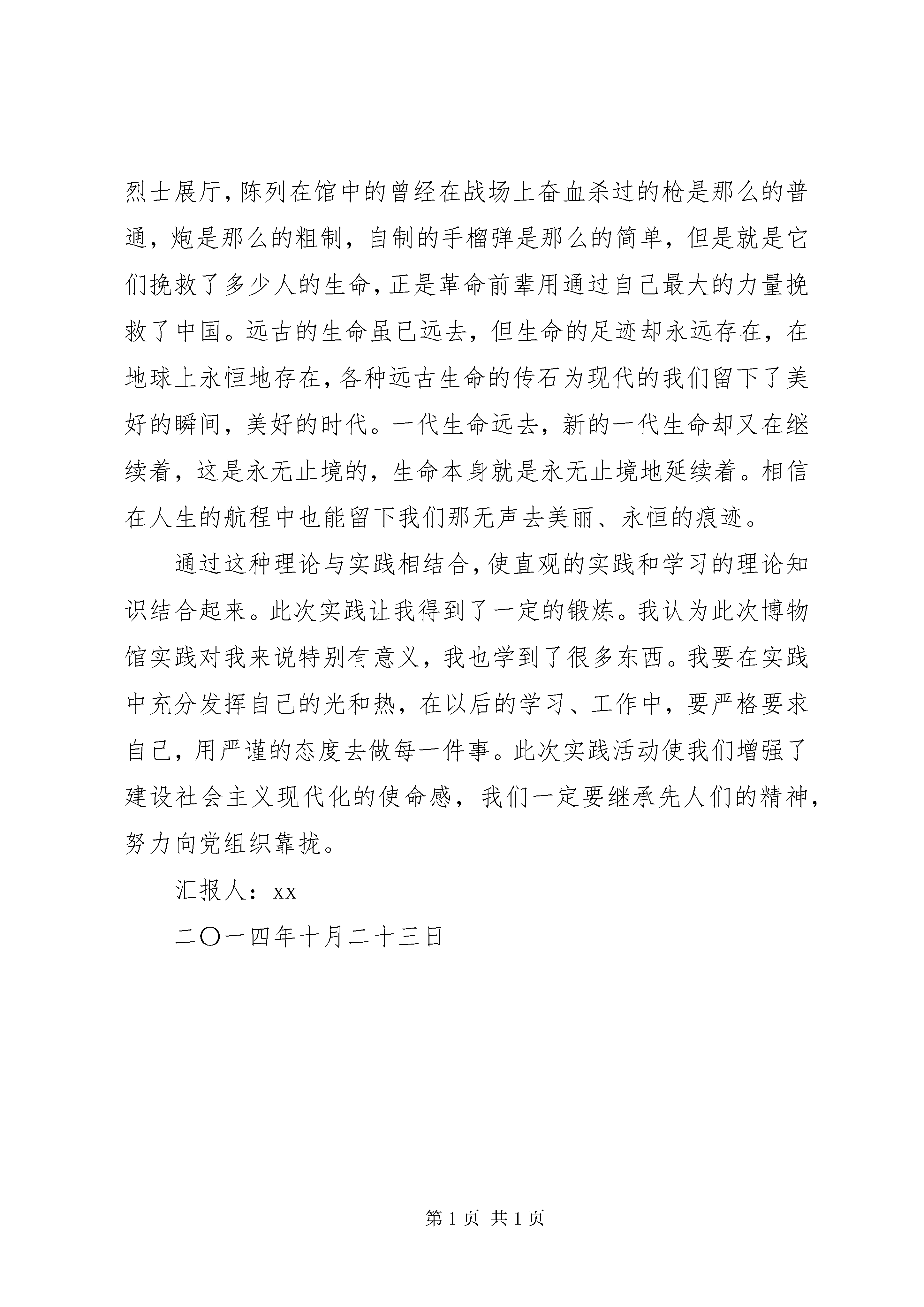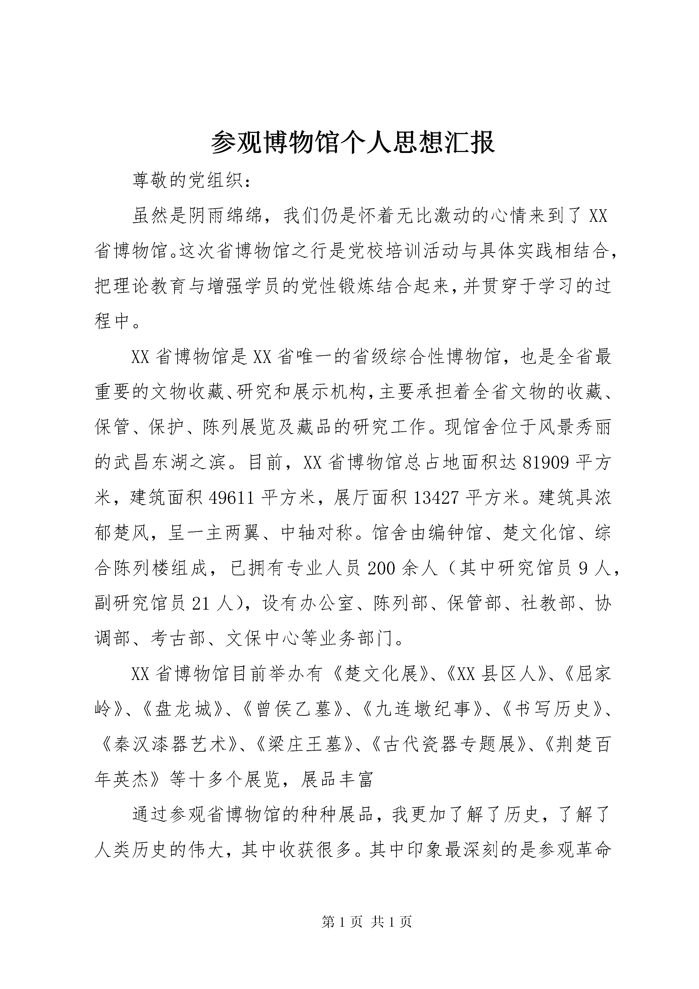 参观博物馆个人思想汇报尊敬的党组织:虽然是阴雨绵绵,我们仍是怀着无比激动的心情来到了XX省博物馆。这次省博物馆之行是党校培训活动与具体实践相结合,把理论教育与增强学员的党性锻炼结合起来,并贯穿于学习的过程中。XX省博物馆是XX省唯一的省级综合性博物馆,也是全省最重要的文物收藏、研究和展示机构,主要承担着全省文物的收藏、保管、保护、陈列展览及藏品的研究工作。现馆舍位于风景秀丽的武昌东湖之滨。目前,XX省博物馆总占地面积达81909平方米,建筑面积49611平方米,展厅面积13427平方米。建筑具浓郁楚风,呈一主两翼、中轴对称。馆舍由编钟馆、楚文化馆、综合陈列楼组成,已拥有专业人员200余人(其中研究馆员9人,副研究馆员21人),设有办公室、陈列部、保管部、社教部、协调部、考古部、文保中心等业务部门。XX省博物馆目前举办有《楚文化展》、《XX县区人》、《屈家岭》、《盘龙城》、《曾侯乙墓》、《九连墩纪事》、《书写历史》、《秦汉漆器艺术》、《梁庄王墓》、《古代瓷器专题展》、《荆楚百年英杰》等十多个展览,展品丰富通过参观省博物馆的种种展品,我更加了解了历史,了解了人类历史的伟大,其中收获很多。其中印象最深刻的是参观革命烈士展厅,陈列在馆中的曾经在战场上奋血杀过的枪是那么的普通,炮是那么的粗制,自制的手榴弹是那么的简单,但是就是它们挽救了多少人的生命,正是革命前辈用通过自己最大的力量挽救了中国。远古的生命虽已远去,但生命的足迹却永远存在,在地球上永恒地存在,各种远古生命的传石为现代的我们留下了美好的瞬间,美好的时代。一代生命远去,新的一代生命却又在继续着,这是永无止境的,生命本身就是永无止境地延续着。相信在人生的航程中也能留下我们那无声去美丽、永恒的痕迹。通过这种理论与实践相结合,使直观的实践和学习的理论知识结合起来。此次实践让我得到了一定的锻炼。我认为此次博物馆实践对我来说特别有意义,我也学到了很多东西。我要在实践中充分发挥自己的光和热,在以后的学习、工作中,要严格要求自己,用严谨的态度去做每一件事。此次实践活动使我们增强了建设社会主义现代化的使命感,我们一定要继承先人们的精神,努力向党组织靠拢。汇报人:xx二〇一四年十月二十三日