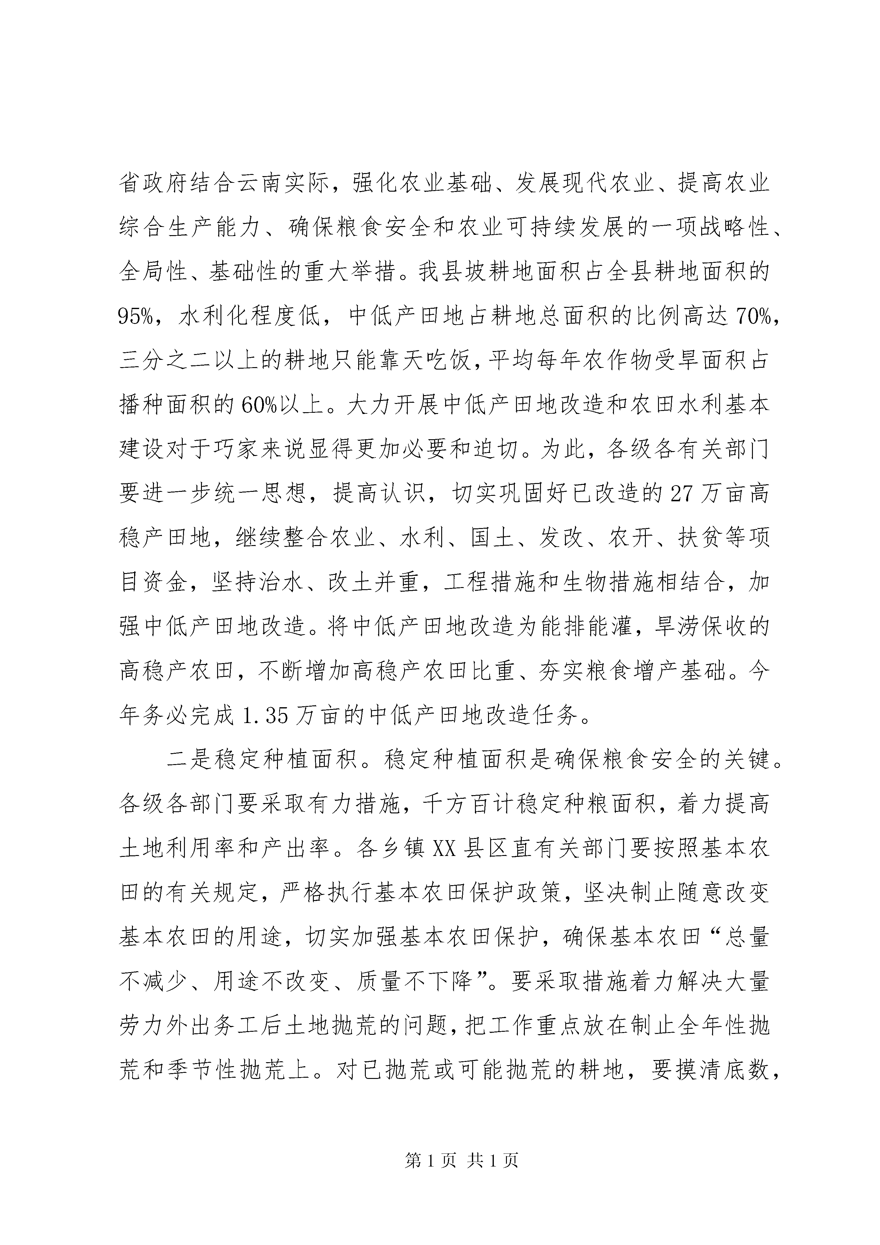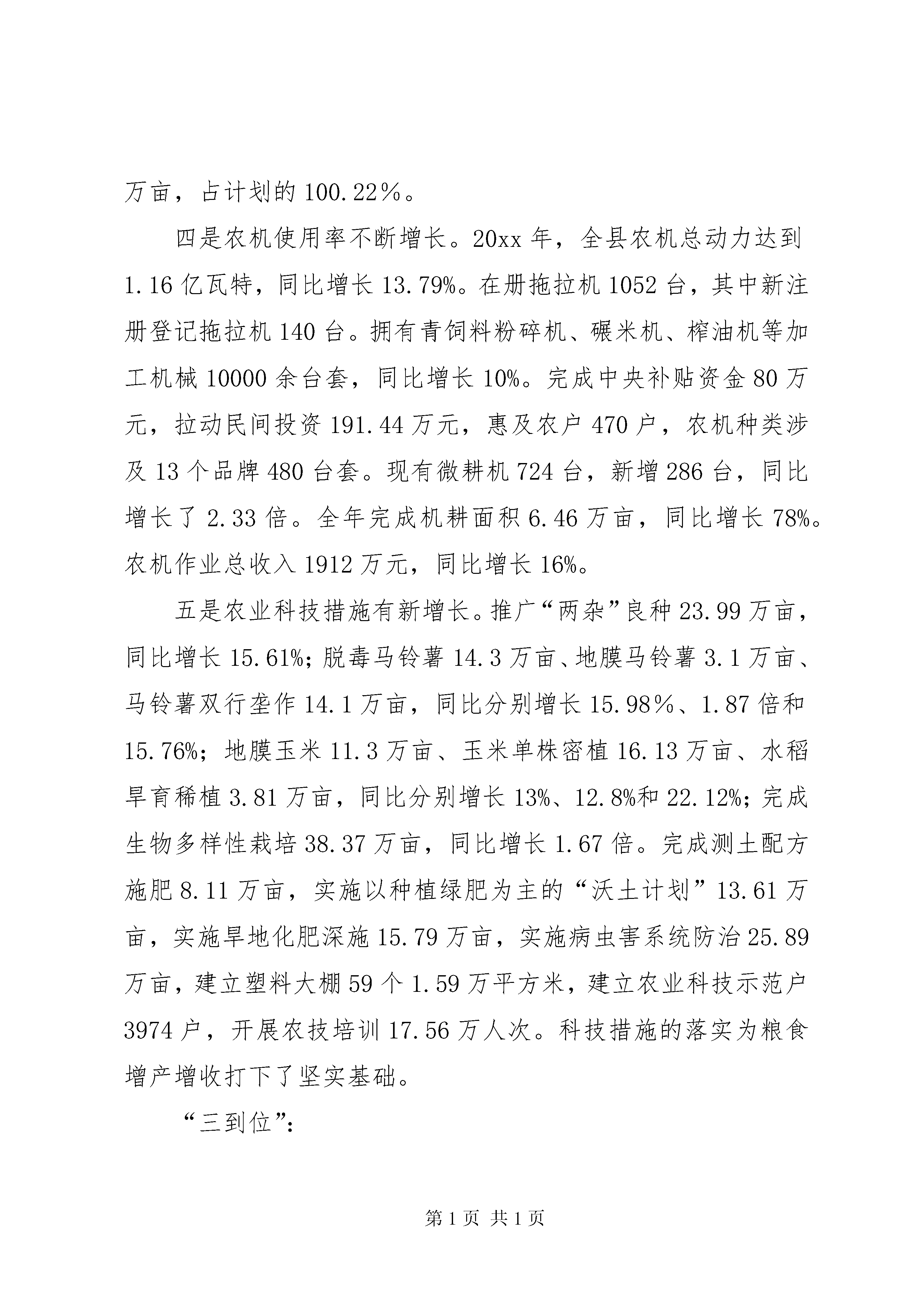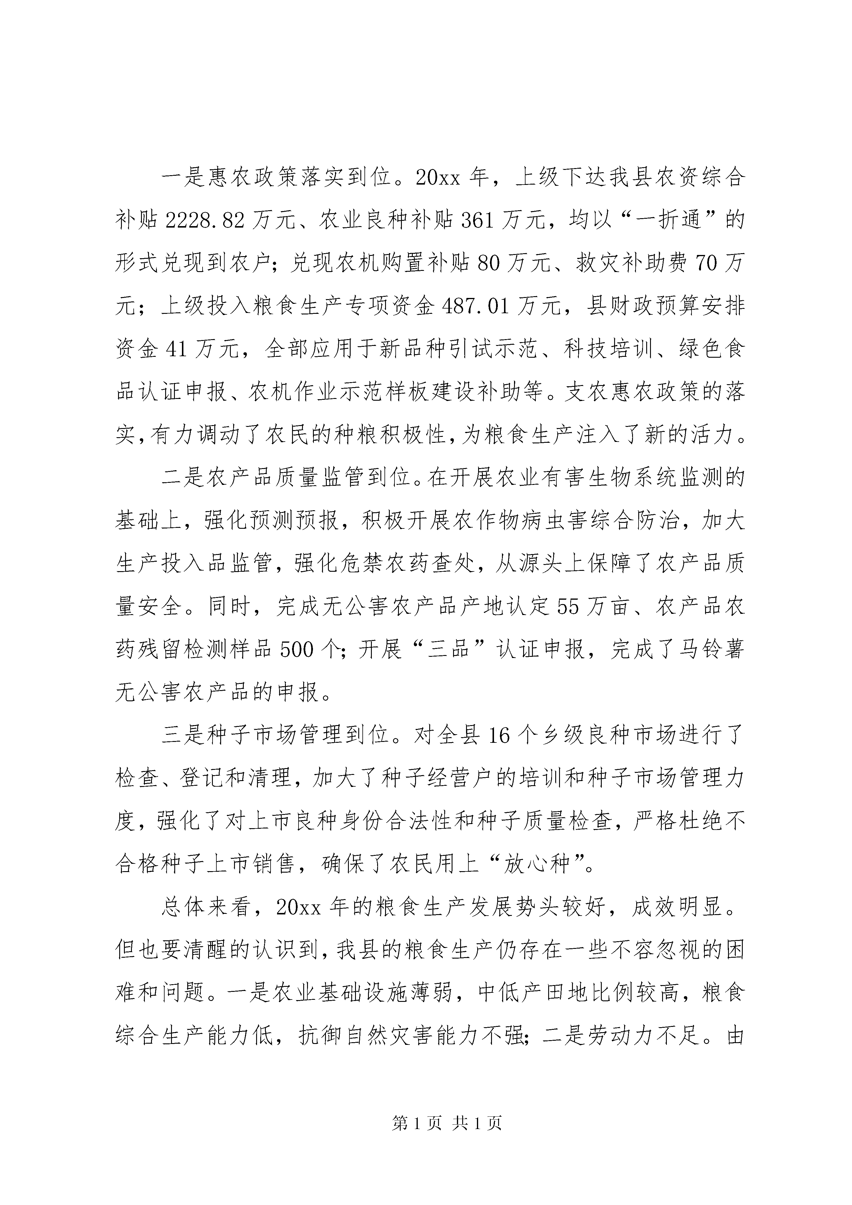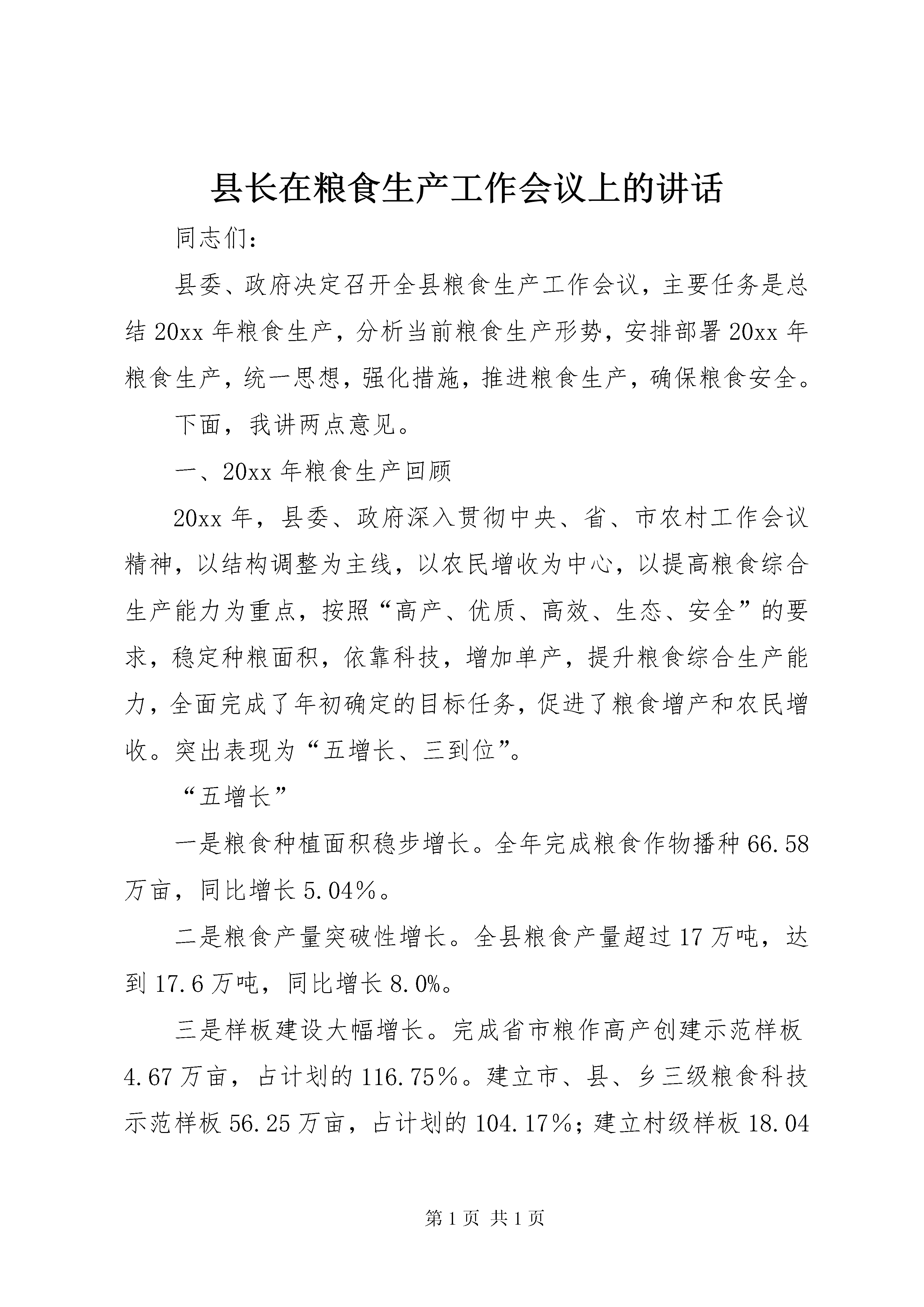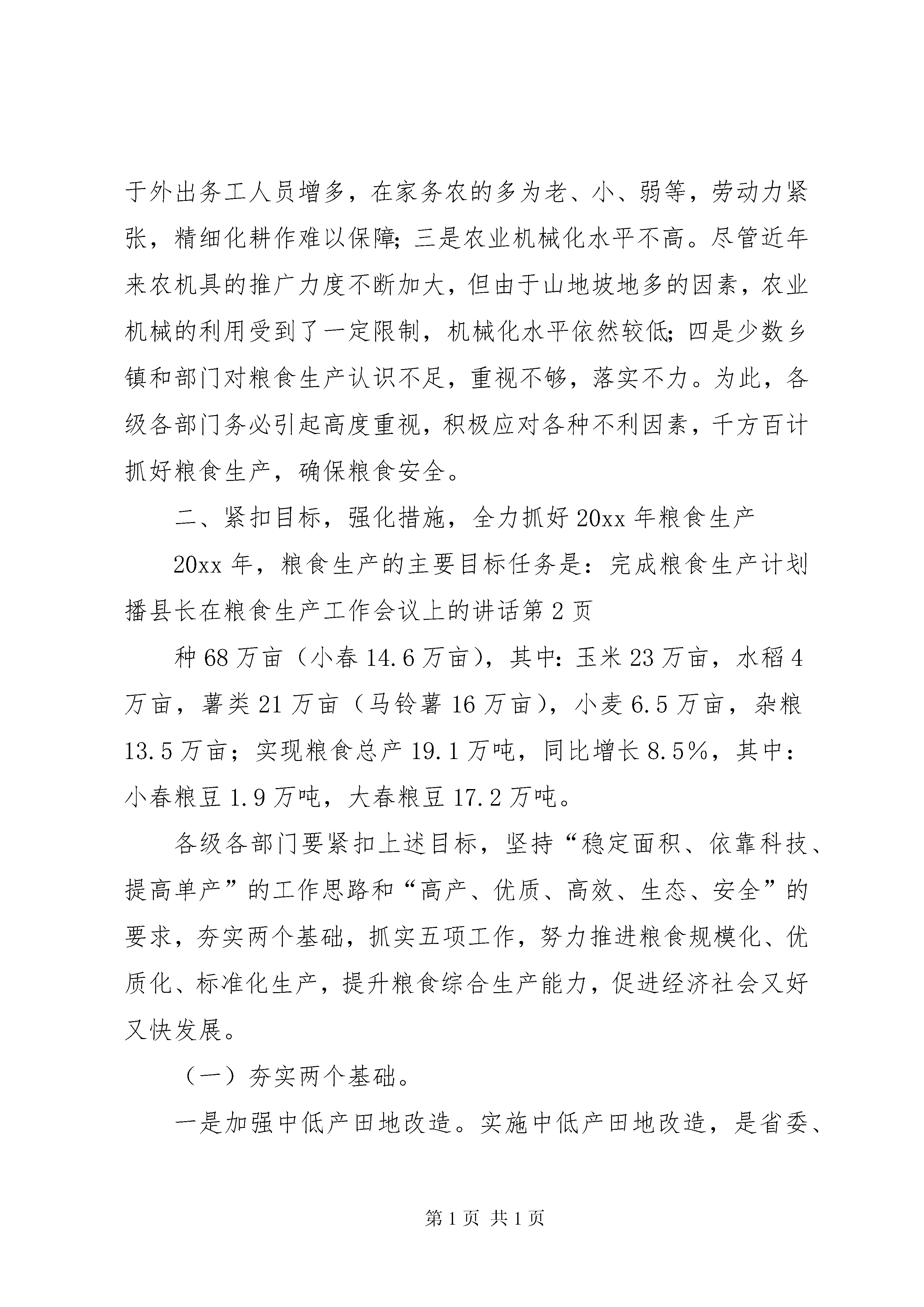 县长在粮食生产工作会议上的讲话同志们:县委、政府决定召开全县粮食生产工作会议,主要任务是总结20xx年粮食生产,分析当前粮食生产形势,安排部署20xx年粮食生产,统一思想,强化措施,推进粮食生产,确保粮食安全。下面,我讲两点意见。一、20xx年粮食生产回顾20xx年,县委、政府深入贯彻中央、省、市农村工作会议精神,以结构调整为主线,以农民增收为中心,以提高粮食综合生产能力为重点,按照“高产、优质、高效、生态、安全”的要求,稳定种粮面积,依靠科技,增加单产,提升粮食综合生产能力,全面完成了年初确定的目标任务,促进了粮食增产和农民增收。突出表现为“五增长、三到位”。“五增长”一是粮食种植面积稳步增长。全年完成粮食作物播种66.58万亩,同比增长5.04%。二是粮食产量突破性增长。全县粮食产量超过17万吨,达到17.6万吨,同比增长8.0%。三是样板建设大幅增长。完成省市粮作高产创建示范样板4.67万亩,占计划的116.75%。建立市、县、乡三级粮食科技示范样板56.25万亩,占计划的104.17%;建立村级样板18.04万亩,占计划的100.22%。四是农机使用率不断增长。20xx年,全县农机总动力达到1.16亿瓦特,同比增长13.79%。在册拖拉机1052台,其中新注册登记拖拉机140台。拥有青饲料粉碎机、碾米机、榨油机等加工机械10000余台套,同比增长10%。完成中央补贴资金80万元,拉动民间投资191.44万元,惠及农户470户,农机种类涉及13个品牌480台套。现有微耕机724台,新增286台,同比增长了2.33倍。全年完成机耕面积6.46万亩,同比增长78%。农机作业总收入1912万元,同比增长16%。五是农业科技措施有新增长。推广“两杂”良种23.99万亩,同比增长15.61%;脱毒马铃薯14.3万亩、地膜马铃薯3.1万亩、马铃薯双行垄作14.1万亩,同比分别增长15.98%、1.87倍和15.76%;地膜玉米11.3万亩、玉米单株密植16.13万亩、水稻旱育稀植3.81万亩,同比分别增长13%、12.8%和22.12%;完成生物多样性栽培38.37万亩,同比增长1.67倍。完成测土配方施肥8.11万亩,实施以种植绿肥为主的“沃土计划”13.61万亩,实施旱地化肥深施15.79万亩,实施病虫害系统防治25.89万亩,建立塑料大棚59个1.59万平方米,建立农业科技示范户3974户,开展农技培训17.56万人次。科技措施的落实为粮食增产增收打下了坚实基础。“三到位”:一是惠农政策落实到位。20xx年,上级下达我县农资综合补贴2228.82万元、农业良种补贴361万元,均以“一折通”的形式兑现到农户;兑现农机购置补贴80万元、救灾补助费70万元;上级投入粮食生产专项资金487.01万元,县财政预算安排资金41万元,全部应用于新品种引试示范、科技培训、绿色食品认证申报、农机作业示范样板建设补助等。支农惠农政策的落实,有力调动了农民的种粮积极性,为粮食生产注入了新的活力。二是农产品质量监管到位。在开展农业有害生物系统监测的基础上,强化预测预报,积极开展农作物病虫害综合防治,加大生产投入品监管,强化危禁农药查处,从源头上保障了农产品质量安全。同时,完成无公害农产品产地认定55万亩、农产品农药残留检测样品500个;开展“三品”认证申报,完成了马铃薯无公害农产品的申报。三是种子市场管理到位。对全县16个乡级良种市场进行了检查、登记和清理,加大了种子经营户的培训和种子市场管理力度,强化了对上市良种身份合法性和种子质量检查,严格杜绝不合格种子上市销售,确保了农民用上“放心种”。总体来看,20xx年的粮食生产发展势头较好,成效明显。但也要清醒的认识到,我县的粮食生产仍存在一些不容忽视的困难和问题。一是农业基础设施薄弱,中低产田地比例较高,粮食综合生产能力低,抗御自然灾害能力不强;二是劳动力不足。由于外出务工人员增多,在家务农的多为老、小、弱等,劳动力紧张,精细化耕作难以保障;三是农业机械化水平不高。尽管近年来农机具的推广力度不断加大,但由于山地坡地多的因素,农业机械的利用受到了一定限制,机械化水平依然较低;四是少数乡镇和部门对粮食生产认识不足,重视不够,落实不力。为此,各级各部门务必引起高度重视,积极应对各种不利因素,千方百计抓好粮食生产,确保粮食安全。二、紧扣目标,强化措施,全力抓好20xx年粮食生产20xx年,粮食生产的主要目标任务是:完成粮食生产计划播县长在粮食生产工作会议上的讲话种68万亩(小春14.6万亩),其中:玉米23万亩,水稻4万亩,薯类21万亩(马铃薯16万亩),小麦6.5万亩,杂粮13.5万亩;实现粮食总产19.1万吨,同比增长8.5%,其中:小春粮豆1.9万吨,大春粮豆17.2万吨。