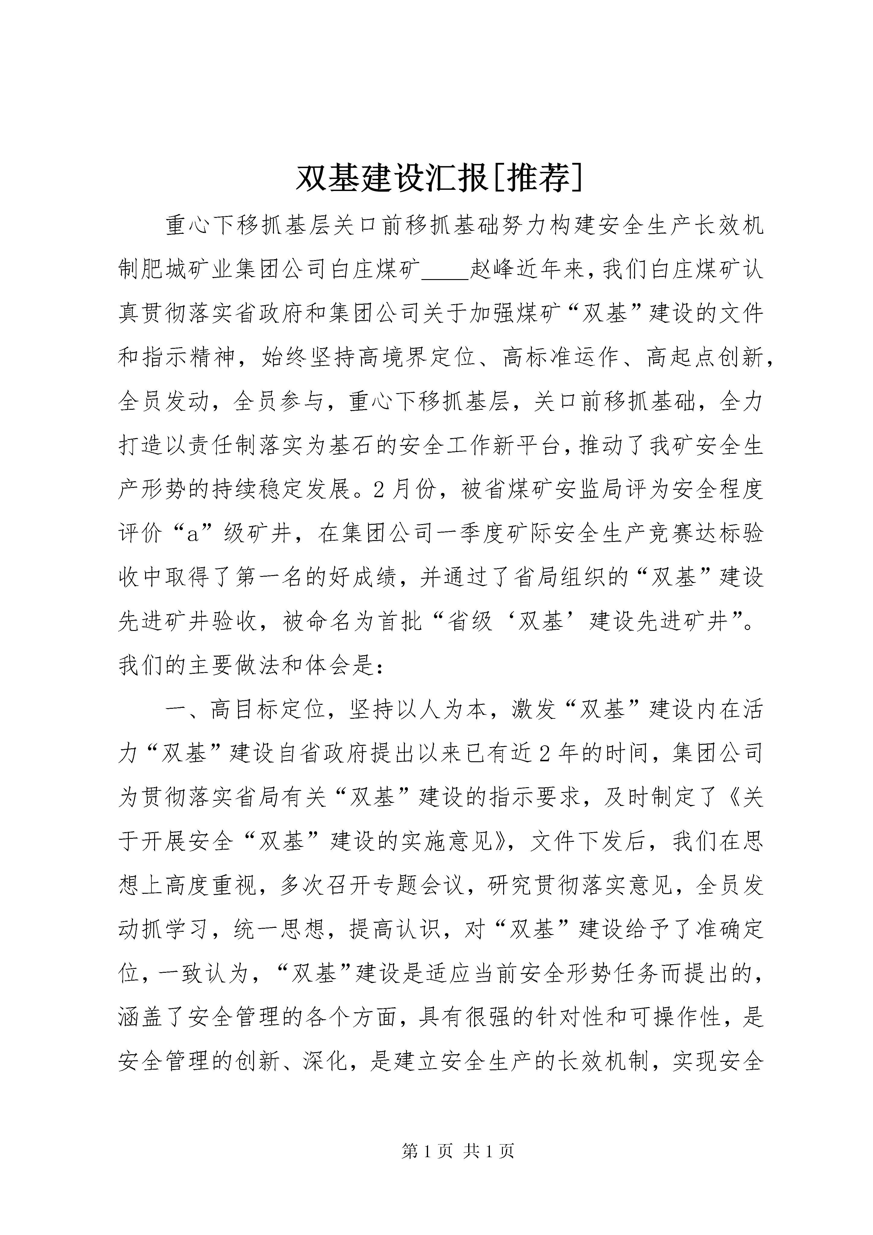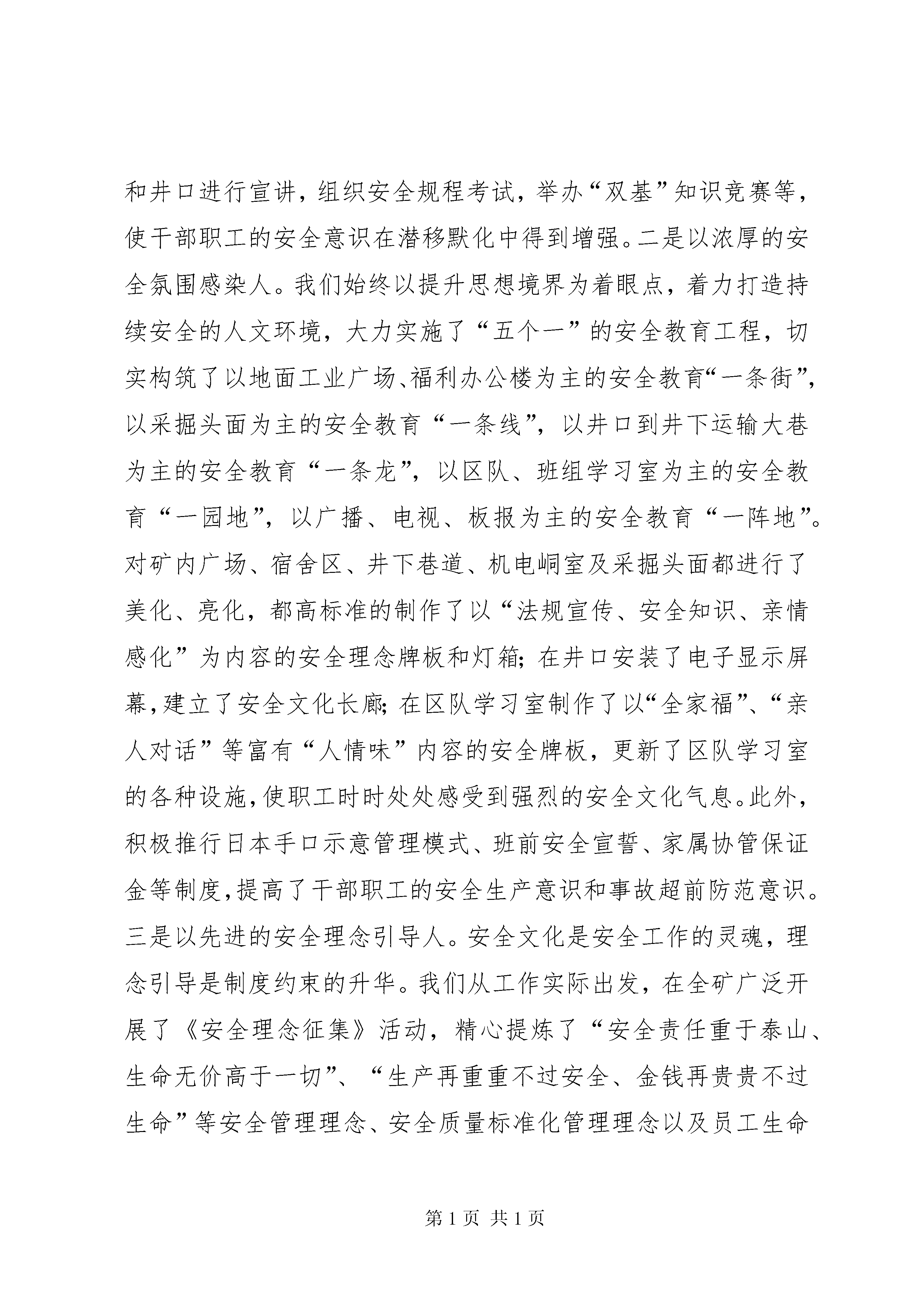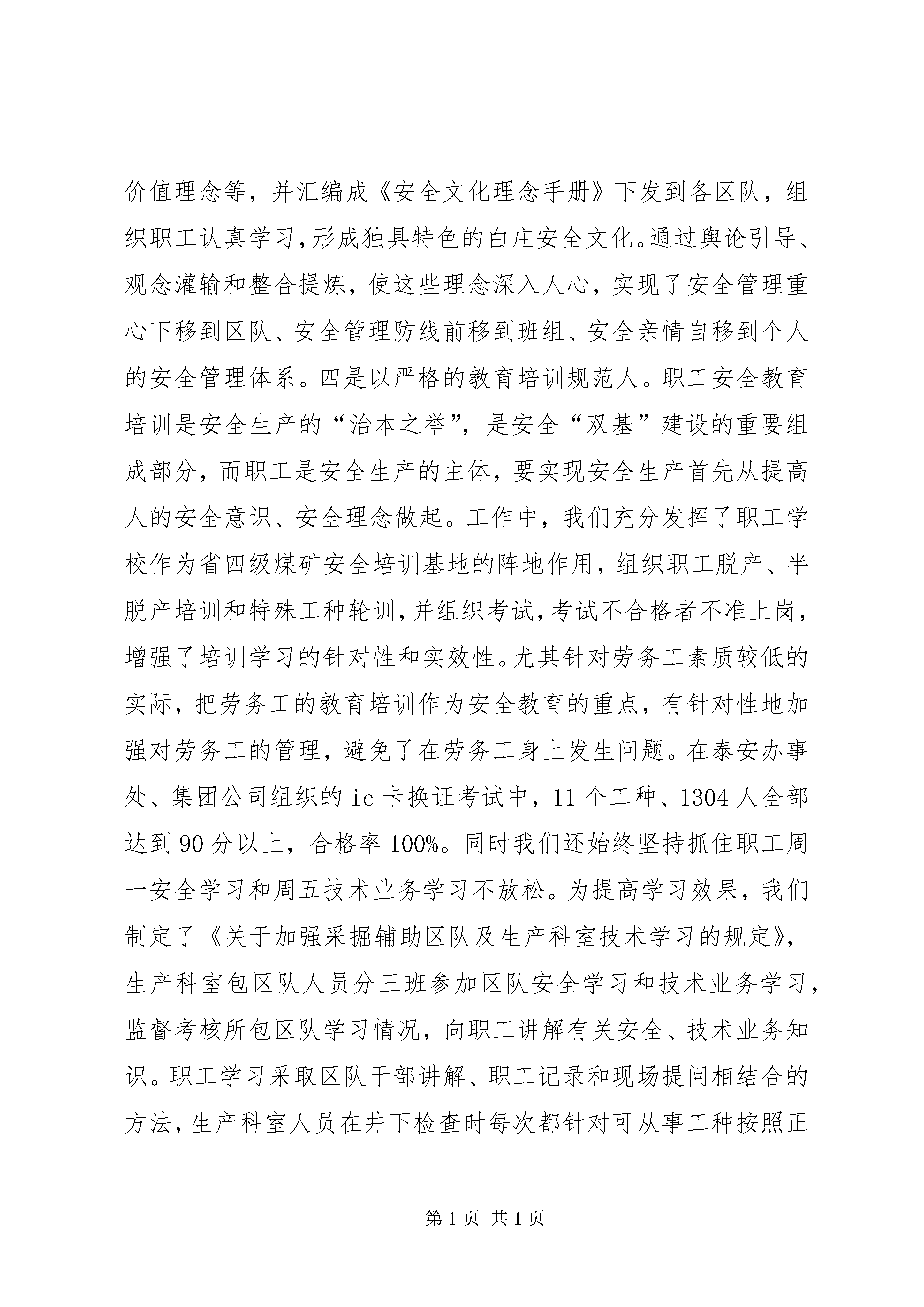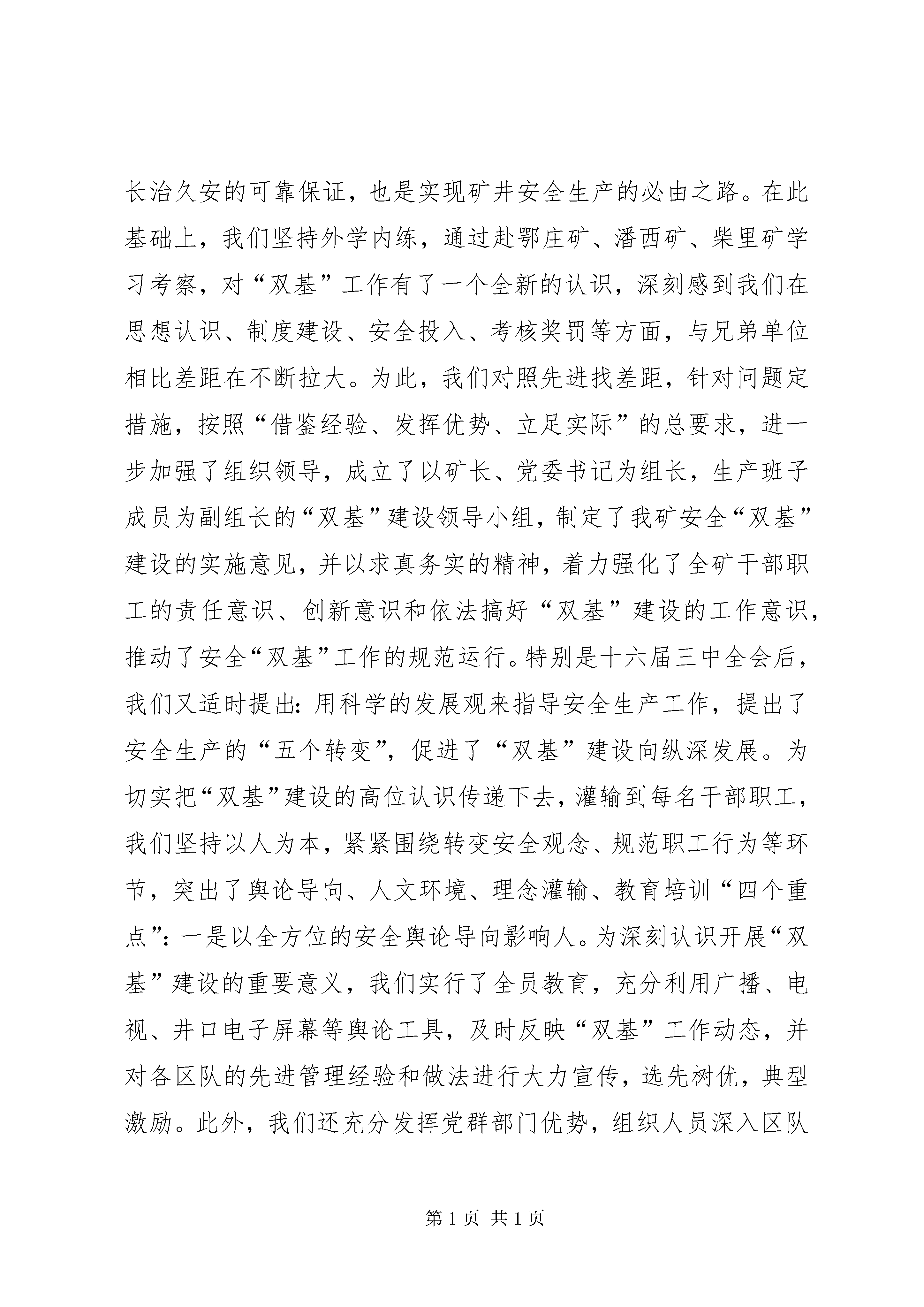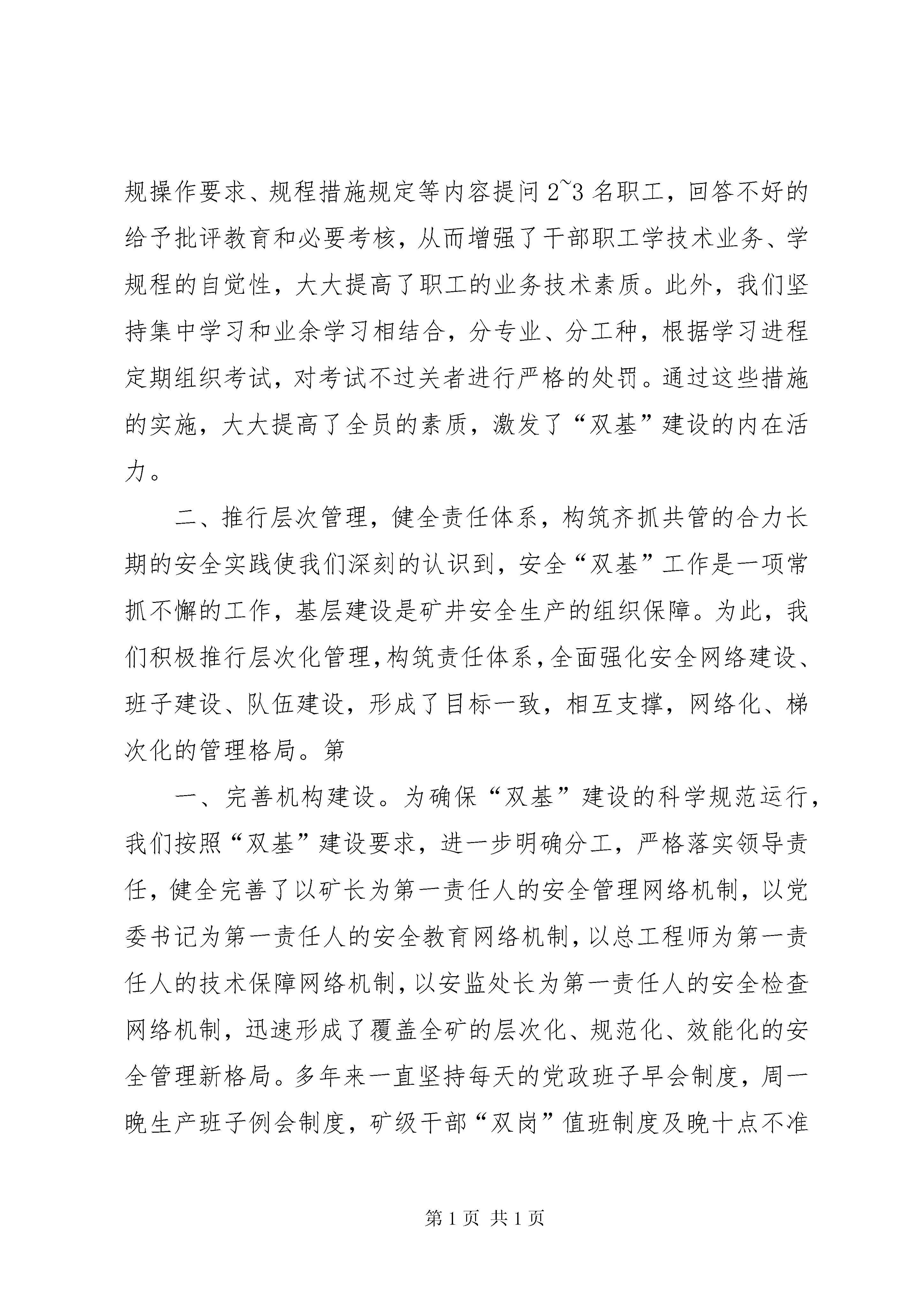 双基建设汇报[推荐]重心下移抓基层关口前移抓基础努力构建安全生产长效机制肥城矿业集团公司白庄煤矿__赵峰近年来,我们白庄煤矿认真贯彻落实省政府和集团公司关于加强煤矿“双基”建设的文件和指示精神,始终坚持高境界定位、高标准运作、高起点创新,全员发动,全员参与,重心下移抓基层,关口前移抓基础,全力打造以责任制落实为基石的安全工作新平台,推动了我矿安全生产形势的持续稳定发展。2月份,被省煤矿安监局评为安全程度评价“a”级矿井,在集团公司一季度矿际安全生产竞赛达标验收中取得了第一名的好成绩,并通过了省局组织的“双基”建设先进矿井验收,被命名为首批“省级‘双基’建设先进矿井”。我们的主要做法和体会是:一、高目标定位,坚持以人为本,激发“双基”建设内在活力“双基”建设自省政府提出以来已有近2年的时间,集团公司为贯彻落实省局有关“双基”建设的指示要求,及时制定了《关于开展安全“双基”建设的实施意见》,文件下发后,我们在思想上高度重视,多次召开专题会议,研究贯彻落实意见,全员发动抓学习,统一思想,提高认识,对“双基”建设给予了准确定位,一致认为,“双基”建设是适应当前安全形势任务而提出的,涵盖了安全管理的各个方面,具有很强的针对性和可操作性,是安全管理的创新、深化,是建立安全生产的长效机制,实现安全长治久安的可靠保证,也是实现矿井安全生产的必由之路。在此基础上,我们坚持外学内练,通过赴鄂庄矿、潘西矿、柴里矿学习考察,对“双基”工作有了一个全新的认识,深刻感到我们在思想认识、制度建设、安全投入、考核奖罚等方面,与兄弟单位相比差距在不断拉大。为此,我们对照先进找差距,针对问题定措施,按照“借鉴经验、发挥优势、立足实际”的总要求,进一步加强了组织领导,成立了以矿长、党委书记为组长,生产班子成员为副组长的“双基”建设领导小组,制定了我矿安全“双基”建设的实施意见,并以求真务实的精神,着力强化了全矿干部职工的责任意识、创新意识和依法搞好“双基”建设的工作意识,推动了安全“双基”工作的规范运行。特别是十六届三中全会后,我们又适时提出:用科学的发展观来指导安全生产工作,提出了安全生产的“五个转变”,促进了“双基”建设向纵深发展。为切实把“双基”建设的高位认识传递下去,灌输到每名干部职工,我们坚持以人为本,紧紧围绕转变安全观念、规范职工行为等环节,突出了舆论导向、人文环境、理念灌输、教育培训“四个重点”:一是以全方位的安全舆论导向影响人。为深刻认识开展“双基”建设的重要意义,我们实行了全员教育,充分利用广播、电视、井口电子屏幕等舆论工具,及时反映“双基”工作动态,并对各区队的先进管理经验和做法进行大力宣传,选先树优,典型激励。此外,我们还充分发挥党群部门优势,组织人员深入区队和井口进行宣讲,组织安全规程考试,举办“双基”知识竞赛等,使干部职工的安全意识在潜移默化中得到增强。二是以浓厚的安全氛围感染人。我们始终以提升思想境界为着眼点,着力打造持续安全的人文环境,大力实施了“五个一”的安全教育工程,切实构筑了以地面工业广场、福利办公楼为主的安全教育“一条街”,以采掘头面为主的安全教育“一条线”,以井口到井下运输大巷为主的安全教育“一条龙”,以区队、班组学习室为主的安全教育“一园地”,以广播、电视、板报为主的安全教育“一阵地”。对矿内广场、宿舍区、井下巷道、机电峒室及采掘头面都进行了美化、亮化,都高标准的制作了以“法规宣传、安全知识、亲情感化”为内容的安全理念牌板和灯箱;在井口安装了电子显示屏幕,建立了安全文化长廊;在区队学习室制作了以“全家福”、“亲人对话”等富有“人情味”内容的安全牌板,更新了区队学习室的各种设施,使职工时时处处感受到强烈的安全文化气息。此外,积极推行日本手口示意管理模式、班前安全宣誓、家属协管保证金等制度,提高了干部职工的安全生产意识和事故超前防范意识。三是以先进的安全理念引导人。安全文化是安全工作的灵魂,理念引导是制度约束的升华。我们从工作实际出发,在全矿广泛开展了《安全理念征集》活动,精心提炼了“安全责任重于泰山、生命无价高于一切”、“生产再重重不过安全、金钱再贵贵不过生命”等安全管理理念、安全质量标准化管理理念以及员工生命价值理念等,并汇编成《安全文化理念手册》下发到各区队,组织职工认真学习,形成独具特色的白庄安全文化。通过舆论引导、观念灌输和整合提炼,使这些理念深入人心,实现了安全管理重心下移到区队、安全管理防线前移到班组、安全亲情自移到个人的安全管理体系。四是以严格的教育培训规范人。职工安全教育培训是安全生产的“治本之举”,是安全“双基”建设的重要组成部分,而职工是安全生产的主体,要实现安全生产首先从提高人的安全意识、安全理念做起。工作中,我们充分发挥了职工学校作为省四级煤矿安全培训基地的阵地作用,组织职工
