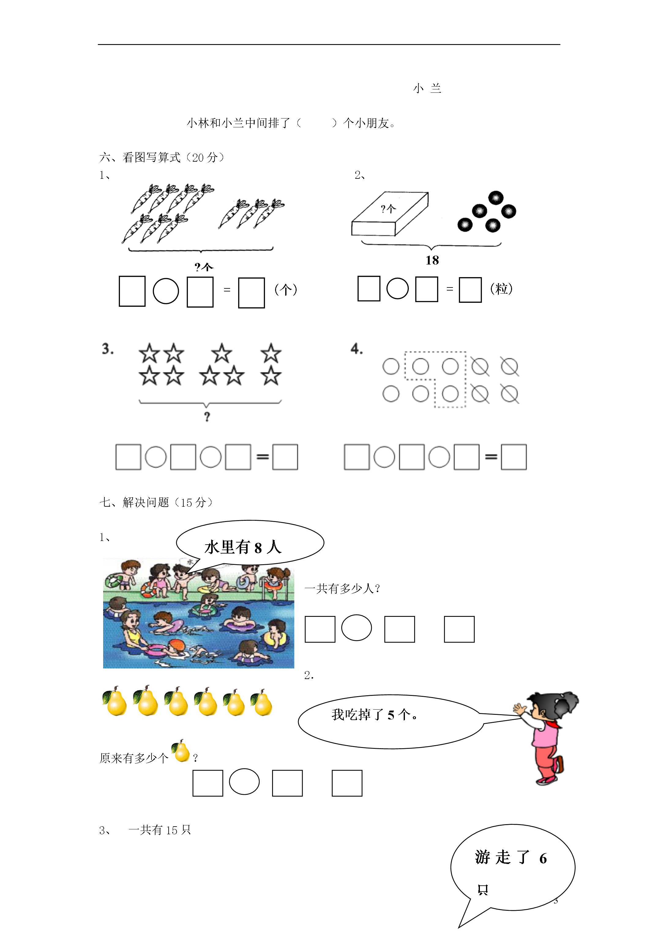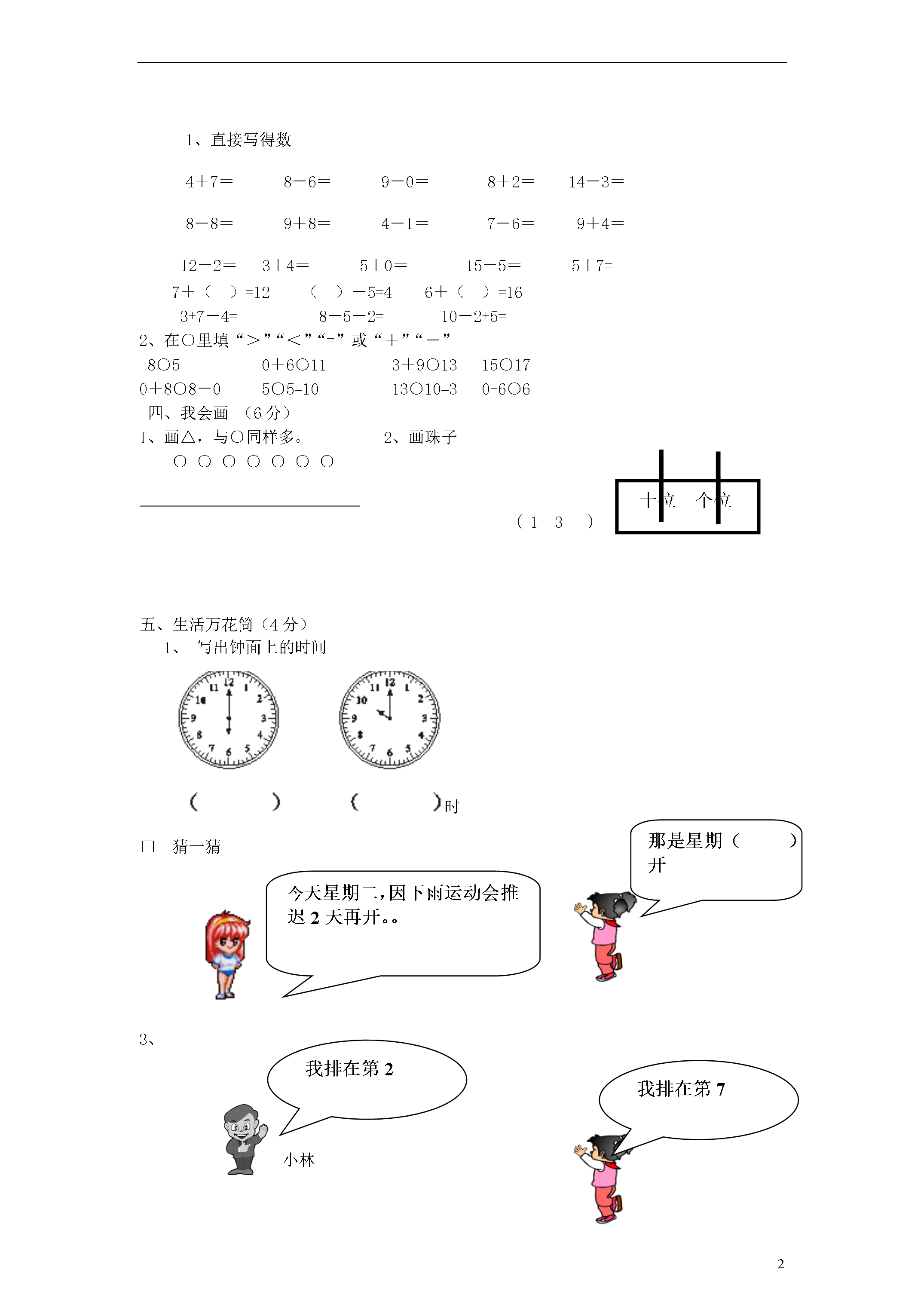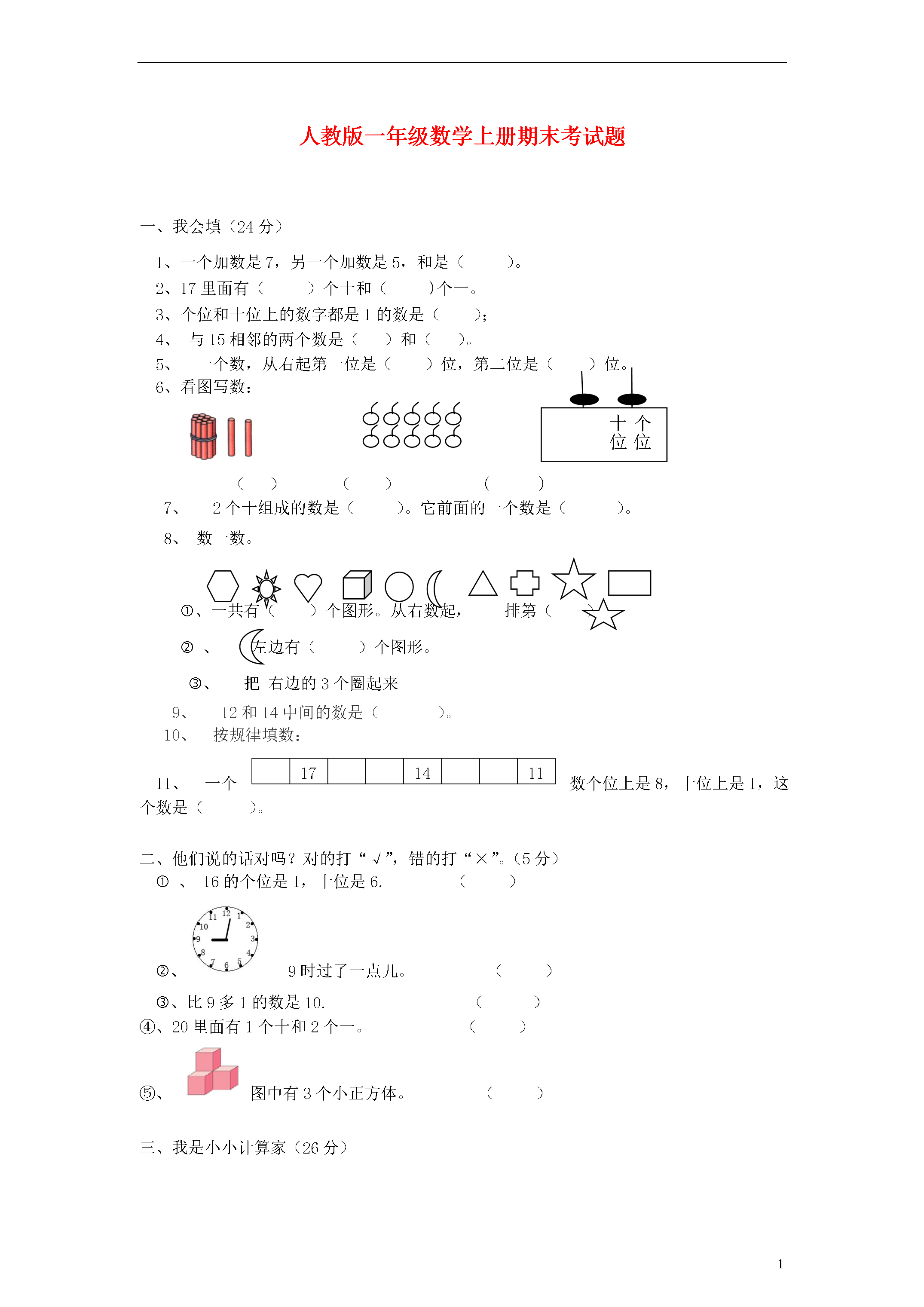 4人教版一年级数学上册期末考试题我会填(24分)1、一个加数是7,另一个加数是5,和是()。2、17里面有()个十和()个一。3、个位和十位上的数字都是1的数是();4、与15相邻的两个数是()和()。个位十位5、一个数,从右起第一位是()位,第二位是()位。6、看图写数:()()()7、2个十组成的数是()。它前面的一个数是()。8、数一数。、一共有()个图形。从右数起,排第()。、左边有()个图形。、把右边的3个圈起来9、12和14中间的数是()。10、按规律填数:17141111、一个数个位上是8,十位上是1,这个数是()。二、他们说的话对吗?对的打“√”,错的打“×”。(5分)、16的个位是1,十位是6.()、9时过了一点儿。()、比9多1的数是10.()④、20里面有1个十和2个一。()⑤、图中有3个小正方体。()三、我是小小计算家(26分)1、直接写得数4+7=8-6=9-0=8+2=14-3=8-8=9+8=4-1=7-6=9+4=12-2=3+4=5+0=15-5=5+7=7+()=12()-5=46+()=163+7-4=8-5-2=10-2+5=2、在○里填“>”“<”“=”或“+”“-”8○50+6○113+9○1315○170+8○8-05○5=1013○10=30+6○6四、我会画(6分)1、画△,与○同样多。2、画珠子○○○○○○○十位个位(13)生活万花筒(4分)1、写出钟面上的时间那是星期()开时猜一猜今天星期二,因下雨运动会推迟2天再开。。我排在第23、我排在第7小林小兰小林和小兰中间排了()个小朋友。六、看图写算式(20分)1、2、?个=(个)18粒=(粒)七、解决问题(15分)水里有8人1、一共有多少人?=2.我吃掉了5个。原来有多少个?=游走了6只3、一共有15只还剩几只?
