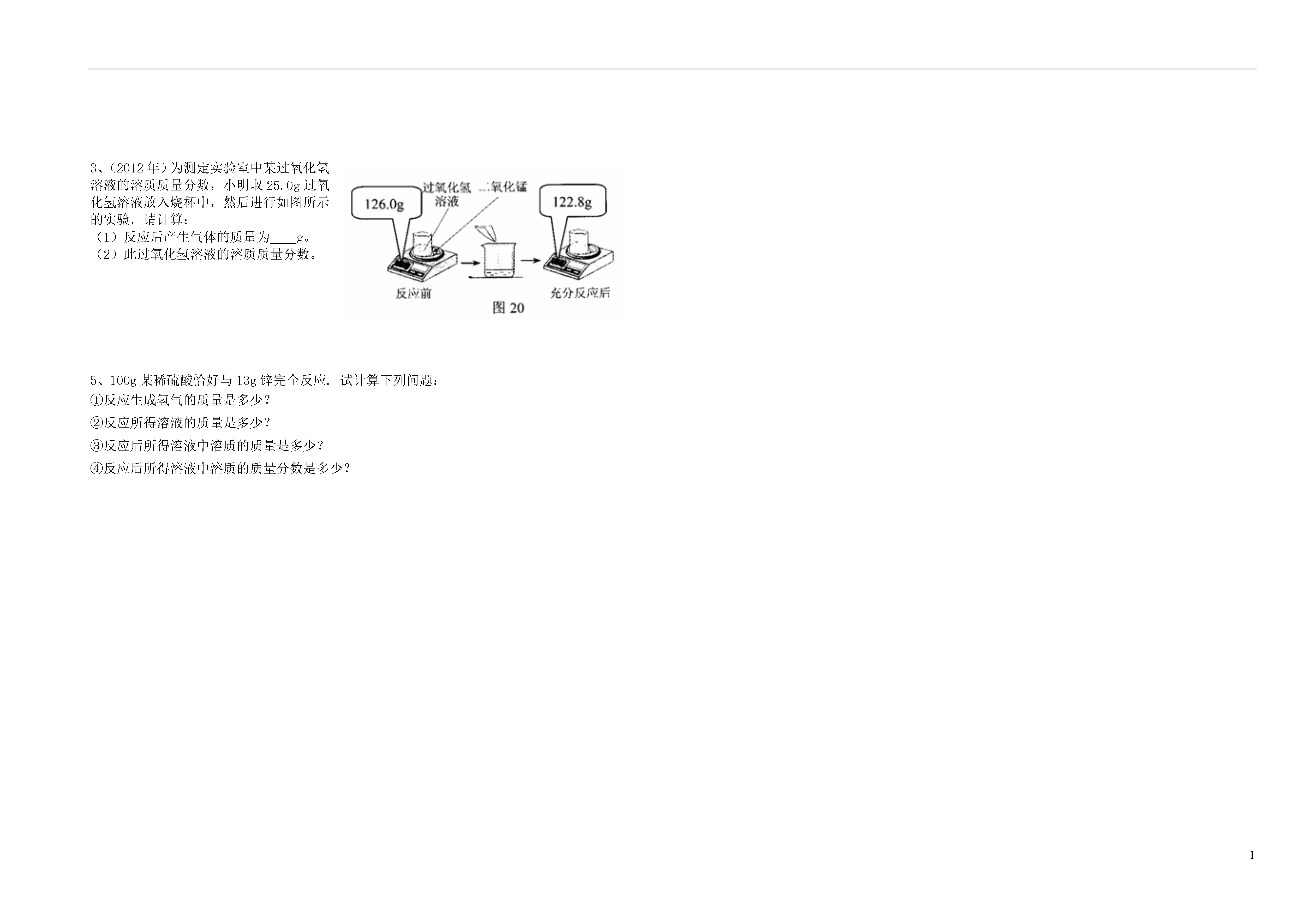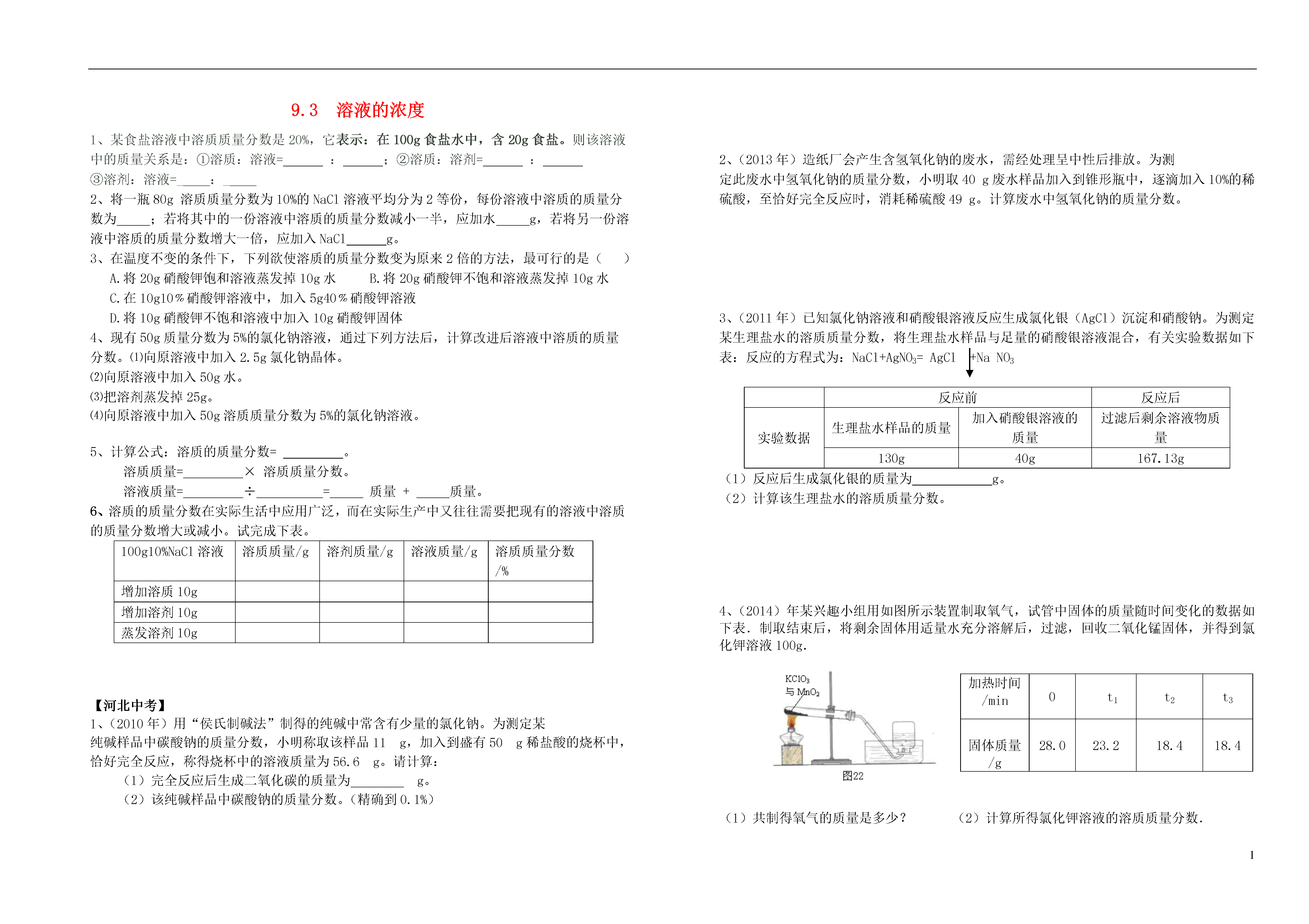 19.3溶液的浓度1、某食盐溶液中溶质质量分数是20%,它表示:在100g食盐水中,含20g食盐。则该溶液中的质量关系是:①溶质:溶液=:;②溶质:溶剂=:③溶剂:溶液=_:_2、将一瓶80g溶质质量分数为10%的NaCl溶液平均分为2等份,每份溶液中溶质的质量分数为;若将其中的一份溶液中溶质的质量分数减小一半,应加水g,若将另一份溶液中溶质的质量分数增大一倍,应加入NaClg。3、在温度不变的条件下,下列欲使溶质的质量分数变为原来2倍的方法,最可行的是()A.将20g硝酸钾饱和溶液蒸发掉10g水B.将20g硝酸钾不饱和溶液蒸发掉10g水C.在10g10﹪硝酸钾溶液中,加入5g40﹪硝酸钾溶液D.将10g硝酸钾不饱和溶液中加入10g硝酸钾固体4、现有50g质量分数为5%的氯化钠溶液,通过下列方法后,计算改进后溶液中溶质的质量分数。⑴向原溶液中加入2.5g氯化钠晶体。⑵向原溶液中加入50g水。⑶把溶剂蒸发掉25g。⑷向原溶液中加入50g溶质质量分数为5%的氯化钠溶液。x5、计算公式:溶质的质量分数=。溶质质量=×溶质质量分数。溶液质量=÷=质量+质量。6、溶质的质量分数在实际生活中应用广泛,而在实际生产中又往往需要把现有的溶液中溶质的质量分数增大或减小。试完成下表。100g10%NaCl溶液溶质质量/g溶剂质量/g溶液质量/g溶质质量分数/%增加溶质10g增加溶剂10g蒸发溶剂10g【河北中考】1、(2010年)用“侯氏制碱法”制得的纯碱中常含有少量的氯化钠。为测定某纯碱样品中碳酸钠的质量分数,小明称取该样品11g,加入到盛有50g稀盐酸的烧杯中,恰好完全反应,称得烧杯中的溶液质量为56.6g。请计算:(1)完全反应后生成二氧化碳的质量为g。(2)该纯碱样品中碳酸钠的质量分数。(精确到0.1%)2、(2013年)造纸厂会产生含氢氧化钠的废水,需经处理呈中性后排放。为测定此废水中氢氧化钠的质量分数,小明取40g废水样品加入到锥形瓶中,逐滴加入10%的稀硫酸,至恰好完全反应时,消耗稀硫酸49g。计算废水中氢氧化钠的质量分数。3、(2011年)已知氯化钠溶液和硝酸银溶液反应生成氯化银(AgCl)沉淀和硝酸钠。为测定某生理盐水的溶质质量分数,将生理盐水样品与足量的硝酸银溶液混合,有关实验数据如下表:反应的方程式为:NaCl+AgNO3=AgCl+NaNO3反应前反应后实验数据生理盐水样品的质量加入硝酸银溶液的质量过滤后剩余溶液物质量130g40g167.13g(1)反应后生成氯化银的质量为g。(2)计算该生理盐水的溶质质量分数。4、(2014)年某兴趣小组用如图所示装置制取氧气,试管中固体的质量随时间变化的数据如下表.制取结束后,将剩余固体用适量水充分溶解后,过滤,回收二氧化锰固体,并得到氯化钾溶液100g.加热时间/min0t1t2t3固体质量/g28.023.218.418.4(1)共制得氧气的质量是多少?(2)计算所得氯化钾溶液的溶质质量分数.3、(2012年)为测定实验室中某过氧化氢溶液的溶质质量分数,小明取25.0g过氧化氢溶液放入烧杯中,然后进行如图所示的实验.请计算:(1)反应后产生气体的质量为g。(2)此过氧化氢溶液的溶质质量分数。5、100g某稀硫酸恰好与13g锌完全反应.试计算下列问题:①反应生成氢气的质量是多少?②反应所得溶液的质量是多少?③反应后所得溶液中溶质的质量是多少?④反应后所得溶液中溶质的质量分数是多少?