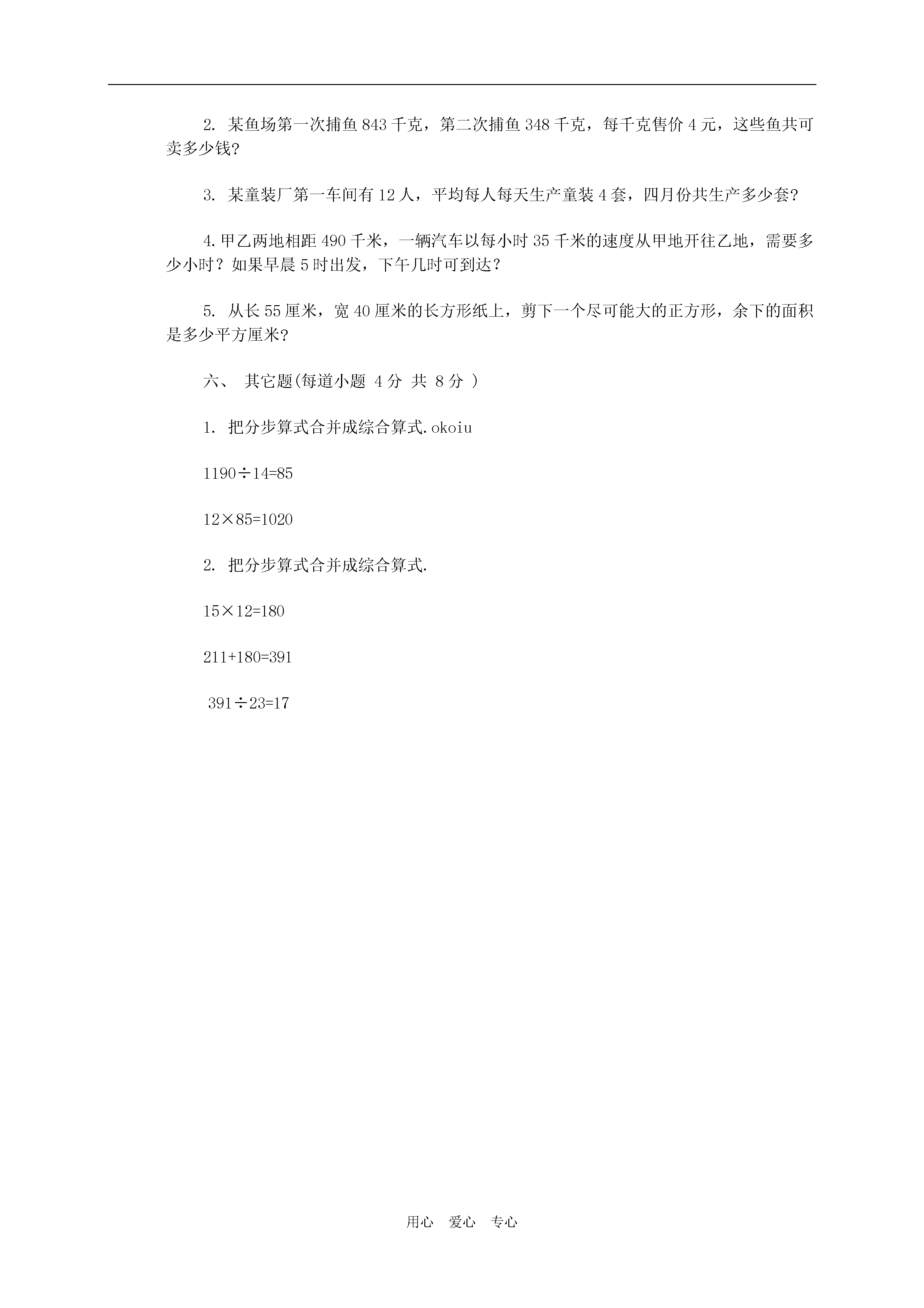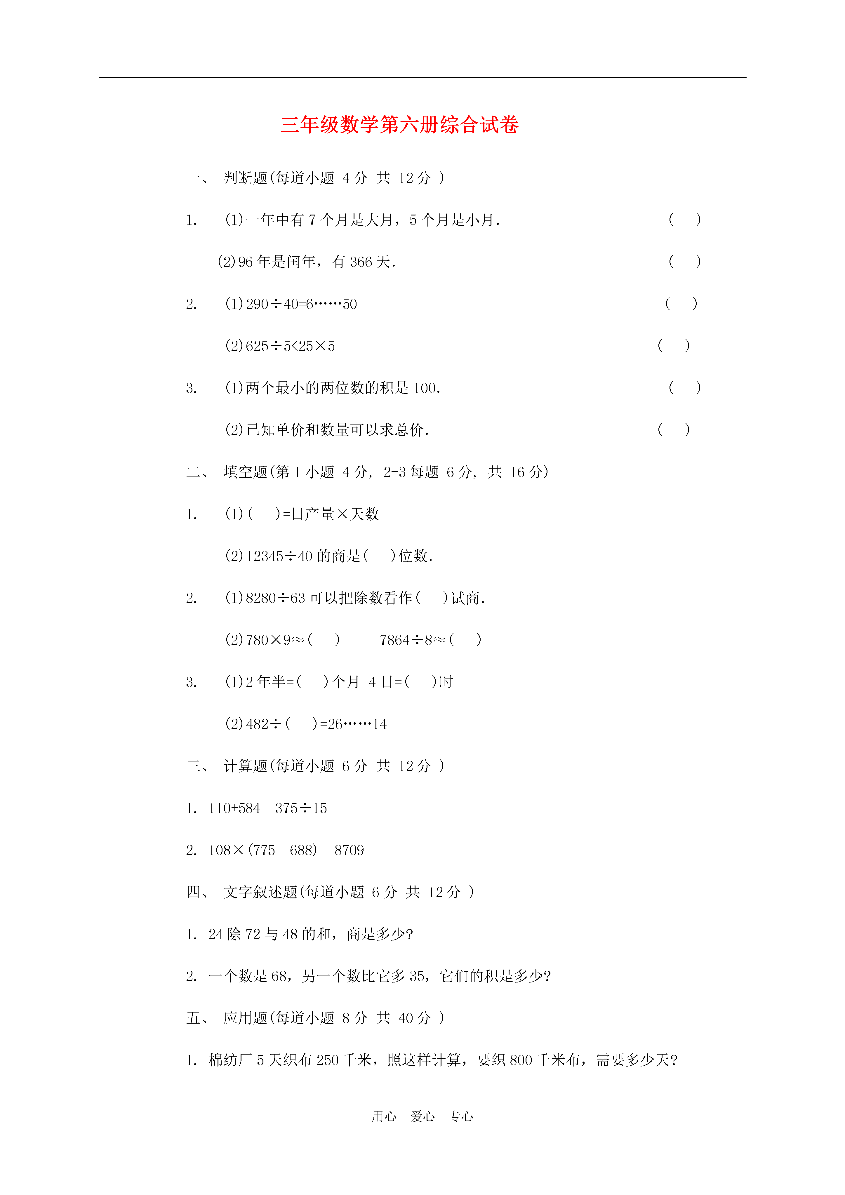 用心爱心专心三年级数学第六册综合试卷一、判断题(每道小题4分共12分)1.(1)一年中有7个月是大月,5个月是小月.()(2)96年是闰年,有366天.()2.(1)290÷40=6……50()(2)625÷5<25×5()3.(1)两个最小的两位数的积是100.()(2)已知单价和数量可以求总价.()二、填空题(第1小题4分,2-3每题6分,共16分)1.(1)()=日产量×天数(2)12345÷40的商是()位数.2.(1)8280÷63可以把除数看作()试商.(2)780×9≈()7864÷8≈()3.(1)2年半=()个月4日=()时(2)482÷()=26……14三、计算题(每道小题6分共12分)1.110+584375÷152.108×(775688)8709四、文字叙述题(每道小题6分共12分)1.24除72与48的和,商是多少?2.一个数是68,另一个数比它多35,它们的积是多少?五、应用题(每道小题8分共40分)1.棉纺厂5天织布250千米,照这样计算,要织800千米布,需要多少天?2.某鱼场第一次捕鱼843千克,第二次捕鱼348千克,每千克售价4元,这些鱼共可卖多少钱?3.某童装厂第一车间有12人,平均每人每天生产童装4套,四月份共生产多少套?4.甲乙两地相距490千米,一辆汽车以每小时35千米的速度从甲地开往乙地,需要多少小时?如果早晨5时出发,下午几时可到达?5.从长55厘米,宽40厘米的长方形纸上,剪下一个尽可能大的正方形,余下的面积是多少平方厘米?六、其它题(每道小题4分共8分)1.把分步算式合并成综合算式.okoiu1190÷14=8512×85=10202.把分步算式合并成综合算式.15×12=180211+180=391391÷23=17