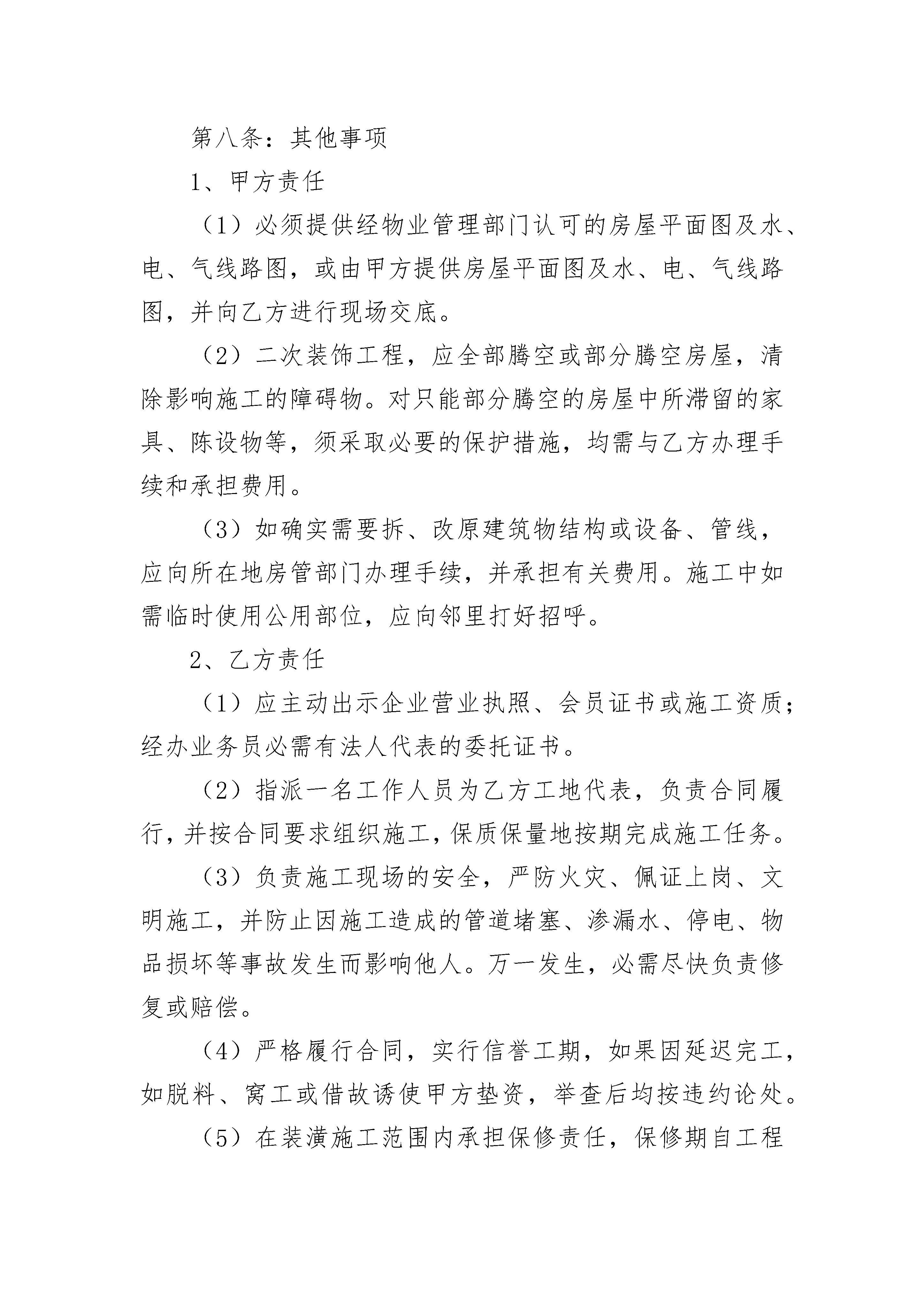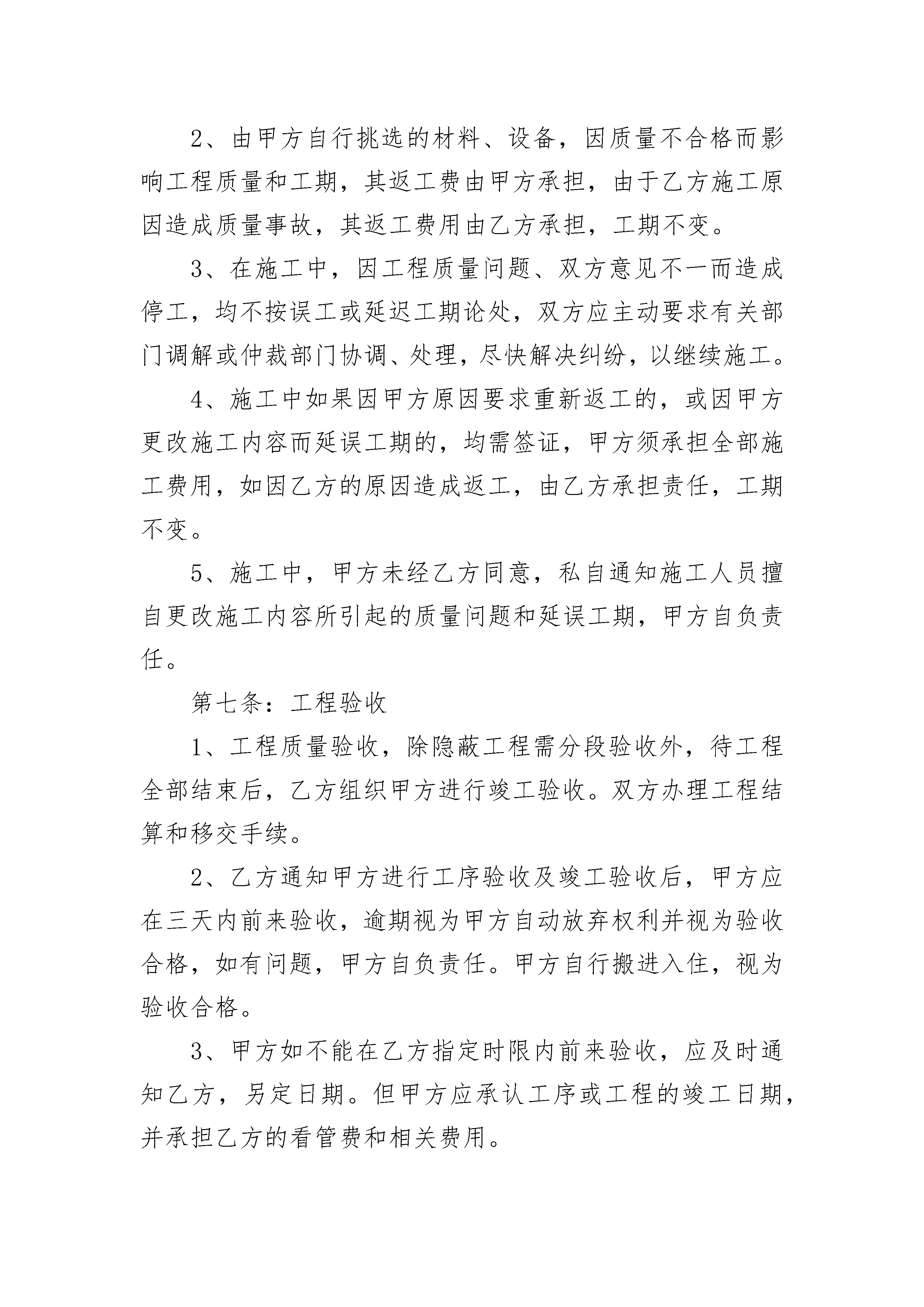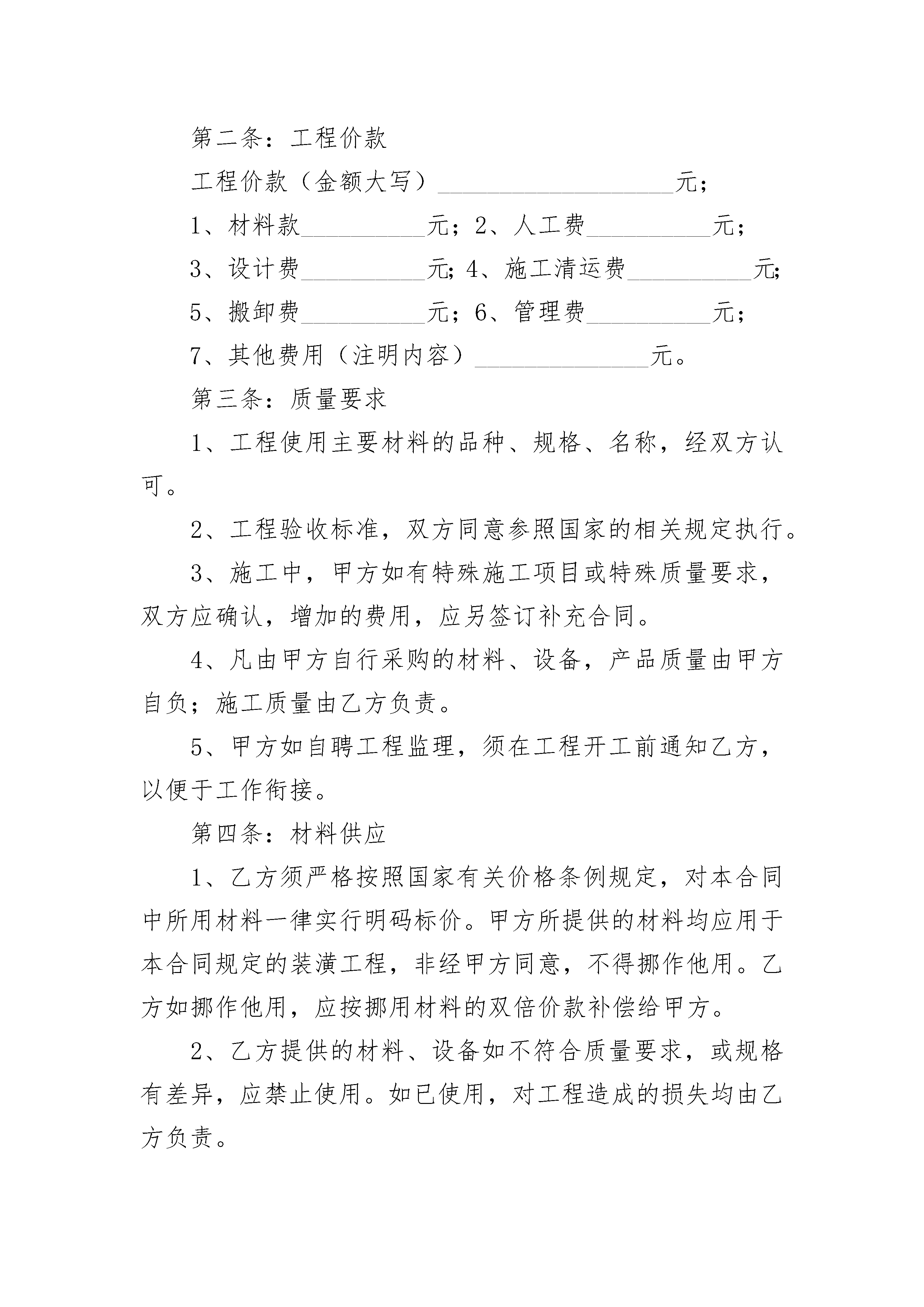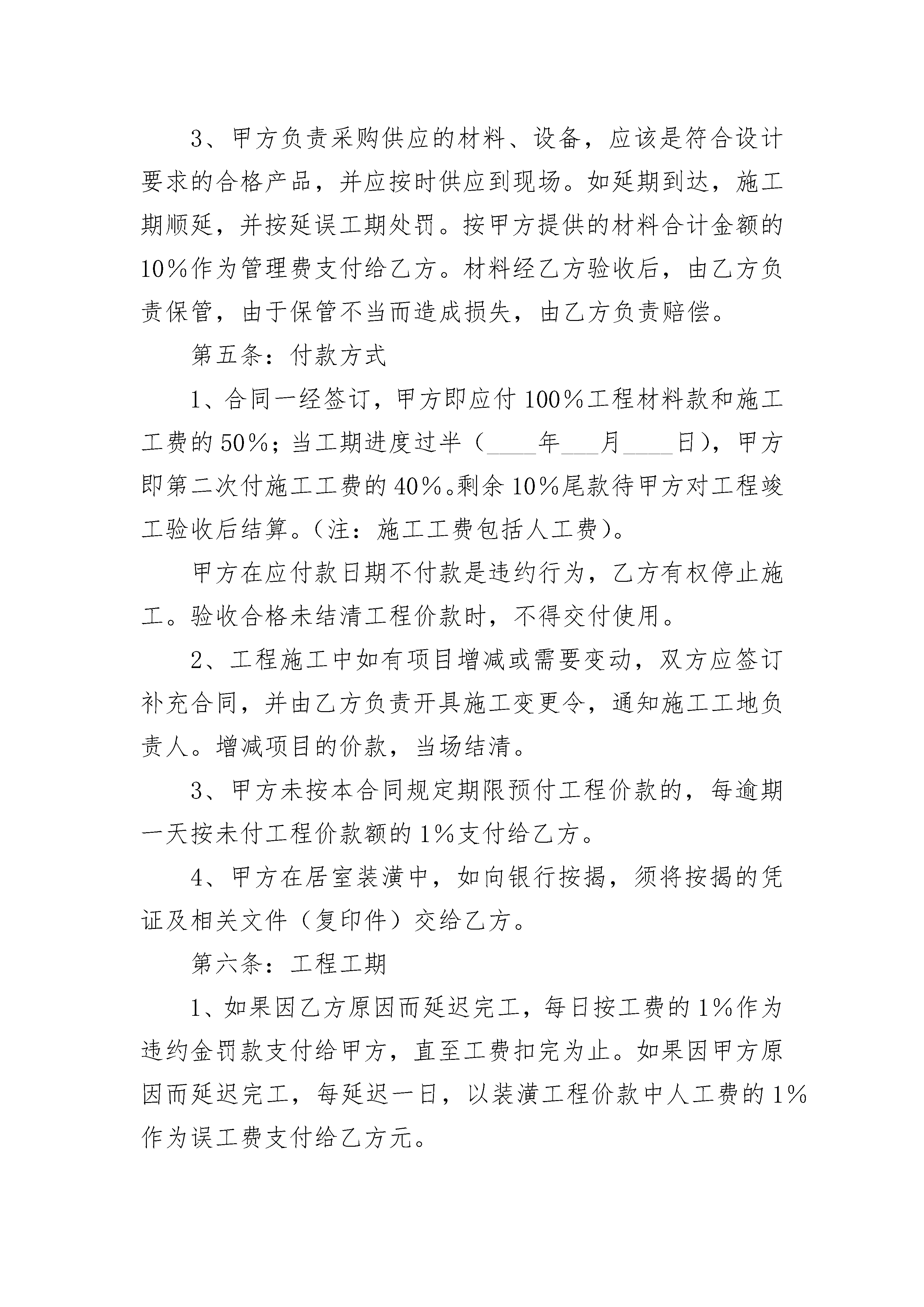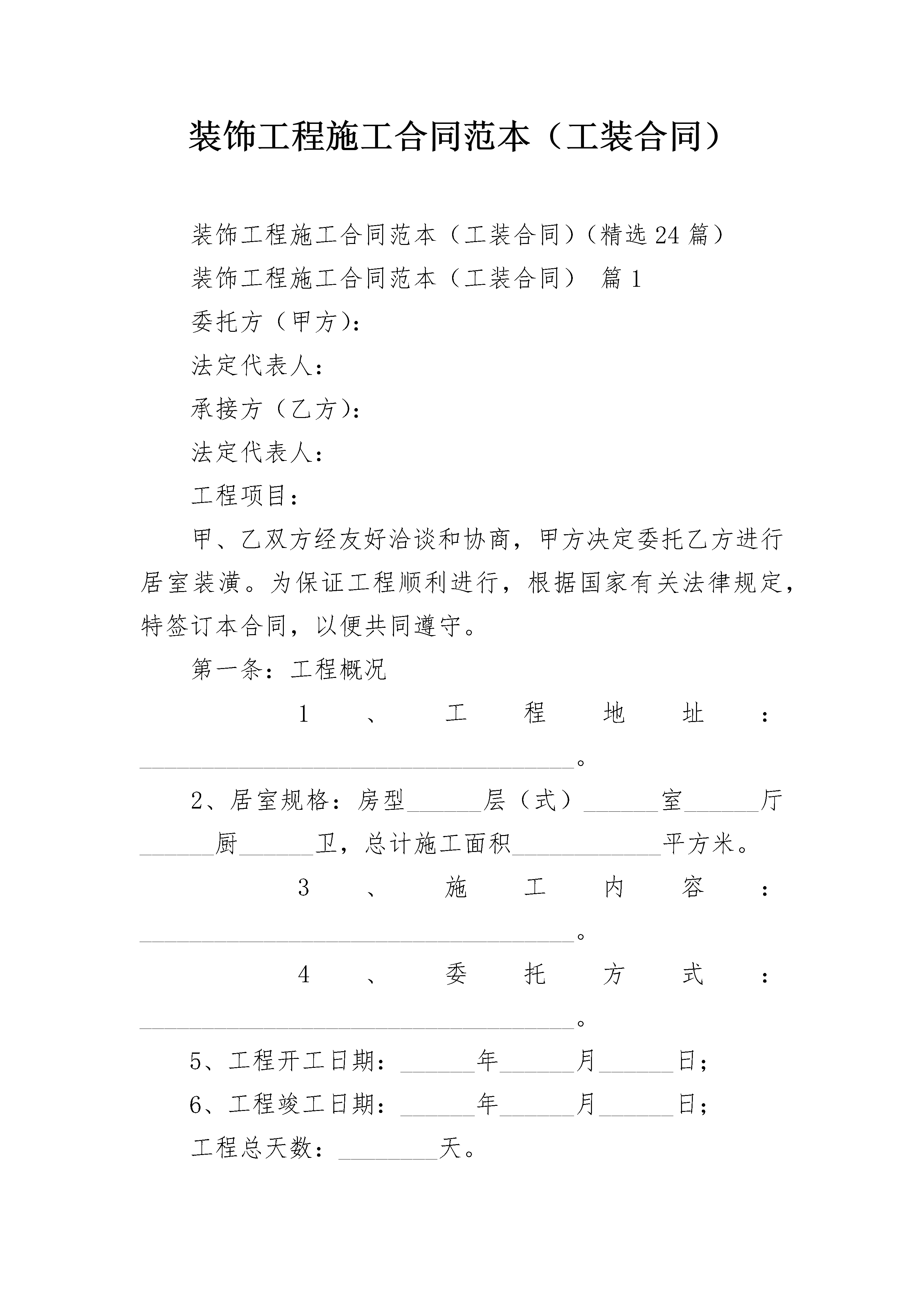 装饰工程施工合同范本(工装合同)装饰工程施工合同范本(工装合同)(精选24篇)装饰工程施工合同范本(工装合同)篇1委托方(甲方):法定代表人:承接方(乙方):法定代表人:工程项目:甲、乙双方经友好洽谈和协商,甲方决定委托乙方进行居室装潢。为保证工程顺利进行,根据国家有关法律规定,特签订本合同,以便共同遵守。第一条:工程概况1、工程地址:___________________________________。2、居室规格:房型______层(式)______室______厅______厨______卫,总计施工面积____________平方米。3、施工内容:___________________________________。4、委托方式:___________________________________。5、工程开工日期:______年______月______日;6、工程竣工日期:______年______月______日;工程总天数:________天。第二条:工程价款工程价款(金额大写)___________________元;1、材料款__________元;2、人工费__________元;3、设计费__________元;4、施工清运费__________元;5、搬卸费__________元;6、管理费__________元;7、其他费用(注明内容)______________元。第三条:质量要求1、工程使用主要材料的品种、规格、名称,经双方认可。2、工程验收标准,双方同意参照国家的相关规定执行。3、施工中,甲方如有特殊施工项目或特殊质量要求,双方应确认,增加的费用,应另签订补充合同。4、凡由甲方自行采购的材料、设备,产品质量由甲方自负;施工质量由乙方负责。5、甲方如自聘工程监理,须在工程开工前通知乙方,以便于工作衔接。第四条:材料供应1、乙方须严格按照国家有关价格条例规定,对本合同中所用材料一律实行明码标价。甲方所提供的材料均应用于本合同规定的装潢工程,非经甲方同意,不得挪作他用。乙方如挪作他用,应按挪用材料的双倍价款补偿给甲方。2、乙方提供的材料、设备如不符合质量要求,或规格有差异,应禁止使用。如已使用,对工程造成的损失均由乙方负责。3、甲方负责采购供应的材料、设备,应该是符合设计要求的合格产品,并应按时供应到现场。如延期到达,施工期顺延,并按延误工期处罚。按甲方提供的材料合计金额的10%作为管理费支付给乙方。材料经乙方验收后,由乙方负责保管,由于保管不当而造成损失,由乙方负责赔偿。第五条:付款方式1、合同一经签订,甲方即应付100%工程材料款和施工工费的50%;当工期进度过半(____年___月____日),甲方即第二次付施工工费的40%。剩余10%尾款待甲方对工程竣工验收后结算。(注:施工工费包括人工费)。甲方在应付款日期不付款是违约行为,乙方有权停止施工。验收合格未结清工程价款时,不得交付使用。2、工程施工中如有项目增减或需要变动,双方应签订补充合同,并由乙方负责开具施工变更令,通知施工工地负责人。增减项目的价款,当场结清。3、甲方未按本合同规定期限预付工程价款的,每逾期一天按未付工程价款额的1%支付给乙方。4、甲方在居室装潢中,如向银行按揭,须将按揭的凭证及相关文件(复印件)交给乙方。第六条:工程工期1、如果因乙方原因而延迟完工,每日按工费的1%作为违约金罚款支付给甲方,直至工费扣完为止。如果因甲方原因而延迟完工,每延迟一日,以装潢工程价款中人工费的1%作为误工费支付给乙方元。2、由甲方自行挑选的材料、设备,因质量不合格而影响工程质量和工期,其返工费由甲方承担,由于乙方施工原因造成质量事故,其返工费用由乙方承担,工期不变。3、在施工中,因工程质量问题、双方意见不一而造成停工,均不按误工或延迟工期论处,双方应主动要求有关部门调解或仲裁部门协调、处理,尽快解决纠纷,以继续施工。4、施工中如果因甲方原因要求重新返工的,或因甲方更改施工内容而延误工期的,均需签证,甲方须承担全部施工费用,如因乙方的原因造成返工,由乙方承担责任,工期不变。5、施工中,甲方未经乙方同意,私自通知施工人员擅自更改施工内容所引起的质量问题和延误工期,甲方自负责任。第七条:工程验收1、工程质量验收,除隐蔽工程需分段验收外,待工程全部结束后,乙方组织甲方进行竣工验收。双方办理工程结算和移交手续。2、乙方通知甲方进行工序验收及竣工验收后,甲方应在三天内前来验收,逾期视为甲方自动放弃权利并视为验收合格,如有问题,甲方自负责任。甲方自行搬进入住,视为验收合格。3、甲方如不能在乙方指定时限内前来验收,应及时通知乙方,另定日期。但甲方应承认工序或工程的竣工日期,并承担乙方的看管费和相关费用。第八条:其他事项1、甲方责任(1)必须提供经物业