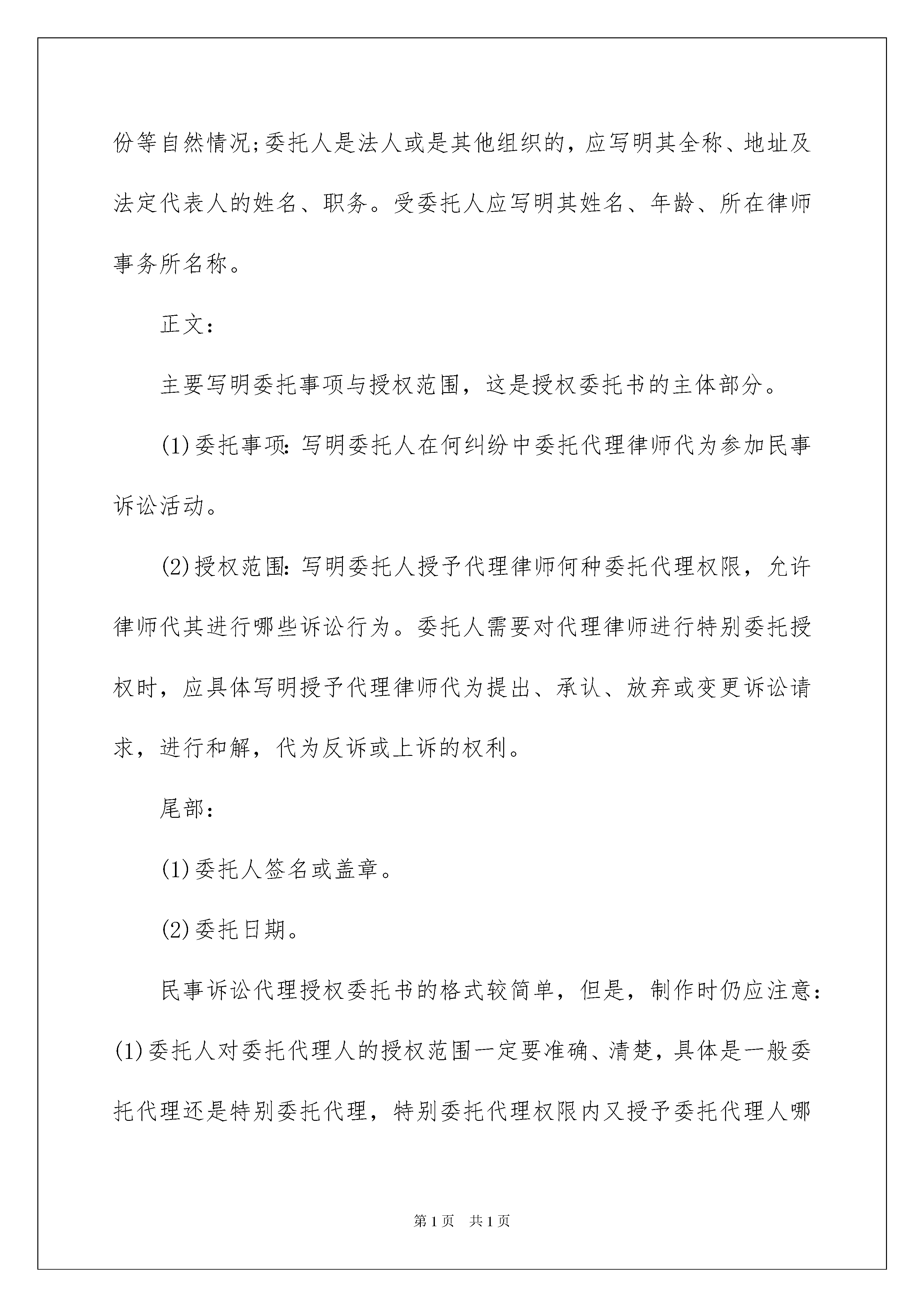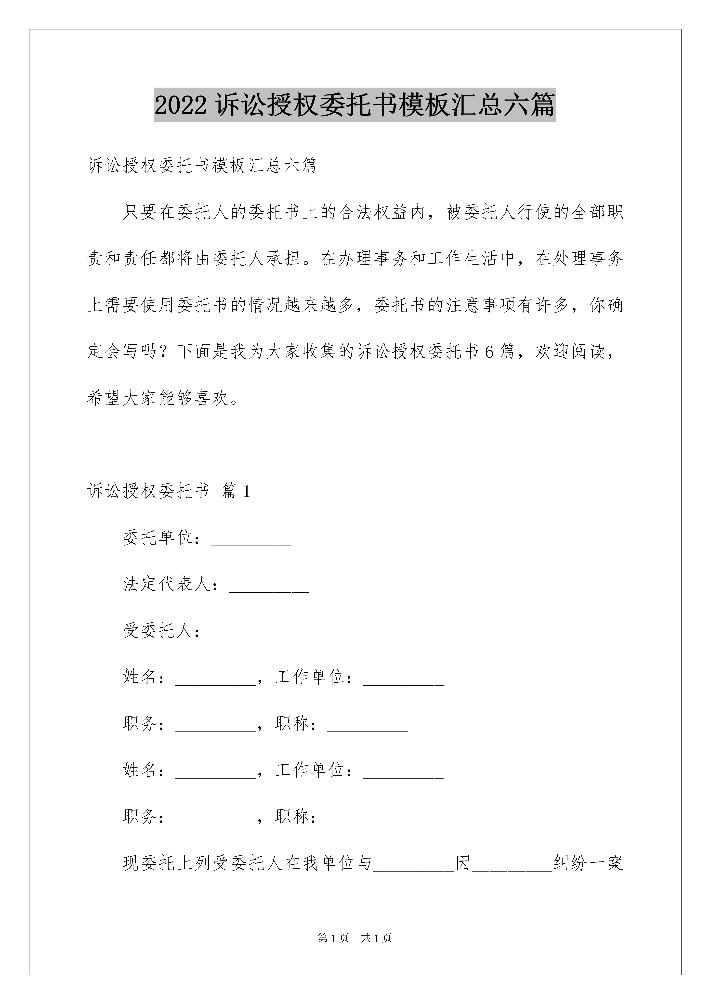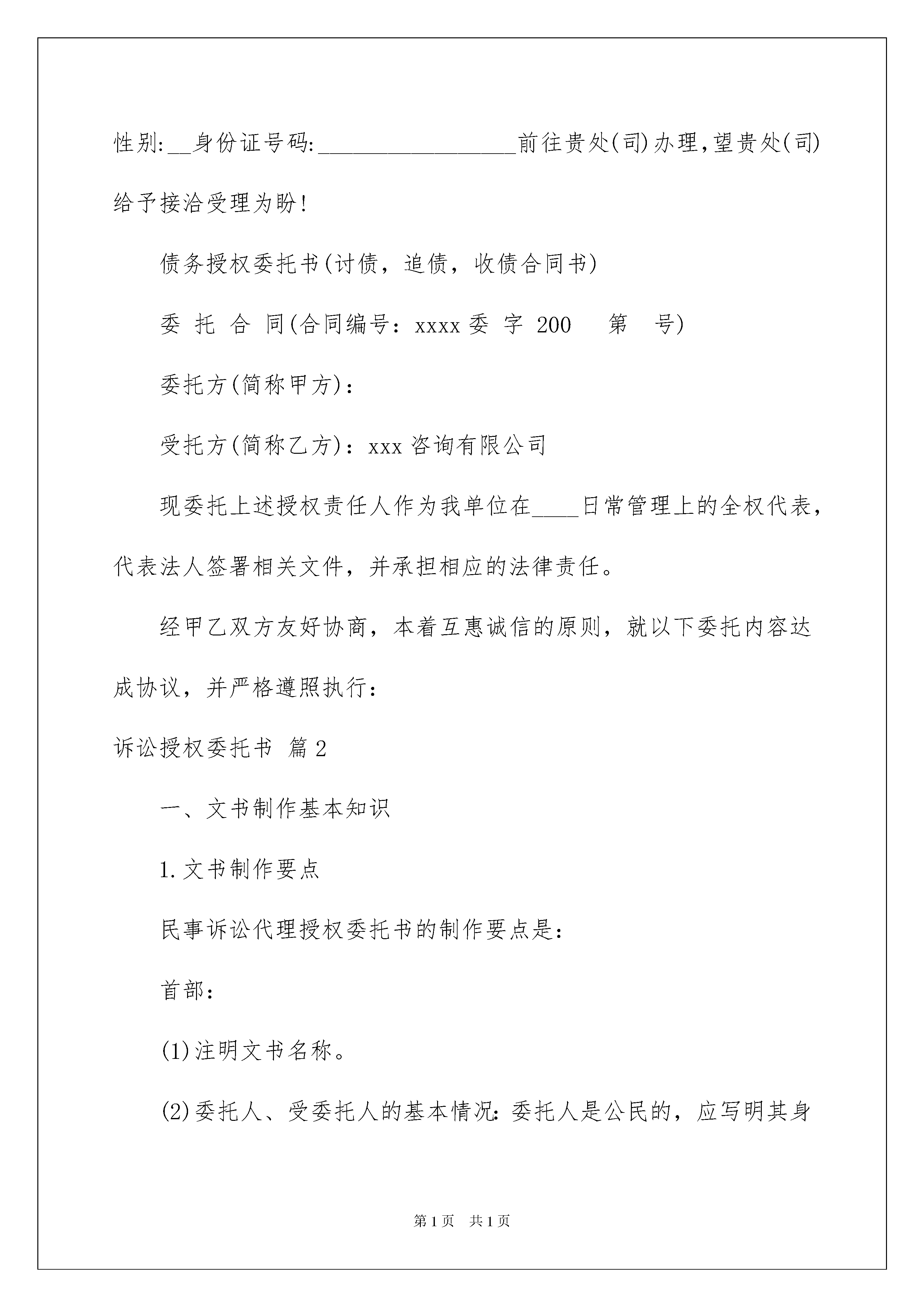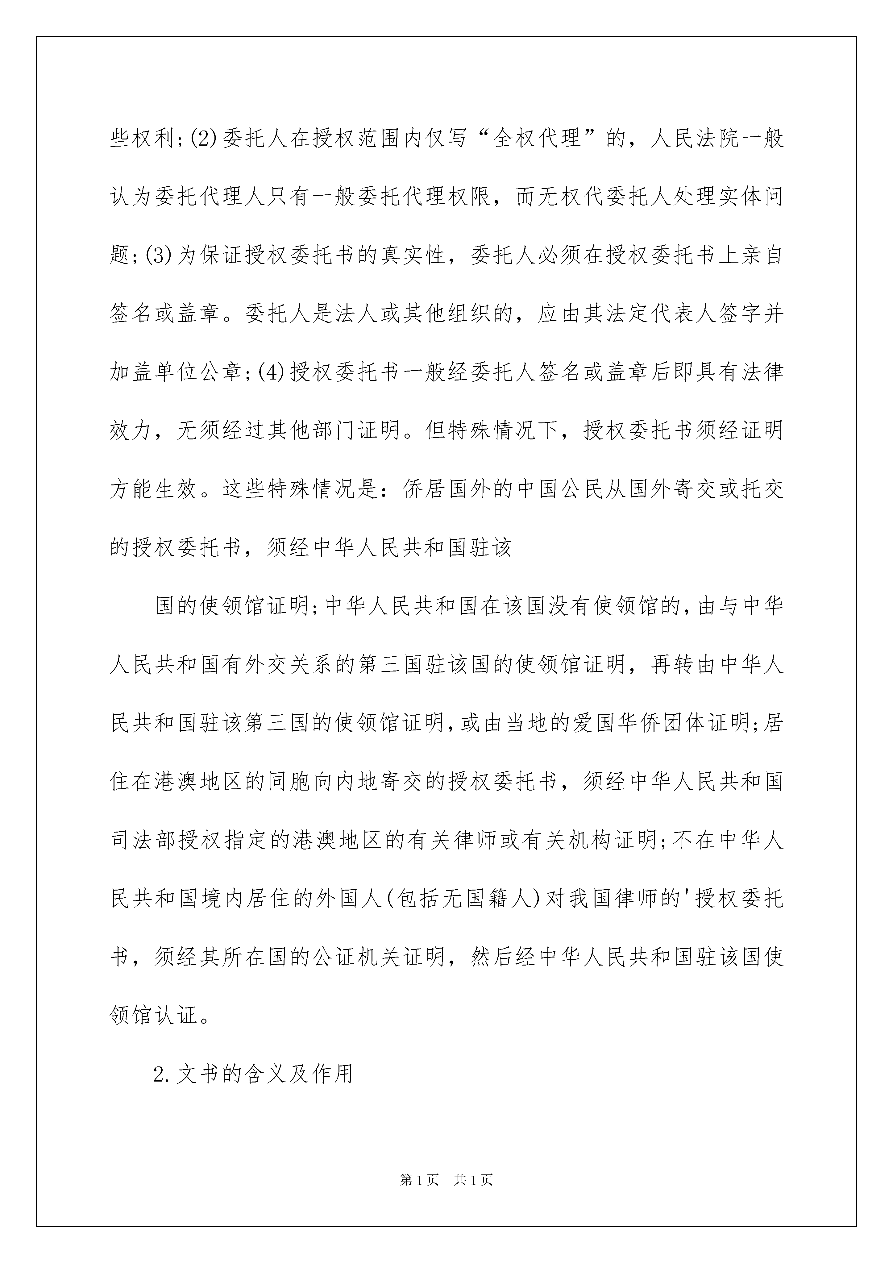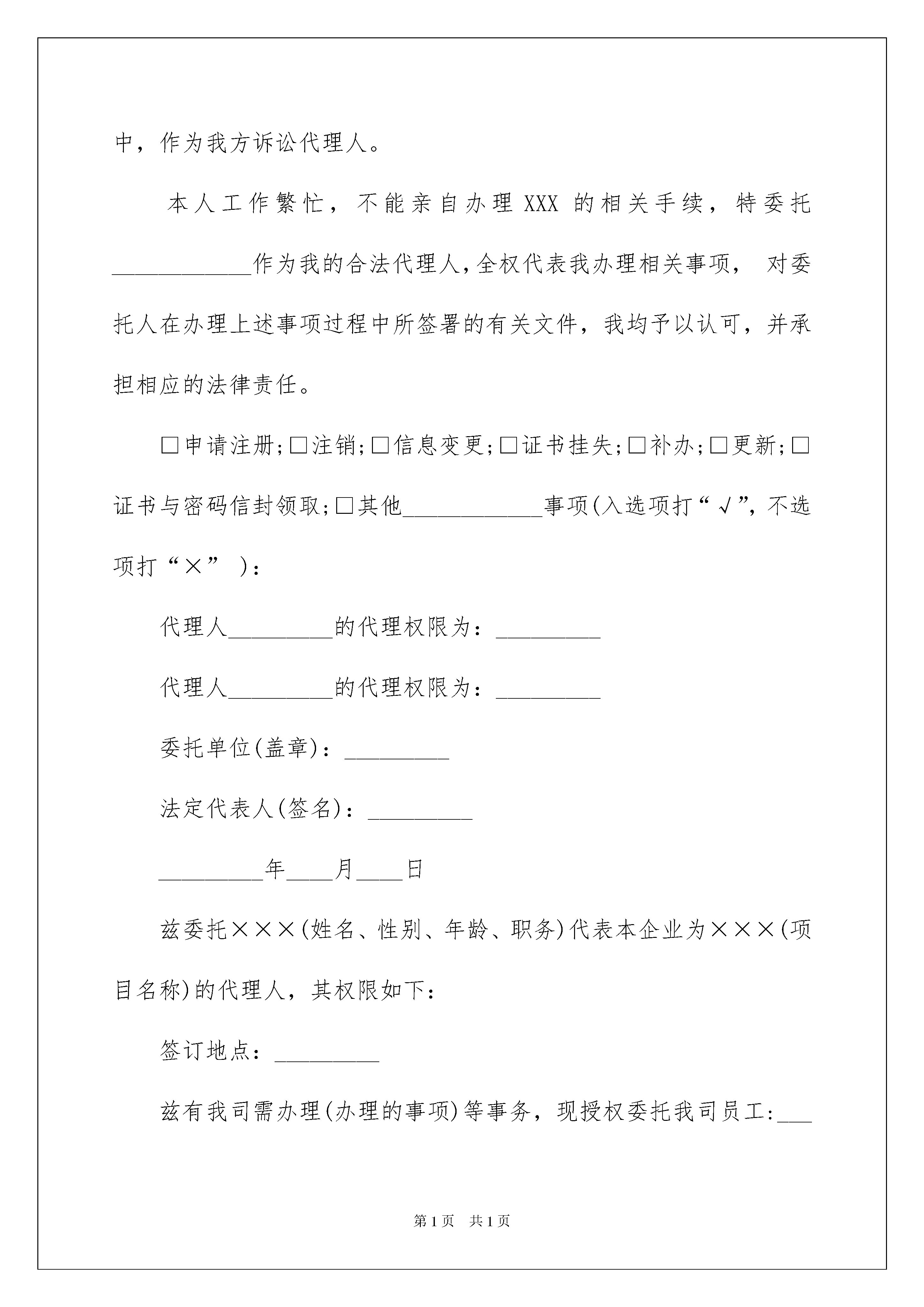 2022诉讼授权委托书模板汇总六篇诉讼授权委托书模板汇总六篇只要在委托人的委托书上的合法权益内,被委托人行使的全部职责和责任都将由委托人承担。在办理事务和工作生活中,在处理事务上需要使用委托书的情况越来越多,委托书的注意事项有许多,你确定会写吗?下面是我为大家收集的诉讼授权委托书6篇,欢迎阅读,希望大家能够喜欢。诉讼授权委托书篇1委托单位:_________法定代表人:_________受委托人:姓名:_________,工作单位:_________职务:_________,职称:_________姓名:_________,工作单位:_________职务:_________,职称:_________现委托上列受委托人在我单位与_________因_________纠纷一案中,作为我方诉讼代理人。本人工作繁忙,不能亲自办理XXX的相关手续,特委托____________作为我的合法代理人,全权代表我办理相关事项,对委托人在办理上述事项过程中所签署的有关文件,我均予以认可,并承担相应的法律责任。□申请注册;□注销;□信息变更;□证书挂失;□补办;□更新;□证书与密码信封领取;□其他____________事项(入选项打“√”,不选项打“×”):代理人_________的代理权限为:_________代理人_________的代理权限为:_________委托单位(盖章):_________法定代表人(签名):__________________年____月____日兹委托×××(姓名、性别、年龄、职务)代表本企业为×××(项目名称)的代理人,其权限如下:签订地点:_________兹有我司需办理(办理的事项)等事务,现授权委托我司员工:___性别:__身份证号码:_________________前往贵处(司)办理,望贵处(司)给予接洽受理为盼!债务授权委托书(讨债,追债,收债合同书)委托合同(合同编号:xxxx委字200第号)委托方(简称甲方):受托方(简称乙方):xxx咨询有限公司现委托上述授权责任人作为我单位在____日常管理上的全权代表,代表法人签署相关文件,并承担相应的法律责任。经甲乙双方友好协商,本着互惠诚信的原则,就以下委托内容达成协议,并严格遵照执行:诉讼授权委托书篇2一、文书制作基本知识1.文书制作要点民事诉讼代理授权委托书的制作要点是:首部:(1)注明文书名称。(2)委托人、受委托人的基本情况:委托人是公民的,应写明其身份等自然情况;委托人是法人或是其他组织的,应写明其全称、地址及法定代表人的姓名、职务。受委托人应写明其姓名、年龄、所在律师事务所名称。正文:主要写明委托事项与授权范围,这是授权委托书的主体部分。(1)委托事项:写明委托人在何纠纷中委托代理律师代为参加民事诉讼活动。(2)授权范围:写明委托人授予代理律师何种委托代理权限,允许律师代其进行哪些诉讼行为。委托人需要对代理律师进行特别委托授权时,应具体写明授予代理律师代为提出、承认、放弃或变更诉讼请求,进行和解,代为反诉或上诉的权利。尾部:(1)委托人签名或盖章。(2)委托日期。民事诉讼代理授权委托书的格式较简单,但是,制作时仍应注意:(1)委托人对委托代理人的授权范围一定要准确、清楚,具体是一般委托代理还是特别委托代理,特别委托代理权限内又授予委托代理人哪些权利;(2)委托人在授权范围内仅写“全权代理”的,人民法院一般认为委托代理人只有一般委托代理权限,而无权代委托人处理实体问题;(3)为保证授权委托书的真实性,委托人必须在授权委托书上亲自签名或盖章。委托人是法人或其他组织的,应由其法定代表人签字并加盖单位公章;(4)授权委托书一般经委托人签名或盖章后即具有法律效力,无须经过其他部门证明。但特殊情况下,授权委托书须经证明方能生效。这些特殊情况是:侨居国外的中国公民从国外寄交或托交的授权委托书,须经中华人民共和国驻该国的使领馆证明;中华人民共和国在该国没有使领馆的,由与中华人民共和国有外交关系的第三国驻该国的使领馆证明,再转由中华人民共和国驻该第三国的使领馆证明,或由当地的爱国华侨团体证明;居住在港澳地区的同胞向内地寄交的授权委托书,须经中华人民共和国司法部授权指定的港澳地区的有关律师或有关机构证明;不在中华人民共和国境内居住的外国人(包括无国籍人)对我国律师的'授权委托书,须经其所在国的公证机关证明,然后经中华人民共和国驻该国使领馆认证。2.文书的含义及作用民事诉讼代理授权委托书,是指民事诉讼活动当事人单方出具的,明确代理律师在代理委托人参加民事诉讼过程中代理权限范围的法律文书。根据《民事诉讼法