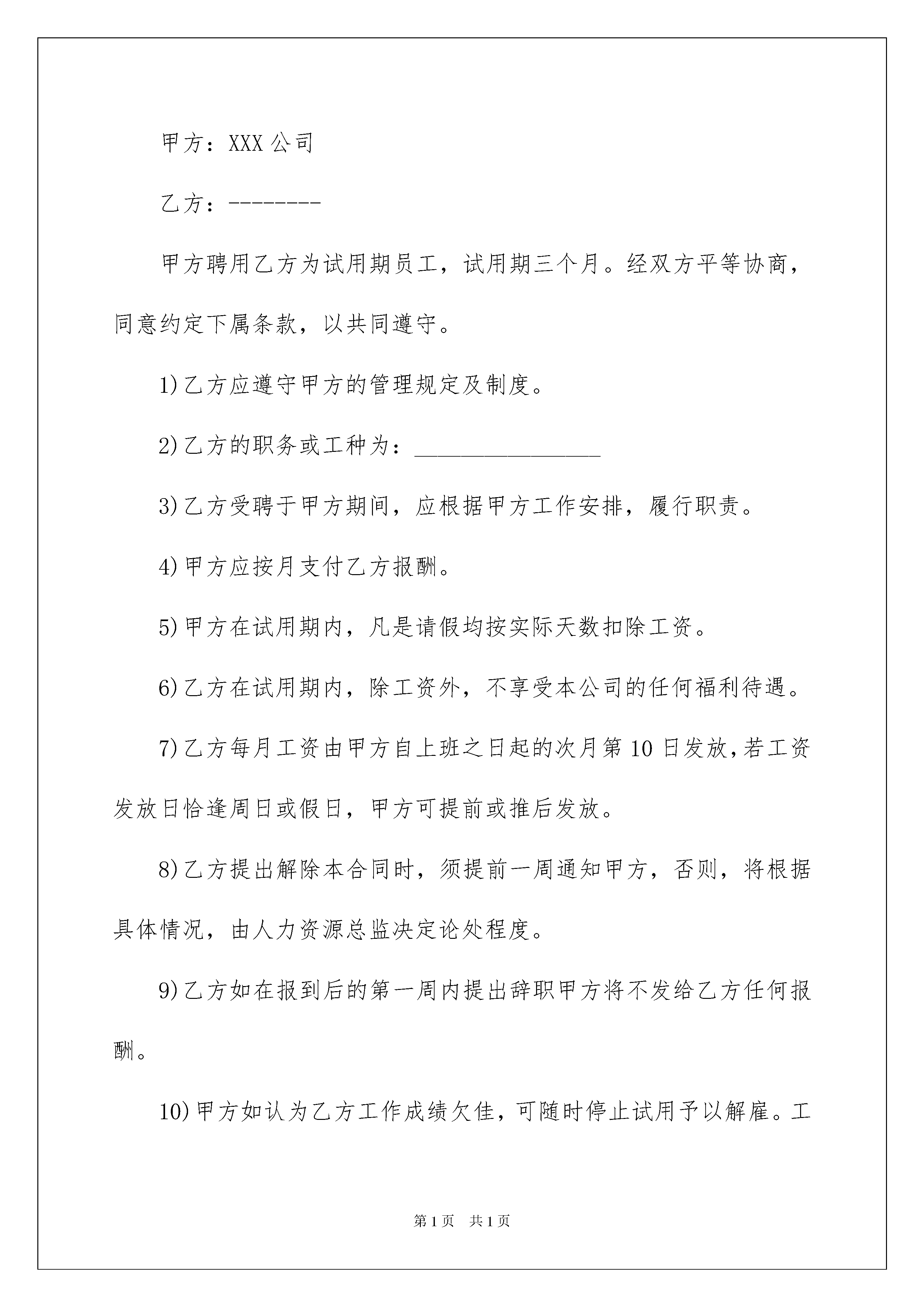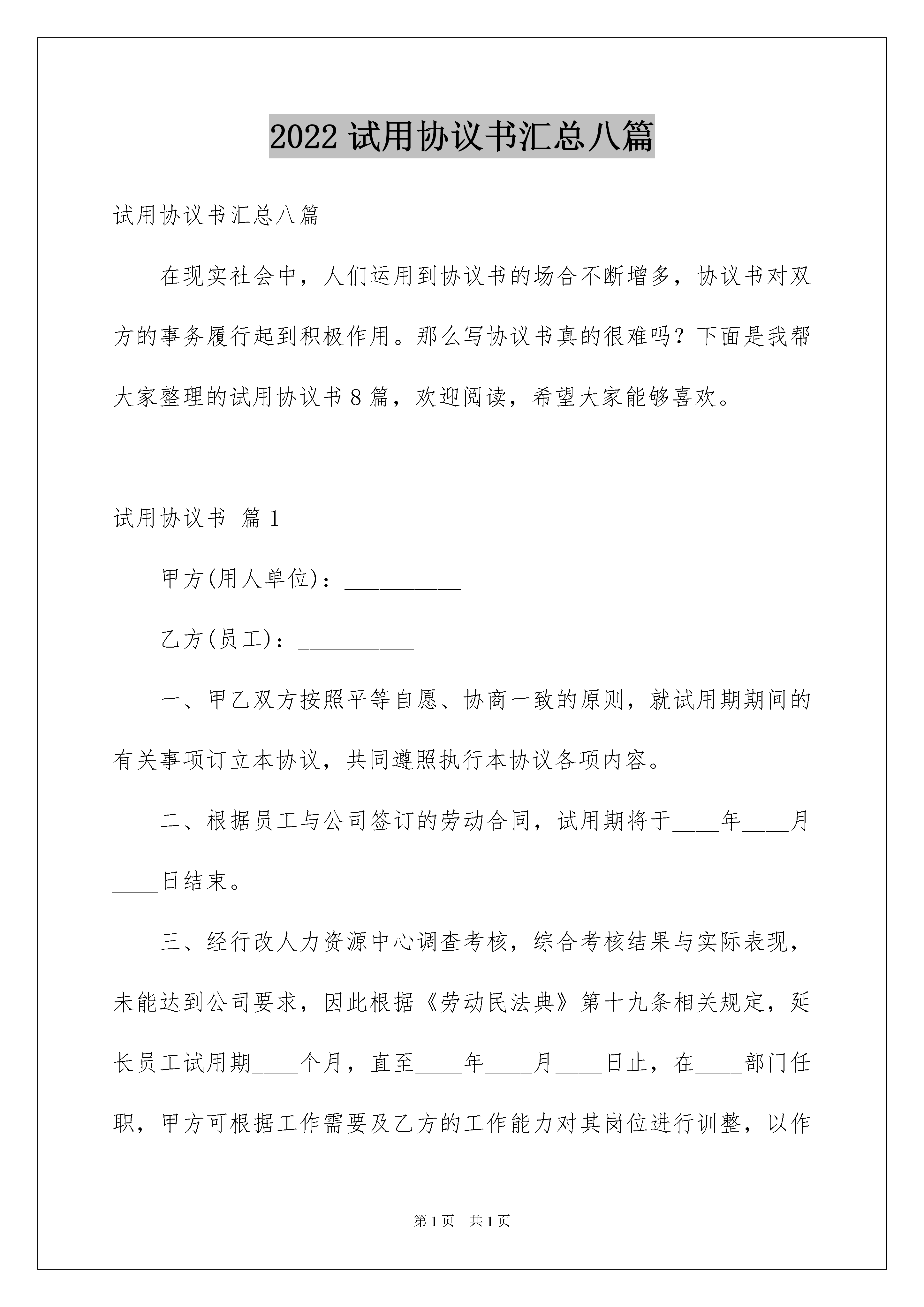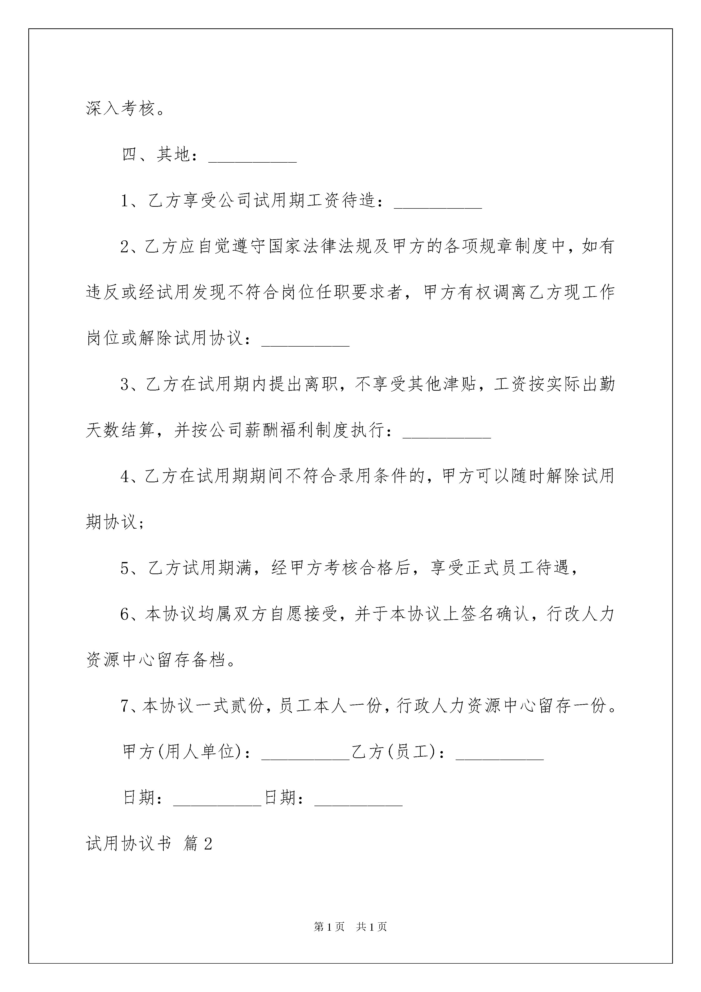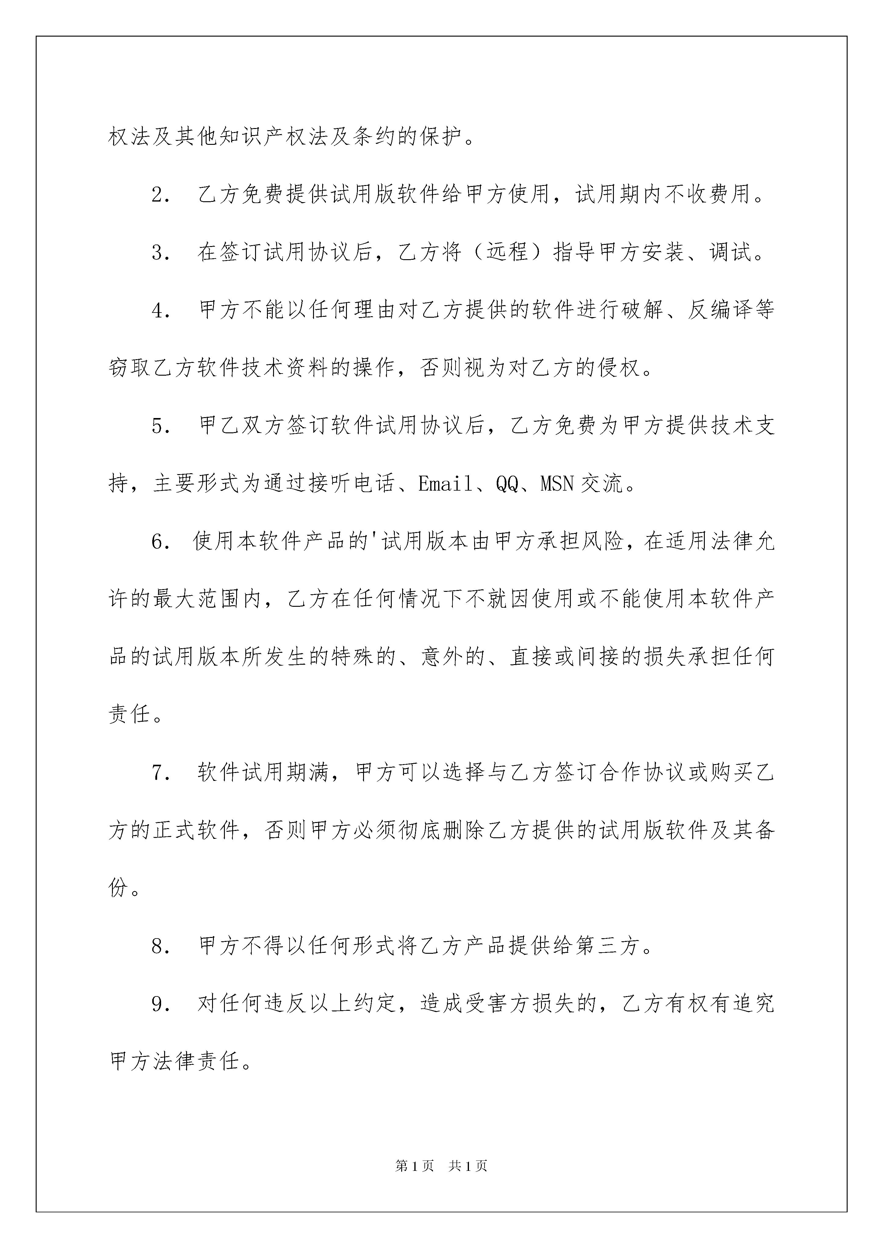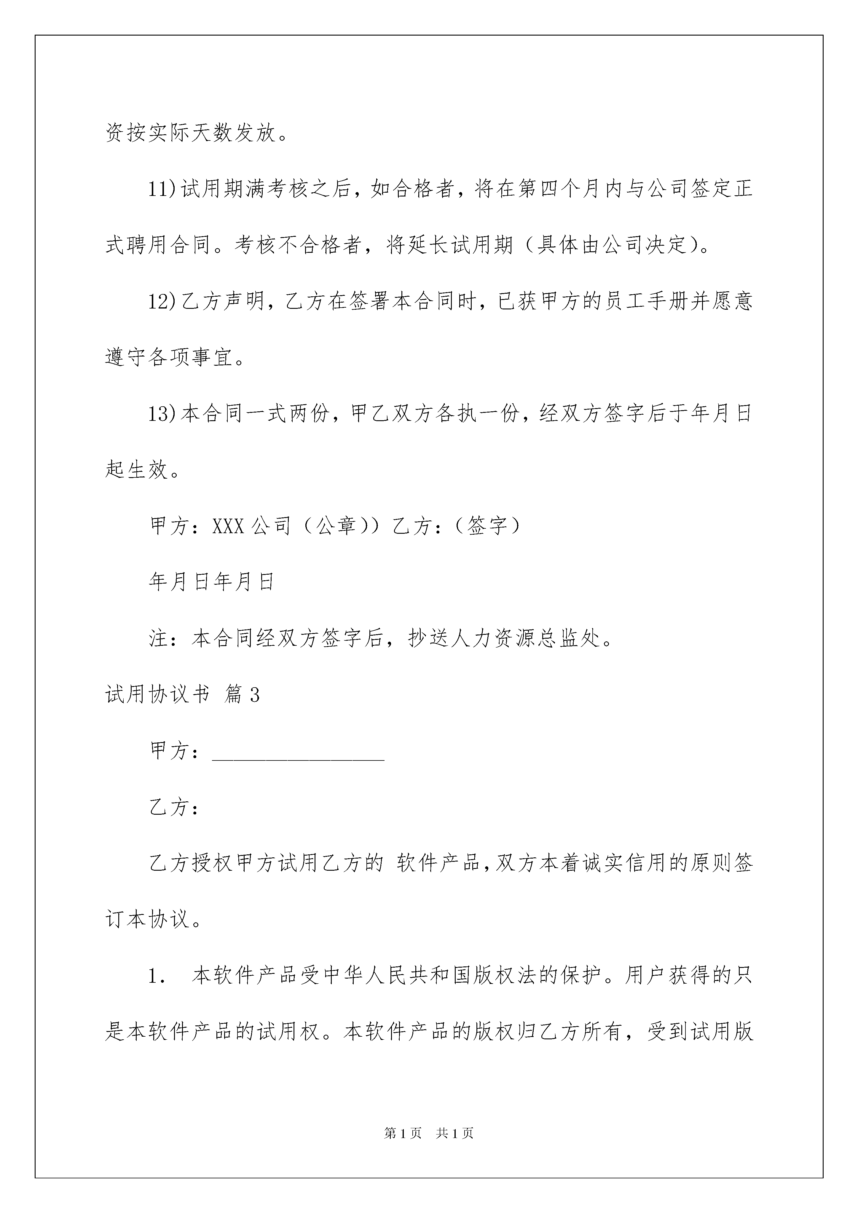 2022试用协议书汇总八篇试用协议书汇总八篇在现实社会中,人们运用到协议书的场合不断增多,协议书对双方的事务履行起到积极作用。那么写协议书真的很难吗?下面是我帮大家整理的试用协议书8篇,欢迎阅读,希望大家能够喜欢。试用协议书篇1甲方(用人单位):__________乙方(员工):__________一、甲乙双方按照平等自愿、协商一致的原则,就试用期期间的有关事项订立本协议,共同遵照执行本协议各项内容。二、根据员工与公司签订的劳动合同,试用期将于____年____月____日结束。三、经行改人力资源中心调查考核,综合考核结果与实际表现,未能达到公司要求,因此根据《劳动民法典》第十九条相关规定,延长员工试用期____个月,直至____年____月____日止,在____部门任职,甲方可根据工作需要及乙方的工作能力对其岗位进行训整,以作深入考核。四、其地:__________1、乙方享受公司试用期工资待造:__________2、乙方应自觉遵守国家法律法规及甲方的各项规章制度中,如有违反或经试用发现不符合岗位任职要求者,甲方有权调离乙方现工作岗位或解除试用协议:__________3、乙方在试用期内提出离职,不享受其他津贴,工资按实际出勤天数结算,并按公司薪酬福利制度执行:__________4、乙方在试用期期间不符合录用条件的,甲方可以随时解除试用期协议;5、乙方试用期满,经甲方考核合格后,享受正式员工待遇,6、本协议均属双方自愿接受,并于本协议上签名确认,行改人力资源中心留存备档。7、本协议一式贰份,员工本人一份,行政人力资源中心留存一份。甲方(用人单位):__________乙方(员工):__________日期:__________日期:__________试用协议书篇2甲方:XXX公司乙方:--------甲方聘用乙方为试用期员工,试用期三个月。经双方平等协商,同意约定下属条款,以共同遵守。1)乙方应遵守甲方的管理规定及制度。2)乙方的职务或工种为:________________3)乙方受聘于甲方期间,应根据甲方工作安排,履行职责。4)甲方应按月支付乙方报酬。5)甲方在试用期内,凡是请假均按实际天数扣除工资。6)乙方在试用期内,除工资外,不享受本公司的任何福利待遇。7)乙方每月工资由甲方自上班之日起的次月第10日发放,若工资发放日恰逢周日或假日,甲方可提前或推后发放。8)乙方提出解除本合同时,须提前一周通知甲方,否则,将根据具体情况,由人力资源总监决定论处程度。9)乙方如在报到后的第一周内提出辞职甲方将不发给乙方任何报酬。10)甲方如认为乙方工作成绩欠佳,可随时停止试用予以解雇。工资按实际天数发放。11)试用期满考核之后,如合格者,将在第四个月内与公司签定正式聘用合同。考核不合格者,将延长试用期(具体由公司决定)。12)乙方声明,乙方在签署本合同时,已获甲方的员工手册并愿意遵守各项事宜。13)本合同一式两份,甲乙双方各执一份,经双方签字后于年月日起生效。甲方:XXX公司(公章))乙方:(签字)年月日年月日注:本合同经双方签字后,抄送人力资源总监处。试用协议书篇3甲方:________________乙方:乙方授权甲方试用乙方的软件产品,双方本着诚实信用的原则签订本协议。1.本软件产品受中华人民共和国版权法的保护。用户获得的只是本软件产品的试用权。本软件产品的版权归乙方所有,受到试用版权法及其他知识产权法及条约的保护。2.乙方免费提供试用版软件给甲方使用,试用期内不收费用。3.在签订试用协议后,乙方将(远程)指导甲方安装、调试。4.甲方不能以任何理由对乙方提供的软件进行破解、反编译等窃取乙方软件技术资料的操作,否则视为对乙方的侵权。5.甲乙双方签订软件试用协议后,乙方免费为甲方提供技术支持,主要形式为通过接听电话、Email、QQ、MSN交流。6.使用本软件产品的'试用版本由甲方承担风险,在适用法律允许的最大范围内,乙方在任何情况下不就因使用或不能使用本软件产品的试用版本所发生的特殊的、意外的、直接或间接的损失承担任何责任。7.软件试用期满,甲方可以选择与乙方签订合作协议或购买乙方的正式软件,否则甲方必须彻底删除乙方提供的试用版软件及其备份。8.甲方不得以任何形式将乙方产品提供给第三方。9.对任何违反以上约定,造成受害方损失的,乙方有权有追究甲方法律责任。10.试用期满,本协议自动终止。11.本协议一式两份,双方各执一份。双方在本协议上签字盖章,本协议生效。甲方(签章):乙方(签章):日期:日期:编号:试用协议书篇4甲方:xxx乙方:xxx就xxx用户试用事宜,甲乙双