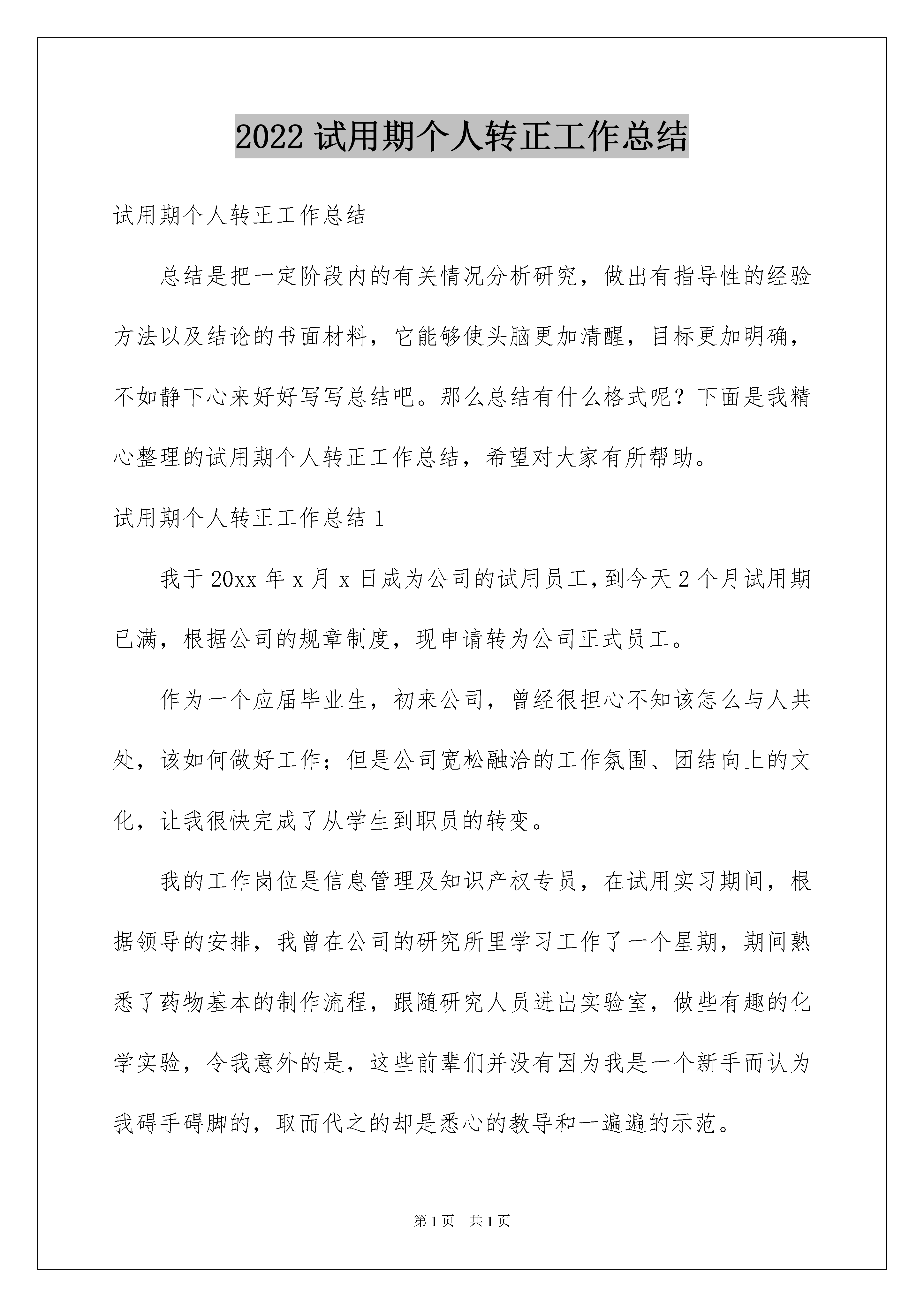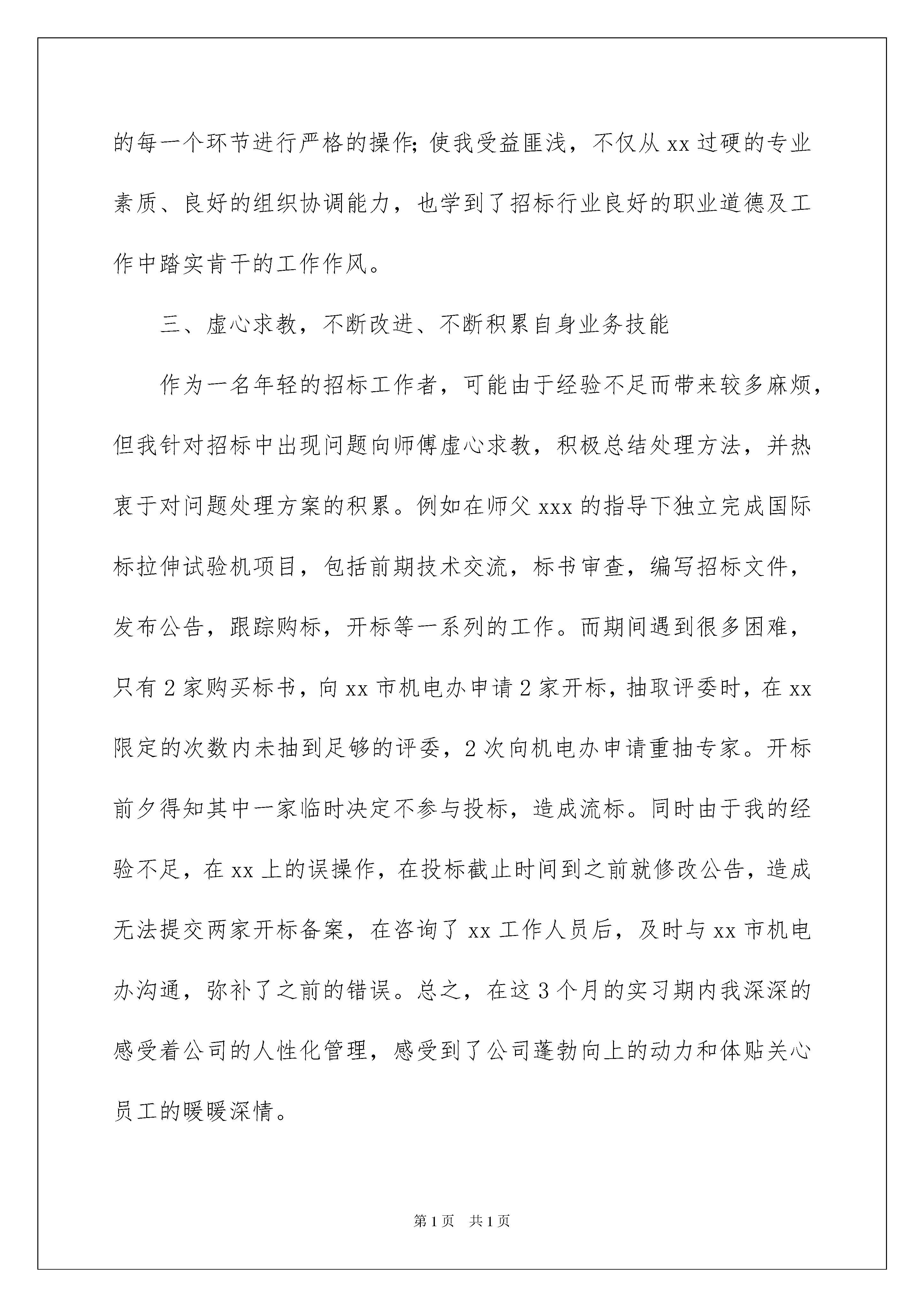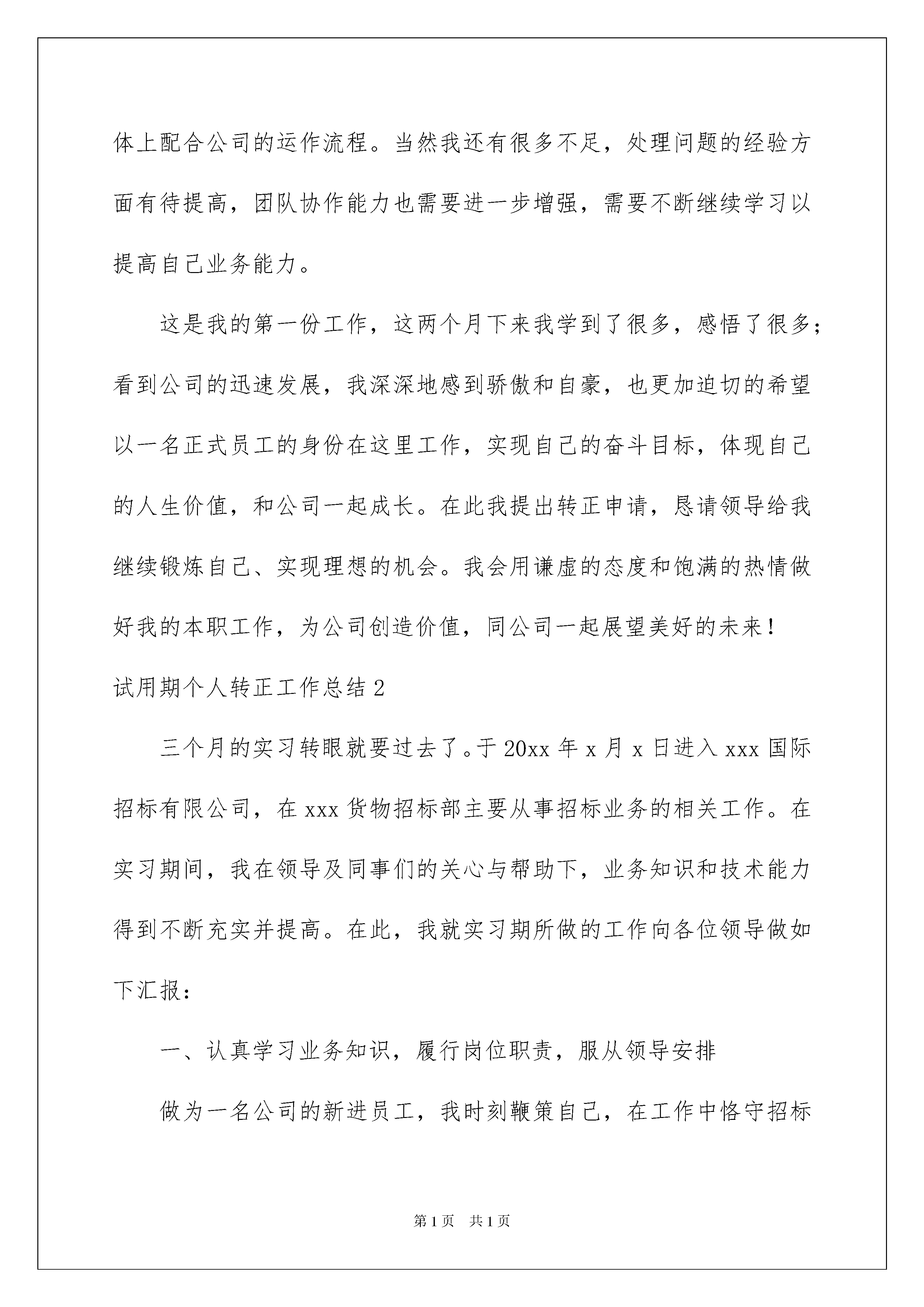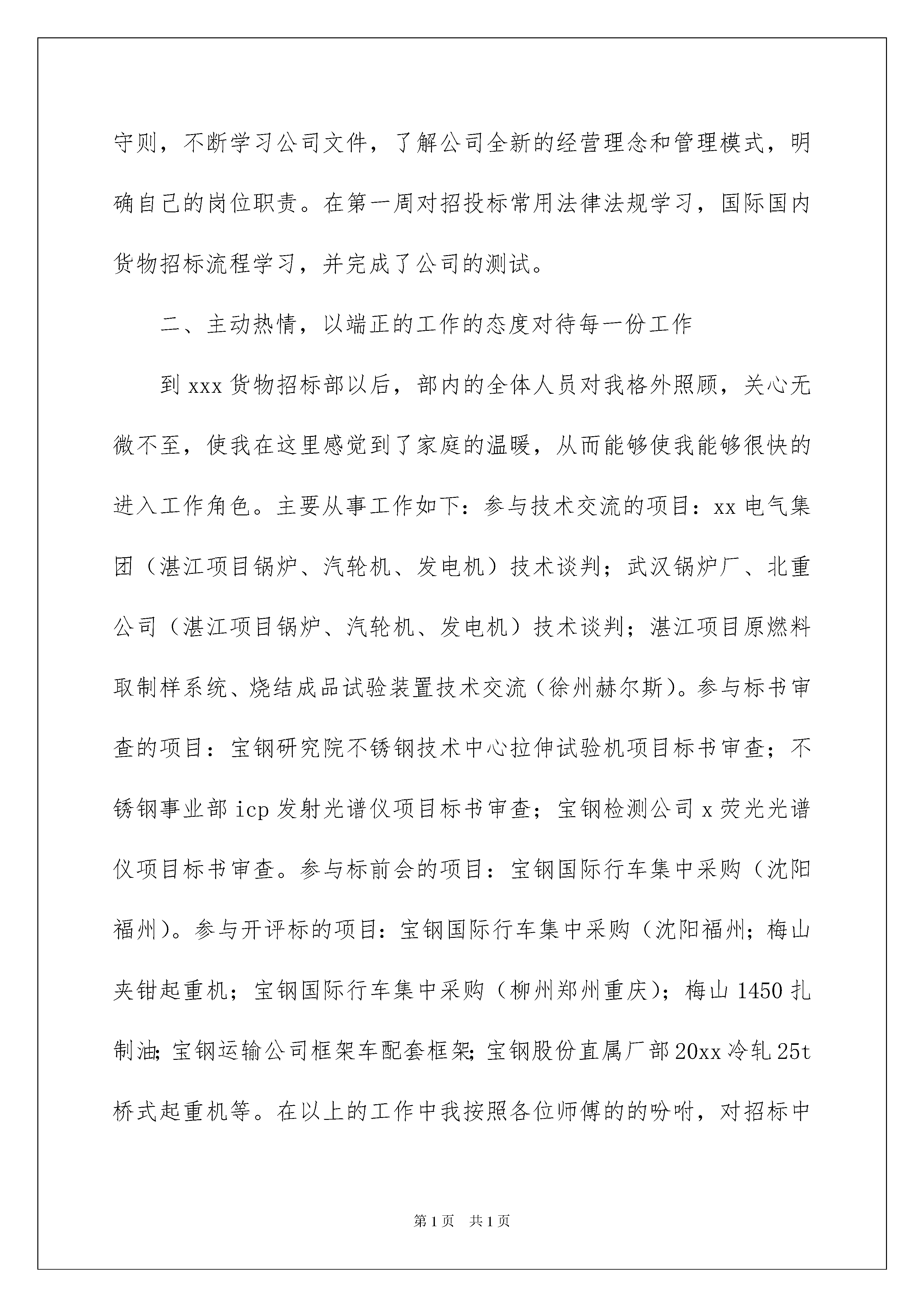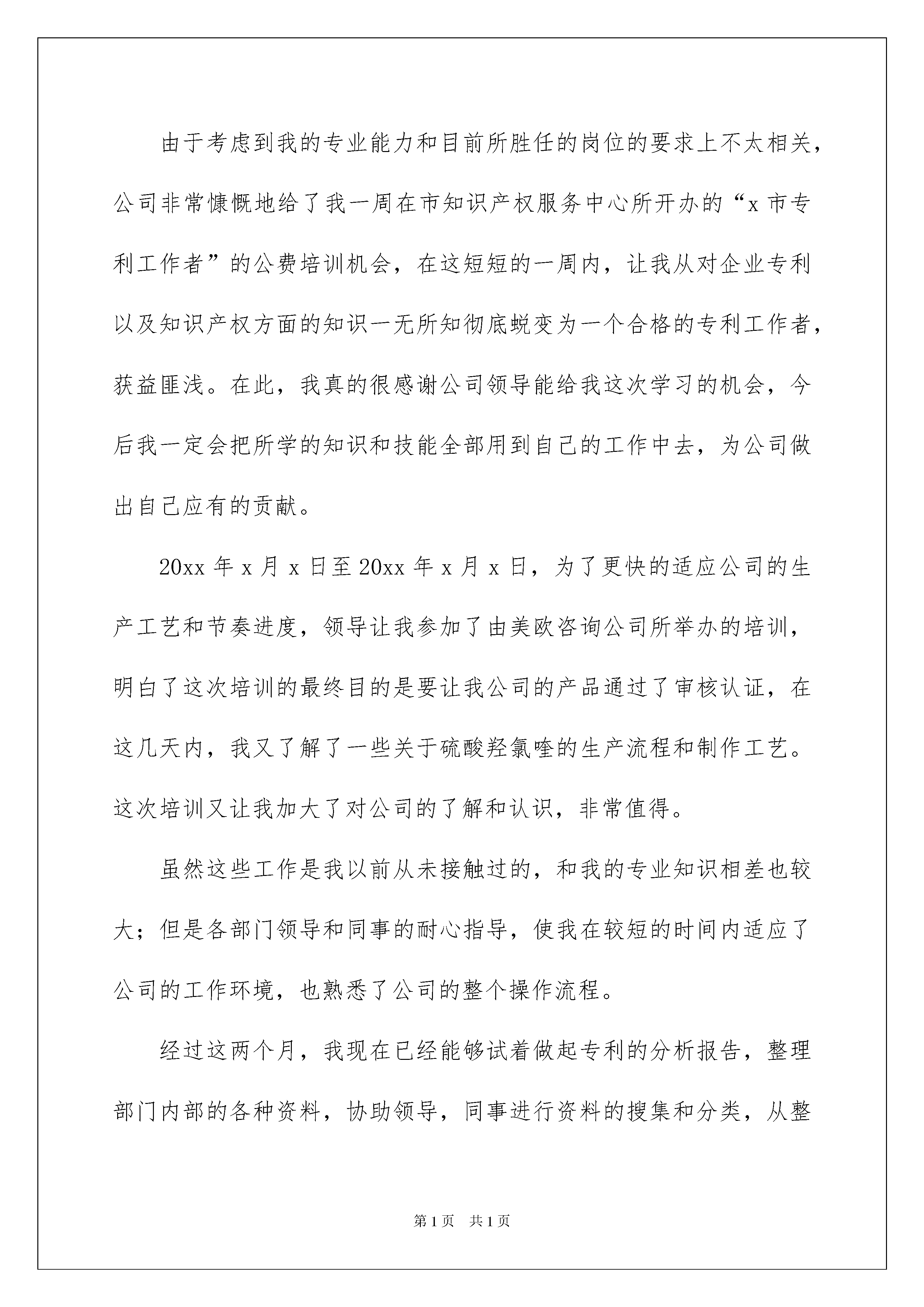 2022试用期个人转正工作总结试用期个人转正工作总结总结是把一定阶段内的有关情况分析研究,做出有指导性的经验方法以及结论的书面材料,它能够使头脑更加清醒,目标更加明确,不如静下心来好好写写总结吧。那么总结有什么格式呢?下面是我精心整理的试用期个人转正工作总结,希望对大家有所帮助。试用期个人转正工作总结1我于20xx年x月x日成为公司的试用员工,到今天2个月试用期已满,根据公司的规章制度,现申请转为公司正式员工。作为一个应届毕业生,初来公司,曾经很担心不知该怎么与人共处,该如何做好工作;但是公司宽松融洽的工作氛围、团结向上的文化,让我很快完成了从学生到职员的转变。我的工作岗位是信息管理及知识产权专员,在试用实习期间,根据领导的安排,我曾在公司的研究所里学习工作了一个星期,期间熟悉了药物基本的制作流程,跟随研究人员进出实验室,做些有趣的化学实验,令我意外的是,这些前辈们并没有因为我是一个新手而认为我碍手碍脚的,取而代之的却是悉心的教导和一遍遍的示范。由于考虑到我的专业能力和目前所胜任的岗位的要求上不太相关,公司非常慷慨地给了我一周在市知识产权服务中心所开办的“x市专利工作者”的公费培训机会,在这短短的一周内,让我从对企业专利以及知识产权方面的知识一无所知彻底蜕变为一个合格的专利工作者,获益匪浅。在此,我真的很感谢公司领导能给我这次学习的机会,今后我一定会把所学的知识和技能全部用到自己的工作中去,为公司做出自己应有的贡献。20xx年x月x日至20xx年x月x日,为了更快的适应公司的生产工艺和节奏进度,领导让我参加了由美欧咨询公司所举办的培训,明白了这次培训的最终目的是要让我公司的产品通过了审核认证,在这几天内,我又了解了一些关于硫酸羟氯喹的生产流程和制作工艺。这次培训又让我加大了对公司的了解和认识,非常值得。虽然这些工作是我以前从未接触过的,和我的专业知识相差也较大;但是各部门领导和同事的耐心指导,使我在较短的时间内适应了公司的工作环境,也熟悉了公司的整个操作流程。经过这两个月,我现在已经能够试着做起专利的分析报告,整理部门内部的各种资料,协助领导,同事进行资料的搜集和分类,从整体上配合公司的运作流程。当然我还有很多不足,处理问题的经验方面有待提高,团队协作能力也需要进一步增强,需要不断继续学习以提高自己业务能力。这是我的第一份工作,这两个月下来我学到了很多,感悟了很多;看到公司的迅速发展,我深深地感到骄傲和自豪,也更加迫切的希望以一名正式员工的身份在这里工作,实现自己的奋斗目标,体现自己的人生价值,和公司一起成长。在此我提出转正申请,恳请领导给我继续锻炼自己、实现理想的机会。我会用谦虚的态度和饱满的热情做好我的本职工作,为公司创造价值,同公司一起展望美好的未来!试用期个人转正工作总结2三个月的实习转眼就要过去了。于20xx年x月x日进入xxx国际招标有限公司,在xxx货物招标部主要从事招标业务的相关工作。在实习期间,我在领导及同事们的关心与帮助下,业务知识和技术能力得到不断充实并提高。在此,我就实习期所做的工作向各位领导做如下汇报:一、认真学习业务知识,履行岗位职责,服从领导安排做为一名公司的新进员工,我时刻鞭策自己,在工作中恪守招标守则,不断学习公司文件,了解公司全新的经营理念和管理模式,明确自己的岗位职责。在第一周对招投标常用法律法规学习,国际国内货物招标流程学习,并完成了公司的测试。二、主动热情,以端正的工作的态度对待每一份工作到xxx货物招标部以后,部内的全体人员对我格外照顾,关心无微不至,使我在这里感觉到了家庭的温暖,从而能够使我能够很快的进入工作角色。主要从事工作如下:参与技术交流的项目:xx电气集团(湛江项目锅炉、汽轮机、发电机)技术谈判;武汉锅炉厂、北重公司(湛江项目锅炉、汽轮机、发电机)技术谈判;湛江项目原燃料取制样系统、烧结成品试验装置技术交流(徐州赫尔斯)。参与标书审查的项目:宝钢研究院不锈钢技术中心拉伸试验机项目标书审查;不锈钢事业部icp发射光谱仪项目标书审查;宝钢检测公司x荧光光谱仪项目标书审查。参与标前会的项目:宝钢国际行车集中采购(沈阳福州)。参与开评标的项目:宝钢国际行车集中采购(沈阳福州;梅山夹钳起重机;宝钢国际行车集中采购(柳州郑州重庆);梅山1450扎制油;宝钢运输公司框架车配套框架;宝钢股份直属厂部20xx冷轧25t桥式起重机等。在以上的工作中我按照各位师傅的的吩咐,对招标中的每一个环节进行严格的操作;使我受益匪浅,不仅从xx过硬的专业素质、良好的组织协调能力,也学到了招标行业良好的职业道德及工作中踏实肯干的工作作风。三、虚心求教,不