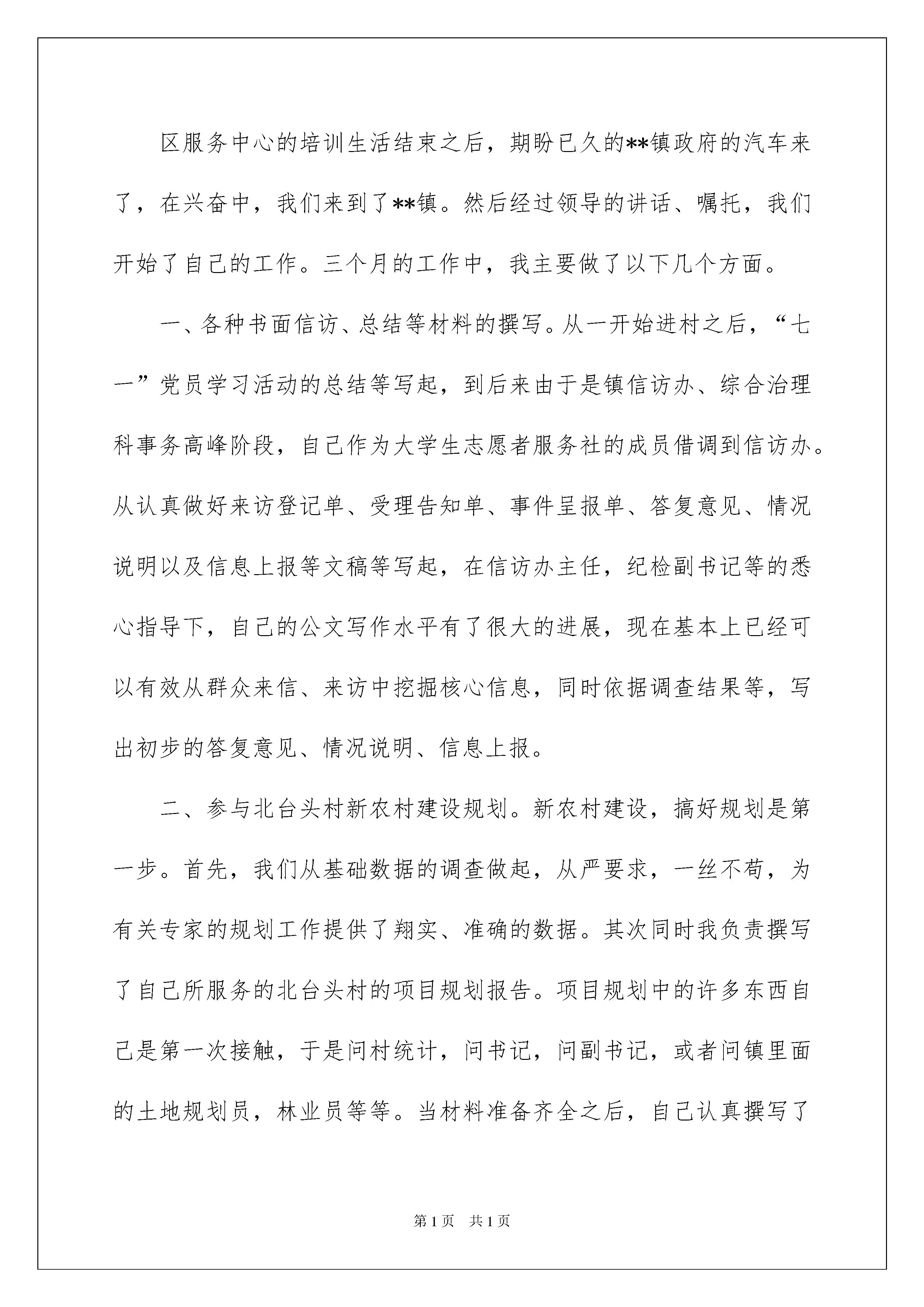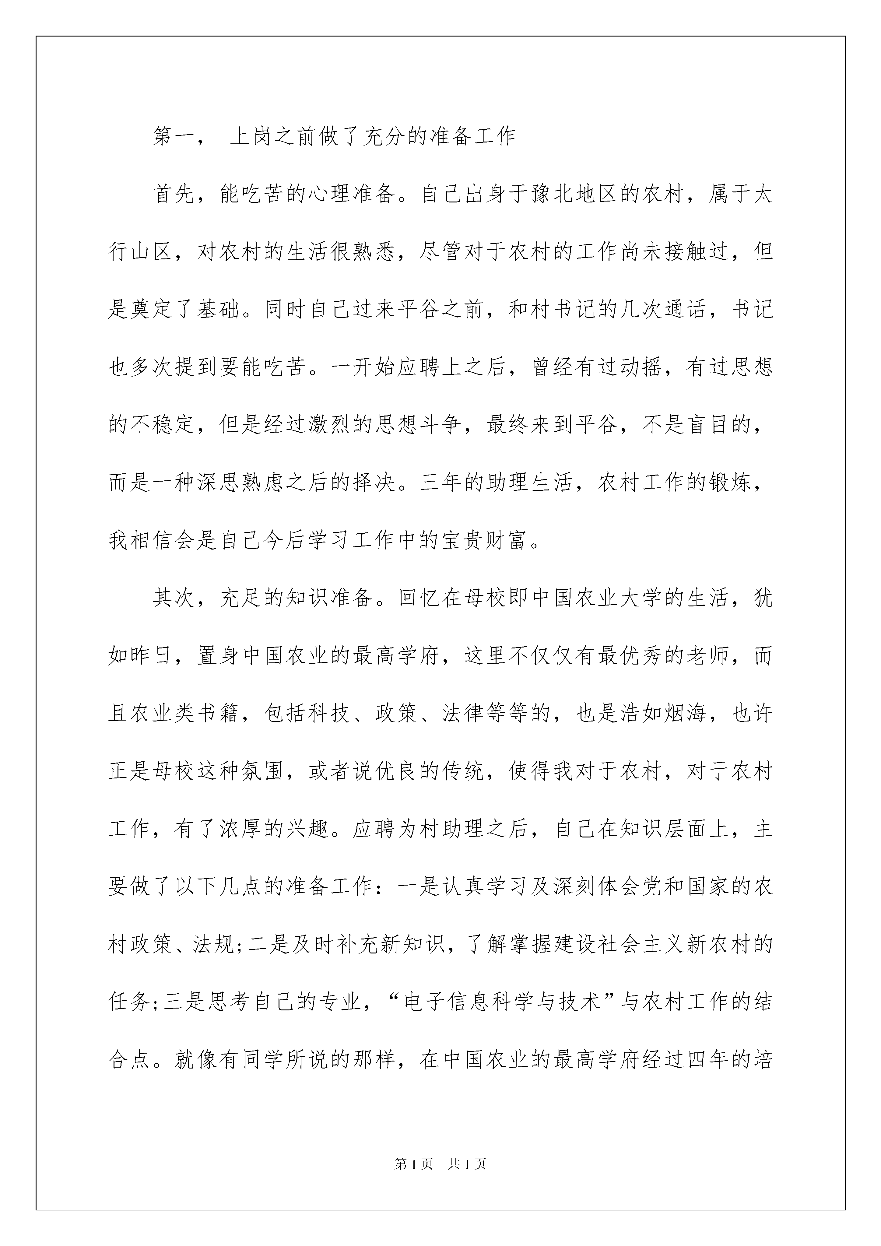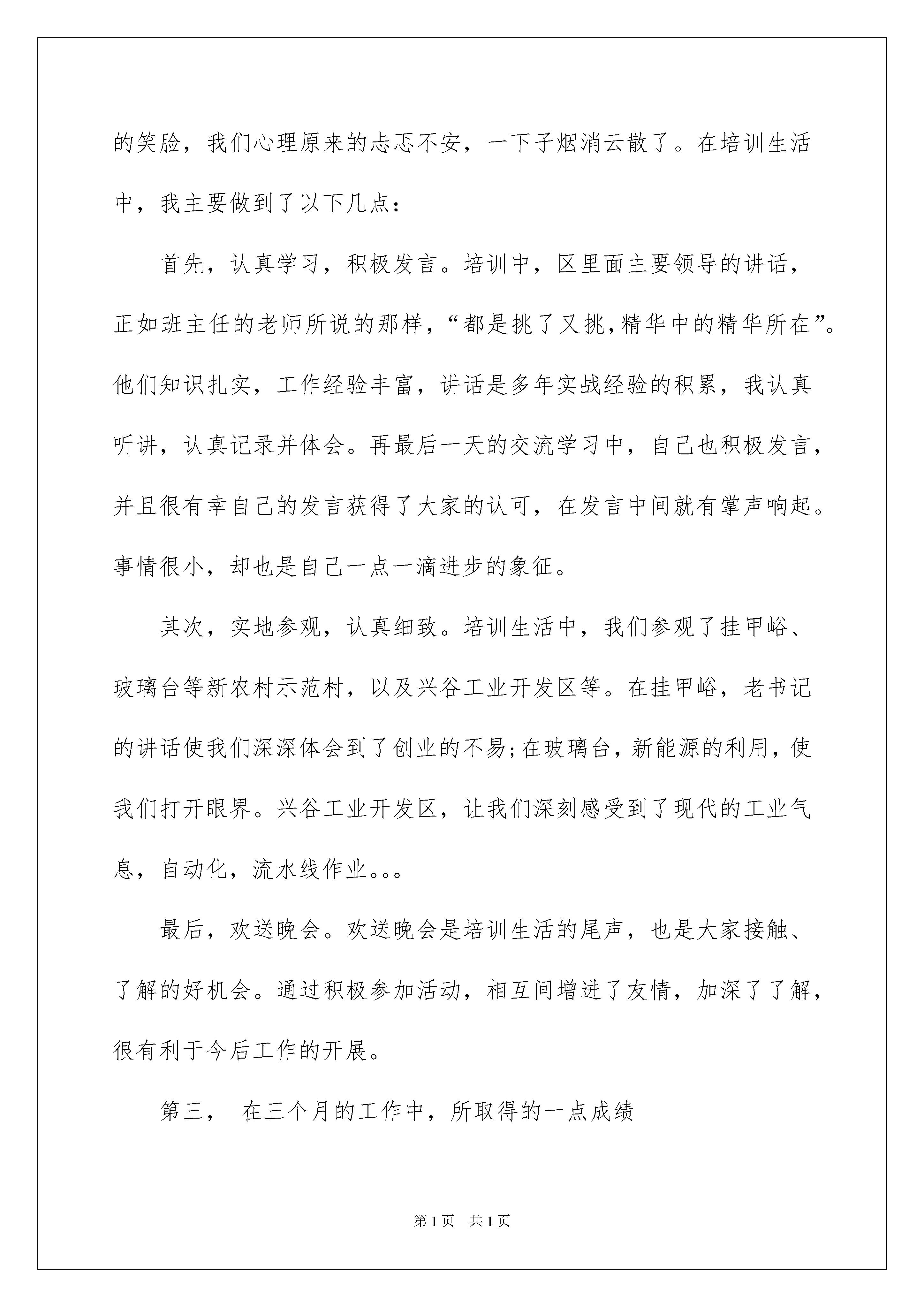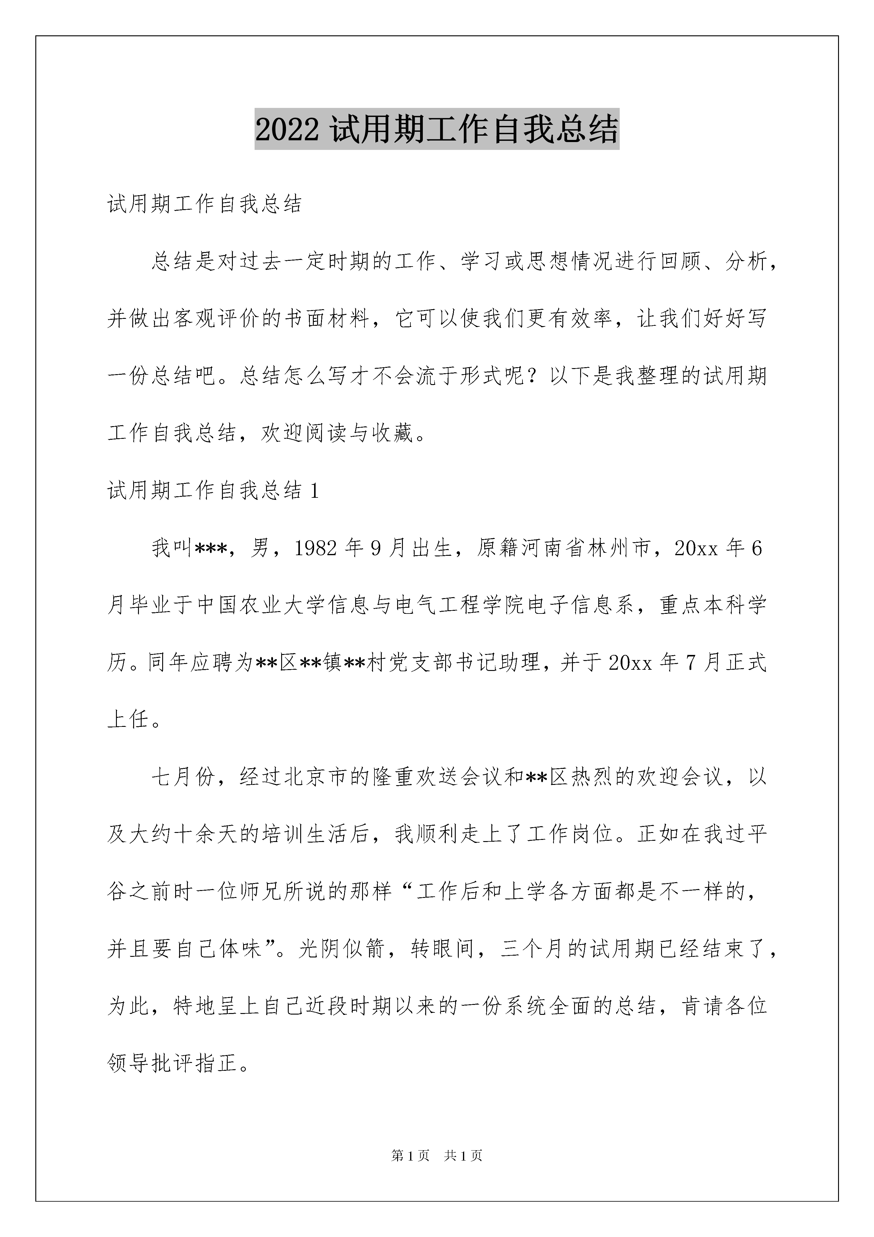 2022试用期工作自我总结试用期工作自我总结总结是对过去一定时期的工作、学习或思想情况进行回顾、分析,并做出客观评价的书面材料,它可以使我们更有效率,让我们好好写一份总结吧。总结怎么写才不会流于形式呢?以下是我整理的试用期工作自我总结,欢迎阅读与收藏。试用期工作自我总结1我叫***,男,1982年9月出生,原籍河南省林州市,20xx年6月毕业于中国农业大学信息与电气工程学院电子信息系,重点本科学历。同年应聘为**区**镇**村党支部书记助理,并于20xx年7月正式上任。七月份,经过北京市的隆重欢送会议和**区热烈的欢迎会议,以及大约十余天的培训生活后,我顺利走上了工作岗位。正如在我过平谷之前时一位师兄所说的那样“工作后和上学各方面都是不一样的,并且要自己体味”。光阴似箭,转眼间,三个月的试用期已经结束了,为此,特地呈上自己近段时期以来的一份系统全面的总结,肯请各位领导批评指正。第一,上岗之前做了充分的准备工作首先,能吃苦的心理准备。自己出身于豫北地区的农村,属于太行山区,对农村的生活很熟悉,尽管对于农村的工作尚未接触过,但是奠定了基础。同时自己过来平谷之前,和村书记的几次通话,书记也多次提到要能吃苦。一开始应聘上之后,曾经有过动摇,有过思想的不稳定,但是经过激烈的思想斗争,最终来到平谷,不是盲目的,而是一种深思熟虑之后的择决。三年的助理生活,农村工作的锻炼,我相信会是自己今后学习工作中的宝贵财富。其次,充足的知识准备。回忆在母校即中国农业大学的生活,犹如昨日,置身中国农业的最高学府,这里不仅仅有最优秀的老师,而且农业类书籍,包括科技、政策、法律等等的,也是浩如烟海,也许正是母校这种氛围,或者说优良的传统,使得我对于农村,对于农村工作,有了浓厚的兴趣。应聘为村助理之后,自己在知识层面上,主要做了以下几点的准备工作:一是认真学习及深刻体会党和国家的农村政策、法规;二是及时补充新知识,了解掌握建设社会主义新农村的任务;三是思考自己的专业,“电子信息科学与技术”与农村工作的结合点。就像有同学所说的那样,在中国农业的最高学府经过四年的培训学习,我们的信息类专业也是具有中国农业大学特色的。再次,完善的物质准备。来到平谷之前,也像去其他单位工作的同学一样,自己憧憬着未来的生活,宿舍会是什么样的?和领导的相处会不会顺利和谐?自己手边还缺少哪些东西?等等,列出了购买清单,换洗的衣物,日用品等。在准备的诸多东西之中,最重要的莫过于书籍的准备工作了,公文写作,网页制作,演讲与口才,等等。这些书籍事后证明,在自己的日常工作中,如同及时雨。自己如饥似渴的阅读书籍,为自己补充了充分的养分,使得自己的各方面工作可以更快的上手。最后,信息资源的准备。20世纪是信息技术高发展的世纪,步入新世纪之后,信息技术任在高速的发展,信息类专业出身的自己,可能对此有着更多的关注。为此,包括在内的人际资源的准备,尤其学校的老师和同学,老师的谆谆教导,同学的深情祝福。困了,累了,工作迷茫了,找人聊聊,豁然开朗,一切原来这么简单哦。雨过天晴。第二,培训生活通过多种途径积极融入大家庭之中七月初,带着母校的嘱托,怀着对母校的依依不舍,校车送我们来到了平谷。节奏紧张而又有条不紊,迎接我们的是一张张和蔼可亲的笑脸,我们心理原来的忐忑不安,一下子烟消云散了。在培训生活中,我主要做到了以下几点:首先,认真学习,积极发言。培训中,区里面主要领导的讲话,正如班主任的老师所说的那样,“都是挑了又挑,精华中的精华所在”。他们知识扎实,工作经验丰富,讲话是多年实战经验的积累,我认真听讲,认真记录并体会。再最后一天的交流学习中,自己也积极发言,并且很有幸自己的发言获得了大家的认可,在发言中间就有掌声响起。事情很小,却也是自己一点一滴进步的象征。其次,实地参观,认真细致。培训生活中,我们参观了挂甲峪、玻璃台等新农村示范村,以及兴谷工业开发区等。在挂甲峪,老书记的讲话使我们深深体会到了创业的不易;在玻璃台,新能源的利用,使我们打开眼界。兴谷工业开发区,让我们深刻感受到了现代的工业气息,自动化,流水线作业。。。最后,欢送晚会。欢送晚会是培训生活的尾声,也是大家接触、了解的好机会。通过积极参加活动,相互间增进了友情,加深了了解,很有利于今后工作的开展。第三,在三个月的工作中,所取得的一点成绩区服务中心的培训生活结束之后,期盼已久的**镇政府的汽车来了,在兴奋中,我们来到了**镇。然后经过领导的讲话、嘱托,我们开始了自己的工作。三个月的工作中,我主要做了以下几个方面。一、各种书面信访、总结等材料的撰写。从一开始进村之后,“七一”党员学习活动的总结等写起,到