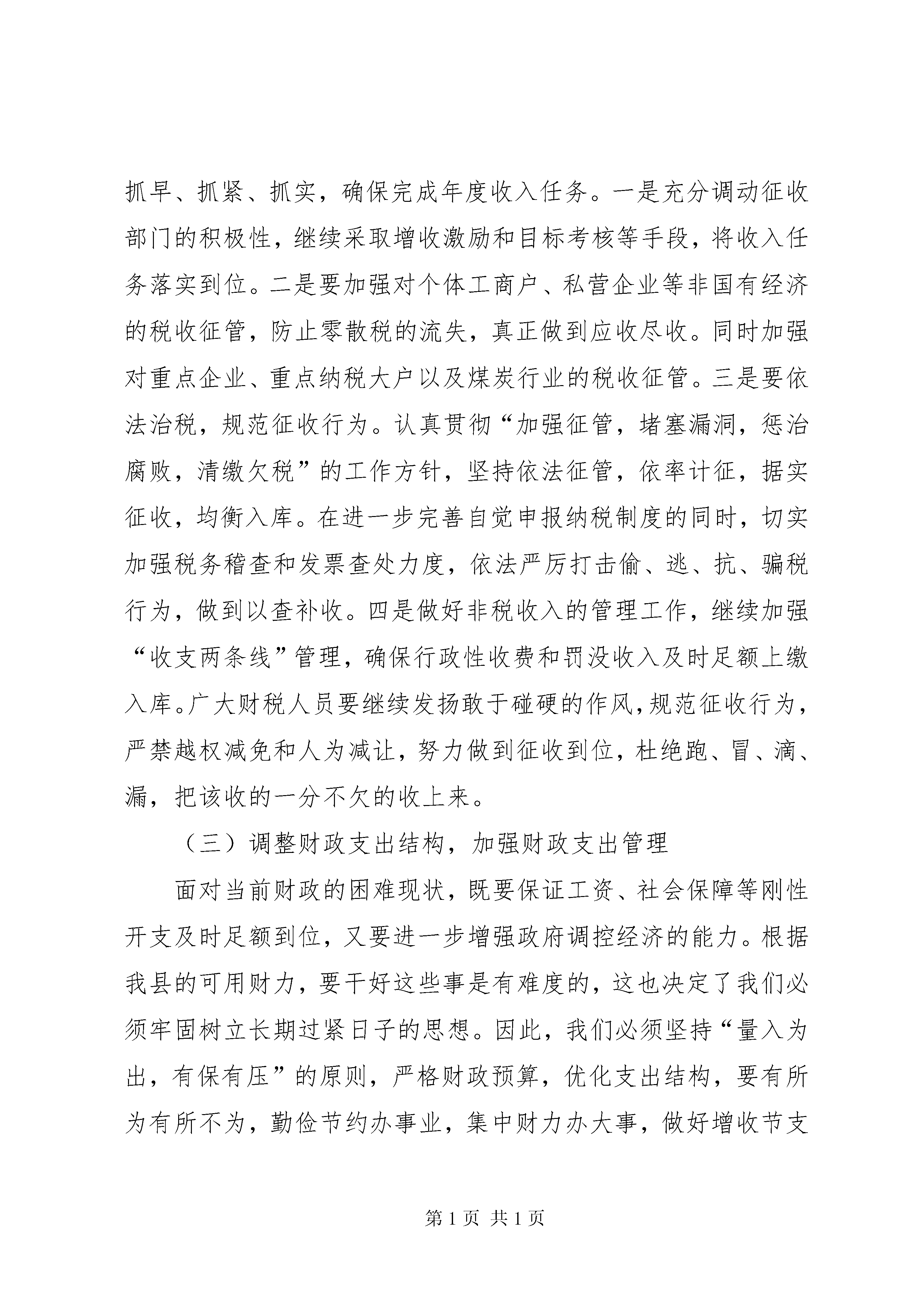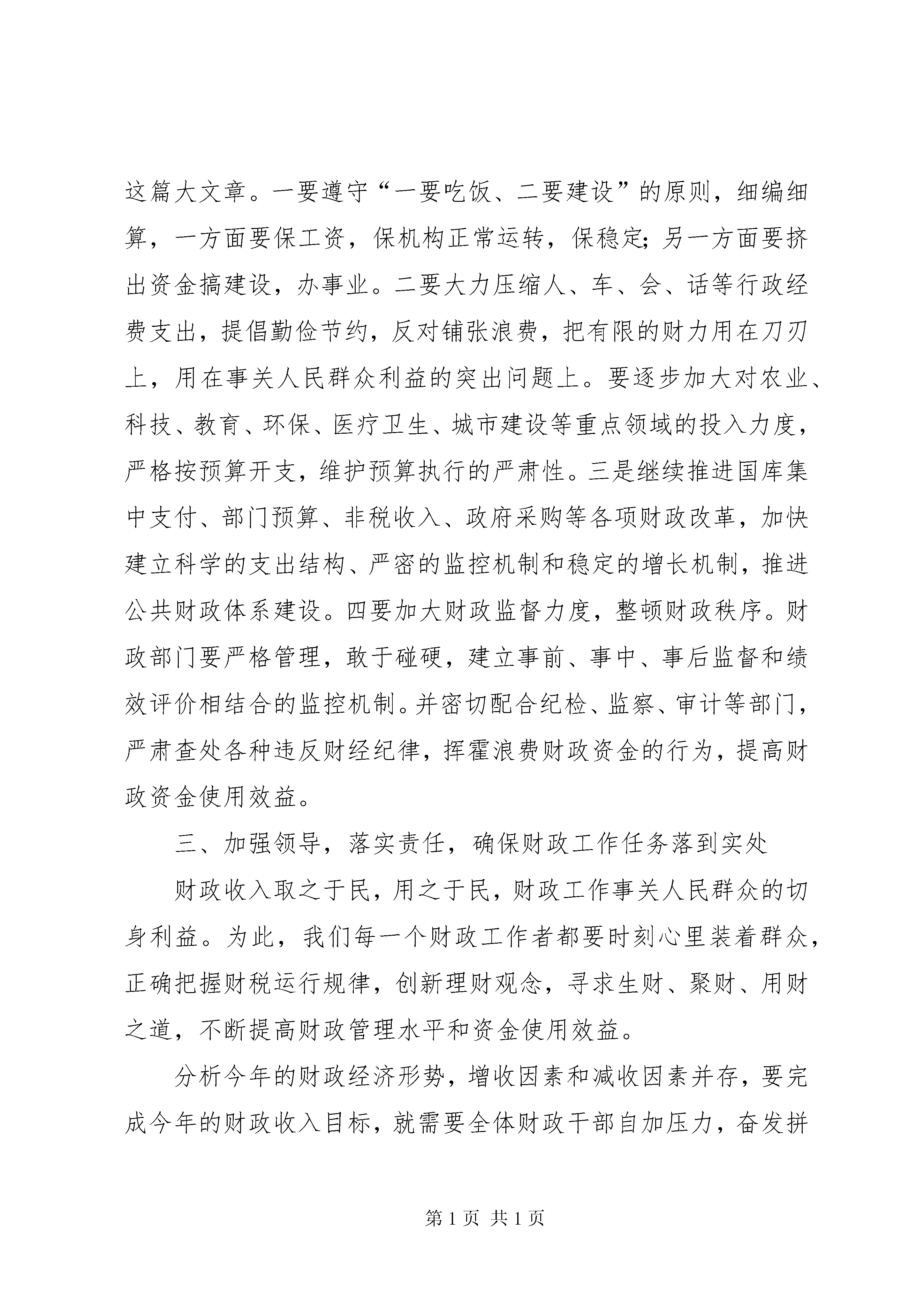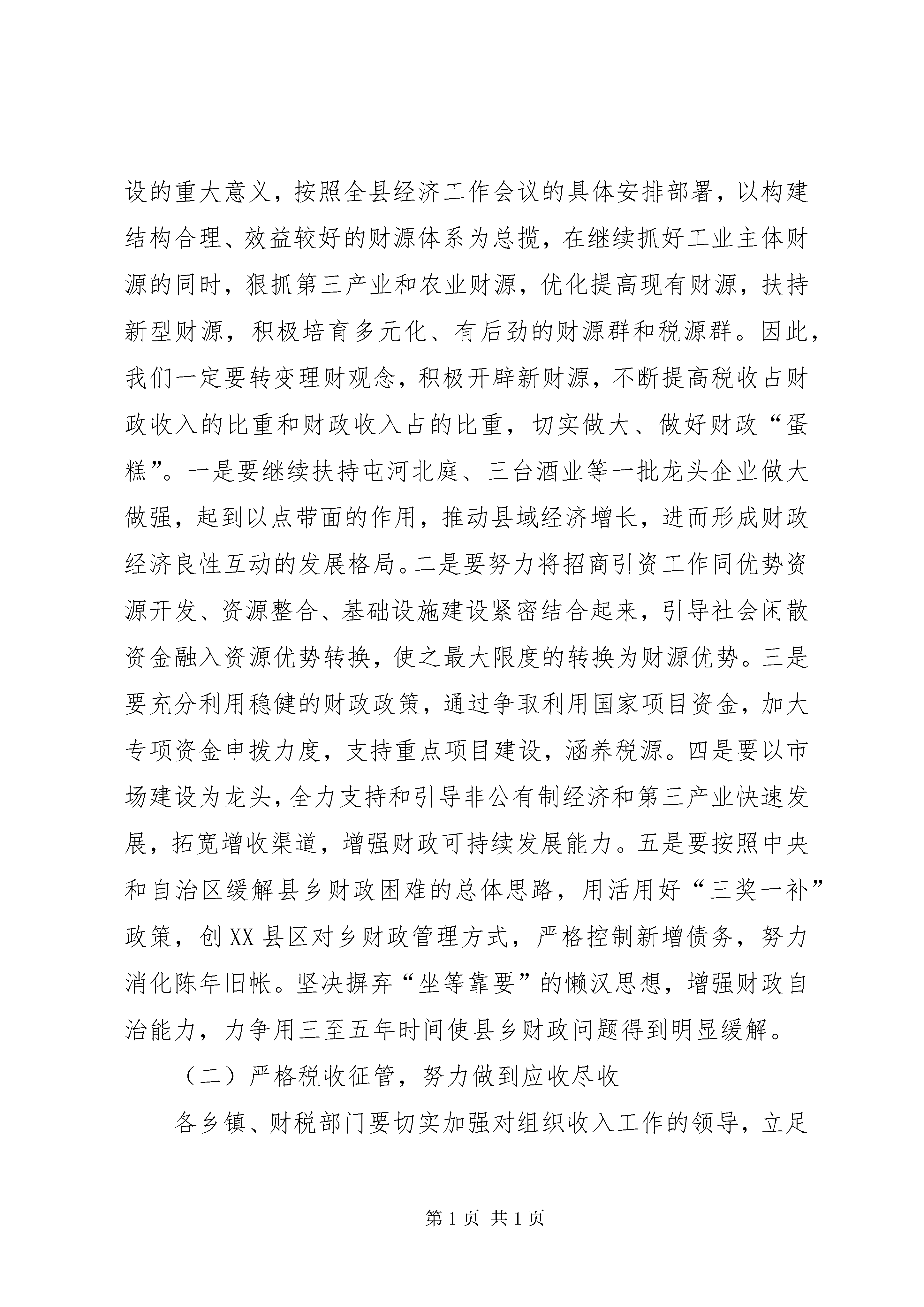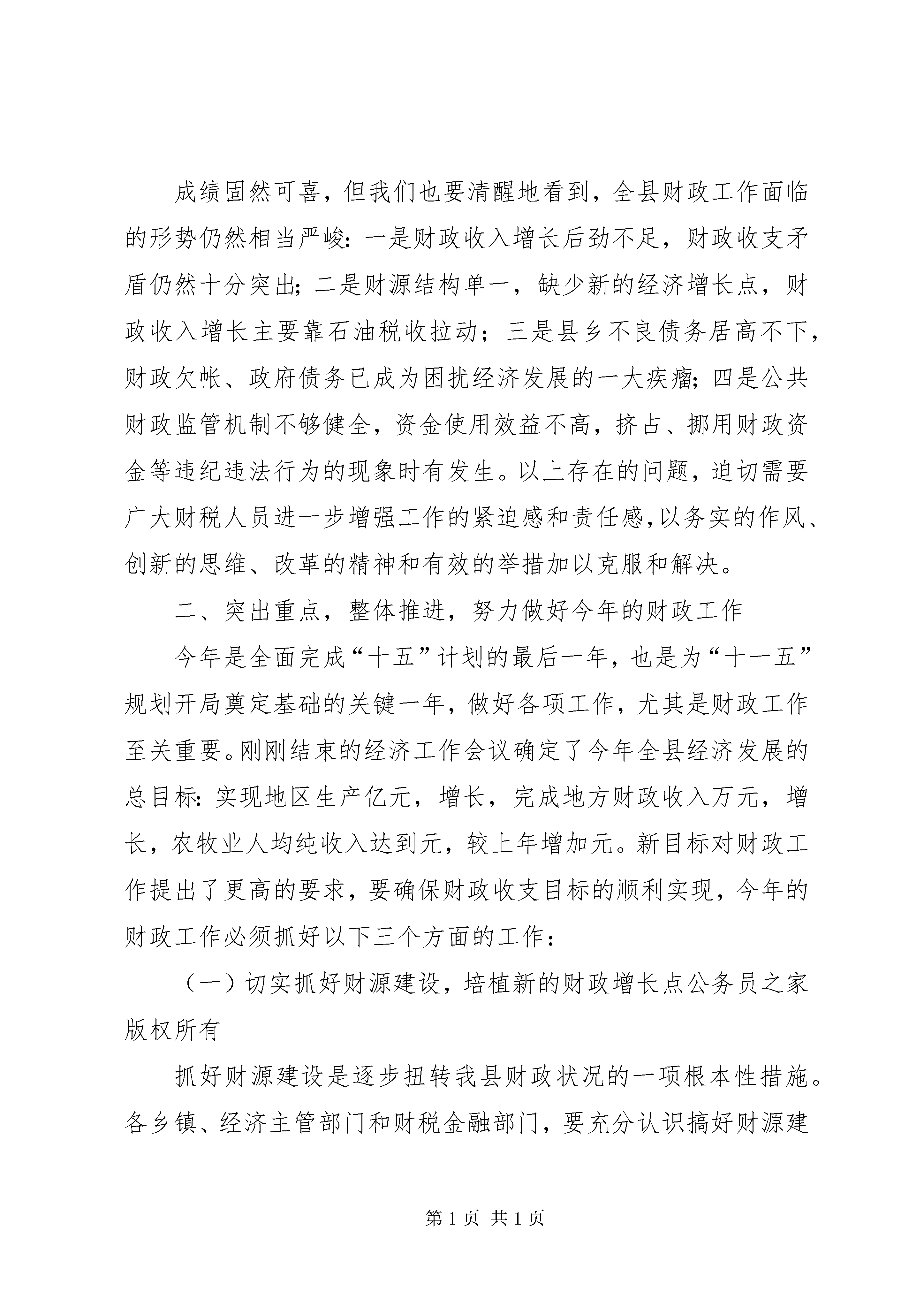 县长在财政工作会议上的讲话在财政工作会议上的讲话同志们:今天我们召开这次会议,主要目的是为了回顾总结××年的财政工作,进一步理清今年的工作思路,明确目标任务,动员大家振奋精神,鼓足干劲,全面做好××年的财政工作。下面,我讲几点意见。一、认清形势,统一思想,进一步增强做好财政工作的紧迫感和责任感过去的一年是不平凡的一年,在金融趋紧和频繁发生自然灾害等诸多不利因素的影响下,县委、县人民政府团结带领各族干部群众,以昂扬的斗志采取有力措施、排难而进,取得了经济社会发展的新成就。国民经济快速发展,综合实力不断增强。财税部门在政策性减收因素增多的不利形势下,紧紧围绕“增加财政收入,增强财政实力”这一核心目标,创新理财机制,取得了可喜的成绩。全县实现地区生产总值(现价)亿元,同比增长;地方财政收入首次突破七千万大关,达万元,创历史最高纪录。财税部门为我县经济发展、社会稳定、深化改革做出了突出贡献,在此,我代表县委、县人民政府向奋斗在财税战线上的广大干部职工表示亲切的问候,向即将受到表彰的先进集体、先进个人表示热烈的祝贺。成绩固然可喜,但我们也要清醒地看到,全县财政工作面临的形势仍然相当严峻:一是财政收入增长后劲不足,财政收支矛盾仍然十分突出;二是财源结构单一,缺少新的经济增长点,财政收入增长主要靠石油税收拉动;三是县乡不良债务居高不下,财政欠帐、政府债务已成为困扰经济发展的一大疾瘤;四是公共财政监管机制不够健全,资金使用效益不高,挤占、挪用财政资金等违纪违法行为的现象时有发生。以上存在的问题,迫切需要广大财税人员进一步增强工作的紧迫感和责任感,以务实的作风、创新的思维、改革的精神和有效的举措加以克服和解决。二、突出重点,整体推进,努力做好今年的财政工作今年是全面完成“十五”计划的最后一年,也是为“十一五”规划开局奠定基础的关键一年,做好各项工作,尤其是财政工作至关重要。刚刚结束的经济工作会议确定了今年全县经济发展的总目标:实现地区生产亿元,增长,完成地方财政收入万元,增长,农牧业人均纯收入达到元,较上年增加元。新目标对财政工作提出了更高的要求,要确保财政收支目标的顺利实现,今年的财政工作必须抓好以下三个方面的工作:(一)切实抓好财源建设,培植新的财政增长点公务员之家版权所有抓好财源建设是逐步扭转我县财政状况的一项根本性措施。各乡镇、经济主管部门和财税金融部门,要充分认识搞好财源建设的重大意义,按照全县经济工作会议的具体安排部署,以构建结构合理、效益较好的财源体系为总揽,在继续抓好工业主体财源的同时,狠抓第三产业和农业财源,优化提高现有财源,扶持新型财源,积极培育多元化、有后劲的财源群和税源群。因此,我们一定要转变理财观念,积极开辟新财源,不断提高税收占财政收入的比重和财政收入占的比重,切实做大、做好财政“蛋糕”。一是要继续扶持屯河北庭、三台酒业等一批龙头企业做大做强,起到以点带面的作用,推动县域经济增长,进而形成财政经济良性互动的发展格局。二是要努力将招商引资工作同优势资源开发、资源整合、基础设施建设紧密结合起来,引导社会闲散资金融入资源优势转换,使之最大限度的转换为财源优势。三是要充分利用稳健的财政政策,通过争取利用国家项目资金,加大专项资金申拨力度,支持重点项目建设,涵养税源。四是要以市场建设为龙头,全力支持和引导非公有制经济和第三产业快速发展,拓宽增收渠道,增强财政可持续发展能力。五是要按照中央和自治区缓解县乡财政困难的总体思路,用活用好“三奖一补”政策,创XX县区对乡财政管理方式,严格控制新增债务,努力消化陈年旧帐。坚决摒弃“坐等靠要”的懒汉思想,增强财政自治能力,力争用三至五年时间使县乡财政问题得到明显缓解。(二)严格税收征管,努力做到应收尽收各乡镇、财税部门要切实加强对组织收入工作的领导,立足抓早、抓紧、抓实,确保完成年度收入任务。一是充分调动征收部门的积极性,继续采取增收激励和目标考核等手段,将收入任务落实到位。二是要加强对个体工商户、私营企业等非国有经济的税收征管,防止零散税的流失,真正做到应收尽收。同时加强对重点企业、重点纳税大户以及煤炭行业的税收征管。三是要依法治税,规范征收行为。认真贯彻“加强征管,堵塞漏洞,惩治腐败,清缴欠税”的工作方针,坚持依法征管,依率计征,据实征收,均衡入库。在进一步完善自觉申报纳税制度的同时,切实加强税务稽查和发票查处力度,依法严厉打击偷、逃、抗、骗税行为,做到以查补收。四是做好非税收入的管理工作,继续加强“收支两条线”管理,确保行政性收费和罚没收入及时足额上缴入库。广大财税人员要继续发扬敢于碰硬的作风,规范征收行为,严禁越权减免和人为减让,努力做到征收到位,杜绝跑、冒、滴、漏,把该收的一分不欠的收上来。(三)调整财政支出结构,加强财政支出管理面对当前财政的困难现状,