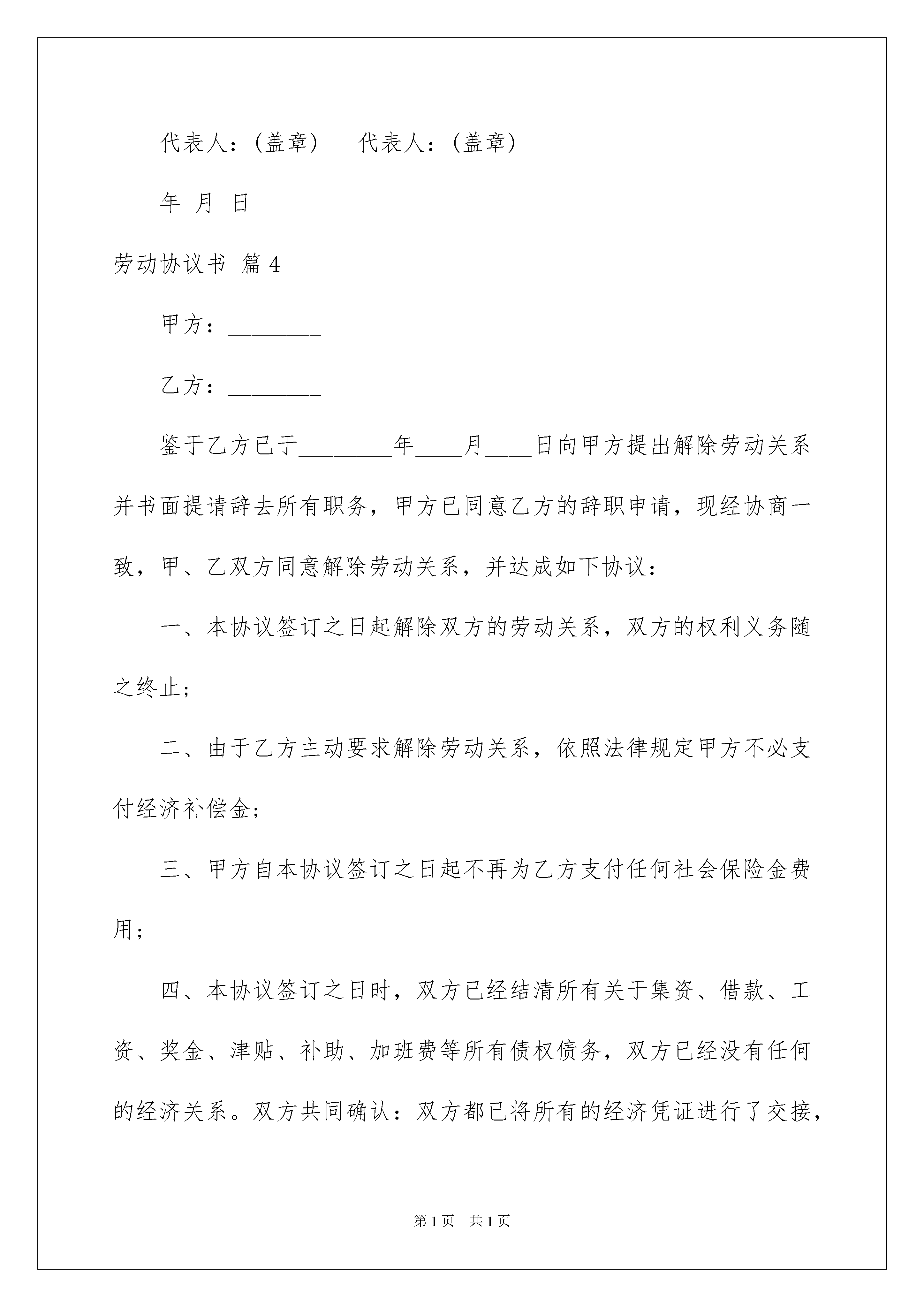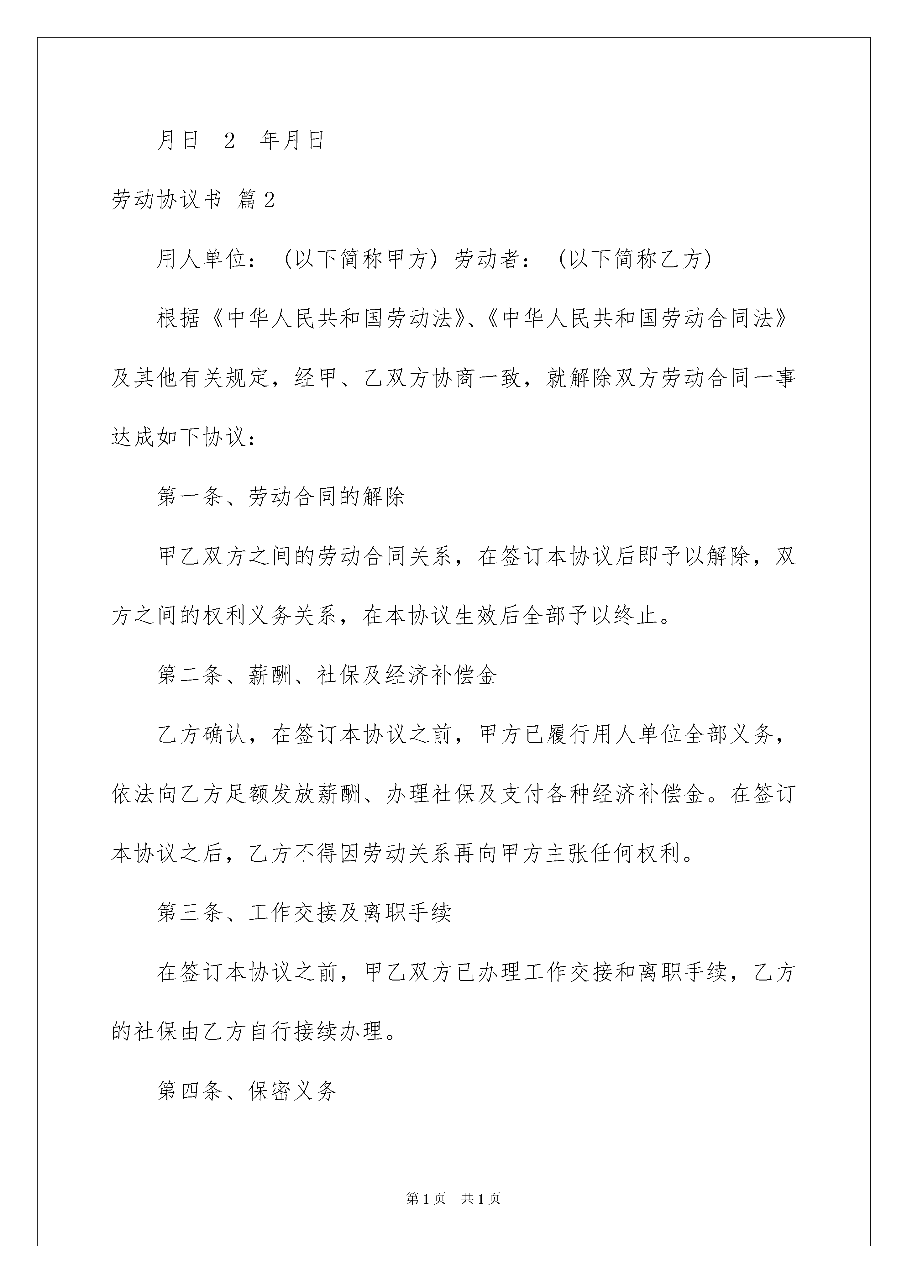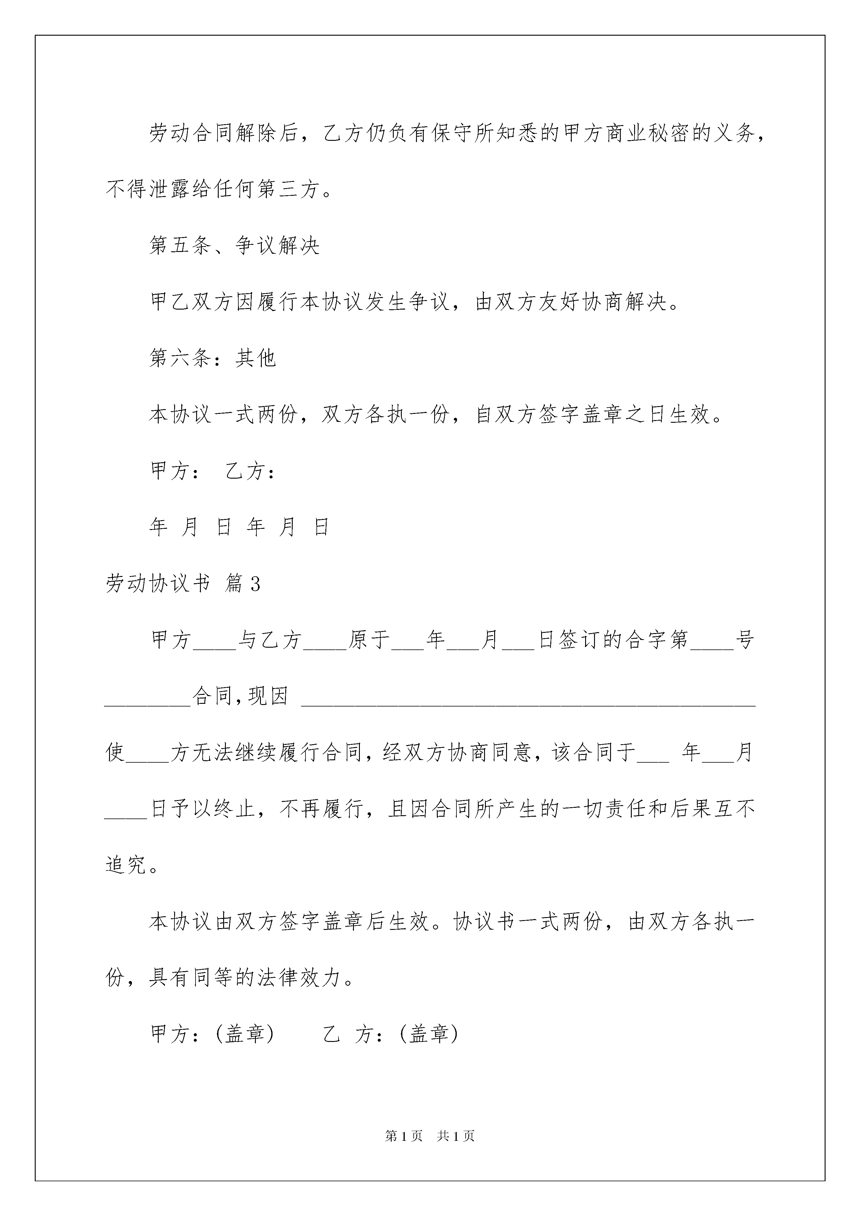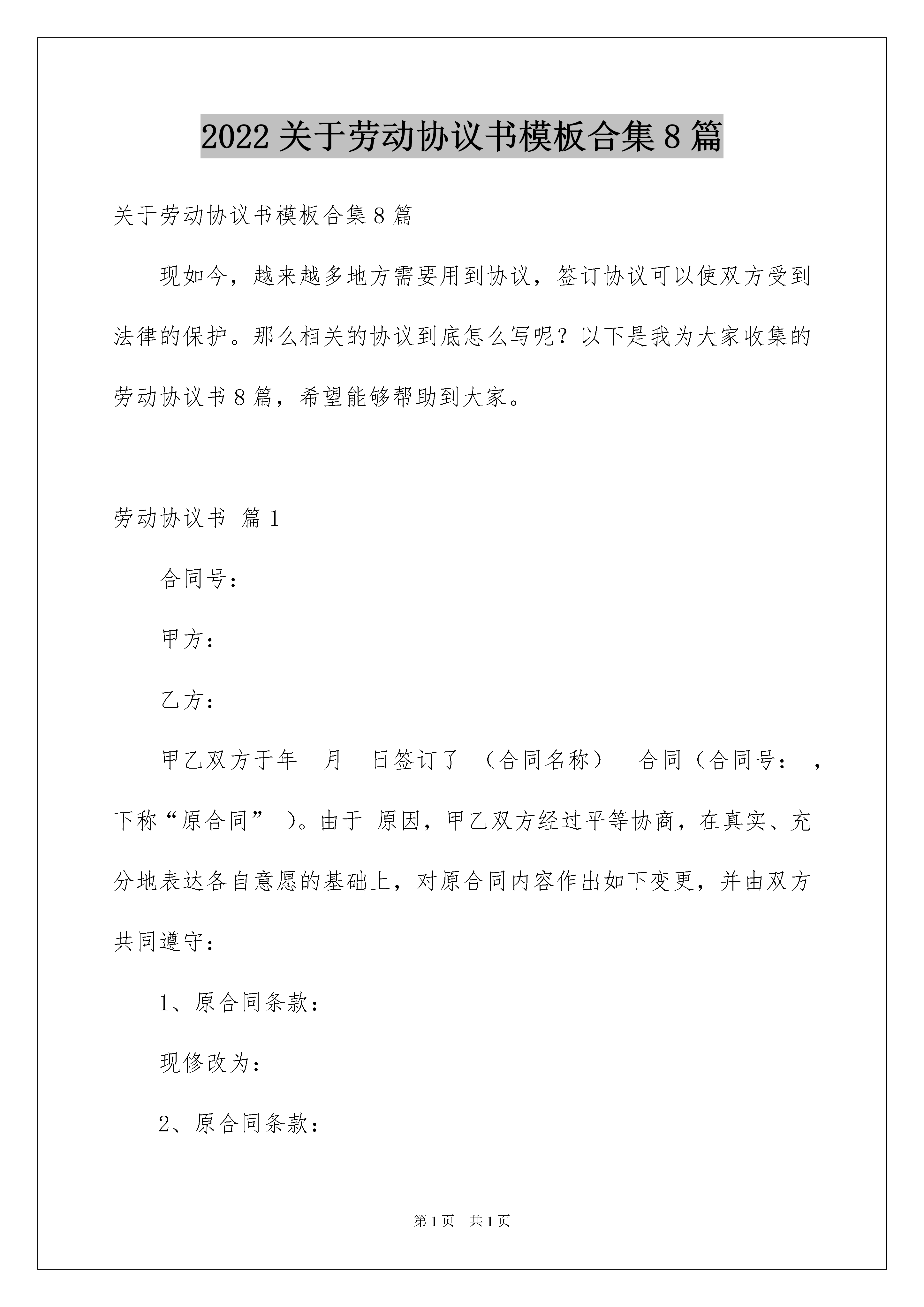 2022关于劳动协议书模板合集8篇关于劳动协议书模板合集8篇现如今,越来越多地方需要用到协议,签订协议可以使双方受到法律的保护。那么相关的协议到底怎么写呢?以下是我为大家收集的劳动协议书8篇,希望能够帮助到大家。劳动协议书篇1合同号:甲方:乙方:甲乙双方于年月日签订了(合同名称)合同(合同号:,下称“原合同”)。由于原因,甲乙双方经过平等协商,在真实、充分地表达各自意愿的基础上,对原合同内容作出如下变更,并由双方共同遵守:1、原合同条款:现修改为:2、原合同条款:现修改为:3、删除原合同条款:4、生效及其它本协议是原合同不可分割的组成部分,与原合同具有同等法律效力。除本协议变更的内容外,原合同中的其他条款仍然适用,对双方有约束力。本协议自双方签字盖章之日起生效,一式份,双方各执份,具有同等法律效力。甲方:乙方:(盖章)(盖章)法定代表人:法定代表人:签字:签字:1地址:北京海淀区双清路同方大厦A座2层地址:邮政编码:100084邮政编码:经办人:经办人:电话:电话:开户银行:开户银行:帐号:帐号:年月日2年月日劳动协议书篇2用人单位:(以下简称甲方)劳动者:(以下简称乙方)根据《中华人民共和国劳动法》、《中华人民共和国劳动合同法》及其他有关规定,经甲、乙双方协商一致,就解除双方劳动合同一事达成如下协议:第一条、劳动合同的解除甲乙双方之间的劳动合同关系,在签订本协议后即予以解除,双方之间的权利义务关系,在本协议生效后全部予以终止。第二条、薪酬、社保及经济补偿金乙方确认,在签订本协议之前,甲方已履行用人单位全部义务,依法向乙方足额发放薪酬、办理社保及支付各种经济补偿金。在签订本协议之后,乙方不得因劳动关系再向甲方主张任何权利。第三条、工作交接及离职手续在签订本协议之前,甲乙双方已办理工作交接和离职手续,乙方的社保由乙方自行接续办理。第四条、保密义务劳动合同解除后,乙方仍负有保守所知悉的甲方商业秘密的义务,不得泄露给任何第三方。第五条、争议解决甲乙双方因履行本协议发生争议,由双方友好协商解决。第六条:其他本协议一式两份,双方各执一份,自双方签字盖章之日生效。甲方:乙方:年月日年月日劳动协议书篇3甲方____与乙方____原于___年___月___日签订的合字第____号________合同,现因__________________________________________使____方无法继续履行合同,经双方协商同意,该合同于___年___月____日予以终止,不再履行,且因合同所产生的一切责任和后果互不追究。本协议由双方签字盖章后生效。协议书一式两份,由双方各执一份,具有同等的法律效力。甲方:(盖章)乙方:(盖章)代表人:(盖章)代表人:(盖章)年月日劳动协议书篇4甲方:________乙方:________鉴于乙方已于________年____月____日向甲方提出解除劳动关系并书面提请辞去所有职务,甲方已同意乙方的辞职申请,现经协商一致,甲、乙双方同意解除劳动关系,并达成如下协议:一、本协议签订之日起解除双方的劳动关系,双方的权利义务随之终止;二、由于乙方主动要求解除劳动关系,依照法律规定甲方不必支付经济补偿金;三、甲方自本协议签订之日起不再为乙方支付任何社会保险金费用;四、本协议签订之日时,双方已经结清所有关于集资、借款、工资、奖金、津贴、补助、加班费等所有债权债务,双方已经没有任何的经济关系。双方共同确认:双方都已将所有的经济凭证进行了交接,自本协议签订之日起任何一方持有对方的有关经济凭证都视为凭证内容已经进行过交接处理,经济凭证不再有效;双方共同承诺:任何一方不得以任何理由、借口要求对方承担经济责任;五、鉴于乙方曾经是甲方的高级管理人员,乙方同意并授权甲方在任何报纸、报刊刊登如下内容的声明:“xx自________年____月____日起不再担任我公司的任何职务,其一切活动自________年____月____日起与xxxx公司无任何关系”;六、乙方离职后不得利用在甲方获取的商业秘密(包括但不限于经营方式、客户名单)从事有损甲方名誉或利益的行为;七、本协议自甲、乙双方签字(盖章)后生效;八、本协议一式四份,甲、乙双方各执两份。甲方(盖章):乙方(签字或盖章):负责人:________年____月____日________年____月____日劳动协议书篇5甲方:乙方:甲乙双方于年月日签订为期年的劳动合同,现合同期满,甲乙双方在自愿、平等协商的前提下就终止劳动关系相关事宜,签订本协议:1、自年月日起,终止双方签订的劳动合同,双方的权利义务随之终止;2、甲方同意在乙