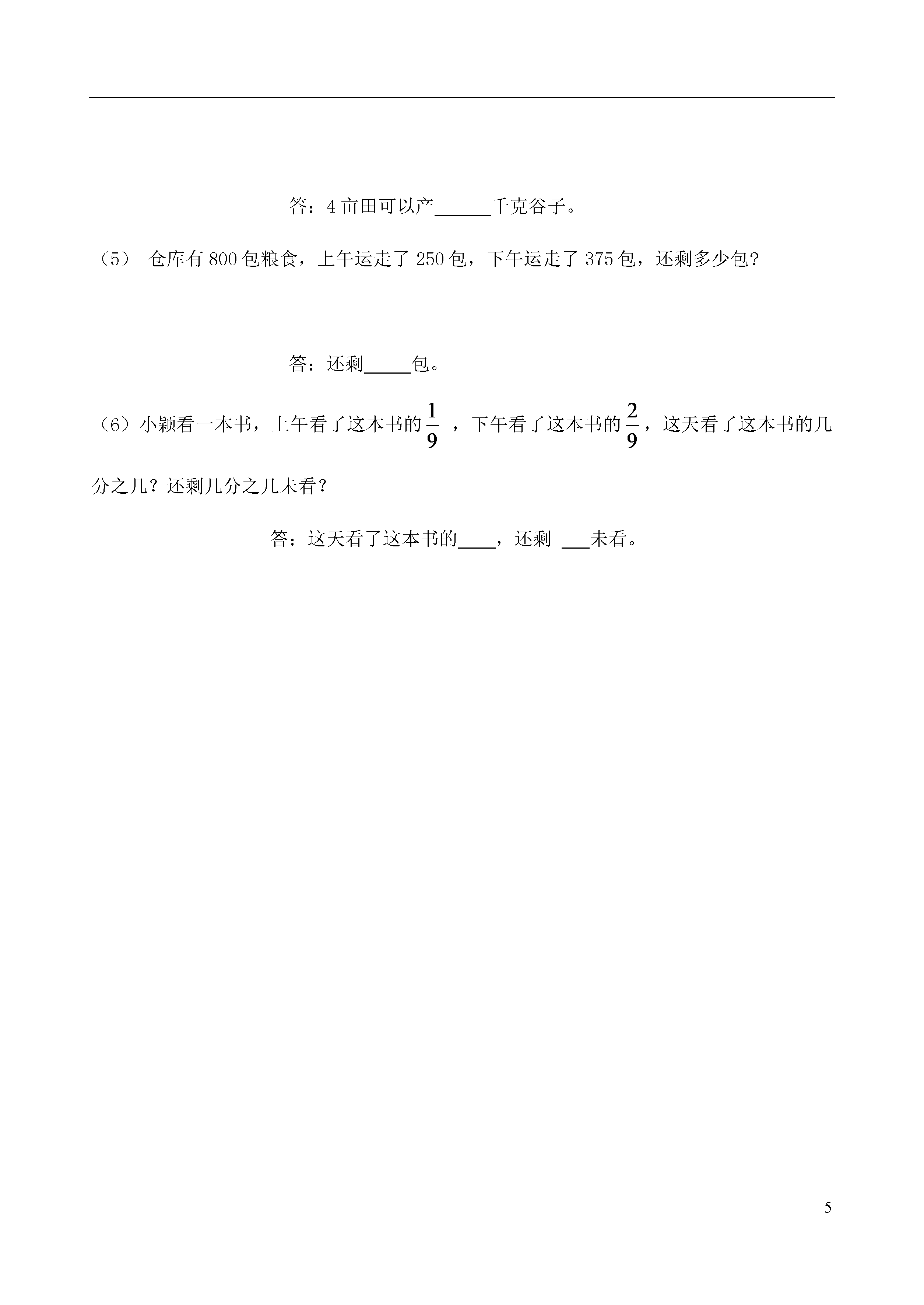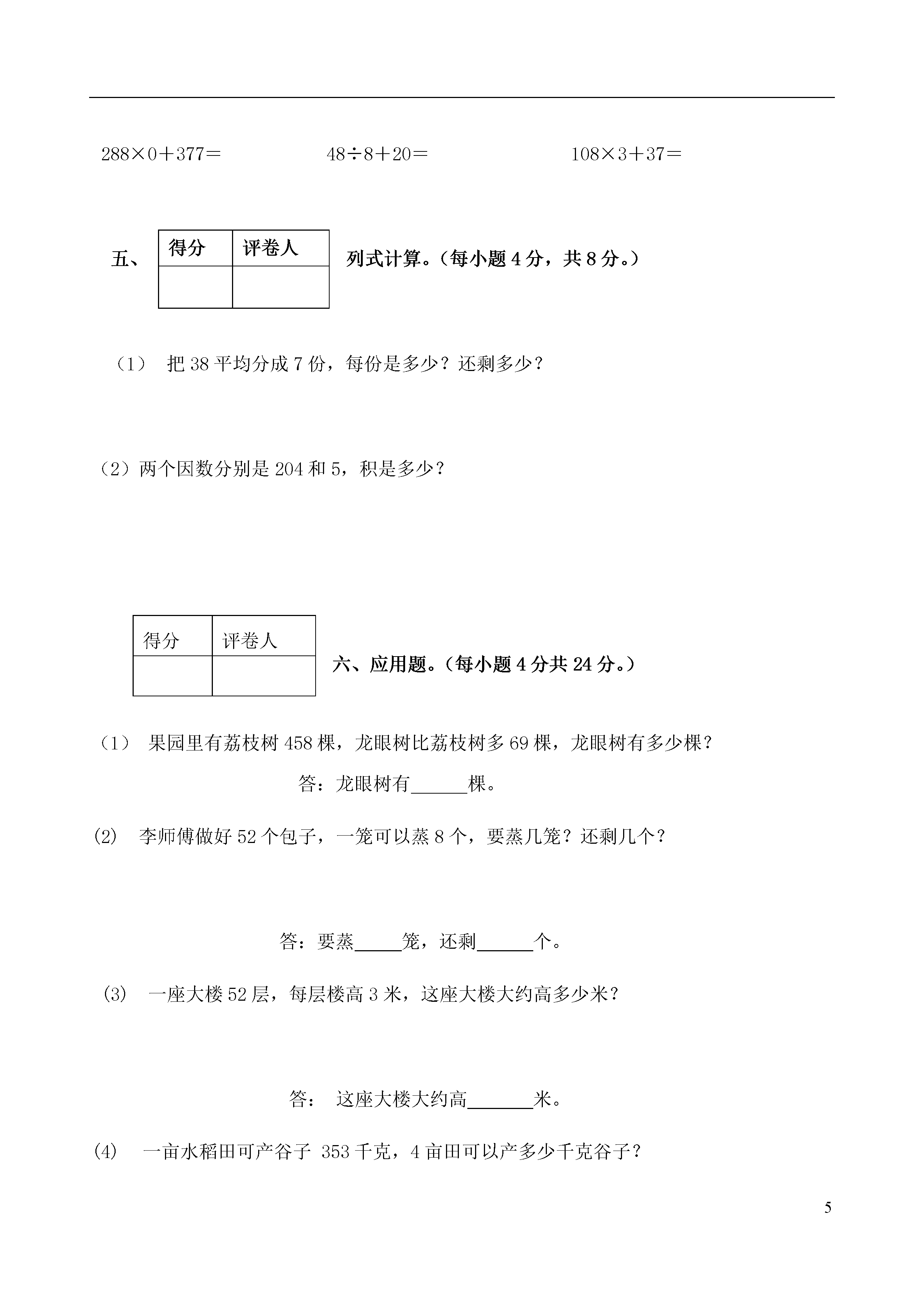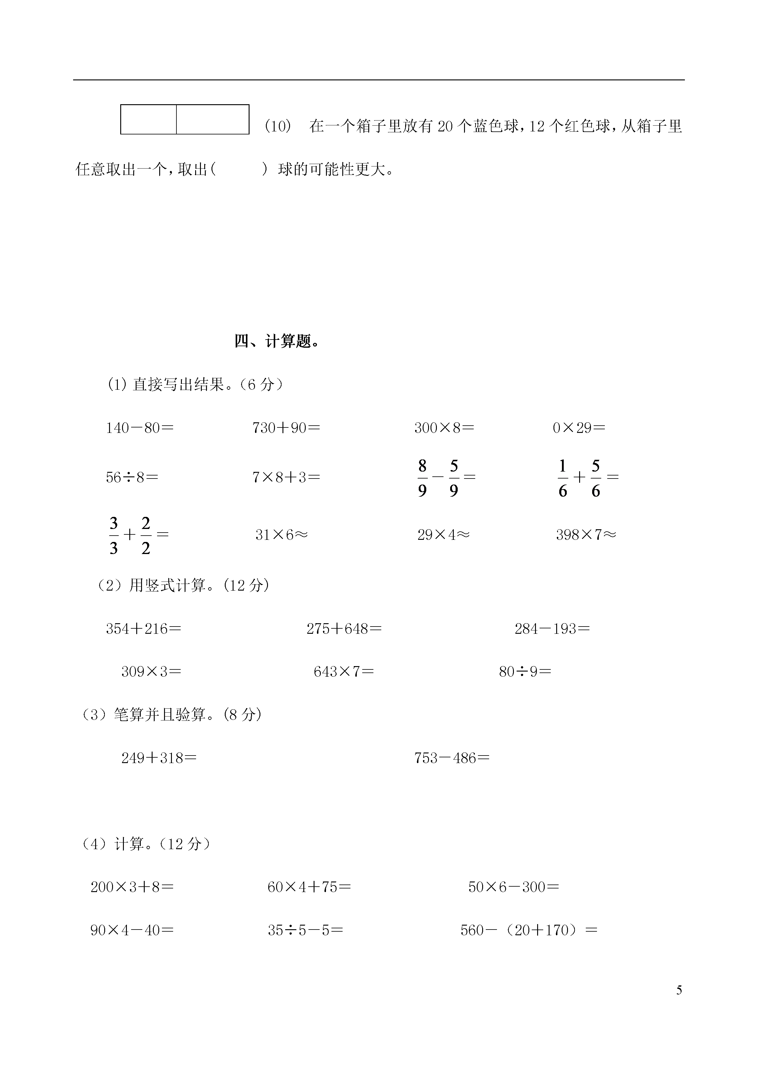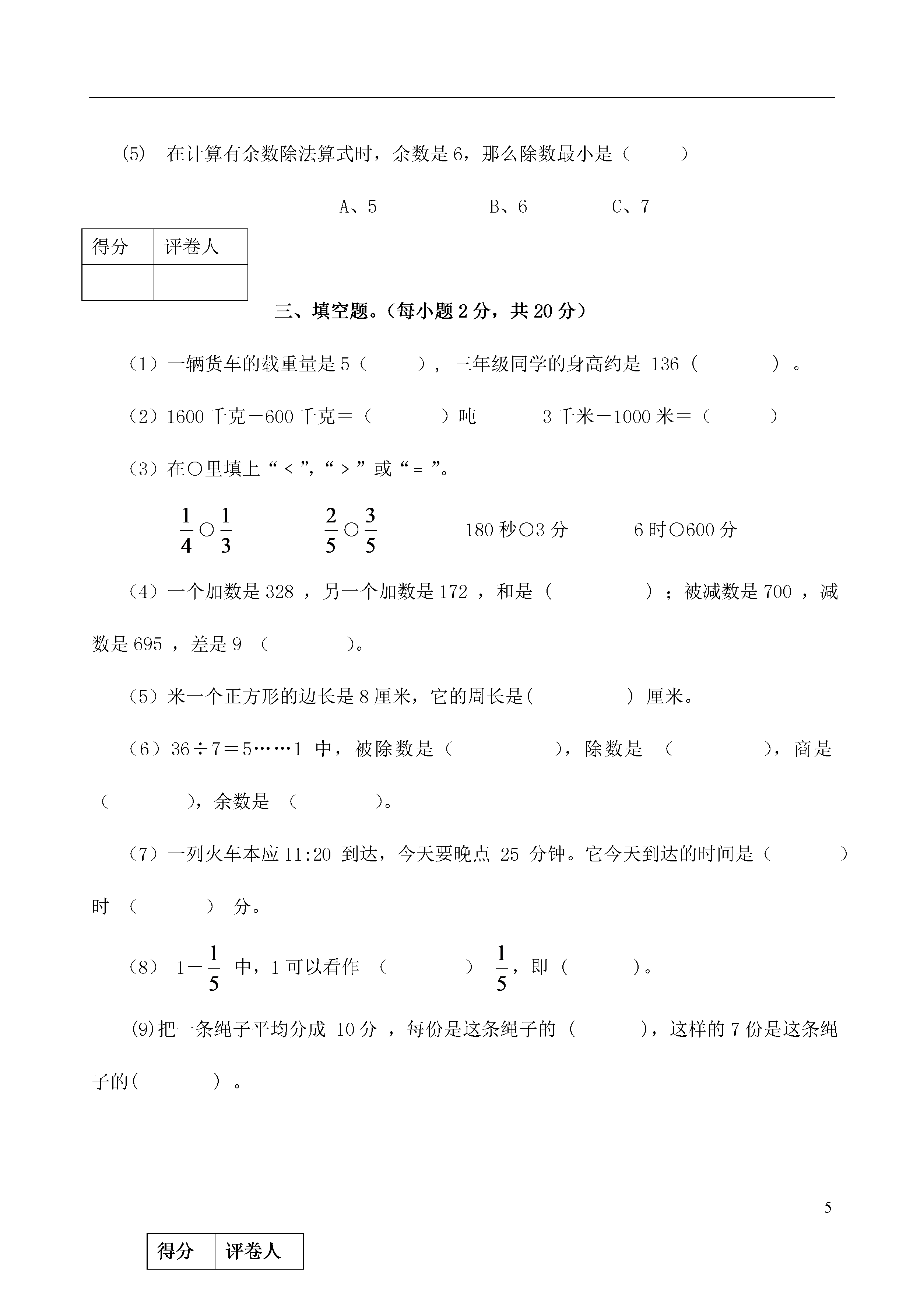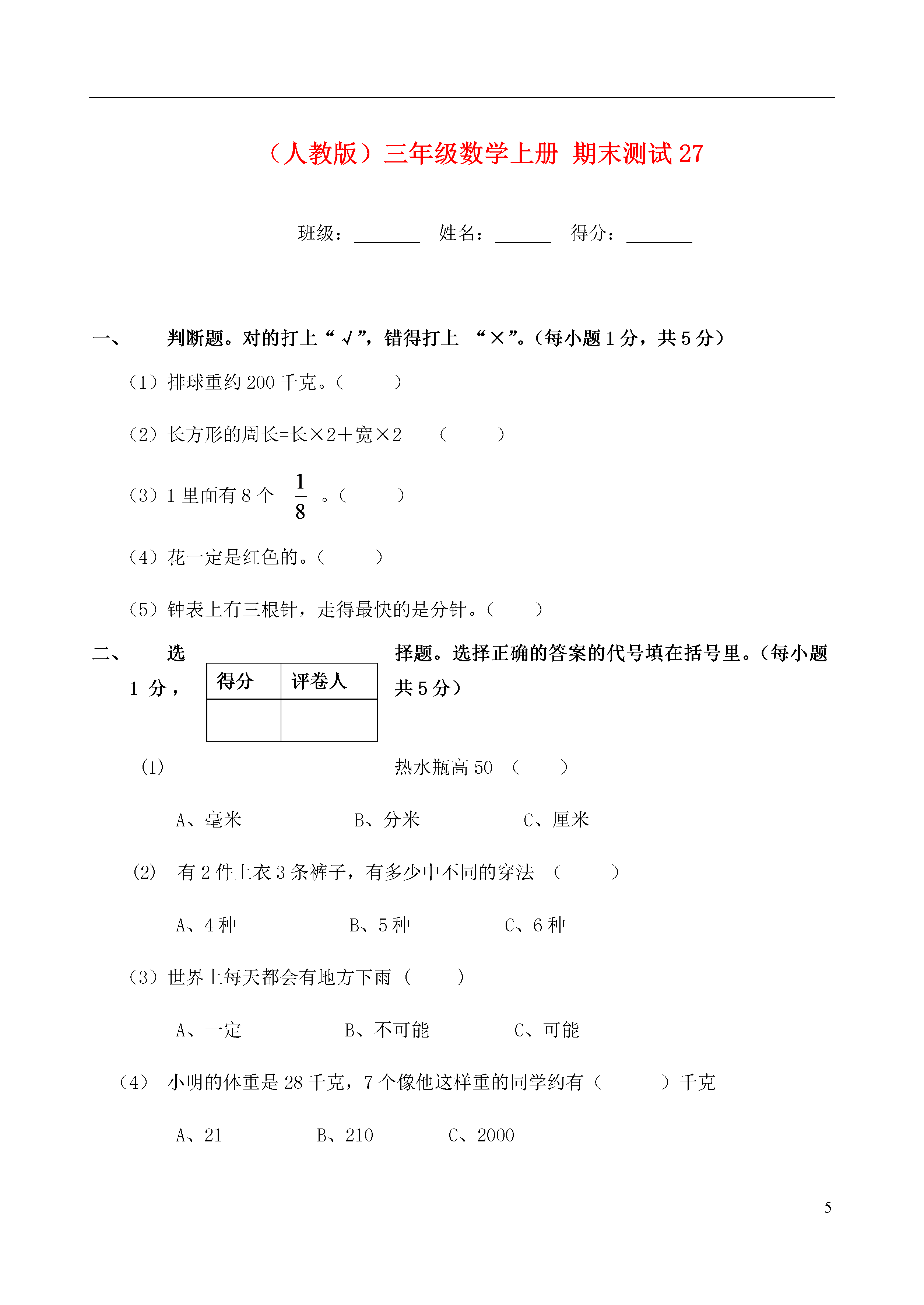 5(人教版)三年级数学上册期末测试27班级:姓名:得分:判断题。对的打上“√”,错得打上“×”。(每小题1分,共5分)(1)排球重约200千克。()(2)长方形的周长=长×2+宽×2()(3)1里面有8个。()(4)花一定是红色的。()(5)钟表上有三根针,走得最快的是分针。()得分评卷人选择题。选择正确的答案的代号填在括号里。(每小题1分,共5分)(1)热水瓶高50()A、毫米B、分米C、厘米(2)有2件上衣3条裤子,有多少中不同的穿法()A、4种B、5种C、6种(3)世界上每天都会有地方下雨()A、一定B、不可能C、可能(4)小明的体重是28千克,7个像他这样重的同学约有()千克A、21B、210C、2000(5)在计算有余数除法算式时,余数是6,那么除数最小是()A、5B、6C、7得分评卷人三、填空题。(每小题2分,共20分)(1)一辆货车的载重量是5(),三年级同学的身高约是136()。(2)1600千克-600千克=()吨3千米-1000米=()(3)在○里填上“﹤”,“﹥”或“﹦”。○○180秒○3分6时○600分(4)一个加数是328,另一个加数是172,和是();被减数是700,减数是695,差是9()。(5)米一个正方形的边长是8厘米,它的周长是()厘米。(6)36÷7=5……1中,被除数是(),除数是(),商是(),余数是()。(7)一列火车本应11:20到达,今天要晚点25分钟。它今天到达的时间是()时()分。(8)1-中,1可以看作(),即()。(9)把一条绳子平均分成10分,每份是这条绳子的(),这样的7份是这条绳子的()。得分评卷人(10)在一个箱子里放有20个蓝色球,12个红色球,从箱子里任意取出一个,取出()球的可能性更大。四、计算题。直接写出结果。(6分)140-80=730+90=300×8=0×29=56÷8=7×8+3=-=+=+=31×6≈29×4≈398×7≈(2)用竖式计算。(12分)354+216=275+648=284-193=309×3=643×7=80÷9=(3)笔算并且验算。(8分)249+318=753-486=(4)计算。(12分)200×3+8=60×4+75=50×6-300=90×4-40=35÷5-5=560-(20+170)=288×0+377=48÷8+20=108×3+37=得分评卷人五、列式计算。(每小题4分,共8分。)把38平均分成7份,每份是多少?还剩多少?(2)两个因数分别是204和5,积是多少?得分评卷人六、应用题。(每小题4分共24分。)(1)果园里有荔枝树458棵,龙眼树比荔枝树多69棵,龙眼树有多少棵?答:龙眼树有棵。(2)李师傅做好52个包子,一笼可以蒸8个,要蒸几笼?还剩几个?答:要蒸笼,还剩个。(3)一座大楼52层,每层楼高3米,这座大楼大约高多少米?答:这座大楼大约高米。一亩水稻田可产谷子353千克,4亩田可以产多少千克谷子?答:4亩田可以产千克谷子。(5)仓库有800包粮食,上午运走了250包,下午运走了375包,还剩多少包?答:还剩包。(6)小颖看一本书,上午看了这本书的,下午看了这本书的,这天看了这本书的几分之几?还剩几分之几未看?答:这天看了这本书的,还剩未看。