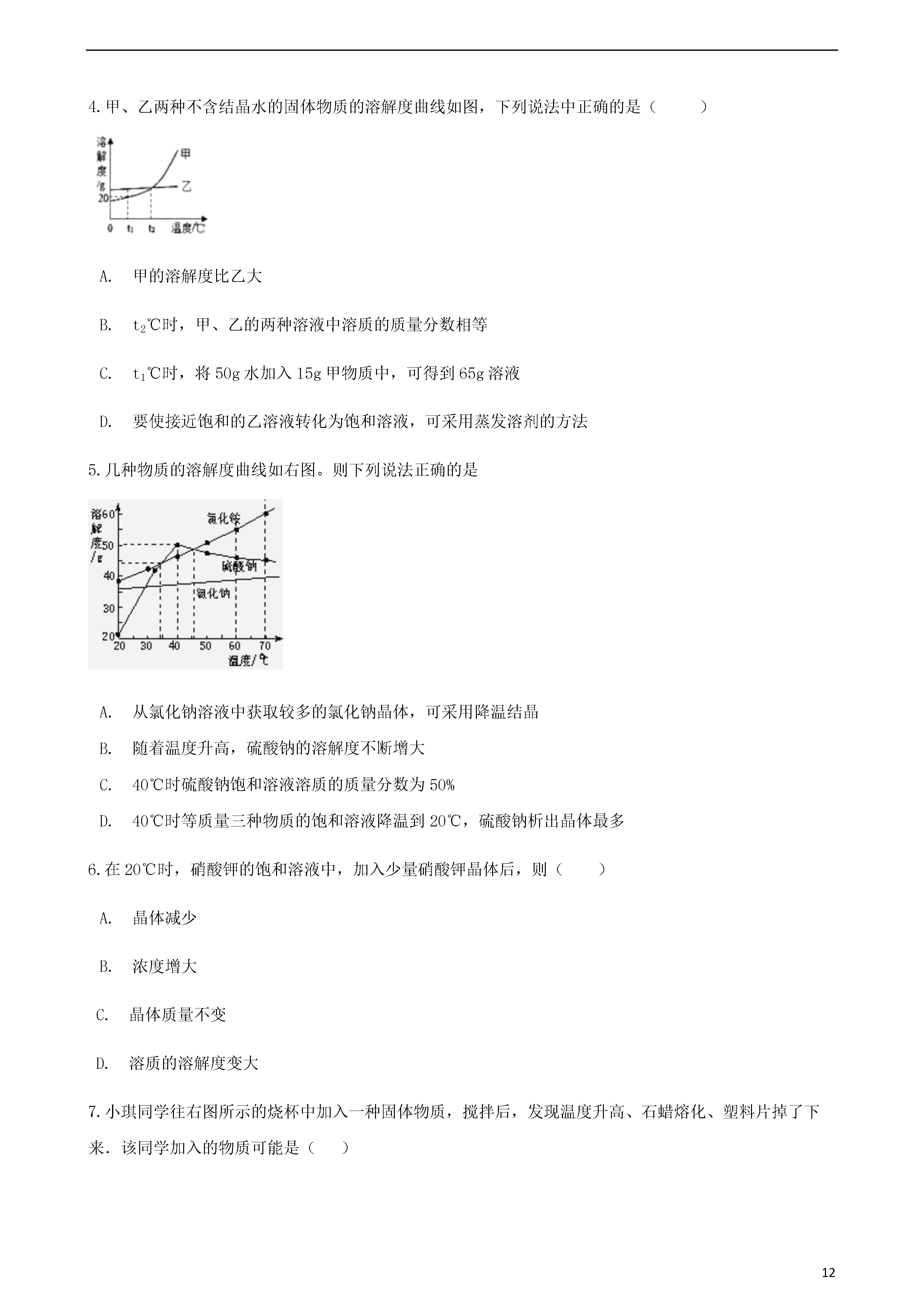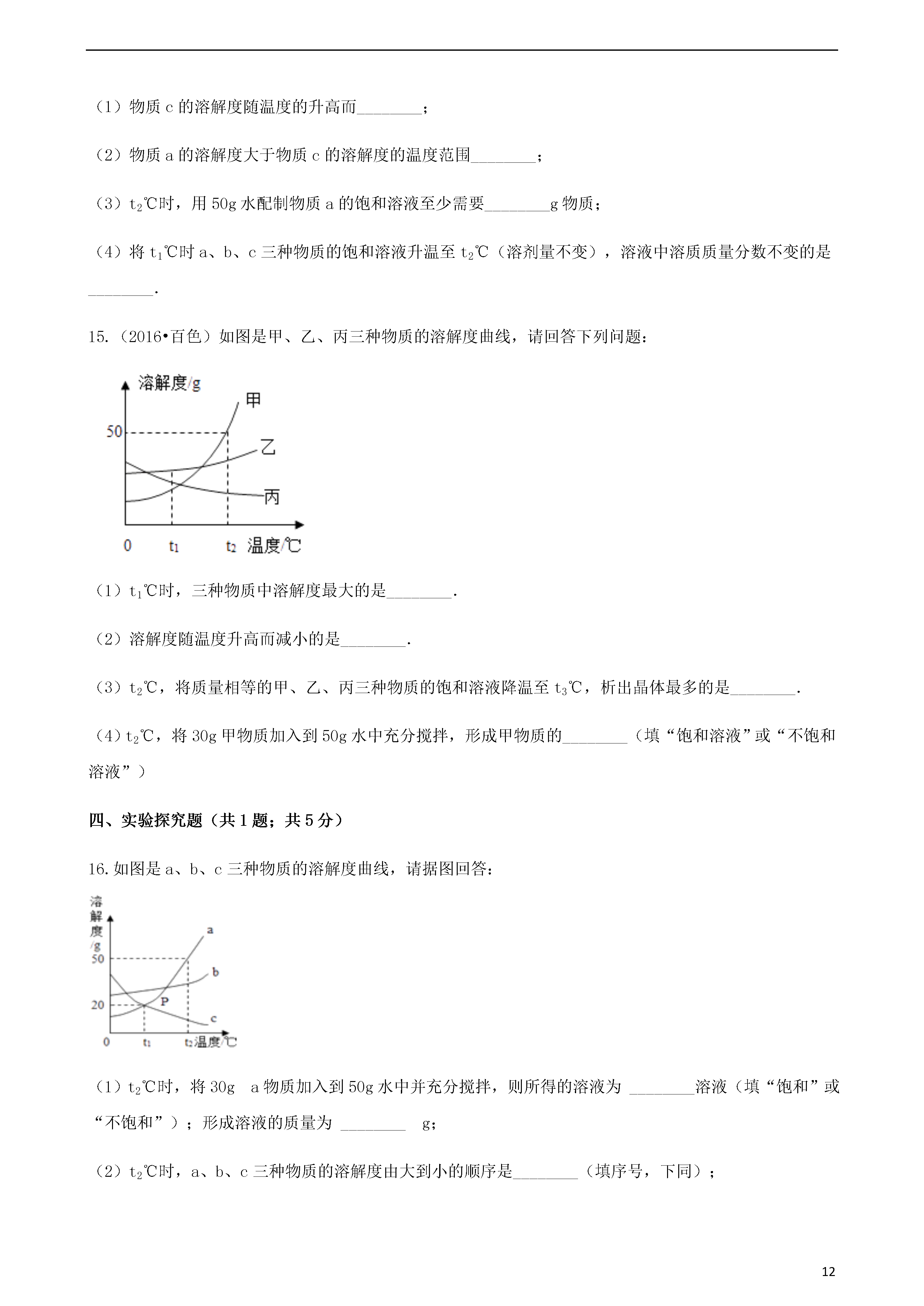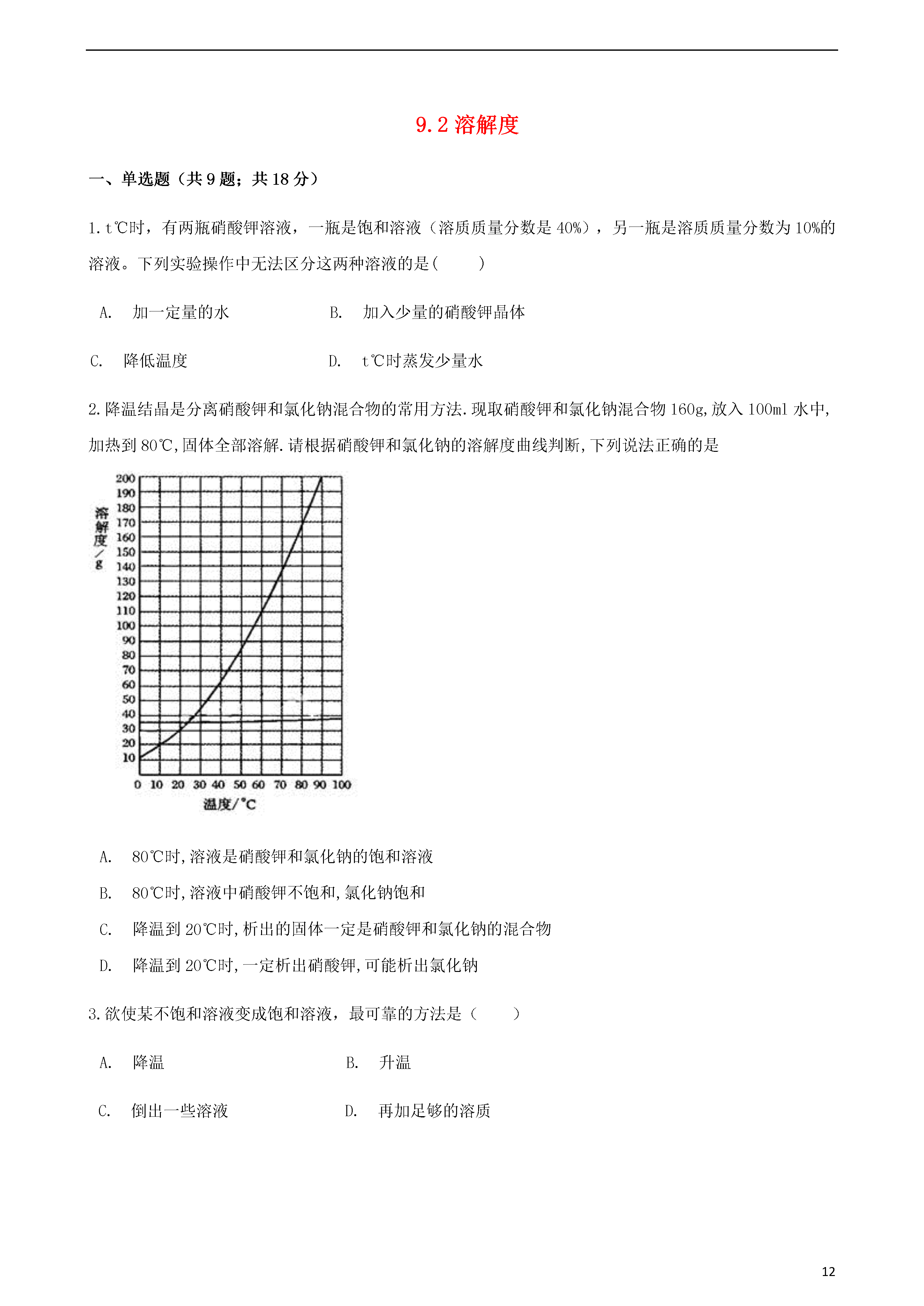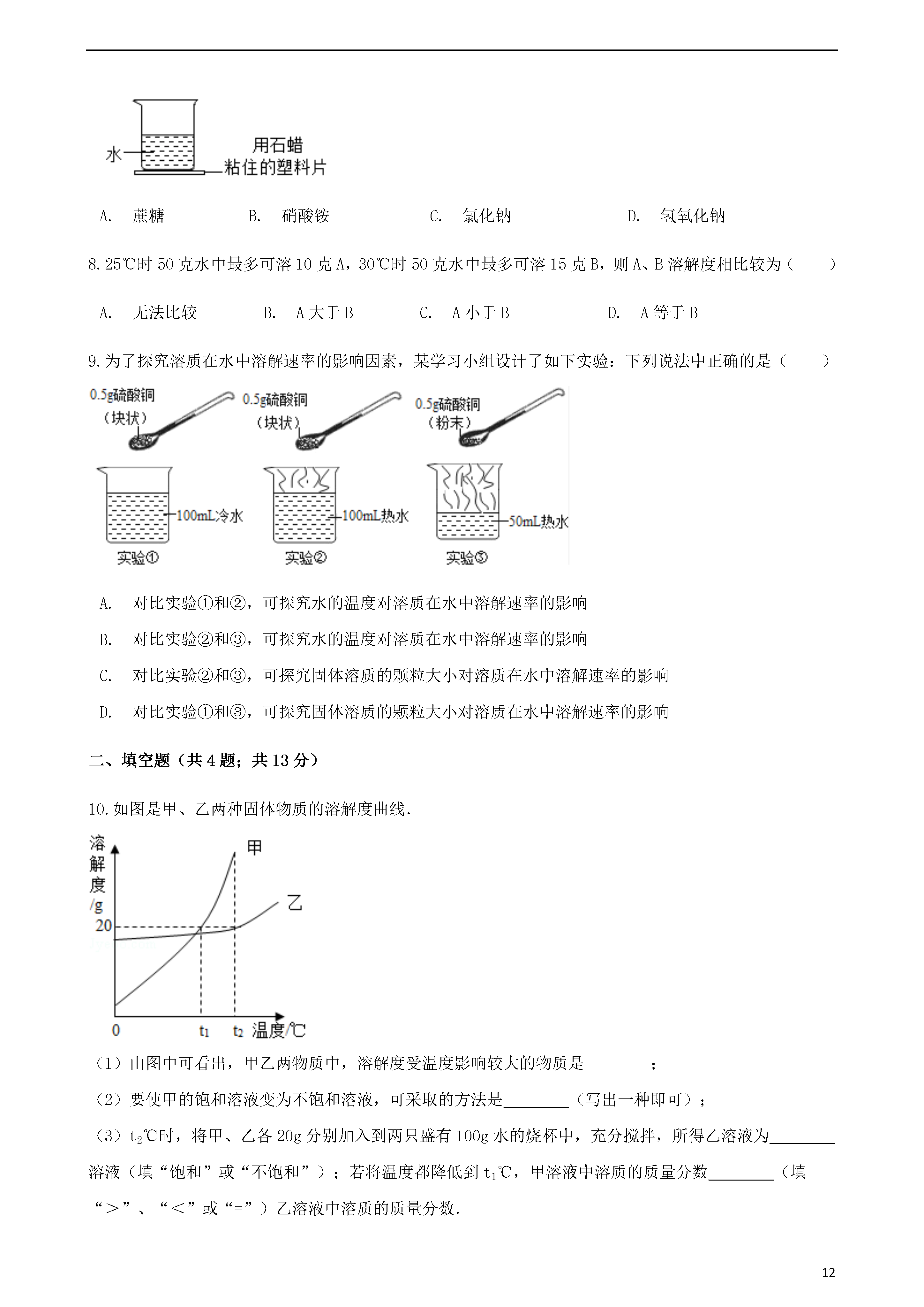 …………○…………外…………○…………装…………○…………订…………○…………线…………○…………※※请※※不※※要※※在※※装※※订※※线※※内※※答※※题※※…………○…………内…………○…………装…………○…………订…………○…………线…………○…………129.2溶解度一、单选题(共9题;共18分)1.t℃时,有两瓶硝酸钾溶液,一瓶是饱和溶液(溶质质量分数是40%),另一瓶是溶质质量分数为10%的溶液。下列实验操作中无法区分这两种溶液的是()A.加一定量的水B.加入少量的硝酸钾晶体C.降低温度D.t℃时蒸发少量水2.降温结晶是分离硝酸钾和氯化钠混合物的常用方法.现取硝酸钾和氯化钠混合物160g,放入100ml水中,加热到80℃,固体全部溶解.请根据硝酸钾和氯化钠的溶解度曲线判断,下列说法正确的是A.80℃时,溶液是硝酸钾和氯化钠的饱和溶液B.80℃时,溶液中硝酸钾不饱和,氯化钠饱和C.降温到20℃时,析出的固体一定是硝酸钾和氯化钠的混合物D.降温到20℃时,一定析出硝酸钾,可能析出氯化钠3.欲使某不饱和溶液变成饱和溶液,最可靠的方法是()A.降温B.升温C.倒出一些溶液D.再加足够的溶质4.甲、乙两种不含结晶水的固体物质的溶解度曲线如图,下列说法中正确的是()A.甲的溶解度比乙大B.t2℃时,甲、乙的两种溶液中溶质的质量分数相等C.t1℃时,将50g水加入15g甲物质中,可得到65g溶液D.要使接近饱和的乙溶液转化为饱和溶液,可采用蒸发溶剂的方法5.几种物质的溶解度曲线如右图。则下列说法正确的是A.从氯化钠溶液中获取较多的氯化钠晶体,可采用降温结晶B.随着温度升高,硫酸钠的溶解度不断增大C.40℃时硫酸钠饱和溶液溶质的质量分数为50%D.40℃时等质量三种物质的饱和溶液降温到20℃,硫酸钠析出晶体最多6.在20℃时,硝酸钾的饱和溶液中,加入少量硝酸钾晶体后,则()A.晶体减少B.浓度增大C.晶体质量不变D.溶质的溶解度变大7.小琪同学往右图所示的烧杯中加入一种固体物质,搅拌后,发现温度升高、石蜡熔化、塑料片掉了下来.该同学加入的物质可能是()A.蔗糖B.硝酸铵C.氯化钠D.氢氧化钠8.25℃时50克水中最多可溶10克A,30℃时50克水中最多可溶15克B,则A、B溶解度相比较为()A.无法比较B.A大于BC.A小于BD.A等于B9.为了探究溶质在水中溶解速率的影响因素,某学习小组设计了如下实验:下列说法中正确的是()A.对比实验①和②,可探究水的温度对溶质在水中溶解速率的影响B.对比实验②和③,可探究水的温度对溶质在水中溶解速率的影响C.对比实验②和③,可探究固体溶质的颗粒大小对溶质在水中溶解速率的影响D.对比实验①和③,可探究固体溶质的颗粒大小对溶质在水中溶解速率的影响二、填空题(共4题;共13分)10.如图是甲、乙两种固体物质的溶解度曲线.(1)由图中可看出,甲乙两物质中,溶解度受温度影响较大的物质是________;(2)要使甲的饱和溶液变为不饱和溶液,可采取的方法是________(写出一种即可);(3)t2℃时,将甲、乙各20g分别加入到两只盛有100g水的烧杯中,充分搅拌,所得乙溶液为________溶液(填“饱和”或“不饱和”);若将温度都降低到t1℃,甲溶液中溶质的质量分数________(填“>”、“<”或“=”)乙溶液中溶质的质量分数.11.在一定温度下,向15g蒸馏水加入无水硫酸铜粉末,充分搅拌并过滤,得到一定质量的蓝色五水合硫酸铜晶体和8.4g滤液,若此温度下无水硫酸铜的溶解度为40g,则此无水硫酸铜的质量是________.12.喜爱阅读的同学发现,化学课本中的图表资料可以为我们提供很多信息。①Ⅰ处物质的名称是________,该物质________(填“溶”或“不溶”)于水。②Ⅱ处“量的名称”是________,Ⅲ处“单位符号”是________。13.如图是甲乙两种固体物质的溶解度曲线图。请你根据图示回答问题:①甲和乙的溶解度相等时,温度为________℃;②40℃时,将相同质量的甲、乙的饱和溶液,分别降温至20℃,析出晶体较多的是________;③40℃时,要完全