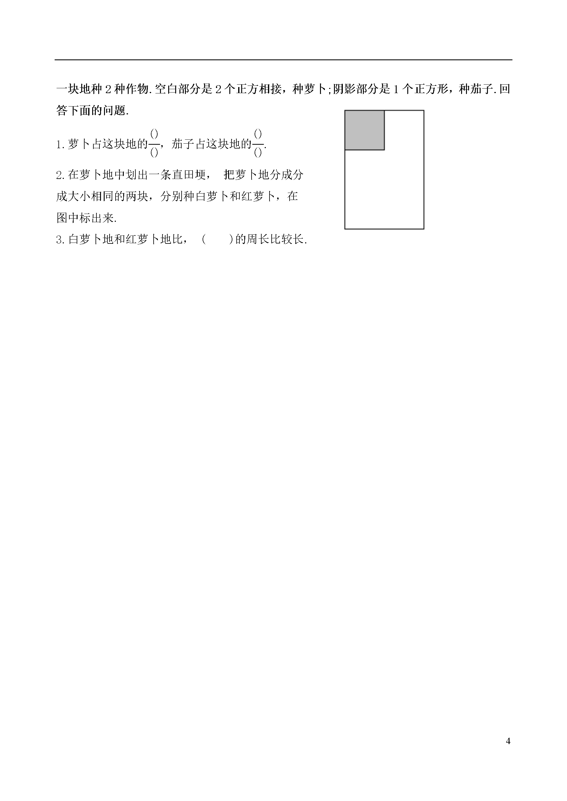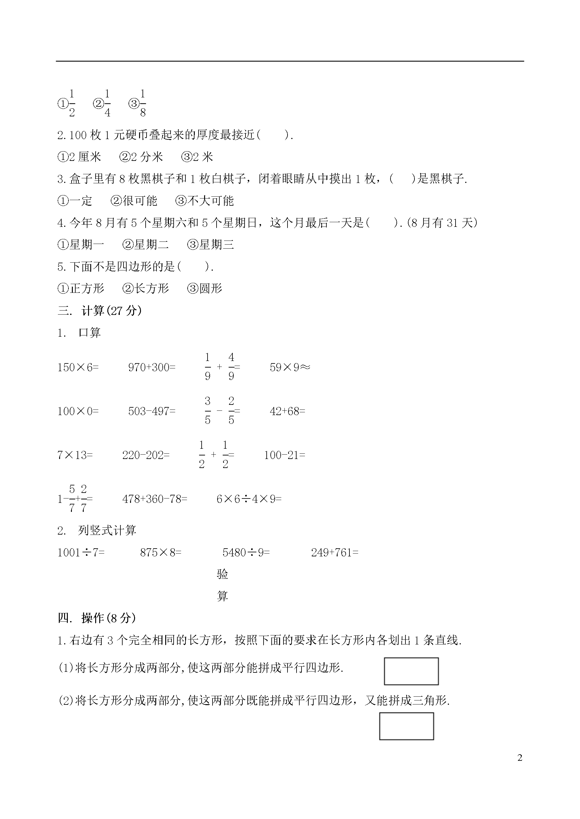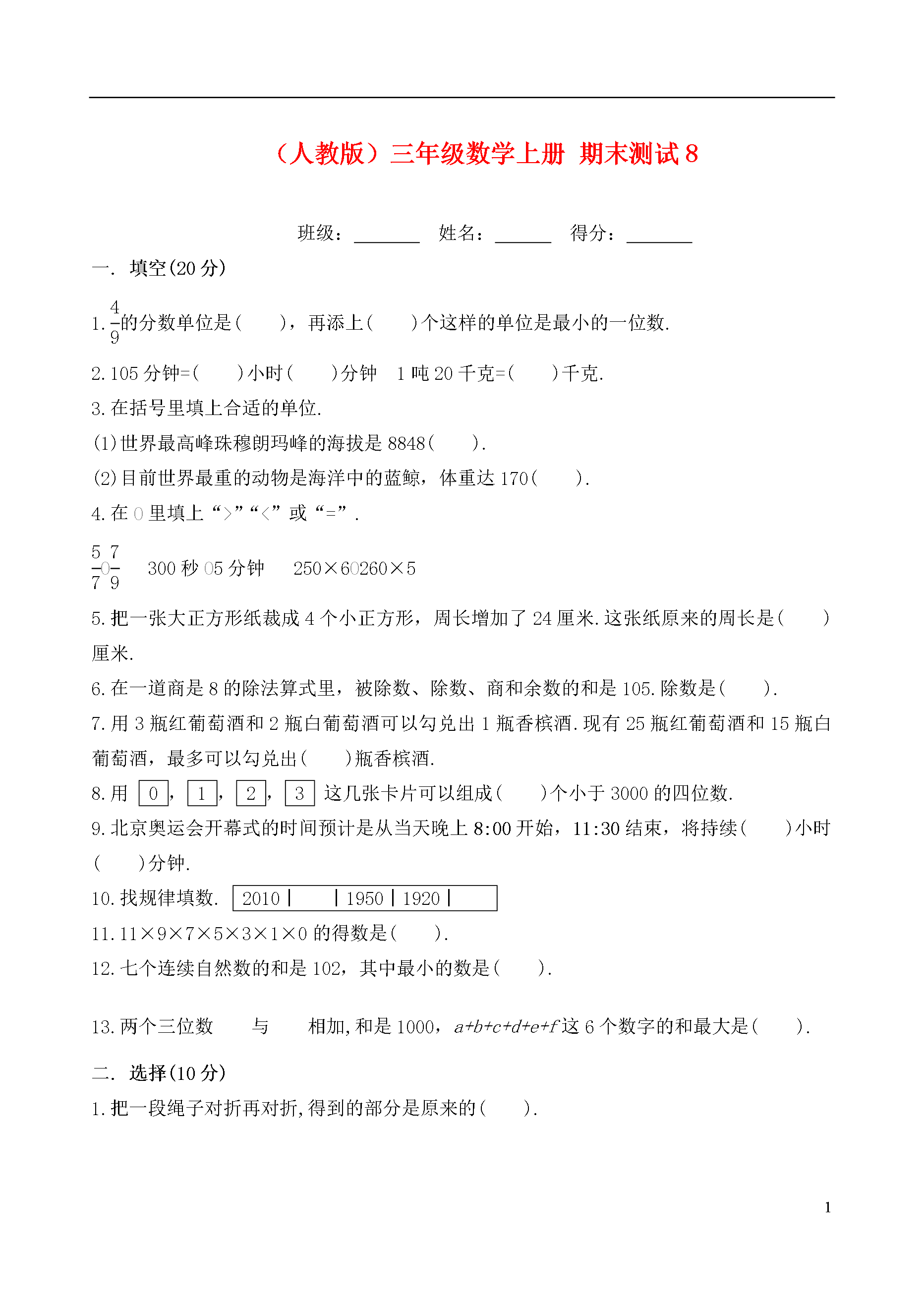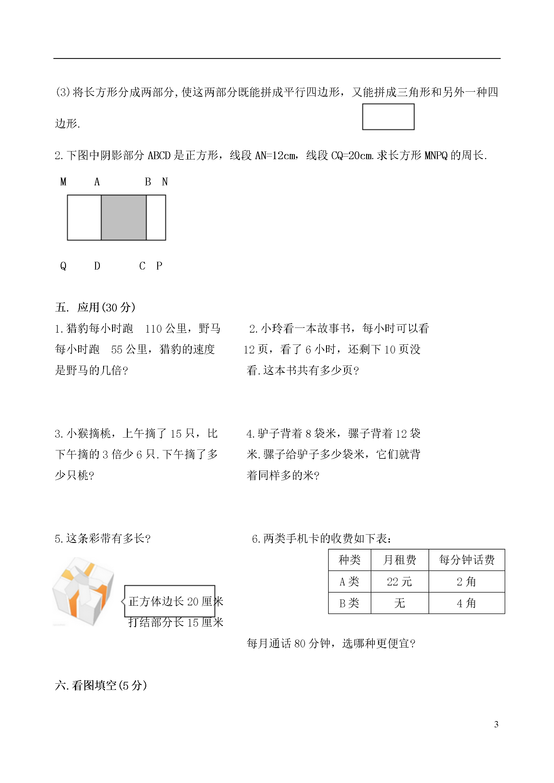 4(人教版)三年级数学上册期末测试8班级:姓名:得分:一.填空(20分)1.eq\f(4,9)的分数单位是(),再添上()个这样的单位是最小的一位数.2.105分钟=()小时()分钟1吨20千克=()千克.3.在括号里填上合适的单位.(1)世界最高峰珠穆朗玛峰的海拔是8848().(2)目前世界最重的动物是海洋中的蓝鲸,体重达170().4.在O里填上“>”“<”或“=”.eq\f(5,7)Oeq\f(7,9)300秒O5分钟250×6O260×55.把一张大正方形纸裁成4个小正方形,周长增加了24厘米.这张纸原来的周长是()厘米.6.在一道商是8的除法算式里,被除数、除数、商和余数的和是105.除数是().7.用3瓶红葡萄酒和2瓶白葡萄酒可以勾兑出1瓶香槟酒.现有25瓶红葡萄酒和15瓶白葡萄酒,最多可以勾兑出()瓶香槟酒.8.用0,1,2,3这几张卡片可以组成()个小于3000的四位数.9.北京奥运会开幕式的时间预计是从当天晚上8:00开始,11:30结束,将持续()小时()分钟.10.找规律填数.2010︱︱1950︱1920︱11.11×9×7×5×3×1×0的得数是().12.七个连续自然数的和是102,其中最小的数是().13.两个三位数与相加,和是1000,a+b+c+d+e+f这6个数字的和最大是().二.选择(10分)1.把一段绳子对折再对折,得到的部分是原来的().①eq\f(1,2)②eq\f(1,4)③eq\f(1,8)2.100枚1元硬币叠起来的厚度最接近().①2厘米②2分米③2米3.盒子里有8枚黑棋子和1枚白棋子,闭着眼睛从中摸出1枚,()是黑棋子.①一定②很可能③不大可能4.今年8月有5个星期六和5个星期日,这个月最后一天是().(8月有31天)①星期一②星期二③星期三5.下面不是四边形的是().①正方形②长方形③圆形三.计算(27分)口算150×6=970+300=eq\f(1,9).+.eq\f(4,9)=59×9≈100×0=503-497=eq\f(3,5).-.eq\f(2,5)=42+68=7×13=220-202=eq\f(1,2).+.eq\f(1,2)=100-21=1-eq\f(5,7)+eq\f(2,7)=478+360-78=6×6÷4×9=列竖式计算1001÷7=875×8=5480÷9=249+761=.验.算四.操作(8分)1.右边有3个完全相同的长方形,按照下面的要求在长方形内各划出1条直线.(1)将长方形分成两部分,使这两部分能拼成平行四边形.(2)将长方形分成两部分,使这两部分既能拼成平行四边形,又能拼成三角形.(3)将长方形分成两部分,使这两部分既能拼成平行四边形,又能拼成三角形和另外一种四边形.2.下图中阴影部分ABCD是正方形,线段AN=12cm,线段CQ=20cm.求长方形MNPQ的周长.M.A.BNQDCP五.应用(30分)1.猎豹每小时跑.110公里,野马2.小玲看一本故事书,每小时可以看每小时跑55公里,猎豹的速度.12页,看了6小时,还剩下10页没是野马的几倍?.看.这本书共有多少页?3.小猴摘桃,上午摘了15只,比4.驴子背着8袋米,骡子背着12袋下午摘的3倍少6只.下午摘了多米.骡子给驴子多少袋米,它们就背少只桃?着同样多的米?5.这条彩带有多长?.6.两类手机卡的收费如下表:种类月租费每分钟话费A类22元2角B类无4角正方体边长20厘米打结部分长15厘米每月通话80分钟,选哪种更便宜?六.看图填空(5分)一块地种2种作物.空白部分是2个正方相接,种萝卜;阴影部分是1个正方形,种茄子.回答下面的问题.1.萝卜占这块地的eq\f((),()),茄子占这块地的eq\f((),()).2.在萝卜地中划出一条直田埂,.把萝卜地分成分成大小相同的两块,分别种白萝卜和红萝卜,在图中标出来.3.白萝卜地和红萝卜地比,.()的周长比较长.