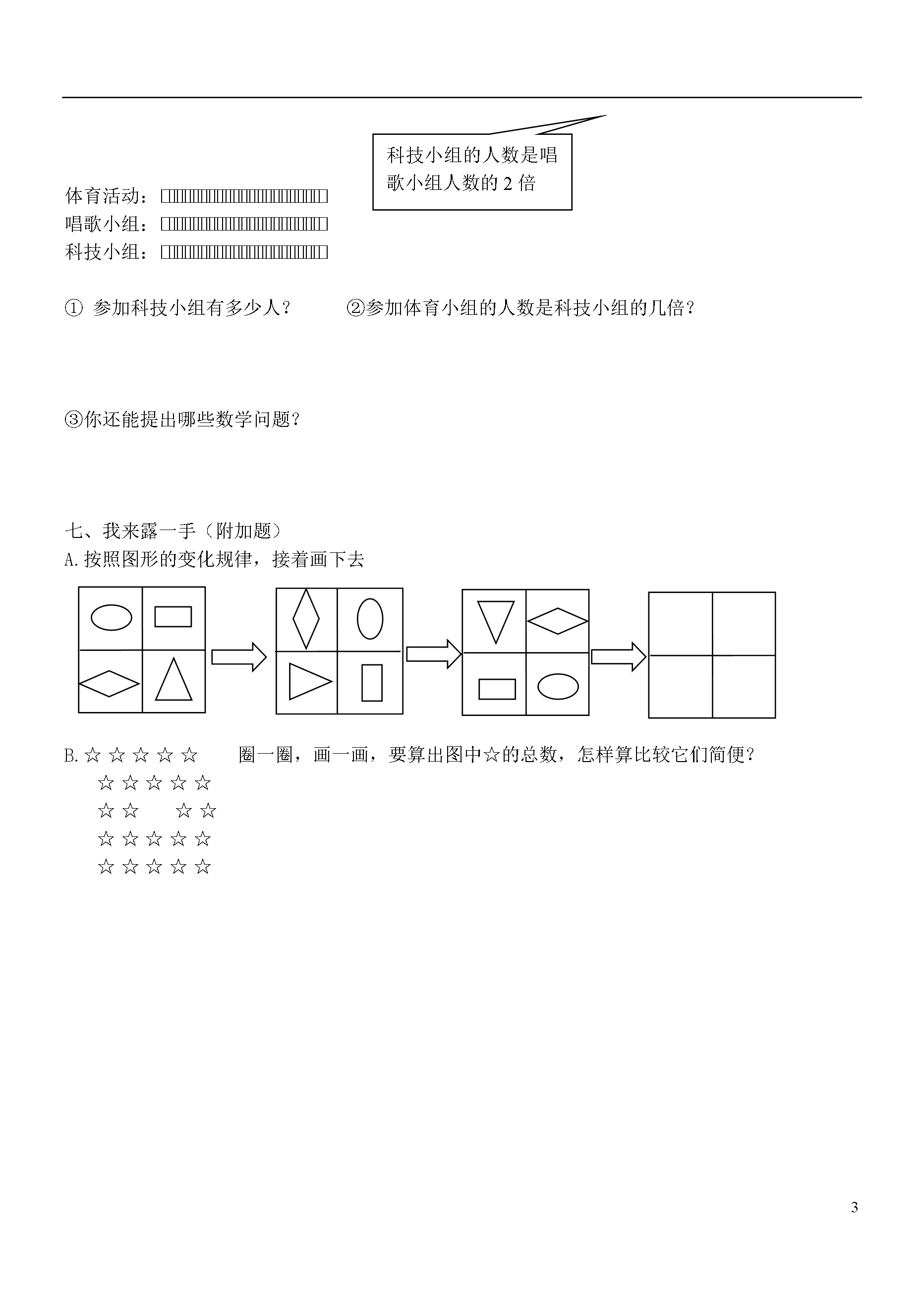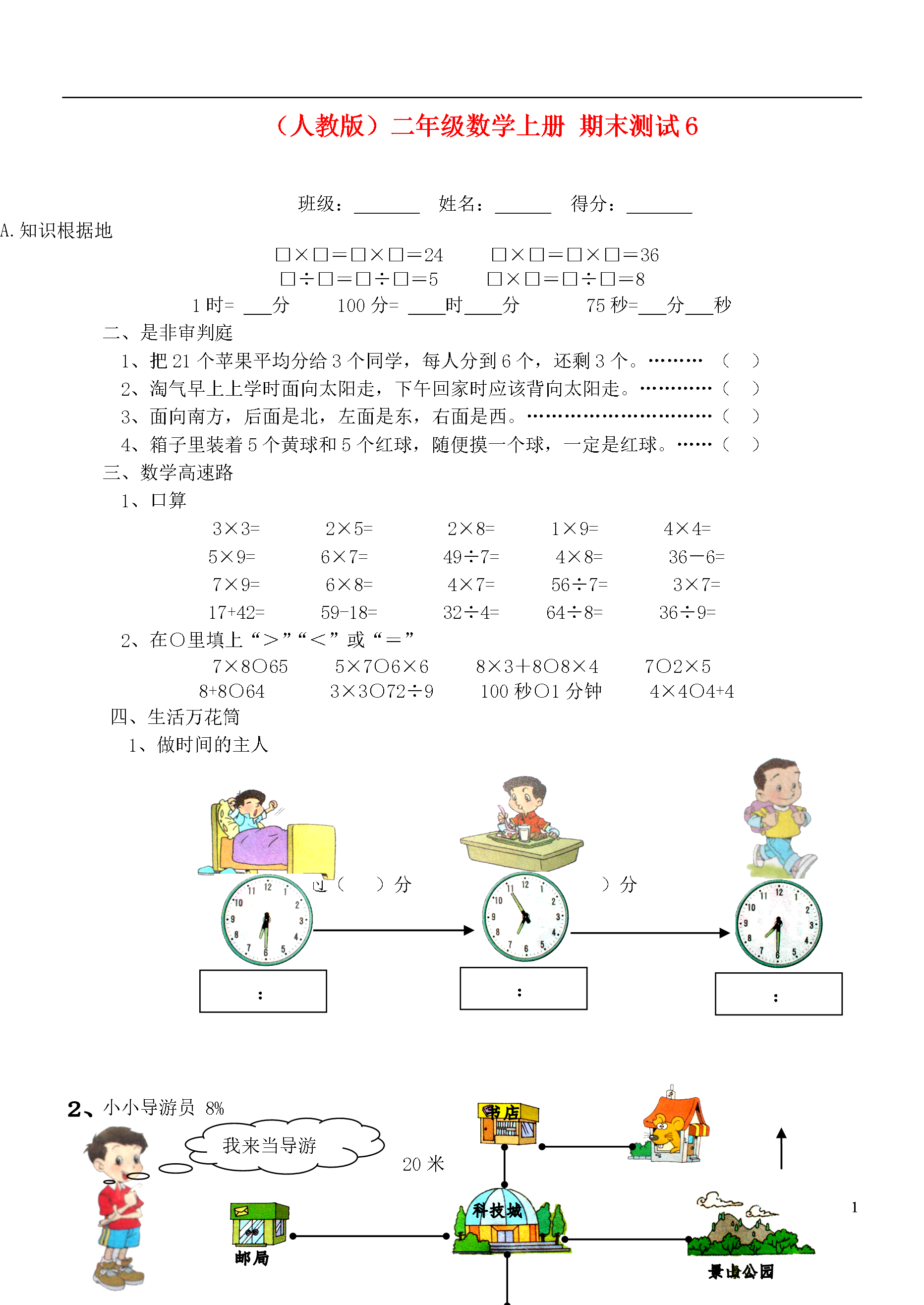 3(人教版)二年级数学上册期末测试6班级:姓名:得分:知识根据地□×□=□×□=24□×□=□×□=36□÷□=□÷□=5□×□=□÷□=81时=分100分=时分75秒=分秒二、是非审判庭1、把21个苹果平均分给3个同学,每人分到6个,还剩3个。………()2、淘气早上上学时面向太阳走,下午回家时应该背向太阳走。…………()3、面向南方,后面是北,左面是东,右面是西。…………………………()4、箱子里装着5个黄球和5个红球,随便摸一个球,一定是红球。……()三、数学高速路1、口算3×3=2×5=2×8=1×9=4×4=5×9=6×7=49÷7=4×8=36-6=7×9=6×8=4×7=56÷7=3×7=17+42=59-18=32÷4=64÷8=36÷9=2、在○里填上“>”“<”或“=”7×8○655×7○6×68×3+8○8×47○2×58+8○643×3○72÷9100秒○1分钟4×4○4+4:::四、生活万花筒1、做时间的主人经过()分经过()分我来当导游小小导游员8%北30米20米50米45米25米1、小老鼠向走米,再向走米,到达科技城。2、小狐狸向走米,再向走米,到达景山公园。3、狐狸家在书店的面,科技城在景山公园的面。4、家离书店比较近。①我买2盒用了多少钱?五、生活自助餐(任选一题)15%每盒4元②我用了20元,我花的钱是小白兔的几倍?③27元能买几盒?还剩几元?2、①买4个布娃娃需要多少钱?②24元可以买几只风筝?③如果你有30元想买些什么?还剩多少钱?·········密·····封·····线·····内·····不·····要·····作·····答·········参加体育小组有16人参加唱歌小组人数的有4人学区小学年班姓名六、素质加油站科技小组的人数是唱歌小组人数的2倍体育活动:□□□□□□□□□□□□□□□□□□□□唱歌小组:□□□□□□□□□□□□□□□□□□□□科技小组:□□□□□□□□□□□□□□□□□□□□①参加科技小组有多少人?②参加体育小组的人数是科技小组的几倍?③你还能提出哪些数学问题?七、我来露一手(附加题)按照图形的变化规律,接着画下去☆☆☆☆☆圈一圈,画一画,要算出图中☆的总数,怎样算比较它们简便?☆☆☆☆☆☆☆☆☆☆☆☆☆☆☆☆☆☆☆