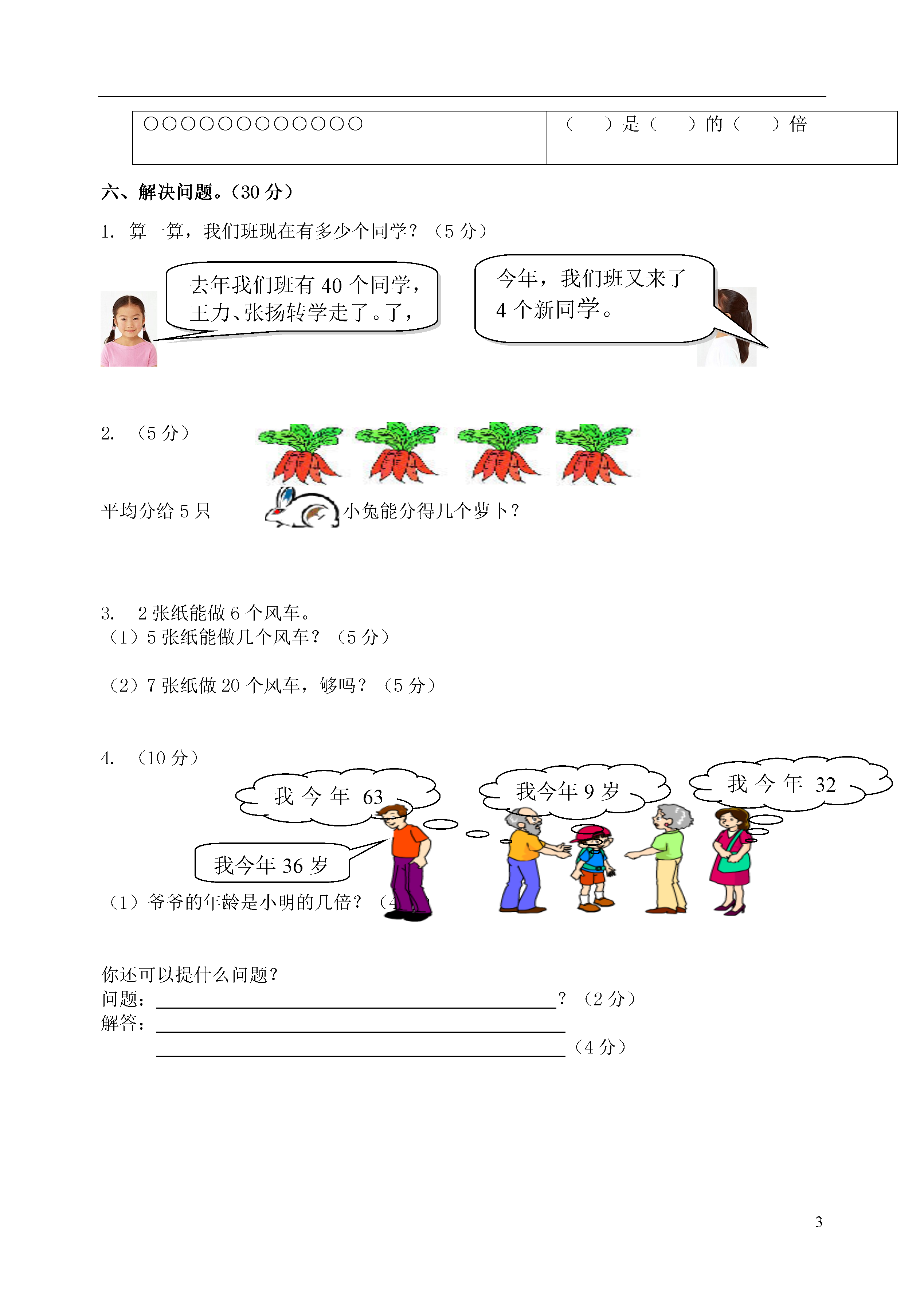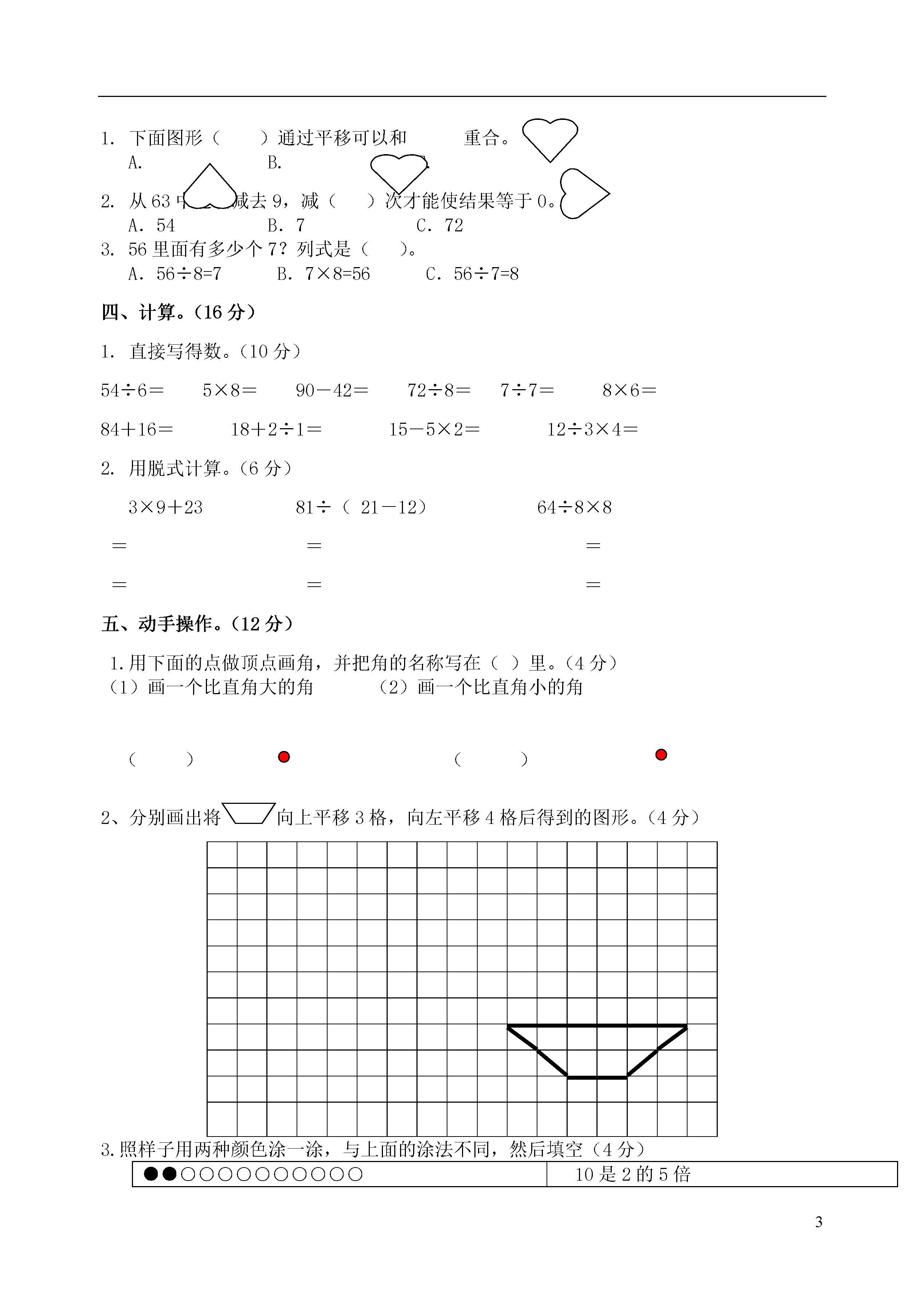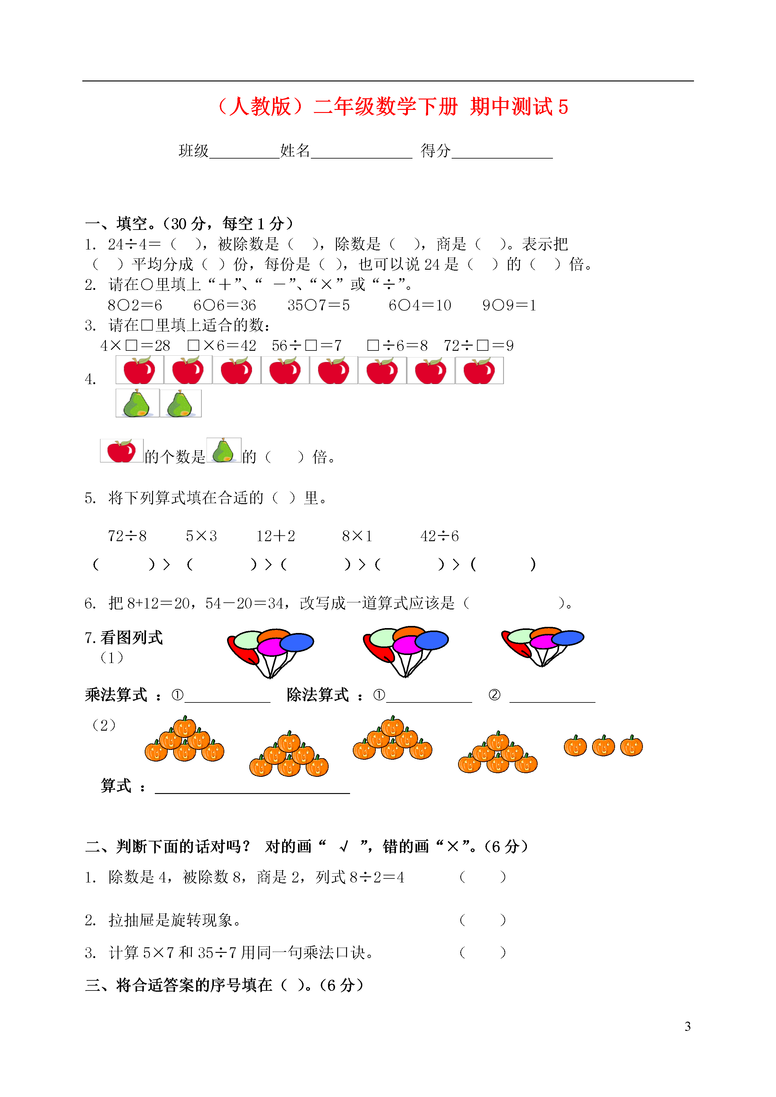 3(人教版)二年级数学下册期中测试5班级姓名得分一、填空。(30分,每空1分)1.24÷4=(),被除数是(),除数是(),商是()。表示把()平均分成()份,每份是(),也可以说24是()的()倍。2.请在○里填上“+”、“-”、“×”或“÷”。8○2=66○6=3635○7=56○4=109○9=13.请在□里填上适合的数:4×□=28□×6=4256÷□=7□÷6=872÷□=94.的个数是的()倍。5.将下列算式填在合适的()里。72÷85×312+28×142÷6()>()>()>()>()6.把8+12=20,54-20=34,改写成一道算式应该是()。7.看图列式(1)乘法算式:除法算式:(2)算式:二、判断下面的话对吗?对的画“√”,错的画“×”。(6分)1.除数是4,被除数8,商是2,列式8÷2=4()2.拉抽屉是旋转现象。()3.计算5×7和35÷7用同一句乘法口诀。()三、将合适答案的序号填在()。(6分)1.下面图形()通过平移可以和重合。A.B.C.2.从63中连续减去9,减()次才能使结果等于0。A.54B.7C.723.56里面有多少个7?列式是()。A.56÷8=7B.7×8=56C.56÷7=8四、计算。(16分)1.直接写得数。(10分)54÷6=5×8=90-42=72÷8=7÷7=8×6=84+16=18+2÷1=15-5×2=12÷3×4=2.用脱式计算。(6分)3×9+2381÷(21-12)64÷8×8======动手操作。(12分)1.用下面的点做顶点画角,并把角的名称写在()里。(4分)(1)画一个比直角大的角(2)画一个比直角小的角()()2、分别画出将向上平移3格,向左平移4格后得到的图形。(4分)3.照样子用两种颜色涂一涂,与上面的涂法不同,然后填空(4分)●●○○○○○○○○○○10是2的5倍○○○○○○○○○○○○()是()的()倍六、解决问题。(30分)1.算一算,我们班现在有多少个同学?(5分)今年,我们班又来了4个新同学。去年我们班有40个同学,王力、张扬转学走了。了,2.(5分)平均分给5只,每只小兔能分得几个萝卜?3.2张纸能做6个风车。(1)5张纸能做几个风车?(5分)(2)7张纸做20个风车,够吗?(5分)我今年9岁岁我今年63岁我今年32岁4.(10分)我今年36岁爷爷的年龄是小明的几倍?(4分)你还可以提什么问题?问题:?(2分)解答:(4分)