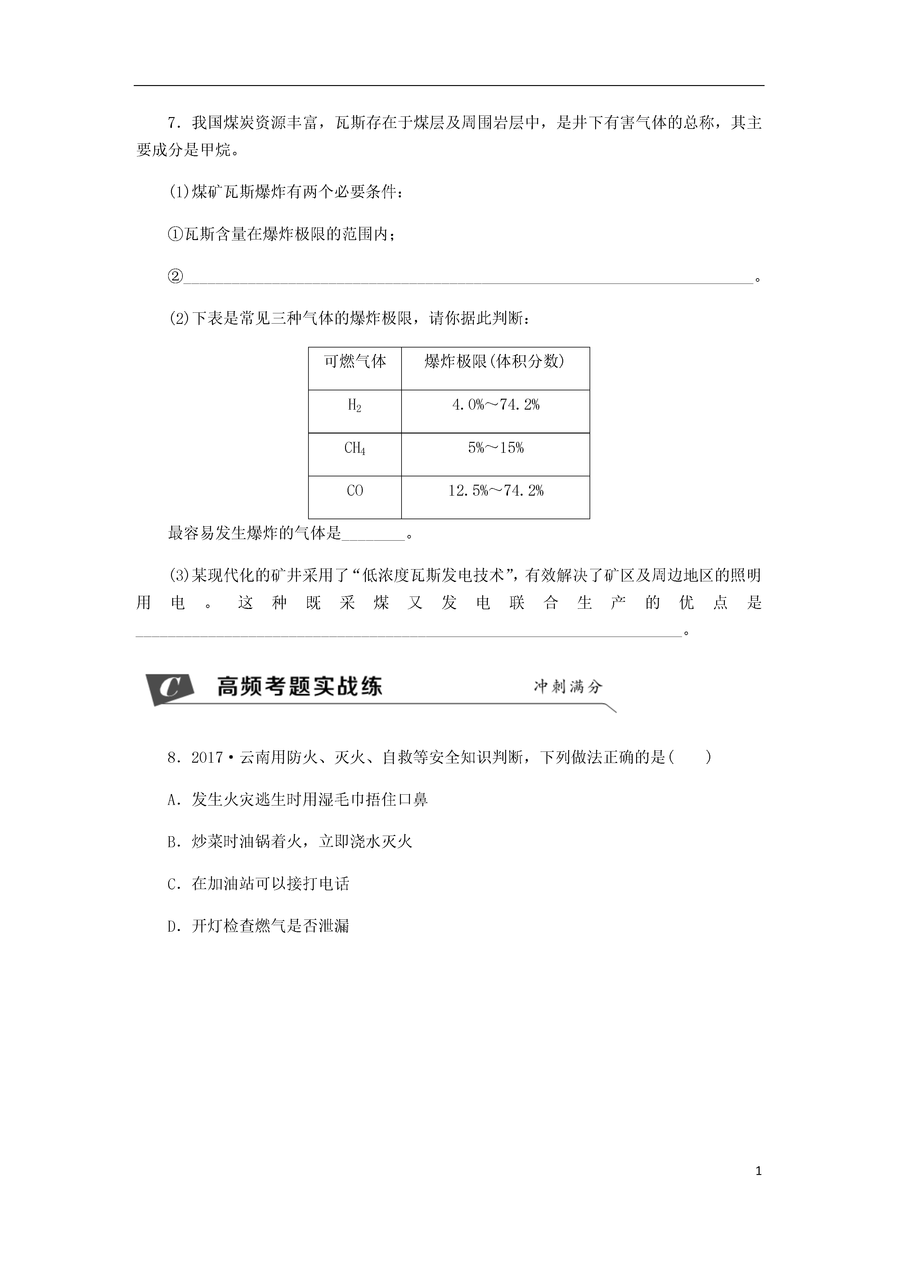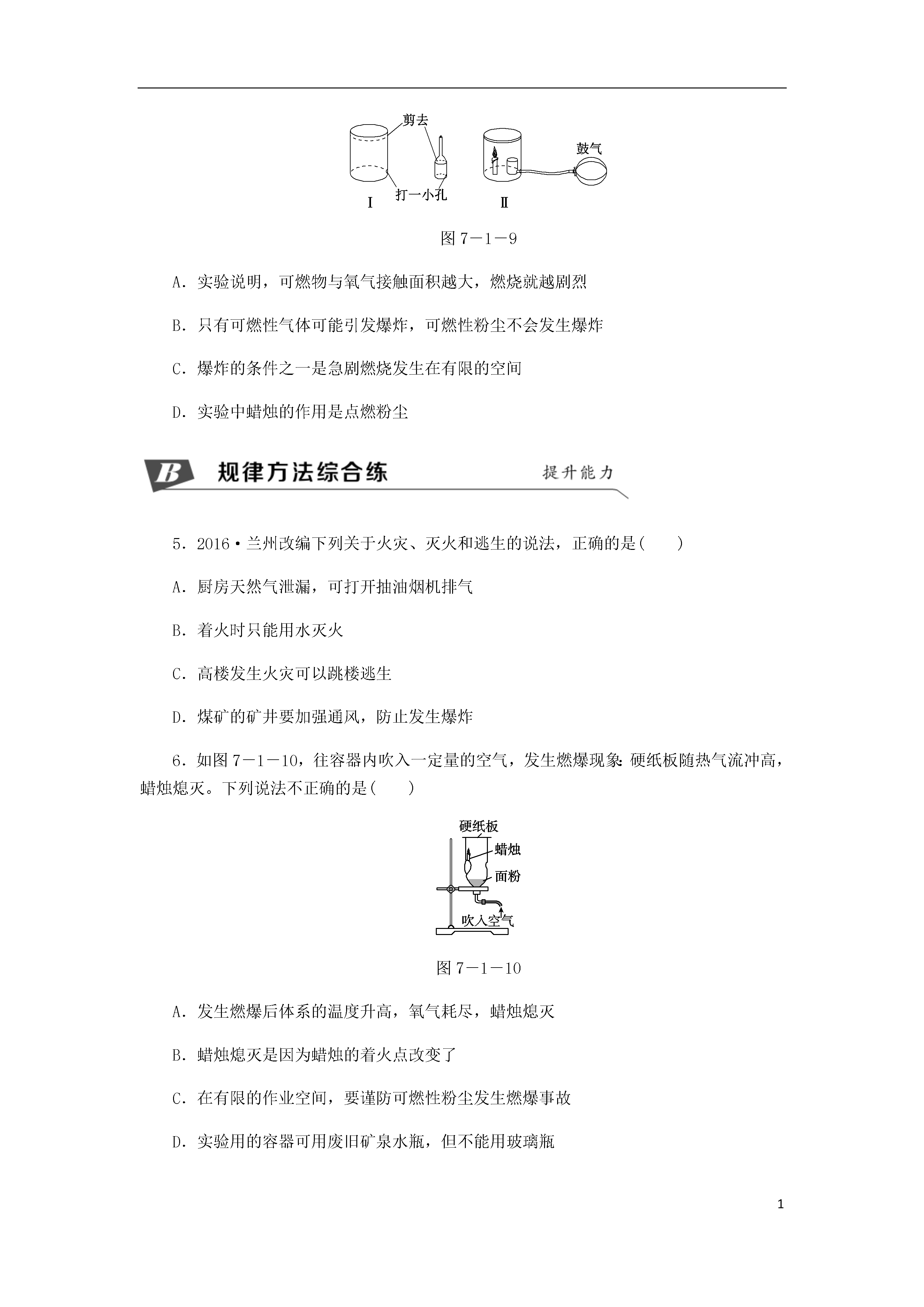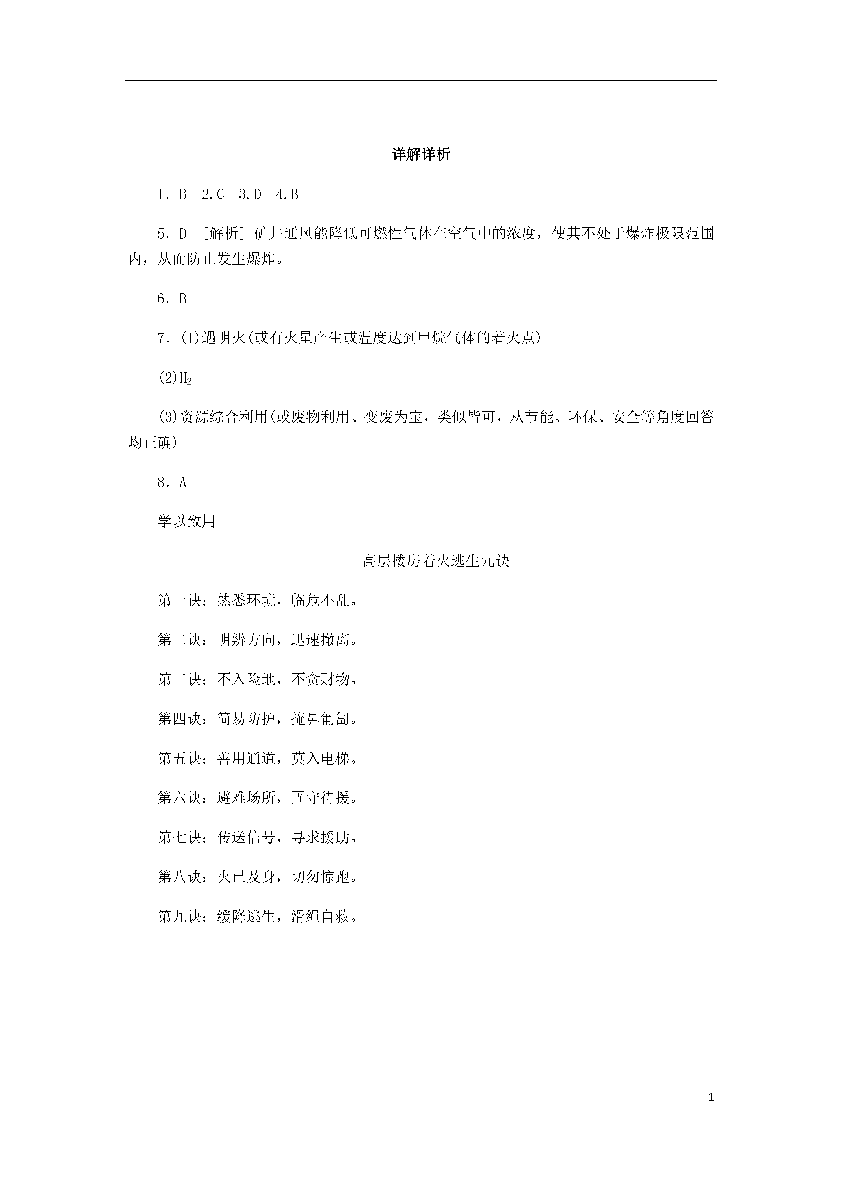 1第2课时易燃、易爆物的安全知识1.下列图标中,与燃烧和爆炸无关的是()图7-1-82.下列物质与空气混合后,遇明火,不可能发生爆炸的是()A.甲烷B.氢气C.氧气D.煤粉粉尘3.下列做法和认识正确的是()A.向正在燃烧的酒精炉里面添加酒精B.煤气泄漏时,点燃打火机检查泄漏点C.可燃物的急剧燃烧都会引起爆炸D.面粉厂、纺织厂中要严禁烟火4.如图7-1-9是粉尘爆炸的实验装置,有关说法错误的是()图7-1-9A.实验说明,可燃物与氧气接触面积越大,燃烧就越剧烈B.只有可燃性气体可能引发爆炸,可燃性粉尘不会发生爆炸C.爆炸的条件之一是急剧燃烧发生在有限的空间D.实验中蜡烛的作用是点燃粉尘5.2016·兰州改编下列关于火灾、灭火和逃生的说法,正确的是()A.厨房天然气泄漏,可打开抽油烟机排气B.着火时只能用水灭火C.高楼发生火灾可以跳楼逃生D.煤矿的矿井要加强通风,防止发生爆炸6.如图7-1-10,往容器内吹入一定量的空气,发生燃爆现象:硬纸板随热气流冲高,蜡烛熄灭。下列说法不正确的是()图7-1-10A.发生燃爆后体系的温度升高,氧气耗尽,蜡烛熄灭B.蜡烛熄灭是因为蜡烛的着火点改变了C.在有限的作业空间,要谨防可燃性粉尘发生燃爆事故D.实验用的容器可用废旧矿泉水瓶,但不能用玻璃瓶7.我国煤炭资源丰富,瓦斯存在于煤层及周围岩层中,是井下有害气体的总称,其主要成分是甲烷。(1)煤矿瓦斯爆炸有两个必要条件:①瓦斯含量在爆炸极限的范围内;②________________________________________________________________________。(2)下表是常见三种气体的爆炸极限,请你据此判断:可燃气体爆炸极限(体积分数)H24.0%~74.2%CH45%~15%CO12.5%~74.2%最容易发生爆炸的气体是________。(3)某现代化的矿井采用了“低浓度瓦斯发电技术”,有效解决了矿区及周边地区的照明用电。这种既采煤又发电联合生产的优点是_____________________________________________________________________。8.2017·云南用防火、灭火、自救等安全知识判断,下列做法正确的是()A.发生火灾逃生时用湿毛巾捂住口鼻B.炒菜时油锅着火,立即浇水灭火C.在加油站可以接打电话D.开灯检查燃气是否泄漏详解详析1.B2.C3.D4.B5.D[解析]矿井通风能降低可燃性气体在空气中的浓度,使其不处于爆炸极限范围内,从而防止发生爆炸。6.B7.(1)遇明火(或有火星产生或温度达到甲烷气体的着火点)(2)H2(3)资源综合利用(或废物利用、变废为宝,类似皆可,从节能、环保、安全等角度回答均正确)8.A学以致用高层楼房着火逃生九诀第一诀:熟悉环境,临危不乱。第二诀:明辨方向,迅速撤离。第三诀:不入险地,不贪财物。第四诀:简易防护,掩鼻匍匐。第五诀:善用通道,莫入电梯。第六诀:避难场所,固守待援。第七诀:传送信号,寻求援助。第八诀:火已及身,切勿惊跑。第九诀:缓降逃生,滑绳自救。