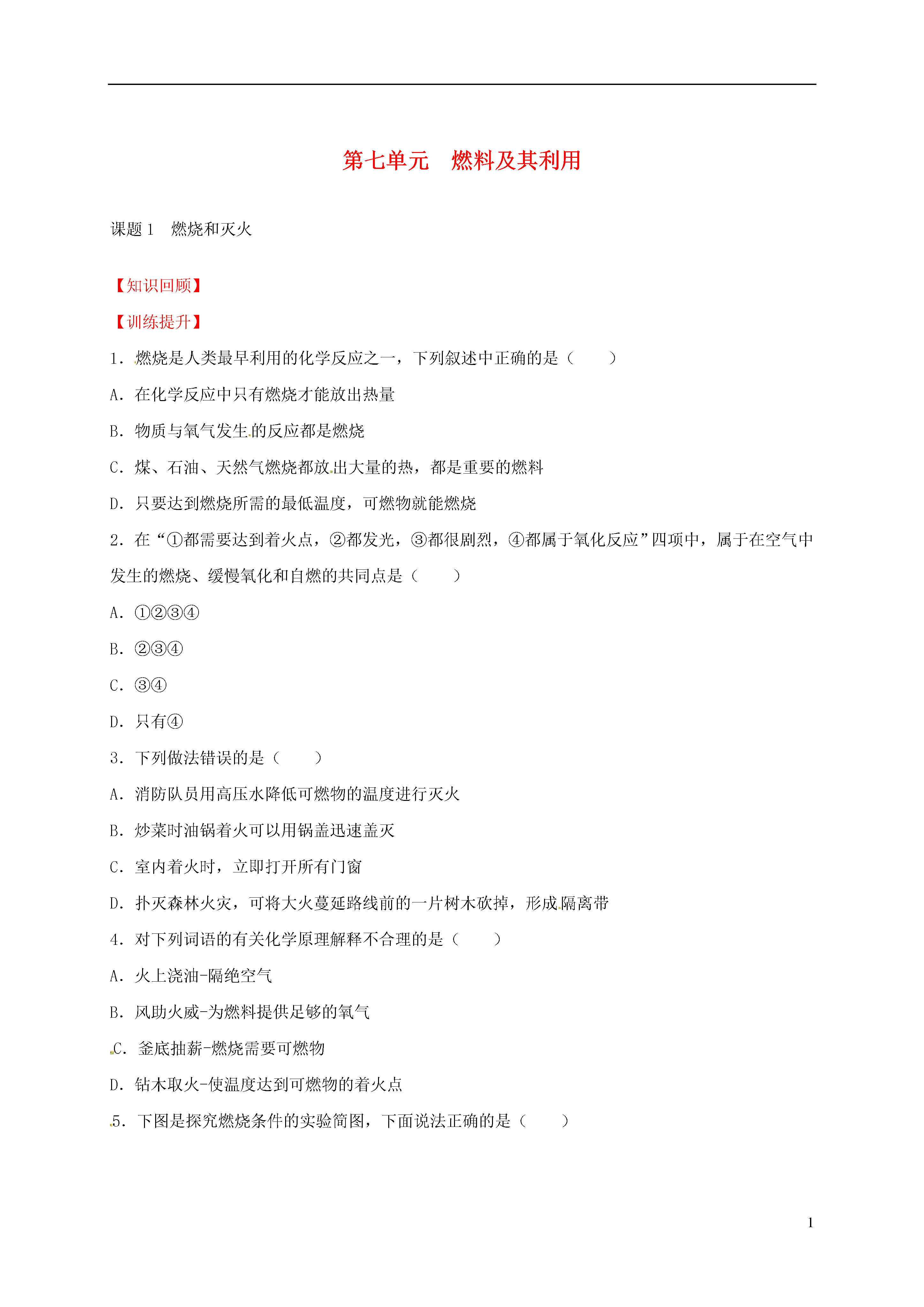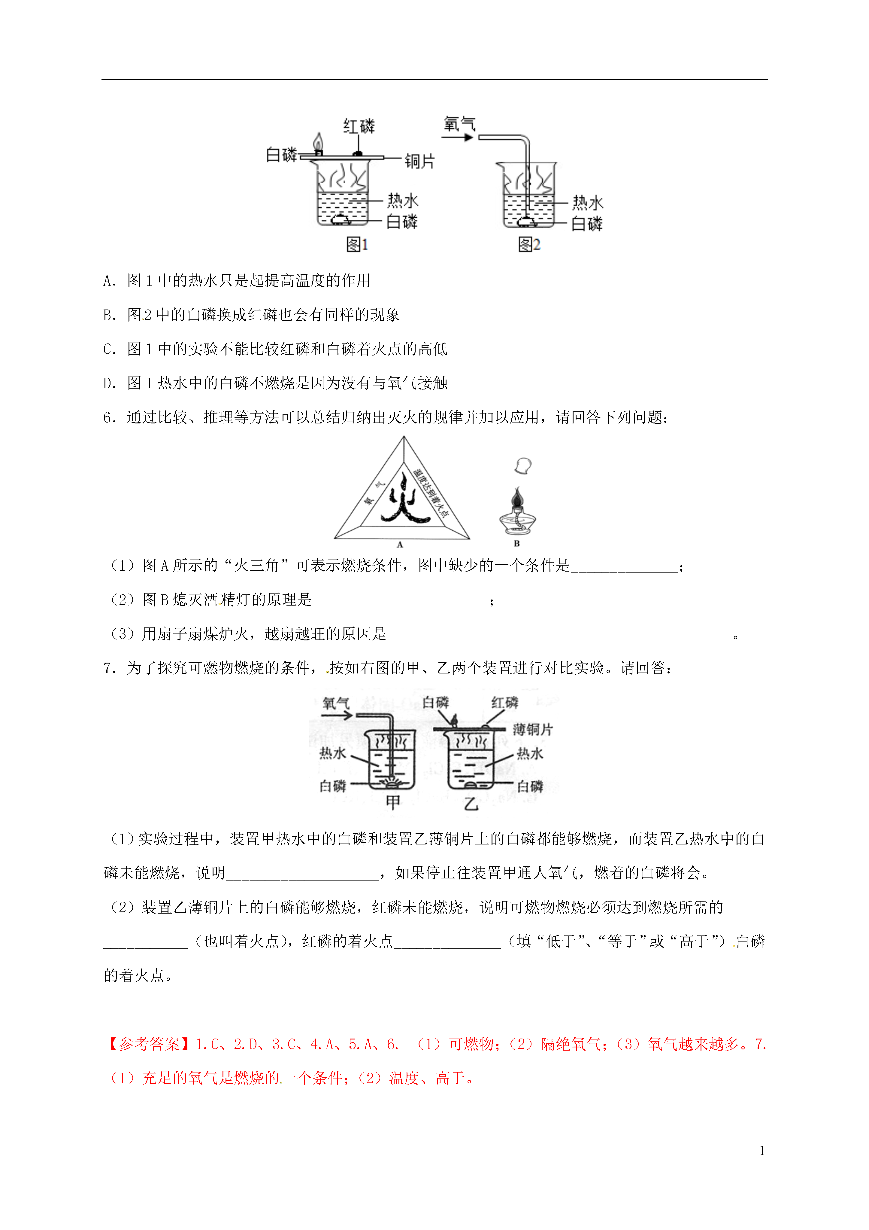 1第七单元燃料及其利用课题1燃烧和灭火【知识回顾】【训练提升】1.燃烧是人类最早利用的化学反应之一,下列叙述中正确的是()A.在化学反应中只有燃烧才能放出热量B.物质与氧气发生的反应都是燃烧C.煤、石油、天然气燃烧都放出大量的热,都是重要的燃料D.只要达到燃烧所需的最低温度,可燃物就能燃烧2.在“①都需要达到着火点,②都发光,③都很剧烈,④都属于氧化反应”四项中,属于在空气中发生的燃烧、缓慢氧化和自燃的共同点是()A.①②③④B.②③④C.③④D.只有④3.下列做法错误的是()A.消防队员用高压水降低可燃物的温度进行灭火B.炒菜时油锅着火可以用锅盖迅速盖灭C.室内着火时,立即打开所有门窗D.扑灭森林火灾,可将大火蔓延路线前的一片树木砍掉,形成隔离带4.对下列词语的有关化学原理解释不合理的是()A.火上浇油-隔绝空气B.风助火威-为燃料提供足够的氧气C.釜底抽薪-燃烧需要可燃物D.钻木取火-使温度达到可燃物的着火点5.下图是探究燃烧条件的实验简图,下面说法正确的是()A.图1中的热水只是起提高温度的作用B.图2中的白磷换成红磷也会有同样的现象C.图1中的实验不能比较红磷和白磷着火点的高低D.图1热水中的白磷不燃烧是因为没有与氧气接触6.通过比较、推理等方法可以总结归纳出灭火的规律并加以应用,请回答下列问题:(1)图A所示的“火三角”可表示燃烧条件,图中缺少的一个条件是______________;(2)图B熄灭酒精灯的原理是_______________________;(3)用扇子扇煤炉火,越扇越旺的原因是_____________________________________________。7.为了探究可燃物燃烧的条件,按如右图的甲、乙两个装置进行对比实验。请回答:(1)实验过程中,装置甲热水中的白磷和装置乙薄铜片上的白磷都能够燃烧,而装置乙热水中的白磷未能燃烧,说明____________________,如果停止往装置甲通人氧气,燃着的白磷将会。(2)装置乙薄铜片上的白磷能够燃烧,红磷未能燃烧,说明可燃物燃烧必须达到燃烧所需的___________(也叫着火点),红磷的着火点______________(填“低于”、“等于”或“高于”)白磷的着火点。【参考答案】1.C、2.D、3.C、4.A、5.A、6.(1)可燃物;(2)隔绝氧气;(3)氧气越来越多。7.(1)充足的氧气是燃烧的一个条件;(2)温度、高于。