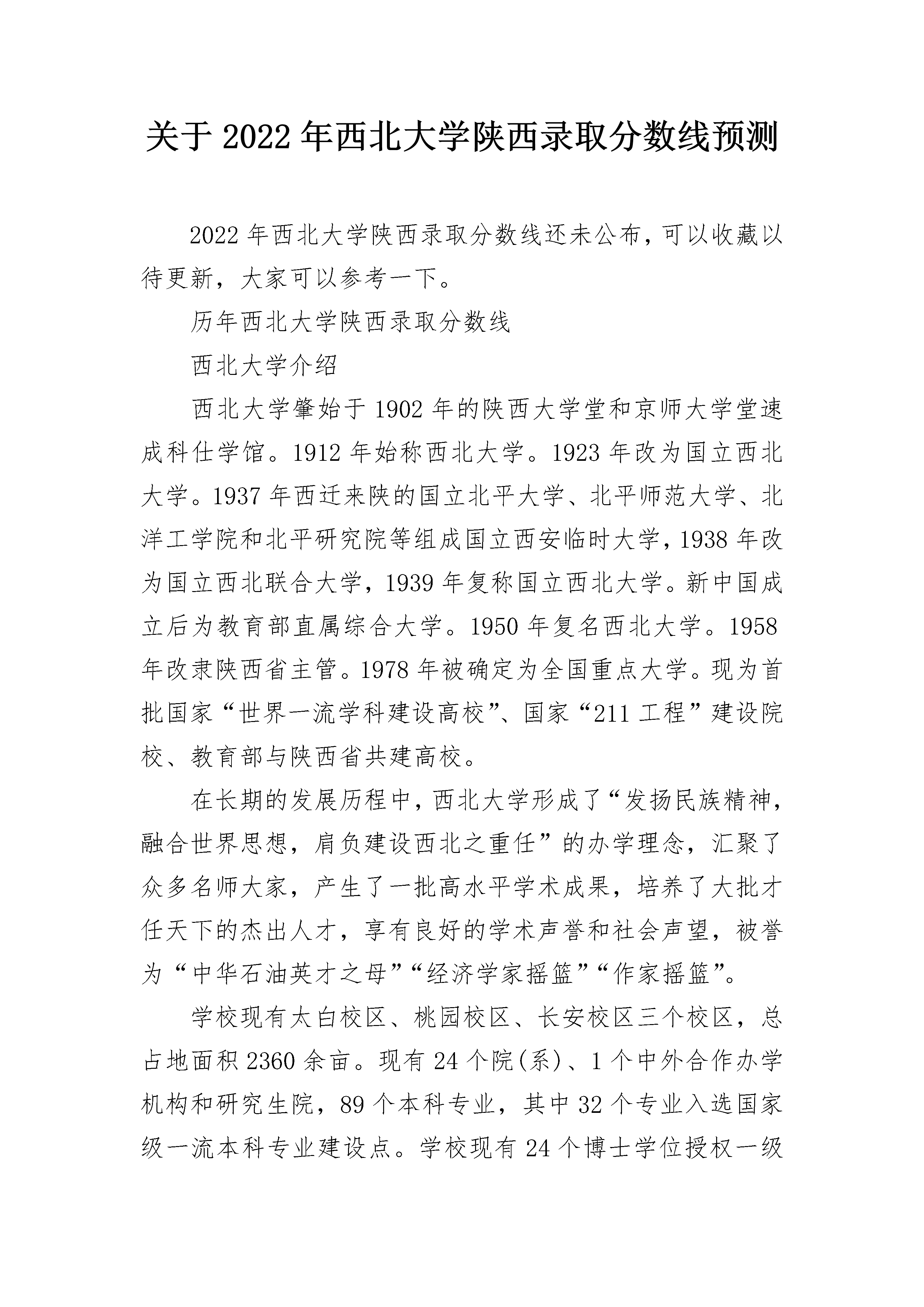 关于2022年西北大学陕西录取分数线预测2022年西北大学陕西录取分数线还未公布,可以收藏以待更新,大家可以参考一下。历年西北大学陕西录取分数线西北大学介绍西北大学肇始于1902年的陕西大学堂和京师大学堂速成科仕学馆。1912年始称西北大学。1923年改为国立西北大学。1937年西迁来陕的国立北平大学、北平师范大学、北洋工学院和北平研究院等组成国立西安临时大学,1938年改为国立西北联合大学,1939年复称国立西北大学。新中国成立后为教育部直属综合大学。1950年复名西北大学。1958年改隶陕西省主管。1978年被确定为全国重点大学。现为首批国家“世界一流学科建设高校”、国家“211工程”建设院校、教育部与陕西省共建高校。在长期的发展历程中,西北大学形成了“发扬民族精神,融合世界思想,肩负建设西北之重任”的办学理念,汇聚了众多名师大家,产生了一批高水平学术成果,培养了大批才任天下的杰出人才,享有良好的学术声誉和社会声望,被誉为“中华石油英才之母”“经济学家摇篮”“作家摇篮”。学校现有太白校区、桃园校区、长安校区三个校区,总占地面积2360余亩。现有24个院(系)、1个中外合作办学机构和研究生院,89个本科专业,其中32个专业入选国家级一流本科专业建设点。学校现有24个博士学位授权一级学科、36个硕士学位授权一级学科、18个专业学位授权类别。现有1个一级学科国家重点学科(涵盖5个二级学科)、4个二级学科国家重点学科和1个国家重点(培育)学科,24个博士后科研流动站。学校现有7个国家级实验教学示范中心,1个国家级虚拟仿真实验教学中心,7个国家级人才培养基地并设有国家大学生文化素质教育基地。设有1个国家重点实验室,1个国家工程技术研究中心,1个教育部人文社会科学重点研究基地,1个国家语言文字推广基地,1个国家创新人才培养示范基地,3个国家国际科技合作基地,3个国家地方联合工程研究中心,3个国家级高等学校学科创新引智基地,1个省部共建国家重点实验室培育基地,1个省部共建协同创新中心,80个省部级科研基地。现有教职工3000余人,其中中科院院士4人,双聘院士(教授)5人,国际科学史研究院院士1人,发展中国家科学院院士1人,国家“万人计划”项目入选者21人,国家杰出青年科学基金获得者12人,国家优秀青年科学基金获得者12人,国家“百千万人才工程”人选17人,国家级教学名师4人,教育部新世纪优秀人才支持计划25人,科技部“中青年科技创新领军人才”6人。全日制在校生25000余人,其中全日制本科生13000余人,研究生12000余人,国际学生400余人。